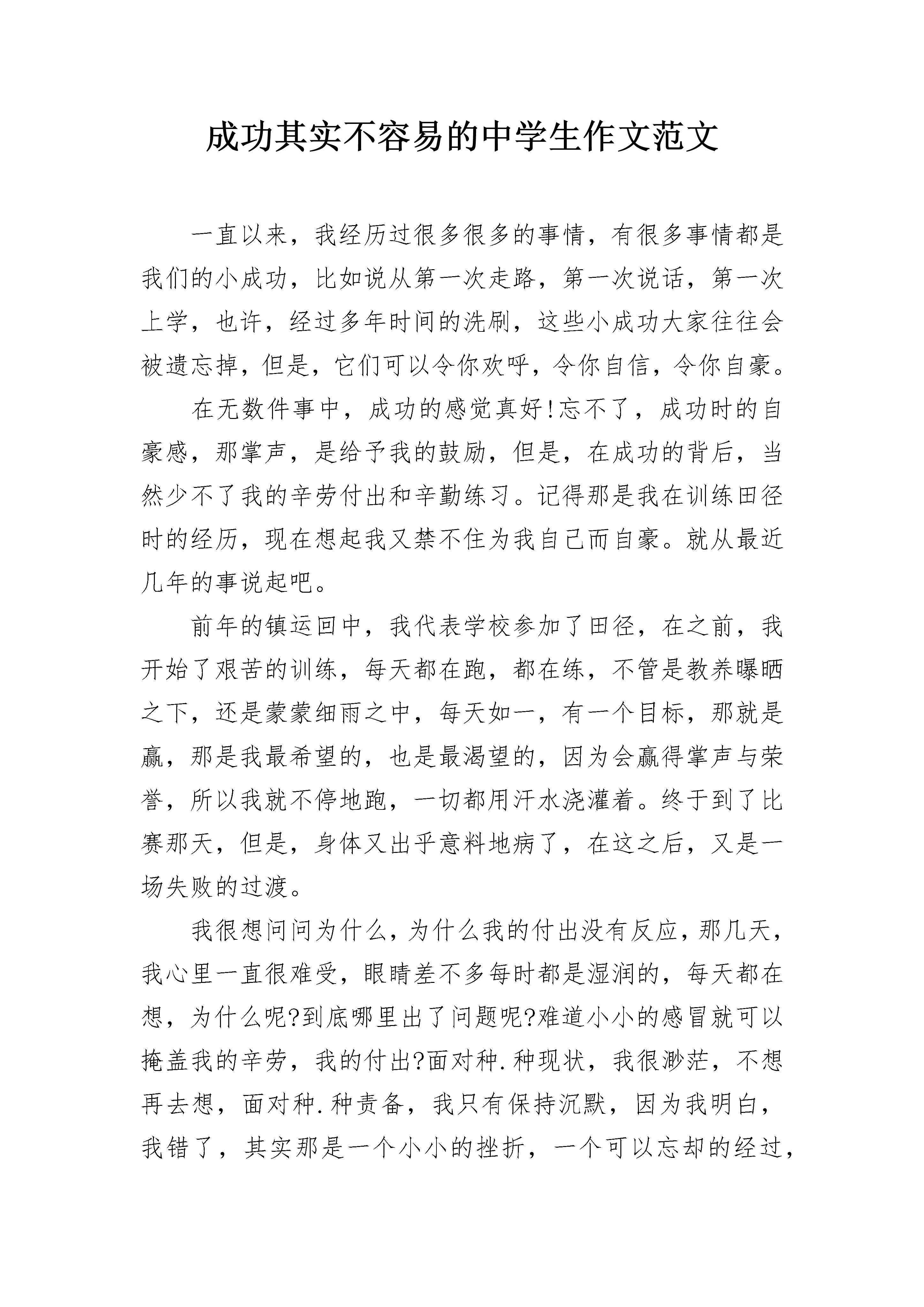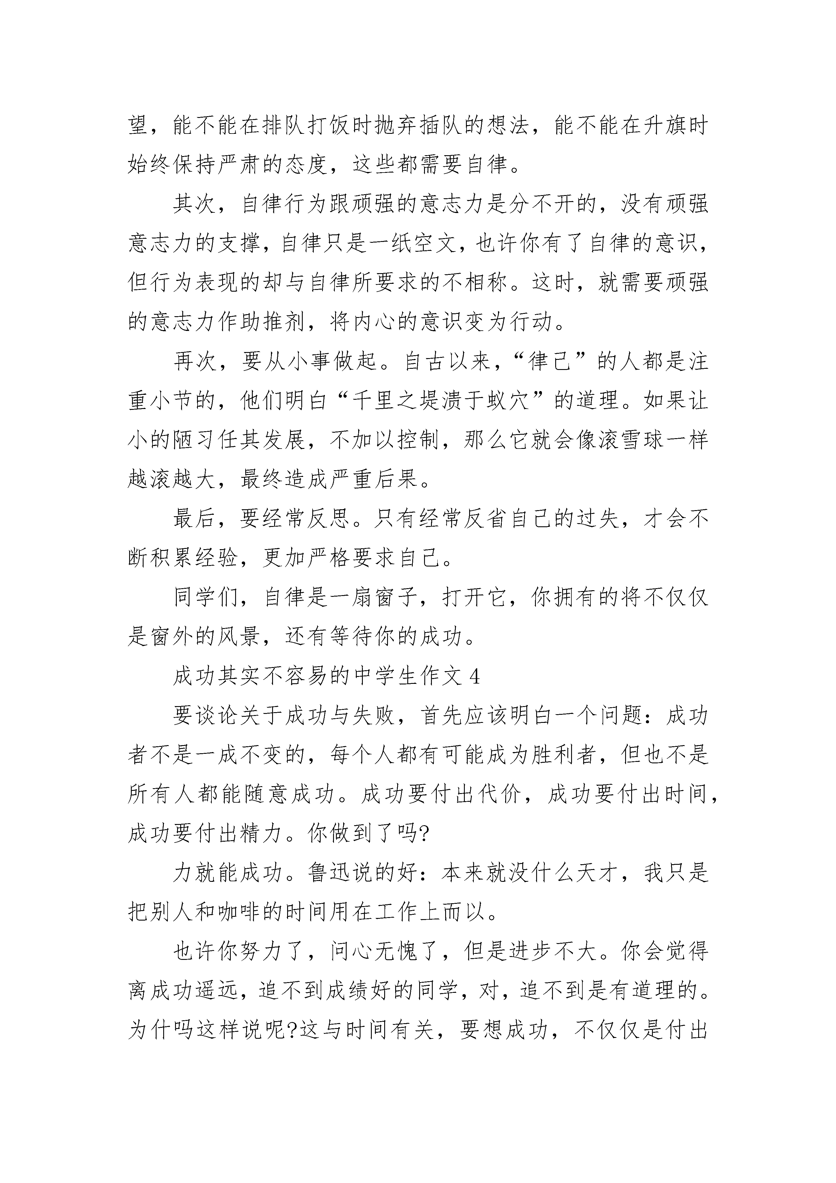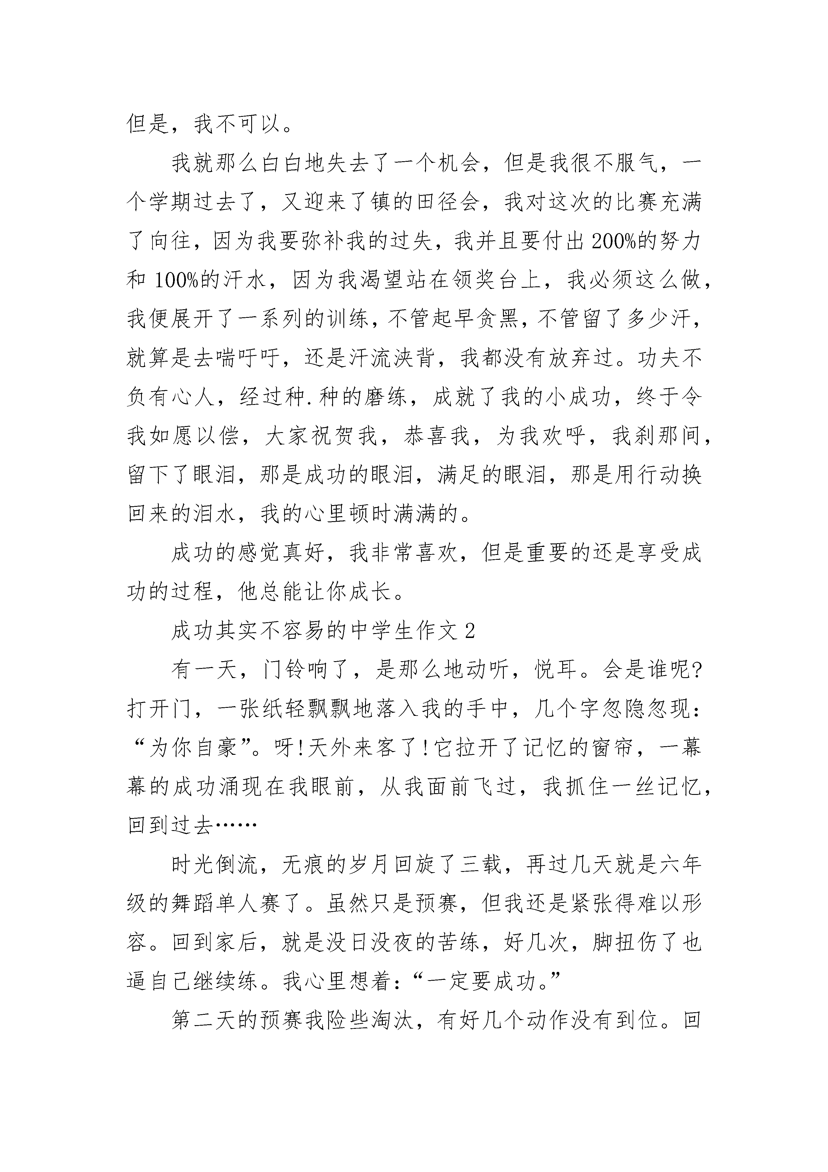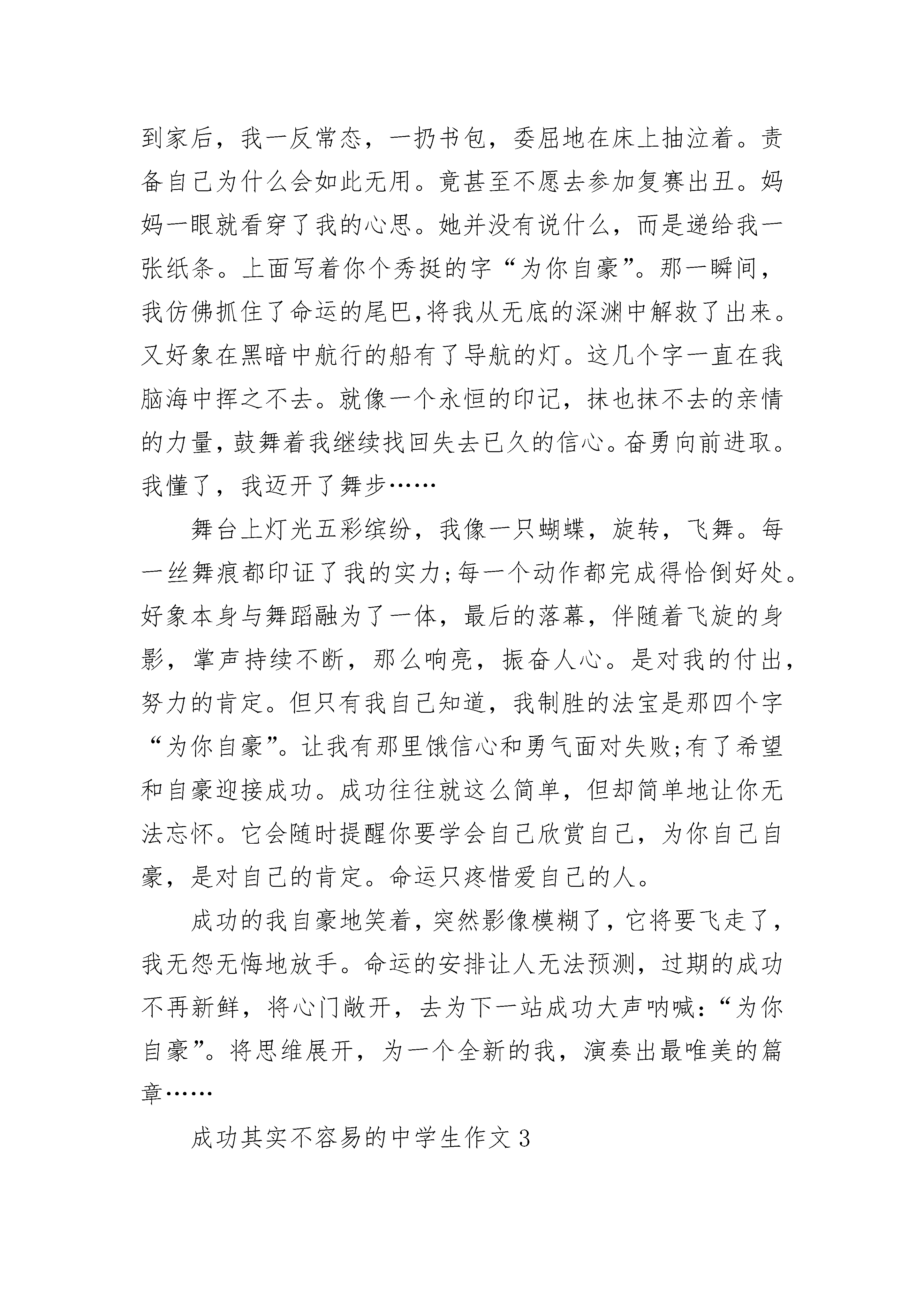 成功其实不容易的中学生作文范文一直以来,我经历过很多很多的事情,有很多事情都是我们的小成功,比如说从第一次走路,第一次说话,第一次上学,也许,经过多年时间的洗刷,这些小成功大家往往会被遗忘掉,但是,它们可以令你欢呼,令你自信,令你自豪。在无数件事中,成功的感觉真好!忘不了,成功时的自豪感,那掌声,是给予我的鼓励,但是,在成功的背后,当然少不了我的辛劳付出和辛勤练习。记得那是我在训练田径时的经历,现在想起我又禁不住为我自己而自豪。就从最近几年的事说起吧。前年的镇运回中,我代表学校参加了田径,在之前,我开始了艰苦的训练,每天都在跑,都在练,不管是教养曝晒之下,还是蒙蒙细雨之中,每天如一,有一个目标,那就是赢,那是我最希望的,也是最渴望的,因为会赢得掌声与荣誉,所以我就不停地跑,一切都用汗水浇灌着。终于到了比赛那天,但是,身体又出乎意料地病了,在这之后,又是一场失败的过渡。我很想问问为什么,为什么我的付出没有反应,那几天,我心里一直很难受,眼睛差不多每时都是湿润的,每天都在想,为什么呢?到底哪里出了问题呢?难道小小的感冒就可以掩盖我的辛劳,我的付出?面对种.种现状,我很渺茫,不想再去想,面对种.种责备,我只有保持沉默,因为我明白,我错了,其实那是一个小小的挫折,一个可以忘却的经过,但是,我不可以。我就那么白白地失去了一个机会,但是我很不服气,一个学期过去了,又迎来了镇的田径会,我对这次的比赛充满了向往,因为我要弥补我的过失,我并且要付出200%的努力和100%的汗水,因为我渴望站在领奖台上,我必须这么做,我便展开了一系列的训练,不管起早贪黑,不管留了多少汗,就算是去喘吁吁,还是汗流浃背,我都没有放弃过。功夫不负有心人,经过种.种的磨练,成就了我的小成功,终于令我如愿以偿,大家祝贺我,恭喜我,为我欢呼,我刹那间,留下了眼泪,那是成功的眼泪,满足的眼泪,那是用行动换回来的泪水,我的心里顿时满满的。成功的感觉真好,我非常喜欢,但是重要的还是享受成功的过程,他总能让你成长。成功其实不容易的中学生作文2有一天,门铃响了,是那么地动听,悦耳。会是谁呢?打开门,一张纸轻飘飘地落入我的手中,几个字忽隐忽现:“为你自豪”。呀!天外来客了!它拉开了记忆的窗帘,一幕幕的成功涌现在我眼前,从我面前飞过,我抓住一丝记忆,回到过去……时光倒流,无痕的岁月回旋了三载,再过几天就是六年级的舞蹈单人赛了。虽然只是预赛,但我还是紧张得难以形容。回到家后,就是没日没夜的苦练,好几次,脚扭伤了也逼自己继续练。我心里想着:“一定要成功。”第二天的预赛我险些淘汰,有好几个动作没有到位。回到家后,我一反常态,一扔书包,委屈地在床上抽泣着。责备自己为什么会如此无用。竟甚至不愿去参加复赛出丑。妈妈一眼就看穿了我的心思。她并没有说什么,而是递给我一张纸条。上面写着你个秀挺的字“为你自豪”。那一瞬间,我仿佛抓住了命运的尾巴,将我从无底的深渊中解救了出来。又好象在黑暗中航行的船有了导航的灯。这几个字一直在我脑海中挥之不去。就像一个永恒的印记,抹也抹不去的亲情的力量,鼓舞着我继续找回失去已久的信心。奋勇向前进取。我懂了,我迈开了舞步……舞台上灯光五彩缤纷,我像一只蝴蝶,旋转,飞舞。每一丝舞痕都印证了我的实力;每一个动作都完成得恰倒好处。好象本身与舞蹈融为了一体,最后的落幕,伴随着飞旋的身影,掌声持续不断,那么响亮,振奋人心。是对我的付出,努力的肯定。但只有我自己知道,我制胜的法宝是那四个字“为你自豪”。让我有那里饿信心和勇气面对失败;有了希望和自豪迎接成功。成功往往就这么简单,但却简单地让你无法忘怀。它会随时提醒你要学会自己欣赏自己,为你自己自豪,是对自己的肯定。命运只疼惜爱自己的人。成功的我自豪地笑着,突然影像模糊了,它将要飞走了,我无怨无悔地放手。命运的安排让人无法预测,过期的成功不再新鲜,将心门敞开,去为下一站成功大声呐喊:“为你自豪”。将思维展开,为一个全新的我,演奏出最唯美的篇章……成功其实不容易的中学生作文3自律,即自我约束。从大的方面说,它是一个群体的思想品质的体现;从小的方面来说,它是对一个人意志力的考验。普罗图斯说过:“新主宰自己灵魂的人,将是永远被称为征服者的征服者。”勃朗宁也说:“一个人一旦打响了征服自我的战斗,他便是值得称道的人。”这些都是名人眼中的自律。也许现在的我们还没有完全懂得自律的涵义,但它却时刻在我们身边,起着不可估量的作用。美国有个心理学家曾做过这样一个实验,将一群小孩子放置在同一个房间里,并放上糖果,告诉他们等工作人员回来再吃,然后又用隐藏的摄像头观察他们,发现只有少部分孩子克服了糖果的诱惑,以后工作人员跟踪调查,发现没吃糖的孩子成人后在事业上大多都很成功,而吃了糖的那部分孩子很少有成就,并且失业率很高。同学们,由此可见,自律是成功的基石。尤其是物