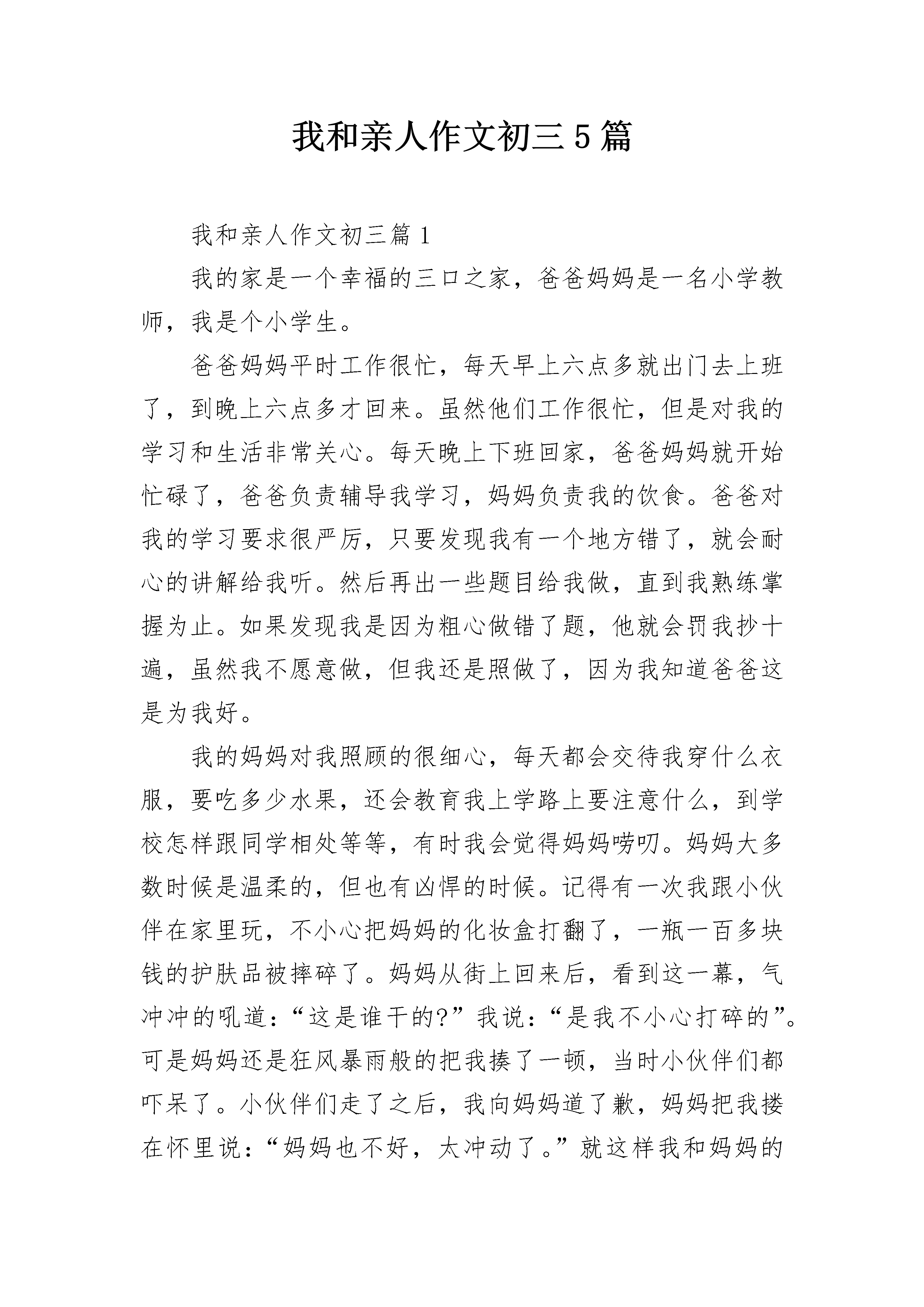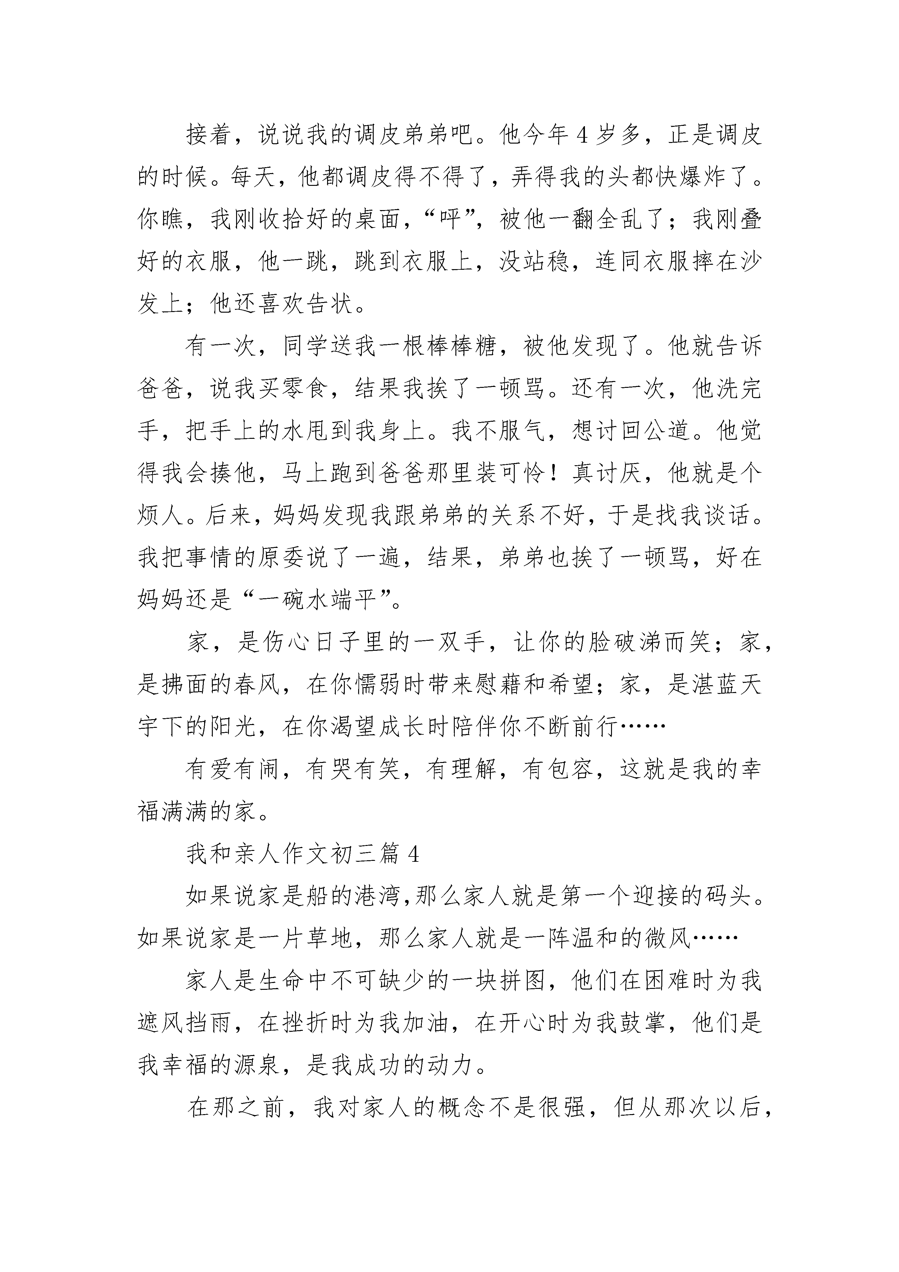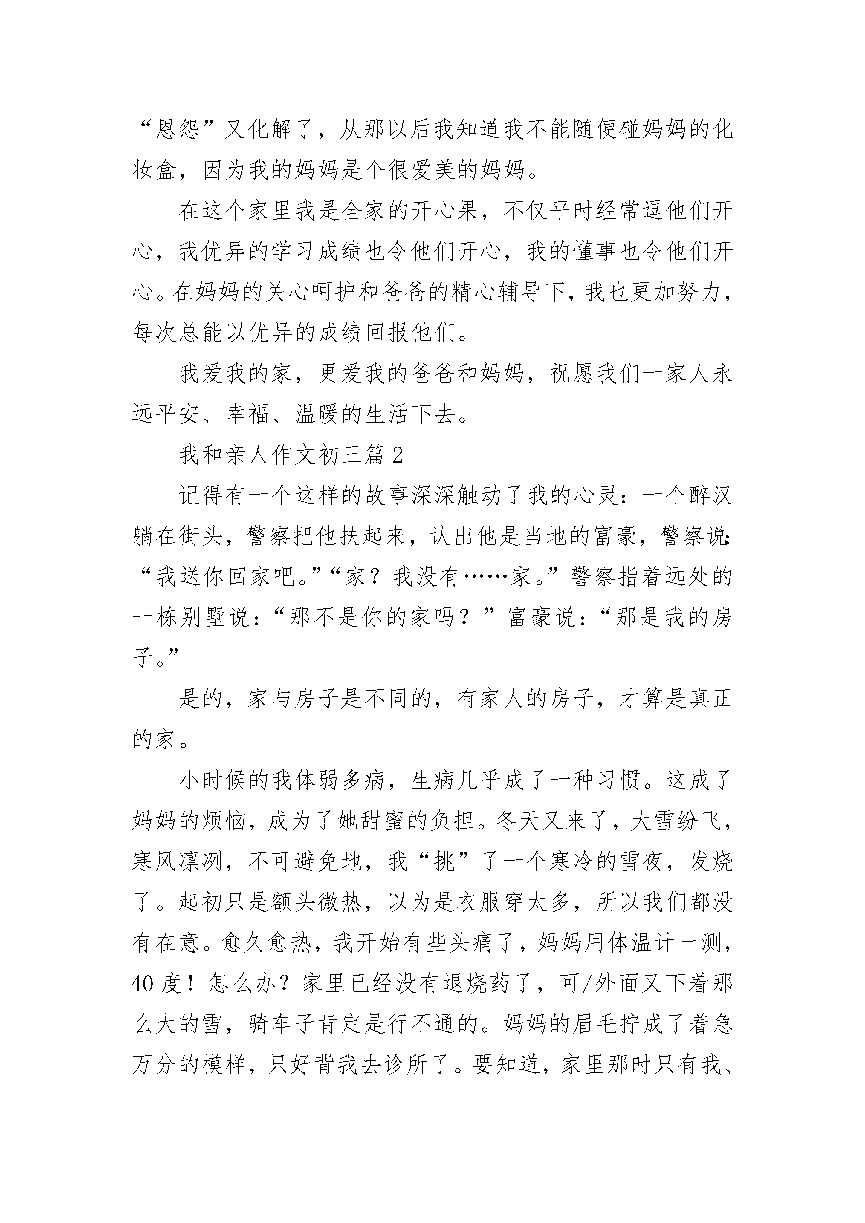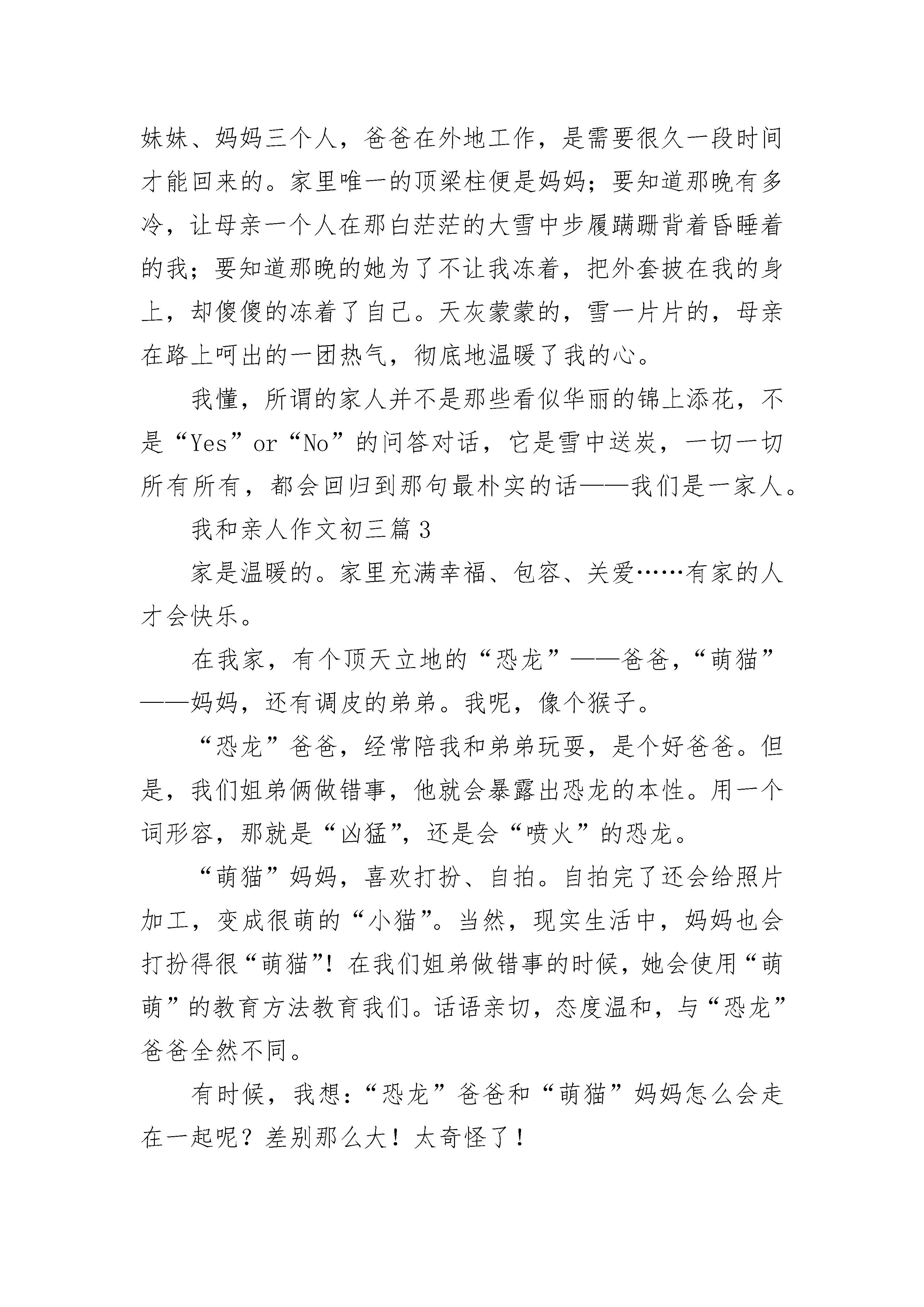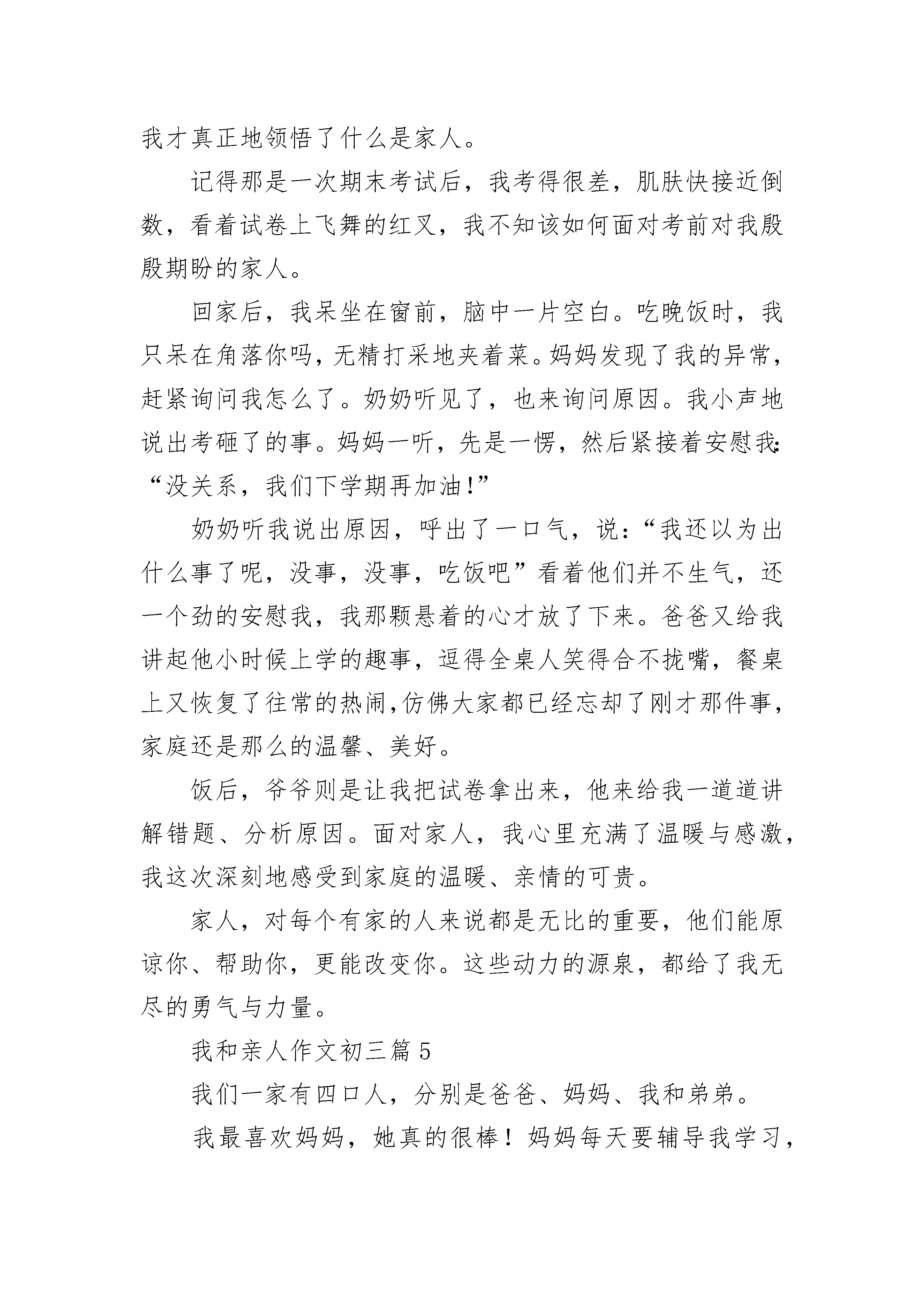 我和亲人作文初三5篇我和亲人作文初三篇1我的家是一个幸福的三口之家,爸爸妈妈是一名小学教师,我是个小学生。爸爸妈妈平时工作很忙,每天早上六点多就出门去上班了,到晚上六点多才回来。虽然他们工作很忙,但是对我的学习和生活非常关心。每天晚上下班回家,爸爸妈妈就开始忙碌了,爸爸负责辅导我学习,妈妈负责我的饮食。爸爸对我的学习要求很严厉,只要发现我有一个地方错了,就会耐心的讲解给我听。然后再出一些题目给我做,直到我熟练掌握为止。如果发现我是因为粗心做错了题,他就会罚我抄十遍,虽然我不愿意做,但我还是照做了,因为我知道爸爸这是为我好。我的妈妈对我照顾的很细心,每天都会交待我穿什么衣服,要吃多少水果,还会教育我上学路上要注意什么,到学校怎样跟同学相处等等,有时我会觉得妈妈唠叨。妈妈大多数时候是温柔的,但也有凶悍的时候。记得有一次我跟小伙伴在家里玩,不小心把妈妈的化妆盒打翻了,一瓶一百多块钱的护肤品被摔碎了。妈妈从街上回来后,看到这一幕,气冲冲的吼道:“这是谁干的?”我说:“是我不小心打碎的”。可是妈妈还是狂风暴雨般的把我揍了一顿,当时小伙伴们都吓呆了。小伙伴们走了之后,我向妈妈道了歉,妈妈把我搂在怀里说:“妈妈也不好,太冲动了。”就这样我和妈妈的“恩怨”又化解了,从那以后我知道我不能随便碰妈妈的化妆盒,因为我的妈妈是个很爱美的妈妈。在这个家里我是全家的开心果,不仅平时经常逗他们开心,我优异的学习成绩也令他们开心,我的懂事也令他们开心。在妈妈的关心呵护和爸爸的精心辅导下,我也更加努力,每次总能以优异的成绩回报他们。我爱我的家,更爱我的爸爸和妈妈,祝愿我们一家人永远平安、幸福、温暖的生活下去。我和亲人作文初三篇2记得有一个这样的故事深深触动了我的心灵:一个醉汉躺在街头,警察把他扶起来,认出他是当地的富豪,警察说:“我送你回家吧。”“家?我没有……家。”警察指着远处的一栋别墅说:“那不是你的家吗?”富豪说:“那是我的房子。”是的,家与房子是不同的,有家人的房子,才算是真正的家。小时候的我体弱多病,生病几乎成了一种习惯。这成了妈妈的烦恼,成为了她甜蜜的负担。冬天又来了,大雪纷飞,寒风凛冽,不可避免地,我“挑”了一个寒冷的雪夜,发烧了。起初只是额头微热,以为是衣服穿太多,所以我们都没有在意。愈久愈热,我开始有些头痛了,妈妈用体温计一测,40度!怎么办?家里已经没有退烧药了,可/外面又下着那么大的雪,骑车子肯定是行不通的。妈妈的眉毛拧成了着急万分的模样,只好背我去诊所了。要知道,家里那时只有我、妹妹、妈妈三个人,爸爸在外地工作,是需要很久一段时间才能回来的。家里唯一的顶梁柱便是妈妈;要知道那晚有多冷,让母亲一个人在那白茫茫的大雪中步履蹒跚背着昏睡着的我;要知道那晚的她为了不让我冻着,把外套披在我的身上,却傻傻的冻着了自己。天灰蒙蒙的,雪一片片的,母亲在路上呵出的一团热气,彻底地温暖了我的心。我懂,所谓的家人并不是那些看似华丽的锦上添花,不是“Yes”or“No”的问答对话,它是雪中送炭,一切一切所有所有,都会回归到那句最朴实的话——我们是一家人。我和亲人作文初三篇3家是温暖的。家里充满幸福、包容、关爱……有家的人才会快乐。在我家,有个顶天立地的“恐龙”——爸爸,“萌猫”——妈妈,还有调皮的弟弟。我呢,像个猴子。“恐龙”爸爸,经常陪我和弟弟玩耍,是个好爸爸。但是,我们姐弟俩做错事,他就会暴露出恐龙的本性。用一个词形容,那就是“凶猛”,还是会“喷火”的恐龙。“萌猫”妈妈,喜欢打扮、自拍。自拍完了还会给照片加工,变成很萌的“小猫”。当然,现实生活中,妈妈也会打扮得很“萌猫”!在我们姐弟做错事的时候,她会使用“萌萌”的教育方法教育我们。话语亲切,态度温和,与“恐龙”爸爸全然不同。有时候,我想:“恐龙”爸爸和“萌猫”妈妈怎么会走在一起呢?差别那么大!太奇怪了!接着,说说我的调皮弟弟吧。他今年4岁多,正是调皮的时候。每天,他都调皮得不得了,弄得我的头都快爆炸了。你瞧,我刚收拾好的桌面,“呯”,被他一翻全乱了;我刚叠好的衣服,他一跳,跳到衣服上,没站稳,连同衣服摔在沙发上;他还喜欢告状。有一次,同学送我一根棒棒糖,被他发现了。他就告诉爸爸,说我买零食,结果我挨了一顿骂。还有一次,他洗完手,把手上的水甩到我身上。我不服气,想讨回公道。他觉得我会揍他,马上跑到爸爸那里装可怜!真讨厌,他就是个烦人。后来,妈妈发现我跟弟弟的关系不好,于是找我谈话。我把事情的原委说了一遍,结果,弟弟也挨了一顿骂,好在妈妈还是“一碗水端平”。家,是伤心日子里的一双手,让你的脸破涕而笑;家,是拂面的春风,在你懦弱时带来慰藉和希望;家,是湛蓝天宇下的阳光,在你渴望成长时陪伴你不断前行……有爱有闹,有哭有笑,有理解,有包容,这就是我的幸福满满的家。我和亲人作文初三篇4如果说家是船的港湾,那么家人