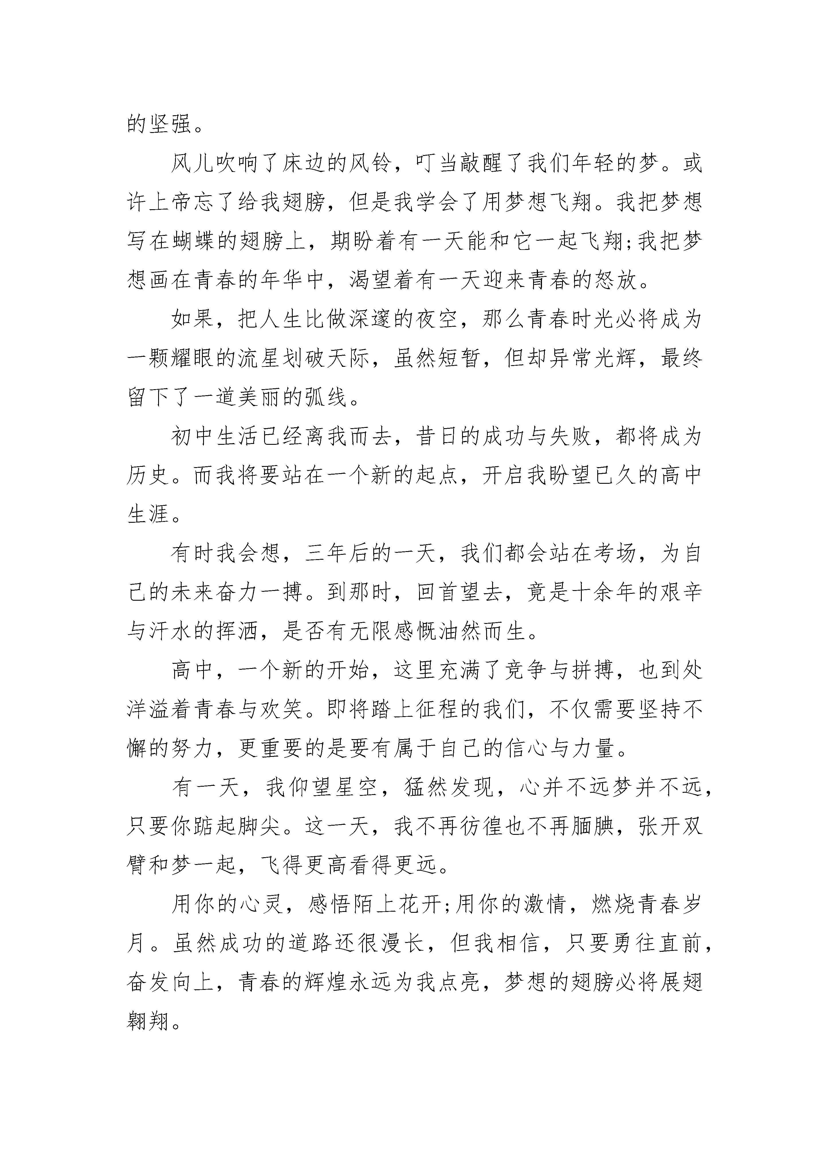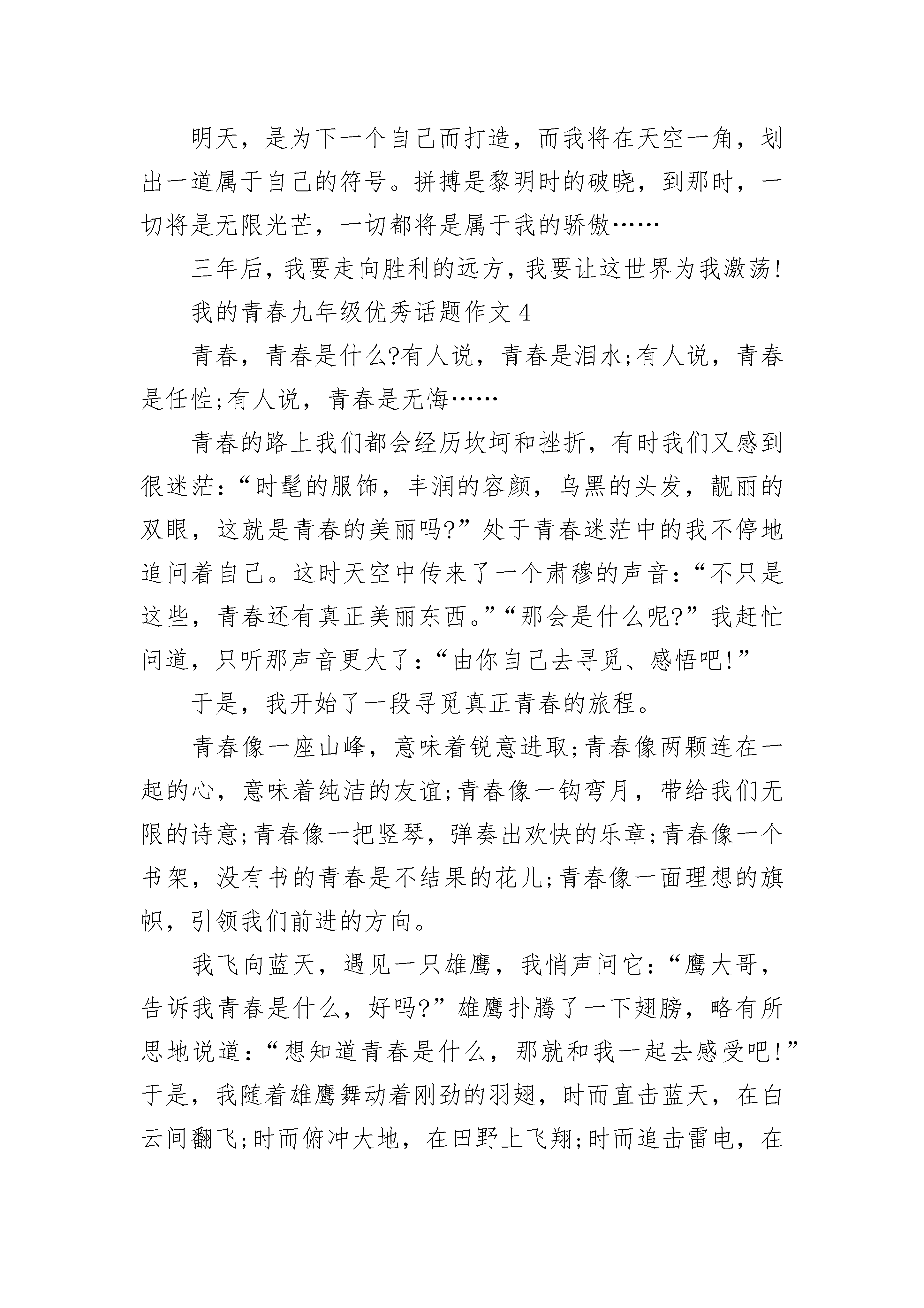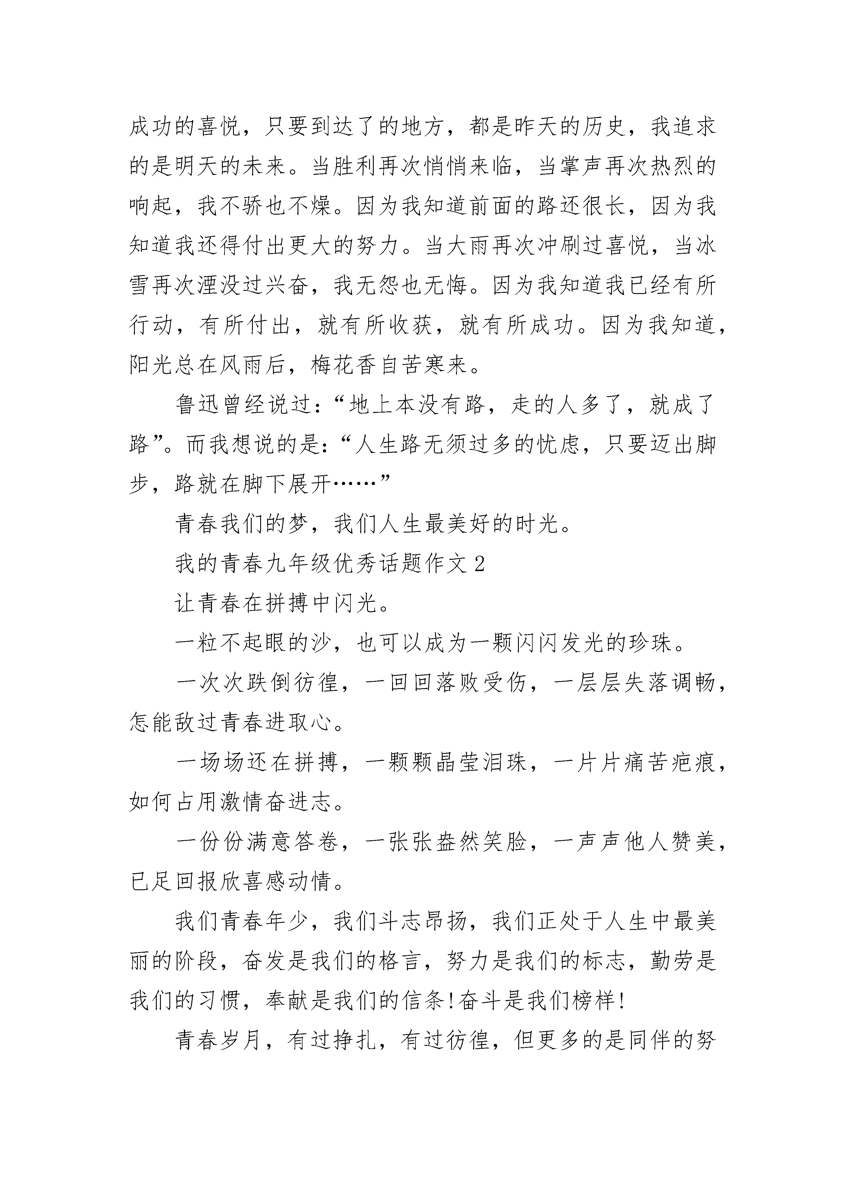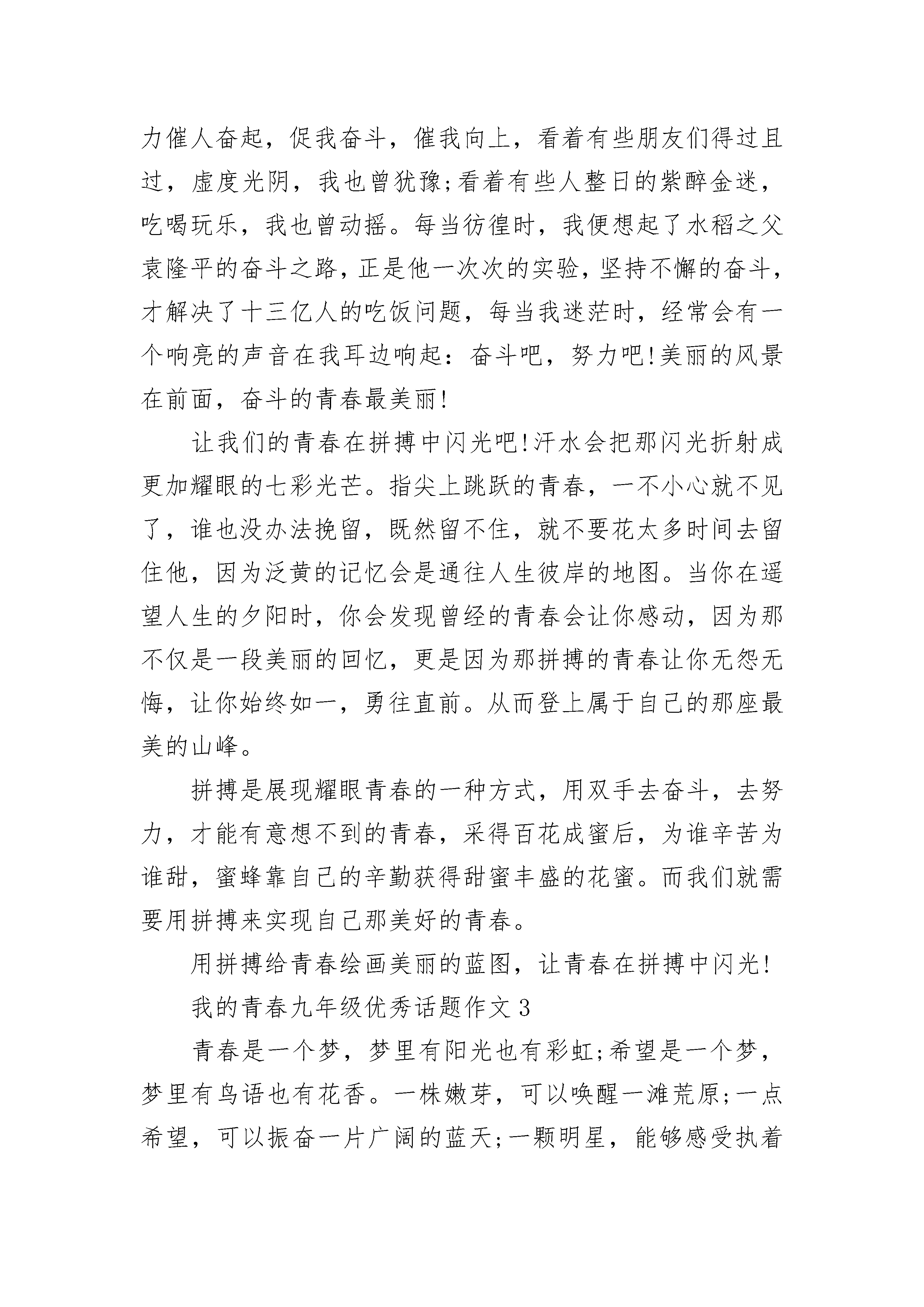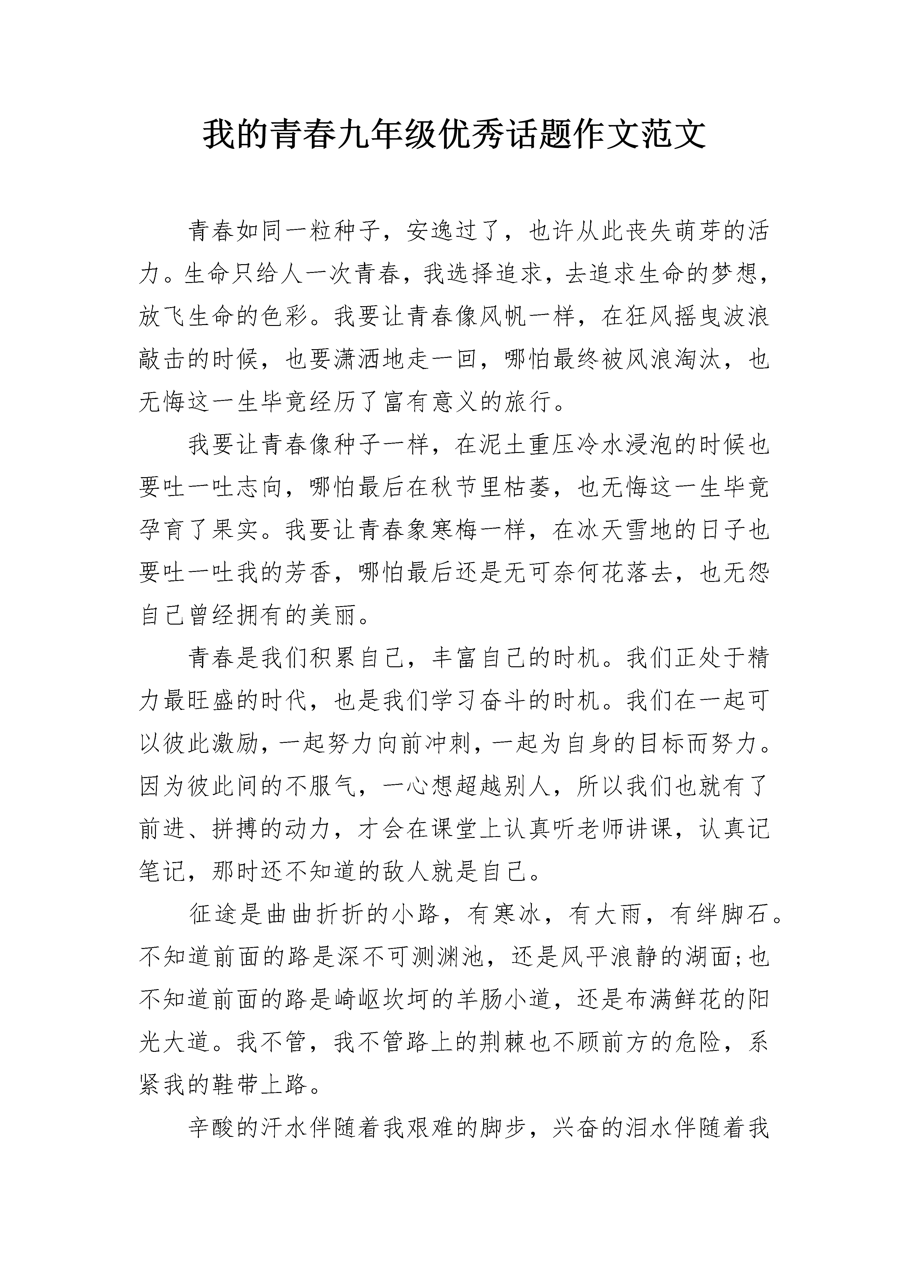 我的青春九年级优秀话题作文范文青春如同一粒种子,安逸过了,也许从此丧失萌芽的活力。生命只给人一次青春,我选择追求,去追求生命的梦想,放飞生命的色彩。我要让青春像风帆一样,在狂风摇曳波浪敲击的时候,也要潇洒地走一回,哪怕最终被风浪淘汰,也无悔这一生毕竟经历了富有意义的旅行。我要让青春像种子一样,在泥土重压冷水浸泡的时候也要吐一吐志向,哪怕最后在秋节里枯萎,也无悔这一生毕竟孕育了果实。我要让青春象寒梅一样,在冰天雪地的日子也要吐一吐我的芳香,哪怕最后还是无可奈何花落去,也无怨自己曾经拥有的美丽。青春是我们积累自己,丰富自己的时机。我们正处于精力最旺盛的时代,也是我们学习奋斗的时机。我们在一起可以彼此激励,一起努力向前冲刺,一起为自身的目标而努力。因为彼此间的不服气,一心想超越别人,所以我们也就有了前进、拼搏的动力,才会在课堂上认真听老师讲课,认真记笔记,那时还不知道的敌人就是自己。征途是曲曲折折的小路,有寒冰,有大雨,有绊脚石。不知道前面的路是深不可测渊池,还是风平浪静的湖面;也不知道前面的路是崎岖坎坷的羊肠小道,还是布满鲜花的阳光大道。我不管,我不管路上的荆棘也不顾前方的危险,系紧我的鞋带上路。辛酸的汗水伴随着我艰难的脚步,兴奋的泪水伴随着我成功的喜悦,只要到达了的地方,都是昨天的历史,我追求的是明天的未来。当胜利再次悄悄来临,当掌声再次热烈的响起,我不骄也不燥。因为我知道前面的路还很长,因为我知道我还得付出更大的努力。当大雨再次冲刷过喜悦,当冰雪再次湮没过兴奋,我无怨也无悔。因为我知道我已经有所行动,有所付出,就有所收获,就有所成功。因为我知道,阳光总在风雨后,梅花香自苦寒来。鲁迅曾经说过:“地上本没有路,走的人多了,就成了路”。而我想说的是:“人生路无须过多的忧虑,只要迈出脚步,路就在脚下展开……”青春我们的梦,我们人生最美好的时光。我的青春九年级优秀话题作文2让青春在拼搏中闪光。一粒不起眼的沙,也可以成为一颗闪闪发光的珍珠。一次次跌倒彷徨,一回回落败受伤,一层层失落调畅,怎能敌过青春进取心。一场场还在拼搏,一颗颗晶莹泪珠,一片片痛苦疤痕,如何占用激情奋进志。一份份满意答卷,一张张盎然笑脸,一声声他人赞美,已足回报欣喜感动情。我们青春年少,我们斗志昂扬,我们正处于人生中最美丽的阶段,奋发是我们的格言,努力是我们的标志,勤劳是我们的习惯,奉献是我们的信条!奋斗是我们榜样!青春岁月,有过挣扎,有过彷徨,但更多的是同伴的努力催人奋起,促我奋斗,催我向上,看着有些朋友们得过且过,虚度光阴,我也曾犹豫;看着有些人整日的紫醉金迷,吃喝玩乐,我也曾动摇。每当彷徨时,我便想起了水稻之父袁隆平的奋斗之路,正是他一次次的实验,坚持不懈的奋斗,才解决了十三亿人的吃饭问题,每当我迷茫时,经常会有一个响亮的声音在我耳边响起:奋斗吧,努力吧!美丽的风景在前面,奋斗的青春最美丽!让我们的青春在拼搏中闪光吧!汗水会把那闪光折射成更加耀眼的七彩光芒。指尖上跳跃的青春,一不小心就不见了,谁也没办法挽留,既然留不住,就不要花太多时间去留住他,因为泛黄的记忆会是通往人生彼岸的地图。当你在遥望人生的夕阳时,你会发现曾经的青春会让你感动,因为那不仅是一段美丽的回忆,更是因为那拼搏的青春让你无怨无悔,让你始终如一,勇往直前。从而登上属于自己的那座最美的山峰。拼搏是展现耀眼青春的一种方式,用双手去奋斗,去努力,才能有意想不到的青春,采得百花成蜜后,为谁辛苦为谁甜,蜜蜂靠自己的辛勤获得甜蜜丰盛的花蜜。而我们就需要用拼搏来实现自己那美好的青春。用拼搏给青春绘画美丽的蓝图,让青春在拼搏中闪光!我的青春九年级优秀话题作文3青春是一个梦,梦里有阳光也有彩虹;希望是一个梦,梦里有鸟语也有花香。一株嫩芽,可以唤醒一滩荒原;一点希望,可以振奋一片广阔的蓝天;一颗明星,能够感受执着的坚强。风儿吹响了床边的风铃,叮当敲醒了我们年轻的梦。或许上帝忘了给我翅膀,但是我学会了用梦想飞翔。我把梦想写在蝴蝶的翅膀上,期盼着有一天能和它一起飞翔;我把梦想画在青春的年华中,渴望着有一天迎来青春的怒放。如果,把人生比做深邃的夜空,那么青春时光必将成为一颗耀眼的流星划破天际,虽然短暂,但却异常光辉,最终留下了一道美丽的弧线。初中生活已经离我而去,昔日的成功与失败,都将成为历史。而我将要站在一个新的起点,开启我盼望已久的高中生涯。有时我会想,三年后的一天,我们都会站在考场,为自己的未来奋力一搏。到那时,回首望去,竟是十余年的艰辛与汗水的挥洒,是否有无限感慨油然而生。高中,一个新的开始,这里充满了竞争与拼搏,也到处洋溢着青春与欢笑。即将踏上征程的我们,不仅需要坚持不懈的努力,更重要的是要有属于自己的信心与力量。有一天,我仰望星空,猛然发现,心并不远梦并不远,只要你踮起脚尖。这一天,我不再彷徨也不再腼腆,张开双