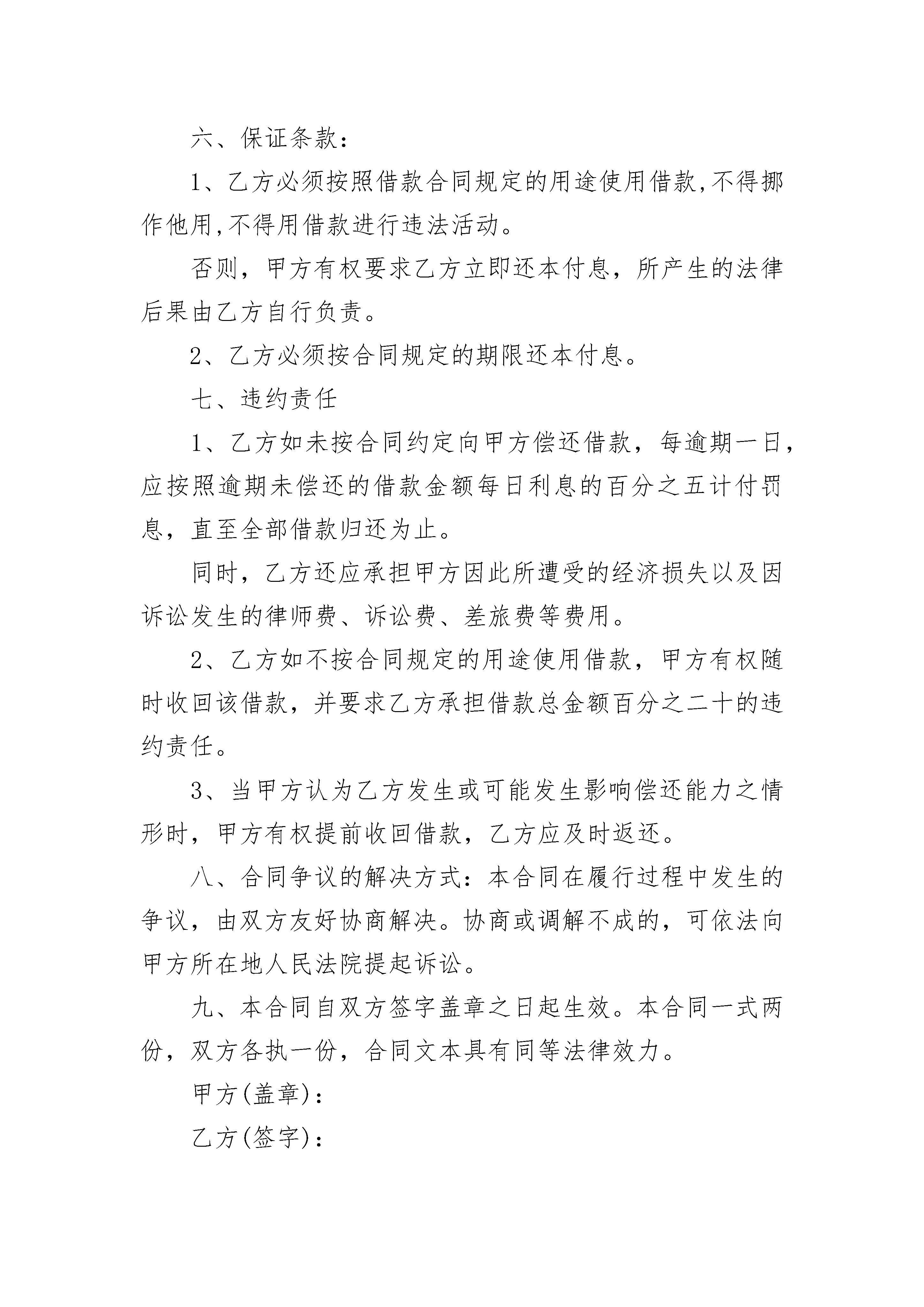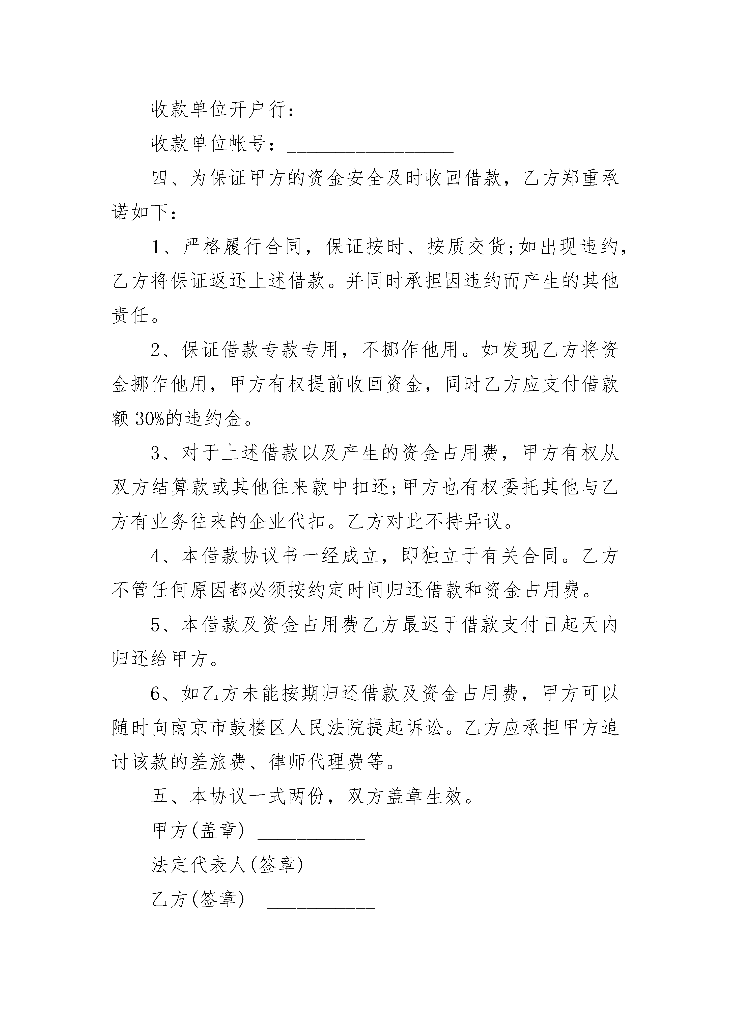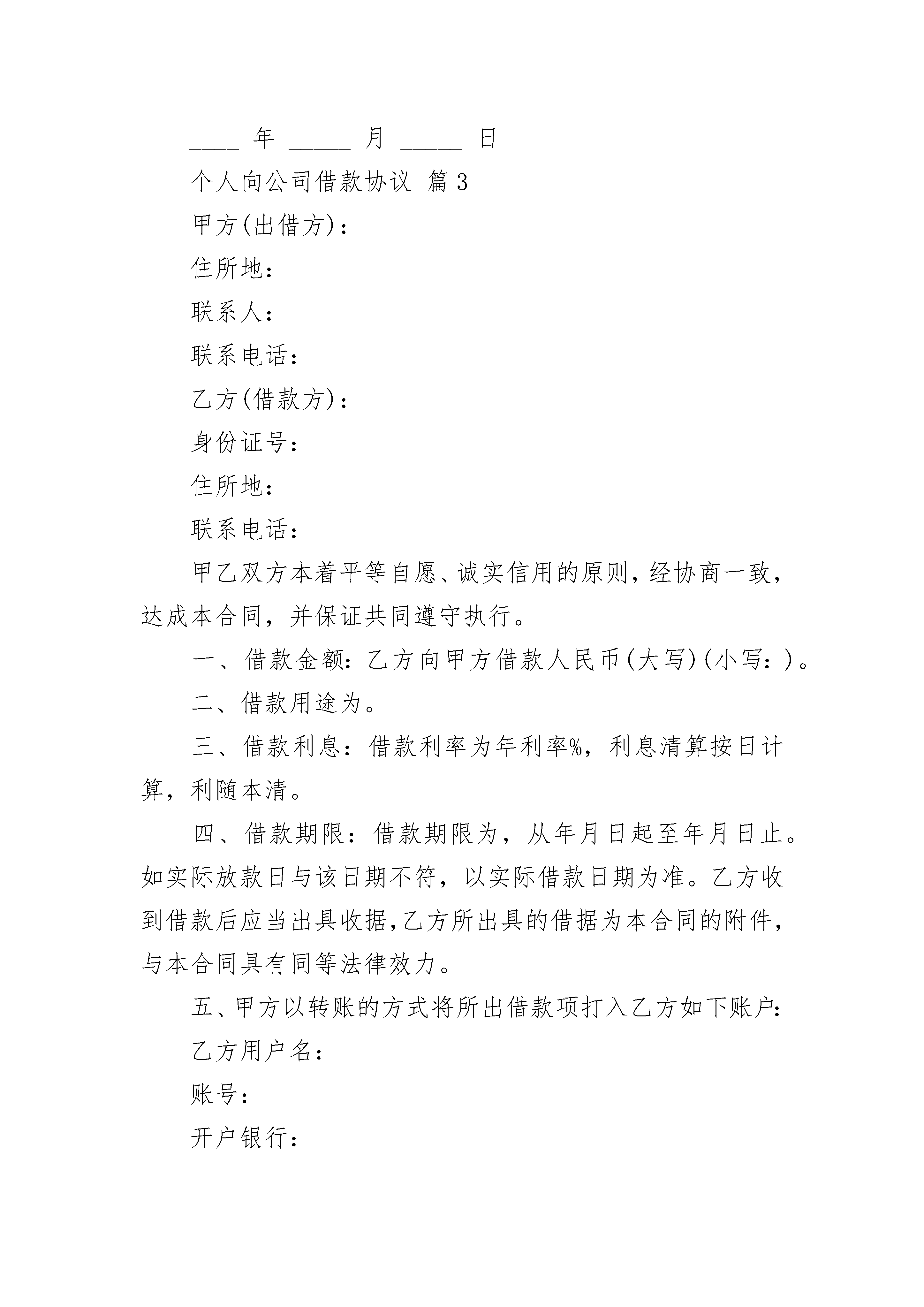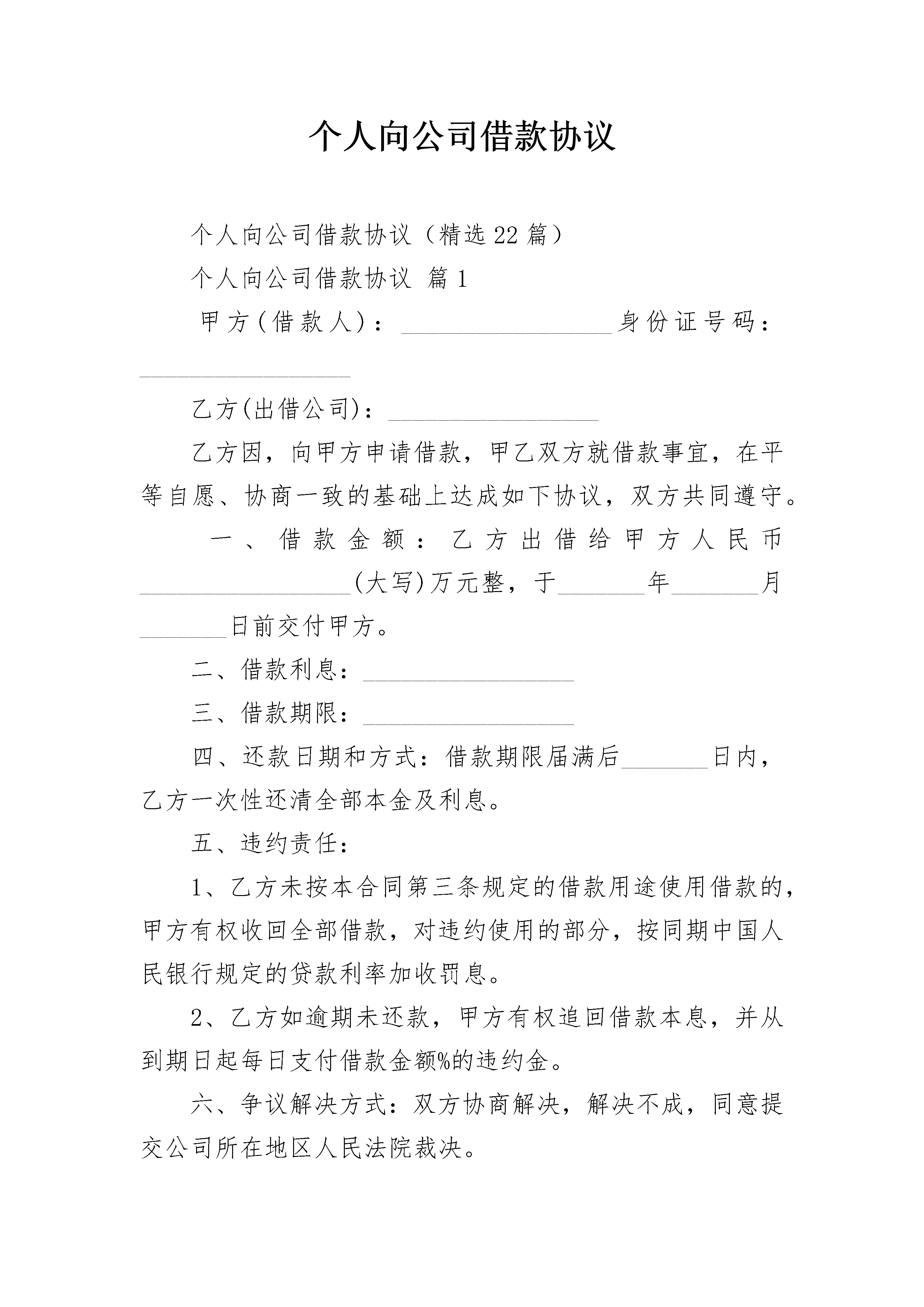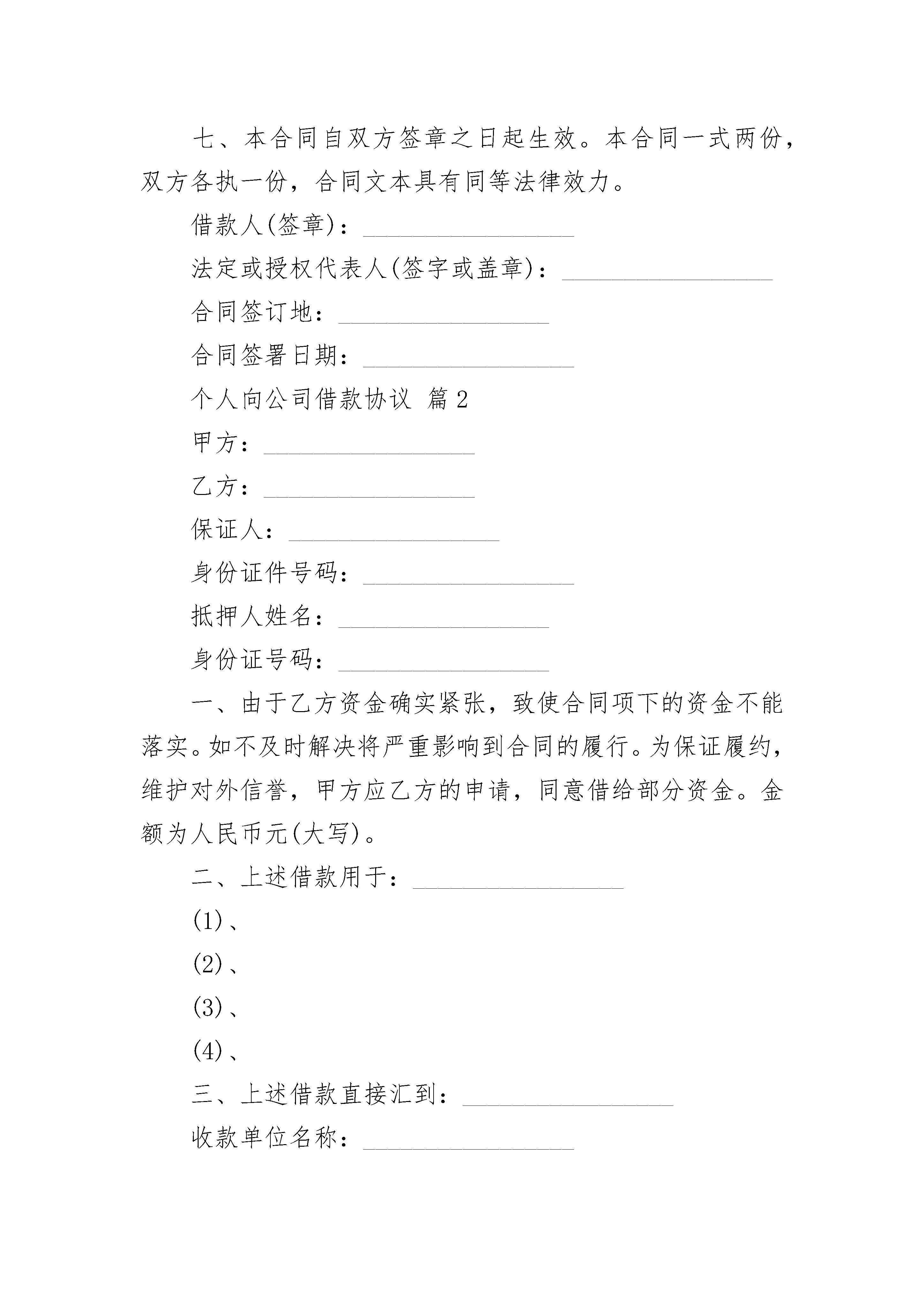 个人向公司借款协议个人向公司借款协议(精选22篇)个人向公司借款协议篇1甲方(借款人):_________________身份证号码:_________________乙方(出借公司):_________________乙方因,向甲方申请借款,甲乙双方就借款事宜,在平等自愿、协商一致的基础上达成如下协议,双方共同遵守。一、借款金额:乙方出借给甲方人民币_________________(大写)万元整,于_______年_______月_______日前交付甲方。二、借款利息:_________________三、借款期限:_________________四、还款日期和方式:借款期限届满后_______日内,乙方一次性还清全部本金及利息。五、违约责任:1、乙方未按本合同第三条规定的借款用途使用借款的,甲方有权收回全部借款,对违约使用的部分,按同期中国人民银行规定的贷款利率加收罚息。2、乙方如逾期未还款,甲方有权追回借款本息,并从到期日起每日支付借款金额%的违约金。六、争议解决方式:双方协商解决,解决不成,同意提交公司所在地区人民法院裁决。七、本合同自双方签章之日起生效。本合同一式两份,双方各执一份,合同文本具有同等法律效力。借款人(签章):_________________法定或授权代表人(签字或盖章):_________________合同签订地:_________________合同签署日期:_________________个人向公司借款协议篇2甲方:_________________乙方:_________________保证人:_________________身份证件号码:_________________抵押人姓名:_________________身份证号码:_________________一、由于乙方资金确实紧张,致使合同项下的资金不能落实。如不及时解决将严重影响到合同的履行。为保证履约,维护对外信誉,甲方应乙方的申请,同意借给部分资金。金额为人民币元(大写)。二、上述借款用于:_________________(1)、(2)、(3)、(4)、三、上述借款直接汇到:_________________收款单位名称:_________________收款单位开户行:_________________收款单位帐号:_________________四、为保证甲方的资金安全及时收回借款,乙方郑重承诺如下:_________________1、严格履行合同,保证按时、按质交货;如出现违约,乙方将保证返还上述借款。并同时承担因违约而产生的其他责任。2、保证借款专款专用,不挪作他用。如发现乙方将资金挪作他用,甲方有权提前收回资金,同时乙方应支付借款额30%的违约金。3、对于上述借款以及产生的资金占用费,甲方有权从双方结算款或其他往来款中扣还;甲方也有权委托其他与乙方有业务往来的企业代扣。乙方对此不持异议。4、本借款协议书一经成立,即独立于有关合同。乙方不管任何原因都必须按约定时间归还借款和资金占用费。5、本借款及资金占用费乙方最迟于借款支付日起天内归还给甲方。6、如乙方未能按期归还借款及资金占用费,甲方可以随时向南京市鼓楼区人民法院提起诉讼。乙方应承担甲方追讨该款的差旅费、律师代理费等。五、本协议一式两份,双方盖章生效。甲方(盖章)___________法定代表人(签章)___________乙方(签章)_______________年_____月_____日个人向公司借款协议篇3甲方(出借方):住所地:联系人:联系电话:乙方(借款方):身份证号:住所地:联系电话:甲乙双方本着平等自愿、诚实信用的原则,经协商一致,达成本合同,并保证共同遵守执行。一、借款金额:乙方向甲方借款人民币(大写)(小写:)。二、借款用途为。三、借款利息:借款利率为年利率%,利息清算按日计算,利随本清。四、借款期限:借款期限为,从年月日起至年月日止。如实际放款日与该日期不符,以实际借款日期为准。乙方收到借款后应当出具收据,乙方所出具的借据为本合同的附件,与本合同具有同等法律效力。五、甲方以转账的方式将所出借款项打入乙方如下账户:乙方用户名:账号:开户银行:六、保证条款:1、乙方必须按照借款合同规定的用途使用借款,不得挪作他用,不得用借款进行违法活动。否则,甲方有权要求乙方立即还本付息,所产生的法律后果由乙方自行负责。2、乙方必须按合同规定的期限还本付息。七、违约责任1、乙方如未按合同约定向甲方偿还借款,每逾期一日,应按照逾期未偿还的借款金额每日利息的百分之五计付罚息,直至全部借款归还为止。同时,乙方还应承担甲方因此所遭受的经济损失以及因诉讼发生的律师费、诉讼费、差旅费等费用。2、乙方如不按合同规定的用途使用借款,甲方有权随时收回该借款,并要求乙
