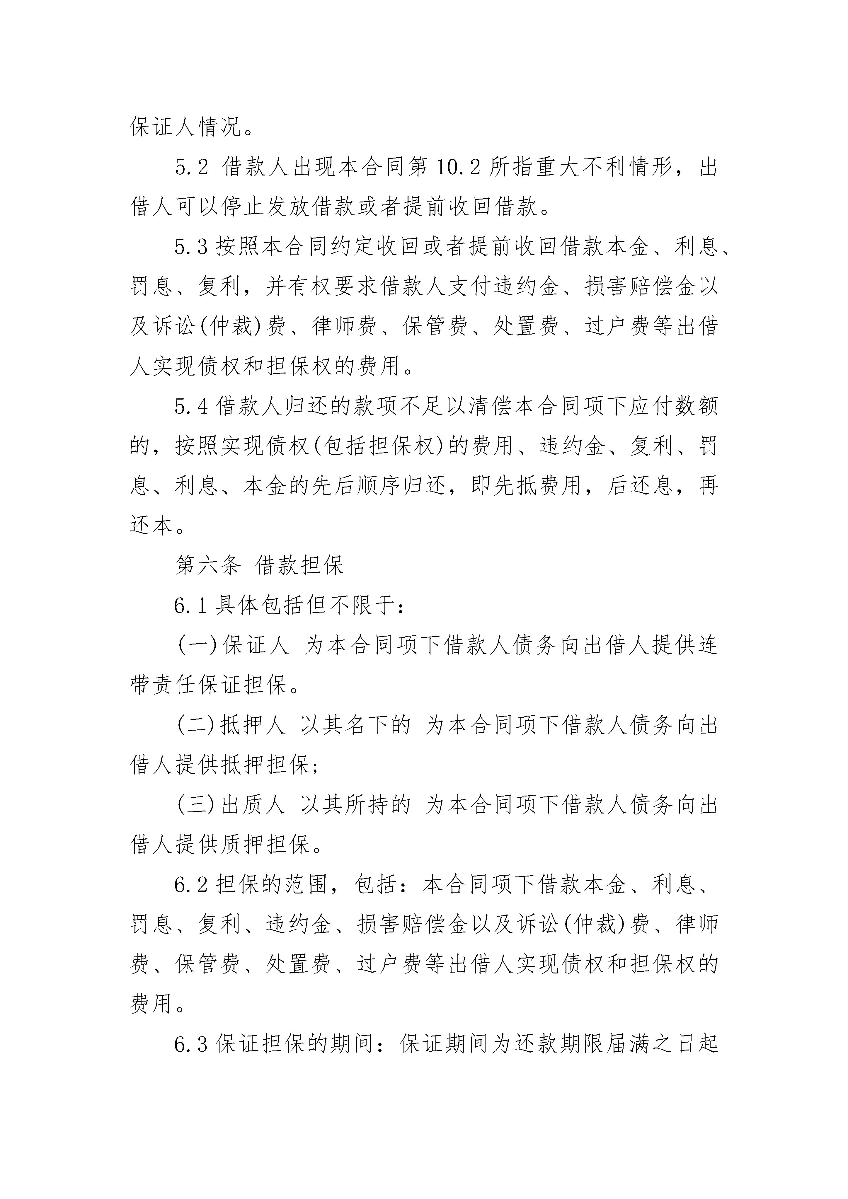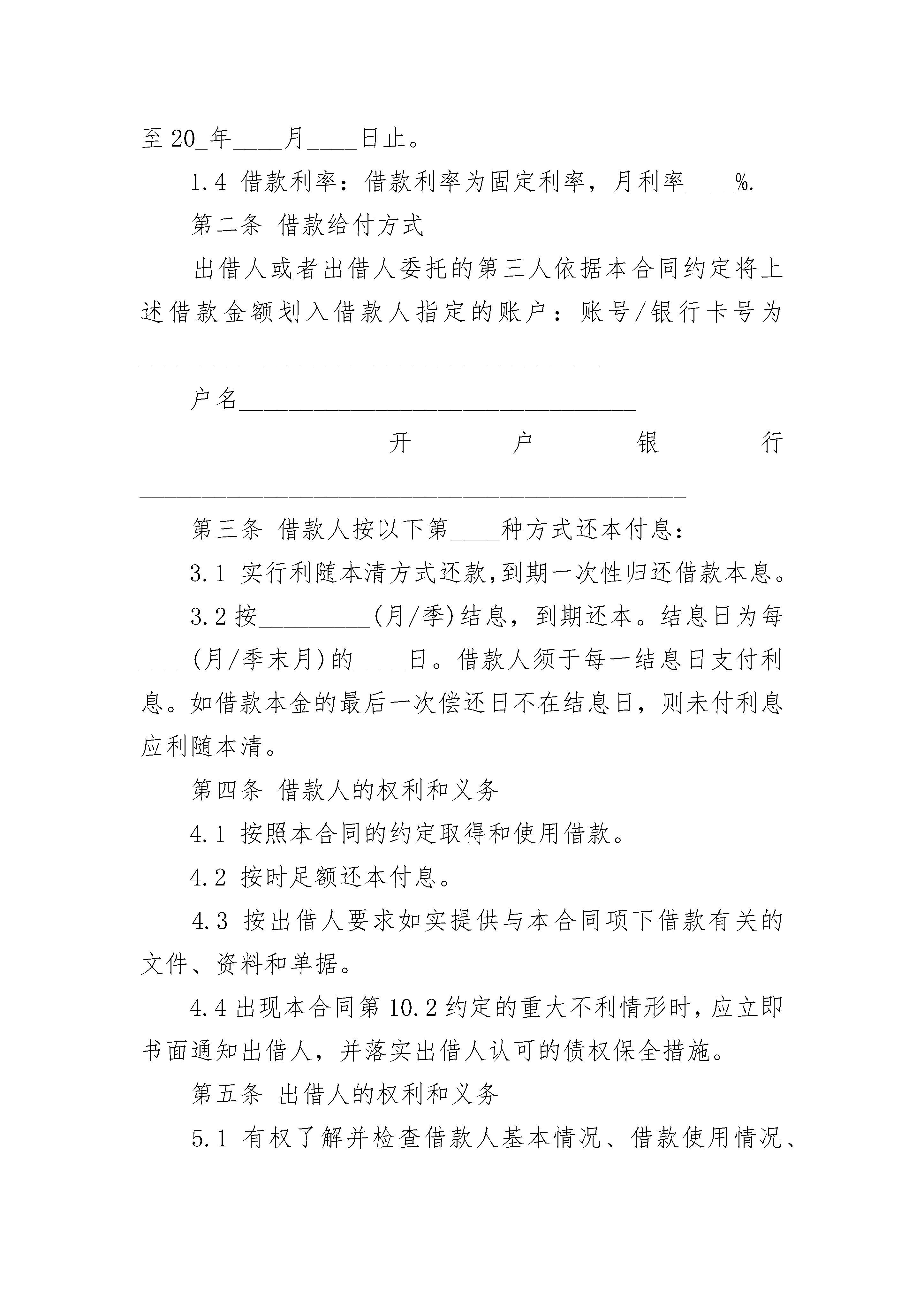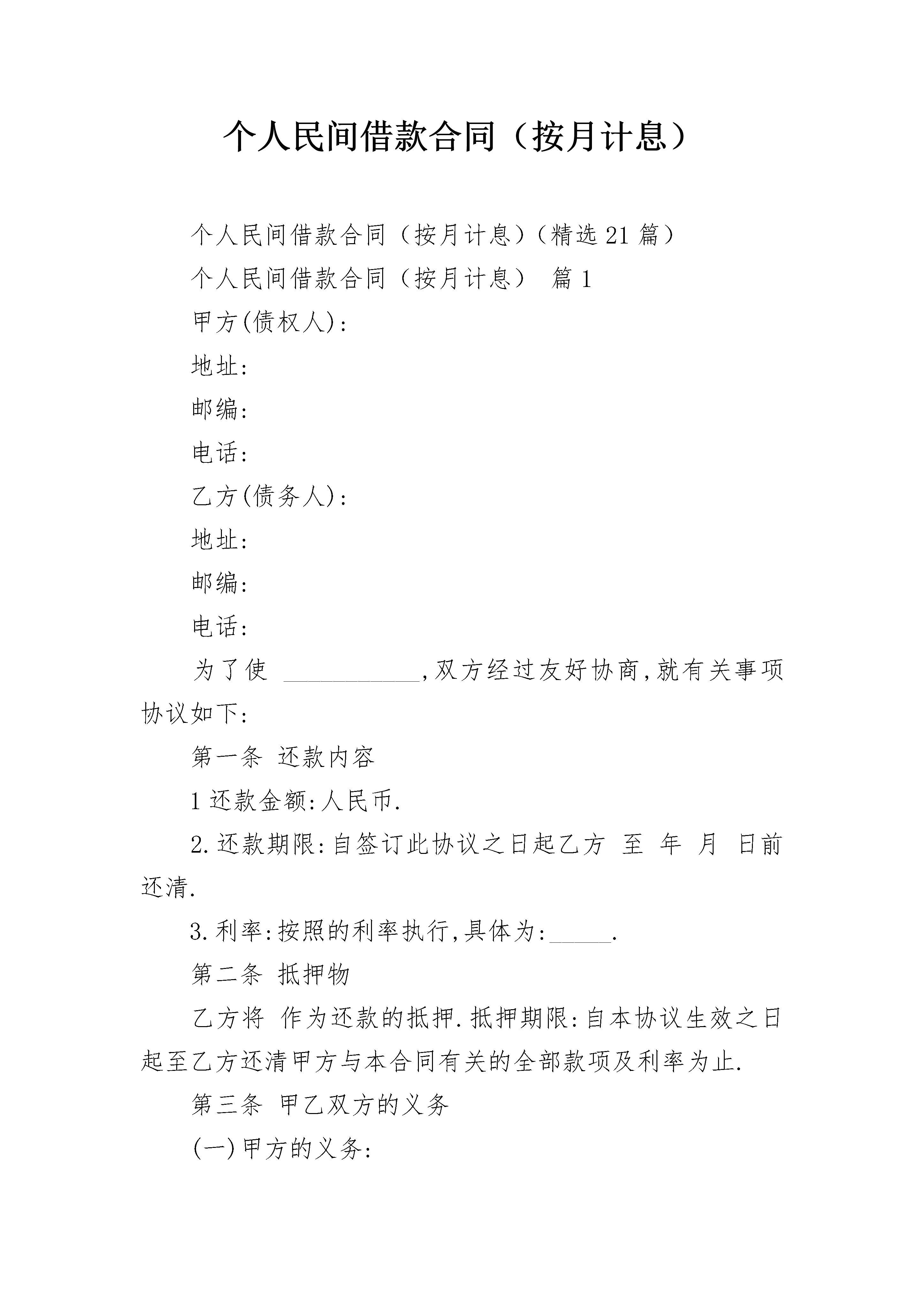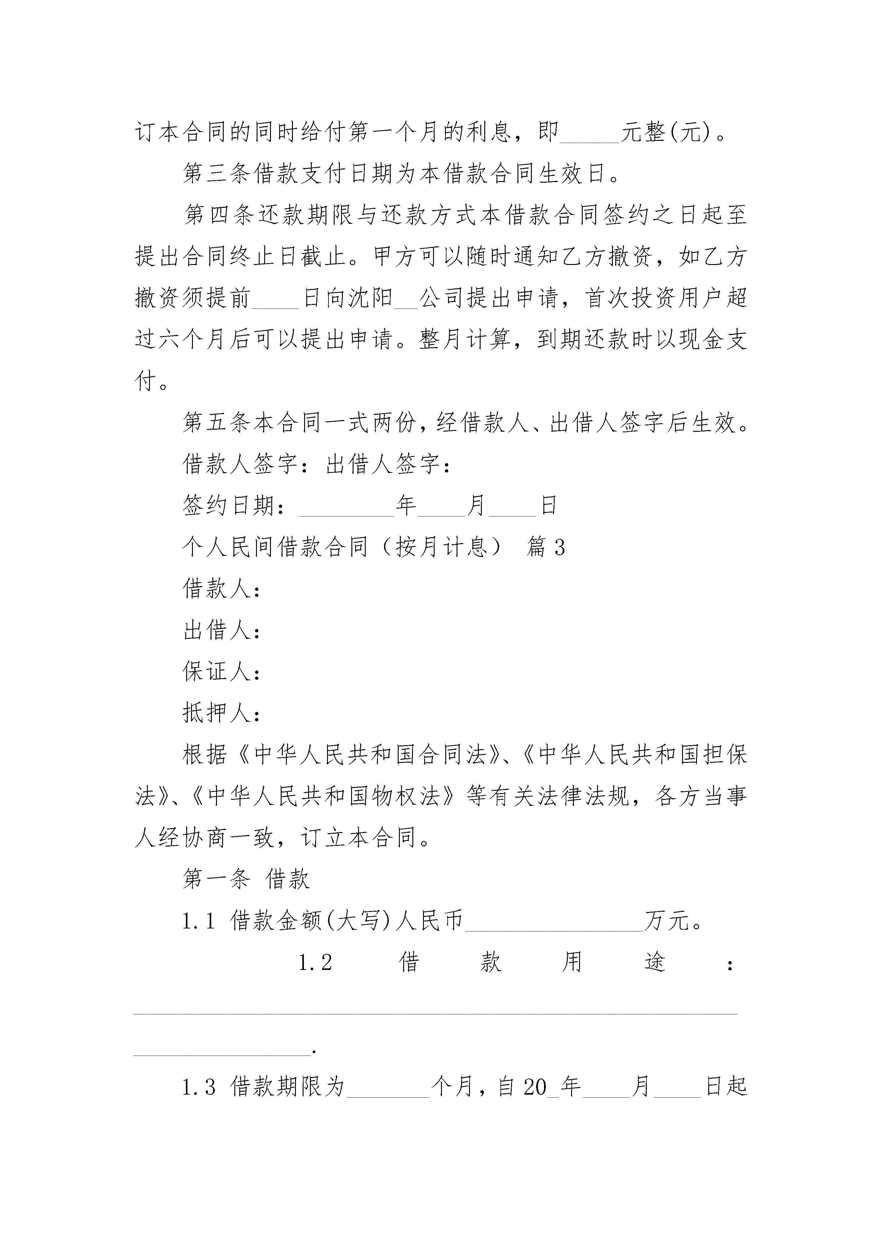 个人民间借款合同(按月计息)个人民间借款合同(按月计息)(精选21篇)个人民间借款合同(按月计息)篇1甲方(债权人):地址:邮编:电话:乙方(债务人):地址:邮编:电话:为了使___________,双方经过友好协商,就有关事项协议如下:第一条还款内容1还款金额:人民币.2.还款期限:自签订此协议之日起乙方至年月日前还清.3.利率:按照的利率执行,具体为:_____.第二条抵押物乙方将作为还款的抵押.抵押期限:自本协议生效之日起至乙方还清甲方与本合同有关的全部款项及利率为止.第三条甲乙双方的义务(一)甲方的义务:1.对甲方交来抵押物的单证妥善保管,不得遗失,损毁.2.在甲方到期还清所有本协议规定的款项后,将抵押物的单证完整交给甲方.(二)乙方的义务:1.应按照本协议规定时间主动偿还对甲方的欠款及利率.2.乙方在签订协议之日起交付抵押物的所有权证书.第四条违约责任乙方如因本身责任不按合同规定支付给甲方欠款及利息的,乙方应负责违约责任.第七条本合同经___________见证后生效.本合同一式六份,甲,乙双方各执二份,见证单位留存二份.甲方:(公章)代表人:乙方:(公章)代表人:个人民间借款合同(按月计息)篇2借款人(甲方):地址:电话:出借人(乙方):电话:地址:合同签订时间:20________年____月____日借款人、出借人经一致协商,订立本合同,约定如下条款双方共同遵守:第一条借款金额金额(大写)_____元整(小写)_____元。第二条借款利率及结息借款利率为2%,按月结息。在签订本合同的同时给付第一个月的利息,即_____元整(元)。第三条借款支付日期为本借款合同生效日。第四条还款期限与还款方式本借款合同签约之日起至提出合同终止日截止。甲方可以随时通知乙方撤资,如乙方撤资须提前____日向沈阳__公司提出申请,首次投资用户超过六个月后可以提出申请。整月计算,到期还款时以现金支付。第五条本合同一式两份,经借款人、出借人签字后生效。借款人签字:出借人签字:签约日期:________年____月____日个人民间借款合同(按月计息)篇3借款人:出借人:保证人:抵押人:根据《中华人民共和国合同法》、《中华人民共和国担保法》、《中华人民共和国物权法》等有关法律法规,各方当事人经协商一致,订立本合同。第一条借款1.1借款金额(大写)人民币_______________万元。1.2借款用途:__________________________________________________________________.1.3借款期限为_______个月,自20_年____月____日起至20_年____月____日止。1.4借款利率:借款利率为固定利率,月利率____%.第二条借款给付方式出借人或者出借人委托的第三人依据本合同约定将上述借款金额划入借款人指定的账户:账号/银行卡号为_____________________________________户名________________________________开户银行____________________________________________第三条借款人按以下第____种方式还本付息:3.1实行利随本清方式还款,到期一次性归还借款本息。3.2按_________(月/季)结息,到期还本。结息日为每____(月/季末月)的____日。借款人须于每一结息日支付利息。如借款本金的最后一次偿还日不在结息日,则未付利息应利随本清。第四条借款人的权利和义务4.1按照本合同的约定取得和使用借款。4.2按时足额还本付息。4.3按出借人要求如实提供与本合同项下借款有关的文件、资料和单据。4.4出现本合同第10.2约定的重大不利情形时,应立即书面通知出借人,并落实出借人认可的债权保全措施。第五条出借人的权利和义务5.1有权了解并检查借款人基本情况、借款使用情况、保证人情况。5.2借款人出现本合同第10.2所指重大不利情形,出借人可以停止发放借款或者提前收回借款。5.3按照本合同约定收回或者提前收回借款本金、利息、罚息、复利,并有权要求借款人支付违约金、损害赔偿金以及诉讼(仲裁)费、律师费、保管费、处置费、过户费等出借人实现债权和担保权的费用。5.4借款人归还的款项不足以清偿本合同项下应付数额的,按照实现债权(包括担保权)的费用、违约金、复利、罚息、利息、本金的先后顺序归还,即先抵费用,后还息,再还本。第六条借款担保6.1具体包括但不限于:(一)保证人为本合同项下借款人债务向出借人提供连带责任保证担保。(二)抵押人以其名下的为本合同项下借款人债务向出借人提供抵押担保;(三)出质人以其所持的为本合同项下借款人债务向出借人提供质押担保。6.2担保的范围,包括:本合同项下借款