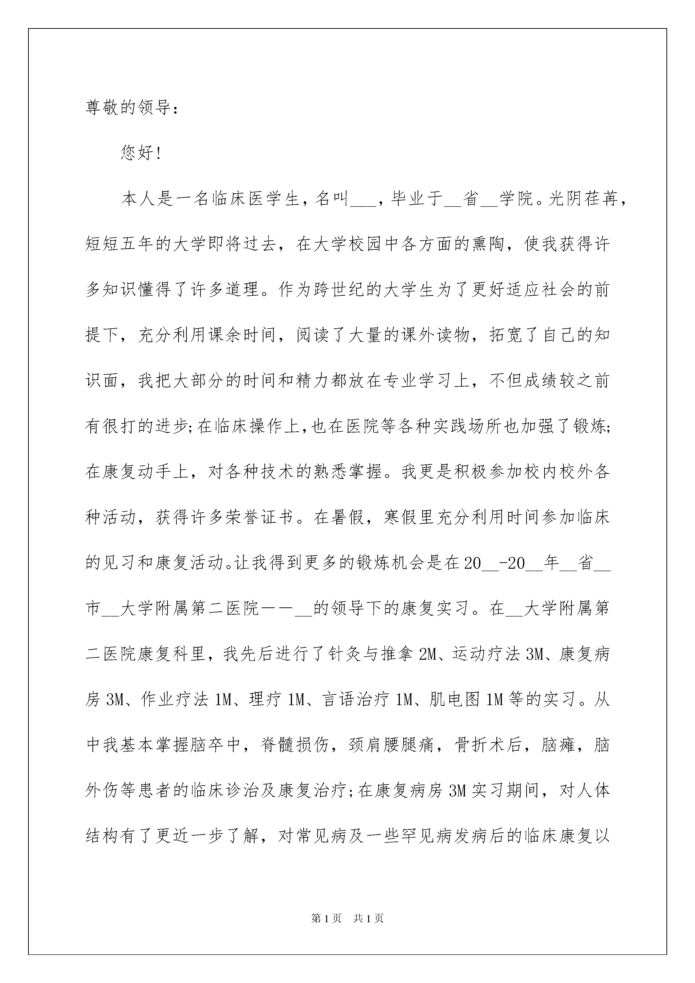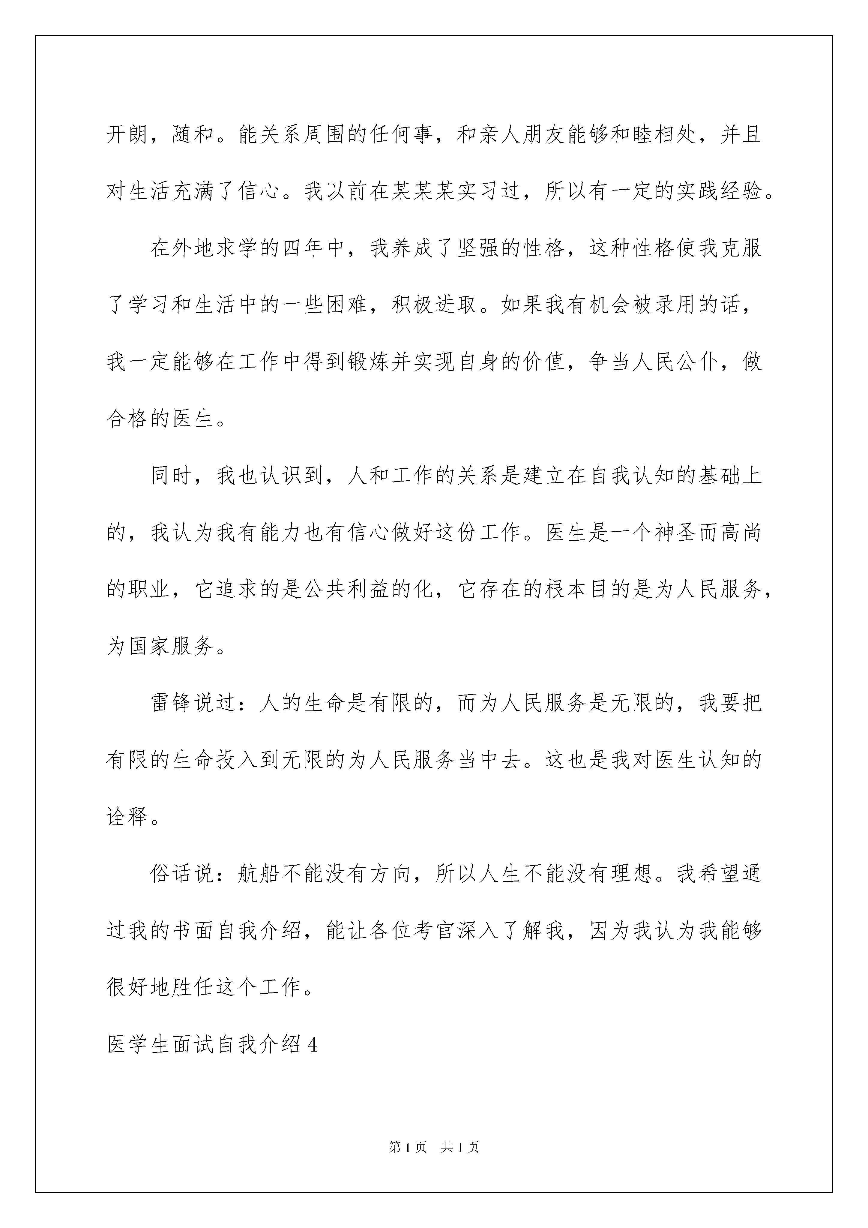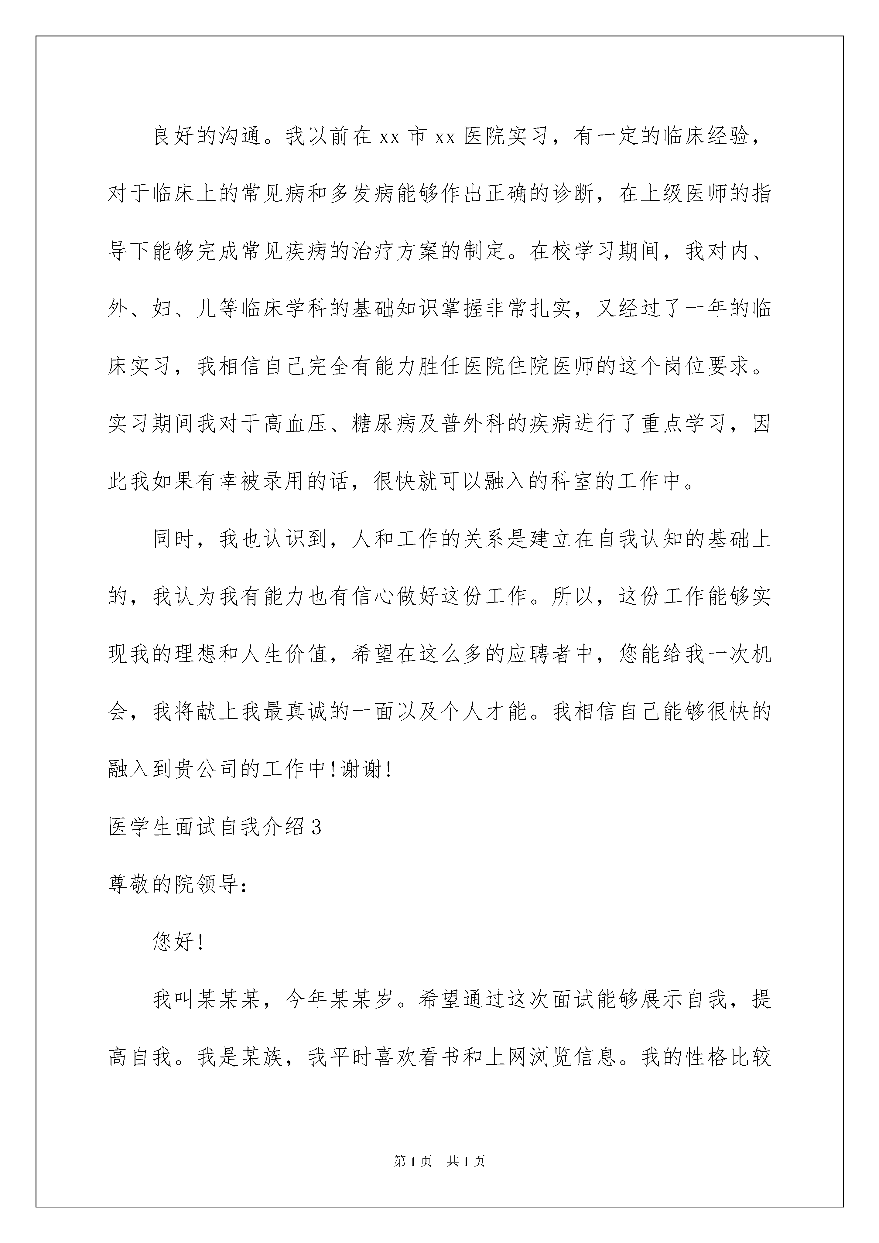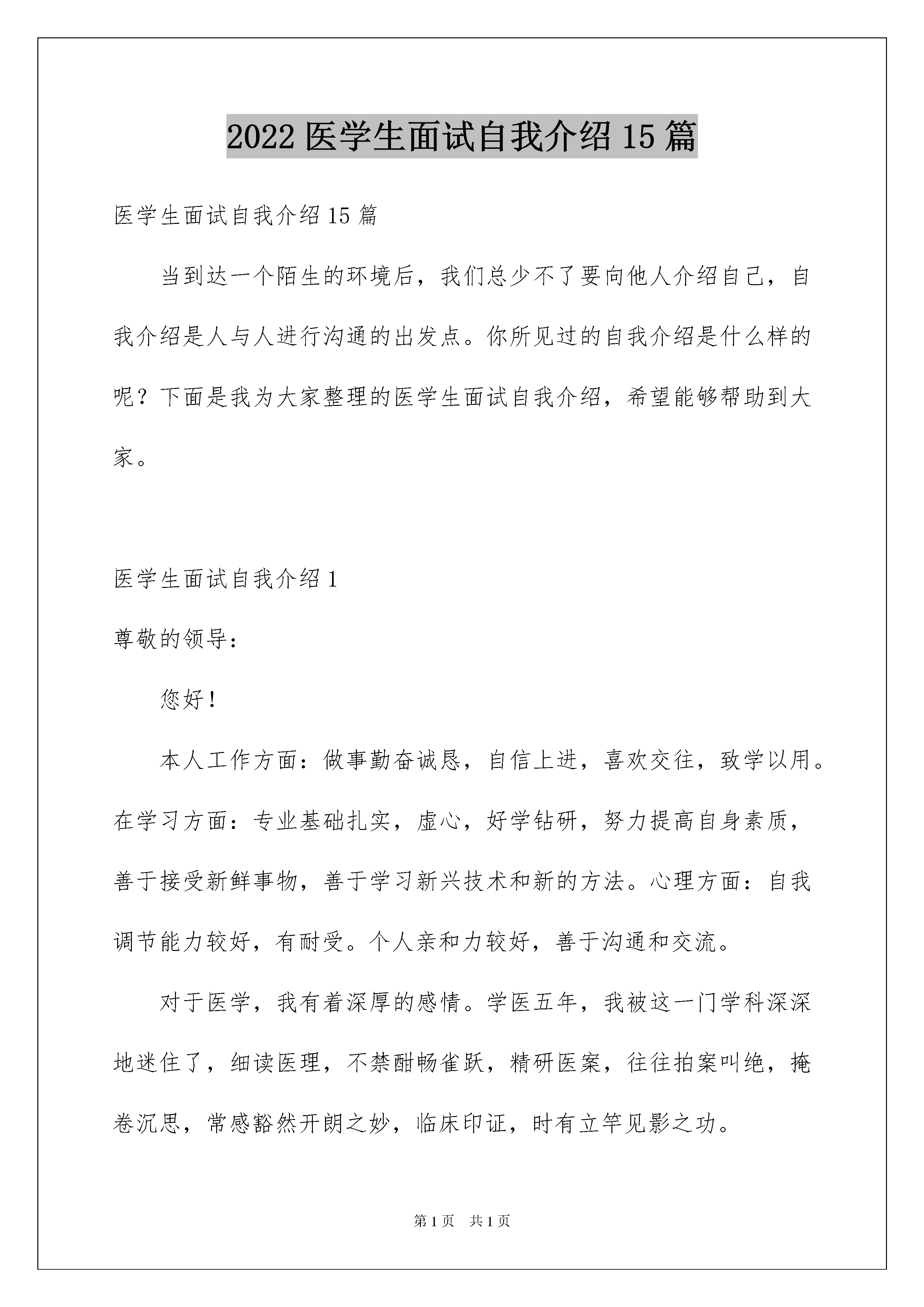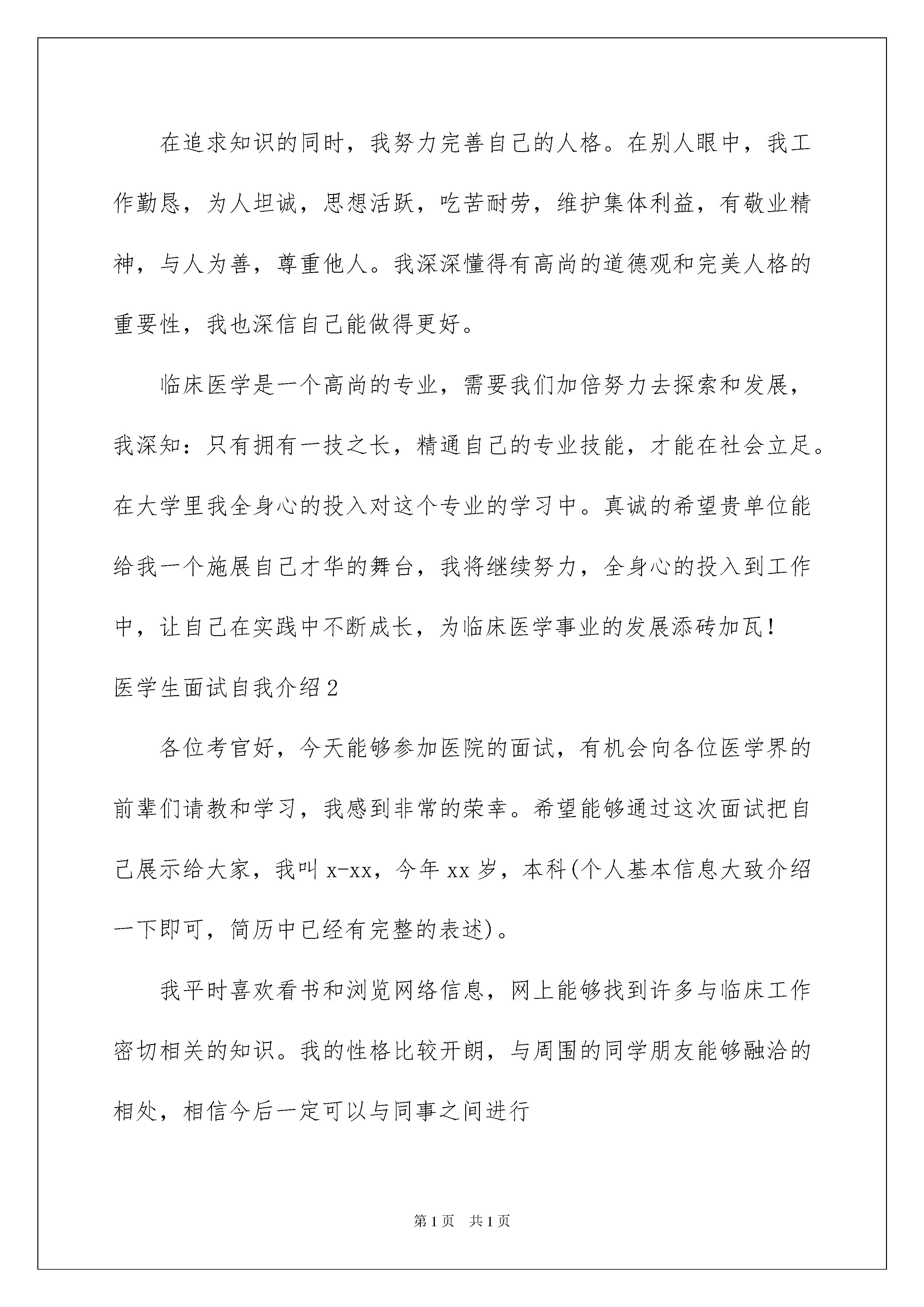 2022医学生面试自我介绍15篇医学生面试自我介绍15篇当到达一个陌生的环境后,我们总少不了要向他人介绍自己,自我介绍是人与人进行沟通的出发点。你所见过的自我介绍是什么样的呢?下面是我为大家整理的医学生面试自我介绍,希望能够帮助到大家。医学生面试自我介绍1尊敬的领导:您好!本人工作方面:做事勤奋诚恳,自信上进,喜欢交往,致学以用。在学习方面:专业基础扎实,虚心,好学钻研,努力提高自身素质,善于接受新鲜事物,善于学习新兴技术和新的方法。心理方面:自我调节能力较好,有耐受。个人亲和力较好,善于沟通和交流。对于医学,我有着深厚的感情。学医五年,我被这一门学科深深地迷住了,细读医理,不禁酣畅雀跃,精研医案,往往拍案叫绝,掩卷沉思,常感豁然开朗之妙,临床印证,时有立竿见影之功。在追求知识的同时,我努力完善自己的人格。在别人眼中,我工作勤恳,为人坦诚,思想活跃,吃苦耐劳,维护集体利益,有敬业精神,与人为善,尊重他人。我深深懂得有高尚的道德观和完美人格的重要性,我也深信自己能做得更好。临床医学是一个高尚的专业,需要我们加倍努力去探索和发展,我深知:只有拥有一技之长,精通自己的专业技能,才能在社会立足。在大学里我全身心的投入对这个专业的学习中。真诚的希望贵单位能给我一个施展自己才华的舞台,我将继续努力,全身心的投入到工作中,让自己在实践中不断成长,为临床医学事业的发展添砖加瓦!医学生面试自我介绍2各位考官好,今天能够参加医院的面试,有机会向各位医学界的前辈们请教和学习,我感到非常的荣幸。希望能够通过这次面试把自己展示给大家,我叫x-xx,今年xx岁,本科(个人基本信息大致介绍一下即可,简历中已经有完整的表述)。我平时喜欢看书和浏览网络信息,网上能够找到许多与临床工作密切相关的知识。我的性格比较开朗,与周围的同学朋友能够融洽的相处,相信今后一定可以与同事之间进行良好的沟通。我以前在xx市xx医院实习,有一定的临床经验,对于临床上的常见病和多发病能够作出正确的诊断,在上级医师的指导下能够完成常见疾病的治疗方案的制定。在校学习期间,我对内、外、妇、儿等临床学科的基础知识掌握非常扎实,又经过了一年的临床实习,我相信自己完全有能力胜任医院住院医师的这个岗位要求。实习期间我对于高血压、糖尿病及普外科的疾病进行了重点学习,因此我如果有幸被录用的话,很快就可以融入的科室的工作中。同时,我也认识到,人和工作的关系是建立在自我认知的基础上的,我认为我有能力也有信心做好这份工作。所以,这份工作能够实现我的理想和人生价值,希望在这么多的应聘者中,您能给我一次机会,我将献上我最真诚的一面以及个人才能。我相信自己能够很快的融入到贵公司的工作中!谢谢!医学生面试自我介绍3尊敬的院领导:您好!我叫某某某,今年某某岁。希望通过这次面试能够展示自我,提高自我。我是某族,我平时喜欢看书和上网浏览信息。我的性格比较开朗,随和。能关系周围的任何事,和亲人朋友能够和睦相处,并且对生活充满了信心。我以前在某某某实习过,所以有一定的实践经验。在外地求学的四年中,我养成了坚强的性格,这种性格使我克服了学习和生活中的一些困难,积极进取。如果我有机会被录用的话,我一定能够在工作中得到锻炼并实现自身的价值,争当人民公仆,做合格的医生。同时,我也认识到,人和工作的关系是建立在自我认知的基础上的,我认为我有能力也有信心做好这份工作。医生是一个神圣而高尚的职业,它追求的是公共利益的化,它存在的根本目的是为人民服务,为国家服务。雷锋说过:人的生命是有限的,而为人民服务是无限的,我要把有限的生命投入到无限的为人民服务当中去。这也是我对医生认知的诠释。俗话说:航船不能没有方向,所以人生不能没有理想。我希望通过我的书面自我介绍,能让各位考官深入了解我,因为我认为我能够很好地胜任这个工作。医学生面试自我介绍4尊敬的领导:您好!本人是一名临床医学生,名叫___,毕业于__省__学院。光阴荏苒,短短五年的大学即将过去,在大学校园中各方面的熏陶,使我获得许多知识懂得了许多道理。作为跨世纪的大学生为了更好适应社会的前提下,充分利用课余时间,阅读了大量的课外读物,拓宽了自己的知识面,我把大部分的时间和精力都放在专业学习上,不但成绩较之前有很打的进步;在临床操作上,也在医院等各种实践场所也加强了锻炼;在康复动手上,对各种技术的熟悉掌握。我更是积极参加校内校外各种活动,获得许多荣誉证书。在暑假,寒假里充分利用时间参加临床的见习和康复活动。让我得到更多的锻炼机会是在20__-20__年__省__市__大学附属第二医院――__的领导下的康复实习。在__大学附属第二医院康复科里