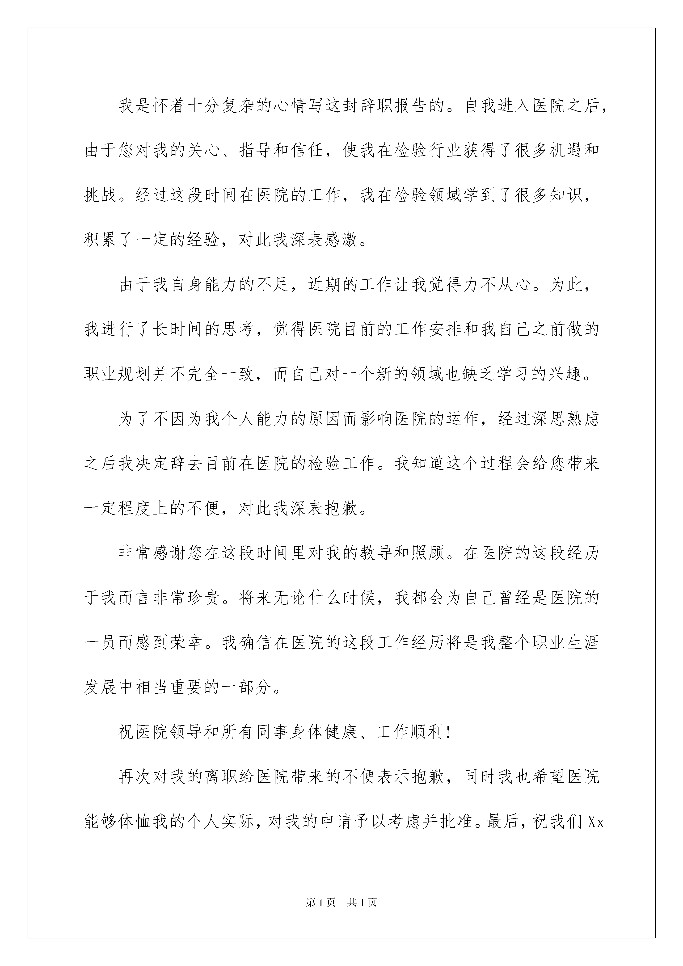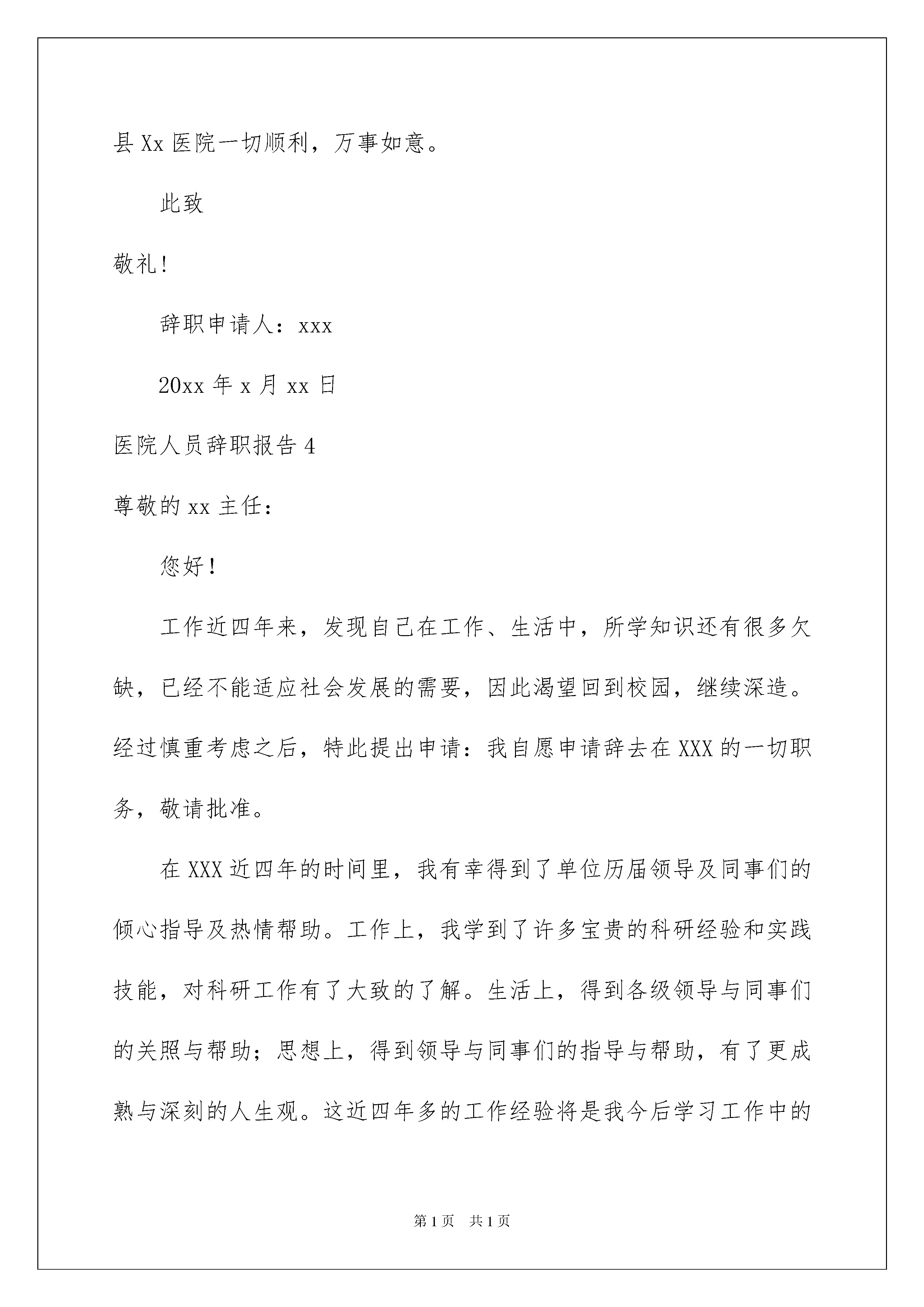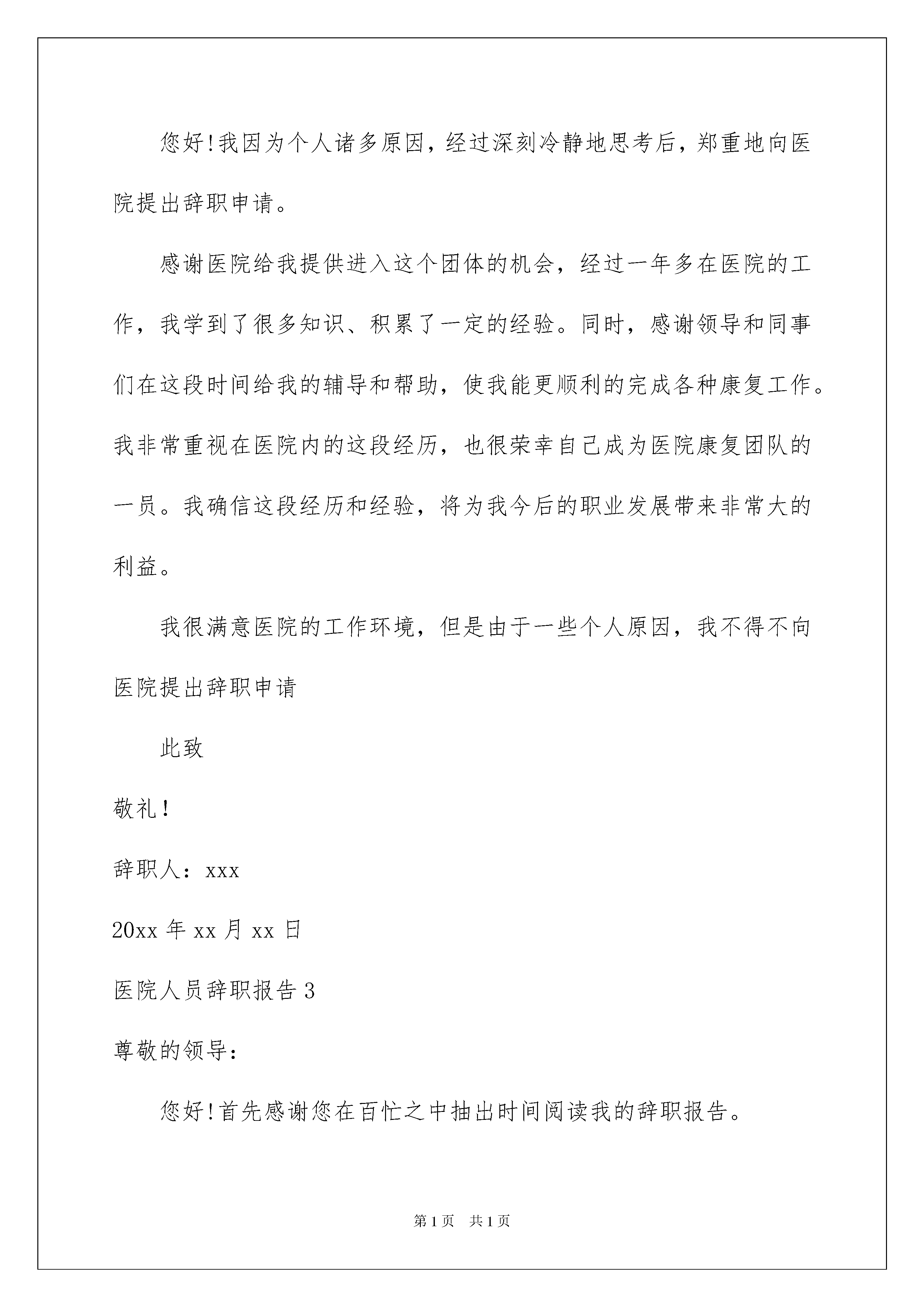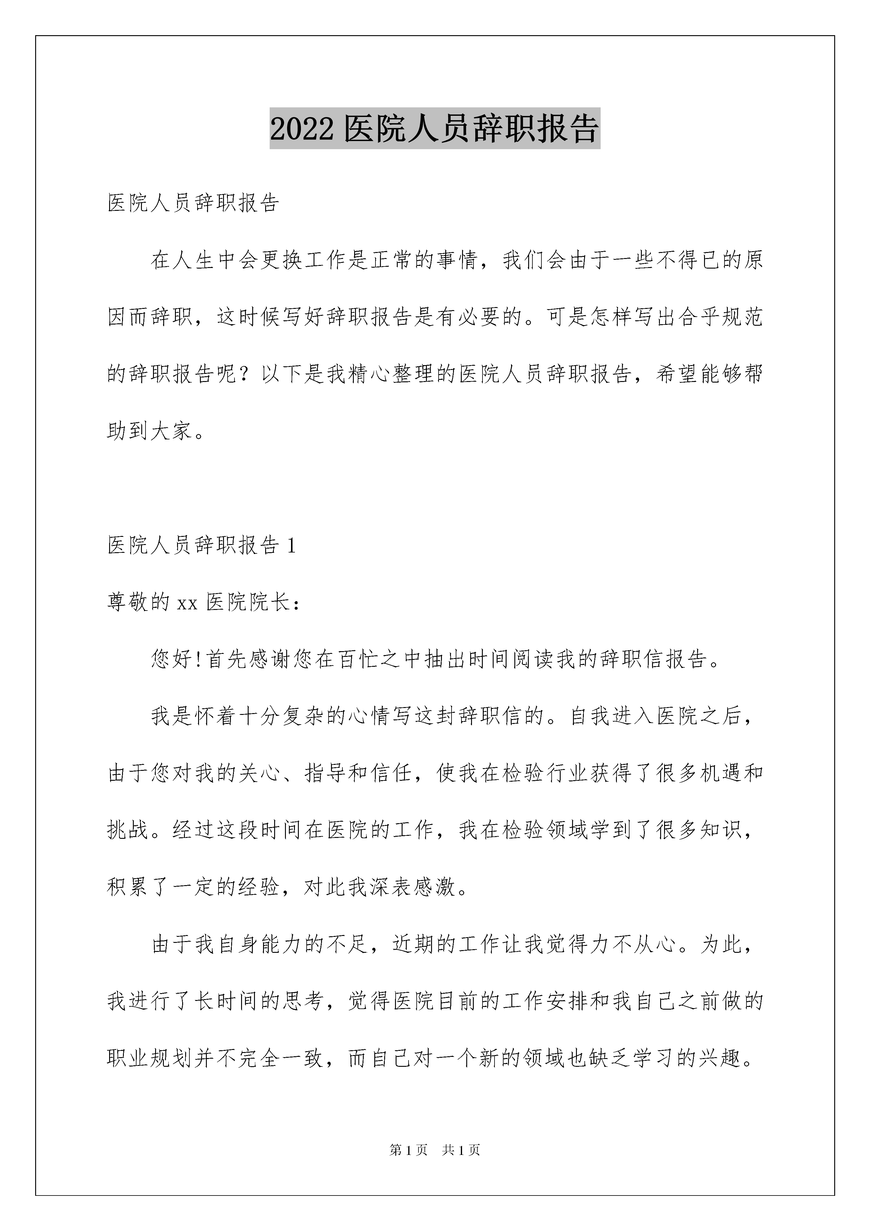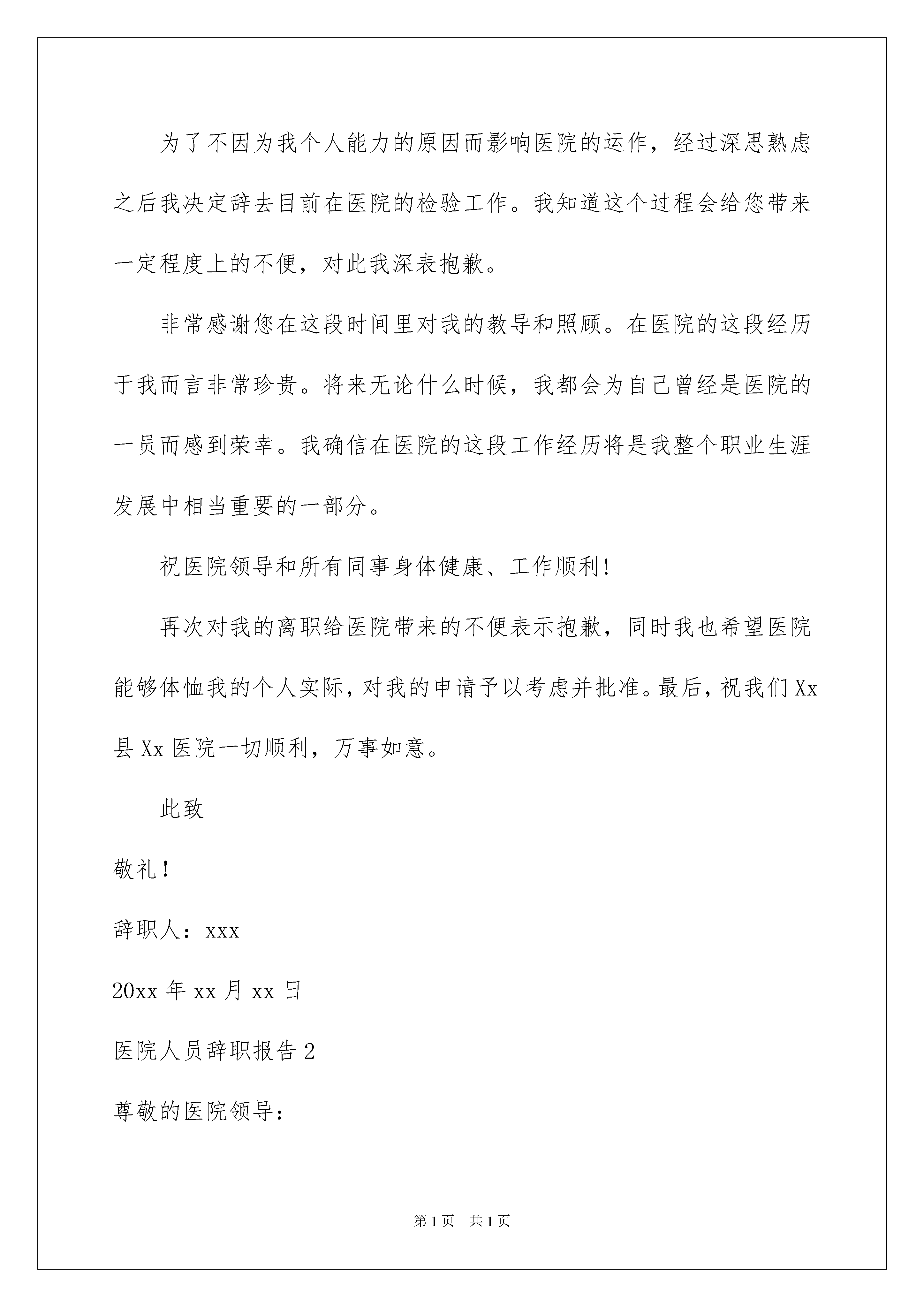 2022医院人员辞职报告医院人员辞职报告在人生中会更换工作是正常的事情,我们会由于一些不得已的原因而辞职,这时候写好辞职报告是有必要的。可是怎样写出合乎规范的辞职报告呢?以下是我精心整理的医院人员辞职报告,希望能够帮助到大家。医院人员辞职报告1尊敬的xx医院院长:您好!首先感谢您在百忙之中抽出时间阅读我的辞职信报告。我是怀着十分复杂的心情写这封辞职信的。自我进入医院之后,由于您对我的关心、指导和信任,使我在检验行业获得了很多机遇和挑战。经过这段时间在医院的工作,我在检验领域学到了很多知识,积累了一定的经验,对此我深表感激。由于我自身能力的不足,近期的工作让我觉得力不从心。为此,我进行了长时间的思考,觉得医院目前的工作安排和我自己之前做的职业规划并不完全一致,而自己对一个新的领域也缺乏学习的兴趣。为了不因为我个人能力的原因而影响医院的运作,经过深思熟虑之后我决定辞去目前在医院的检验工作。我知道这个过程会给您带来一定程度上的不便,对此我深表抱歉。非常感谢您在这段时间里对我的教导和照顾。在医院的这段经历于我而言非常珍贵。将来无论什么时候,我都会为自己曾经是医院的一员而感到荣幸。我确信在医院的这段工作经历将是我整个职业生涯发展中相当重要的一部分。祝医院领导和所有同事身体健康、工作顺利!再次对我的离职给医院带来的不便表示抱歉,同时我也希望医院能够体恤我的个人实际,对我的申请予以考虑并批准。最后,祝我们Xx县Xx医院一切顺利,万事如意。此致敬礼!辞职人:xxx20xx年xx月xx日医院人员辞职报告2尊敬的医院领导:您好!我因为个人诸多原因,经过深刻冷静地思考后,郑重地向医院提出辞职申请。感谢医院给我提供进入这个团体的机会,经过一年多在医院的工作,我学到了很多知识、积累了一定的经验。同时,感谢领导和同事们在这段时间给我的辅导和帮助,使我能更顺利的完成各种康复工作。我非常重视在医院内的这段经历,也很荣幸自己成为医院康复团队的一员。我确信这段经历和经验,将为我今后的职业发展带来非常大的利益。我很满意医院的工作环境,但是由于一些个人原因,我不得不向医院提出辞职申请此致敬礼!辞职人:xxx20xx年xx月xx日医院人员辞职报告3尊敬的领导:您好!首先感谢您在百忙之中抽出时间阅读我的辞职报告。我是怀着十分复杂的心情写这封辞职报告的。自我进入医院之后,由于您对我的关心、指导和信任,使我在检验行业获得了很多机遇和挑战。经过这段时间在医院的工作,我在检验领域学到了很多知识,积累了一定的经验,对此我深表感激。由于我自身能力的不足,近期的工作让我觉得力不从心。为此,我进行了长时间的思考,觉得医院目前的工作安排和我自己之前做的职业规划并不完全一致,而自己对一个新的领域也缺乏学习的兴趣。为了不因为我个人能力的原因而影响医院的运作,经过深思熟虑之后我决定辞去目前在医院的检验工作。我知道这个过程会给您带来一定程度上的不便,对此我深表抱歉。非常感谢您在这段时间里对我的教导和照顾。在医院的这段经历于我而言非常珍贵。将来无论什么时候,我都会为自己曾经是医院的一员而感到荣幸。我确信在医院的这段工作经历将是我整个职业生涯发展中相当重要的一部分。祝医院领导和所有同事身体健康、工作顺利!再次对我的离职给医院带来的不便表示抱歉,同时我也希望医院能够体恤我的个人实际,对我的申请予以考虑并批准。最后,祝我们Xx县Xx医院一切顺利,万事如意。此致敬礼!辞职申请人:xxx20xx年x月xx日医院人员辞职报告4尊敬的xx主任:您好!工作近四年来,发现自己在工作、生活中,所学知识还有很多欠缺,已经不能适应社会发展的需要,因此渴望回到校园,继续深造。经过慎重考虑之后,特此提出申请:我自愿申请辞去在XXX的一切职务,敬请批准。在XXX近四年的时间里,我有幸得到了单位历届领导及同事们的倾心指导及热情帮助。工作上,我学到了许多宝贵的科研经验和实践技能,对科研工作有了大致的了解。生活上,得到各级领导与同事们的关照与帮助;思想上,得到领导与同事们的指导与帮助,有了更成熟与深刻的人生观。这近四年多的工作经验将是我今后学习工作中的第一笔宝贵的财富。在这里,特别感谢A主任、B主任、C主任在过去的工作、生活中给予的大力扶持与帮助。尤其感谢主任在近二年来的关照、指导以及对我的信任和在人生道路上对我的指引。感谢所有给予过我帮助的同事们。望领导批准我的申请,并请协助办理相关离职手续,在正式离开之前我将认真继续做好目前的每一项工作。祝您身体健康,事业顺心。并祝事业蓬勃发展。此致敬礼申请人:xxx日期:医院人员辞职报告5尊重的医院领导:你好!首先感谢您在百忙之中抽出时间