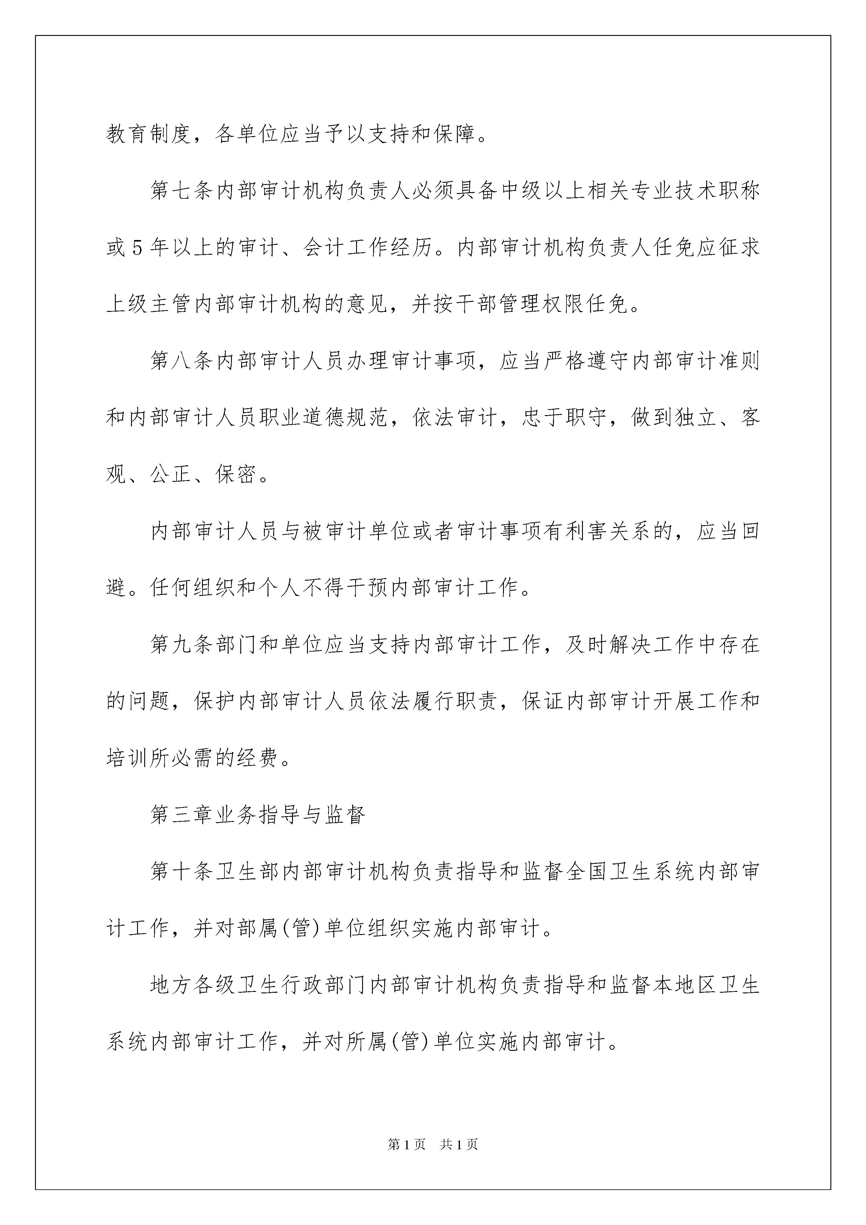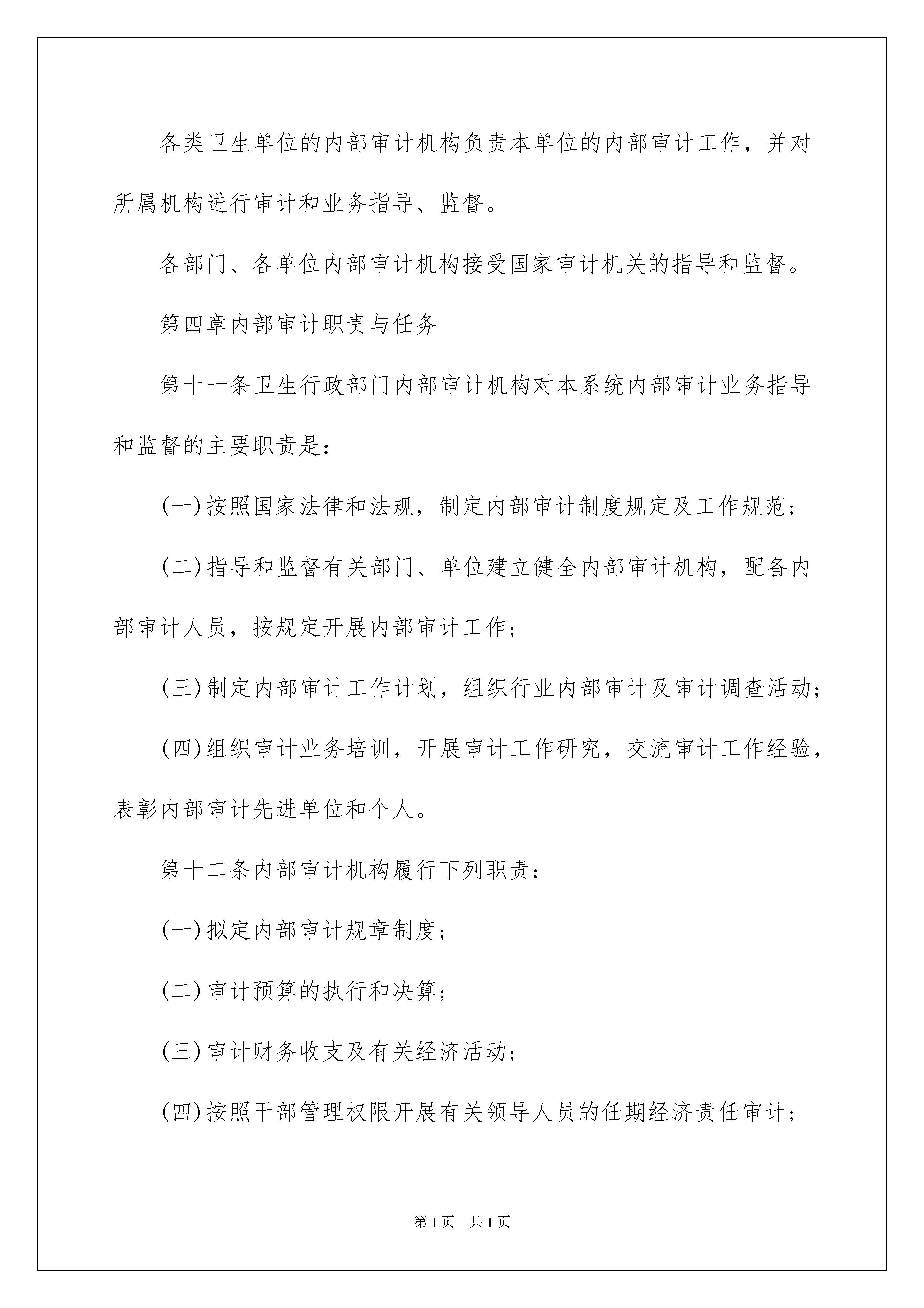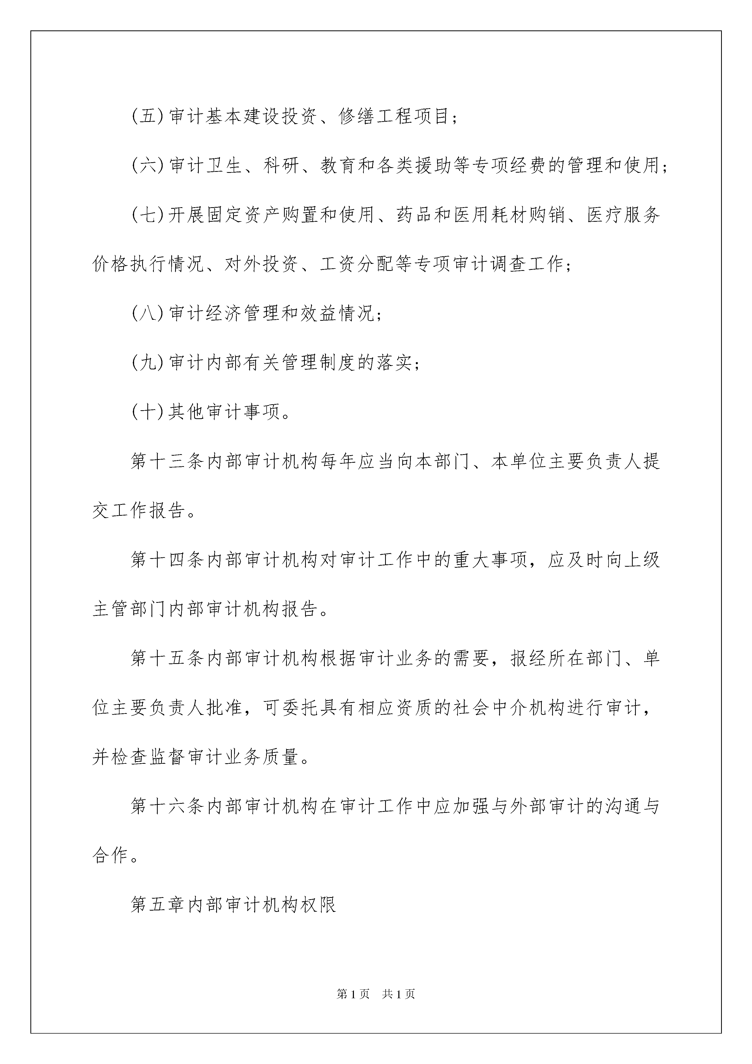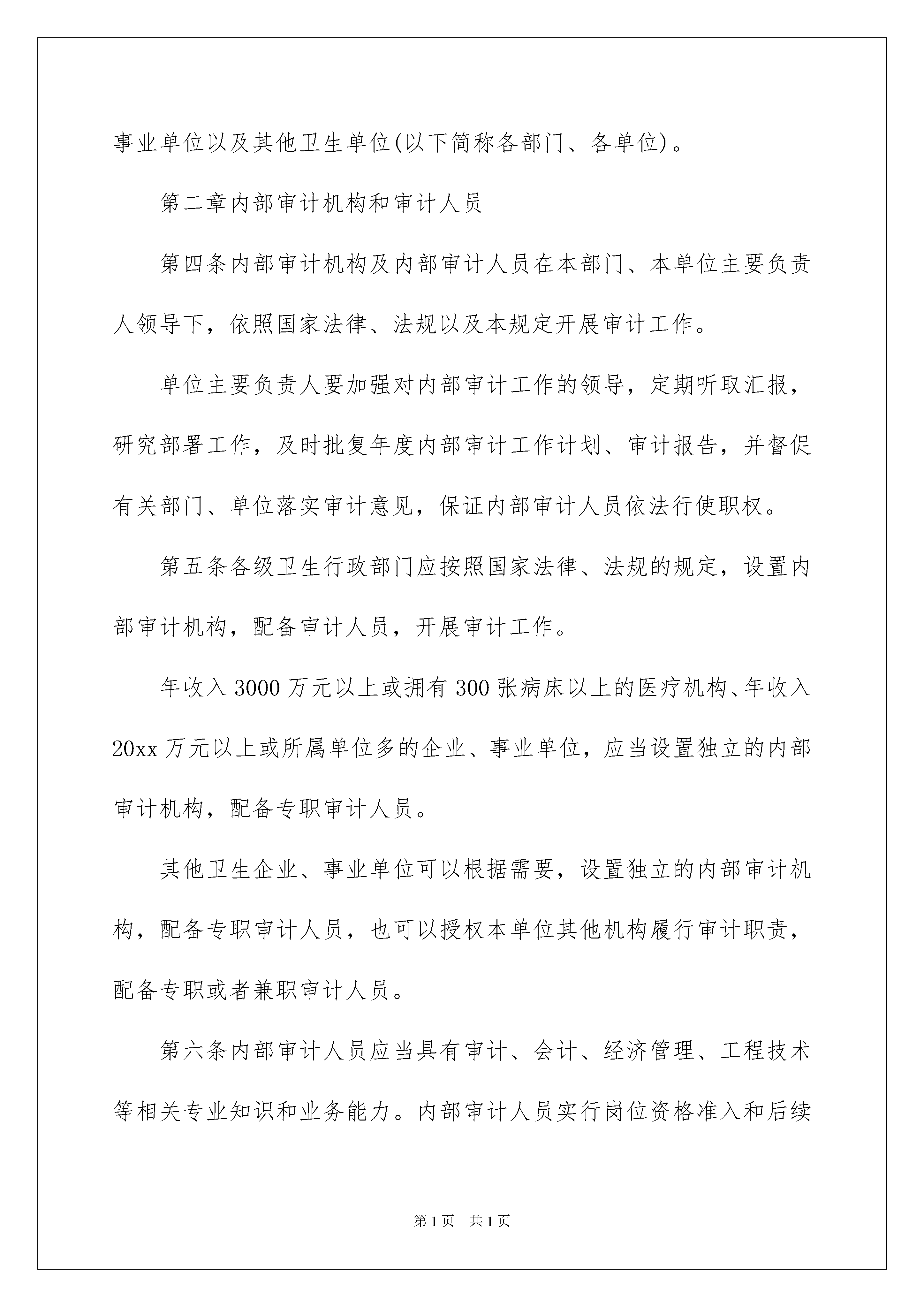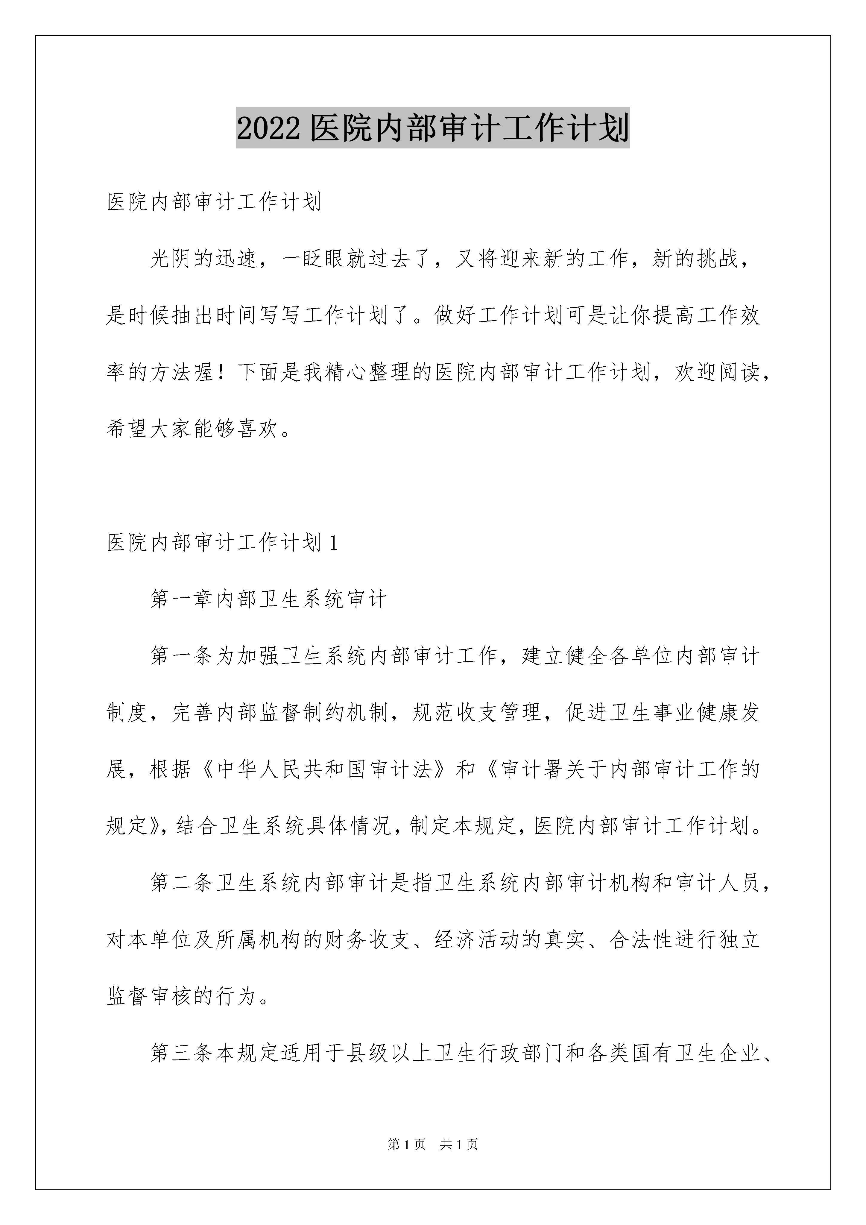 2022医院内部审计工作计划医院内部审计工作计划光阴的迅速,一眨眼就过去了,又将迎来新的工作,新的挑战,是时候抽出时间写写工作计划了。做好工作计划可是让你提高工作效率的方法喔!下面是我精心整理的医院内部审计工作计划,欢迎阅读,希望大家能够喜欢。医院内部审计工作计划1第一章内部卫生系统审计第一条为加强卫生系统内部审计工作,建立健全各单位内部审计制度,完善内部监督制约机制,规范收支管理,促进卫生事业健康发展,根据《中华人民共和国审计法》和《审计署关于内部审计工作的规定》,结合卫生系统具体情况,制定本规定,医院内部审计工作计划。第二条卫生系统内部审计是指卫生系统内部审计机构和审计人员,对本单位及所属机构的财务收支、经济活动的真实、合法性进行独立监督审核的行为。第三条本规定适用于县级以上卫生行政部门和各类国有卫生企业、事业单位以及其他卫生单位(以下简称各部门、各单位)。第二章内部审计机构和审计人员第四条内部审计机构及内部审计人员在本部门、本单位主要负责人领导下,依照国家法律、法规以及本规定开展审计工作。单位主要负责人要加强对内部审计工作的领导,定期听取汇报,研究部署工作,及时批复年度内部审计工作计划、审计报告,并督促有关部门、单位落实审计意见,保证内部审计人员依法行使职权。第五条各级卫生行政部门应按照国家法律、法规的规定,设置内部审计机构,配备审计人员,开展审计工作。年收入3000万元以上或拥有300张病床以上的医疗机构、年收入20xx万元以上或所属单位多的企业、事业单位,应当设置独立的内部审计机构,配备专职审计人员。其他卫生企业、事业单位可以根据需要,设置独立的内部审计机构,配备专职审计人员,也可以授权本单位其他机构履行审计职责,配备专职或者兼职审计人员。第六条内部审计人员应当具有审计、会计、经济管理、工程技术等相关专业知识和业务能力。内部审计人员实行岗位资格准入和后续教育制度,各单位应当予以支持和保障。第七条内部审计机构负责人必须具备中级以上相关专业技术职称或5年以上的审计、会计工作经历。内部审计机构负责人任免应征求上级主管内部审计机构的意见,并按干部管理权限任免。第八条内部审计人员办理审计事项,应当严格遵守内部审计准则和内部审计人员职业道德规范,依法审计,忠于职守,做到独立、客观、公正、保密。内部审计人员与被审计单位或者审计事项有利害关系的,应当回避。任何组织和个人不得干预内部审计工作。第九条部门和单位应当支持内部审计工作,及时解决工作中存在的问题,保护内部审计人员依法履行职责,保证内部审计开展工作和培训所必需的经费。第三章业务指导与监督第十条卫生部内部审计机构负责指导和监督全国卫生系统内部审计工作,并对部属(管)单位组织实施内部审计。地方各级卫生行政部门内部审计机构负责指导和监督本地区卫生系统内部审计工作,并对所属(管)单位实施内部审计。各类卫生单位的内部审计机构负责本单位的内部审计工作,并对所属机构进行审计和业务指导、监督。各部门、各单位内部审计机构接受国家审计机关的指导和监督。第四章内部审计职责与任务第十一条卫生行政部门内部审计机构对本系统内部审计业务指导和监督的主要职责是:(一)按照国家法律和法规,制定内部审计制度规定及工作规范;(二)指导和监督有关部门、单位建立健全内部审计机构,配备内部审计人员,按规定开展内部审计工作;(三)制定内部审计工作计划,组织行业内部审计及审计调查活动;(四)组织审计业务培训,开展审计工作研究,交流审计工作经验,表彰内部审计先进单位和个人。第十二条内部审计机构履行下列职责:(一)拟定内部审计规章制度;(二)审计预算的执行和决算;(三)审计财务收支及有关经济活动;(四)按照干部管理权限开展有关领导人员的任期经济责任审计;(五)审计基本建设投资、修缮工程项目;(六)审计卫生、科研、教育和各类援助等专项经费的管理和使用;(七)开展固定资产购置和使用、药品和医用耗材购销、医疗服务价格执行情况、对外投资、工资分配等专项审计调查工作;(八)审计经济管理和效益情况;(九)审计内部有关管理制度的落实;(十)其他审计事项。第十三条内部审计机构每年应当向本部门、本单位主要负责人提交工作报告。第十四条内部审计机构对审计工作中的重大事项,应及时向上级主管部门内部审计机构报告。第十五条内部审计机构根据审计业务的需要,报经所在部门、单位主要负责人批准,可委托具有相应资质的社会中介机构进行审计,并检查监督审计业务质量。第十六条内部审计机构在审计工作中应加强与外部审计的沟通与合作。第五章内部审计机构权限第十七条内部审计机构在履行审计职责时,具有下列权限:(一)要求被审计