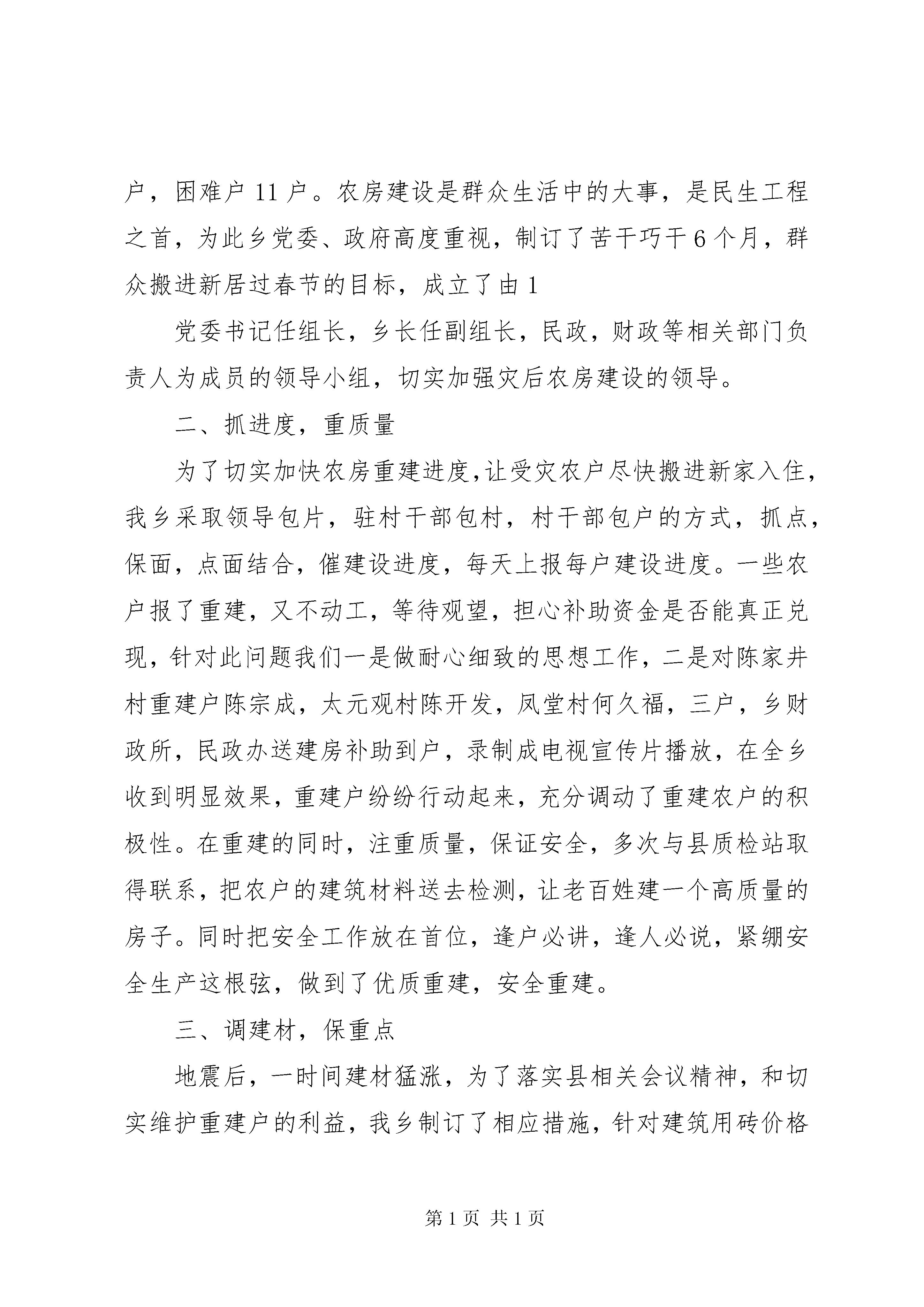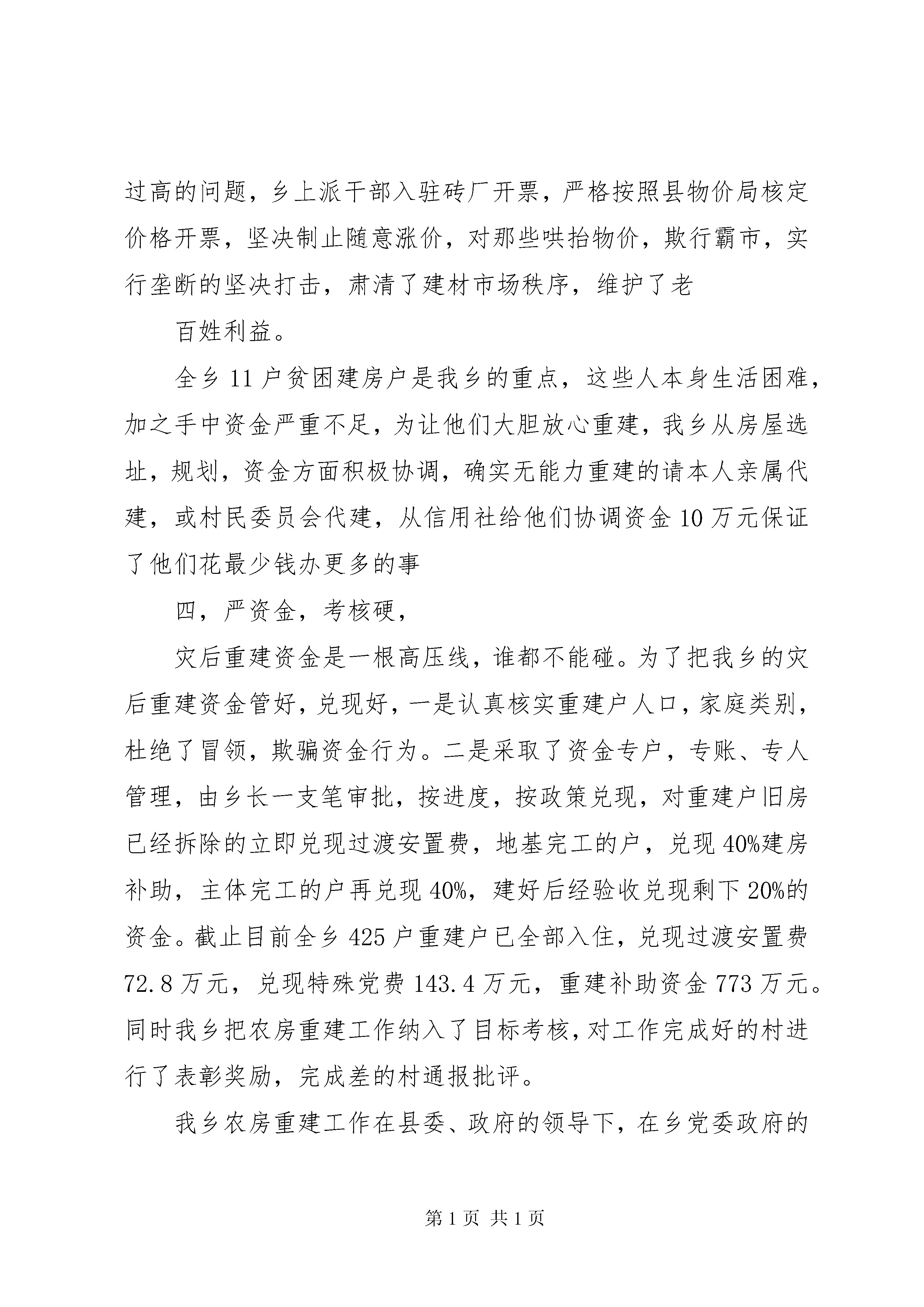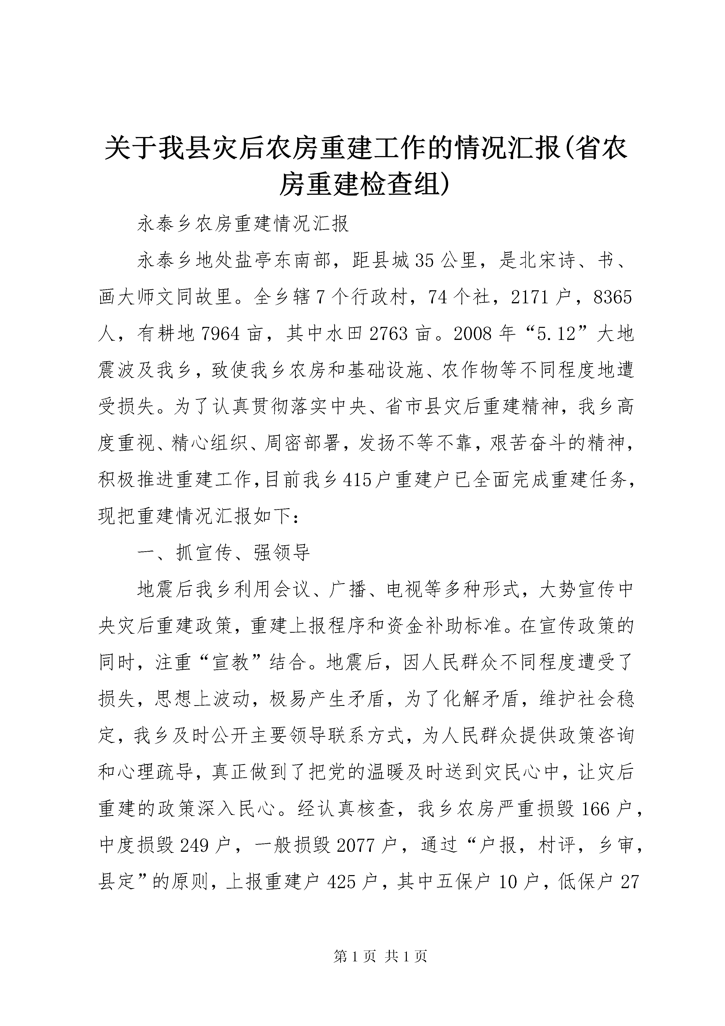 关于我县灾后农房重建工作的情况汇报(省农房重建检查组)永泰乡农房重建情况汇报永泰乡地处盐亭东南部,距县城35公里,是北宋诗、书、画大师文同故里。全乡辖7个行政村,74个社,2171户,8365人,有耕地7964亩,其中水田2763亩。2008年“5.12”大地震波及我乡,致使我乡农房和基础设施、农作物等不同程度地遭受损失。为了认真贯彻落实中央、省市县灾后重建精神,我乡高度重视、精心组织、周密部署,发扬不等不靠,艰苦奋斗的精神,积极推进重建工作,目前我乡415户重建户已全面完成重建任务,现把重建情况汇报如下:一、抓宣传、强领导地震后我乡利用会议、广播、电视等多种形式,大势宣传中央灾后重建政策,重建上报程序和资金补助标准。在宣传政策的同时,注重“宣教”结合。地震后,因人民群众不同程度遭受了损失,思想上波动,极易产生矛盾,为了化解矛盾,维护社会稳定,我乡及时公开主要领导联系方式,为人民群众提供政策咨询和心理疏导,真正做到了把党的温暖及时送到灾民心中,让灾后重建的政策深入民心。经认真核查,我乡农房严重损毁166户,中度损毁249户,一般损毁2077户,通过“户报,村评,乡审,县定”的原则,上报重建户425户,其中五保户10户,低保户27户,困难户11户。农房建设是群众生活中的大事,是民生工程之首,为此乡党委、政府高度重视,制订了苦干巧干6个月,群众搬进新居过春节的目标,成立了由1党委书记任组长,乡长任副组长,民政,财政等相关部门负责人为成员的领导小组,切实加强灾后农房建设的领导。二、抓进度,重质量为了切实加快农房重建进度,让受灾农户尽快搬进新家入住,我乡采取领导包片,驻村干部包村,村干部包户的方式,抓点,保面,点面结合,催建设进度,每天上报每户建设进度。一些农户报了重建,又不动工,等待观望,担心补助资金是否能真正兑现,针对此问题我们一是做耐心细致的思想工作,二是对陈家井村重建户陈宗成,太元观村陈开发,凤堂村何久福,三户,乡财政所,民政办送建房补助到户,录制成电视宣传片播放,在全乡收到明显效果,重建户纷纷行动起来,充分调动了重建农户的积极性。在重建的同时,注重质量,保证安全,多次与县质检站取得联系,把农户的建筑材料送去检测,让老百姓建一个高质量的房子。同时把安全工作放在首位,逢户必讲,逢人必说,紧绷安全生产这根弦,做到了优质重建,安全重建。三、调建材,保重点地震后,一时间建材猛涨,为了落实县相关会议精神,和切实维护重建户的利益,我乡制订了相应措施,针对建筑用砖价格过高的问题,乡上派干部入驻砖厂开票,严格按照县物价局核定价格开票,坚决制止随意涨价,对那些哄抬物价,欺行霸市,实行垄断的坚决打击,肃清了建材市场秩序,维护了老百姓利益。全乡11户贫困建房户是我乡的重点,这些人本身生活困难,加之手中资金严重不足,为让他们大胆放心重建,我乡从房屋选址,规划,资金方面积极协调,确实无能力重建的请本人亲属代建,或村民委员会代建,从信用社给他们协调资金10万元保证了他们花最少钱办更多的事四,严资金,考核硬,灾后重建资金是一根高压线,谁都不能碰。为了把我乡的灾后重建资金管好,兑现好,一是认真核实重建户人口,家庭类别,杜绝了冒领,欺骗资金行为。二是采取了资金专户,专账、专人管理,由乡长一支笔审批,按进度,按政策兑现,对重建户旧房已经拆除的立即兑现过渡安置费,地基完工的户,兑现40%建房补助,主体完工的户再兑现40%,建好后经验收兑现剩下20%的资金。截止目前全乡425户重建户已全部入住,兑现过渡安置费72.8万元,兑现特殊党费143.4万元,重建补助资金773万元。同时我乡把农房重建工作纳入了目标考核,对工作完成好的村进行了表彰奖励,完成差的村通报批评。我乡农房重建工作在县委、政府的领导下,在乡党委政府的高度重视下,圆满完成了工作任务。全乡无一事资金违规行为,无一例因资金上访事件,受到群众好评,实现灾后重建一年完成的目标,给力我乡经济社会又好又快发展。