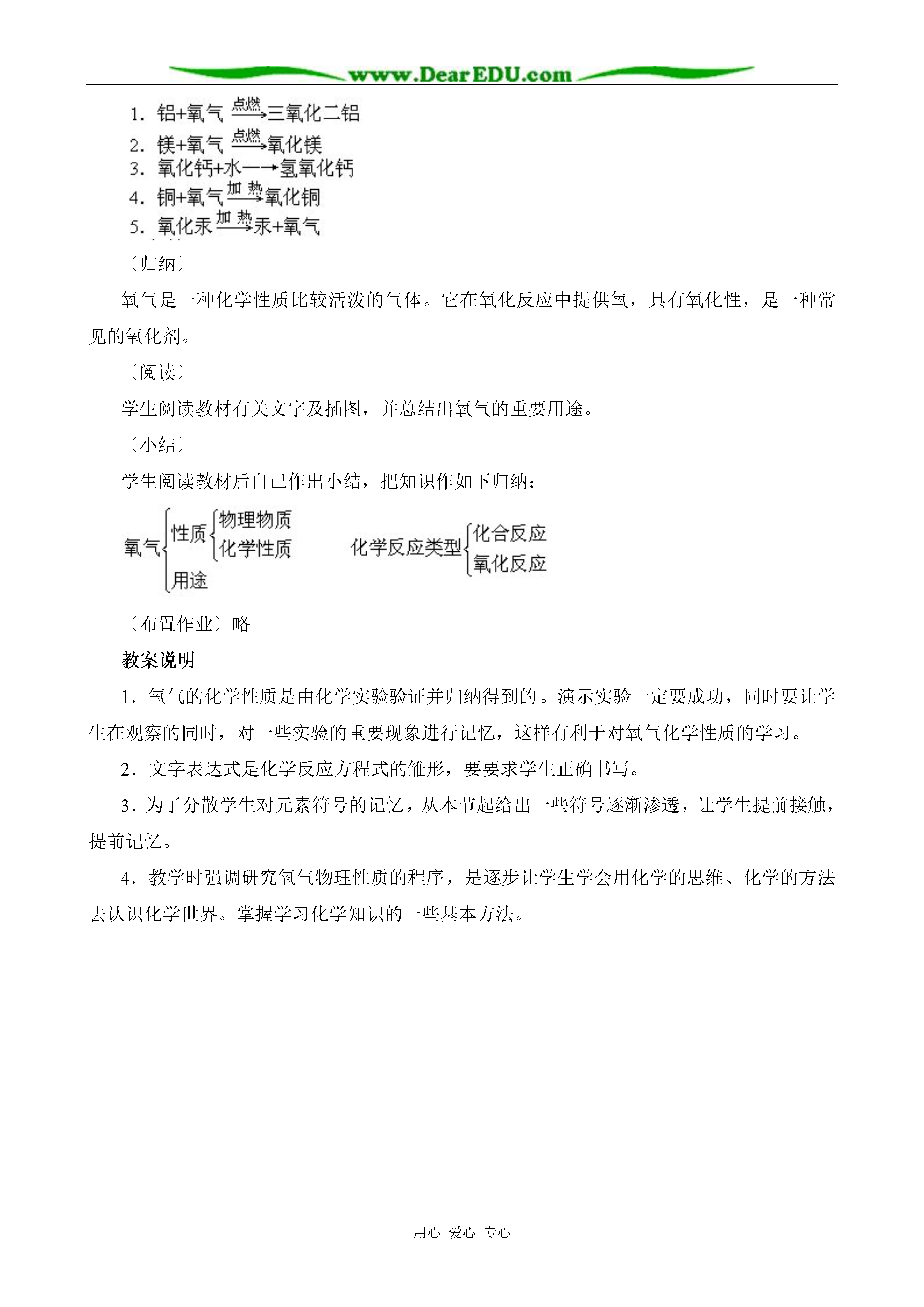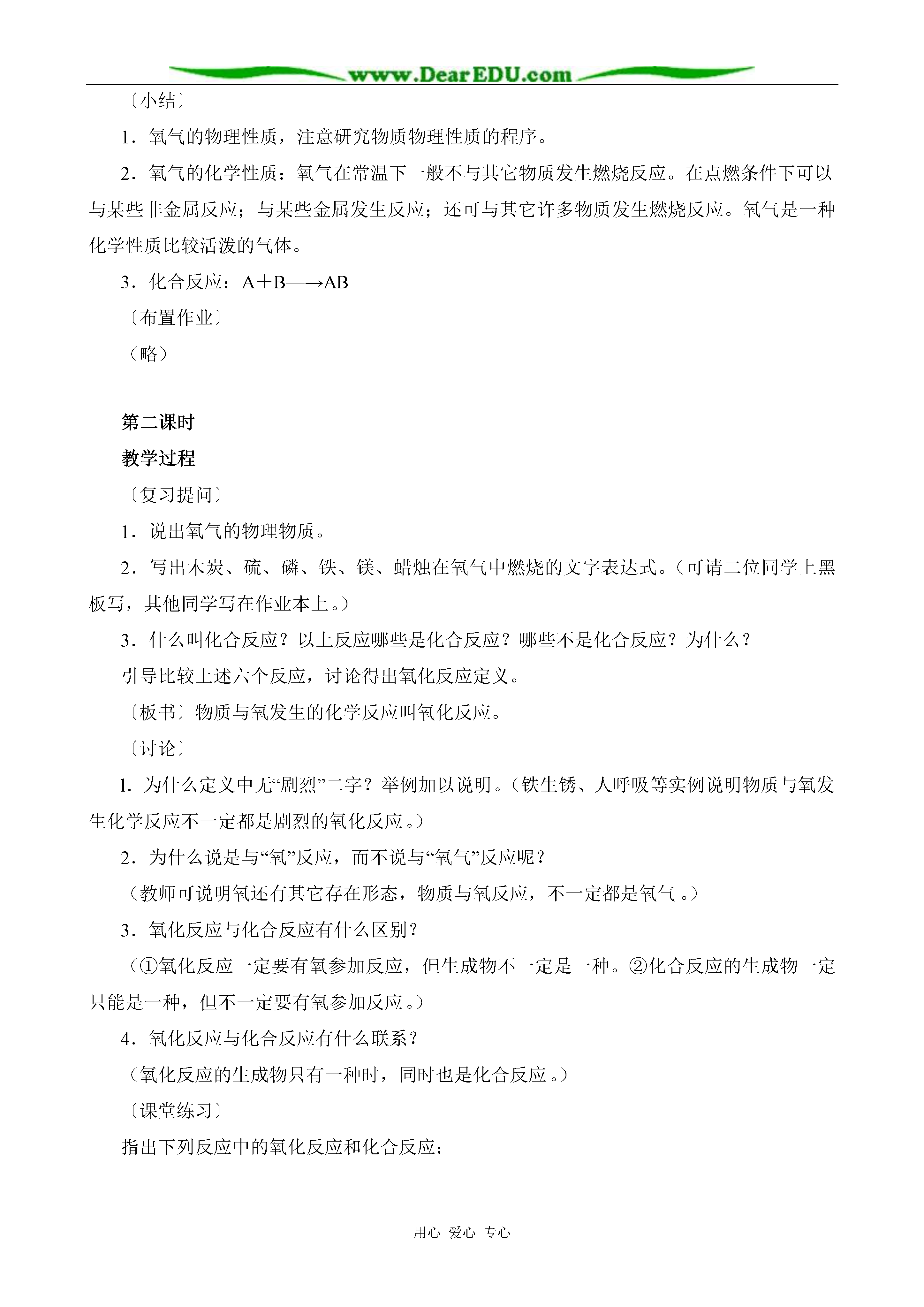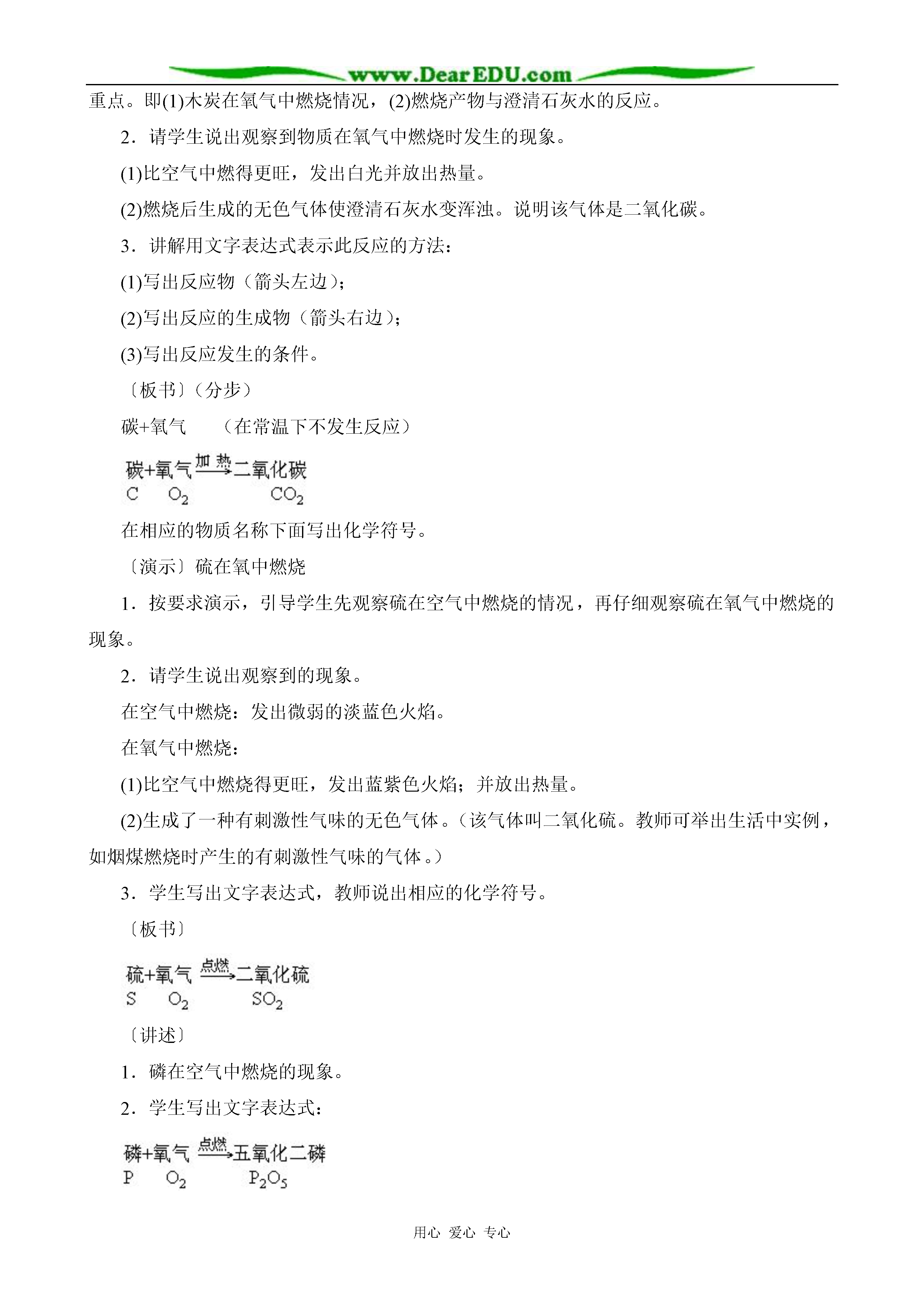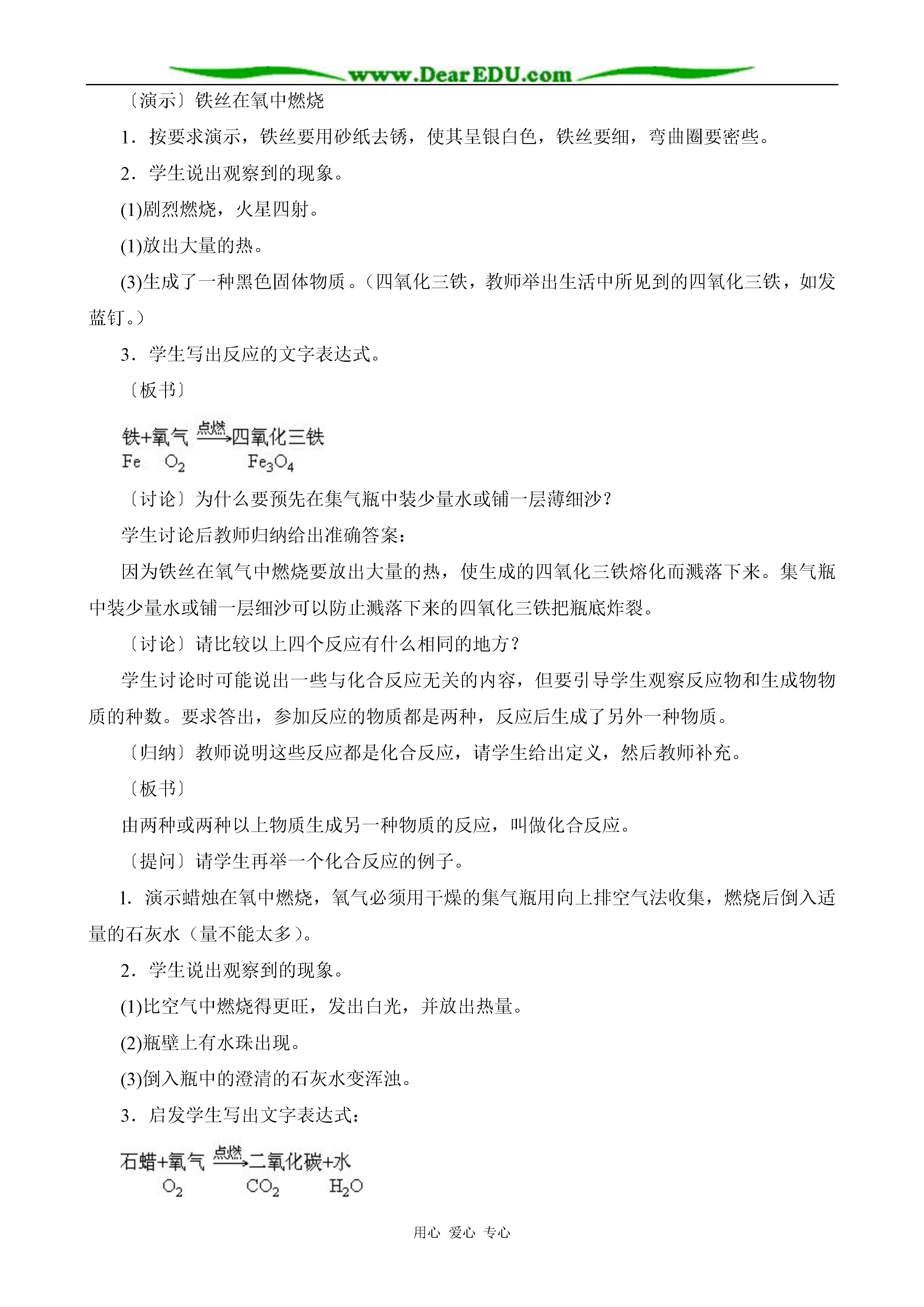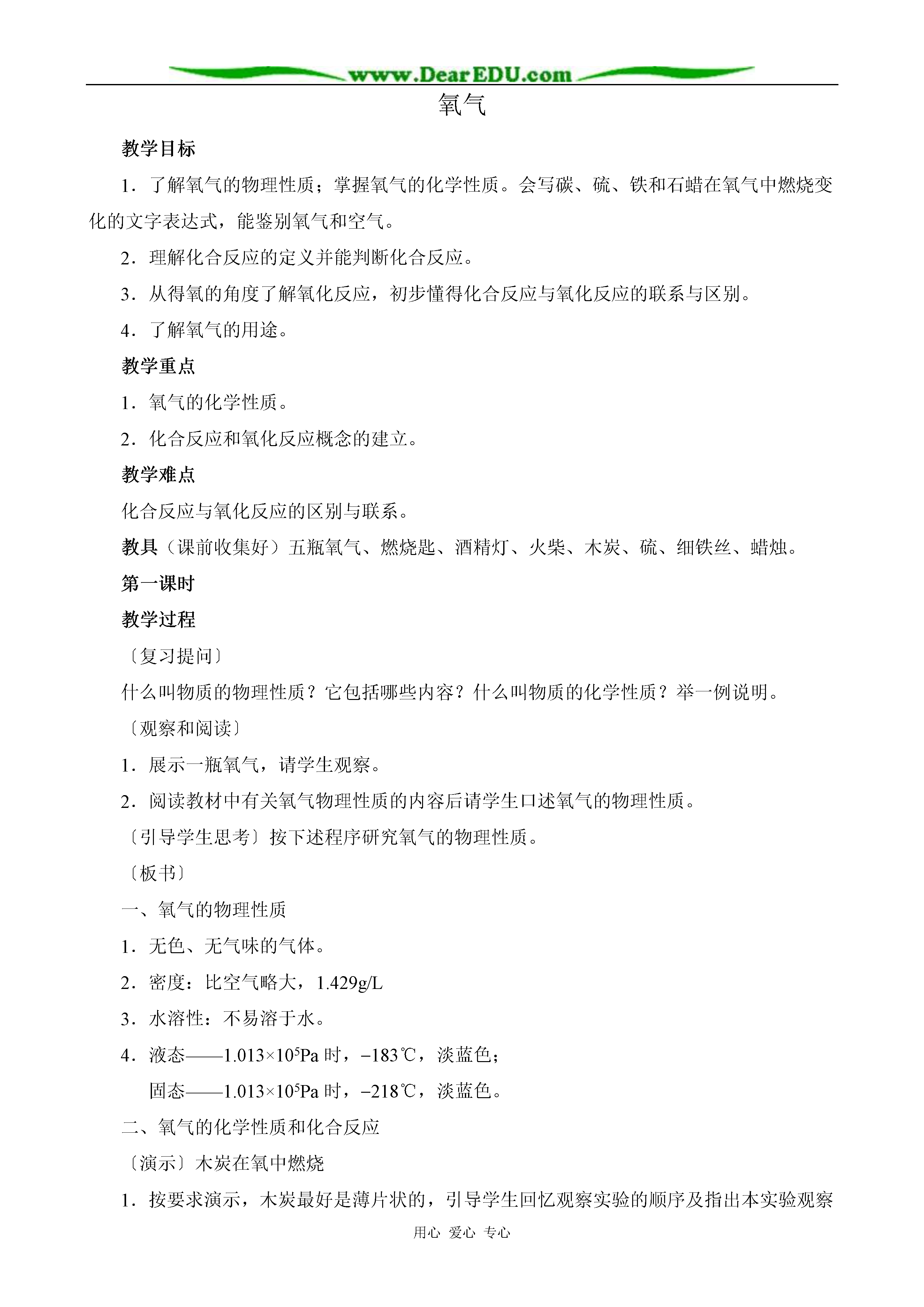 用心爱心专心氧气教学目标1.了解氧气的物理性质;掌握氧气的化学性质。会写碳、硫、铁和石蜡在氧气中燃烧变化的文字表达式,能鉴别氧气和空气。2.理解化合反应的定义并能判断化合反应。3.从得氧的角度了解氧化反应,初步懂得化合反应与氧化反应的联系与区别。4.了解氧气的用途。教学重点1.氧气的化学性质。2.化合反应和氧化反应概念的建立。教学难点化合反应与氧化反应的区别与联系。教具(课前收集好)五瓶氧气、燃烧匙、酒精灯、火柴、木炭、硫、细铁丝、蜡烛。第一课时教学过程〔复习提问〕什么叫物质的物理性质?它包括哪些内容?什么叫物质的化学性质?举一例说明。〔观察和阅读〕1.展示一瓶氧气,请学生观察。2.阅读教材中有关氧气物理性质的内容后请学生口述氧气的物理性质。〔引导学生思考〕按下述程序研究氧气的物理性质。〔板书〕一、氧气的物理性质1.无色、无气味的气体。2.密度:比空气略大,1.429g/L3.水溶性:不易溶于水。4.液态——1.013×105Pa时,183℃,淡蓝色;固态——1.013×105Pa时,218℃,淡蓝色。二、氧气的化学性质和化合反应〔演示〕木炭在氧中燃烧1.按要求演示,木炭最好是薄片状的,引导学生回忆观察实验的顺序及指出本实验观察重点。即(1)木炭在氧气中燃烧情况,(2)燃烧产物与澄清石灰水的反应。2.请学生说出观察到物质在氧气中燃烧时发生的现象。(1)比空气中燃得更旺,发出白光并放出热量。(2)燃烧后生成的无色气体使澄清石灰水变浑浊。说明该气体是二氧化碳。3.讲解用文字表达式表示此反应的方法:(1)写出反应物(箭头左边);(2)写出反应的生成物(箭头右边);(3)写出反应发生的条件。〔板书〕(分步)碳+氧气(在常温下不发生反应)在相应的物质名称下面写出化学符号。〔演示〕硫在氧中燃烧1.按要求演示,引导学生先观察硫在空气中燃烧的情况,再仔细观察硫在氧气中燃烧的现象。2.请学生说出观察到的现象。在空气中燃烧:发出微弱的淡蓝色火焰。在氧气中燃烧:(1)比空气中燃烧得更旺,发出蓝紫色火焰;并放出热量。(2)生成了一种有刺激性气味的无色气体。(该气体叫二氧化硫。教师可举出生活中实例,如烟煤燃烧时产生的有刺激性气味的气体。)3.学生写出文字表达式,教师说出相应的化学符号。〔板书〕〔讲述〕1.磷在空气中燃烧的现象。2.学生写出文字表达式:〔演示〕铁丝在氧中燃烧1.按要求演示,铁丝要用砂纸去锈,使其呈银白色,铁丝要细,弯曲圈要密些。2.学生说出观察到的现象。(1)剧烈燃烧,火星四射。(1)放出大量的热。(3)生成了一种黑色固体物质。(四氧化三铁,教师举出生活中所见到的四氧化三铁,如发蓝钉。)3.学生写出反应的文字表达式。〔板书〕〔讨论〕为什么要预先在集气瓶中装少量水或铺一层薄细沙?学生讨论后教师归纳给出准确答案:因为铁丝在氧气中燃烧要放出大量的热,使生成的四氧化三铁熔化而溅落下来。集气瓶中装少量水或铺一层细沙可以防止溅落下来的四氧化三铁把瓶底炸裂。〔讨论〕请比较以上四个反应有什么相同的地方?学生讨论时可能说出一些与化合反应无关的内容,但要引导学生观察反应物和生成物物质的种数。要求答出,参加反应的物质都是两种,反应后生成了另外一种物质。〔归纳〕教师说明这些反应都是化合反应,请学生给出定义,然后教师补充。〔板书〕由两种或两种以上物质生成另一种物质的反应,叫做化合反应。〔提问〕请学生再举一个化合反应的例子。l.演示蜡烛在氧中燃烧,氧气必须用干燥的集气瓶用向上排空气法收集,燃烧后倒入适量的石灰水(量不能太多)。2.学生说出观察到的现象。(1)比空气中燃烧得更旺,发出白光,并放出热量。(2)瓶壁上有水珠出现。(3)倒入瓶中的澄清的石灰水变浑浊。3.启发学生写出文字表达式:〔小结〕1.氧气的物理性质,注意研究物质物理性质的程序。2.氧气的化学性质:氧气在常温下一般不与其它物质发生燃烧反应。在点燃条件下可以与某些非金属反应;与某些金属发生反应;还可与其它许多物质发生燃烧反应。氧气是一种化学性质比较活泼的气体。3.化合反应:A+B—→AB〔布置作业〕(略)第二课时教学过程〔复习提问〕1.说出氧气的物理物质。2.写出木炭、硫、磷、铁、镁、蜡烛在氧气中燃烧的文字表达式。(可请二位同学上黑板写,其他同学写在作业本上。)3.什么叫化合反应?以上反应哪些是化合反应?哪些不是化合反应?为什么?引导比较上述六个反应,讨论得出氧化反应定义。〔板书〕物质与氧发生的化学反应叫氧化反应。〔讨论〕l.为什么定义中无“剧烈”二字?举例加以说明。(铁生锈、人呼吸等实例说明物质与氧发