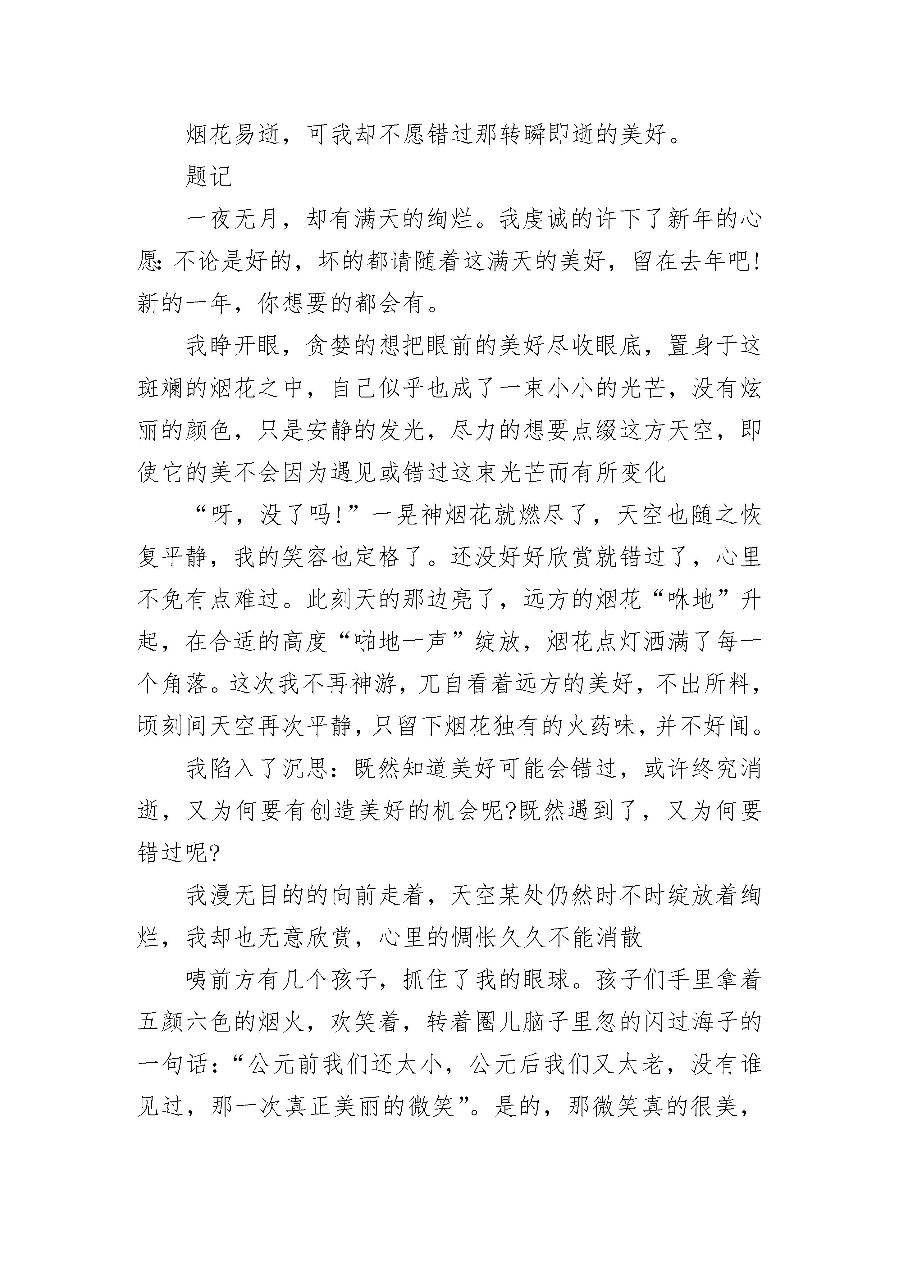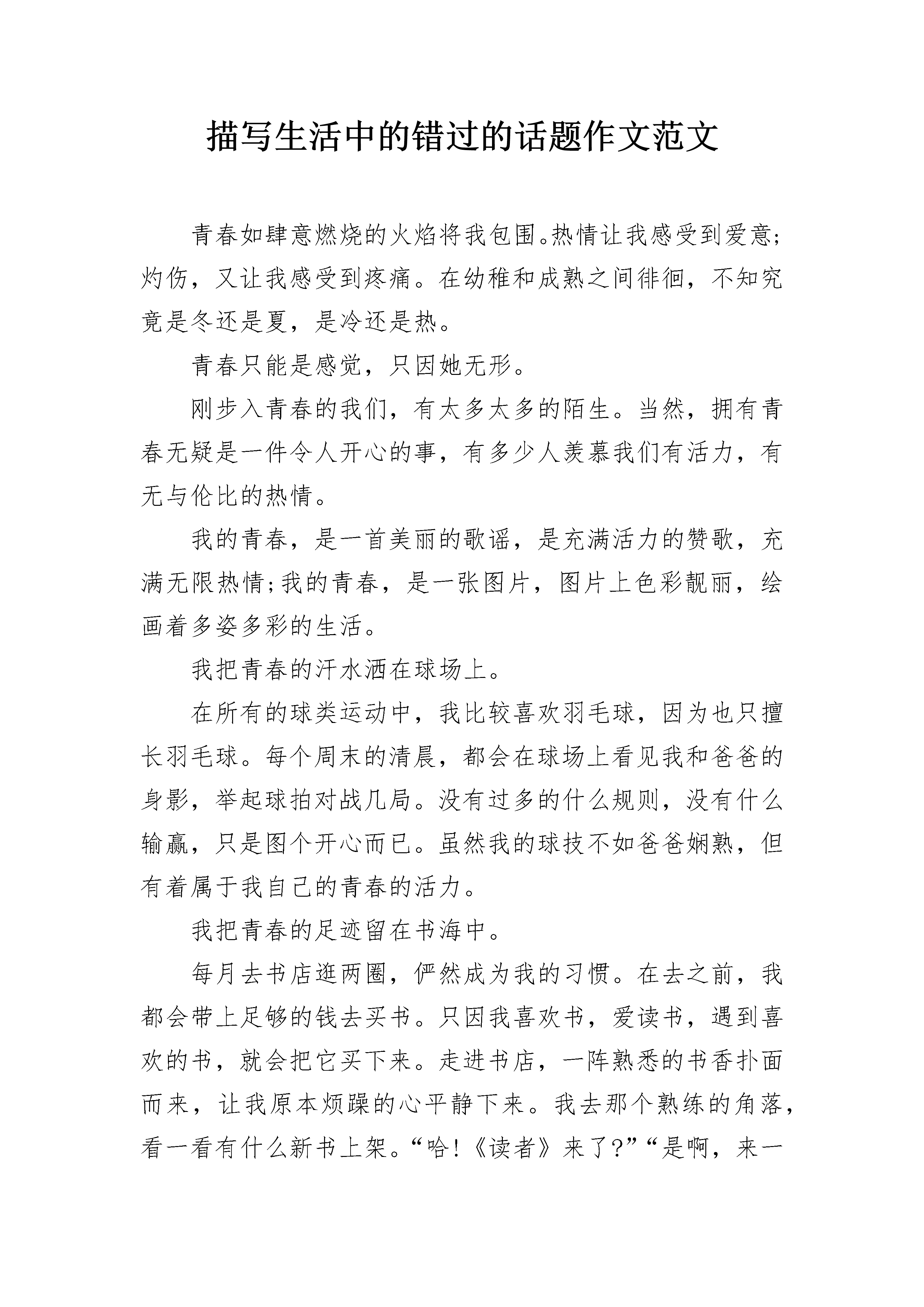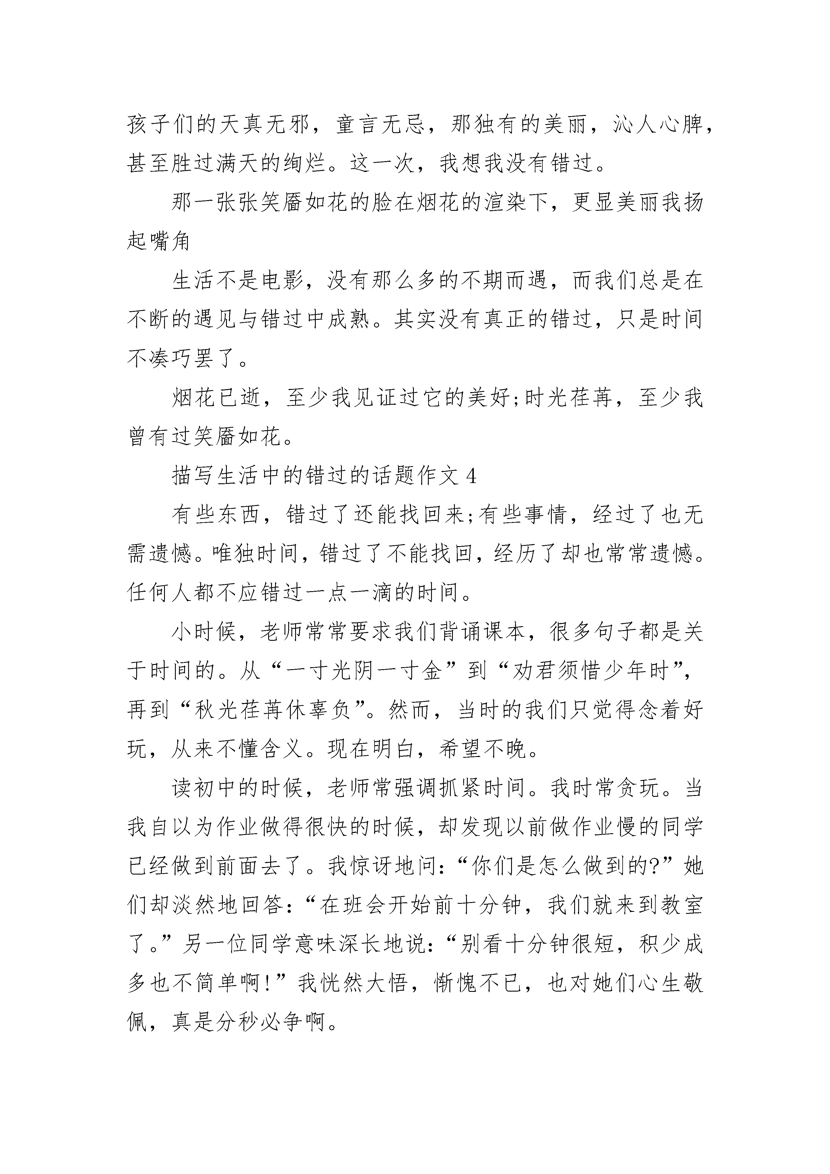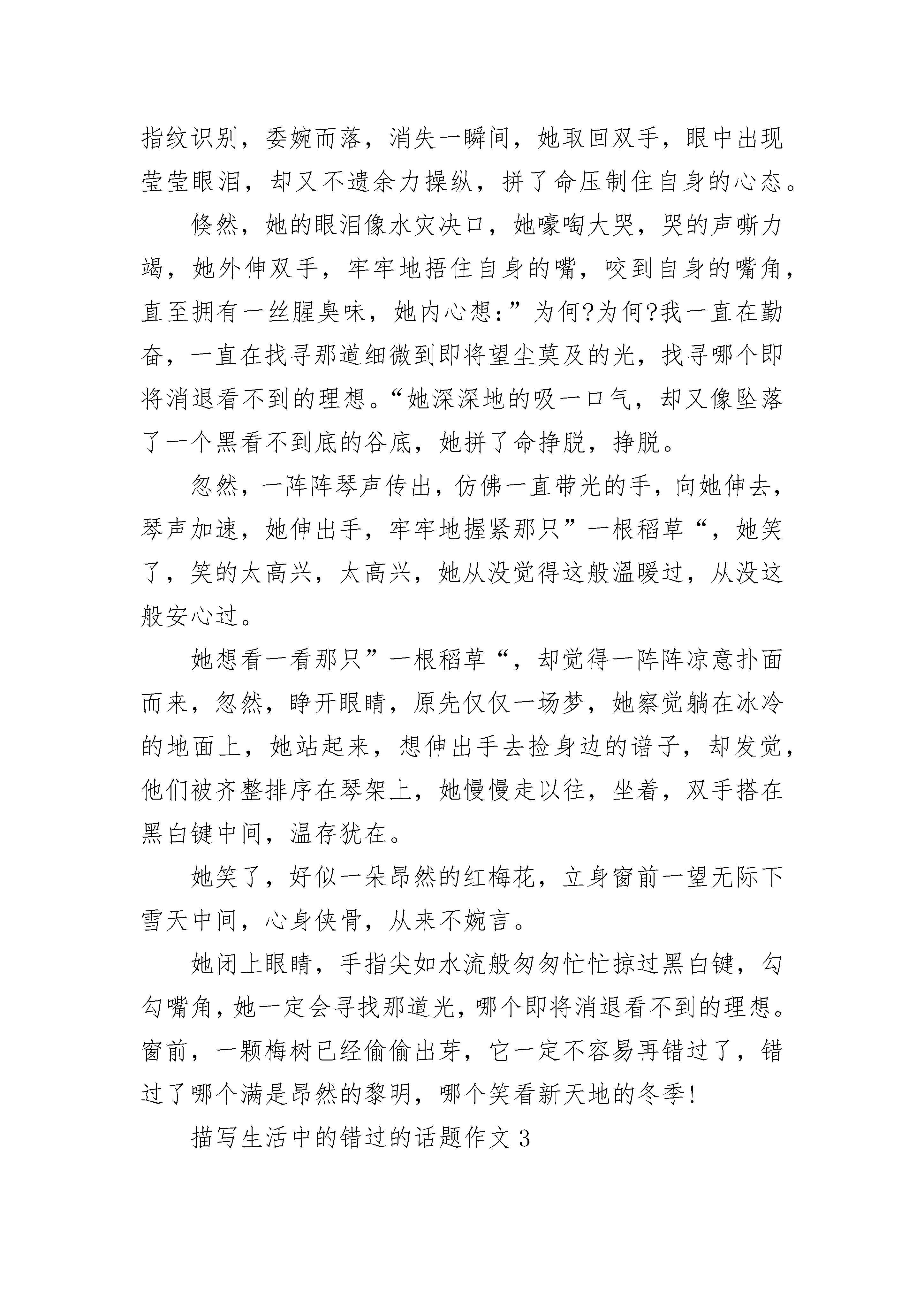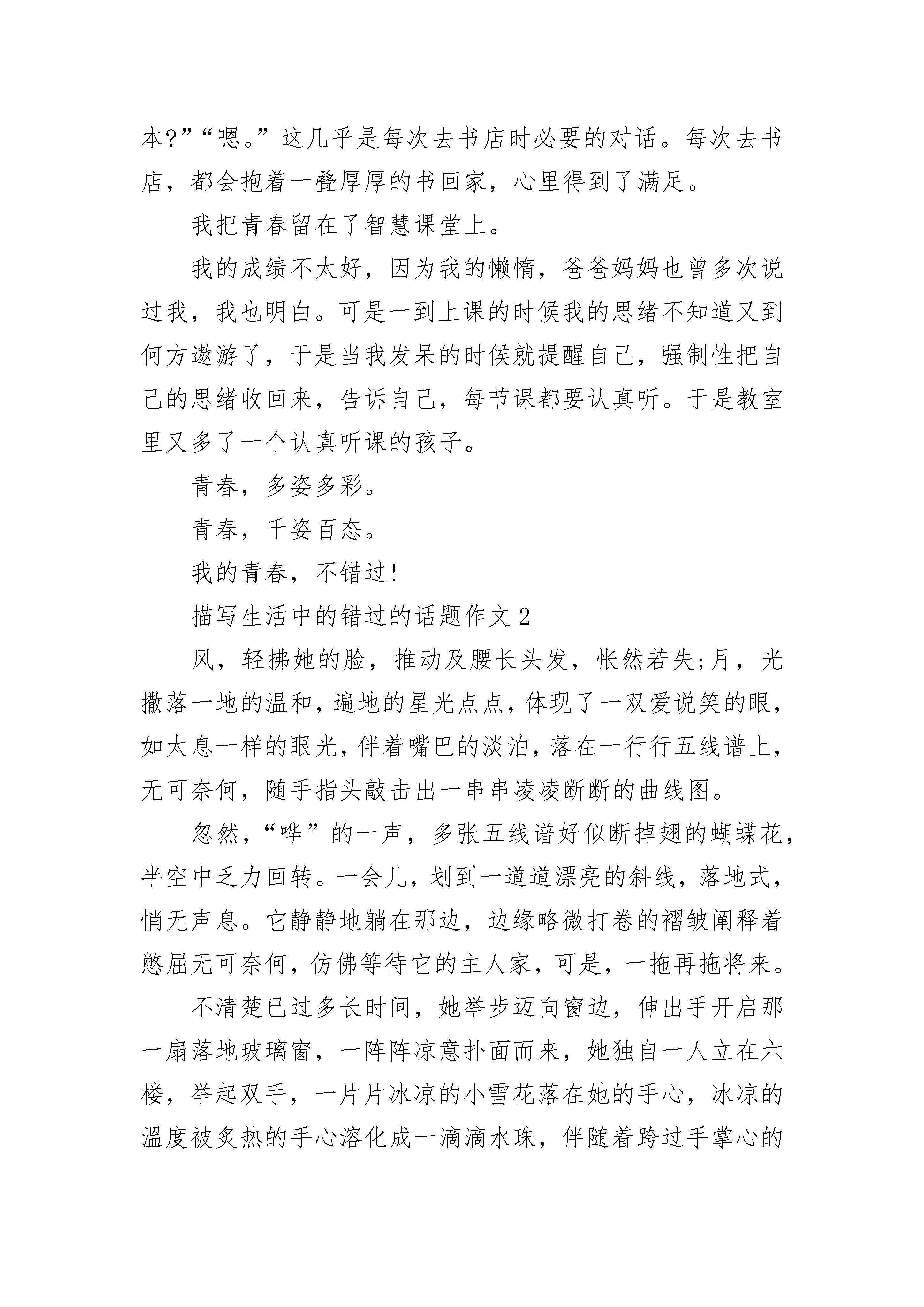描写生活中的错过的话题作文范文青春如肆意燃烧的火焰将我包围。热情让我感受到爱意;灼伤,又让我感受到疼痛。在幼稚和成熟之间徘徊,不知究竟是冬还是夏,是冷还是热。青春只能是感觉,只因她无形。刚步入青春的我们,有太多太多的陌生。当然,拥有青春无疑是一件令人开心的事,有多少人羡慕我们有活力,有无与伦比的热情。我的青春,是一首美丽的歌谣,是充满活力的赞歌,充满无限热情;我的青春,是一张图片,图片上色彩靓丽,绘画着多姿多彩的生活。我把青春的汗水洒在球场上。在所有的球类运动中,我比较喜欢羽毛球,因为也只擅长羽毛球。每个周末的清晨,都会在球场上看见我和爸爸的身影,举起球拍对战几局。没有过多的什么规则,没有什么输赢,只是图个开心而已。虽然我的球技不如爸爸娴熟,但有着属于我自己的青春的活力。我把青春的足迹留在书海中。每月去书店逛两圈,俨然成为我的习惯。在去之前,我都会带上足够的钱去买书。只因我喜欢书,爱读书,遇到喜欢的书,就会把它买下来。走进书店,一阵熟悉的书香扑面而来,让我原本烦躁的心平静下来。我去那个熟练的角落,看一看有什么新书上架。“哈!《读者》来了?”“是啊,来一本?”“嗯。”这几乎是每次去书店时必要的对话。每次去书店,都会抱着一叠厚厚的书回家,心里得到了满足。我把青春留在了智慧课堂上。我的成绩不太好,因为我的懒惰,爸爸妈妈也曾多次说过我,我也明白。可是一到上课的时候我的思绪不知道又到何方遨游了,于是当我发呆的时候就提醒自己,强制性把自己的思绪收回来,告诉自己,每节课都要认真听。于是教室里又多了一个认真听课的孩子。青春,多姿多彩。青春,千姿百态。我的青春,不错过!描写生活中的错过的话题作文2风,轻拂她的脸,推动及腰长头发,怅然若失;月,光撒落一地的温和,遍地的星光点点,体现了一双爱说笑的眼,如太息一样的眼光,伴着嘴巴的淡泊,落在一行行五线谱上,无可奈何,随手指头敲击出一串串凌凌断断的曲线图。忽然,“哗”的一声,多张五线谱好似断掉翅的蝴蝶花,半空中乏力回转。一会儿,划到一道道漂亮的斜线,落地式,悄无声息。它静静地躺在那边,边缘略微打卷的褶皱阐释着憋屈无可奈何,仿佛等待它的主人家,可是,一拖再拖将来。不清楚已过多长时间,她举步迈向窗边,伸出手开启那一扇落地玻璃窗,一阵阵凉意扑面而来,她独自一人立在六楼,举起双手,一片片冰凉的小雪花落在她的手心,冰凉的溫度被炙热的手心溶化成一滴滴水珠,伴随着跨过手掌心的指纹识别,委婉而落,消失一瞬间,她取回双手,眼中出现莹莹眼泪,却又不遗余力操纵,拼了命压制住自身的心态。倏然,她的眼泪像水灾决口,她嚎啕大哭,哭的声嘶力竭,她外伸双手,牢牢地捂住自身的嘴,咬到自身的嘴角,直至拥有一丝腥臭味,她内心想:”为何?为何?我一直在勤奋,一直在找寻那道细微到即将望尘莫及的光,找寻哪个即将消退看不到的理想。“她深深地的吸一口气,却又像坠落了一个黑看不到底的谷底,她拼了命挣脱,挣脱。忽然,一阵阵琴声传出,仿佛一直带光的手,向她伸去,琴声加速,她伸出手,牢牢地握紧那只”一根稻草“,她笑了,笑的太高兴,太高兴,她从没觉得这般溫暖过,从没这般安心过。她想看一看那只”一根稻草“,却觉得一阵阵凉意扑面而来,忽然,睁开眼睛,原先仅仅一场梦,她察觉躺在冰冷的地面上,她站起来,想伸出手去捡身边的谱子,却发觉,他们被齐整排序在琴架上,她慢慢走以往,坐着,双手搭在黑白键中间,温存犹在。她笑了,好似一朵昂然的红梅花,立身窗前一望无际下雪天中间,心身侠骨,从来不婉言。她闭上眼睛,手指尖如水流般匆匆忙忙掠过黑白键,勾勾嘴角,她一定会寻找那道光,哪个即将消退看不到的理想。窗前,一颗梅树已经偷偷出芽,它一定不容易再错过了,错过了哪个满是昂然的黎明,哪个笑看新天地的冬季!描写生活中的错过的话题作文3烟花易逝,可我却不愿错过那转瞬即逝的美好。题记一夜无月,却有满天的绚烂。我虔诚的许下了新年的心愿:不论是好的,坏的都请随着这满天的美好,留在去年吧!新的一年,你想要的都会有。我睁开眼,贪婪的想把眼前的美好尽收眼底,置身于这斑斓的烟花之中,自己似乎也成了一束小小的光芒,没有炫丽的颜色,只是安静的发光,尽力的想要点缀这方天空,即使它的美不会因为遇见或错过这束光芒而有所变化“呀,没了吗!”一晃神烟花就燃尽了,天空也随之恢复平静,我的笑容也定格了。还没好好欣赏就错过了,心里不免有点难过。此刻天的那边亮了,远方的烟花“咻地”升起,在合适的高度“啪地一声”绽放,烟花点灯洒满了每一个角落。这次我不再神游,兀自看着远方的美好,不出所料,顷刻间天空再次平静,只留下烟花独有的火药味,并不好闻。我陷入了沉思:既然知道美好可能会错过,或许终究消逝,又为何要有创造美好的机会呢?既然遇到了,又为何要错过呢?我漫无目的的向前走着,天空某处仍然时不时绽放着绚烂,我却也无意欣赏,心里的惆怅久久