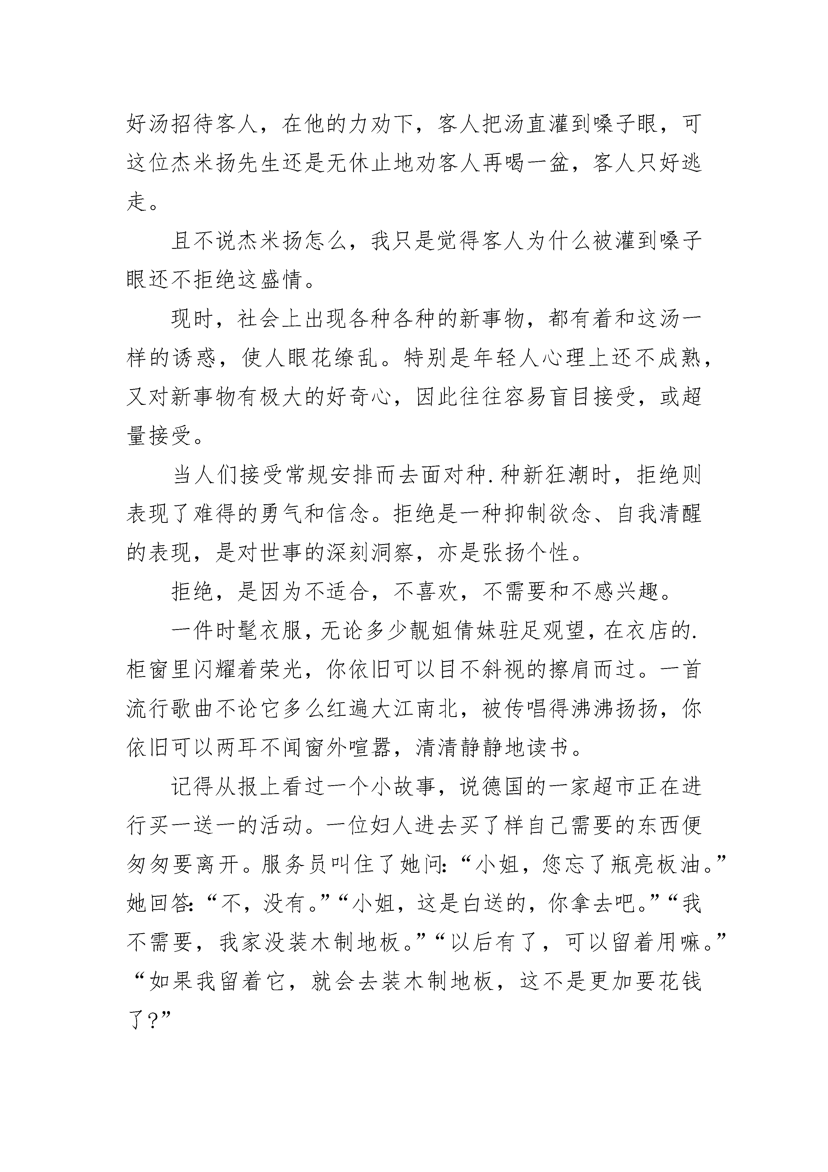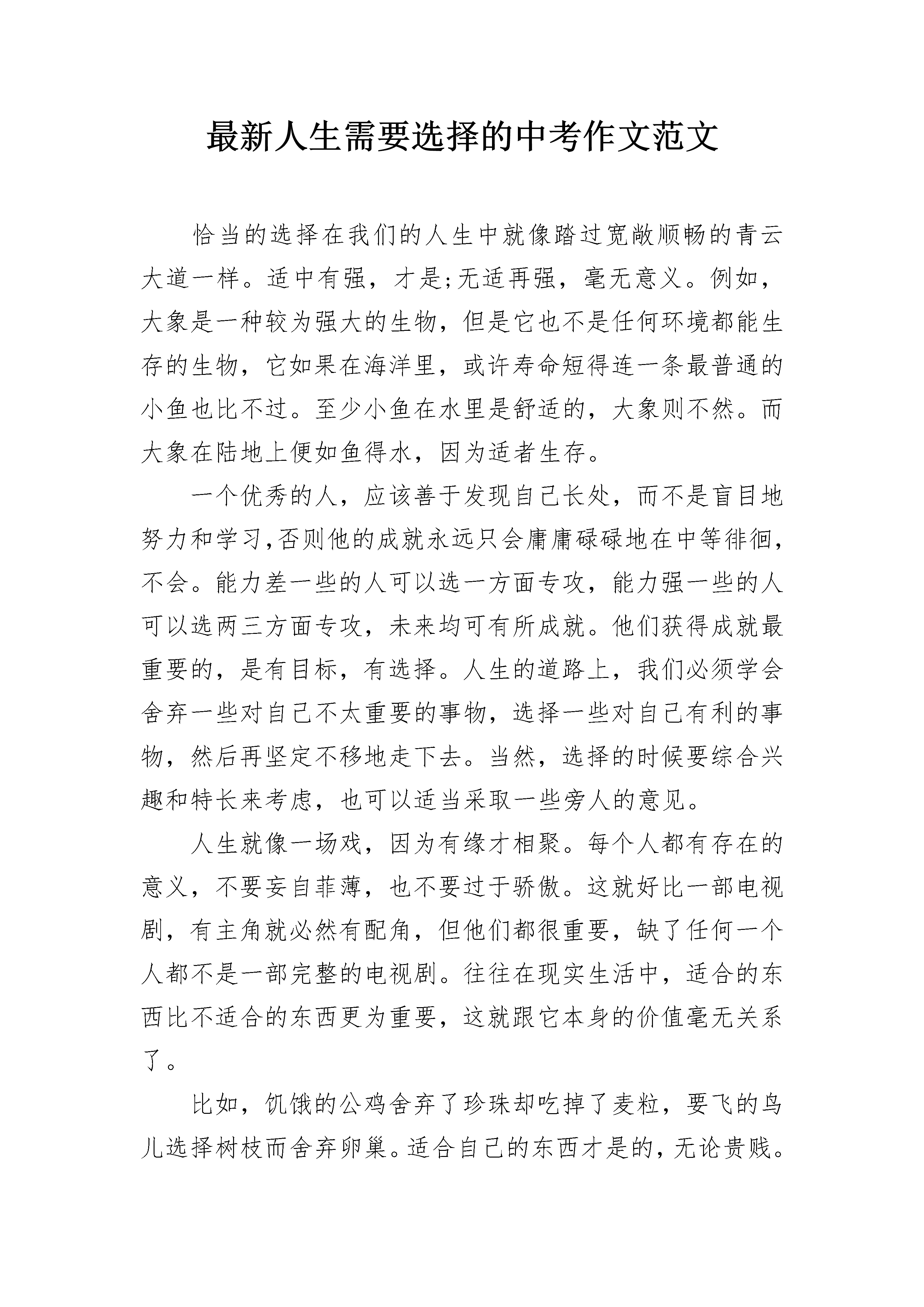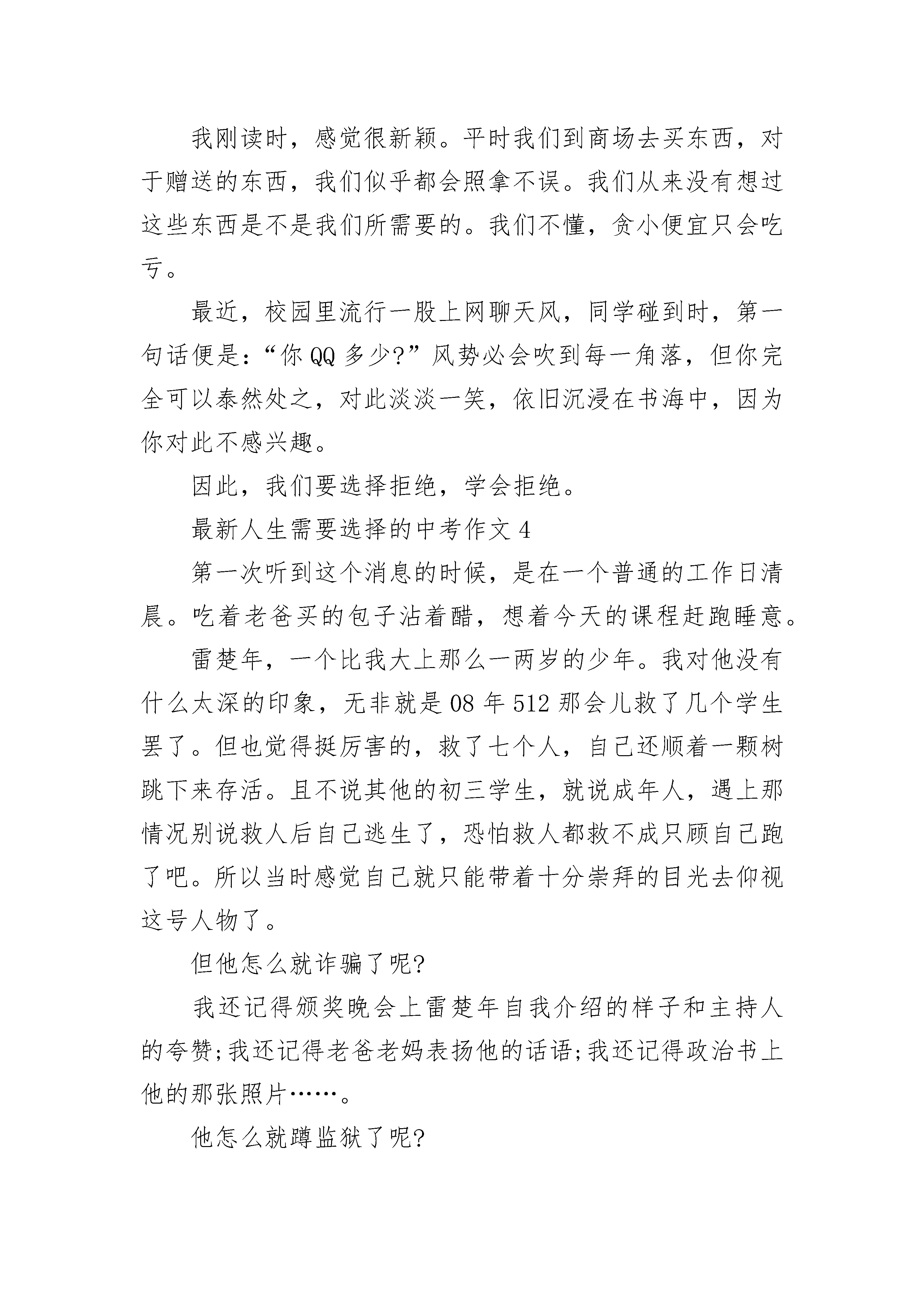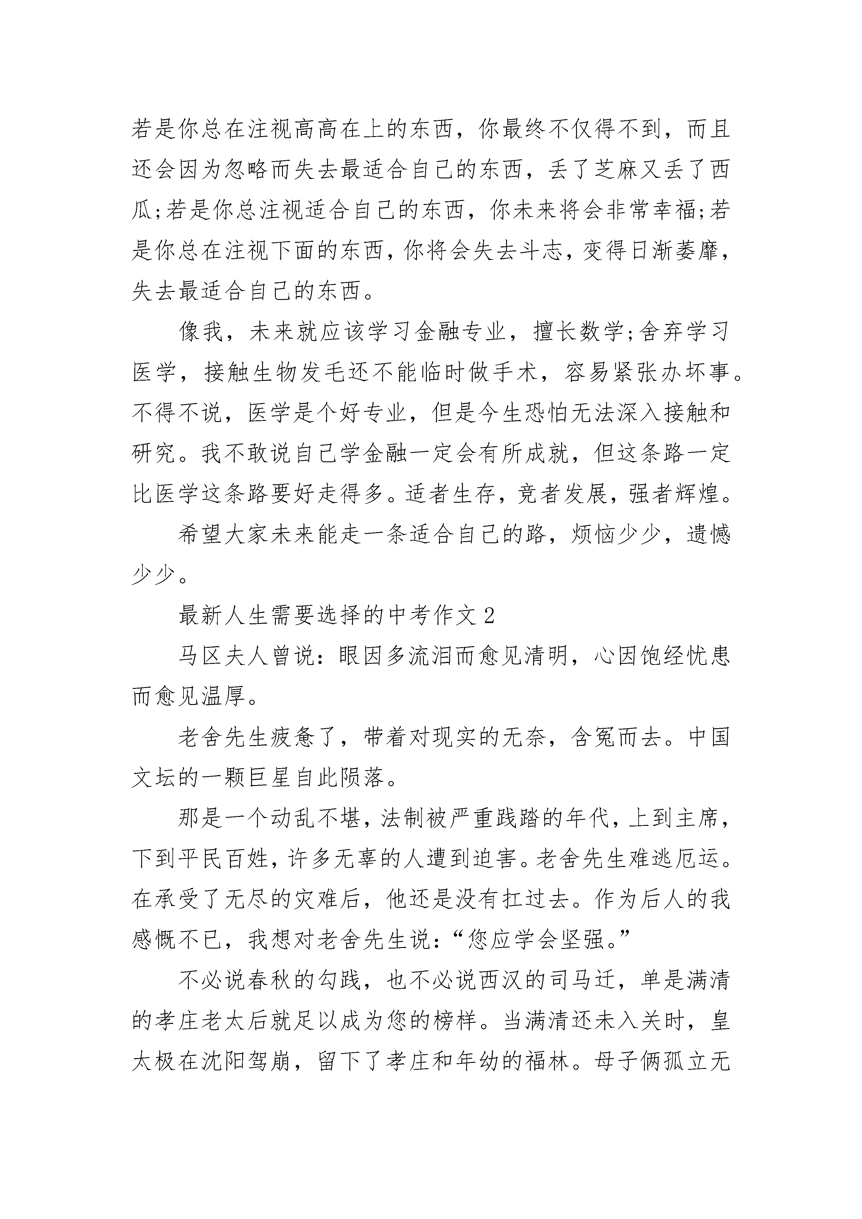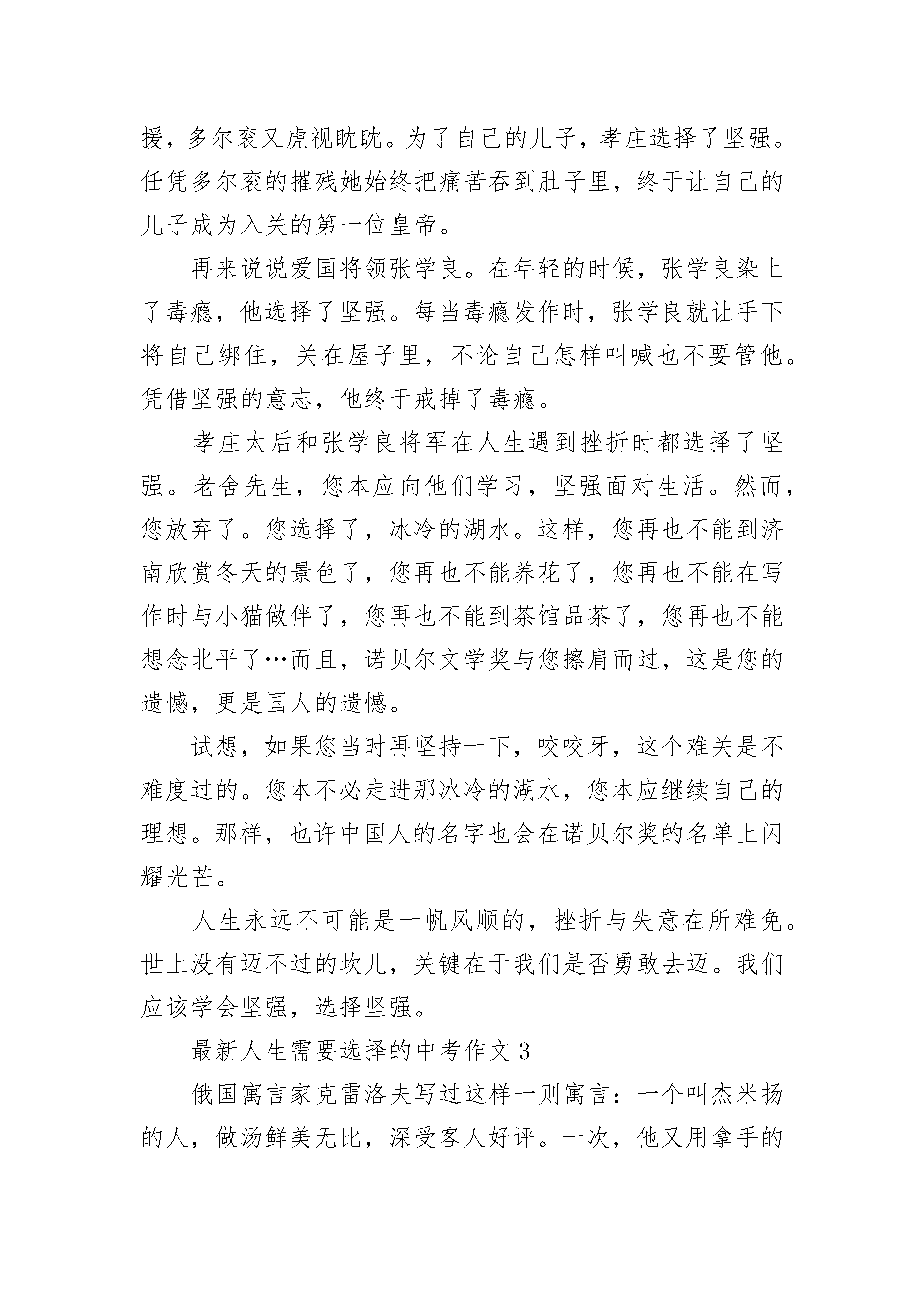 最新人生需要选择的中考作文范文恰当的选择在我们的人生中就像踏过宽敞顺畅的青云大道一样。适中有强,才是;无适再强,毫无意义。例如,大象是一种较为强大的生物,但是它也不是任何环境都能生存的生物,它如果在海洋里,或许寿命短得连一条最普通的小鱼也比不过。至少小鱼在水里是舒适的,大象则不然。而大象在陆地上便如鱼得水,因为适者生存。一个优秀的人,应该善于发现自己长处,而不是盲目地努力和学习,否则他的成就永远只会庸庸碌碌地在中等徘徊,不会。能力差一些的人可以选一方面专攻,能力强一些的人可以选两三方面专攻,未来均可有所成就。他们获得成就最重要的,是有目标,有选择。人生的道路上,我们必须学会舍弃一些对自己不太重要的事物,选择一些对自己有利的事物,然后再坚定不移地走下去。当然,选择的时候要综合兴趣和特长来考虑,也可以适当采取一些旁人的意见。人生就像一场戏,因为有缘才相聚。每个人都有存在的意义,不要妄自菲薄,也不要过于骄傲。这就好比一部电视剧,有主角就必然有配角,但他们都很重要,缺了任何一个人都不是一部完整的电视剧。往往在现实生活中,适合的东西比不适合的东西更为重要,这就跟它本身的价值毫无关系了。比如,饥饿的公鸡舍弃了珍珠却吃掉了麦粒,要飞的鸟儿选择树枝而舍弃卵巢。适合自己的东西才是的,无论贵贱。若是你总在注视高高在上的东西,你最终不仅得不到,而且还会因为忽略而失去最适合自己的东西,丢了芝麻又丢了西瓜;若是你总注视适合自己的东西,你未来将会非常幸福;若是你总在注视下面的东西,你将会失去斗志,变得日渐萎靡,失去最适合自己的东西。像我,未来就应该学习金融专业,擅长数学;舍弃学习医学,接触生物发毛还不能临时做手术,容易紧张办坏事。不得不说,医学是个好专业,但是今生恐怕无法深入接触和研究。我不敢说自己学金融一定会有所成就,但这条路一定比医学这条路要好走得多。适者生存,竞者发展,强者辉煌。希望大家未来能走一条适合自己的路,烦恼少少,遗憾少少。最新人生需要选择的中考作文2马区夫人曾说:眼因多流泪而愈见清明,心因饱经忧患而愈见温厚。老舍先生疲惫了,带着对现实的无奈,含冤而去。中国文坛的一颗巨星自此陨落。那是一个动乱不堪,法制被严重践踏的年代,上到主席,下到平民百姓,许多无辜的人遭到迫害。老舍先生难逃厄运。在承受了无尽的灾难后,他还是没有扛过去。作为后人的我感慨不已,我想对老舍先生说:“您应学会坚强。”不必说春秋的勾践,也不必说西汉的司马迁,单是满清的孝庄老太后就足以成为您的榜样。当满清还未入关时,皇太极在沈阳驾崩,留下了孝庄和年幼的福林。母子俩孤立无援,多尔衮又虎视眈眈。为了自己的儿子,孝庄选择了坚强。任凭多尔衮的摧残她始终把痛苦吞到肚子里,终于让自己的儿子成为入关的第一位皇帝。再来说说爱国将领张学良。在年轻的时候,张学良染上了毒瘾,他选择了坚强。每当毒瘾发作时,张学良就让手下将自己绑住,关在屋子里,不论自己怎样叫喊也不要管他。凭借坚强的意志,他终于戒掉了毒瘾。孝庄太后和张学良将军在人生遇到挫折时都选择了坚强。老舍先生,您本应向他们学习,坚强面对生活。然而,您放弃了。您选择了,冰冷的湖水。这样,您再也不能到济南欣赏冬天的景色了,您再也不能养花了,您再也不能在写作时与小猫做伴了,您再也不能到茶馆品茶了,您再也不能想念北平了…而且,诺贝尔文学奖与您擦肩而过,这是您的遗憾,更是国人的遗憾。试想,如果您当时再坚持一下,咬咬牙,这个难关是不难度过的。您本不必走进那冰冷的湖水,您本应继续自己的理想。那样,也许中国人的名字也会在诺贝尔奖的名单上闪耀光芒。人生永远不可能是一帆风顺的,挫折与失意在所难免。世上没有迈不过的坎儿,关键在于我们是否勇敢去迈。我们应该学会坚强,选择坚强。最新人生需要选择的中考作文3俄国寓言家克雷洛夫写过这样一则寓言:一个叫杰米扬的人,做汤鲜美无比,深受客人好评。一次,他又用拿手的好汤招待客人,在他的力劝下,客人把汤直灌到嗓子眼,可这位杰米扬先生还是无休止地劝客人再喝一盆,客人只好逃走。且不说杰米扬怎么,我只是觉得客人为什么被灌到嗓子眼还不拒绝这盛情。现时,社会上出现各种各种的新事物,都有着和这汤一样的诱惑,使人眼花缭乱。特别是年轻人心理上还不成熟,又对新事物有极大的好奇心,因此往往容易盲目接受,或超量接受。当人们接受常规安排而去面对种.种新狂潮时,拒绝则表现了难得的勇气和信念。拒绝是一种抑制欲念、自我清醒的表现,是对世事的深刻洞察,亦是张扬个性。拒绝,是因为不适合,不喜欢,不需要和不感兴趣。一件时髦衣服,无论多少靓姐倩妹驻足观望,在衣店的.柜窗里闪耀着荣光,你依旧可以目不斜视的擦肩而过。一首流行歌曲不论它多么红遍大江南北,被传唱得沸沸扬扬,你依旧可以两耳不闻窗外喧嚣,清清静静地读书。记得从报上看过一个小故事,说德国的一家超市正在进行买一送一的活动。一