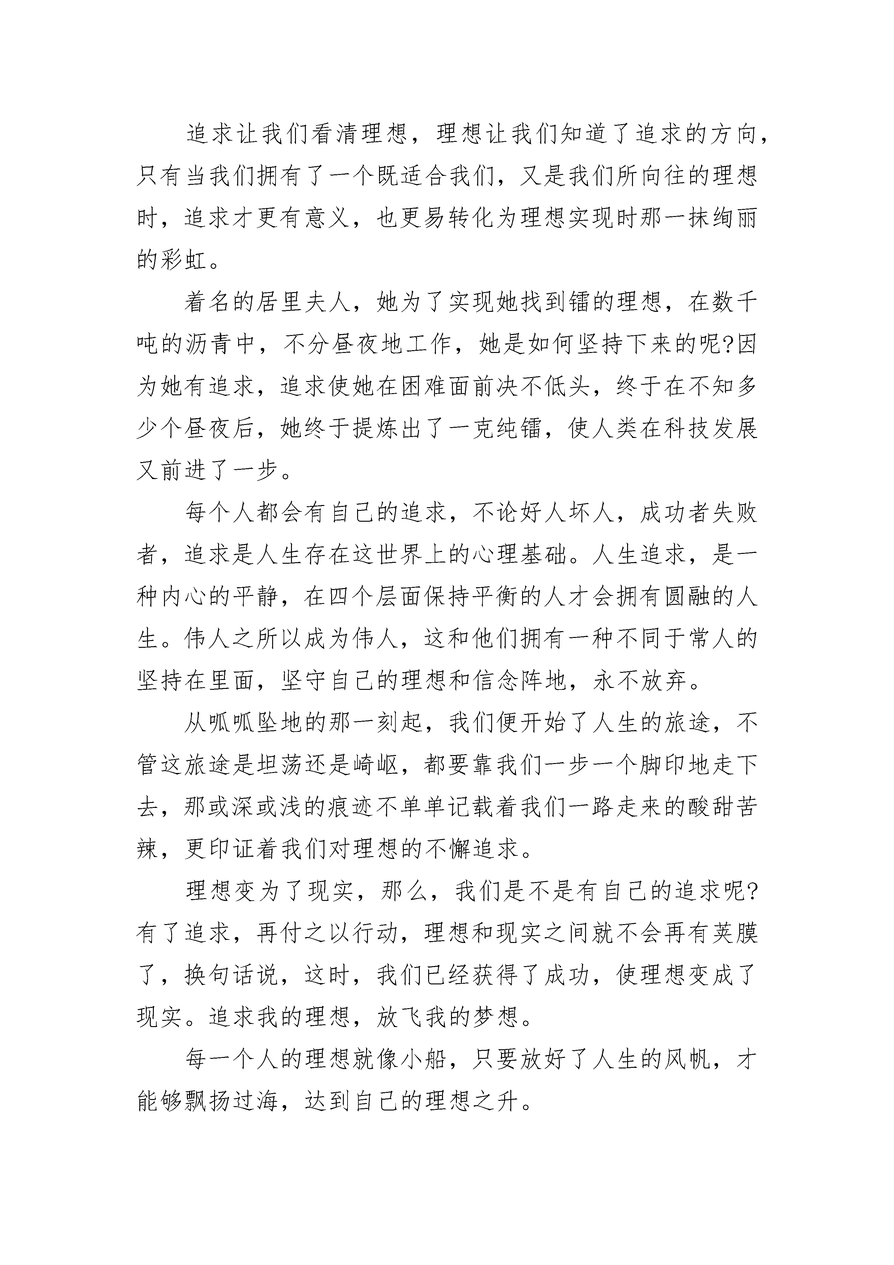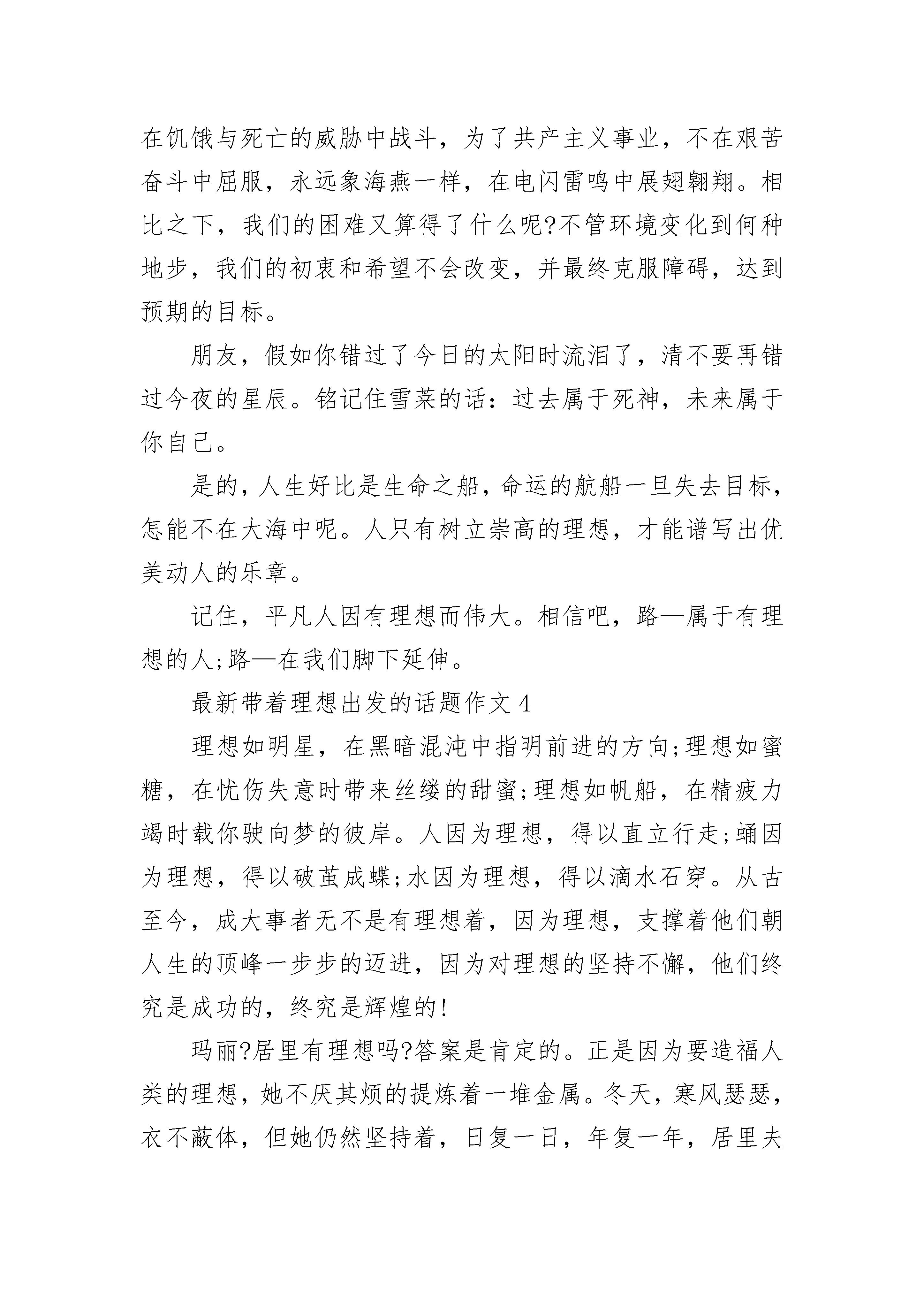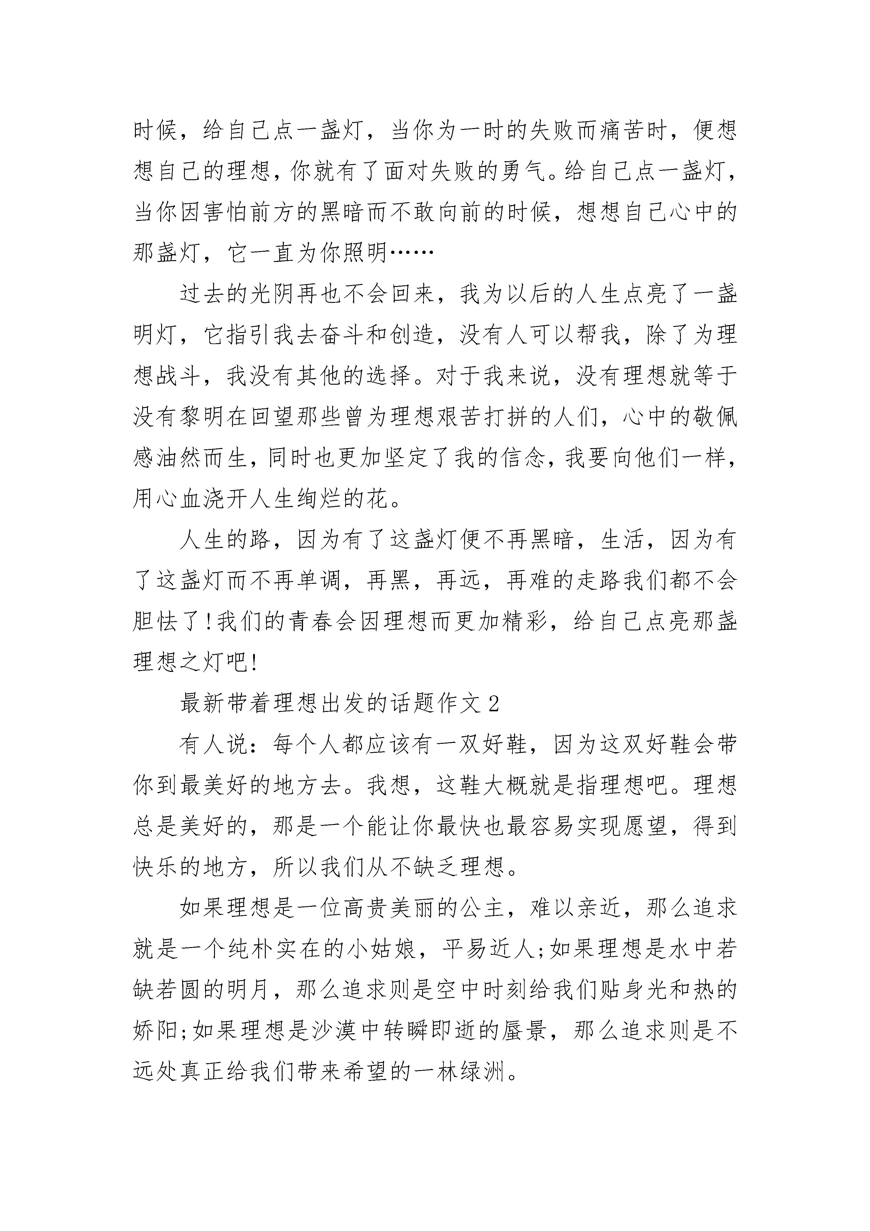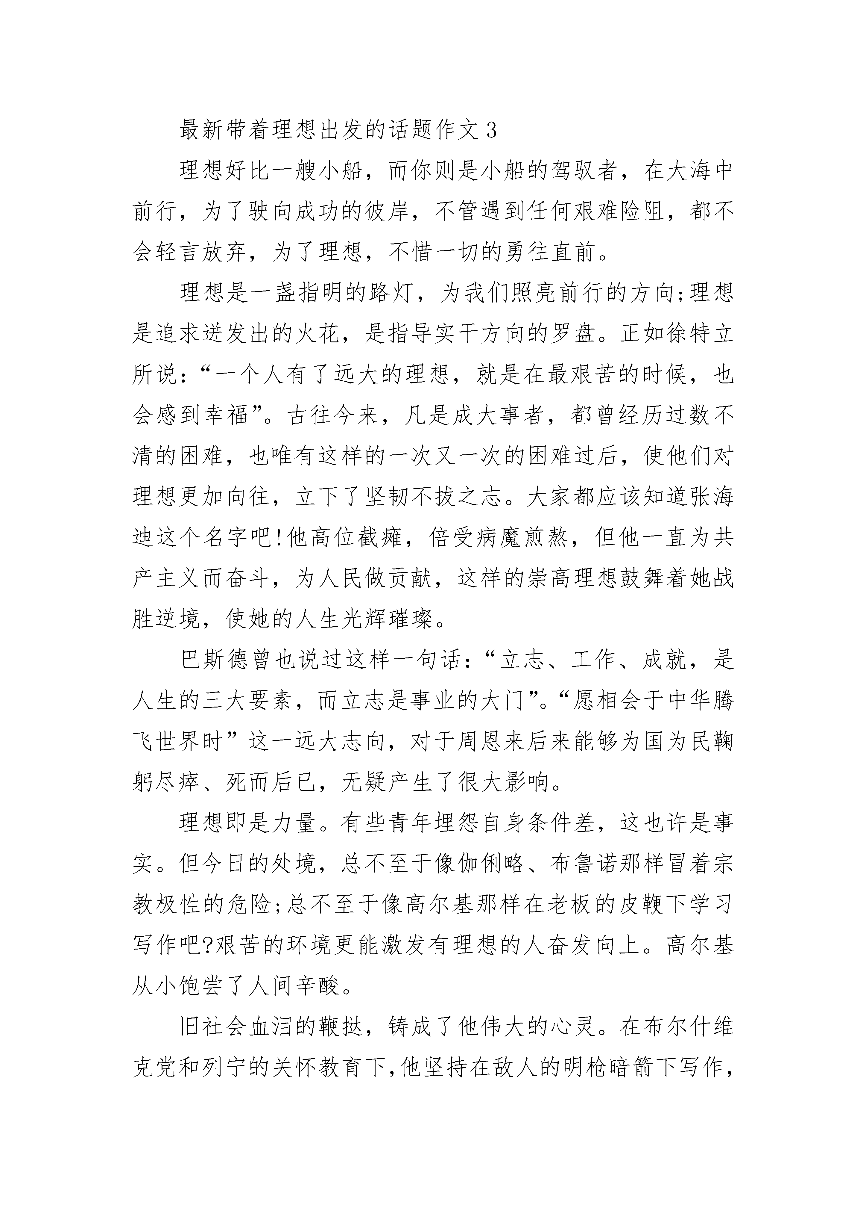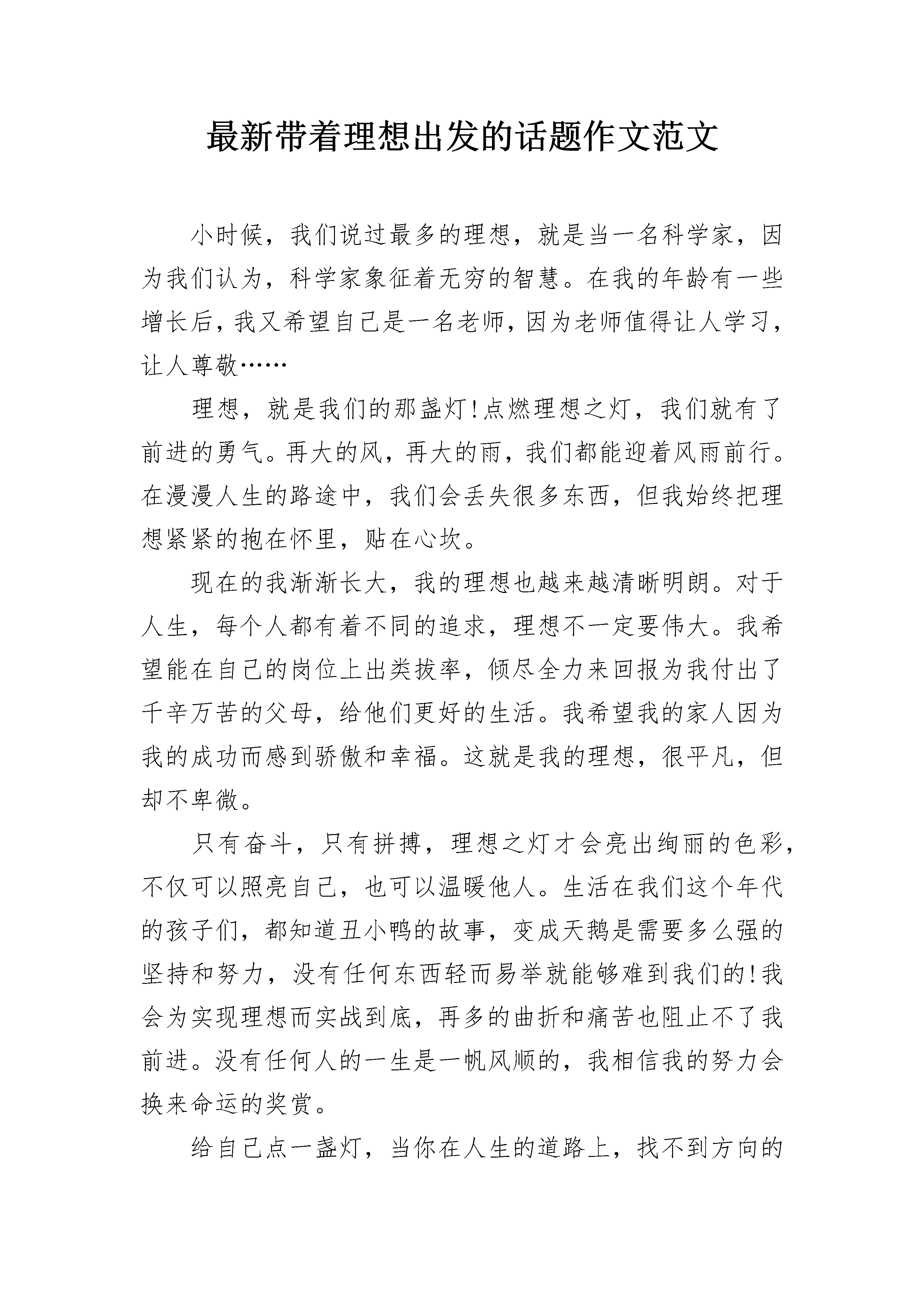 最新带着理想出发的话题作文范文小时候,我们说过最多的理想,就是当一名科学家,因为我们认为,科学家象征着无穷的智慧。在我的年龄有一些增长后,我又希望自己是一名老师,因为老师值得让人学习,让人尊敬……理想,就是我们的那盏灯!点燃理想之灯,我们就有了前进的勇气。再大的风,再大的雨,我们都能迎着风雨前行。在漫漫人生的路途中,我们会丢失很多东西,但我始终把理想紧紧的抱在怀里,贴在心坎。现在的我渐渐长大,我的理想也越来越清晰明朗。对于人生,每个人都有着不同的追求,理想不一定要伟大。我希望能在自己的岗位上出类拔率,倾尽全力来回报为我付出了千辛万苦的父母,给他们更好的生活。我希望我的家人因为我的成功而感到骄傲和幸福。这就是我的理想,很平凡,但却不卑微。只有奋斗,只有拼搏,理想之灯才会亮出绚丽的色彩,不仅可以照亮自己,也可以温暖他人。生活在我们这个年代的孩子们,都知道丑小鸭的故事,变成天鹅是需要多么强的坚持和努力,没有任何东西轻而易举就能够难到我们的!我会为实现理想而实战到底,再多的曲折和痛苦也阻止不了我前进。没有任何人的一生是一帆风顺的,我相信我的努力会换来命运的奖赏。给自己点一盏灯,当你在人生的道路上,找不到方向的时候,给自己点一盏灯,当你为一时的失败而痛苦时,便想想自己的理想,你就有了面对失败的勇气。给自己点一盏灯,当你因害怕前方的黑暗而不敢向前的时候,想想自己心中的那盏灯,它一直为你照明……过去的光阴再也不会回来,我为以后的人生点亮了一盏明灯,它指引我去奋斗和创造,没有人可以帮我,除了为理想战斗,我没有其他的选择。对于我来说,没有理想就等于没有黎明在回望那些曾为理想艰苦打拼的人们,心中的敬佩感油然而生,同时也更加坚定了我的信念,我要向他们一样,用心血浇开人生绚烂的花。人生的路,因为有了这盏灯便不再黑暗,生活,因为有了这盏灯而不再单调,再黑,再远,再难的走路我们都不会胆怯了!我们的青春会因理想而更加精彩,给自己点亮那盏理想之灯吧!最新带着理想出发的话题作文2有人说:每个人都应该有一双好鞋,因为这双好鞋会带你到最美好的地方去。我想,这鞋大概就是指理想吧。理想总是美好的,那是一个能让你最快也最容易实现愿望,得到快乐的地方,所以我们从不缺乏理想。如果理想是一位高贵美丽的公主,难以亲近,那么追求就是一个纯朴实在的小姑娘,平易近人;如果理想是水中若缺若圆的明月,那么追求则是空中时刻给我们贴身光和热的娇阳;如果理想是沙漠中转瞬即逝的蜃景,那么追求则是不远处真正给我们带来希望的一林绿洲。追求让我们看清理想,理想让我们知道了追求的方向,只有当我们拥有了一个既适合我们,又是我们所向往的理想时,追求才更有意义,也更易转化为理想实现时那一抹绚丽的彩虹。着名的居里夫人,她为了实现她找到镭的理想,在数千吨的沥青中,不分昼夜地工作,她是如何坚持下来的呢?因为她有追求,追求使她在困难面前决不低头,终于在不知多少个昼夜后,她终于提炼出了一克纯镭,使人类在科技发展又前进了一步。每个人都会有自己的追求,不论好人坏人,成功者失败者,追求是人生存在这世界上的心理基础。人生追求,是一种内心的平静,在四个层面保持平衡的人才会拥有圆融的人生。伟人之所以成为伟人,这和他们拥有一种不同于常人的坚持在里面,坚守自己的理想和信念阵地,永不放弃。从呱呱坠地的那一刻起,我们便开始了人生的旅途,不管这旅途是坦荡还是崎岖,都要靠我们一步一个脚印地走下去,那或深或浅的痕迹不单单记载着我们一路走来的酸甜苦辣,更印证着我们对理想的不懈追求。理想变为了现实,那么,我们是不是有自己的追求呢?有了追求,再付之以行动,理想和现实之间就不会再有荚膜了,换句话说,这时,我们已经获得了成功,使理想变成了现实。追求我的理想,放飞我的梦想。每一个人的理想就像小船,只要放好了人生的风帆,才能够飘扬过海,达到自己的理想之升。最新带着理想出发的话题作文3理想好比一艘小船,而你则是小船的驾驭者,在大海中前行,为了驶向成功的彼岸,不管遇到任何艰难险阻,都不会轻言放弃,为了理想,不惜一切的勇往直前。理想是一盏指明的路灯,为我们照亮前行的方向;理想是追求迸发出的火花,是指导实干方向的罗盘。正如徐特立所说:“一个人有了远大的理想,就是在最艰苦的时候,也会感到幸福”。古往今来,凡是成大事者,都曾经历过数不清的困难,也唯有这样的一次又一次的困难过后,使他们对理想更加向往,立下了坚韧不拔之志。大家都应该知道张海迪这个名字吧!他高位截瘫,倍受病魔煎熬,但他一直为共产主义而奋斗,为人民做贡献,这样的崇高理想鼓舞着她战胜逆境,使她的人生光辉璀璨。巴斯德曾也说过这样一句话:“立志、工作、成就,是人生的三大要素,而立志是事业的大门”。“愿相会于中华腾飞世界时”这一远大志向,对于周恩来后来能够为国为民鞠躬尽瘁、死而后已,无疑产生了很大影响。理想即是力量