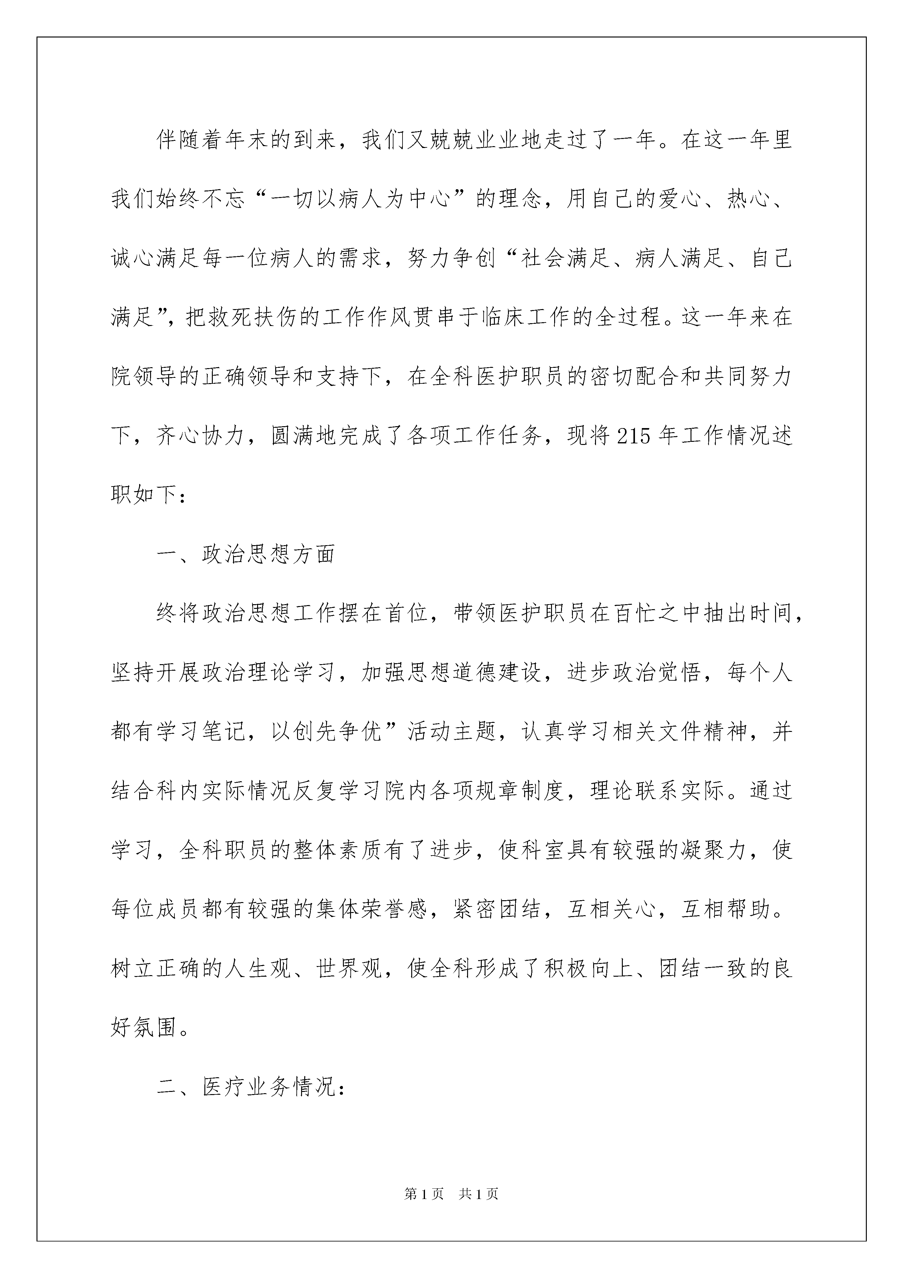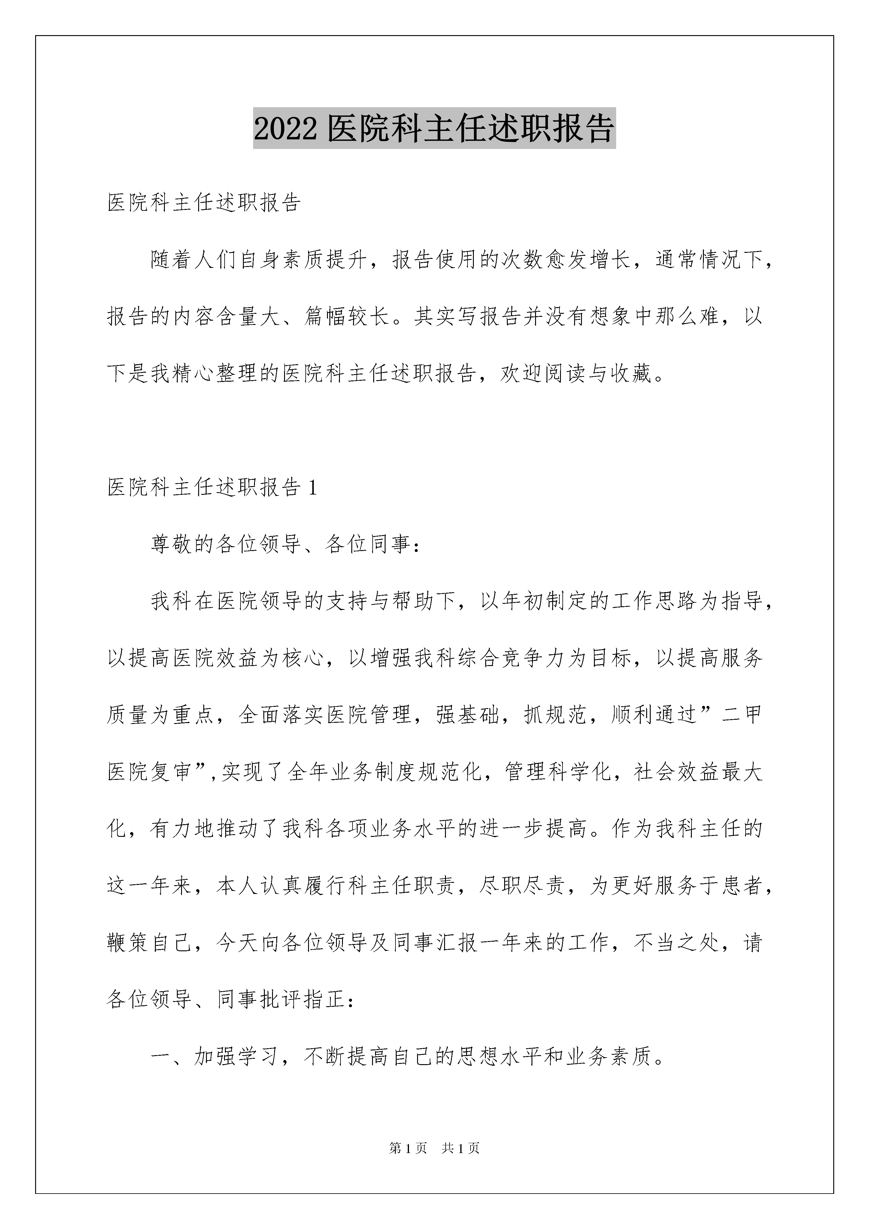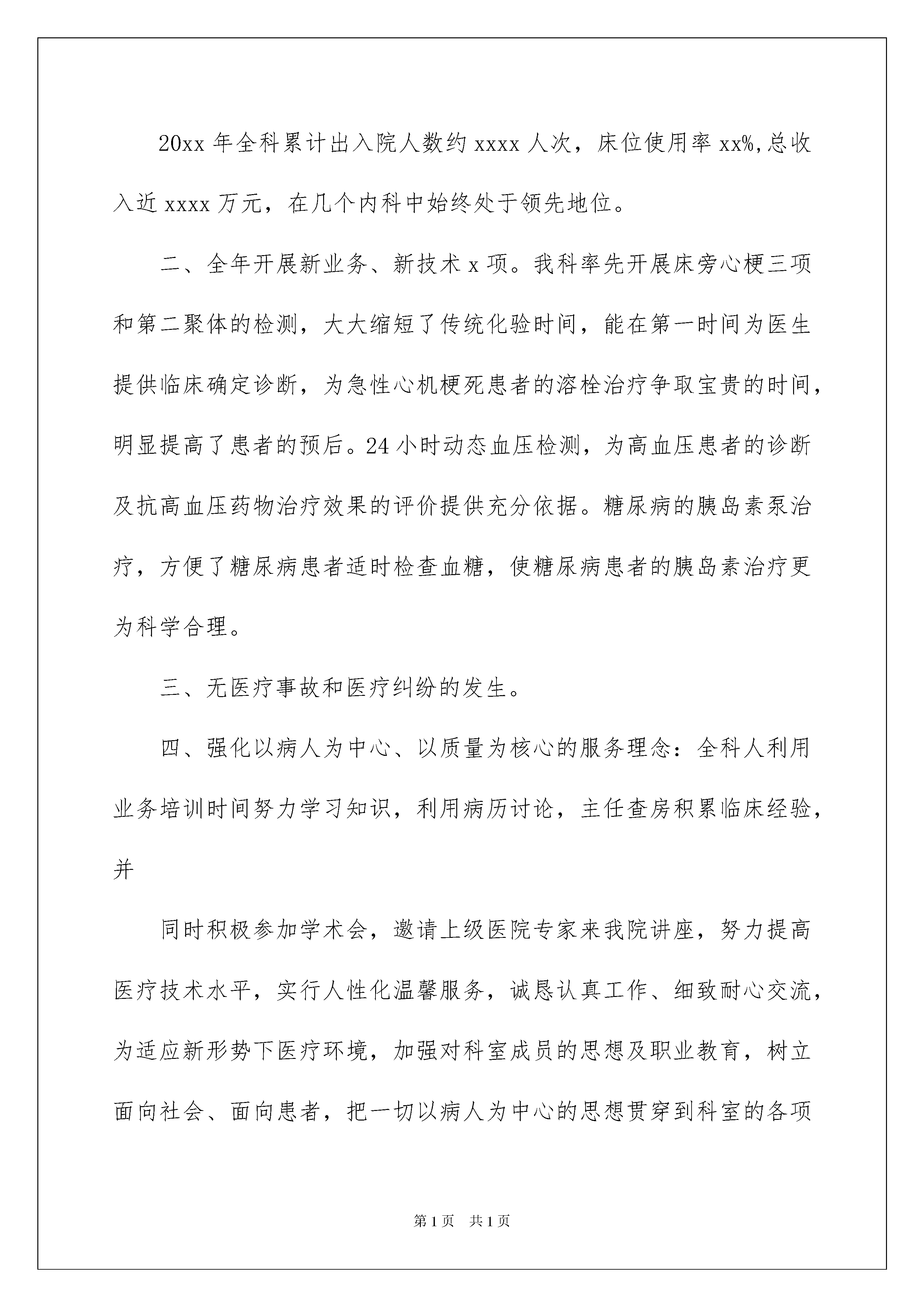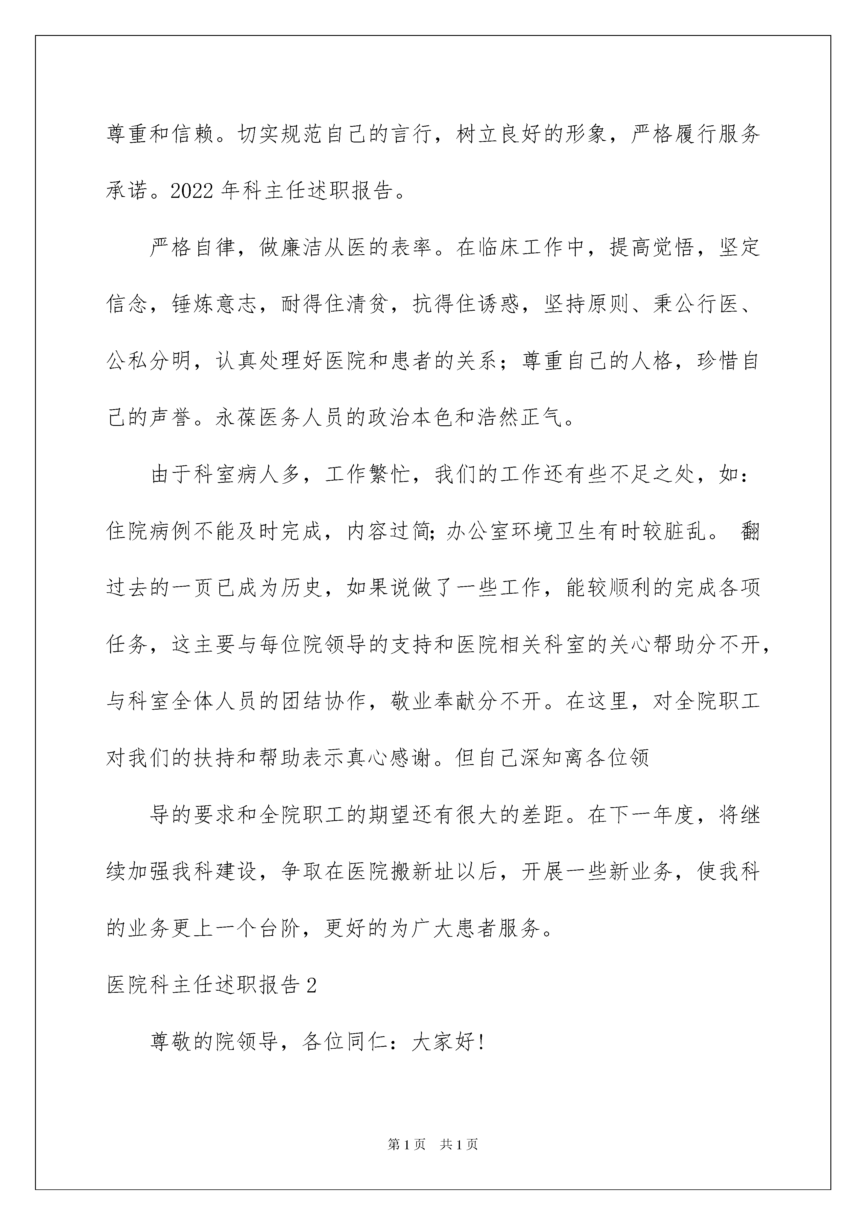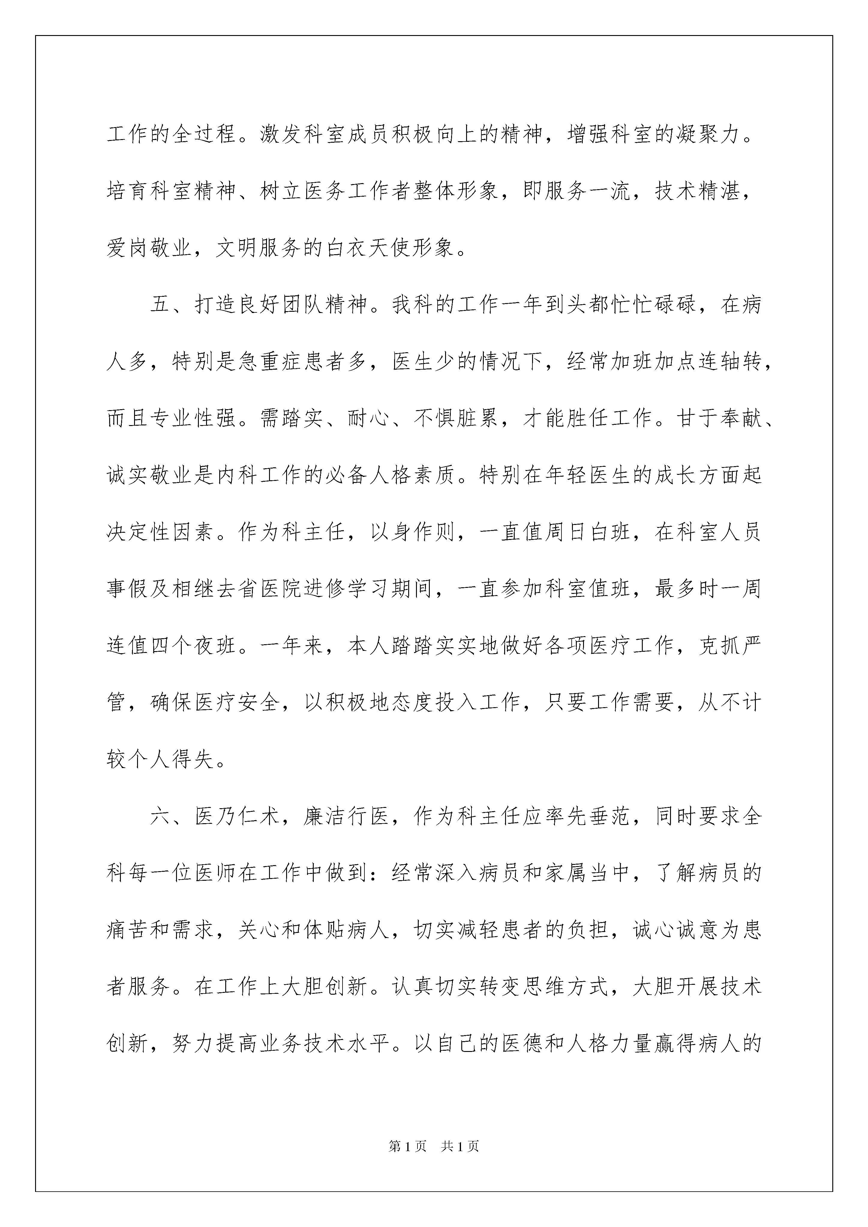 2022医院科主任述职报告医院科主任述职报告随着人们自身素质提升,报告使用的次数愈发增长,通常情况下,报告的内容含量大、篇幅较长。其实写报告并没有想象中那么难,以下是我精心整理的医院科主任述职报告,欢迎阅读与收藏。医院科主任述职报告1尊敬的各位领导、各位同事:我科在医院领导的支持与帮助下,以年初制定的工作思路为指导,以提高医院效益为核心,以增强我科综合竞争力为目标,以提高服务质量为重点,全面落实医院管理,强基础,抓规范,顺利通过”二甲医院复审”,实现了全年业务制度规范化,管理科学化,社会效益最大化,有力地推动了我科各项业务水平的进一步提高。作为我科主任的这一年来,本人认真履行科主任职责,尽职尽责,为更好服务于患者,鞭策自己,今天向各位领导及同事汇报一年来的工作,不当之处,请各位领导、同事批评指正:一、加强学习,不断提高自己的思想水平和业务素质。20xx年全科累计出入院人数约xxxx人次,床位使用率xx%,总收入近xxxx万元,在几个内科中始终处于领先地位。二、全年开展新业务、新技术x项。我科率先开展床旁心梗三项和第二聚体的检测,大大缩短了传统化验时间,能在第一时间为医生提供临床确定诊断,为急性心机梗死患者的溶栓治疗争取宝贵的时间,明显提高了患者的预后。24小时动态血压检测,为高血压患者的诊断及抗高血压药物治疗效果的评价提供充分依据。糖尿病的胰岛素泵治疗,方便了糖尿病患者适时检查血糖,使糖尿病患者的胰岛素治疗更为科学合理。三、无医疗事故和医疗纠纷的发生。四、强化以病人为中心、以质量为核心的服务理念:全科人利用业务培训时间努力学习知识,利用病历讨论,主任查房积累临床经验,并同时积极参加学术会,邀请上级医院专家来我院讲座,努力提高医疗技术水平,实行人性化温馨服务,诚恳认真工作、细致耐心交流,为适应新形势下医疗环境,加强对科室成员的思想及职业教育,树立面向社会、面向患者,把一切以病人为中心的思想贯穿到科室的各项工作的全过程。激发科室成员积极向上的精神,增强科室的凝聚力。培育科室精神、树立医务工作者整体形象,即服务一流,技术精湛,爱岗敬业,文明服务的白衣天使形象。五、打造良好团队精神。我科的工作一年到头都忙忙碌碌,在病人多,特别是急重症患者多,医生少的情况下,经常加班加点连轴转,而且专业性强。需踏实、耐心、不惧脏累,才能胜任工作。甘于奉献、诚实敬业是内科工作的必备人格素质。特别在年轻医生的成长方面起决定性因素。作为科主任,以身作则,一直值周日白班,在科室人员事假及相继去省医院进修学习期间,一直参加科室值班,最多时一周连值四个夜班。一年来,本人踏踏实实地做好各项医疗工作,克抓严管,确保医疗安全,以积极地态度投入工作,只要工作需要,从不计较个人得失。六、医乃仁术,廉洁行医,作为科主任应率先垂范,同时要求全科每一位医师在工作中做到:经常深入病员和家属当中,了解病员的痛苦和需求,关心和体贴病人,切实减轻患者的负担,诚心诚意为患者服务。在工作上大胆创新。认真切实转变思维方式,大胆开展技术创新,努力提高业务技术水平。以自己的医德和人格力量赢得病人的尊重和信赖。切实规范自己的言行,树立良好的形象,严格履行服务承诺。2022年科主任述职报告。严格自律,做廉洁从医的表率。在临床工作中,提高觉悟,坚定信念,锤炼意志,耐得住清贫,抗得住诱惑,坚持原则、秉公行医、公私分明,认真处理好医院和患者的关系;尊重自己的人格,珍惜自己的声誉。永葆医务人员的政治本色和浩然正气。由于科室病人多,工作繁忙,我们的工作还有些不足之处,如:住院病例不能及时完成,内容过简;办公室环境卫生有时较脏乱。翻过去的一页已成为历史,如果说做了一些工作,能较顺利的完成各项任务,这主要与每位院领导的支持和医院相关科室的关心帮助分不开,与科室全体人员的团结协作,敬业奉献分不开。在这里,对全院职工对我们的扶持和帮助表示真心感谢。但自己深知离各位领导的要求和全院职工的期望还有很大的差距。在下一年度,将继续加强我科建设,争取在医院搬新址以后,开展一些新业务,使我科的业务更上一个台阶,更好的为广大患者服务。医院科主任述职报告2尊敬的院领导,各位同仁:大家好!伴随着年末的到来,我们又兢兢业业地走过了一年。在这一年里我们始终不忘“一切以病人为中心”的理念,用自己的爱心、热心、诚心满足每一位病人的需求,努力争创“社会满足、病人满足、自己满足”,把救死扶伤的工作作风贯串于临床工作的全过程。这一年来在院领导的正确领导和支持下,在全科医护职员的密切配合和共同努力下,齐心协力,圆满地完成了各项工作任务,现将215年工作情况述职如下:一、政治思想方面终将政治思想工作