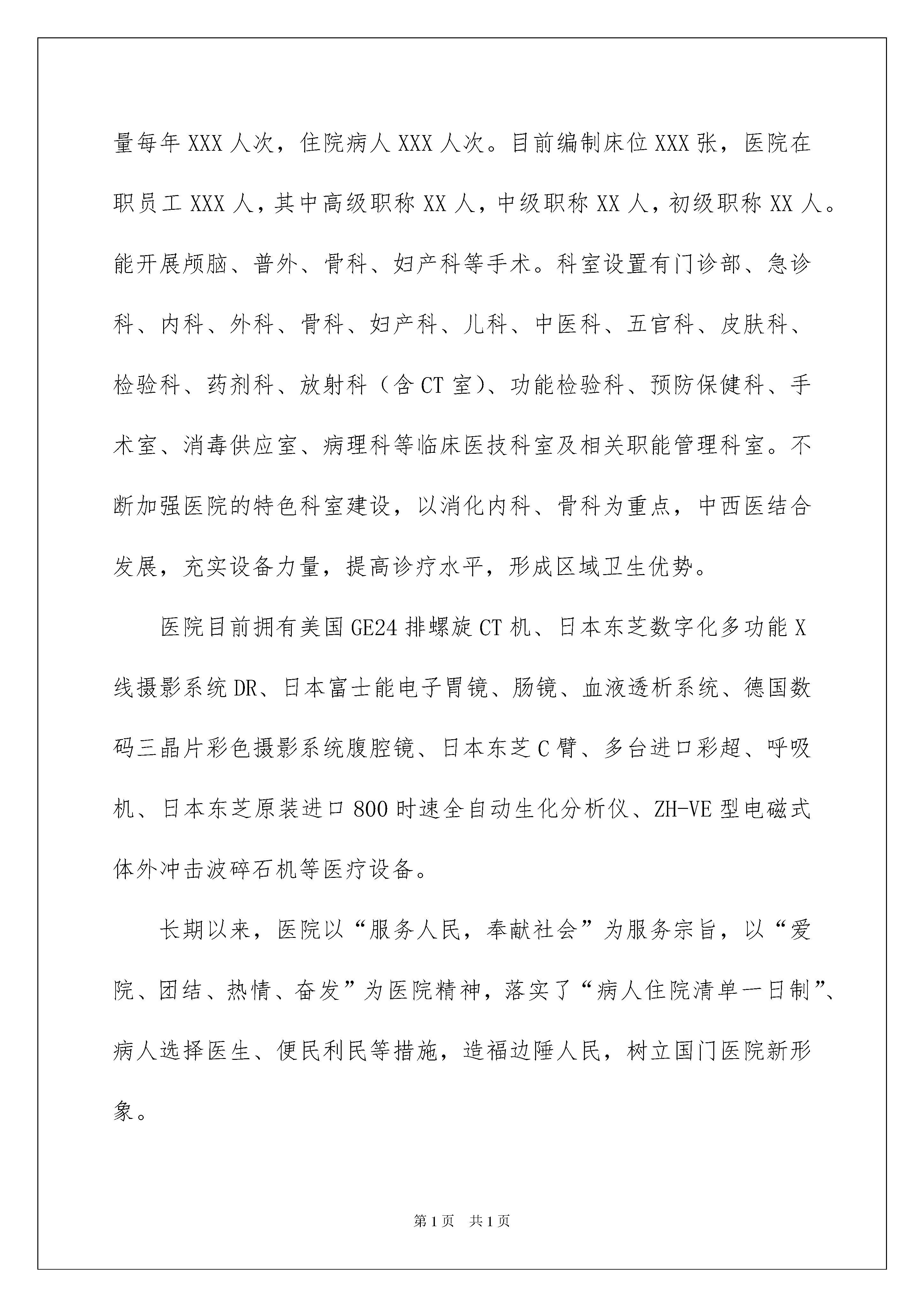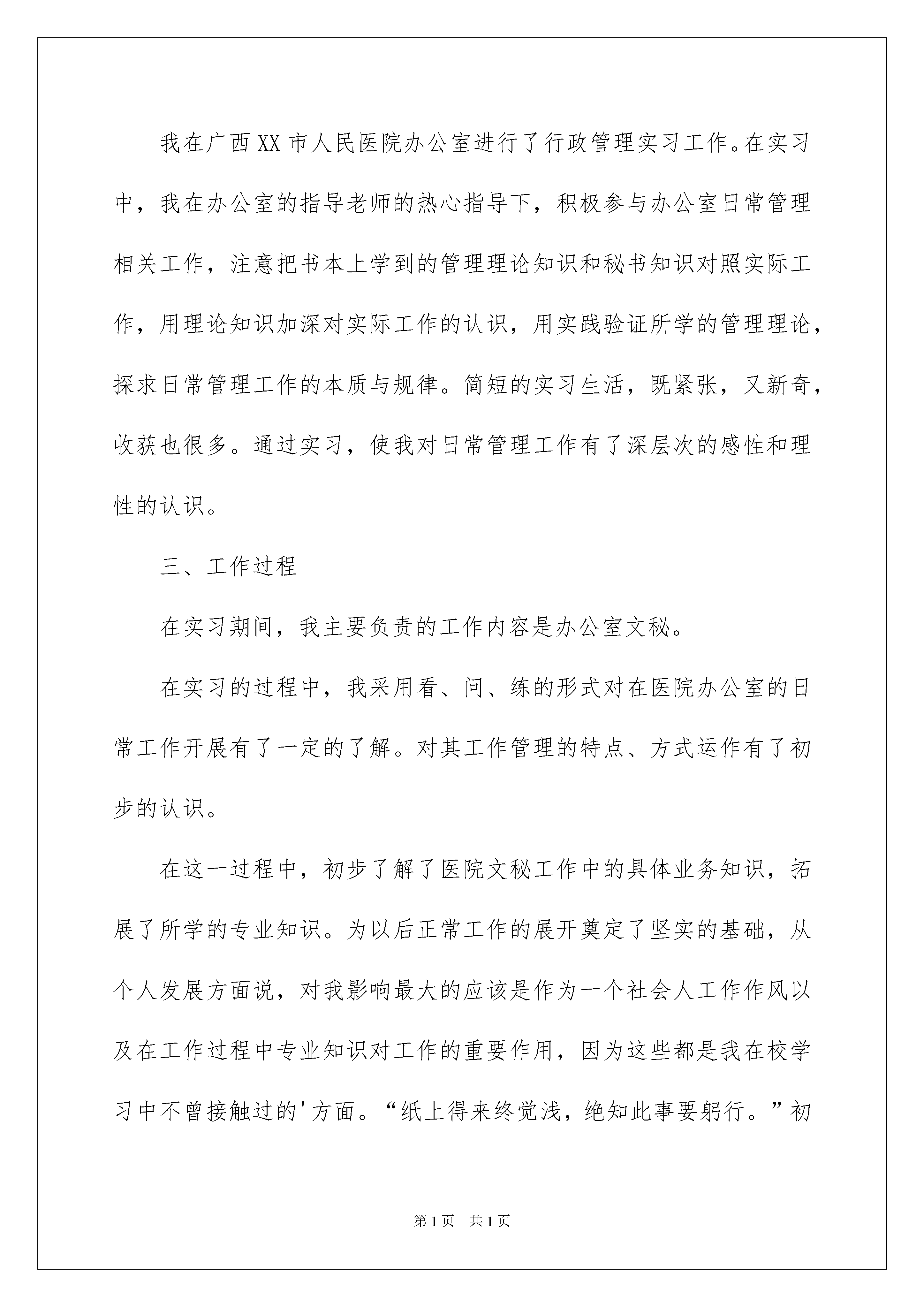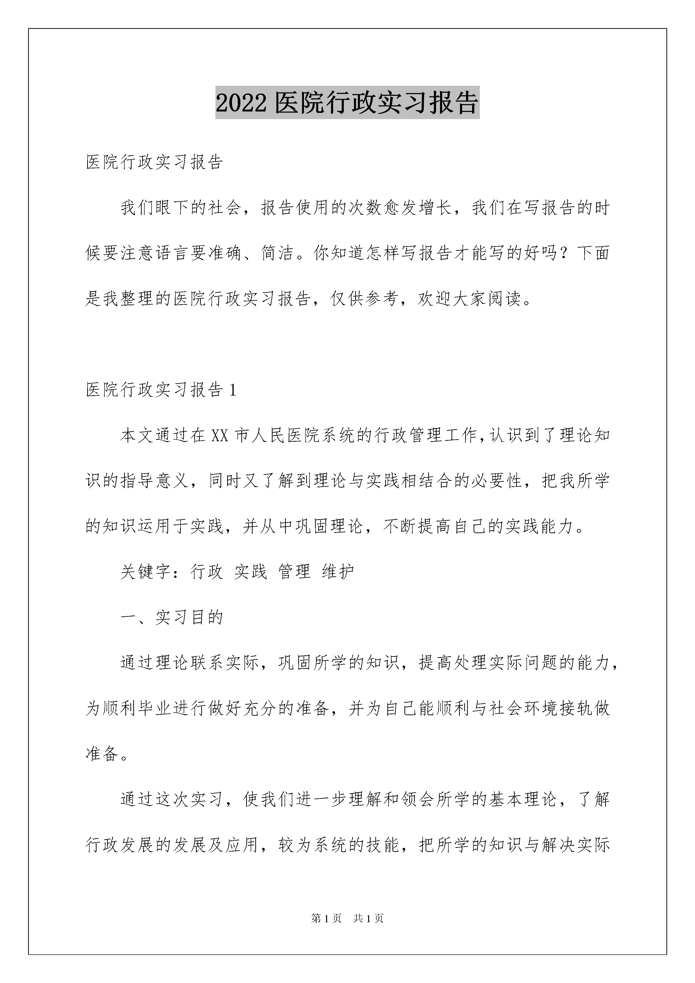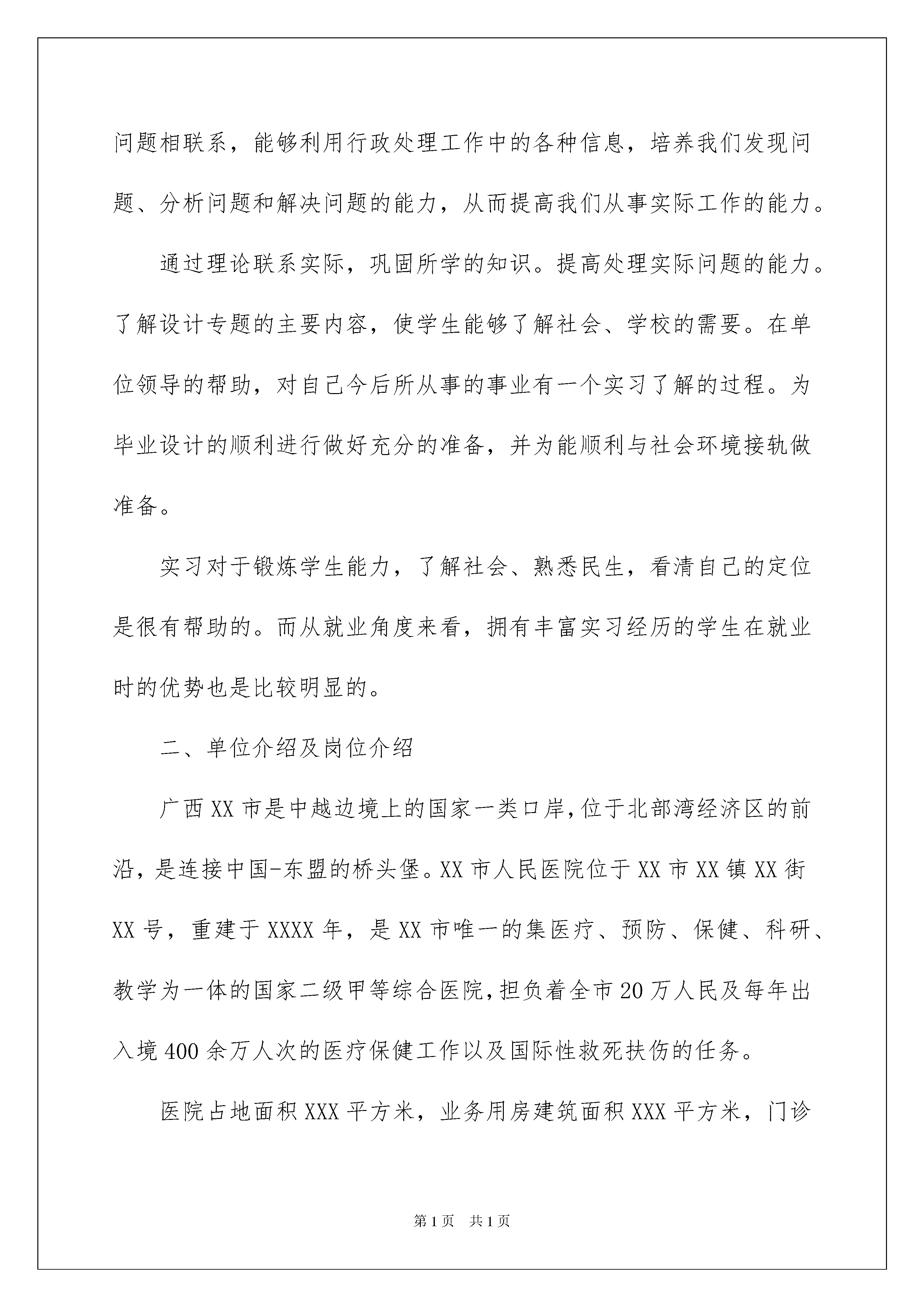 2022医院行政实习报告医院行政实习报告我们眼下的社会,报告使用的次数愈发增长,我们在写报告的时候要注意语言要准确、简洁。你知道怎样写报告才能写的好吗?下面是我整理的医院行政实习报告,仅供参考,欢迎大家阅读。医院行政实习报告1本文通过在XX市人民医院系统的行政管理工作,认识到了理论知识的指导意义,同时又了解到理论与实践相结合的必要性,把我所学的知识运用于实践,并从中巩固理论,不断提高自己的实践能力。关键字:行政实践管理维护一、实习目的通过理论联系实际,巩固所学的知识,提高处理实际问题的能力,为顺利毕业进行做好充分的准备,并为自己能顺利与社会环境接轨做准备。通过这次实习,使我们进一步理解和领会所学的基本理论,了解行政发展的发展及应用,较为系统的技能,把所学的知识与解决实际问题相联系,能够利用行政处理工作中的各种信息,培养我们发现问题、分析问题和解决问题的能力,从而提高我们从事实际工作的能力。通过理论联系实际,巩固所学的知识。提高处理实际问题的能力。了解设计专题的主要内容,使学生能够了解社会、学校的需要。在单位领导的帮助,对自己今后所从事的事业有一个实习了解的过程。为毕业设计的顺利进行做好充分的准备,并为能顺利与社会环境接轨做准备。实习对于锻炼学生能力,了解社会、熟悉民生,看清自己的定位是很有帮助的。而从就业角度来看,拥有丰富实习经历的学生在就业时的优势也是比较明显的。二、单位介绍及岗位介绍广西XX市是中越边境上的国家一类口岸,位于北部湾经济区的前沿,是连接中国-东盟的桥头堡。XX市人民医院位于XX市XX镇XX街XX号,重建于XXXX年,是XX市唯一的集医疗、预防、保健、科研、教学为一体的国家二级甲等综合医院,担负着全市20万人民及每年出入境400余万人次的医疗保健工作以及国际性救死扶伤的任务。医院占地面积XXX平方米,业务用房建筑面积XXX平方米,门诊量每年XXX人次,住院病人XXX人次。目前编制床位XXX张,医院在职员工XXX人,其中高级职称XX人,中级职称XX人,初级职称XX人。能开展颅脑、普外、骨科、妇产科等手术。科室设置有门诊部、急诊科、内科、外科、骨科、妇产科、儿科、中医科、五官科、皮肤科、检验科、药剂科、放射科(含CT室)、功能检验科、预防保健科、手术室、消毒供应室、病理科等临床医技科室及相关职能管理科室。不断加强医院的特色科室建设,以消化内科、骨科为重点,中西医结合发展,充实设备力量,提高诊疗水平,形成区域卫生优势。医院目前拥有美国GE24排螺旋CT机、日本东芝数字化多功能X线摄影系统DR、日本富士能电子胃镜、肠镜、血液透析系统、德国数码三晶片彩色摄影系统腹腔镜、日本东芝C臂、多台进口彩超、呼吸机、日本东芝原装进口800时速全自动生化分析仪、ZH-VE型电磁式体外冲击波碎石机等医疗设备。长期以来,医院以“服务人民,奉献社会”为服务宗旨,以“爱院、团结、热情、奋发”为医院精神,落实了“病人住院清单一日制”、病人选择医生、便民利民等措施,造福边陲人民,树立国门医院新形象。我在广西XX市人民医院办公室进行了行政管理实习工作。在实习中,我在办公室的指导老师的热心指导下,积极参与办公室日常管理相关工作,注意把书本上学到的管理理论知识和秘书知识对照实际工作,用理论知识加深对实际工作的认识,用实践验证所学的管理理论,探求日常管理工作的本质与规律。简短的实习生活,既紧张,又新奇,收获也很多。通过实习,使我对日常管理工作有了深层次的感性和理性的认识。三、工作过程在实习期间,我主要负责的工作内容是办公室文秘。在实习的过程中,我采用看、问、练的形式对在医院办公室的日常工作开展有了一定的了解。对其工作管理的特点、方式运作有了初步的认识。在这一过程中,初步了解了医院文秘工作中的具体业务知识,拓展了所学的专业知识。为以后正常工作的展开奠定了坚实的基础,从个人发展方面说,对我影响最大的应该是作为一个社会人工作作风以及在工作过程中专业知识对工作的重要作用,因为这些都是我在校学习中不曾接触过的'方面。“纸上得来终觉浅,绝知此事要躬行。”初读此句时,我并没有特别的感觉。然而就在这不长的实习后,我不仅真正明白了它的意义,更深切体会到它的内涵。对我而言,社会和单位才是最好的大学,我发现自己在课本上学到的理论知识如果不与公司工作实践相结合就显得太有限,太浅薄。作为实习生,我严格的要求自己,甘于吃苦,任劳任怨,尽心尽力,遵守公司的规章制度,主动打扫办公室卫生、尊重领导、维护领导的威信、适应领导的工作习惯、工作方法、工作风格以及工作特点、主动向领导、向办公室同志学习,取长补短,加强沟通,增进了解,提升能力