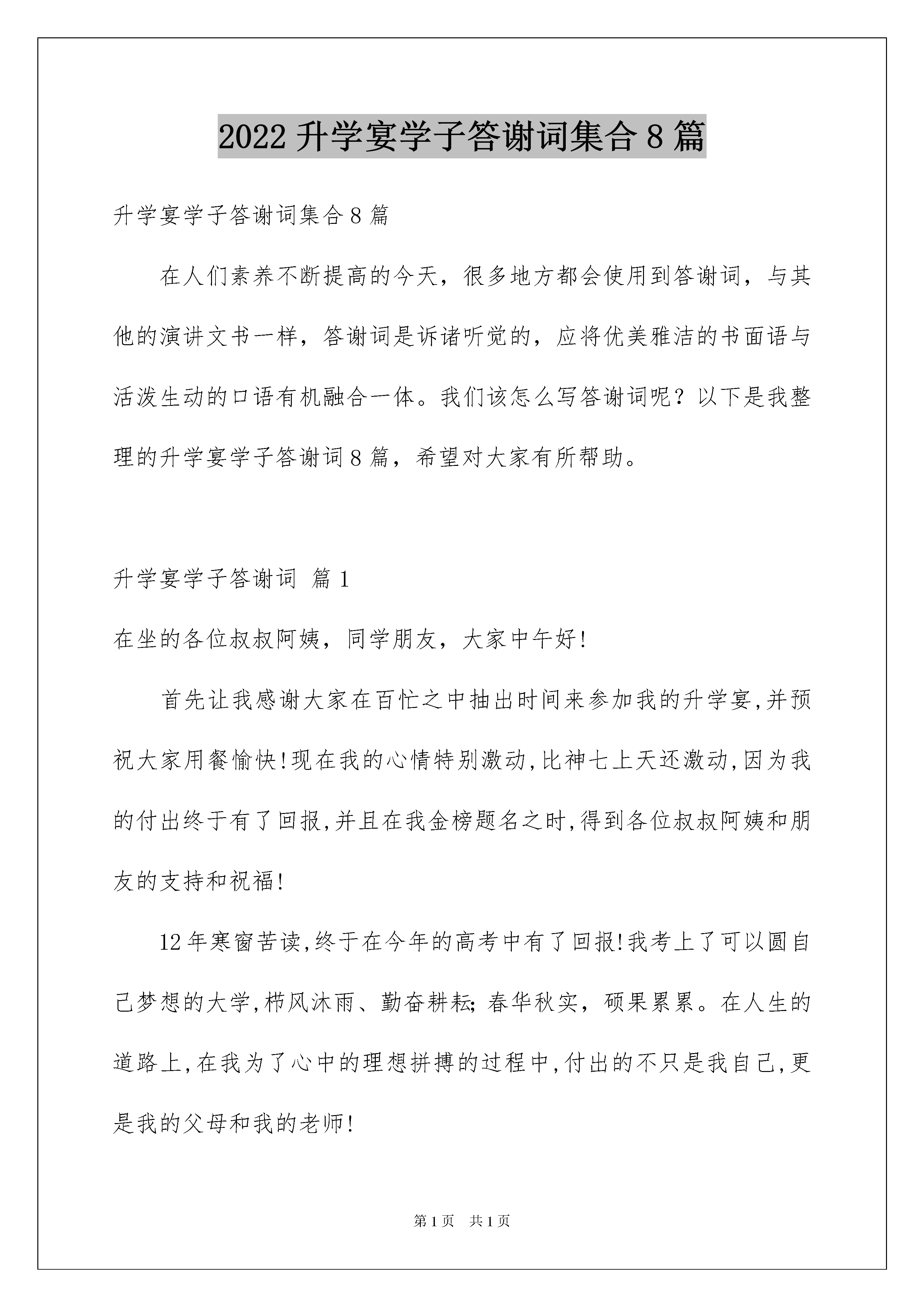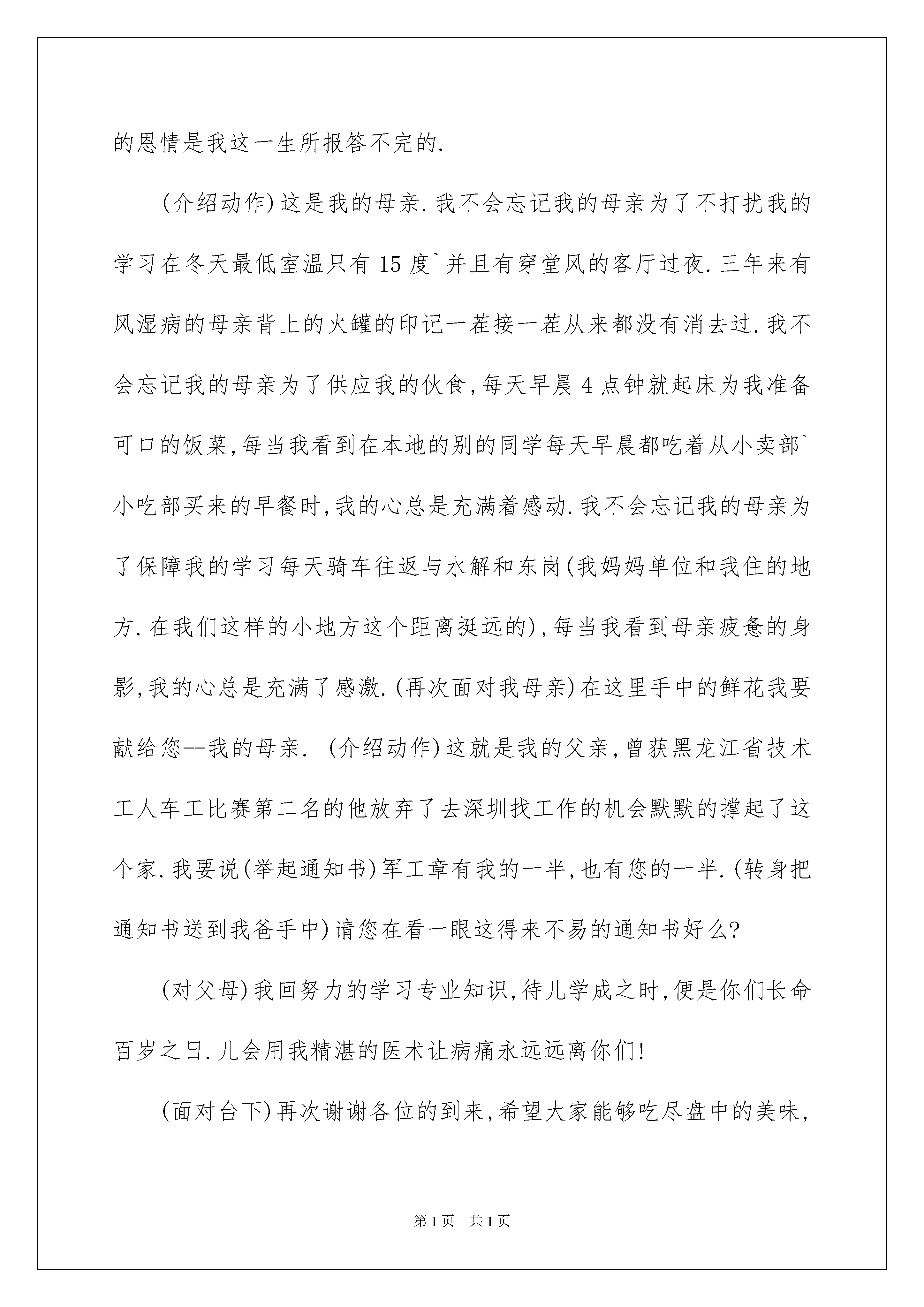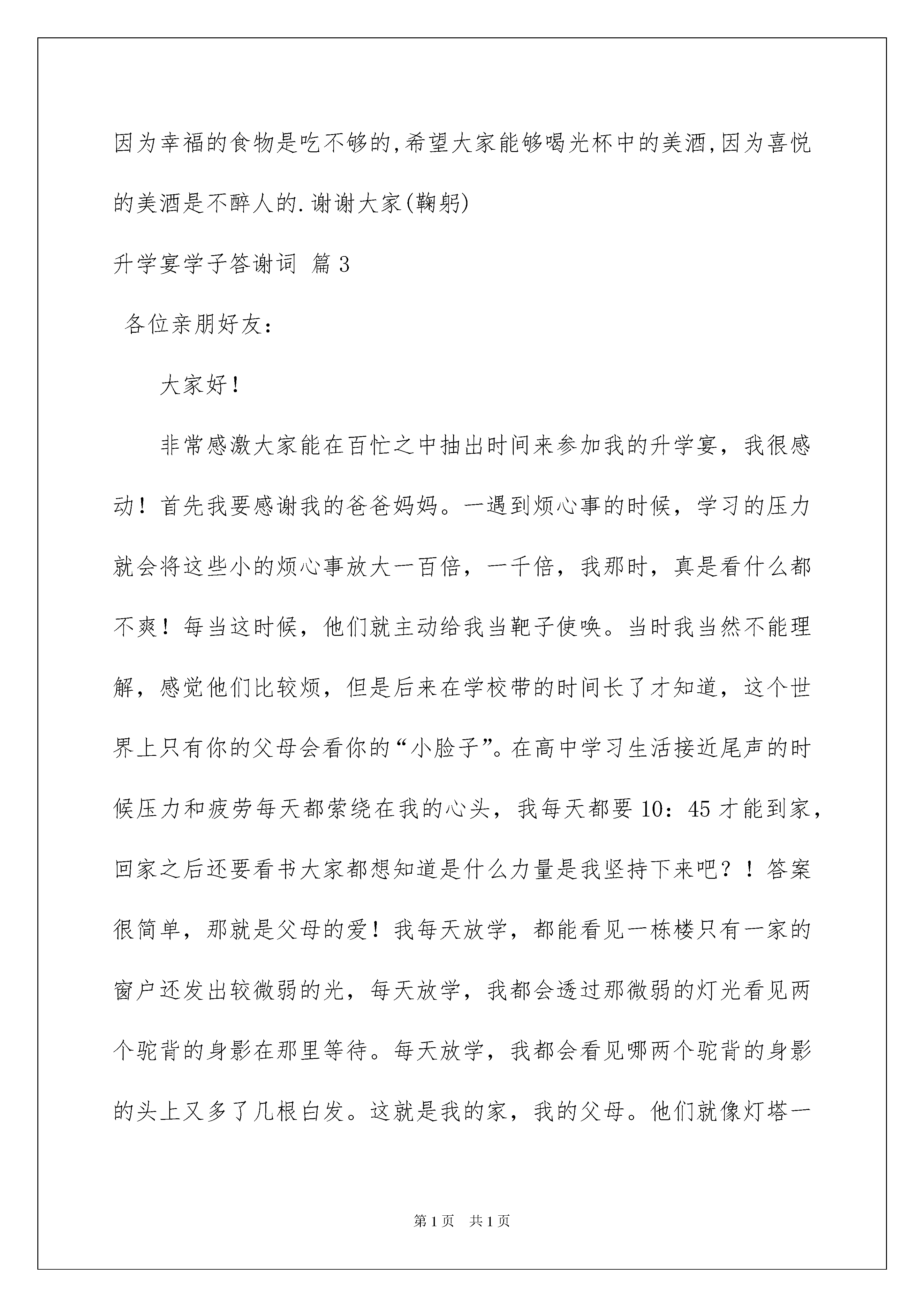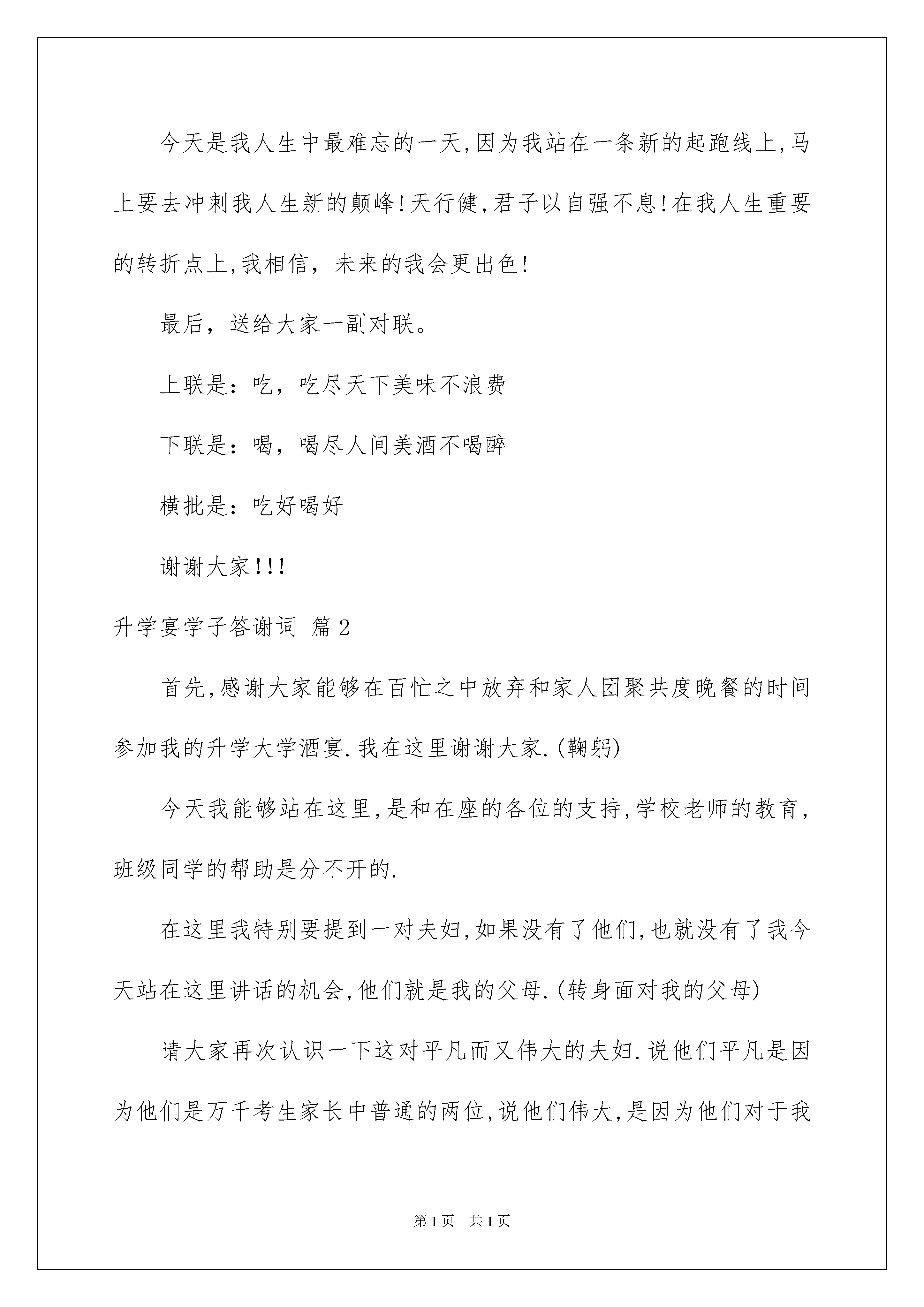 2022升学宴学子答谢词集合8篇升学宴学子答谢词集合8篇在人们素养不断提高的今天,很多地方都会使用到答谢词,与其他的演讲文书一样,答谢词是诉诸听觉的,应将优美雅洁的书面语与活泼生动的口语有机融合一体。我们该怎么写答谢词呢?以下是我整理的升学宴学子答谢词8篇,希望对大家有所帮助。升学宴学子答谢词篇1在坐的各位叔叔阿姨,同学朋友,大家中午好!首先让我感谢大家在百忙之中抽出时间来参加我的升学宴,并预祝大家用餐愉快!现在我的心情特别激动,比神七上天还激动,因为我的付出终于有了回报,并且在我金榜题名之时,得到各位叔叔阿姨和朋友的支持和祝福!12年寒窗苦读,终于在今年的高考中有了回报!我考上了可以圆自己梦想的大学,栉风沐雨、勤奋耕耘;春华秋实,硕果累累。在人生的道路上,在我为了心中的理想拼搏的过程中,付出的不只是我自己,更是我的父母和我的老师!从我呱呱坠地,咿呀学语,到津津求学,长大成人。我想我最应该感谢的就是我生我育我的父母,一对平凡又伟大的父母。没有他们的拼搏和关爱,就没有我生活上的舒适,学习上的顺利,当然就更不会有我金榜题名的今天!他们不仅在生活上为我付出,还教育我如何做人,如何成为对国家有用的人才!在我最苦最累的高中三年里,我的妈妈甚至比我还累,除了每天的在外奔波,她还要收拾家务,照顾我。在学校遇到什么烦心事,我的妈妈甚至比我还急。记得我刚上学的时候,妈妈的皮肤白白的,嫩嫩的,不似现在,已有了细细的纹理,20年来的时世沧桑,有酸楚,有欣慰,更多的便是对我的付出。现在我长大了,或许我领悟的,不过是妈妈对我爱的十分之一,我曾暗暗发誓,我一定要做出成绩来回报妈妈。虽然我做的还不够好,但我会更加努力,在此我想对她说一声。妈妈,辛苦了!为了这一天我苦读了12年,尤其是在一高的1000多个日日夜夜,有过成功,有过挫折,但是青春没有失败,一分耕耘就有一分收获,今天不是我学习生活的终结,而是我人生新征程的开始!马上我就要成为一名大学生,一只脚已经踏入社会,我会不断用知识去武装自己,路漫漫其修远兮,吾将上下而求索!用我所掌握的知识去贡献社会,报效祖国!今天是我人生中最难忘的一天,因为我站在一条新的起跑线上,马上要去冲刺我人生新的颠峰!天行健,君子以自强不息!在我人生重要的转折点上,我相信,未来的我会更出色!最后,送给大家一副对联。上联是:吃,吃尽天下美味不浪费下联是:喝,喝尽人间美酒不喝醉横批是:吃好喝好谢谢大家!!!升学宴学子答谢词篇2首先,感谢大家能够在百忙之中放弃和家人团聚共度晚餐的时间参加我的升学大学酒宴.我在这里谢谢大家.(鞠躬)今天我能够站在这里,是和在座的各位的支持,学校老师的教育,班级同学的帮助是分不开的.在这里我特别要提到一对夫妇,如果没有了他们,也就没有了我今天站在这里讲话的机会,他们就是我的父母.(转身面对我的父母)请大家再次认识一下这对平凡而又伟大的夫妇.说他们平凡是因为他们是万千考生家长中普通的两位,说他们伟大,是因为他们对于我的恩情是我这一生所报答不完的.(介绍动作)这是我的母亲.我不会忘记我的母亲为了不打扰我的学习在冬天最低室温只有15度`并且有穿堂风的客厅过夜.三年来有风湿病的母亲背上的火罐的印记一茬接一茬从来都没有消去过.我不会忘记我的母亲为了供应我的伙食,每天早晨4点钟就起床为我准备可口的饭菜,每当我看到在本地的别的同学每天早晨都吃着从小卖部`小吃部买来的早餐时,我的心总是充满着感动.我不会忘记我的母亲为了保障我的学习每天骑车往返与水解和东岗(我妈妈单位和我住的地方.在我们这样的小地方这个距离挺远的),每当我看到母亲疲惫的身影,我的心总是充满了感激.(再次面对我母亲)在这里手中的鲜花我要献给您--我的母亲.(介绍动作)这就是我的父亲,曾获黑龙江省技术工人车工比赛第二名的他放弃了去深圳找工作的机会默默的撑起了这个家.我要说(举起通知书)军工章有我的一半,也有您的一半.(转身把通知书送到我爸手中)请您在看一眼这得来不易的通知书好么?(对父母)我回努力的学习专业知识,待儿学成之时,便是你们长命百岁之日.儿会用我精湛的医术让病痛永远远离你们!(面对台下)再次谢谢各位的到来,希望大家能够吃尽盘中的美味,因为幸福的食物是吃不够的,希望大家能够喝光杯中的美酒,因为喜悦的美酒是不醉人的.谢谢大家(鞠躬)升学宴学子答谢词篇3各位亲朋好友:大家好!非常感激大家能在百忙之中抽出时间来参加我的升学宴,我很感动!首先我要感谢我的爸爸妈妈。一遇到烦心事的时候,学习的压力就会将这些小的烦心事放大一百倍,一千倍,我那时,真是看什么都不爽!每当这时候,他们就主动给我当靶子使唤。当时我当然不能
