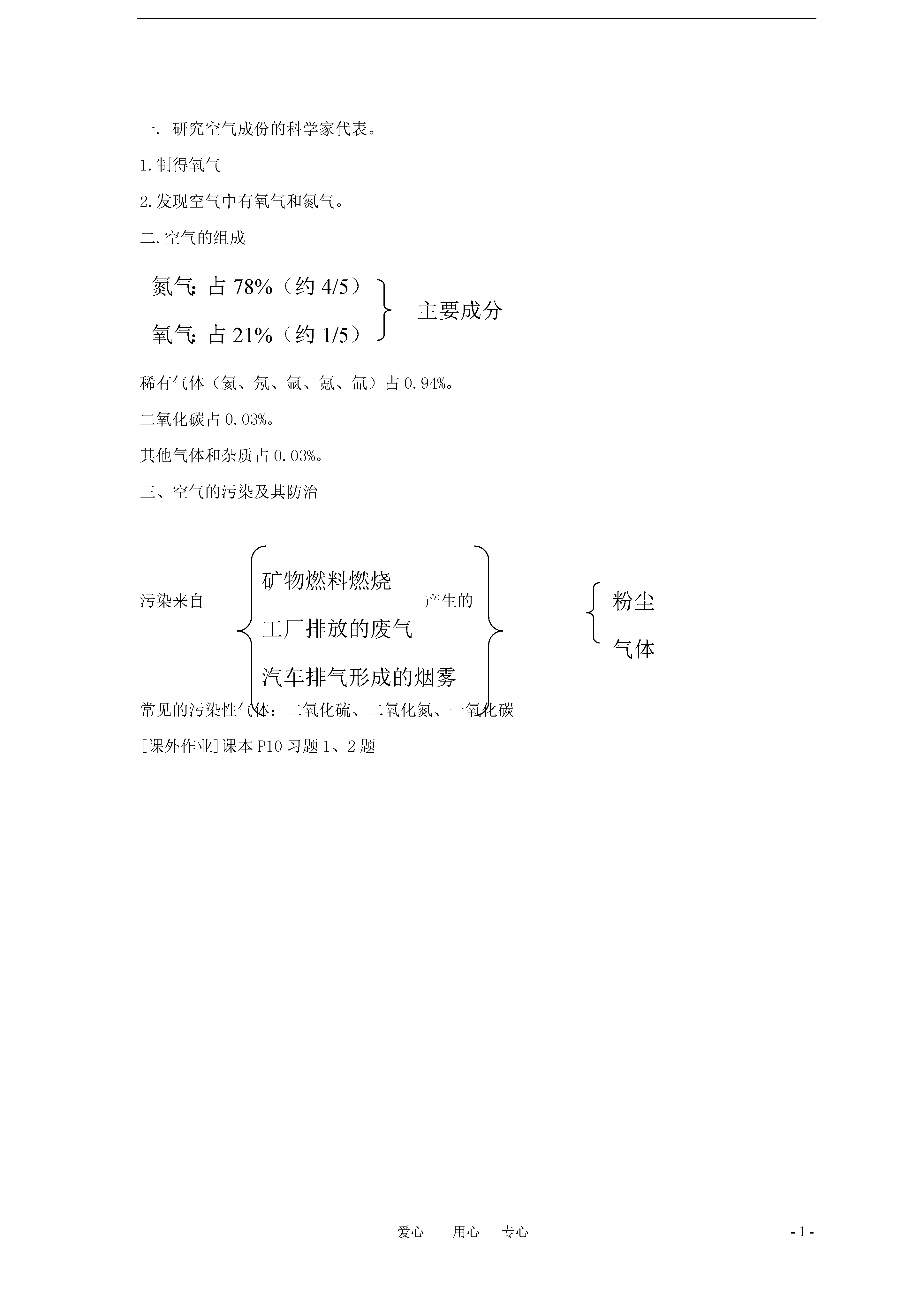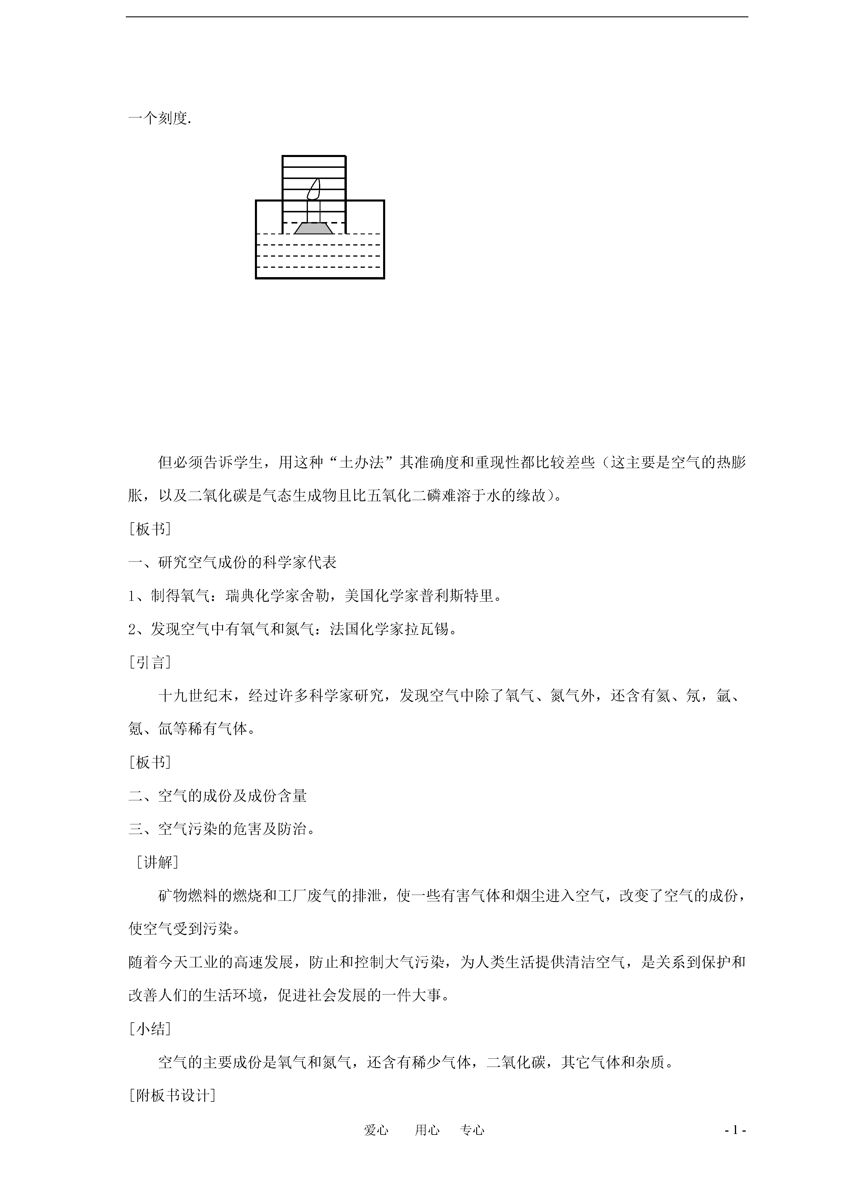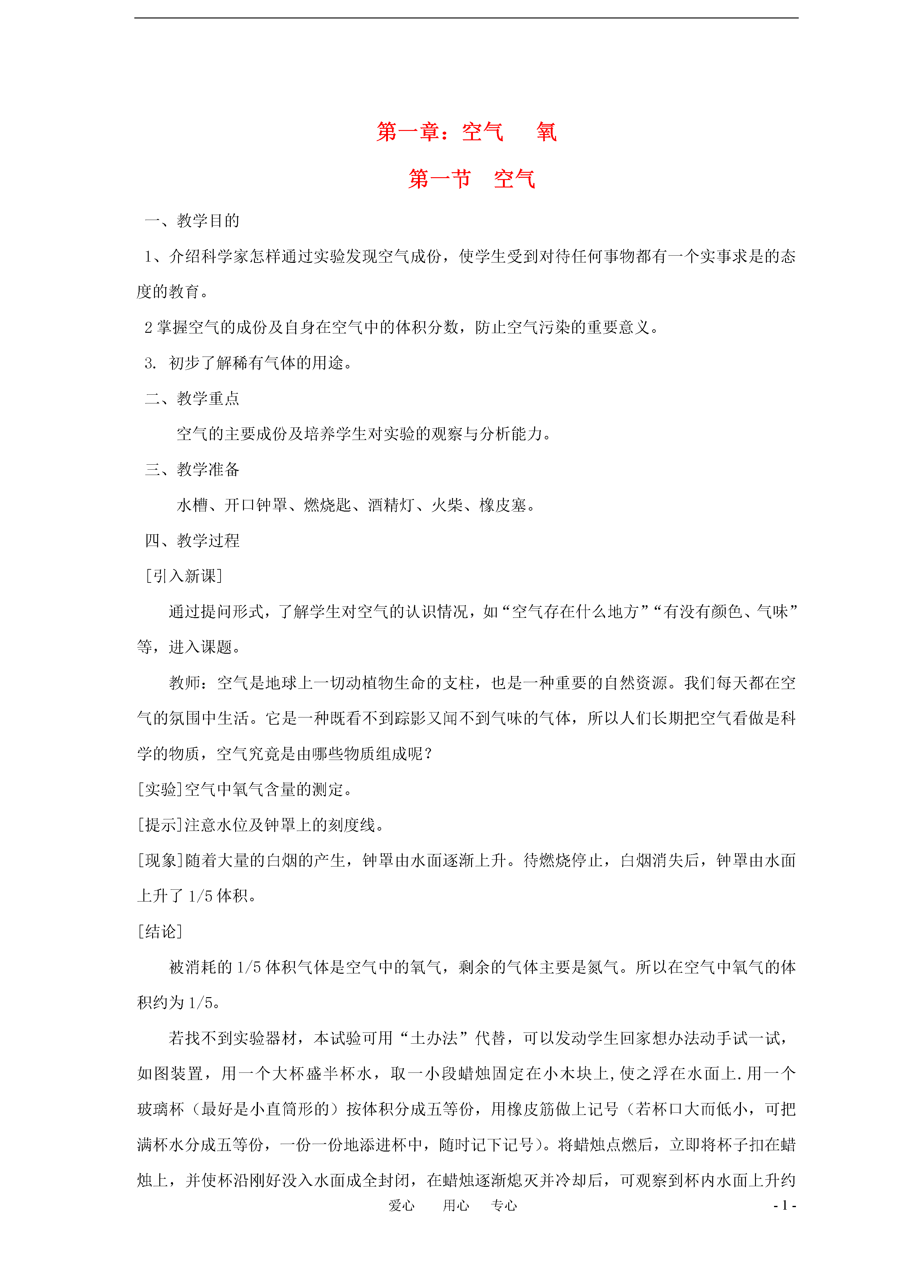 -1-爱心用心专心第一章:空气氧第一节空气一、教学目的1、介绍科学家怎样通过实验发现空气成份,使学生受到对待任何事物都有一个实事求是的态度的教育。2掌握空气的成份及自身在空气中的体积分数,防止空气污染的重要意义。3.初步了解稀有气体的用途。二、教学重点空气的主要成份及培养学生对实验的观察与分析能力。三、教学准备水槽、开口钟罩、燃烧匙、酒精灯、火柴、橡皮塞。四、教学过程[引入新课]通过提问形式,了解学生对空气的认识情况,如“空气存在什么地方”“有没有颜色、气味”等,进入课题。教师:空气是地球上一切动植物生命的支柱,也是一种重要的自然资源。我们每天都在空气的氛围中生活。它是一种既看不到踪影又闻不到气味的气体,所以人们长期把空气看做是科学的物质,空气究竟是由哪些物质组成呢?[实验]空气中氧气含量的测定。[提示]注意水位及钟罩上的刻度线。[现象]随着大量的白烟的产生,钟罩由水面逐渐上升。待燃烧停止,白烟消失后,钟罩由水面上升了1/5体积。[结论]被消耗的1/5体积气体是空气中的氧气,剩余的气体主要是氮气。所以在空气中氧气的体积约为1/5。若找不到实验器材,本试验可用“土办法”代替,可以发动学生回家想办法动手试一试,如图装置,用一个大杯盛半杯水,取一小段蜡烛固定在小木块上,使之浮在水面上.用一个玻璃杯(最好是小直筒形的)按体积分成五等份,用橡皮筋做上记号(若杯口大而低小,可把满杯水分成五等份,一份一份地添进杯中,随时记下记号)。将蜡烛点燃后,立即将杯子扣在蜡烛上,并使杯沿刚好没入水面成全封闭,在蜡烛逐渐熄灭并冷却后,可观察到杯内水面上升约一个刻度.但必须告诉学生,用这种“土办法”其准确度和重现性都比较差些(这主要是空气的热膨胀,以及二氧化碳是气态生成物且比五氧化二磷难溶于水的缘故)。[板书]一、研究空气成份的科学家代表1、制得氧气:瑞典化学家舍勒,美国化学家普利斯特里。2、发现空气中有氧气和氮气:法国化学家拉瓦锡。[引言]十九世纪末,经过许多科学家研究,发现空气中除了氧气、氮气外,还含有氦、氖,氩、氪、氙等稀有气体。[板书]二、空气的成份及成份含量三、空气污染的危害及防治。[讲解]矿物燃料的燃烧和工厂废气的排泄,使一些有害气体和烟尘进入空气,改变了空气的成份,使空气受到污染。随着今天工业的高速发展,防止和控制大气污染,为人类生活提供清洁空气,是关系到保护和改善人们的生活环境,促进社会发展的一件大事。[小结]空气的主要成份是氧气和氮气,还含有稀少气体,二氧化碳,其它气体和杂质。[附板书设计]一.研究空气成份的科学家代表。1.制得氧气2.发现空气中有氧气和氮气。二.空气的组成主要成分氮气:占78%(约4/5)氧气:占21%(约1/5)稀有气体(氦、氖、氩、氪、氙)占0.94%。二氧化碳占0.03%。其他气体和杂质占0.03%。三、空气的污染及其防治矿物燃料燃烧工厂排放的废气汽车排气形成的烟雾粉尘气体污染来自产生的常见的污染性气体:二氧化硫、二氧化氮、一氧化碳[课外作业]课本P10习题1、2题