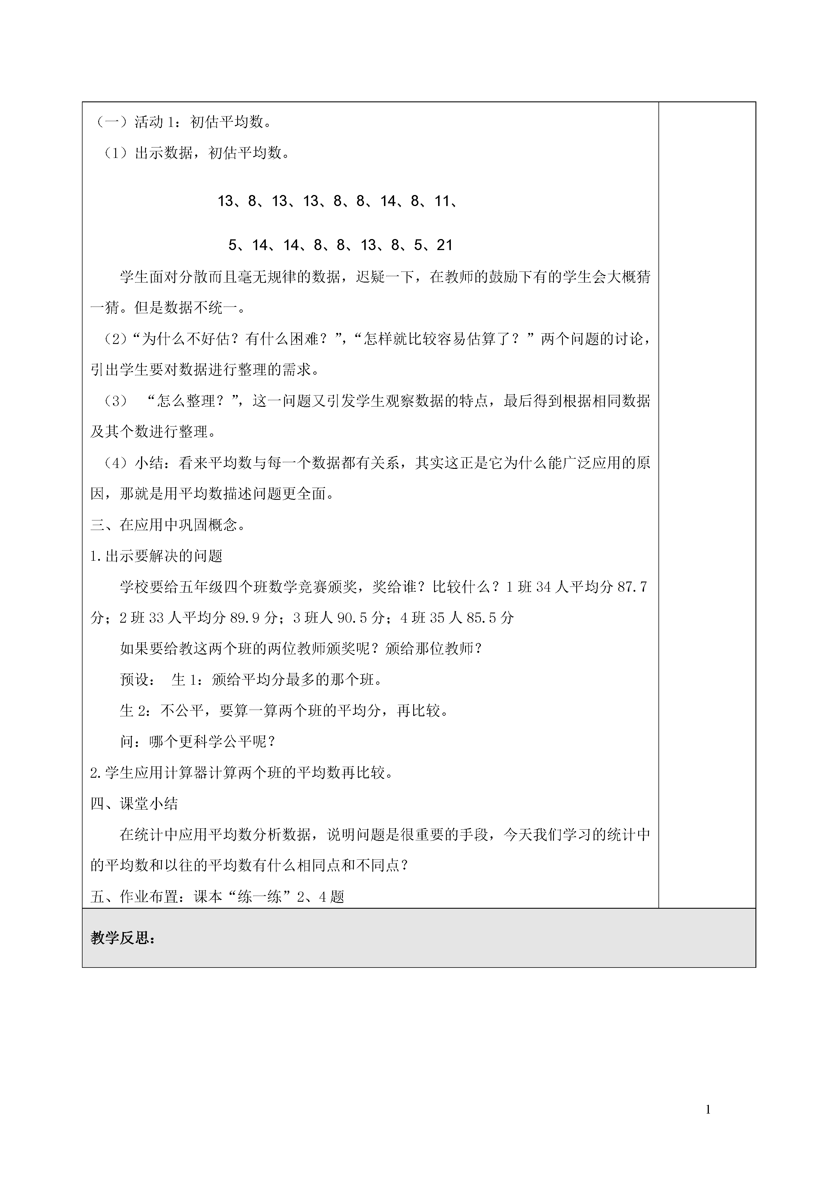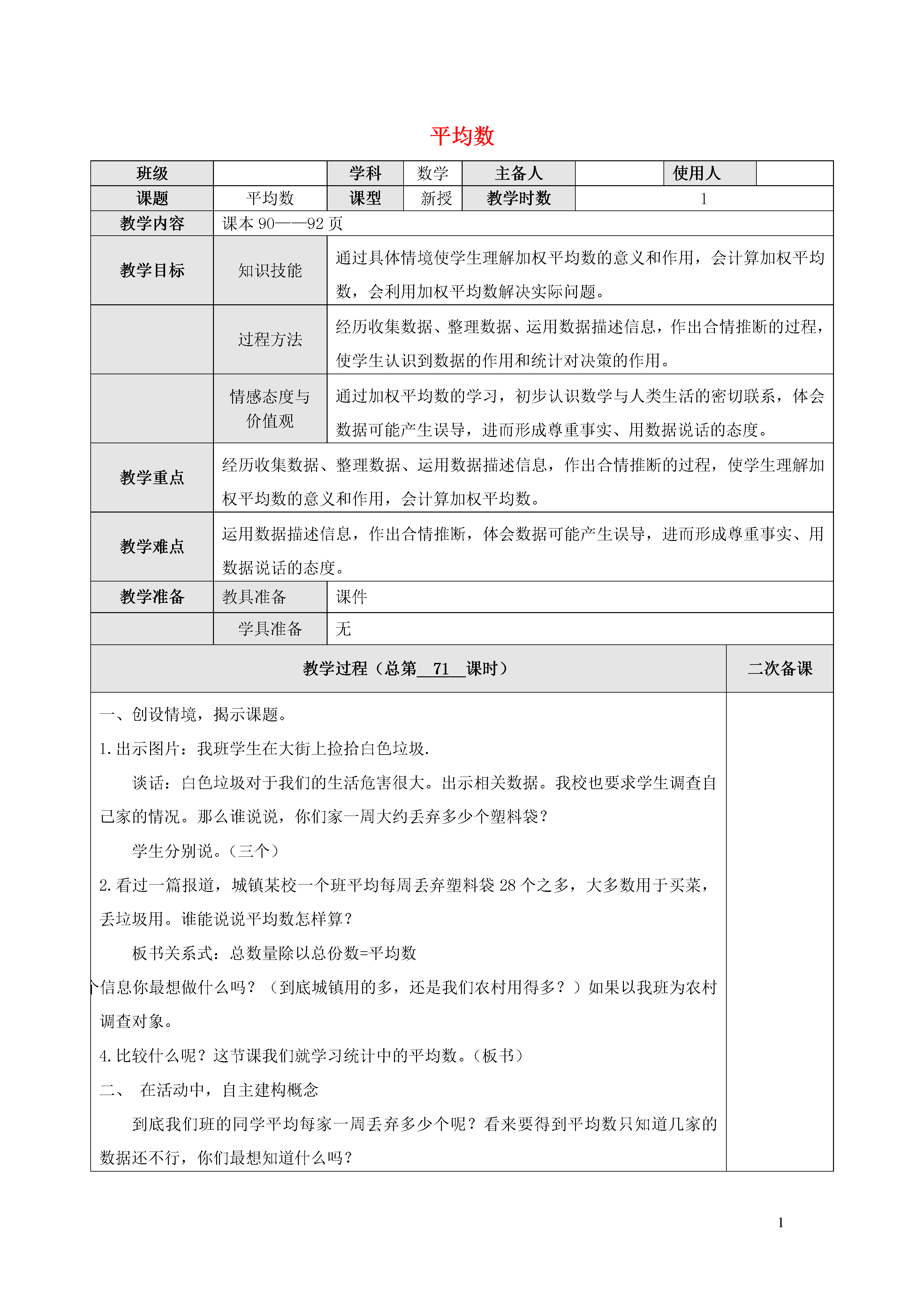 1平均数班级学科数学主备人使用人课题平均数课型新授教学时数1教学内容课本90——92页教学目标知识技能通过具体情境使学生理解加权平均数的意义和作用,会计算加权平均数,会利用加权平均数解决实际问题。过程方法经历收集数据、整理数据、运用数据描述信息,作出合情推断的过程,使学生认识到数据的作用和统计对决策的作用。情感态度与价值观通过加权平均数的学习,初步认识数学与人类生活的密切联系,体会数据可能产生误导,进而形成尊重事实、用数据说话的态度。教学重点经历收集数据、整理数据、运用数据描述信息,作出合情推断的过程,使学生理解加权平均数的意义和作用,会计算加权平均数。教学难点运用数据描述信息,作出合情推断,体会数据可能产生误导,进而形成尊重事实、用数据说话的态度。教学准备教具准备课件学具准备无教学过程(总第71课时)二次备课一、创设情境,揭示课题。1.出示图片:我班学生在大街上捡拾白色垃圾.谈话:白色垃圾对于我们的生活危害很大。出示相关数据。我校也要求学生调查自己家的情况。那么谁说说,你们家一周大约丢弃多少个塑料袋?学生分别说。(三个)2.看过一篇报道,城镇某校一个班平均每周丢弃塑料袋28个之多,大多数用于买菜,丢垃圾用。谁能说说平均数怎样算?板书关系式:总数量除以总份数=平均数3.看到这个信息你最想做什么吗?(到底城镇用的多,还是我们农村用得多?)如果以我班为农村调查对象。4.比较什么呢?这节课我们就学习统计中的平均数。(板书)二、在活动中,自主建构概念到底我们班的同学平均每家一周丢弃多少个呢?看来要得到平均数只知道几家的数据还不行,你们最想知道什么吗?活动1:初估平均数。(1)出示数据,初估平均数。13、8、13、13、8、8、14、8、11、5、14、14、8、8、13、8、5、2114、13、5、8、5、8、14、8、13、8、13、8、8、14、8、8、14、14、学生面对分散而且毫无规律的数据,迟疑一下,在教师的鼓励下有的学生会大概猜一猜。但是数据不统一。(2)“为什么不好估?有什么困难?”,“怎样就比较容易估算了?”两个问题的讨论,引出学生要对数据进行整理的需求。(3)“怎么整理?”,这一问题又引发学生观察数据的特点,最后得到根据相同数据及其个数进行整理。(4)小结:看来平均数与每一个数据都有关系,其实这正是它为什么能广泛应用的原因,那就是用平均数描述问题更全面。三、在应用中巩固概念。1.出示要解决的问题学校要给五年级四个班数学竞赛颁奖,奖给谁?比较什么?1班34人平均分87.7分;2班33人平均分89.9分;3班人90.5分;4班35人85.5分如果要给教这两个班的两位教师颁奖呢?颁给那位教师?预设:生1:颁给平均分最多的那个班。生2:不公平,要算一算两个班的平均分,再比较。问:哪个更科学公平呢?2.学生应用计算器计算两个班的平均数再比较。四、课堂小结在统计中应用平均数分析数据,说明问题是很重要的手段,今天我们学习的统计中的平均数和以往的平均数有什么相同点和不同点?五、作业布置:课本“练一练”2、4题教学反思: