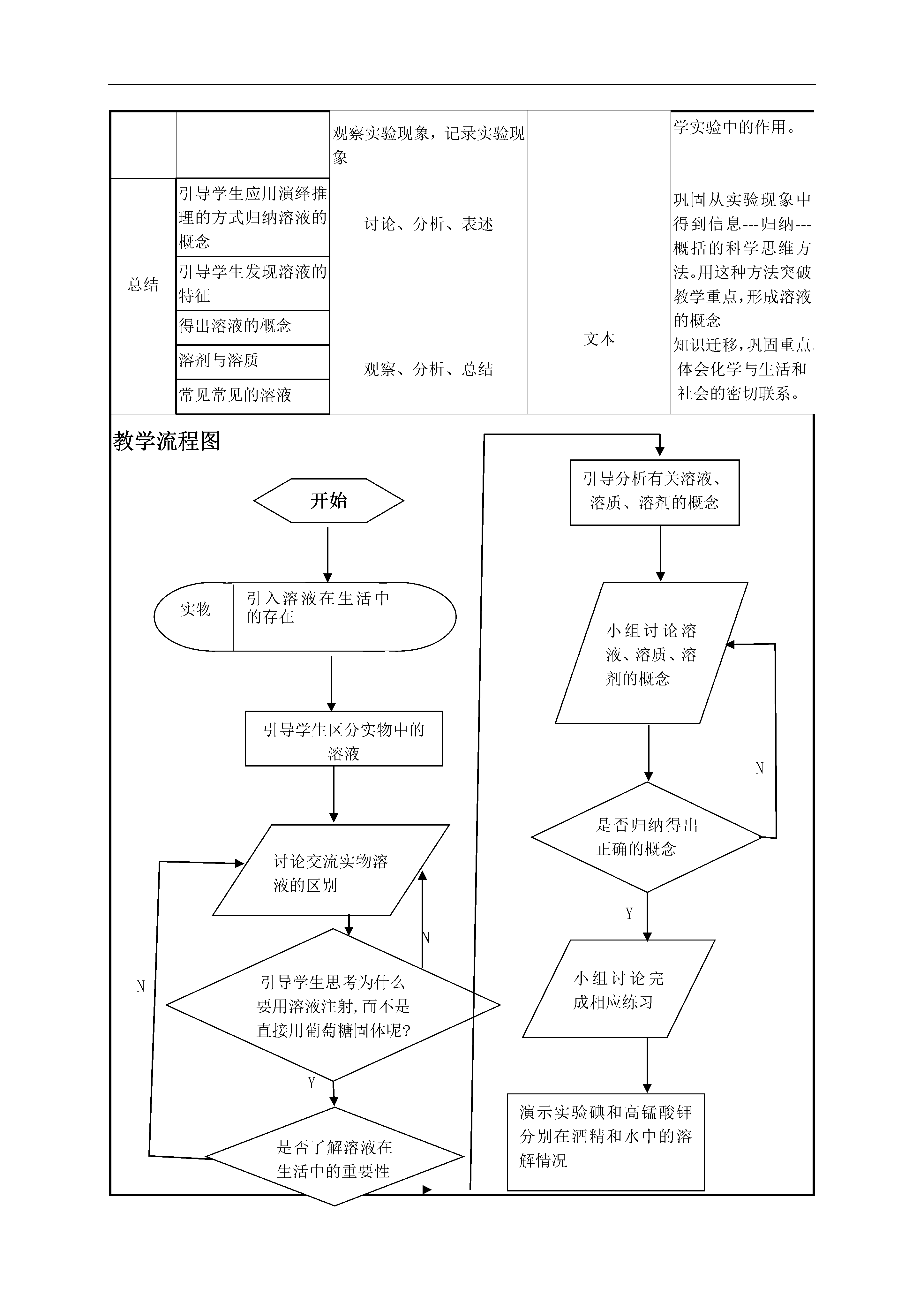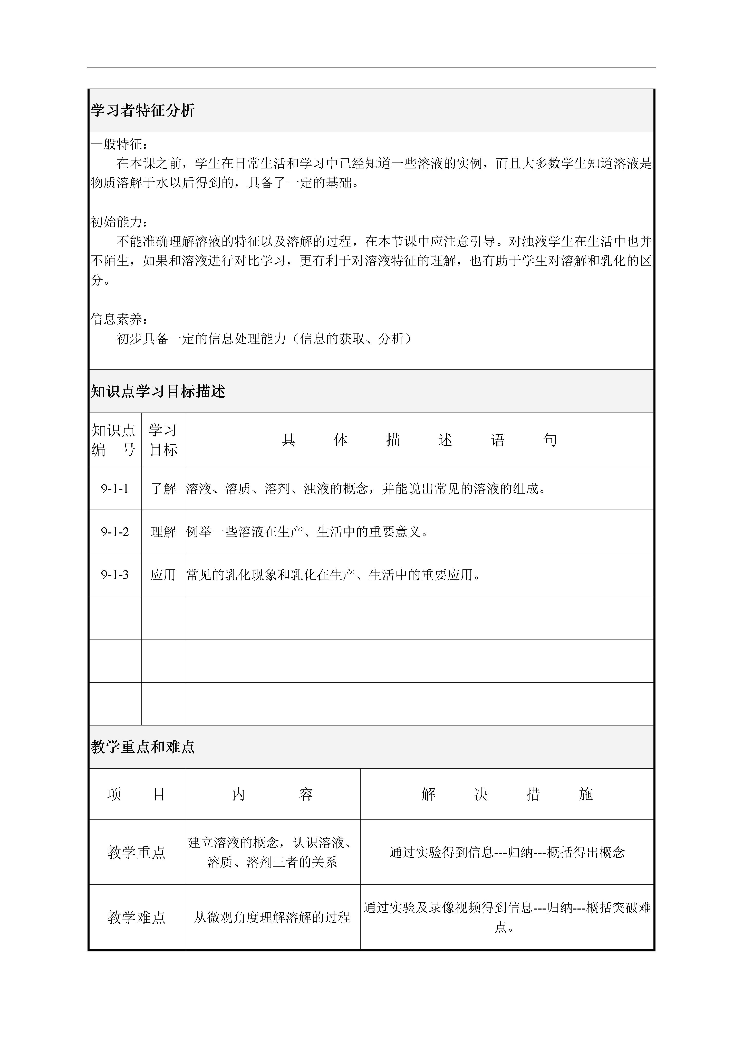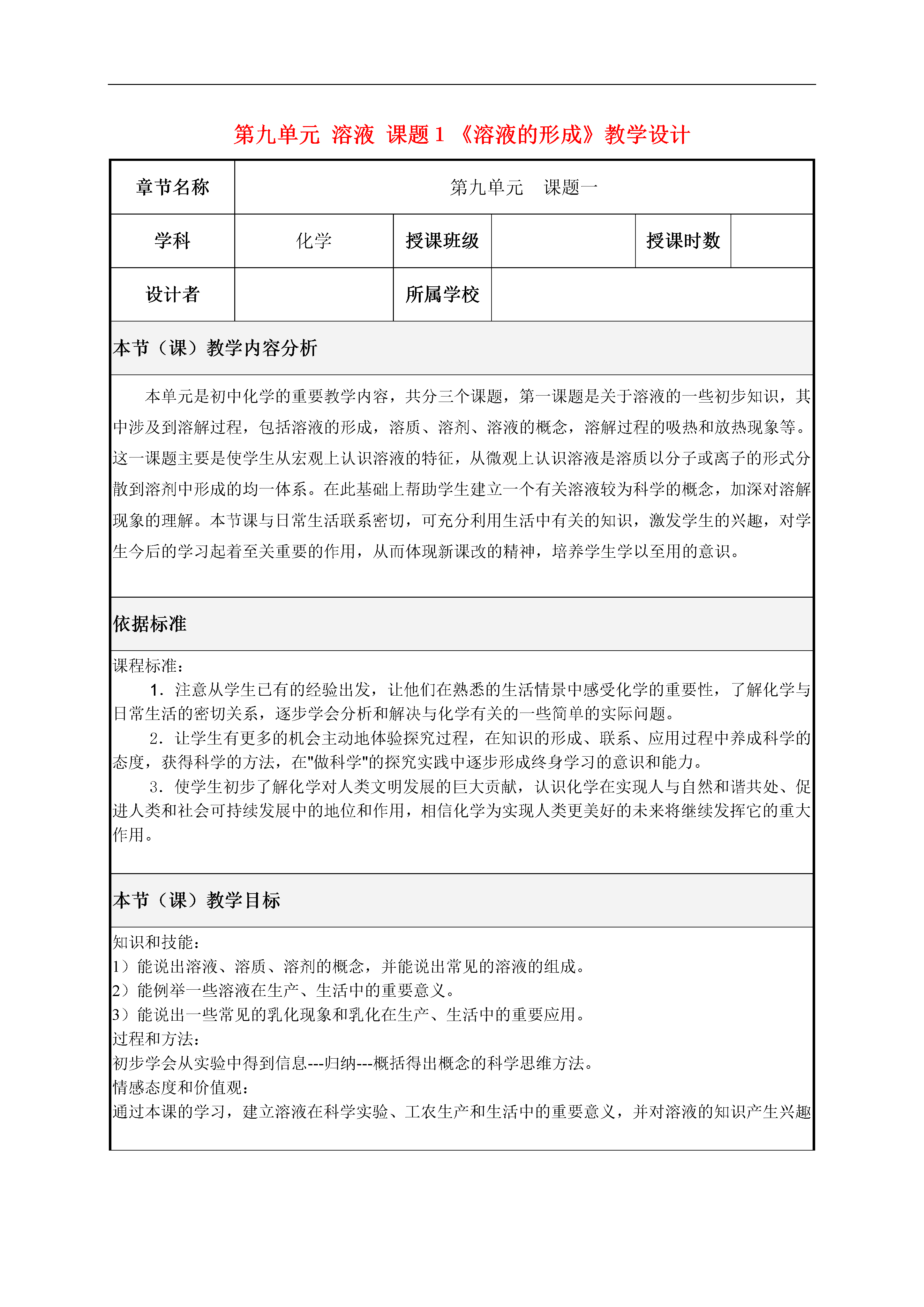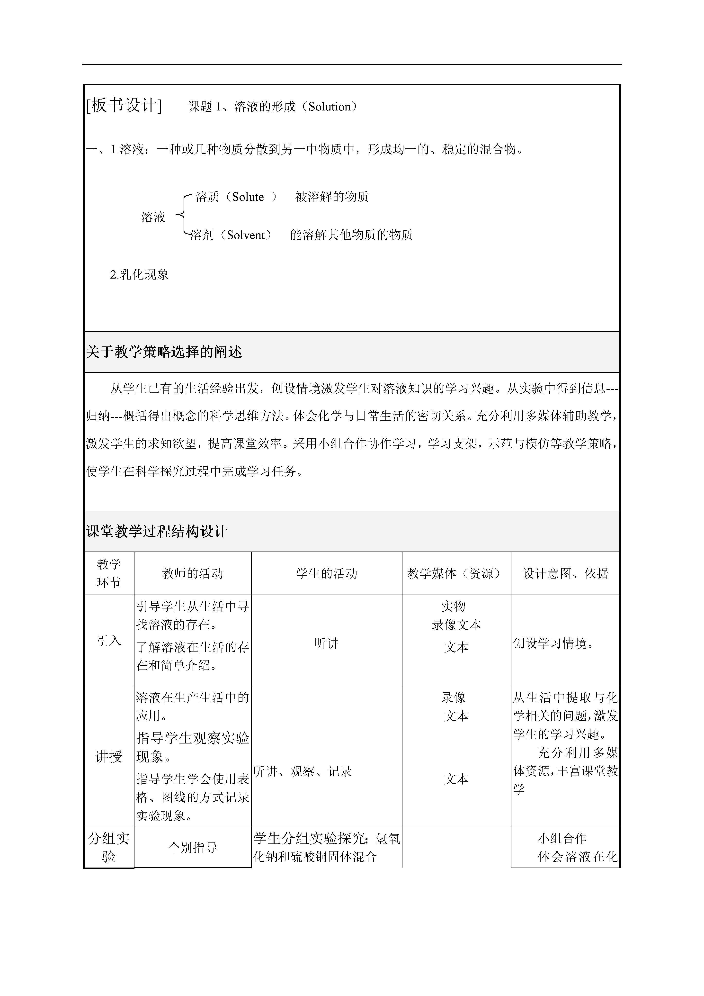 第九单元溶液课题1《溶液的形成》教学设计章节名称第九单元课题一学科化学授课班级授课时数设计者所属学校本节(课)教学内容分析本单元是初中化学的重要教学内容,共分三个课题,第一课题是关于溶液的一些初步知识,其中涉及到溶解过程,包括溶液的形成,溶质、溶剂、溶液的概念,溶解过程的吸热和放热现象等。这一课题主要是使学生从宏观上认识溶液的特征,从微观上认识溶液是溶质以分子或离子的形式分散到溶剂中形成的均一体系。在此基础上帮助学生建立一个有关溶液较为科学的概念,加深对溶解现象的理解。本节课与日常生活联系密切,可充分利用生活中有关的知识,激发学生的兴趣,对学生今后的学习起着至关重要的作用,从而体现新课改的精神,培养学生学以至用的意识。依据标准课程标准:1.注意从学生已有的经验出发,让他们在熟悉的生活情景中感受化学的重要性,了解化学与日常生活的密切关系,逐步学会分析和解决与化学有关的一些简单的实际问题。2.让学生有更多的机会主动地体验探究过程,在知识的形成、联系、应用过程中养成科学的态度,获得科学的方法,在"做科学"的探究实践中逐步形成终身学习的意识和能力。3.使学生初步了解化学对人类文明发展的巨大贡献,认识化学在实现人与自然和谐共处、促进人类和社会可持续发展中的地位和作用,相信化学为实现人类更美好的未来将继续发挥它的重大作用。本节(课)教学目标知识和技能:1)能说出溶液、溶质、溶剂的概念,并能说出常见的溶液的组成。2)能例举一些溶液在生产、生活中的重要意义。3)能说出一些常见的乳化现象和乳化在生产、生活中的重要应用。过程和方法:初步学会从实验中得到信息---归纳---概括得出概念的科学思维方法。情感态度和价值观:通过本课的学习,建立溶液在科学实验、工农生产和生活中的重要意义,并对溶液的知识产生兴趣学习者特征分析一般特征:在本课之前,学生在日常生活和学习中已经知道一些溶液的实例,而且大多数学生知道溶液是物质溶解于水以后得到的,具备了一定的基础。初始能力:不能准确理解溶液的特征以及溶解的过程,在本节课中应注意引导。对浊液学生在生活中也并不陌生,如果和溶液进行对比学习,更有利于对溶液特征的理解,也有助于学生对溶解和乳化的区分。信息素养:初步具备一定的信息处理能力(信息的获取、分析)知识点学习目标描述知识点编号学习目标具体描述语句9-1-1了解溶液、溶质、溶剂、浊液的概念,并能说出常见的溶液的组成。9-1-2理解例举一些溶液在生产、生活中的重要意义。9-1-3应用常见的乳化现象和乳化在生产、生活中的重要应用。教学重点和难点项目内容解决措施教学重点建立溶液的概念,认识溶液、溶质、溶剂三者的关系通过实验得到信息---归纳---概括得出概念教学难点从微观角度理解溶解的过程通过实验及录像视频得到信息---归纳---概括突破难点。教学环境设计多媒体设备:溶液在生产生活中的应用(工农生产和生活)的视频、图片资料实物展示:装有无色液体的注射液瓶。实验设备:氢氧化钠固体、硫酸铜固体、烧杯、药勺、玻璃棒、研钵、碘、高锰酸钾、酒精、水、植物油、洗涤剂、葡萄糖注射液、氯化钠注射液、沙土。教学媒体(资源)选择知识点编号学习目标媒体类型媒体内容要点教学作用使用方式所得结论占用时间媒体来源9-1-1了解视频图片溶液的形成BA了解溶液的形成过程与条件6网络下载9-1-2领会图片文本生活中的溶液DE生活中的溶液存在4自制9-1-3应用视频文本溶液在工农生产和生活的应用EH从科学探究过程中,感知溶液在工农生产和生活的应用的广泛和重要性。6网络下载①媒体在教学中的作用分为:A.提供事实,建立经验;B.创设情境,引发动机;C.举例验证,建立概念;D.提供示范,正确操作;E.呈现过程,形成表象;F.演绎原理,启发思维;G.设难置疑,引起思辨;H.展示事例,开阔视野;I.欣赏审美,陶冶情操;J.归纳总结,复习巩固;K.自定义。②媒体的使用方式包括:A.设疑—播放—讲解;B.设疑—播放—讨论;C.讲解—播放—概括;D.讲解—播放—举例;E.播放—提问—讲解;F.播放—讨论—总结;G.边播放、边讲解;H.边播放、边议论;I.学习者自己操作媒体进行学习;J.自定义。板书设计[板书设计]课题1、溶液的形成(Solution)1.溶液:一种或几种物质分散到另一中物质中,形成均一的、稳定的混合物。溶质(Solute)被溶解的物质溶液溶剂(Solvent)能溶解其他物质的物质2.乳化现象关于教学策略选择的阐述从学生已有的生活经验出发,创设情境激发学生对溶液知识的学习兴趣。从实验中得到信息---归纳---概括得出概念的科学思维方法。体会化学与日常生活的密切关系。充分利用多媒体辅助教学,激发学生的求