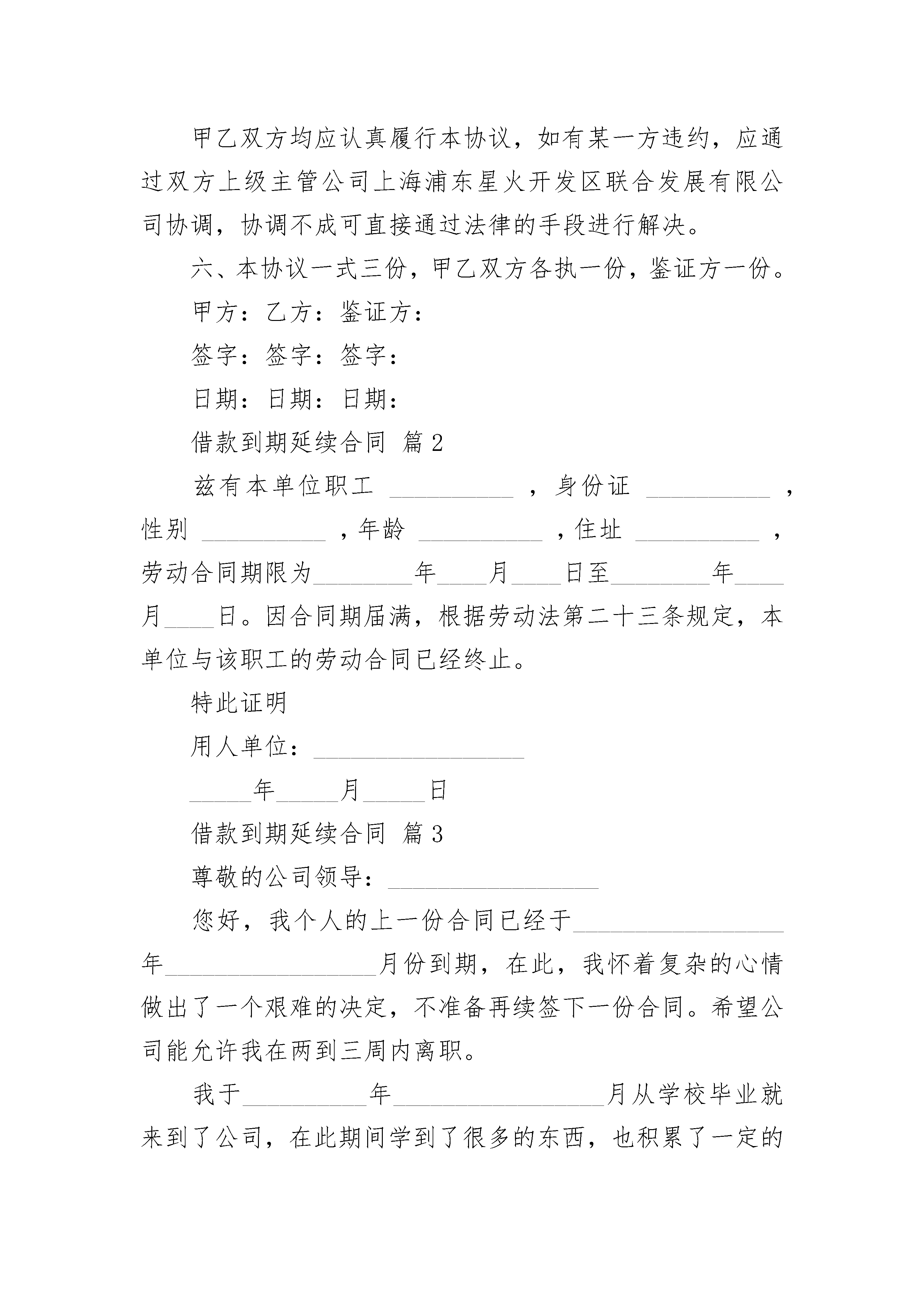 借款到期延续合同借款到期延续合同(精选3篇)借款到期延续合同篇1借款人:贷款人:鉴证人:经双方友好协商,因甲方经营上需要,原向乙方的借款到期延续,为共同遵守执行,特签订本协议。一、续借金额甲方本次向乙方续借金额人民币为____。前期借款利率到__年_月底前按期一次性支付完成。二、续借期限本次约定续借款期限为一年,即从__年_月_日至__年_月_日。三、续借款利率与计息和结息1)本协议项下续借款的年利率,按银行同期贷款基准利率结算,半年结息次。2)本协议项下续借款按实际使用期结息,也可提前归还。四、还款方式甲方应在本协议约定的还款日前准备好足额资金,届时甲方应用货币资金一次性付清乙方本、息,如有其他意向需经协商,以另行签订协议为准。五、违约责任甲乙双方均应认真履行本协议,如有某一方违约,应通过双方上级主管公司上海浦东星火开发区联合发展有限公司协调,协调不成可直接通过法律的手段进行解决。六、本协议一式三份,甲乙双方各执一份,鉴证方一份。甲方:乙方:鉴证方:签字:签字:签字:日期:日期:日期:借款到期延续合同篇2兹有本单位职工__________,身份证__________,性别__________,年龄__________,住址__________,劳动合同期限为________年____月____日至________年____月____日。因合同期届满,根据劳动法第二十三条规定,本单位与该职工的劳动合同已经终止。特此证明用人单位:______________________年_____月_____日借款到期延续合同篇3尊敬的公司领导:_________________您好,我个人的上一份合同已经于_________________年_________________月份到期,在此,我怀着复杂的心情做出了一个艰难的决定,不准备再续签下一份合同。希望公司能允许我在两到三周内离职。我于__________年_________________月从学校毕业就来到了公司,在此期间学到了很多的东西,也积累了一定的经验。在此,我对在公司得到的一切帮助和进步深表感激!总之,以目前我手上的工作和公司的状况来看,现在离职,目前对我和公司来说,可能都是一个比较的好的机会。申请人:__________________________________年_________________月_________________日