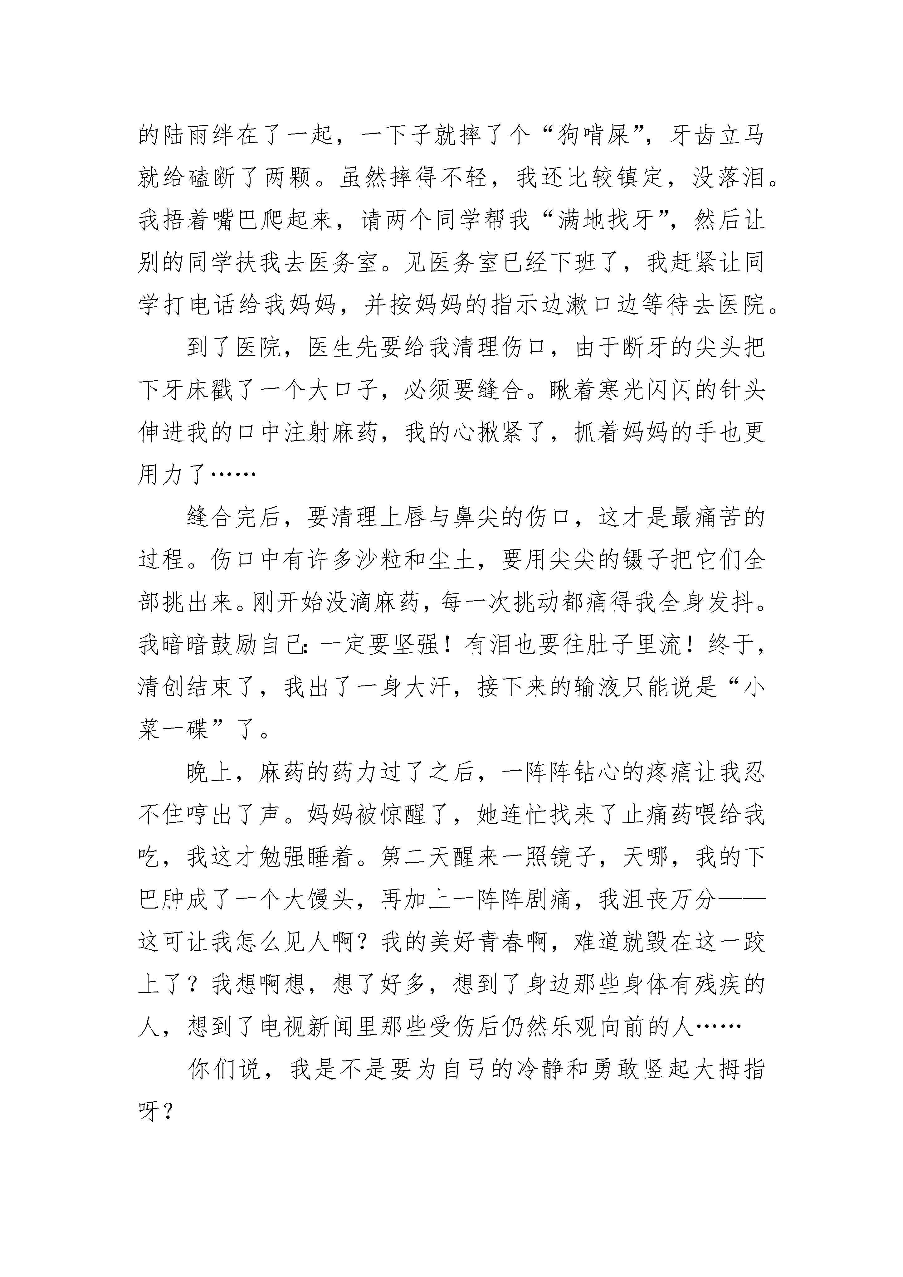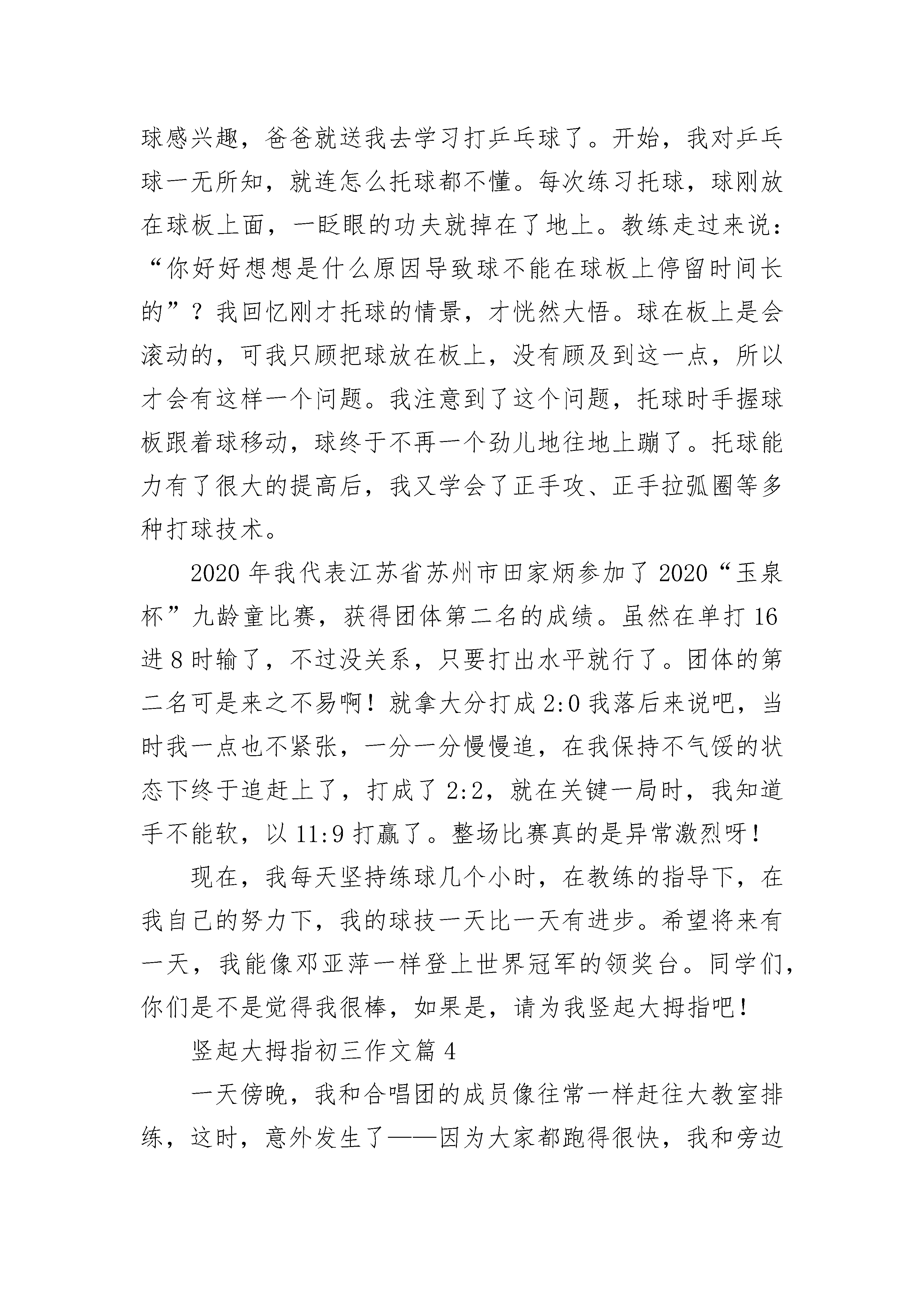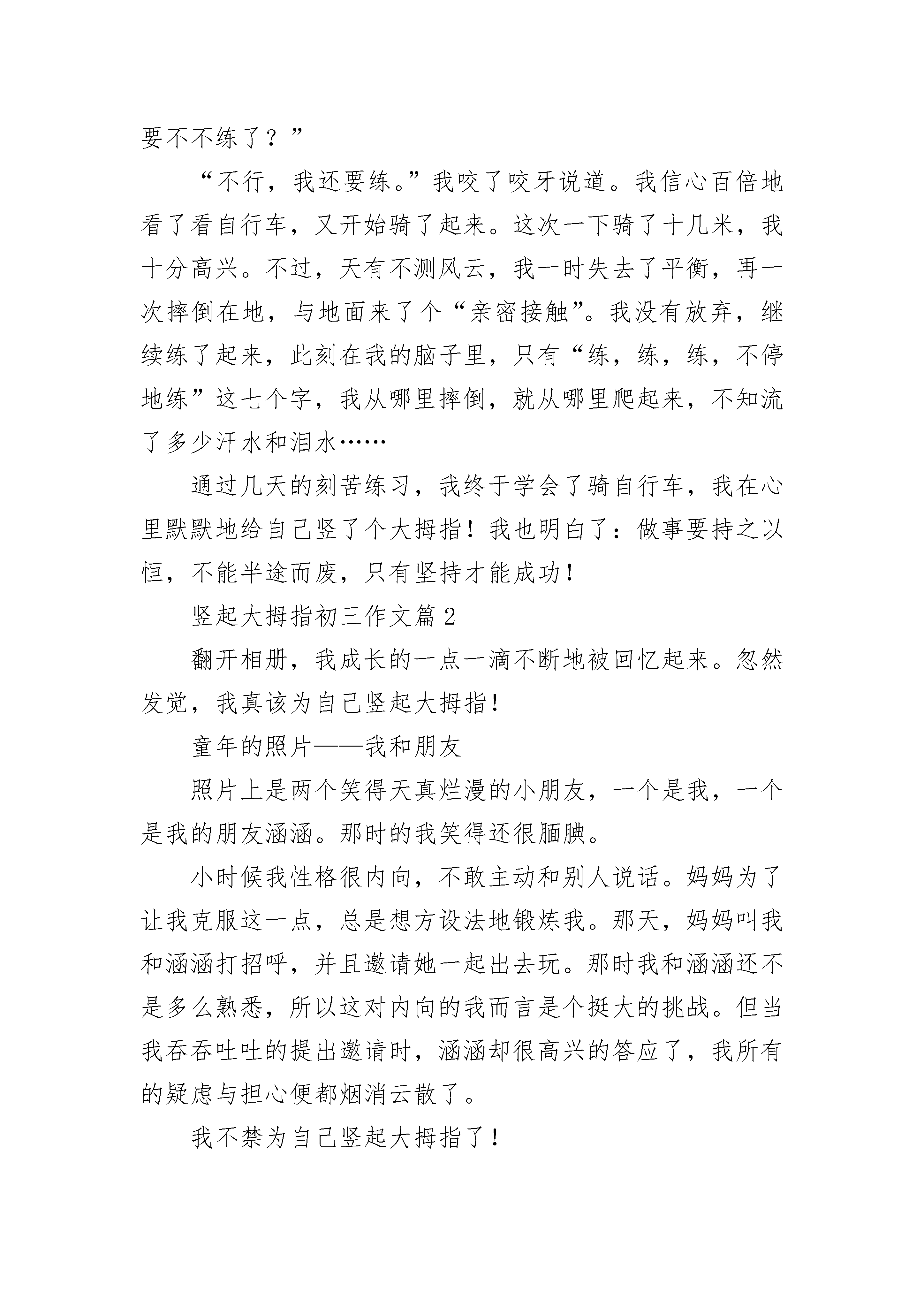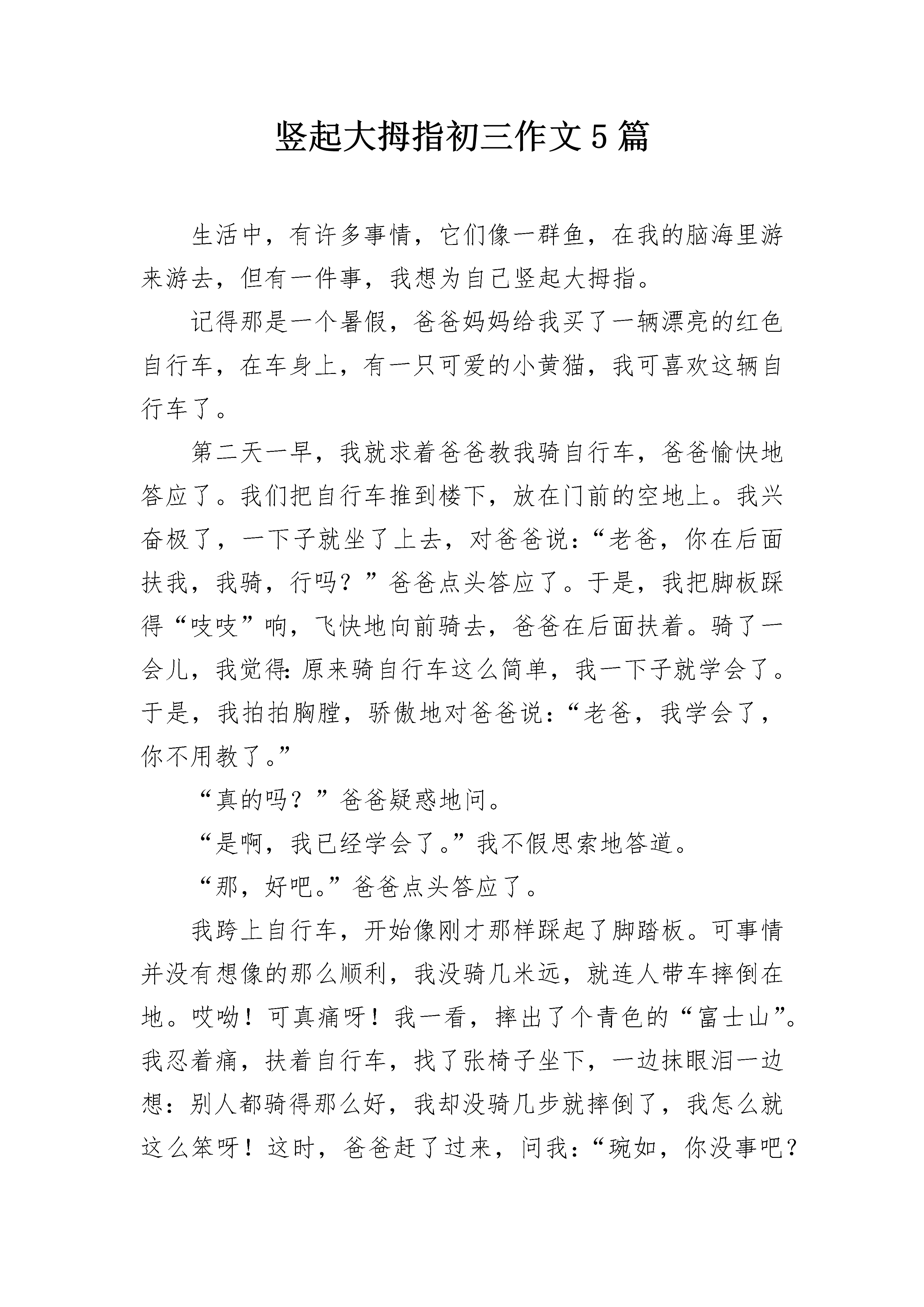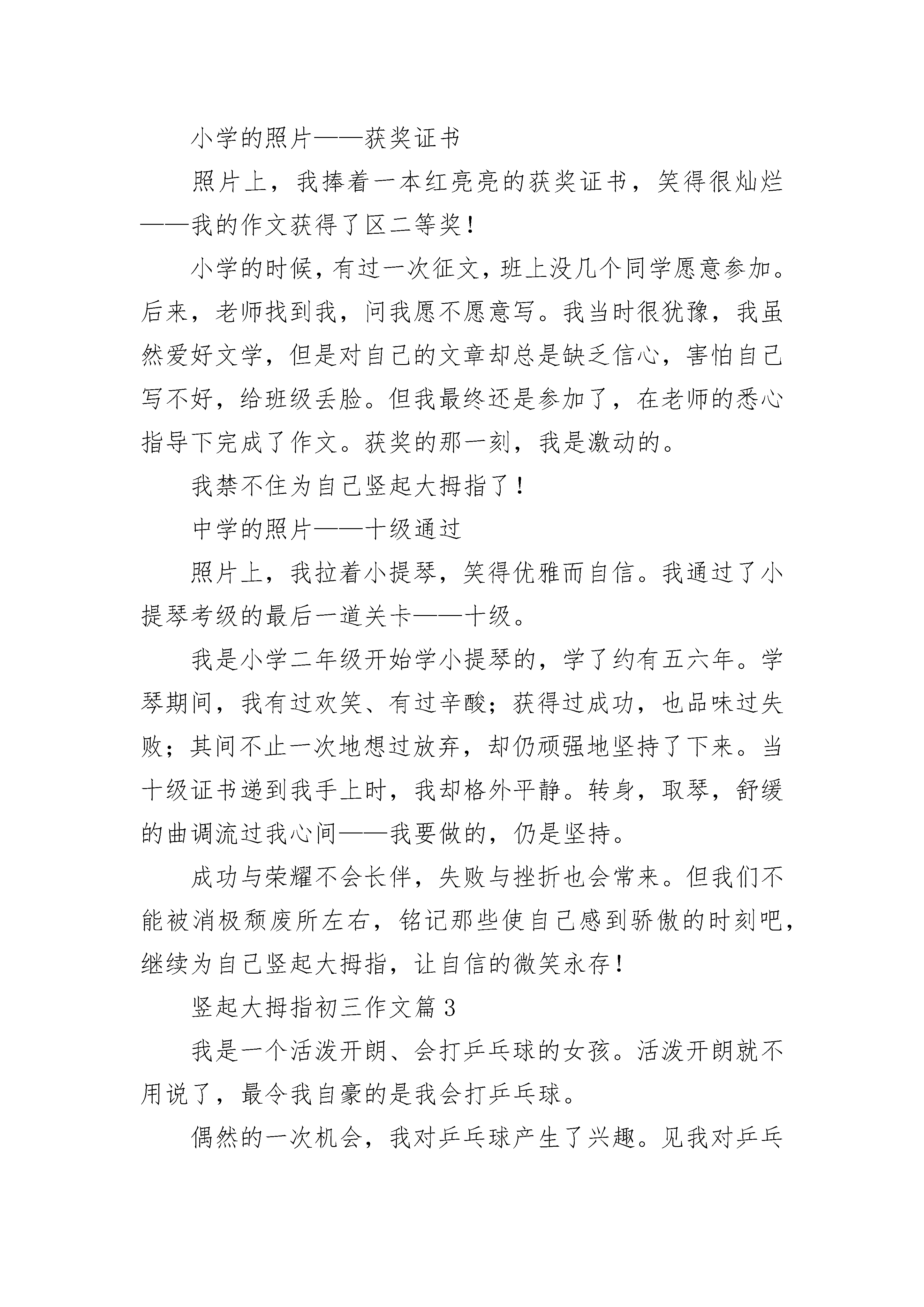 竖起大拇指初三作文5篇生活中,有许多事情,它们像一群鱼,在我的脑海里游来游去,但有一件事,我想为自己竖起大拇指。记得那是一个暑假,爸爸妈妈给我买了一辆漂亮的红色自行车,在车身上,有一只可爱的小黄猫,我可喜欢这辆自行车了。第二天一早,我就求着爸爸教我骑自行车,爸爸愉快地答应了。我们把自行车推到楼下,放在门前的空地上。我兴奋极了,一下子就坐了上去,对爸爸说:“老爸,你在后面扶我,我骑,行吗?”爸爸点头答应了。于是,我把脚板踩得“吱吱”响,飞快地向前骑去,爸爸在后面扶着。骑了一会儿,我觉得:原来骑自行车这么简单,我一下子就学会了。于是,我拍拍胸膛,骄傲地对爸爸说:“老爸,我学会了,你不用教了。”“真的吗?”爸爸疑惑地问。“是啊,我已经学会了。”我不假思索地答道。“那,好吧。”爸爸点头答应了。我跨上自行车,开始像刚才那样踩起了脚踏板。可事情并没有想像的那么顺利,我没骑几米远,就连人带车摔倒在地。哎呦!可真痛呀!我一看,摔出了个青色的“富士山”。我忍着痛,扶着自行车,找了张椅子坐下,一边抹眼泪一边想:别人都骑得那么好,我却没骑几步就摔倒了,我怎么就这么笨呀!这时,爸爸赶了过来,问我:“琬如,你没事吧?要不不练了?”“不行,我还要练。”我咬了咬牙说道。我信心百倍地看了看自行车,又开始骑了起来。这次一下骑了十几米,我十分高兴。不过,天有不测风云,我一时失去了平衡,再一次摔倒在地,与地面来了个“亲密接触”。我没有放弃,继续练了起来,此刻在我的脑子里,只有“练,练,练,不停地练”这七个字,我从哪里摔倒,就从哪里爬起来,不知流了多少汗水和泪水……通过几天的刻苦练习,我终于学会了骑自行车,我在心里默默地给自己竖了个大拇指!我也明白了:做事要持之以恒,不能半途而废,只有坚持才能成功!竖起大拇指初三作文篇2翻开相册,我成长的一点一滴不断地被回忆起来。忽然发觉,我真该为自己竖起大拇指!童年的照片——我和朋友照片上是两个笑得天真烂漫的小朋友,一个是我,一个是我的朋友涵涵。那时的我笑得还很腼腆。小时候我性格很内向,不敢主动和别人说话。妈妈为了让我克服这一点,总是想方设法地锻炼我。那天,妈妈叫我和涵涵打招呼,并且邀请她一起出去玩。那时我和涵涵还不是多么熟悉,所以这对内向的我而言是个挺大的挑战。但当我吞吞吐吐的提出邀请时,涵涵却很高兴的答应了,我所有的疑虑与担心便都烟消云散了。我不禁为自己竖起大拇指了!小学的照片——获奖证书照片上,我捧着一本红亮亮的获奖证书,笑得很灿烂——我的作文获得了区二等奖!小学的时候,有过一次征文,班上没几个同学愿意参加。后来,老师找到我,问我愿不愿意写。我当时很犹豫,我虽然爱好文学,但是对自己的文章却总是缺乏信心,害怕自己写不好,给班级丢脸。但我最终还是参加了,在老师的悉心指导下完成了作文。获奖的那一刻,我是激动的。我禁不住为自己竖起大拇指了!中学的照片——十级通过照片上,我拉着小提琴,笑得优雅而自信。我通过了小提琴考级的最后一道关卡——十级。我是小学二年级开始学小提琴的,学了约有五六年。学琴期间,我有过欢笑、有过辛酸;获得过成功,也品味过失败;其间不止一次地想过放弃,却仍顽强地坚持了下来。当十级证书递到我手上时,我却格外平静。转身,取琴,舒缓的曲调流过我心间——我要做的,仍是坚持。成功与荣耀不会长伴,失败与挫折也会常来。但我们不能被消极颓废所左右,铭记那些使自己感到骄傲的时刻吧,继续为自己竖起大拇指,让自信的微笑永存!竖起大拇指初三作文篇3我是一个活泼开朗、会打乒乓球的女孩。活泼开朗就不用说了,最令我自豪的是我会打乒乓球。偶然的一次机会,我对乒乓球产生了兴趣。见我对乒乓球感兴趣,爸爸就送我去学习打乒乓球了。开始,我对乒乓球一无所知,就连怎么托球都不懂。每次练习托球,球刚放在球板上面,一眨眼的功夫就掉在了地上。教练走过来说:“你好好想想是什么原因导致球不能在球板上停留时间长的”?我回忆刚才托球的情景,才恍然大悟。球在板上是会滚动的,可我只顾把球放在板上,没有顾及到这一点,所以才会有这样一个问题。我注意到了这个问题,托球时手握球板跟着球移动,球终于不再一个劲儿地往地上蹦了。托球能力有了很大的提高后,我又学会了正手攻、正手拉弧圈等多种打球技术。2020年我代表江苏省苏州市田家炳参加了2020“玉泉杯”九龄童比赛,获得团体第二名的成绩。虽然在单打16进8时输了,不过没关系,只要打出水平就行了。团体的第二名可是来之不易啊!就拿大分打成2:0我落后来说吧,当时我一点也不紧张,一分一分慢慢追,在我保持不气馁的状态下终于追赶上了,打成了2:2,就在关键一局时,我知道手不能软,以11:9打赢了。整场比赛真的是异常激烈呀!现在,我每天坚持练球几个小时,在教练的指导下,在我自己的努力下,我的球技一天比一天有进步。希望将来有一天,我能像邓亚萍一样登上世界