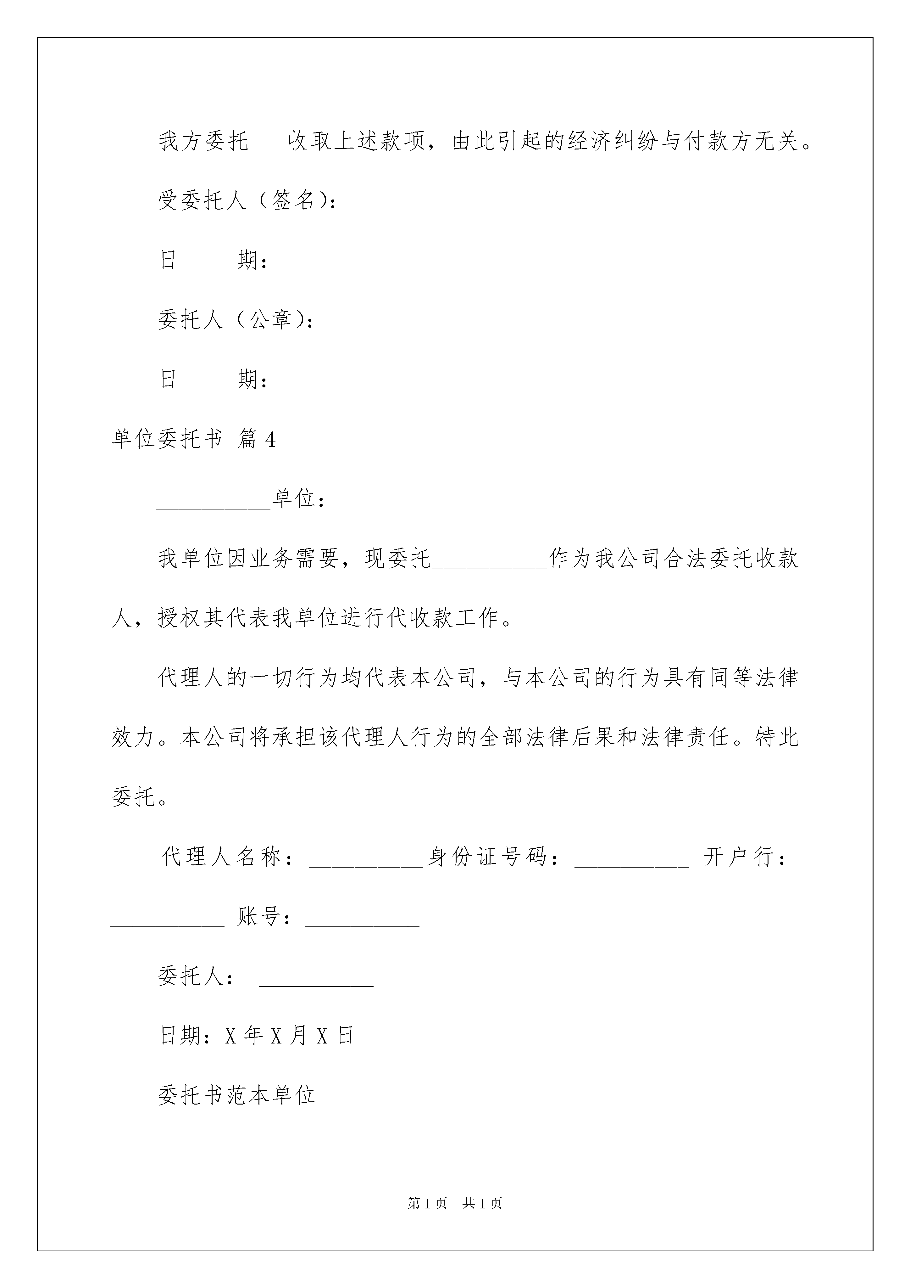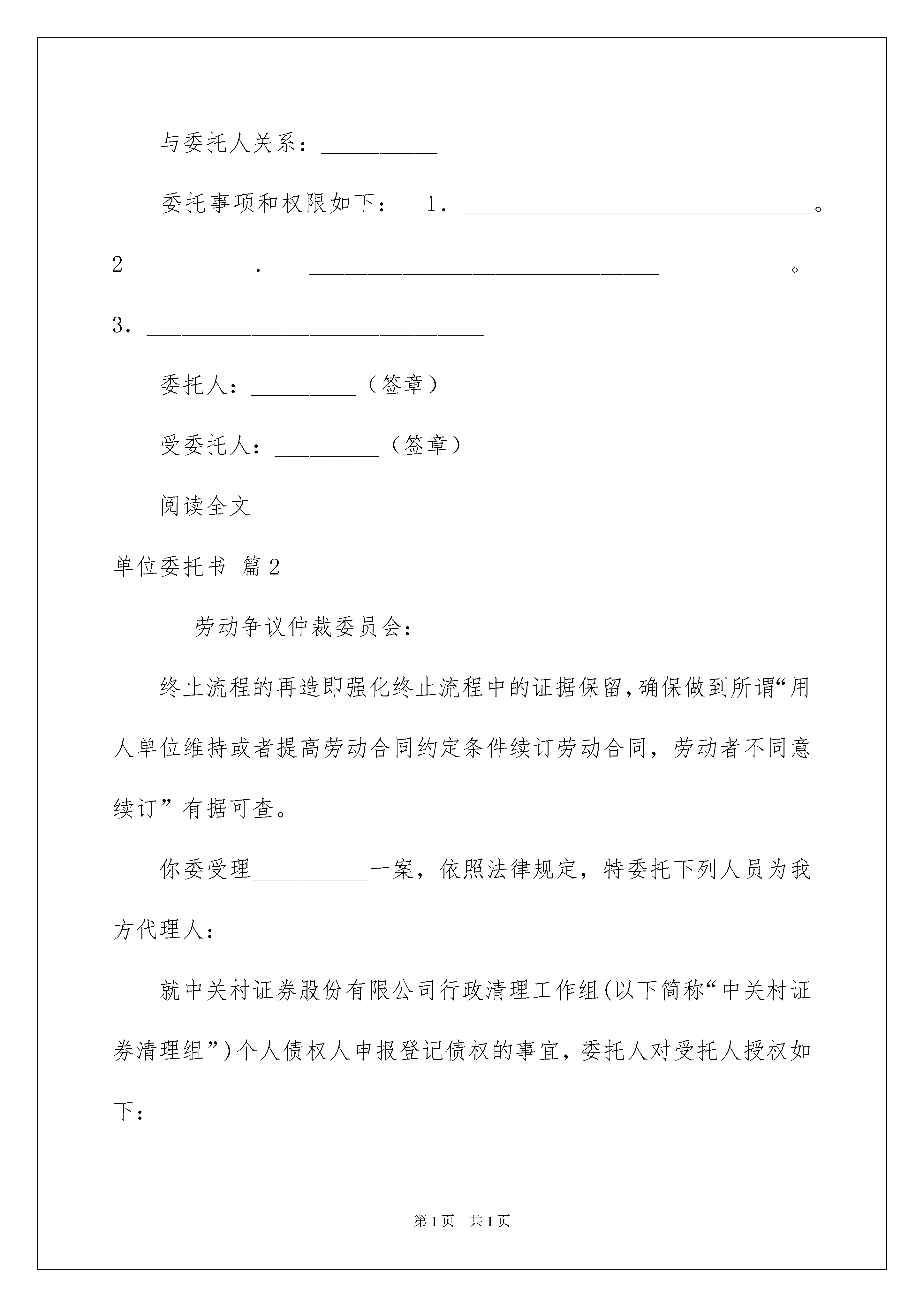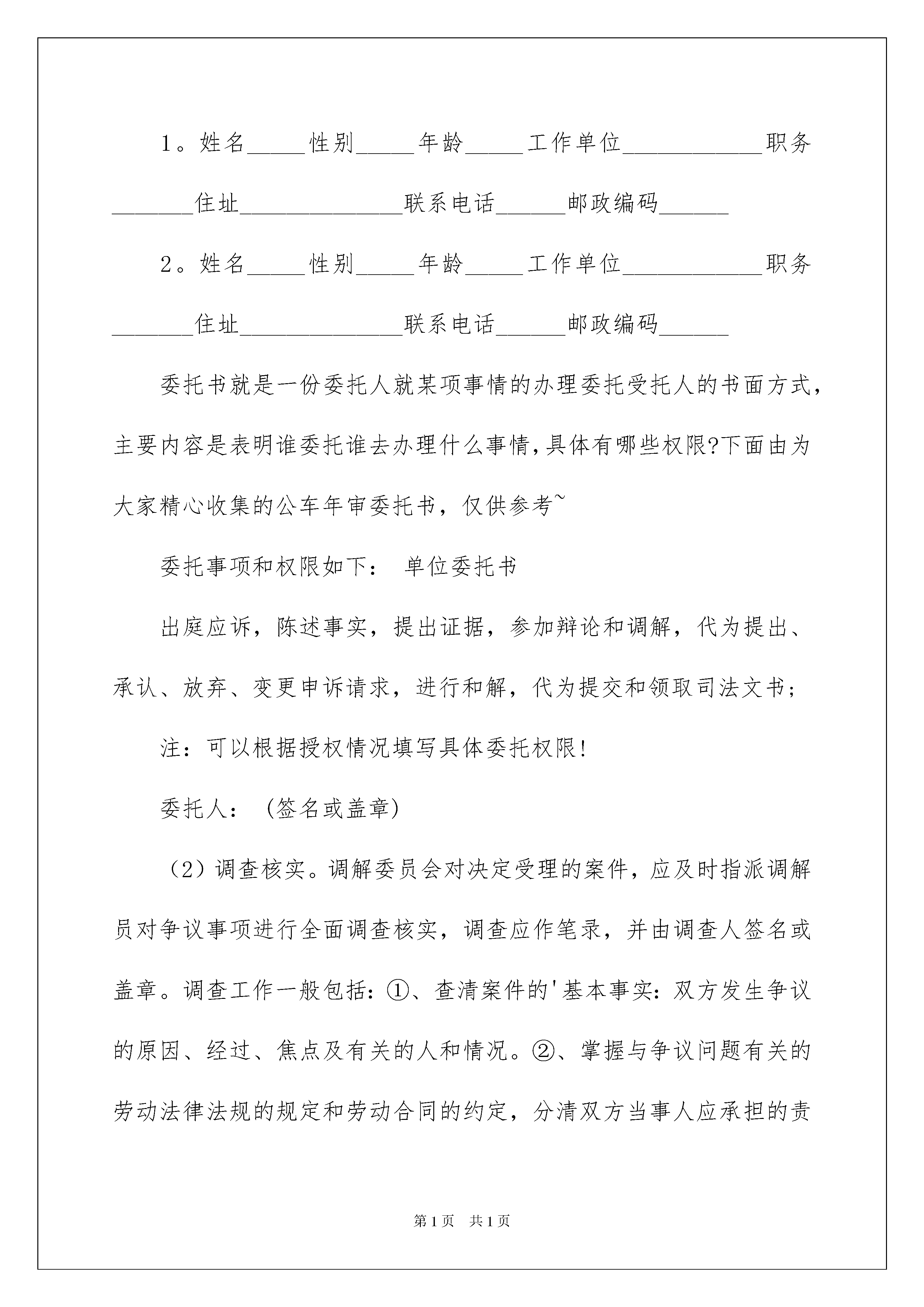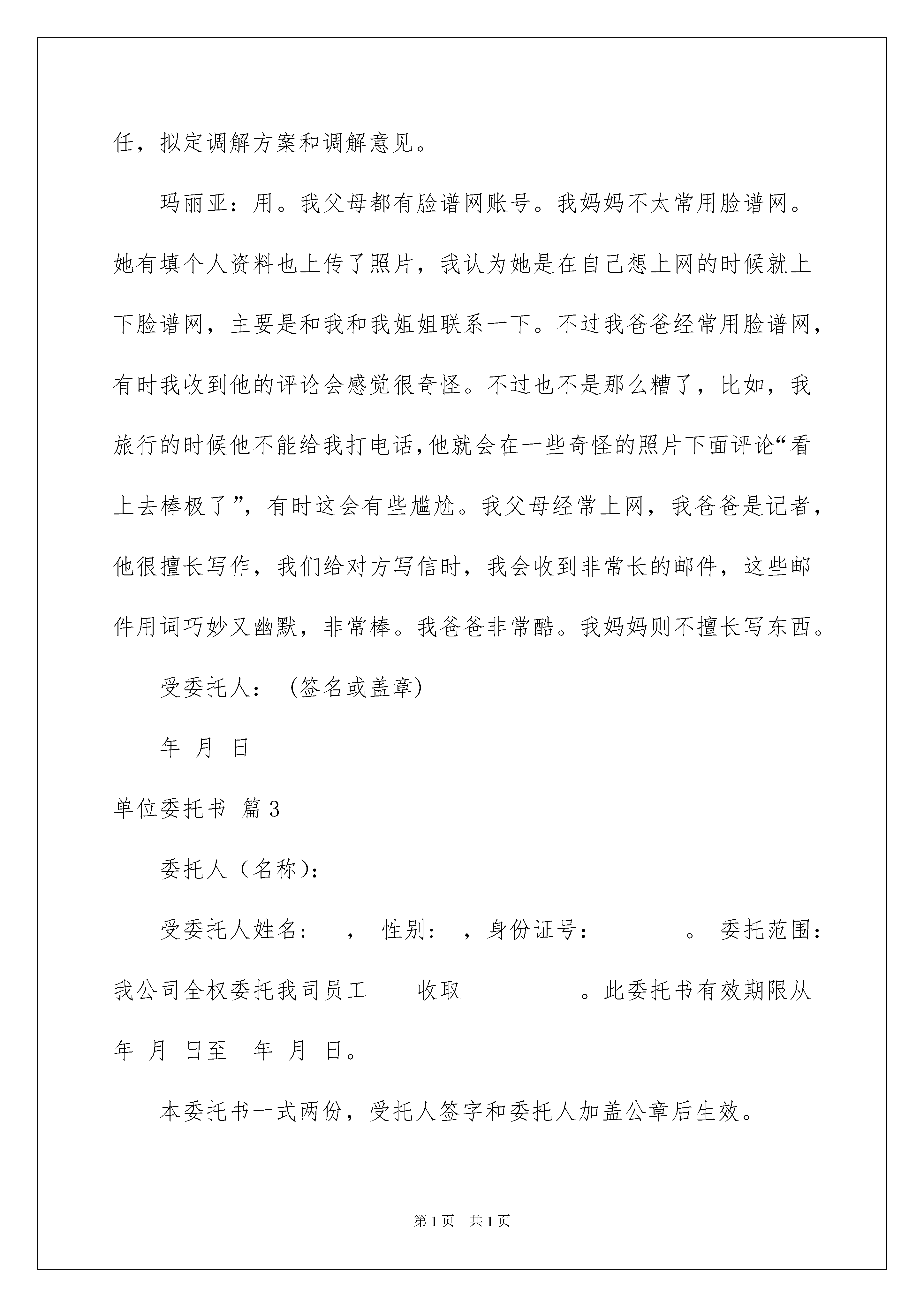 2022单位委托书模板合集七篇单位委托书模板合集七篇委托人不得以任何理由反悔被委托人的委托书上的合法权益。在当今社会生活中,用到委托书的事务越来越多,那么你有了解过委托书吗?以下是我为大家整理的单位委托书7篇,欢迎大家分享。单位委托书篇1_____劳动争议仲裁委员会:你委受理____________与我(单位)的劳动争议一案,依照法律规定,特委托下列人员为我(单位)的代理人:(1)姓名:_________性别:_______民族:__________出生年月:__________工作单位:__________职务:____________电话:________________与委托人关系:__________(2)姓名:_______性别:_______民族:__________出生年月:________工作单位:____________职务:____________电话:________________与委托人关系:__________委托事项和权限如下:1.______________________________。2.______________________________。3._____________________________委托人:_________(签章)受委托人:_________(签章)阅读全文单位委托书篇2_______劳动争议仲裁委员会:终止流程的再造即强化终止流程中的证据保留,确保做到所谓“用人单位维持或者提高劳动合同约定条件续订劳动合同,劳动者不同意续订”有据可查。你委受理__________一案,依照法律规定,特委托下列人员为我方代理人:就中关村证券股份有限公司行政清理工作组(以下简称“中关村证券清理组”)个人债权人申报登记债权的事宜,委托人对受托人授权如下:1。姓名_____性别_____年龄_____工作单位____________职务_______住址______________联系电话______邮政编码______2。姓名_____性别_____年龄_____工作单位____________职务_______住址______________联系电话______邮政编码______委托书就是一份委托人就某项事情的办理委托受托人的书面方式,主要内容是表明谁委托谁去办理什么事情,具体有哪些权限?下面由为大家精心收集的公车年审委托书,仅供参考~委托事项和权限如下:单位委托书出庭应诉,陈述事实,提出证据,参加辩论和调解,代为提出、承认、放弃、变更申诉请求,进行和解,代为提交和领取司法文书;注:可以根据授权情况填写具体委托权限!委托人:(签名或盖章)(2)调查核实。调解委员会对决定受理的案件,应及时指派调解员对争议事项进行全面调查核实,调查应作笔录,并由调查人签名或盖章。调查工作一般包括:①、查清案件的'基本事实:双方发生争议的原因、经过、焦点及有关的人和情况。②、掌握与争议问题有关的劳动法律法规的规定和劳动合同的约定,分清双方当事人应承担的责任,拟定调解方案和调解意见。玛丽亚:用。我父母都有脸谱网账号。我妈妈不太常用脸谱网。她有填个人资料也上传了照片,我认为她是在自己想上网的时候就上下脸谱网,主要是和我和我姐姐联系一下。不过我爸爸经常用脸谱网,有时我收到他的评论会感觉很奇怪。不过也不是那么糟了,比如,我旅行的时候他不能给我打电话,他就会在一些奇怪的照片下面评论“看上去棒极了”,有时这会有些尴尬。我父母经常上网,我爸爸是记者,他很擅长写作,我们给对方写信时,我会收到非常长的邮件,这些邮件用词巧妙又幽默,非常棒。我爸爸非常酷。我妈妈则不擅长写东西。受委托人:(签名或盖章)年月日单位委托书篇3委托人(名称):受委托人姓名:,性别:,身份证号:。委托范围:我公司全权委托我司员工收取。此委托书有效期限从年月日至年月日。本委托书一式两份,受托人签字和委托人加盖公章后生效。我方委托收取上述款项,由此引起的经济纠纷与付款方无关。受委托人(签名):日期:委托人(公章):日期:单位委托书篇4__________单位:我单位因业务需要,现委托__________作为我公司合法委托收款人,授权其代表我单位进行代收款工作。代理人的一切行为均代表本公司,与本公司的行为具有同等法律效力。本公司将承担该代理人行为的全部法律后果和法律责任。特此委托。代理人名称:__________身份证号码:__________开户行:__________账号:__________委托人:__________日期:X年X月X日委托书范本单位委托单位:________________