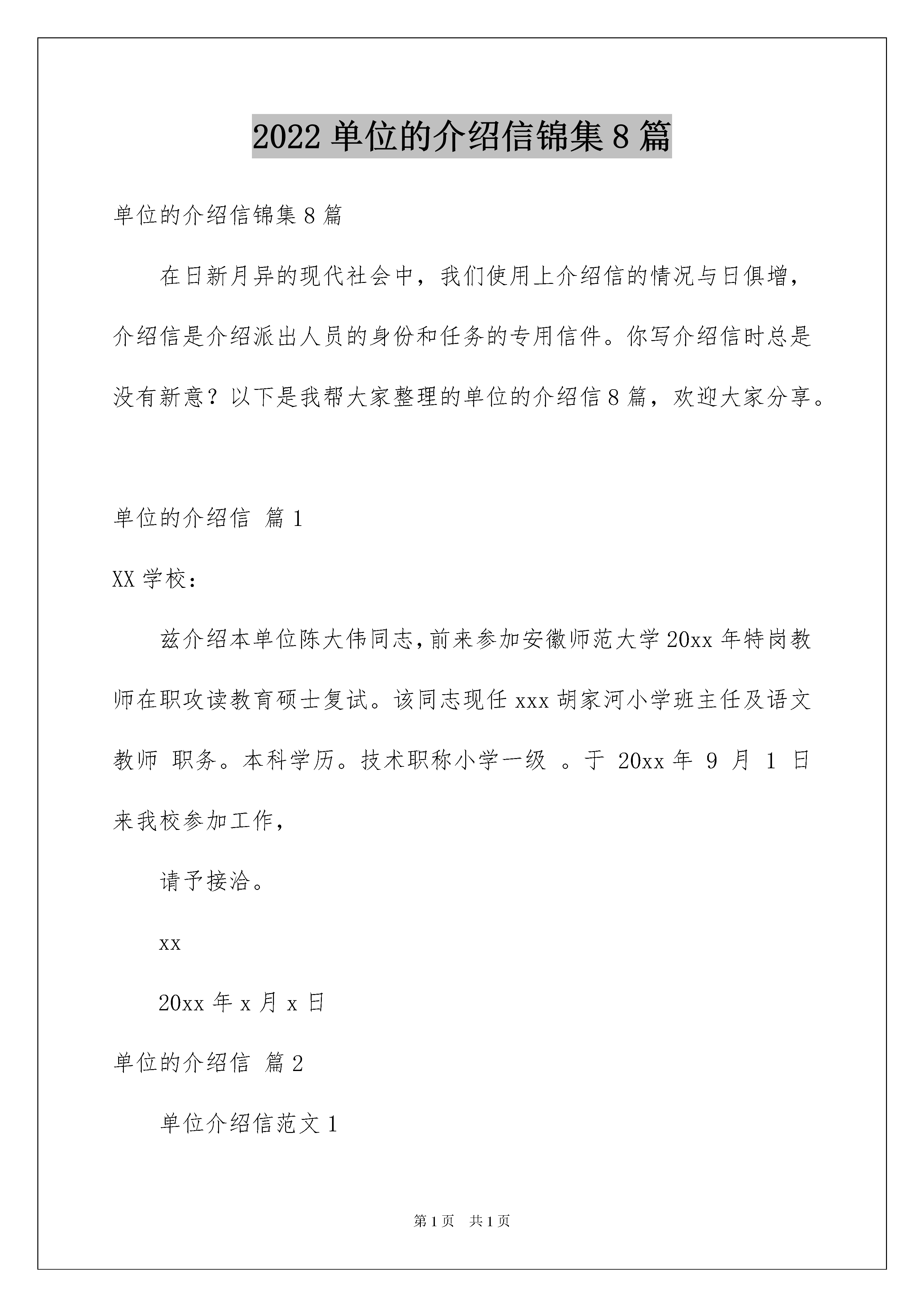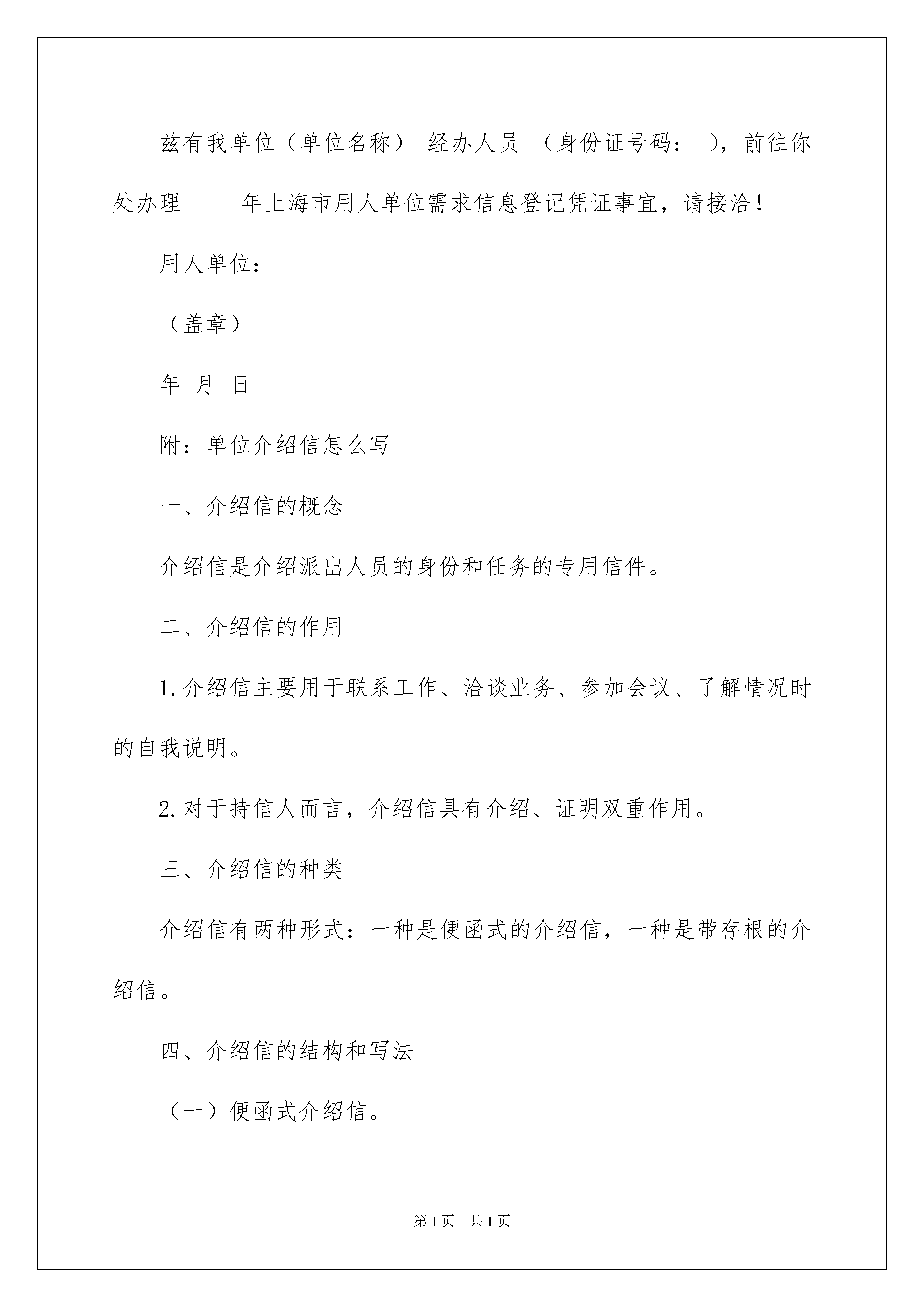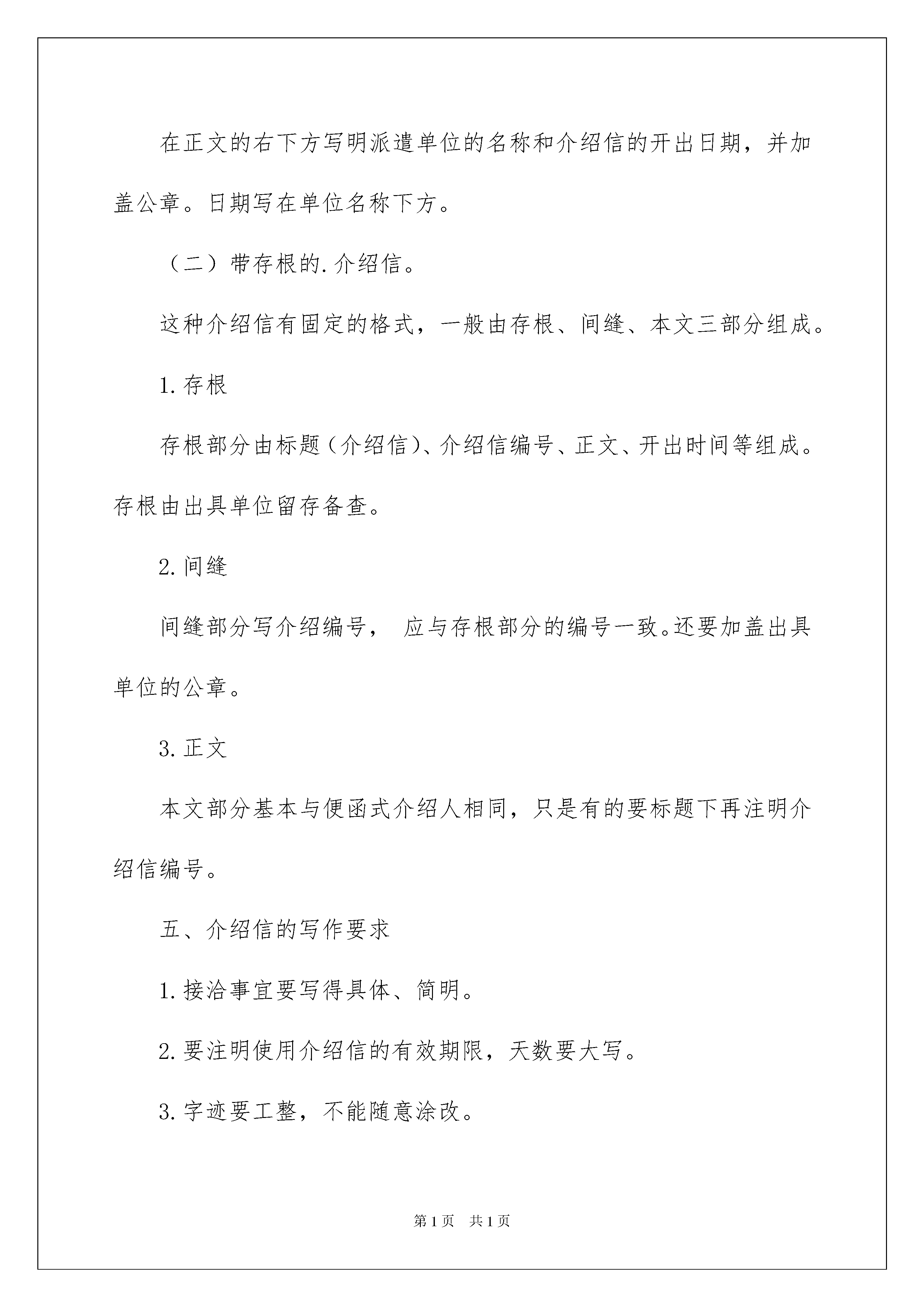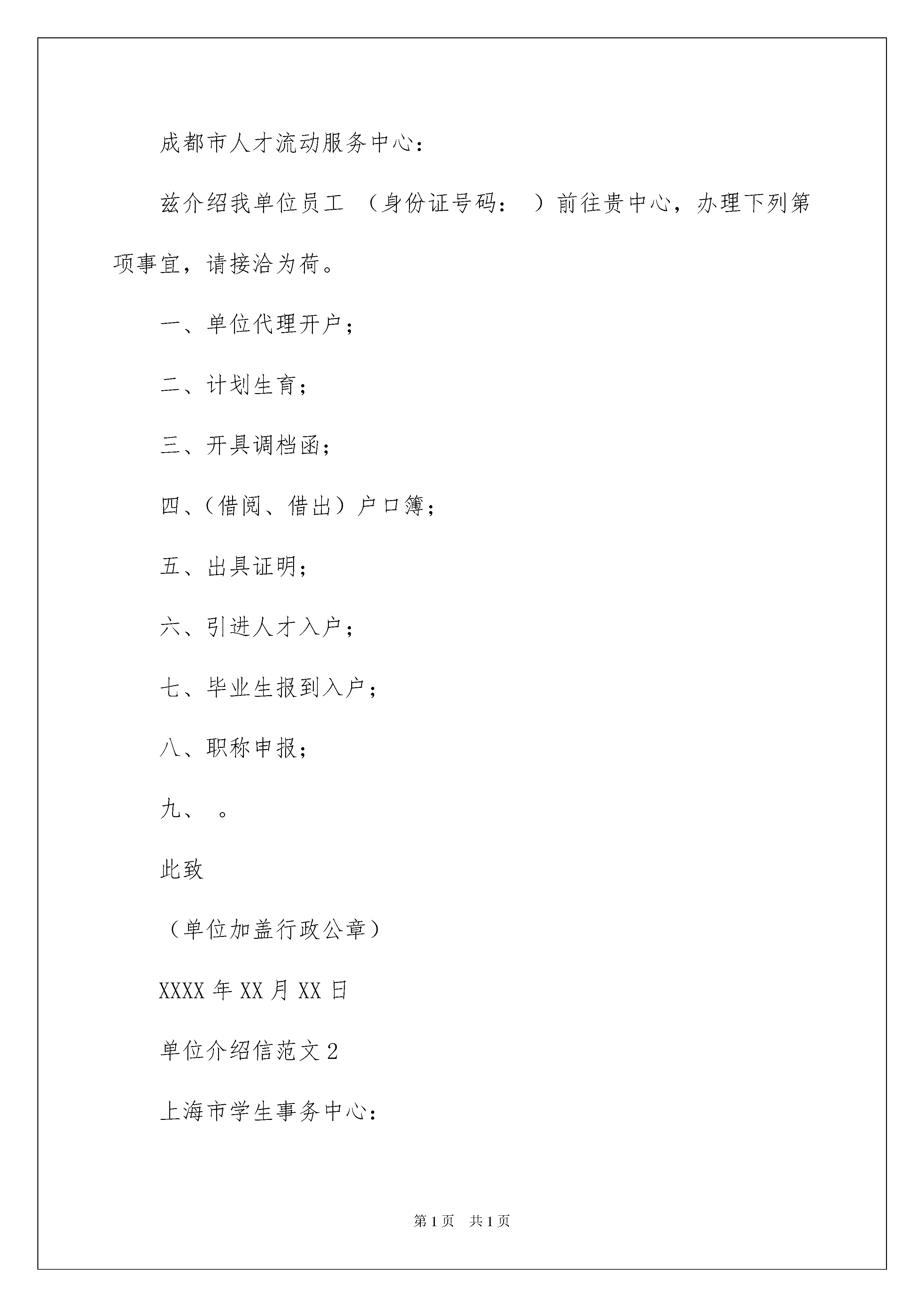 2022单位的介绍信锦集8篇单位的介绍信锦集8篇在日新月异的现代社会中,我们使用上介绍信的情况与日俱增,介绍信是介绍派出人员的身份和任务的专用信件。你写介绍信时总是没有新意?以下是我帮大家整理的单位的介绍信8篇,欢迎大家分享。单位的介绍信篇1XX学校:兹介绍本单位陈大伟同志,前来参加安徽师范大学20xx年特岗教师在职攻读教育硕士复试。该同志现任xxx胡家河小学班主任及语文教师职务。本科学历。技术职称小学一级。于20xx年9月1日来我校参加工作,请予接洽。xx20xx年x月x日单位的介绍信篇2单位介绍信范文1成都市人才流动服务中心:兹介绍我单位员工(身份证号码:)前往贵中心,办理下列第项事宜,请接洽为荷。一、单位代理开户;二、计划生育;三、开具调档函;四、(借阅、借出)户口簿;五、出具证明;六、引进人才入户;七、毕业生报到入户;八、职称申报;九、。此致(单位加盖行政公章)XXXX年XX月XX日单位介绍信范文2上海市学生事务中心:兹有我单位(单位名称)经办人员(身份证号码:),前往你处办理_____年上海市用人单位需求信息登记凭证事宜,请接洽!用人单位:(盖章)年月日附:单位介绍信怎么写一、介绍信的概念介绍信是介绍派出人员的身份和任务的专用信件。二、介绍信的作用1.介绍信主要用于联系工作、洽谈业务、参加会议、了解情况时的自我说明。2.对于持信人而言,介绍信具有介绍、证明双重作用。三、介绍信的种类介绍信有两种形式:一种是便函式的介绍信,一种是带存根的介绍信。四、介绍信的结构和写法(一)便函式介绍信。用一般的公文信纸书写。包括标题、称谓、正文、结尾、单位名称和日期、附注几部分。1.标题在第一行居中写“介绍信”三个字。2.称谓另起一行,顶格写收信单位名称或个人姓名,姓名后加“同志”、“先生”、“女士”等称呼,再加冒号。3.正文另起一行,开头空两格写正文,一般不分段。一般要写清楚:(1)派遣人员的姓名、人数、身份、职务、职称等。(2)说明所要联系的工作、接洽的事项等。(3)对收信单位或个人的希望、要求等,如“请接洽”等。4.结尾写上表示致敬或者祝愿的话,如“此致敬礼”等。5.单位名称和日期6.附注注明介绍信的有效期限,具体天数用大写。在正文的右下方写明派遣单位的名称和介绍信的开出日期,并加盖公章。日期写在单位名称下方。(二)带存根的.介绍信。这种介绍信有固定的格式,一般由存根、间缝、本文三部分组成。1.存根存根部分由标题(介绍信)、介绍信编号、正文、开出时间等组成。存根由出具单位留存备查。2.间缝间缝部分写介绍编号,应与存根部分的编号一致。还要加盖出具单位的公章。3.正文本文部分基本与便函式介绍人相同,只是有的要标题下再注明介绍信编号。五、介绍信的写作要求1.接洽事宜要写得具体、简明。2.要注明使用介绍信的有效期限,天数要大写。3.字迹要工整,不能随意涂改。中关村知识产权促进局:兹有我单位同志,前往你处办理申领专利资助金事宜。请予以接洽。申请人单位(并盖章)年月日2、申请人委托办理介绍信中关村知识产权促进局:我单位委托代理公司,前往你处办理申领专利资助金事宜。请予以接洽。申请人单位(并盖章)年月日单位的介绍信篇3一、介绍信的概念介绍信是介绍派出人员的身份和任务的专用信件。二、介绍信的作用1。介绍信主要用于联系工作、洽谈业务、参加会议、了解情况时的自我说明。2。对于持信人而言,介绍信具有介绍、证明双重作用。三、介绍信的种类介绍信有两种形式:一种是便函式的介绍信,一种是带存根的介绍信。四、介绍信的结构和写法(一)便函式介绍信。用一般的公文信纸书写。包括标题、称谓、正文、结尾、单位名称和日期、附注几部分。1。标题在第一行居中写介绍信三个字。2。称谓另起一行,顶格写收信单位名称或个人姓名,姓名后加同志、先生、女士等称呼,再加冒号。3。正文另起一行,开头空两格写正文,一般不分段。一般要写清楚:(1)派遣人员的姓名、人数、身份、职务、职称等。(2)说明所要联系的工作、接洽的事项等。(3)对收信单位或个人的希望、要求等,如请接洽等。4。结尾写上表示致敬或者祝愿的话,如此致敬礼等。5。单位名称和日期6。附注注明介绍信的有效期限,具体天数用大写。在正文的右下方写明派遣单位的名称和介绍信的开出日期,并加盖公章。日期写在单位名称下方。(二)带存根的介绍信。这种介绍信有固定的格式,一般由存根、间缝、本文三部分组成。1。存根存根部分由标题(介绍信)、介绍信编号、正文、开出时间等组成。存根由出具单位留存备查。2。间缝间缝部分写介绍编号,应与存根部分的编号一致。还要加盖出具单位的公章。3。正文本文部分基本与便函式