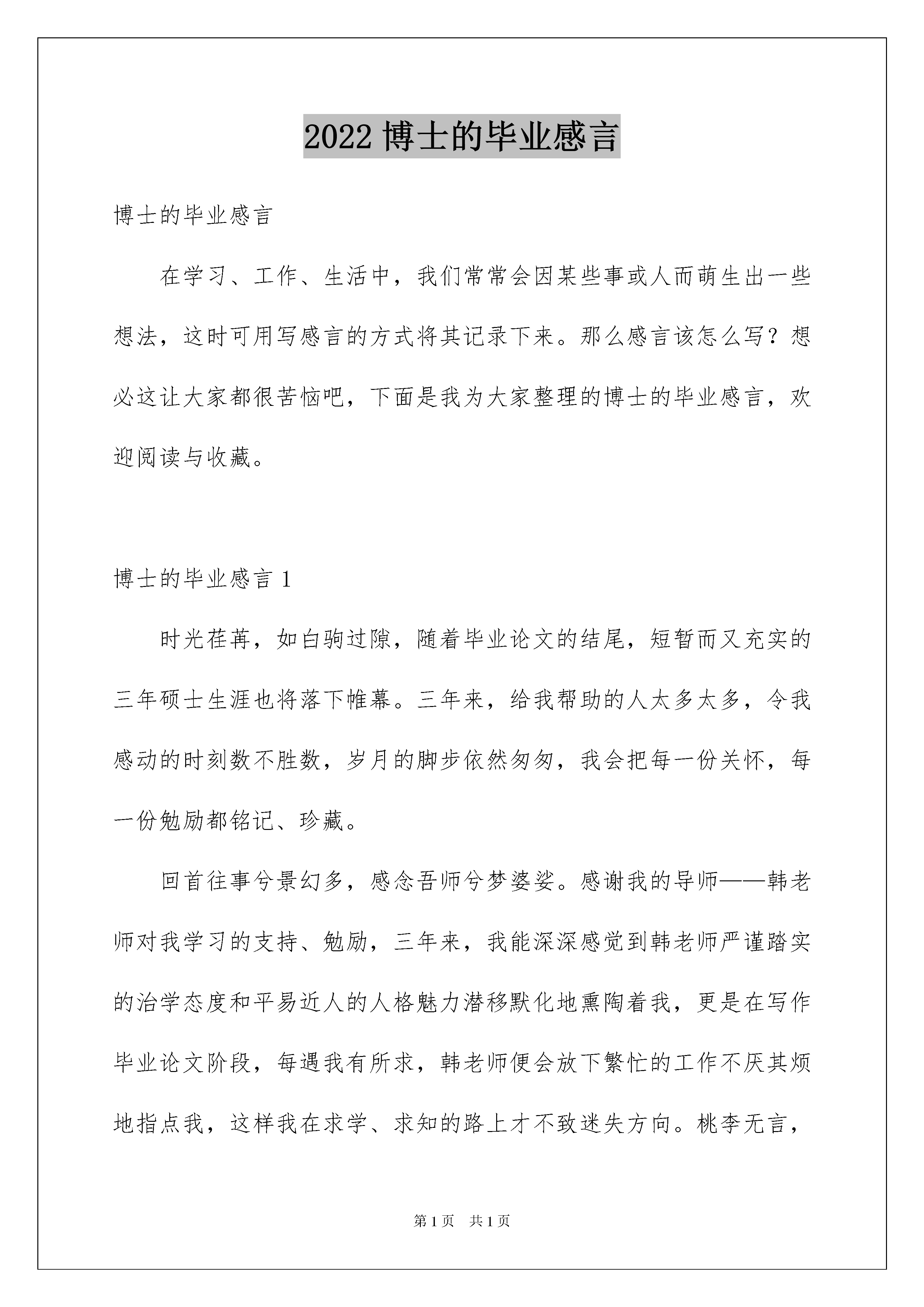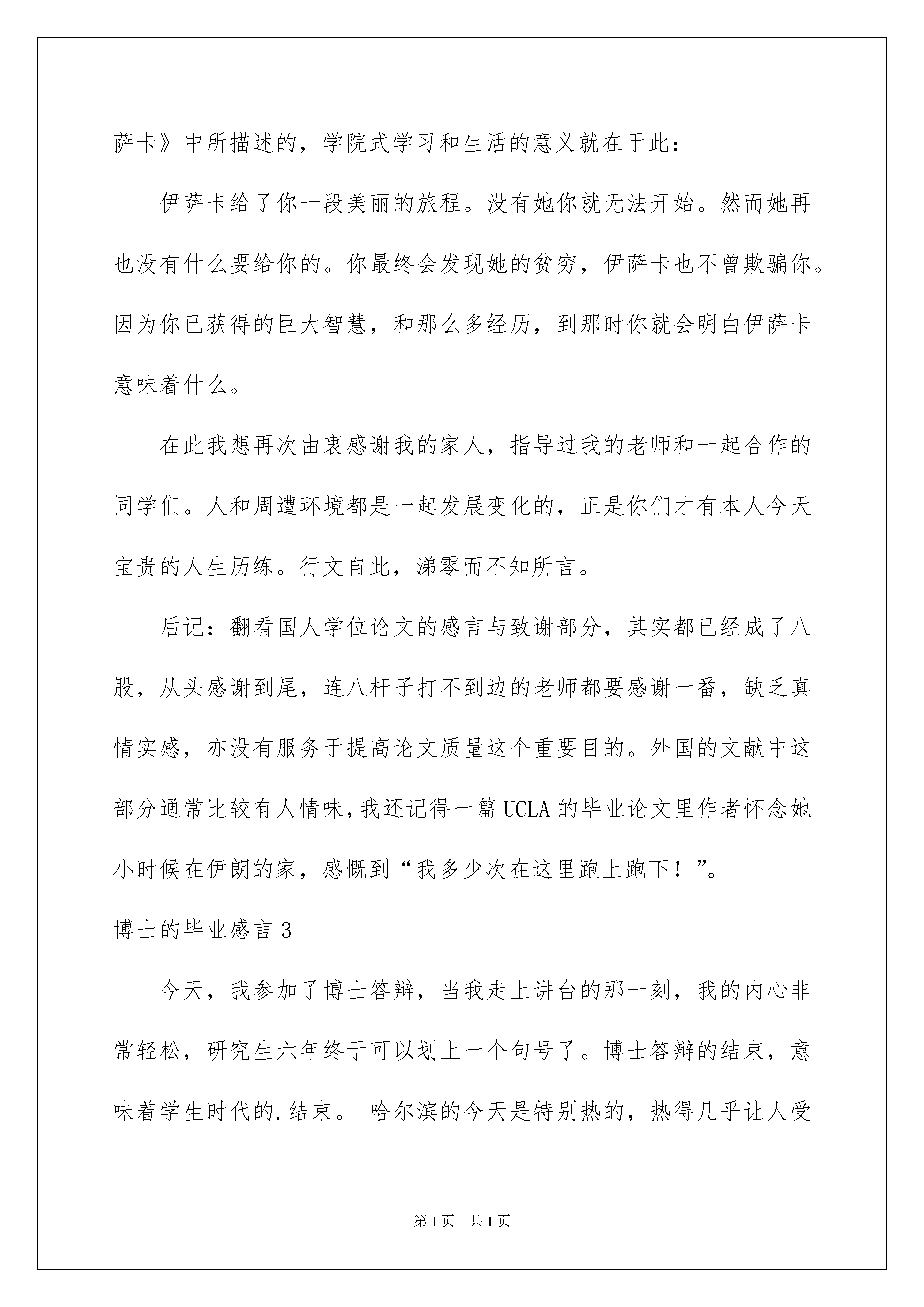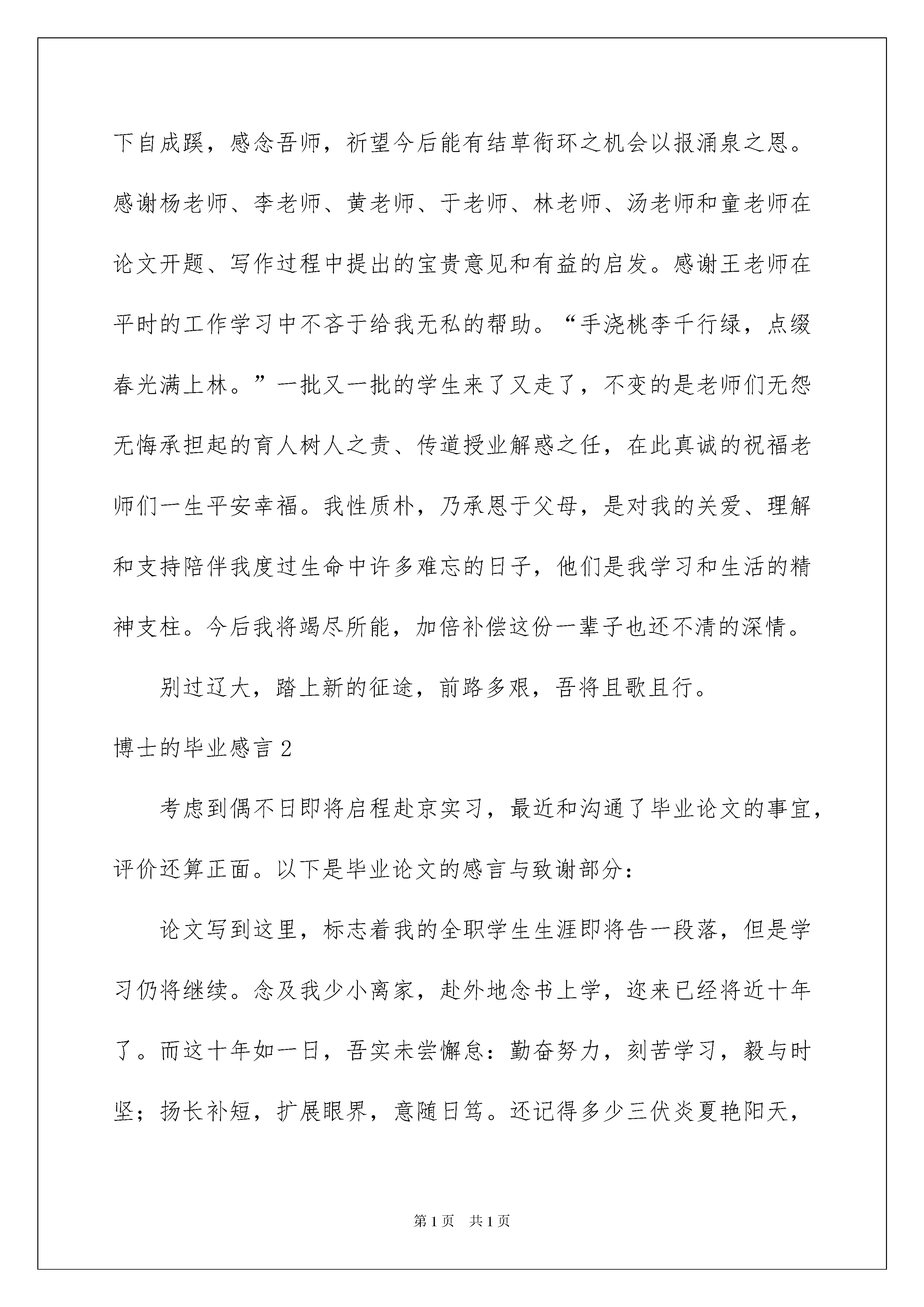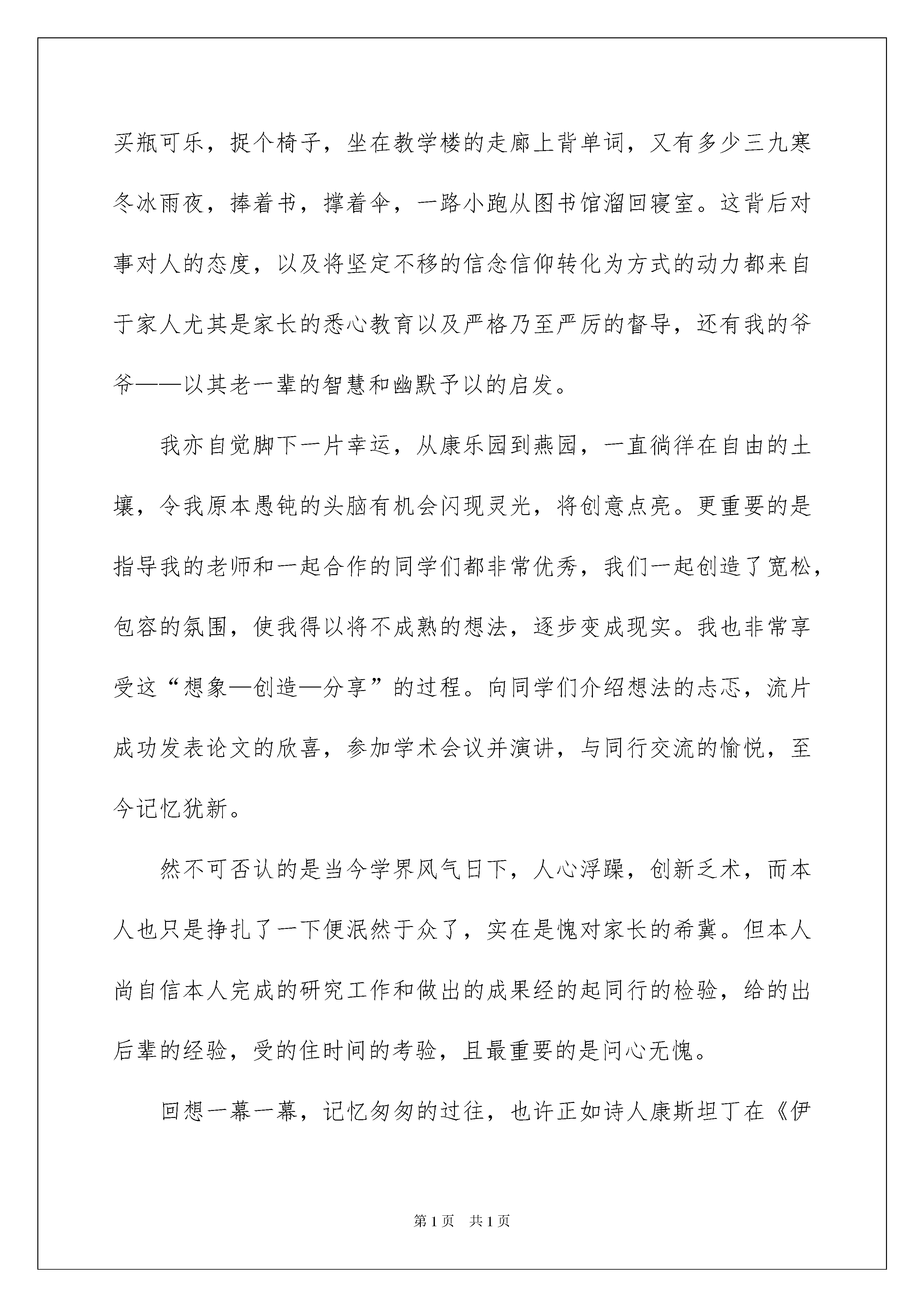 2022博士的毕业感言博士的毕业感言在学习、工作、生活中,我们常常会因某些事或人而萌生出一些想法,这时可用写感言的方式将其记录下来。那么感言该怎么写?想必这让大家都很苦恼吧,下面是我为大家整理的博士的毕业感言,欢迎阅读与收藏。博士的毕业感言1时光荏苒,如白驹过隙,随着毕业论文的结尾,短暂而又充实的三年硕士生涯也将落下帷幕。三年来,给我帮助的人太多太多,令我感动的时刻数不胜数,岁月的脚步依然匆匆,我会把每一份关怀,每一份勉励都铭记、珍藏。回首往事兮景幻多,感念吾师兮梦婆娑。感谢我的导师——韩老师对我学习的支持、勉励,三年来,我能深深感觉到韩老师严谨踏实的治学态度和平易近人的人格魅力潜移默化地熏陶着我,更是在写作毕业论文阶段,每遇我有所求,韩老师便会放下繁忙的工作不厌其烦地指点我,这样我在求学、求知的路上才不致迷失方向。桃李无言,下自成蹊,感念吾师,祈望今后能有结草衔环之机会以报涌泉之恩。感谢杨老师、李老师、黄老师、于老师、林老师、汤老师和童老师在论文开题、写作过程中提出的宝贵意见和有益的启发。感谢王老师在平时的工作学习中不吝于给我无私的帮助。“手浇桃李千行绿,点缀春光满上林。”一批又一批的学生来了又走了,不变的是老师们无怨无悔承担起的育人树人之责、传道授业解惑之任,在此真诚的祝福老师们一生平安幸福。我性质朴,乃承恩于父母,是对我的关爱、理解和支持陪伴我度过生命中许多难忘的日子,他们是我学习和生活的精神支柱。今后我将竭尽所能,加倍补偿这份一辈子也还不清的深情。别过辽大,踏上新的征途,前路多艰,吾将且歌且行。博士的毕业感言2考虑到偶不日即将启程赴京实习,最近和沟通了毕业论文的事宜,评价还算正面。以下是毕业论文的感言与致谢部分:论文写到这里,标志着我的全职学生生涯即将告一段落,但是学习仍将继续。念及我少小离家,赴外地念书上学,迩来已经将近十年了。而这十年如一日,吾实未尝懈怠:勤奋努力,刻苦学习,毅与时坚;扬长补短,扩展眼界,意随日笃。还记得多少三伏炎夏艳阳天,买瓶可乐,捉个椅子,坐在教学楼的走廊上背单词,又有多少三九寒冬冰雨夜,捧着书,撑着伞,一路小跑从图书馆溜回寝室。这背后对事对人的态度,以及将坚定不移的信念信仰转化为方式的动力都来自于家人尤其是家长的悉心教育以及严格乃至严厉的督导,还有我的爷爷——以其老一辈的智慧和幽默予以的启发。我亦自觉脚下一片幸运,从康乐园到燕园,一直徜徉在自由的土壤,令我原本愚钝的头脑有机会闪现灵光,将创意点亮。更重要的是指导我的老师和一起合作的同学们都非常优秀,我们一起创造了宽松,包容的氛围,使我得以将不成熟的想法,逐步变成现实。我也非常享受这“想象—创造—分享”的过程。向同学们介绍想法的忐忑,流片成功发表论文的欣喜,参加学术会议并演讲,与同行交流的愉悦,至今记忆犹新。然不可否认的是当今学界风气日下,人心浮躁,创新乏术,而本人也只是挣扎了一下便泯然于众了,实在是愧对家长的希冀。但本人尚自信本人完成的研究工作和做出的成果经的起同行的检验,给的出后辈的经验,受的住时间的考验,且最重要的是问心无愧。回想一幕一幕,记忆匆匆的过往,也许正如诗人康斯坦丁在《伊萨卡》中所描述的,学院式学习和生活的意义就在于此:伊萨卡给了你一段美丽的旅程。没有她你就无法开始。然而她再也没有什么要给你的。你最终会发现她的贫穷,伊萨卡也不曾欺骗你。因为你已获得的巨大智慧,和那么多经历,到那时你就会明白伊萨卡意味着什么。在此我想再次由衷感谢我的家人,指导过我的老师和一起合作的同学们。人和周遭环境都是一起发展变化的,正是你们才有本人今天宝贵的人生历练。行文自此,涕零而不知所言。后记:翻看国人学位论文的感言与致谢部分,其实都已经成了八股,从头感谢到尾,连八杆子打不到边的老师都要感谢一番,缺乏真情实感,亦没有服务于提高论文质量这个重要目的。外国的文献中这部分通常比较有人情味,我还记得一篇UCLA的毕业论文里作者怀念她小时候在伊朗的家,感慨到“我多少次在这里跑上跑下!”。博士的毕业感言3今天,我参加了博士答辩,当我走上讲台的那一刻,我的内心非常轻松,研究生六年终于可以划上一个句号了。博士答辩的结束,意味着学生时代的.结束。哈尔滨的今天是特别热的,热得几乎让人受不了!答辩教室没有空调,答辩委员会评委老师们非常辛苦。我发自内心的感谢答辩委员会主席和专家评委们!感谢参加博士答辩的师弟及师妹们!十年前,我带着梦想和对未来的无限憧憬来到了哈尔滨。从20xx年进入大学到20xx年博士毕业整整十年,回首十年的奋斗历程,令我感慨万千。有许许多多值得怀念和感谢的人和事。首先,衷心感谢恩师马莺教授对我的淳淳教诲和悉心