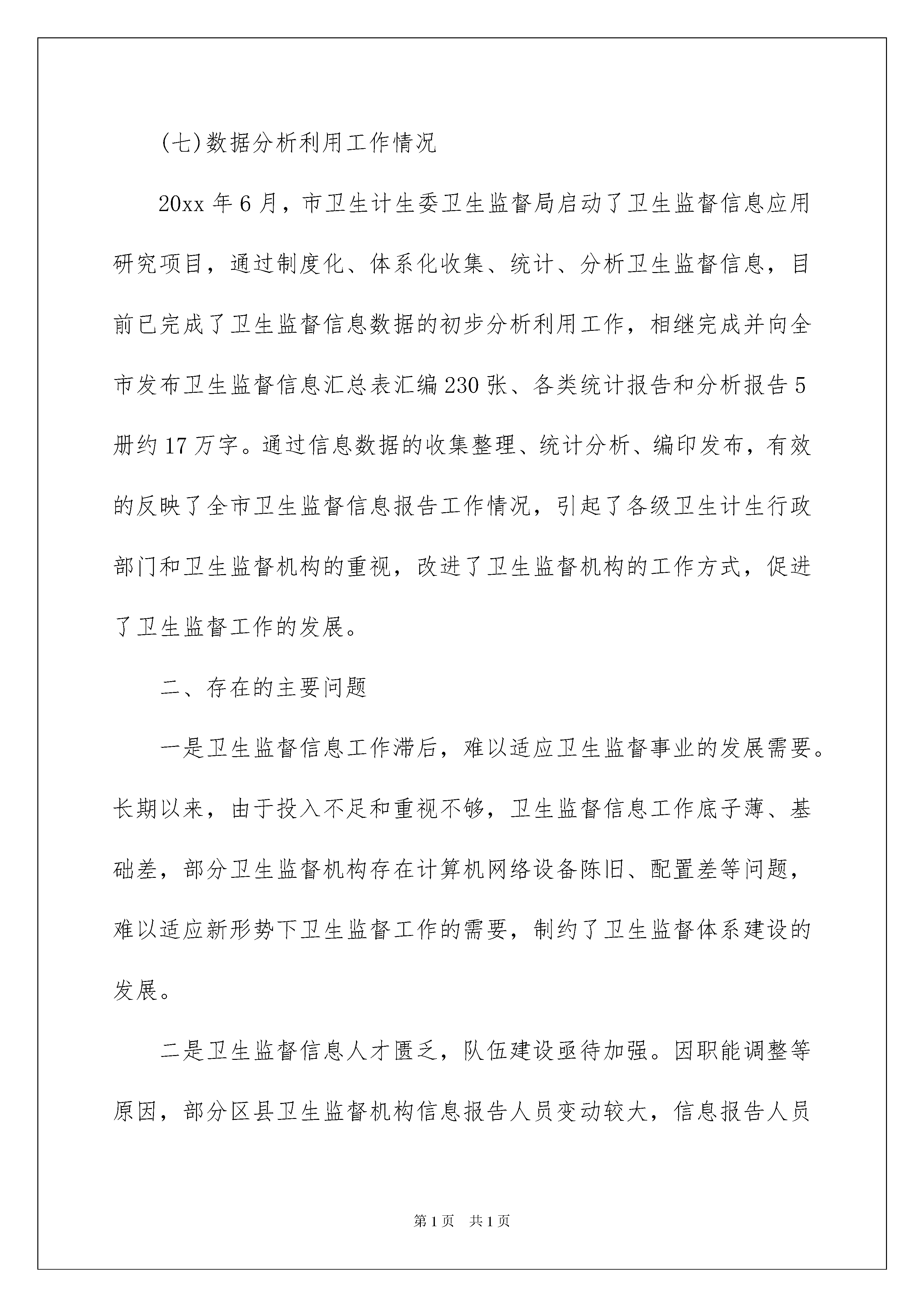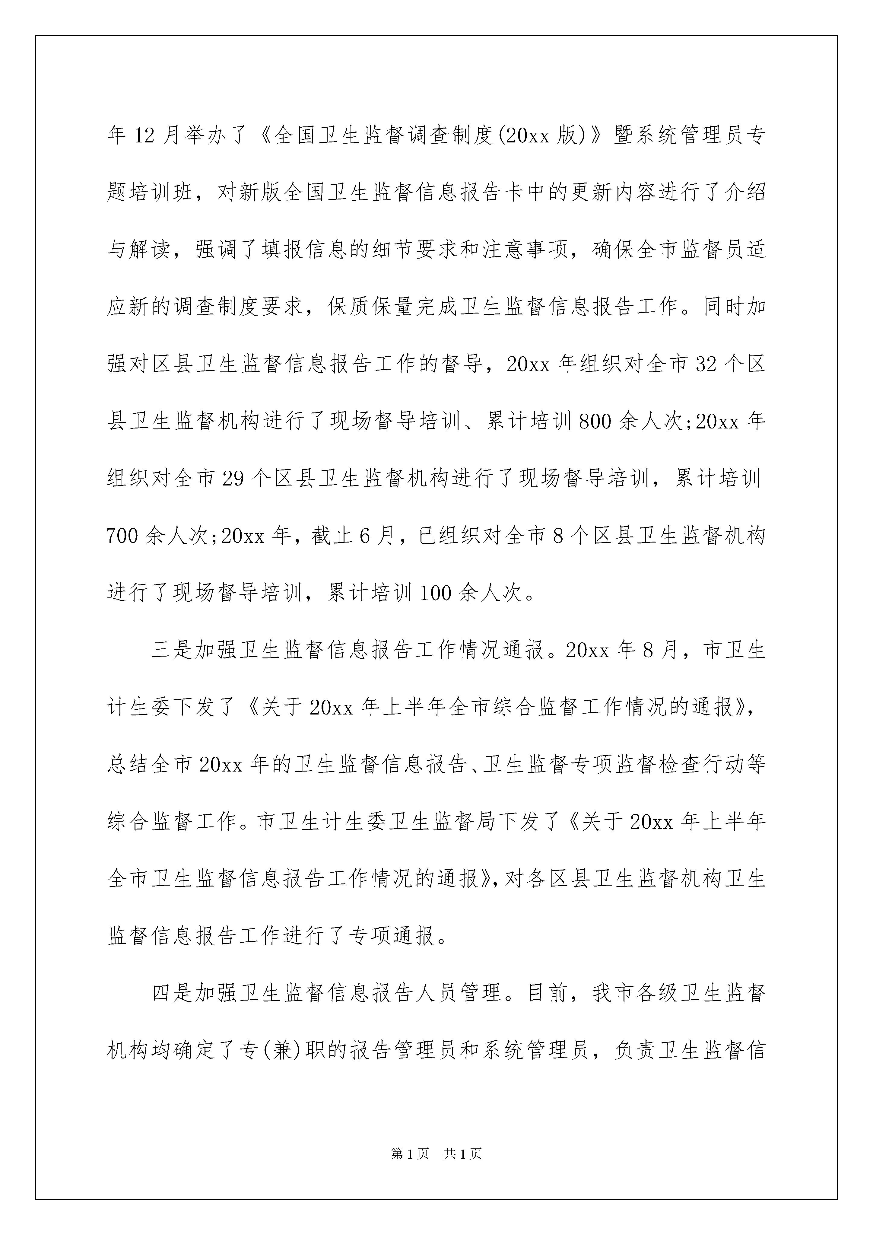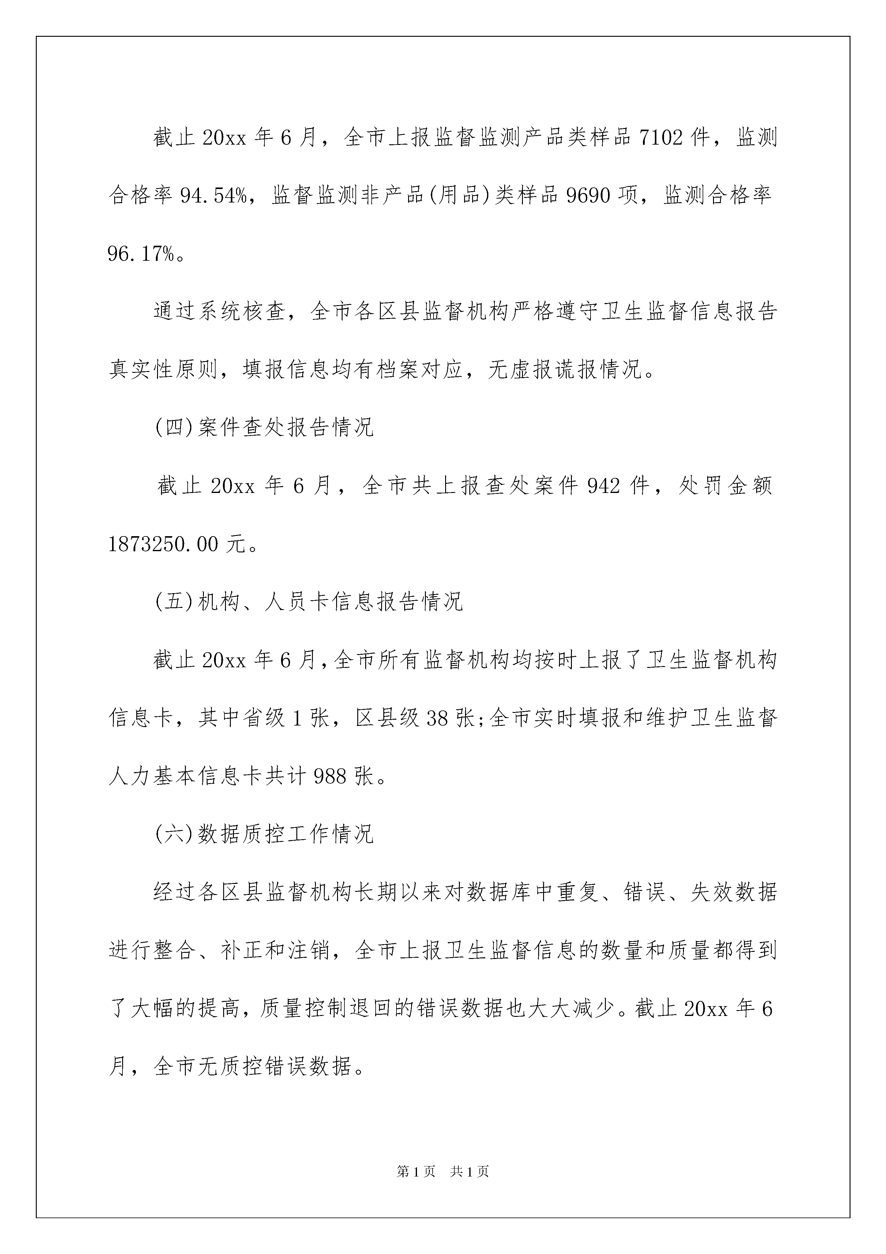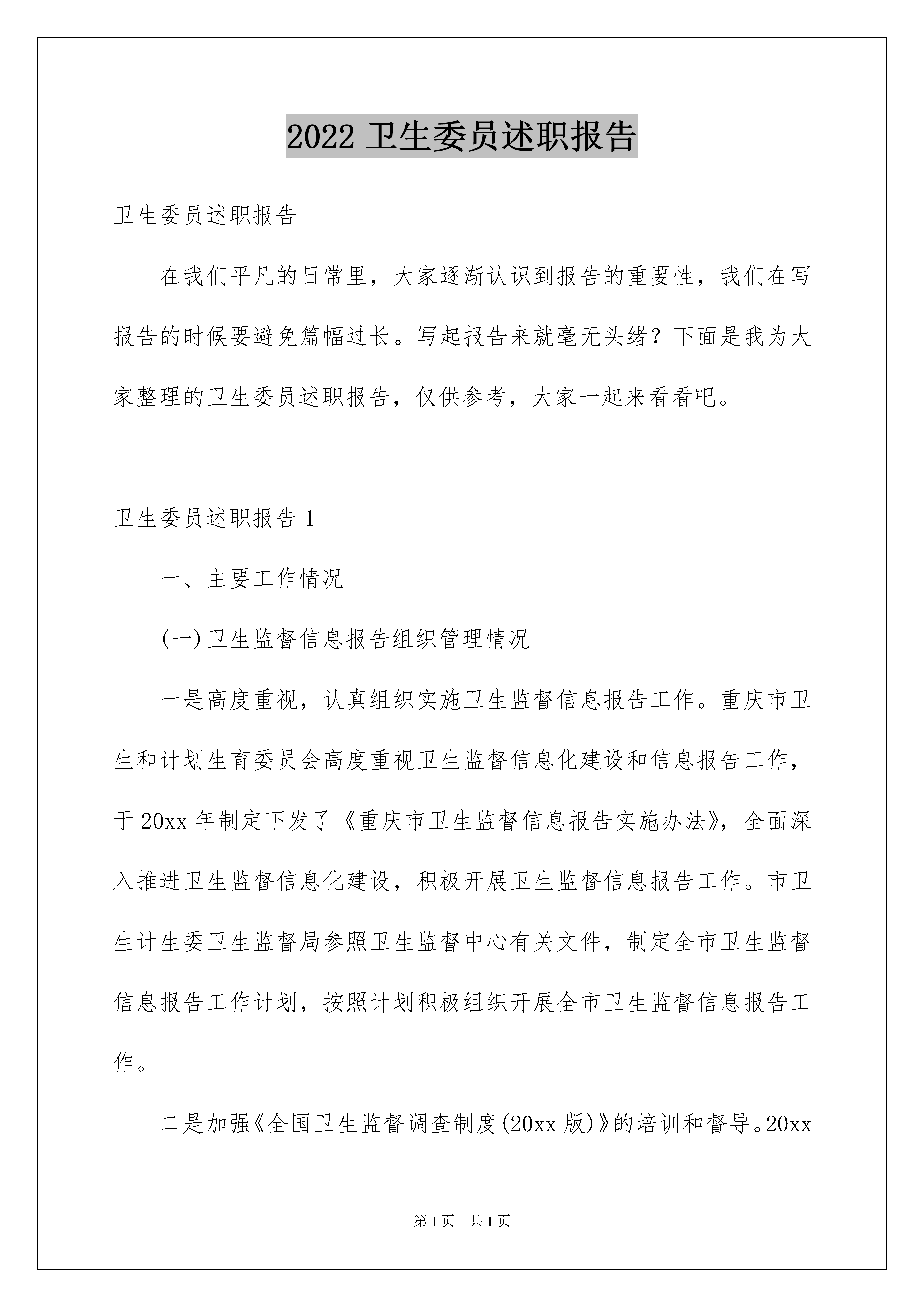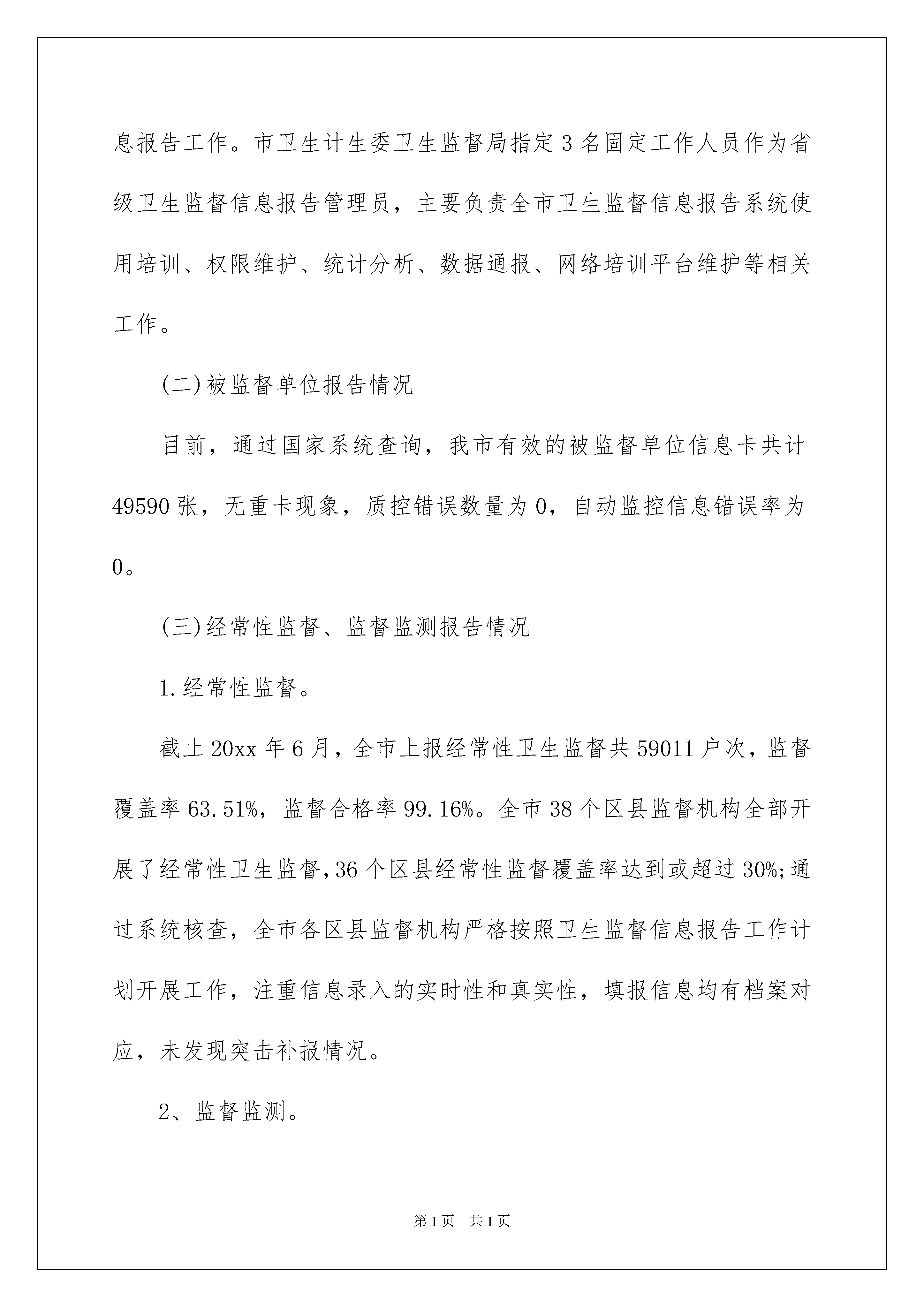 2022卫生委员述职报告卫生委员述职报告在我们平凡的日常里,大家逐渐认识到报告的重要性,我们在写报告的时候要避免篇幅过长。写起报告来就毫无头绪?下面是我为大家整理的卫生委员述职报告,仅供参考,大家一起来看看吧。卫生委员述职报告1一、主要工作情况(一)卫生监督信息报告组织管理情况一是高度重视,认真组织实施卫生监督信息报告工作。重庆市卫生和计划生育委员会高度重视卫生监督信息化建设和信息报告工作,于20xx年制定下发了《重庆市卫生监督信息报告实施办法》,全面深入推进卫生监督信息化建设,积极开展卫生监督信息报告工作。市卫生计生委卫生监督局参照卫生监督中心有关文件,制定全市卫生监督信息报告工作计划,按照计划积极组织开展全市卫生监督信息报告工作。二是加强《全国卫生监督调查制度(20xx版)》的培训和督导。20xx年12月举办了《全国卫生监督调查制度(20xx版)》暨系统管理员专题培训班,对新版全国卫生监督信息报告卡中的更新内容进行了介绍与解读,强调了填报信息的细节要求和注意事项,确保全市监督员适应新的调查制度要求,保质保量完成卫生监督信息报告工作。同时加强对区县卫生监督信息报告工作的督导,20xx年组织对全市32个区县卫生监督机构进行了现场督导培训、累计培训800余人次;20xx年组织对全市29个区县卫生监督机构进行了现场督导培训,累计培训700余人次;20xx年,截止6月,已组织对全市8个区县卫生监督机构进行了现场督导培训,累计培训100余人次。三是加强卫生监督信息报告工作情况通报。20xx年8月,市卫生计生委下发了《关于20xx年上半年全市综合监督工作情况的通报》,总结全市20xx年的卫生监督信息报告、卫生监督专项监督检查行动等综合监督工作。市卫生计生委卫生监督局下发了《关于20xx年上半年全市卫生监督信息报告工作情况的通报》,对各区县卫生监督机构卫生监督信息报告工作进行了专项通报。四是加强卫生监督信息报告人员管理。目前,我市各级卫生监督机构均确定了专(兼)职的报告管理员和系统管理员,负责卫生监督信息报告工作。市卫生计生委卫生监督局指定3名固定工作人员作为省级卫生监督信息报告管理员,主要负责全市卫生监督信息报告系统使用培训、权限维护、统计分析、数据通报、网络培训平台维护等相关工作。(二)被监督单位报告情况目前,通过国家系统查询,我市有效的被监督单位信息卡共计49590张,无重卡现象,质控错误数量为0,自动监控信息错误率为0。(三)经常性监督、监督监测报告情况1.经常性监督。截止20xx年6月,全市上报经常性卫生监督共59011户次,监督覆盖率63.51%,监督合格率99.16%。全市38个区县监督机构全部开展了经常性卫生监督,36个区县经常性监督覆盖率达到或超过30%;通过系统核查,全市各区县监督机构严格按照卫生监督信息报告工作计划开展工作,注重信息录入的实时性和真实性,填报信息均有档案对应,未发现突击补报情况。2、监督监测。截止20xx年6月,全市上报监督监测产品类样品7102件,监测合格率94.54%,监督监测非产品(用品)类样品9690项,监测合格率96.17%。通过系统核查,全市各区县监督机构严格遵守卫生监督信息报告真实性原则,填报信息均有档案对应,无虚报谎报情况。(四)案件查处报告情况截止20xx年6月,全市共上报查处案件942件,处罚金额1873250.00元。(五)机构、人员卡信息报告情况截止20xx年6月,全市所有监督机构均按时上报了卫生监督机构信息卡,其中省级1张,区县级38张;全市实时填报和维护卫生监督人力基本信息卡共计988张。(六)数据质控工作情况经过各区县监督机构长期以来对数据库中重复、错误、失效数据进行整合、补正和注销,全市上报卫生监督信息的数量和质量都得到了大幅的提高,质量控制退回的错误数据也大大减少。截止20xx年6月,全市无质控错误数据。(七)数据分析利用工作情况20xx年6月,市卫生计生委卫生监督局启动了卫生监督信息应用研究项目,通过制度化、体系化收集、统计、分析卫生监督信息,目前已完成了卫生监督信息数据的初步分析利用工作,相继完成并向全市发布卫生监督信息汇总表汇编230张、各类统计报告和分析报告5册约17万字。通过信息数据的收集整理、统计分析、编印发布,有效的反映了全市卫生监督信息报告工作情况,引起了各级卫生计生行政部门和卫生监督机构的重视,改进了卫生监督机构的工作方式,促进了卫生监督工作的发展。二、存在的主要问题一是卫生监督信息工作滞后,难以适应卫生监督事业的发展需要。长期以来,由于投入不足和重视不够,卫生监督信息工作底子薄、基础差,部分卫