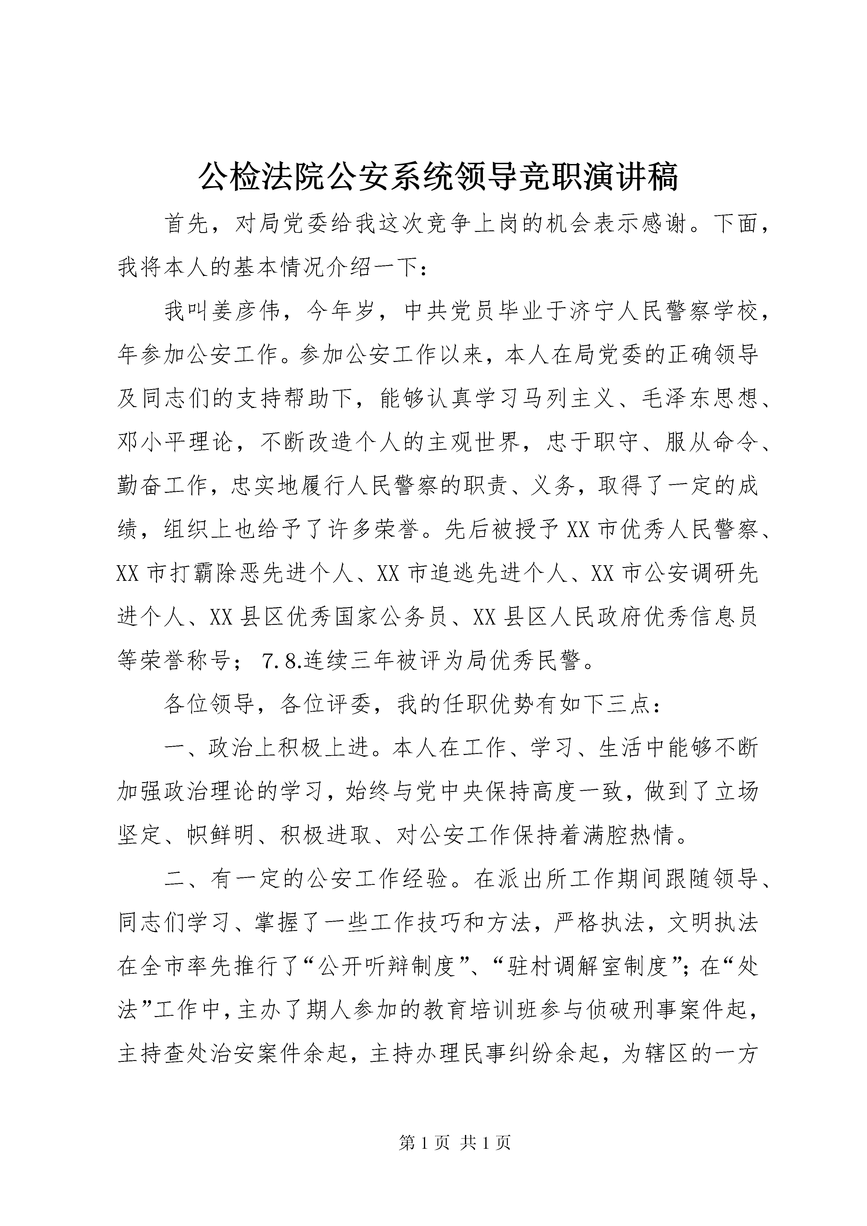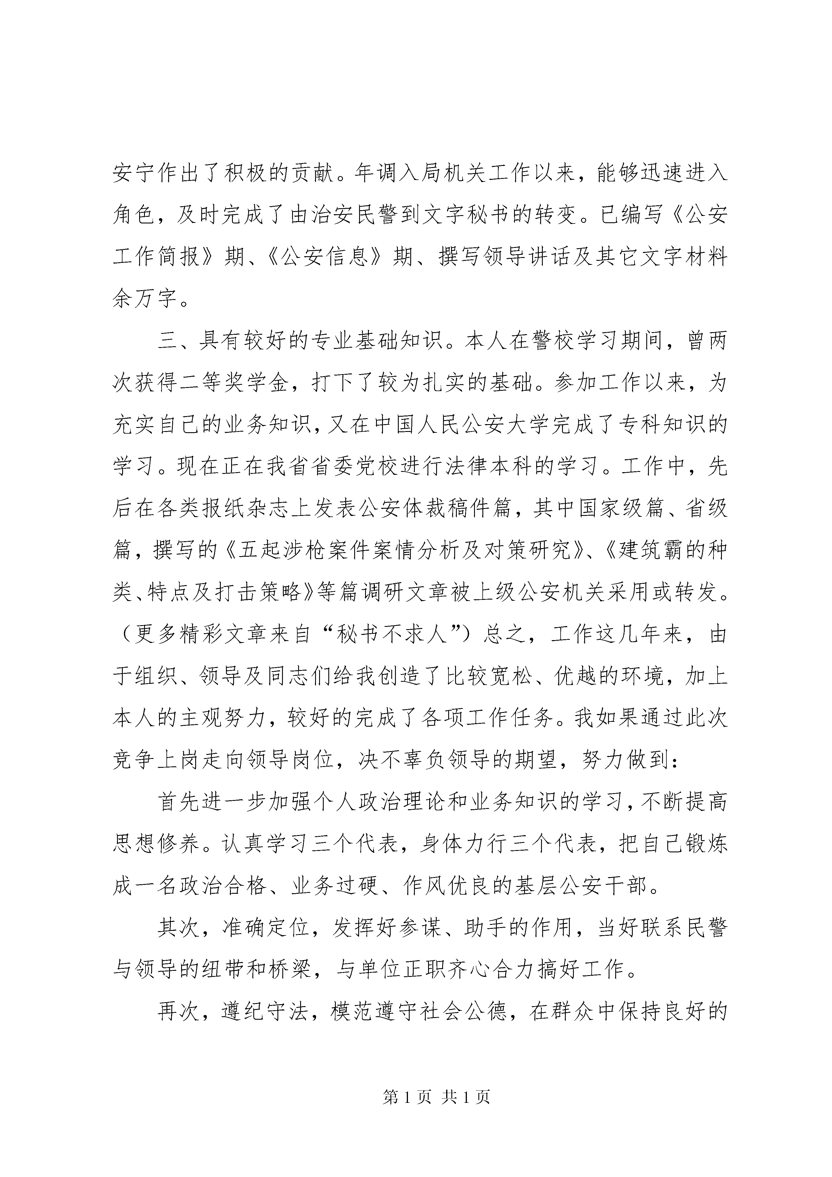 公检法院公安系统领导竞职演讲稿首先,对局党委给我这次竞争上岗的机会表示感谢。下面,我将本人的基本情况介绍一下:我叫姜彦伟,今年岁,中共党员毕业于济宁人民警察学校,年参加公安工作。参加公安工作以来,本人在局党委的正确领导及同志们的支持帮助下,能够认真学习马列主义、毛泽东思想、邓小平理论,不断改造个人的主观世界,忠于职守、服从命令、勤奋工作,忠实地履行人民警察的职责、义务,取得了一定的成绩,组织上也给予了许多荣誉。先后被授予XX市优秀人民警察、XX市打霸除恶先进个人、XX市追逃先进个人、XX市公安调研先进个人、XX县区优秀国家公务员、XX县区人民政府优秀信息员等荣誉称号;⒎⒏连续三年被评为局优秀民警。各位领导,各位评委,我的任职优势有如下三点:一、政治上积极上进。本人在工作、学习、生活中能够不断加强政治理论的学习,始终与党中央保持高度一致,做到了立场坚定、帜鲜明、积极进取、对公安工作保持着满腔热情。二、有一定的公安工作经验。在派出所工作期间跟随领导、同志们学习、掌握了一些工作技巧和方法,严格执法,文明执法在全市率先推行了“公开听辩制度”、“驻村调解室制度”;在“处法”工作中,主办了期人参加的教育培训班参与侦破刑事案件起,主持查处治安案件余起,主持办理民事纠纷余起,为辖区的一方安宁作出了积极的贡献。年调入局机关工作以来,能够迅速进入角色,及时完成了由治安民警到文字秘书的转变。已编写《公安工作简报》期、《公安信息》期、撰写领导讲话及其它文字材料余万字。三、具有较好的专业基础知识。本人在警校学习期间,曾两次获得二等奖学金,打下了较为扎实的基础。参加工作以来,为充实自己的业务知识,又在中国人民公安大学完成了专科知识的学习。现在正在我省省委党校进行法律本科的学习。工作中,先后在各类报纸杂志上发表公安体裁稿件篇,其中国家级篇、省级篇,撰写的《五起涉枪案件案情分析及对策研究》、《建筑霸的种类、特点及打击策略》等篇调研文章被上级公安机关采用或转发。(更多精彩文章来自“秘书不求人”)总之,工作这几年来,由于组织、领导及同志们给我创造了比较宽松、优越的环境,加上本人的主观努力,较好的完成了各项工作任务。我如果通过此次竞争上岗走向领导岗位,决不辜负领导的期望,努力做到:首先进一步加强个人政治理论和业务知识的学习,不断提高思想修养。认真学习三个代表,身体力行三个代表,把自己锻炼成一名政治合格、业务过硬、作风优良的基层公安干部。其次,准确定位,发挥好参谋、助手的作用,当好联系民警与领导的纽带和桥梁,与单位正职齐心合力搞好工作。再次,遵纪守法,模范遵守社会公德,在群众中保持良好的人民警察形象,如果我没有竞争上,我也决不灰心丧气,这说明我在某些方面的条件还不够成熟,我一定会一如既往的干好本职工作,发扬优点,克服缺点,再接再厉争取早日实现自己的目标,为公安工作贡献自己的力量。我的演讲完了。谢谢各位领导、各位评委。