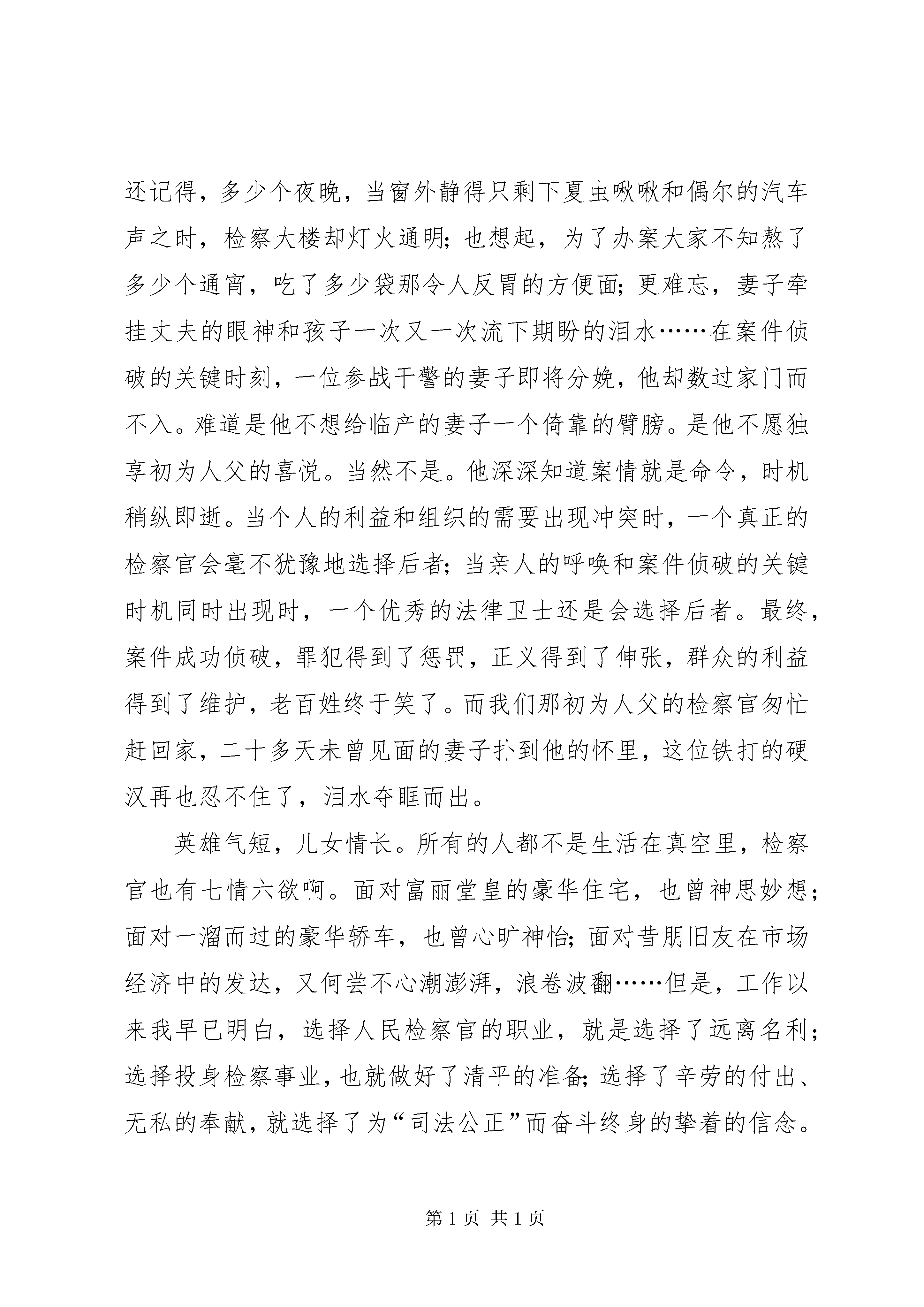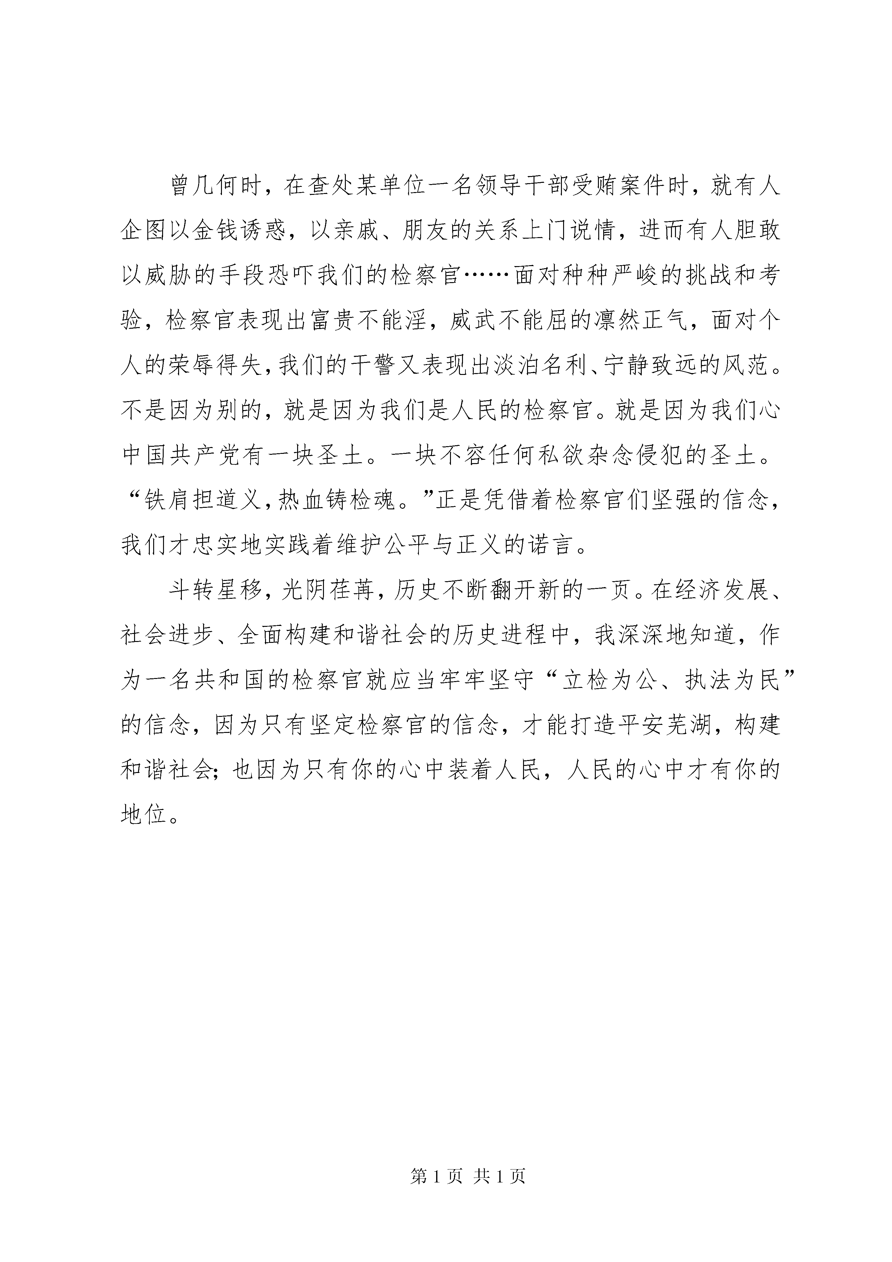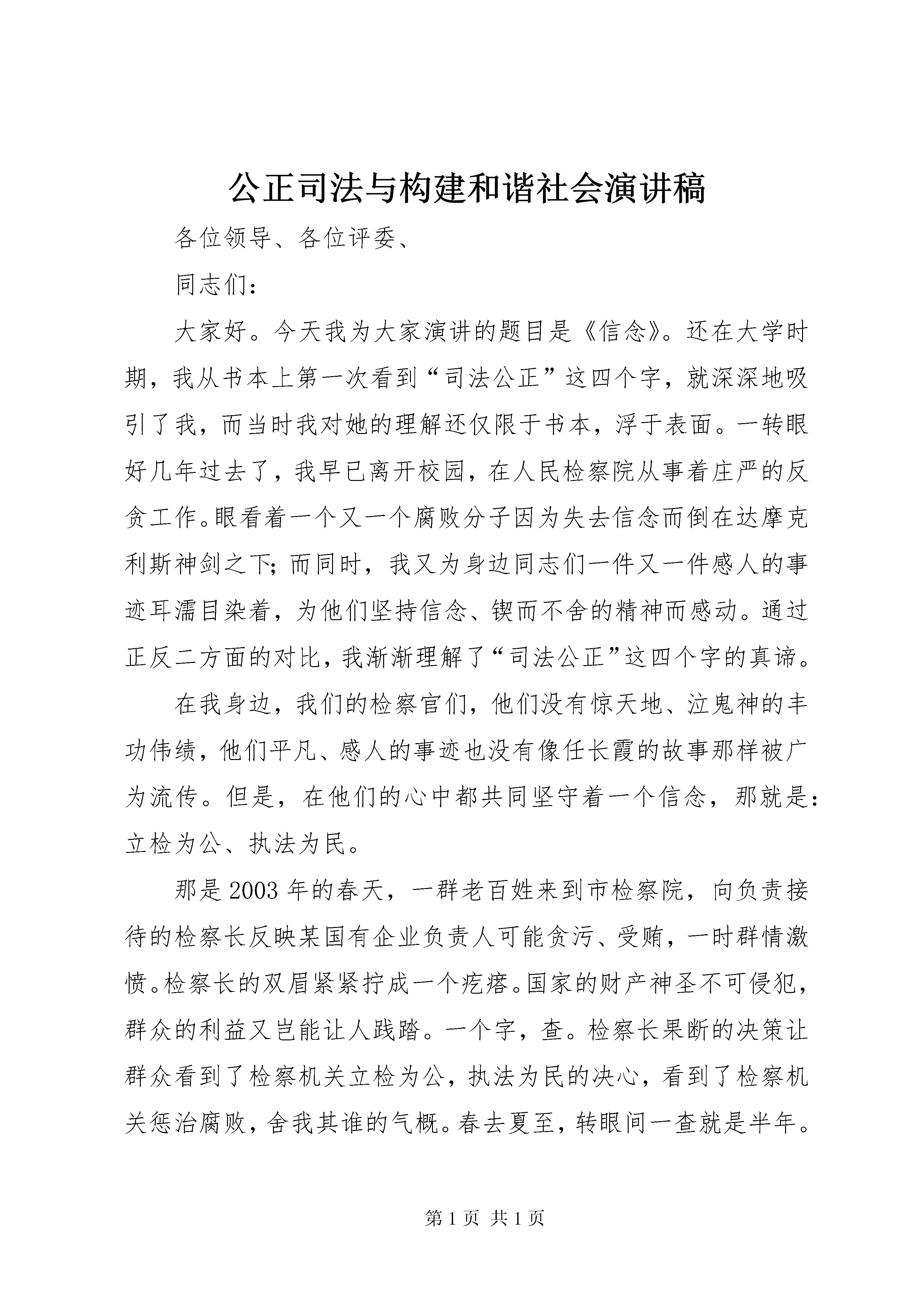 公正司法与构建和谐社会演讲稿各位领导、各位评委、同志们:大家好。今天我为大家演讲的题目是《信念》。还在大学时期,我从书本上第一次看到“司法公正”这四个字,就深深地吸引了我,而当时我对她的理解还仅限于书本,浮于表面。一转眼好几年过去了,我早已离开校园,在人民检察院从事着庄严的反贪工作。眼看着一个又一个腐败分子因为失去信念而倒在达摩克利斯神剑之下;而同时,我又为身边同志们一件又一件感人的事迹耳濡目染着,为他们坚持信念、锲而不舍的精神而感动。通过正反二方面的对比,我渐渐理解了“司法公正”这四个字的真谛。在我身边,我们的检察官们,他们没有惊天地、泣鬼神的丰功伟绩,他们平凡、感人的事迹也没有像任长霞的故事那样被广为流传。但是,在他们的心中都共同坚守着一个信念,那就是:立检为公、执法为民。那是2003年的春天,一群老百姓来到市检察院,向负责接待的检察长反映某国有企业负责人可能贪污、受贿,一时群情激愤。检察长的双眉紧紧拧成一个疙瘩。国家的财产神圣不可侵犯,群众的利益又岂能让人践踏。一个字,查。检察长果断的决策让群众看到了检察机关立检为公,执法为民的决心,看到了检察机关惩治腐败,舍我其谁的气概。春去夏至,转眼间一查就是半年。还记得,多少个夜晚,当窗外静得只剩下夏虫啾啾和偶尔的汽车声之时,检察大楼却灯火通明;也想起,为了办案大家不知熬了多少个通宵,吃了多少袋那令人反胃的方便面;更难忘,妻子牵挂丈夫的眼神和孩子一次又一次流下期盼的泪水……在案件侦破的关键时刻,一位参战干警的妻子即将分娩,他却数过家门而不入。难道是他不想给临产的妻子一个倚靠的臂膀。是他不愿独享初为人父的喜悦。当然不是。他深深知道案情就是命令,时机稍纵即逝。当个人的利益和组织的需要出现冲突时,一个真正的检察官会毫不犹豫地选择后者;当亲人的呼唤和案件侦破的关键时机同时出现时,一个优秀的法律卫士还是会选择后者。最终,案件成功侦破,罪犯得到了惩罚,正义得到了伸张,群众的利益得到了维护,老百姓终于笑了。而我们那初为人父的检察官匆忙赶回家,二十多天未曾见面的妻子扑到他的怀里,这位铁打的硬汉再也忍不住了,泪水夺眶而出。英雄气短,儿女情长。所有的人都不是生活在真空里,检察官也有七情六欲啊。面对富丽堂皇的豪华住宅,也曾神思妙想;面对一溜而过的豪华轿车,也曾心旷神怡;面对昔朋旧友在市场经济中的发达,又何尝不心潮澎湃,浪卷波翻……但是,工作以来我早已明白,选择人民检察官的职业,就是选择了远离名利;选择投身检察事业,也就做好了清平的准备;选择了辛劳的付出、无私的奉献,就选择了为“司法公正”而奋斗终身的挚着的信念。曾几何时,在查处某单位一名领导干部受贿案件时,就有人企图以金钱诱惑,以亲戚、朋友的关系上门说情,进而有人胆敢以威胁的手段恐吓我们的检察官……面对种种严峻的挑战和考验,检察官表现出富贵不能淫,威武不能屈的凛然正气,面对个人的荣辱得失,我们的干警又表现出淡泊名利、宁静致远的风范。不是因为别的,就是因为我们是人民的检察官。就是因为我们心中国共产党有一块圣土。一块不容任何私欲杂念侵犯的圣土。“铁肩担道义,热血铸检魂。”正是凭借着检察官们坚强的信念,我们才忠实地实践着维护公平与正义的诺言。斗转星移,光阴荏苒,历史不断翻开新的一页。在经济发展、社会进步、全面构建和谐社会的历史进程中,我深深地知道,作为一名共和国的检察官就应当牢牢坚守“立检为公、执法为民”的信念,因为只有坚定检察官的信念,才能打造平安芜湖,构建和谐社会;也因为只有你的心中装着人民,人民的心中才有你的地位。