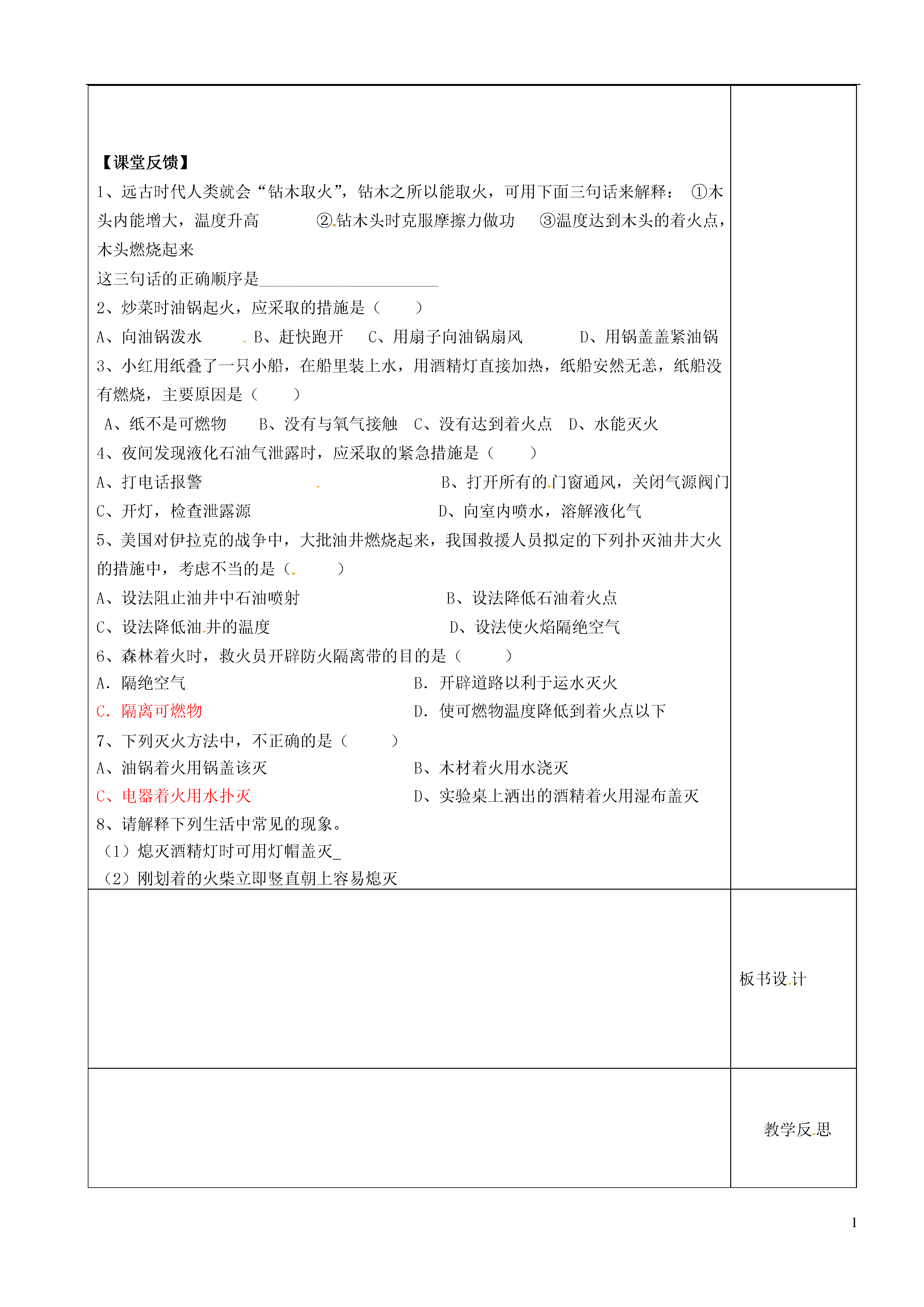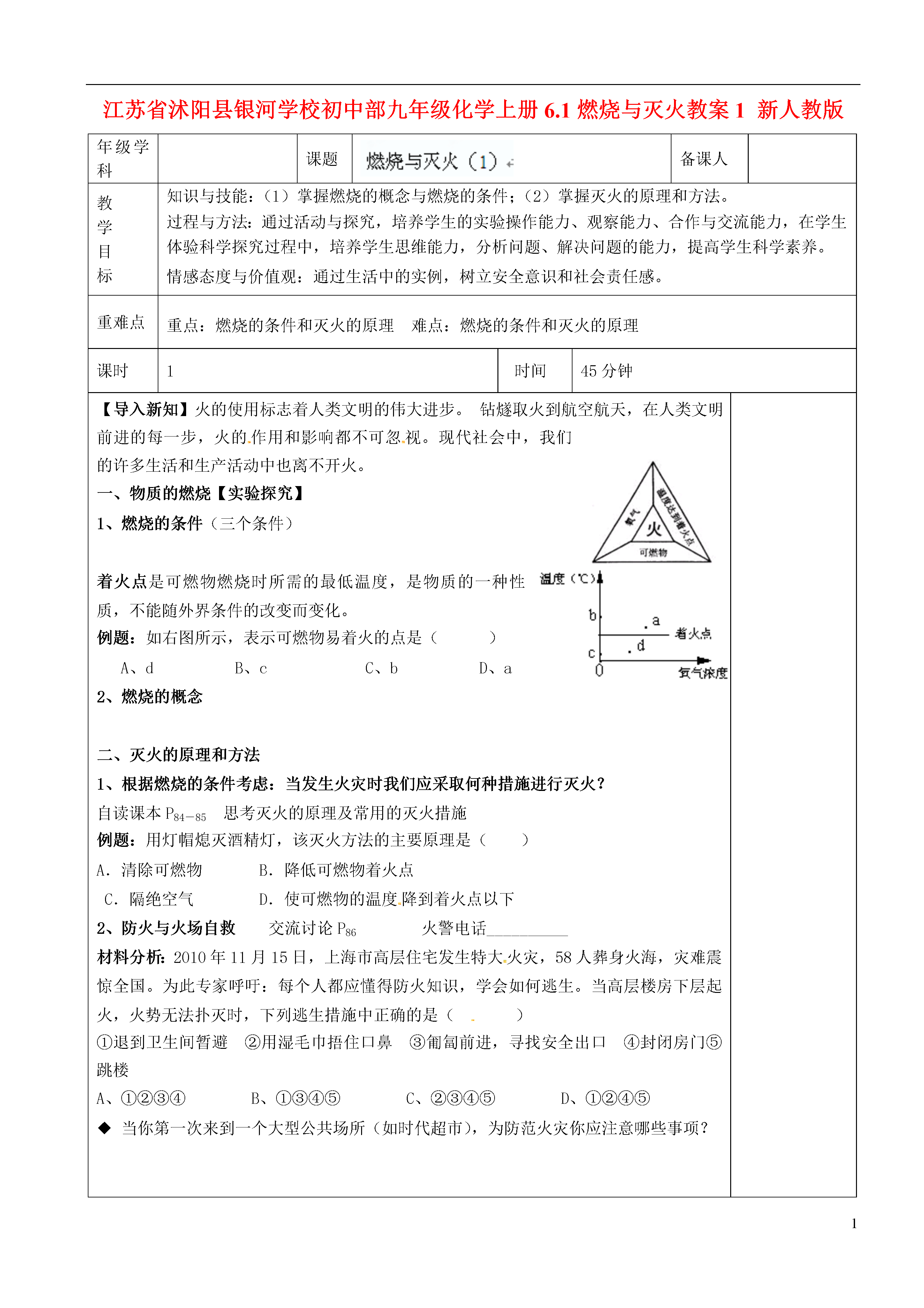 1江苏省沭阳县银河学校初中部九年级化学上册6.1燃烧与灭火教案1新人教版年级学科课题备课人教学目标知识与技能:(1)掌握燃烧的概念与燃烧的条件;(2)掌握灭火的原理和方法。过程与方法:通过活动与探究,培养学生的实验操作能力、观察能力、合作与交流能力,在学生体验科学探究过程中,培养学生思维能力,分析问题、解决问题的能力,提高学生科学素养。情感态度与价值观:通过生活中的实例,树立安全意识和社会责任感。重难点重点:燃烧的条件和灭火的原理难点:燃烧的条件和灭火的原理课时1时间45分钟【导入新知】火的使用标志着人类文明的伟大进步。钻燧取火到航空航天,在人类文明前进的每一步,火的作用和影响都不可忽视。现代社会中,我们的许多生活和生产活动中也离不开火。一、物质的燃烧【实验探究】1、燃烧的条件(三个条件)着火点是可燃物燃烧时所需的最低温度,是物质的一种性质,不能随外界条件的改变而变化。例题:如右图所示,表示可燃物易着火的点是()A、dB、cC、bD、a2、燃烧的概念二、灭火的原理和方法1、根据燃烧的条件考虑:当发生火灾时我们应采取何种措施进行灭火?自读课本P84-85思考灭火的原理及常用的灭火措施例题:用灯帽熄灭酒精灯,该灭火方法的主要原理是()A.清除可燃物B.降低可燃物着火点C.隔绝空气D.使可燃物的温度降到着火点以下2、防火与火场自救交流讨论P86火警电话__________材料分析:2010年11月15日,上海市高层住宅发生特大火灾,58人葬身火海,灾难震惊全国。为此专家呼吁:每个人都应懂得防火知识,学会如何逃生。当高层楼房下层起火,火势无法扑灭时,下列逃生措施中正确的是()①退到卫生间暂避②用湿毛巾捂住口鼻③匍匐前进,寻找安全出口④封闭房门⑤跳楼A、①②③④B、①③④⑤C、②③④⑤D、①②④⑤◆当你第一次来到一个大型公共场所(如时代超市),为防范火灾你应注意哪些事项?【课堂反馈】1、远古时代人类就会“钻木取火”,钻木之所以能取火,可用下面三句话来解释:①木头内能增大,温度升高②钻木头时克服摩擦力做功③温度达到木头的着火点,木头燃烧起来这三句话的正确顺序是______________________2、炒菜时油锅起火,应采取的措施是()A、向油锅泼水B、赶快跑开C、用扇子向油锅扇风D、用锅盖盖紧油锅3、小红用纸叠了一只小船,在船里装上水,用酒精灯直接加热,纸船安然无恙,纸船没有燃烧,主要原因是()A、纸不是可燃物B、没有与氧气接触C、没有达到着火点D、水能灭火4、夜间发现液化石油气泄露时,应采取的紧急措施是()A、打电话报警B、打开所有的门窗通风,关闭气源阀门C、开灯,检查泄露源D、向室内喷水,溶解液化气5、美国对伊拉克的战争中,大批油井燃烧起来,我国救援人员拟定的下列扑灭油井大火的措施中,考虑不当的是()A、设法阻止油井中石油喷射B、设法降低石油着火点C、设法降低油井的温度D、设法使火焰隔绝空气6、森林着火时,救火员开辟防火隔离带的目的是()A.隔绝空气B.开辟道路以利于运水灭火C.隔离可燃物D.使可燃物温度降低到着火点以下7、下列灭火方法中,不正确的是()A、油锅着火用锅盖该灭B、木材着火用水浇灭C、电器着火用水扑灭D、实验桌上洒出的酒精着火用湿布盖灭8、请解释下列生活中常见的现象。(1)熄灭酒精灯时可用灯帽盖灭(2)刚划着的火柴立即竖直朝上容易熄灭板书设计教学反思