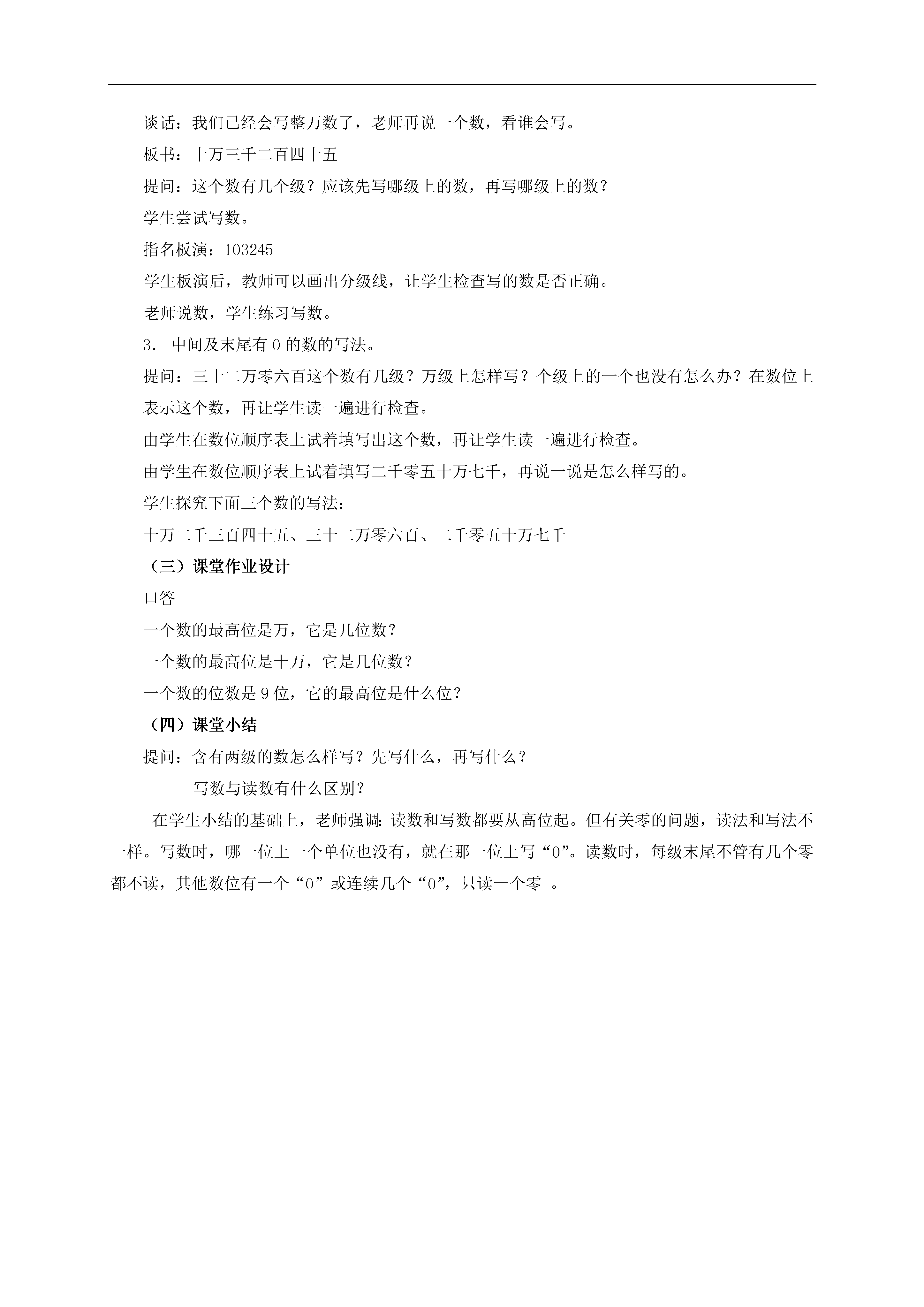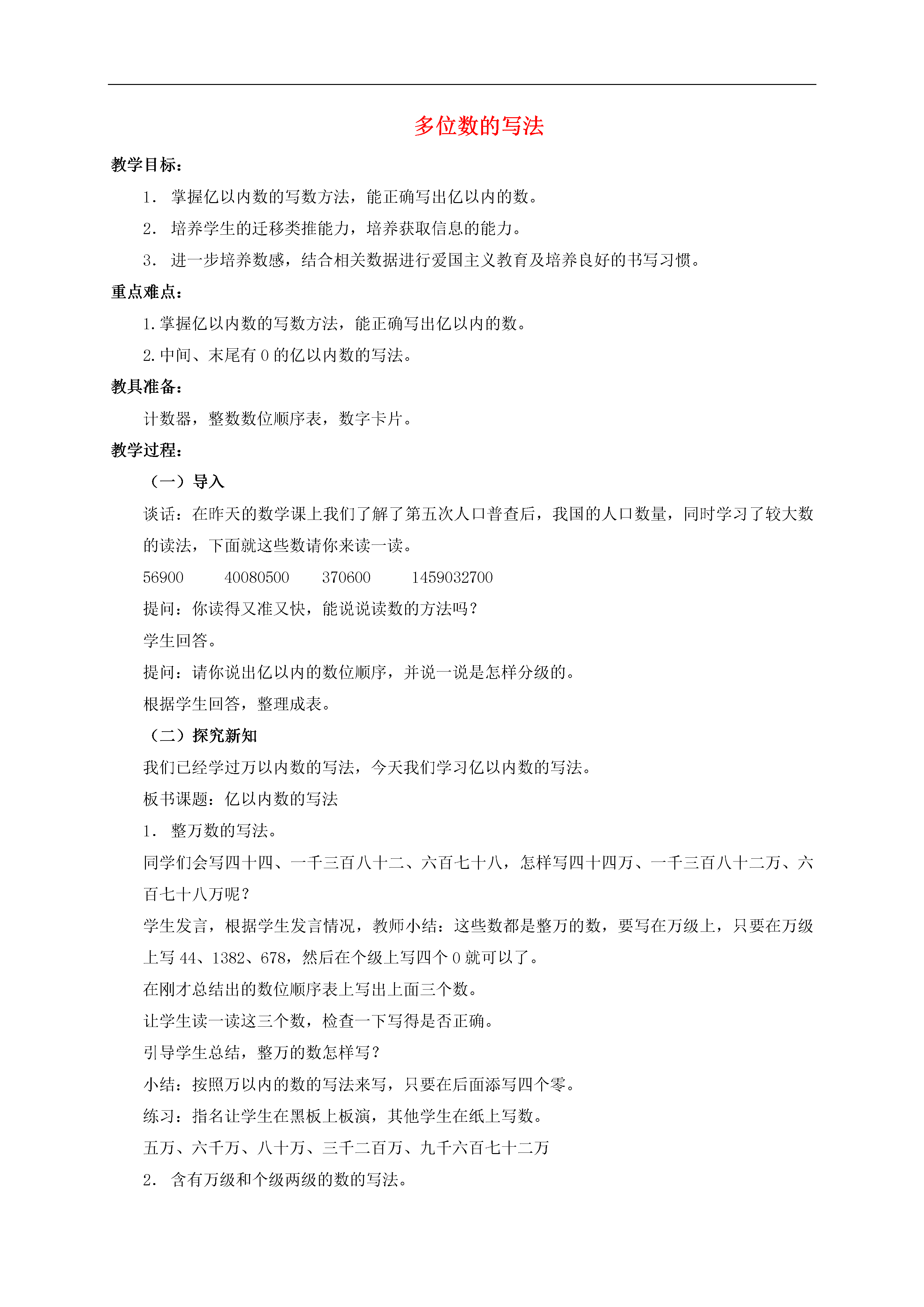 多位数的写法教学目标:掌握亿以内数的写数方法,能正确写出亿以内的数。培养学生的迁移类推能力,培养获取信息的能力。进一步培养数感,结合相关数据进行爱国主义教育及培养良好的书写习惯。重点难点:1.掌握亿以内数的写数方法,能正确写出亿以内的数。2.中间、末尾有0的亿以内数的写法。教具准备:计数器,整数数位顺序表,数字卡片。教学过程:(一)导入谈话:在昨天的数学课上我们了解了第五次人口普查后,我国的人口数量,同时学习了较大数的读法,下面就这些数请你来读一读。56900400805003706001459032700提问:你读得又准又快,能说说读数的方法吗?学生回答。提问:请你说出亿以内的数位顺序,并说一说是怎样分级的。根据学生回答,整理成表。(二)探究新知我们已经学过万以内数的写法,今天我们学习亿以内数的写法。板书课题:亿以内数的写法整万数的写法。同学们会写四十四、一千三百八十二、六百七十八,怎样写四十四万、一千三百八十二万、六百七十八万呢?学生发言,根据学生发言情况,教师小结:这些数都是整万的数,要写在万级上,只要在万级上写44、1382、678,然后在个级上写四个0就可以了。在刚才总结出的数位顺序表上写出上面三个数。让学生读一读这三个数,检查一下写得是否正确。引导学生总结,整万的数怎样写?小结:按照万以内的数的写法来写,只要在后面添写四个零。练习:指名让学生在黑板上板演,其他学生在纸上写数。五万、六千万、八十万、三千二百万、九千六百七十二万含有万级和个级两级的数的写法。谈话:我们已经会写整万数了,老师再说一个数,看谁会写。板书:十万三千二百四十五提问:这个数有几个级?应该先写哪级上的数,再写哪级上的数?学生尝试写数。指名板演:103245学生板演后,教师可以画出分级线,让学生检查写的数是否正确。老师说数,学生练习写数。中间及末尾有0的数的写法。提问:三十二万零六百这个数有几级?万级上怎样写?个级上的一个也没有怎么办?在数位上表示这个数,再让学生读一遍进行检查。由学生在数位顺序表上试着填写出这个数,再让学生读一遍进行检查。由学生在数位顺序表上试着填写二千零五十万七千,再说一说是怎么样写的。学生探究下面三个数的写法:十万二千三百四十五、三十二万零六百、二千零五十万七千(三)课堂作业设计口答一个数的最高位是万,它是几位数?一个数的最高位是十万,它是几位数?一个数的位数是9位,它的最高位是什么位?(四)课堂小结提问:含有两级的数怎么样写?先写什么,再写什么?写数与读数有什么区别?在学生小结的基础上,老师强调:读数和写数都要从高位起。但有关零的问题,读法和写法不一样。写数时,哪一位上一个单位也没有,就在那一位上写“0”。读数时,每级末尾不管有几个零都不读,其他数位有一个“0”或连续几个“0”,只读一个零。
