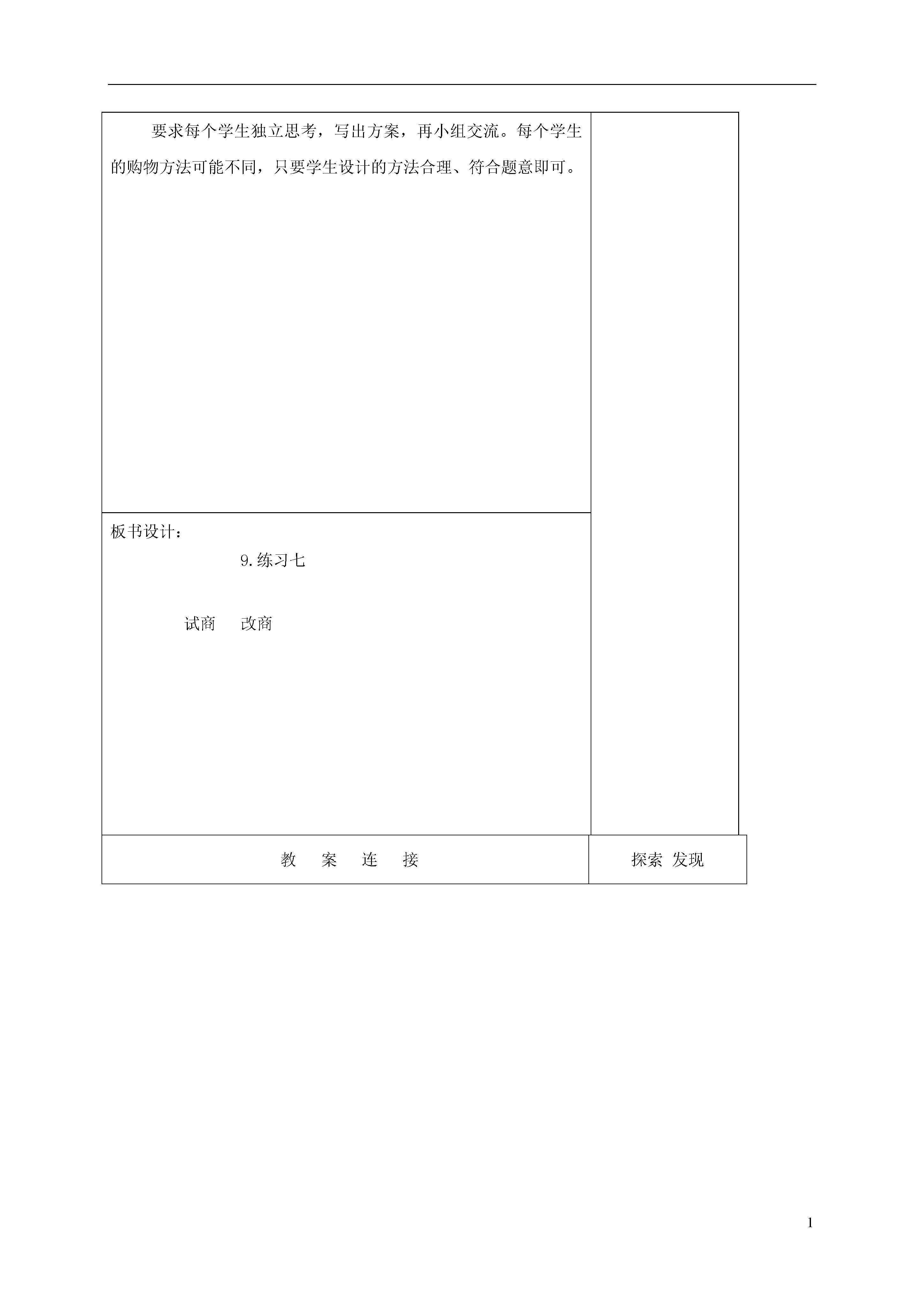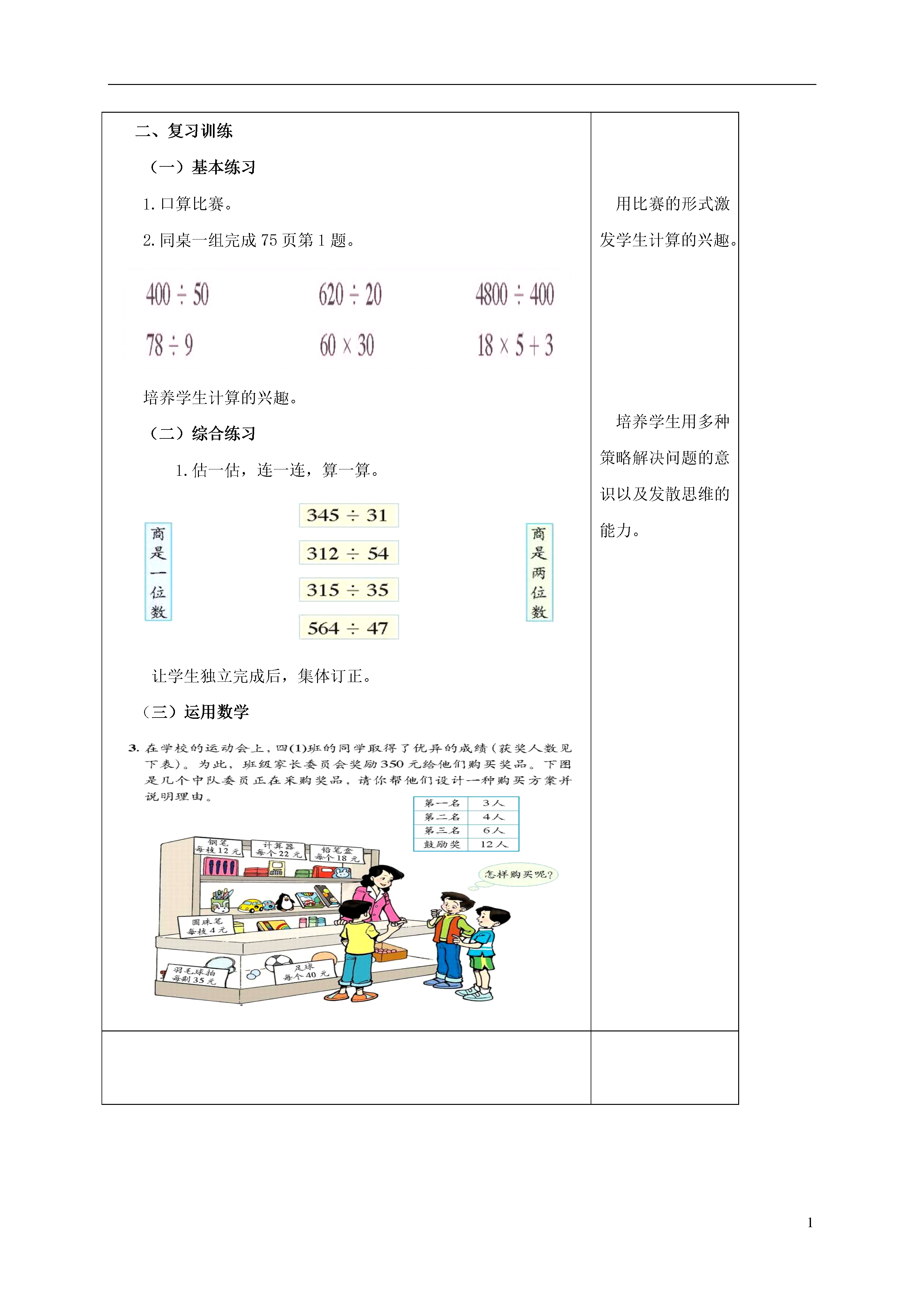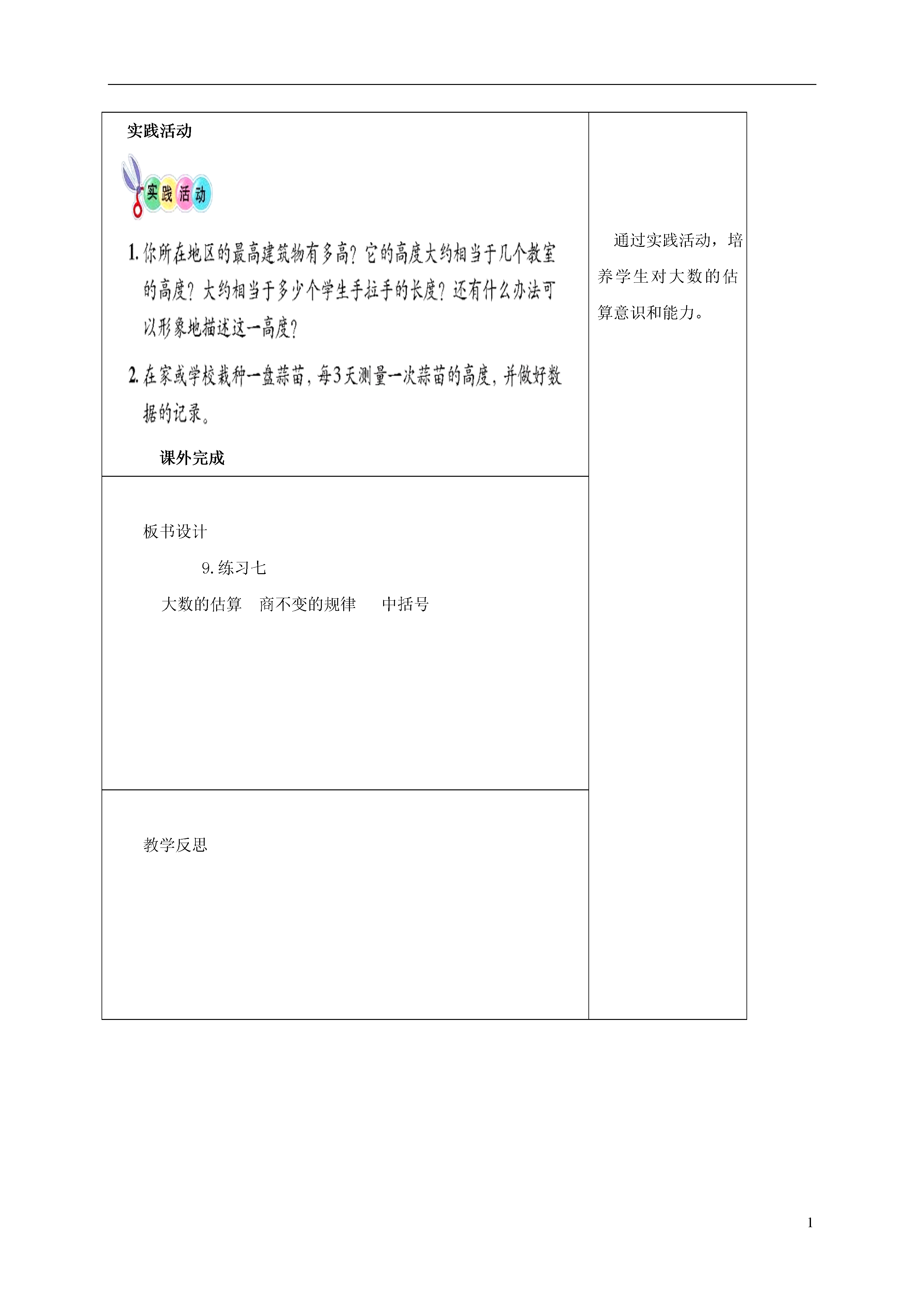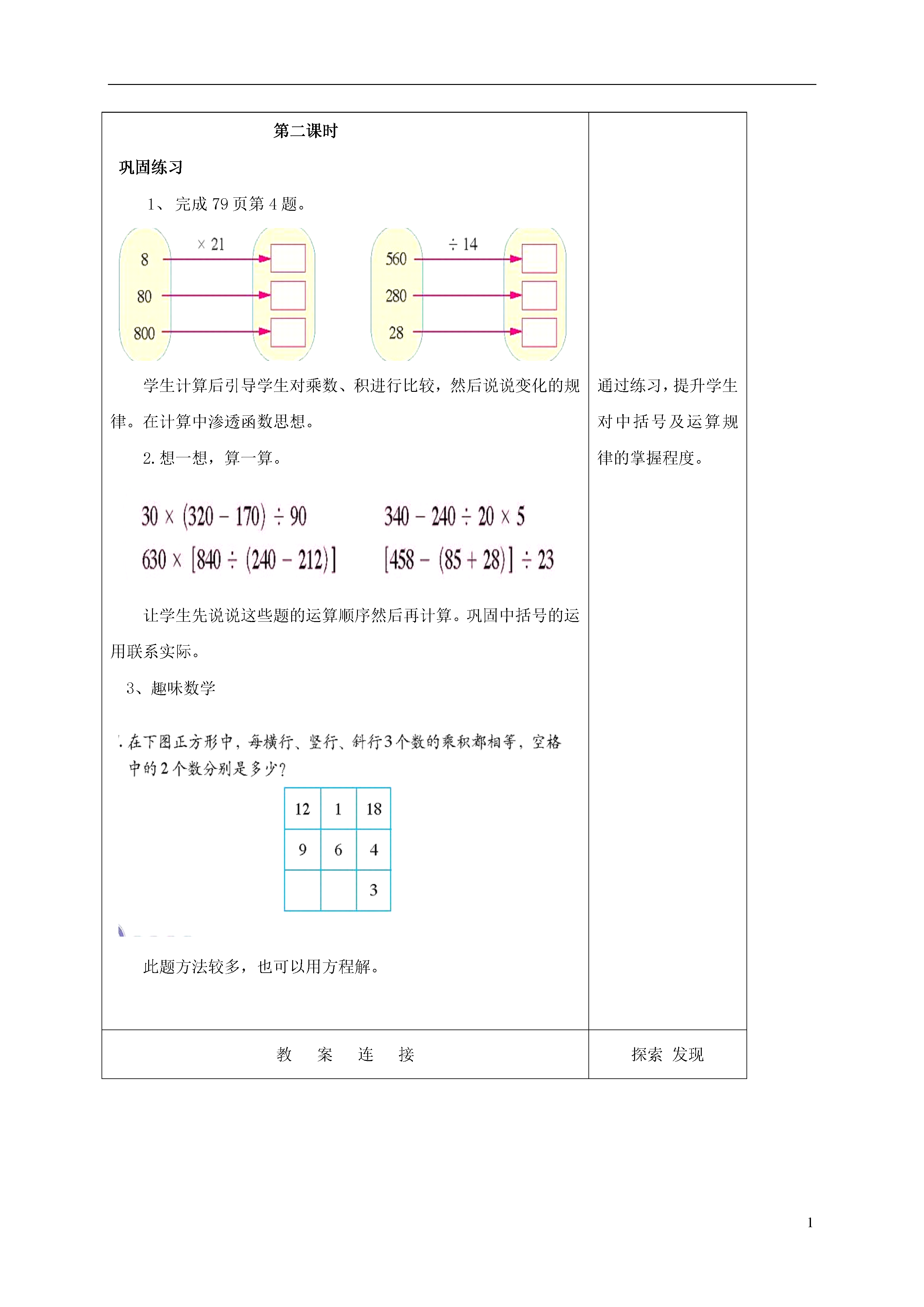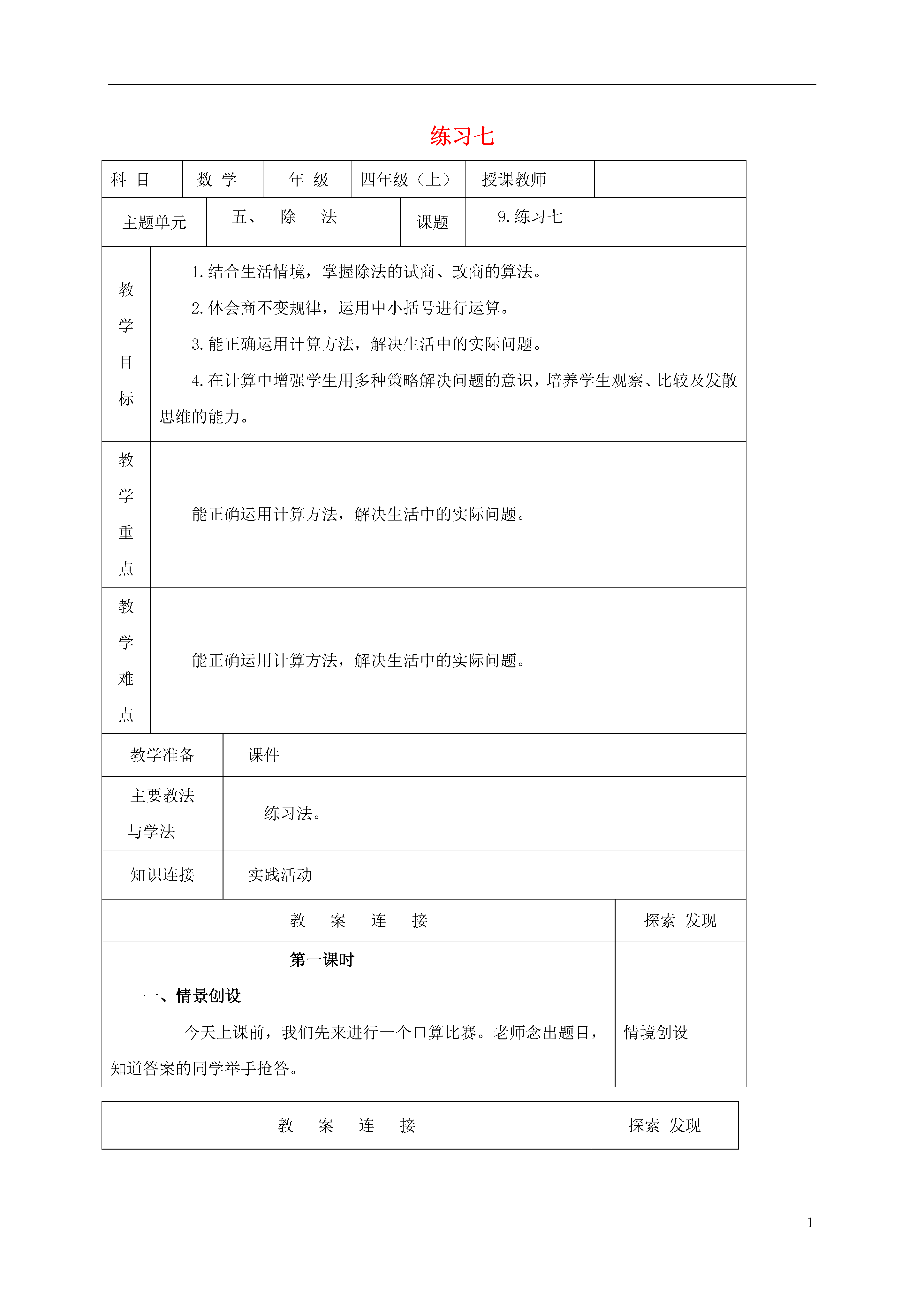 1练习七科目数学年级四年级(上)授课教师主题单元五、除法课题9.练习七教学目标1.结合生活情境,掌握除法的试商、改商的算法。2.体会商不变规律,运用中小括号进行运算。3.能正确运用计算方法,解决生活中的实际问题。4.在计算中增强学生用多种策略解决问题的意识,培养学生观察、比较及发散思维的能力。教学重点能正确运用计算方法,解决生活中的实际问题。教学难点能正确运用计算方法,解决生活中的实际问题。教学准备课件主要教法与学法练习法。知识连接实践活动教案连接探索发现第一课时一、情景创设今天上课前,我们先来进行一个口算比赛。老师念出题目,知道答案的同学举手抢答。情境创设教案连接探索发现二、复习训练(一)基本练习1.口算比赛。2.同桌一组完成75页第1题。培养学生计算的兴趣。(二)综合练习1.估一估,连一连,算一算。让学生独立完成后,集体订正。(三)运用数学用比赛的形式激发学生计算的兴趣。培养学生用多种策略解决问题的意识以及发散思维的能力。要求每个学生独立思考,写出方案,再小组交流。每个学生的购物方法可能不同,只要学生设计的方法合理、符合题意即可。板书设计:9.练习七试商改商教案连接探索发现第二课时巩固练习完成79页第4题。学生计算后引导学生对乘数、积进行比较,然后说说变化的规律。在计算中渗透函数思想。2.想一想,算一算。让学生先说说这些题的运算顺序然后再计算。巩固中括号的运用联系实际。3、趣味数学此题方法较多,也可以用方程解。通过练习,提升学生对中括号及运算规律的掌握程度。教案连接探索发现实践活动课外完成通过实践活动,培养学生对大数的估算意识和能力。板书设计9.练习七大数的估算商不变的规律中括号教学反思