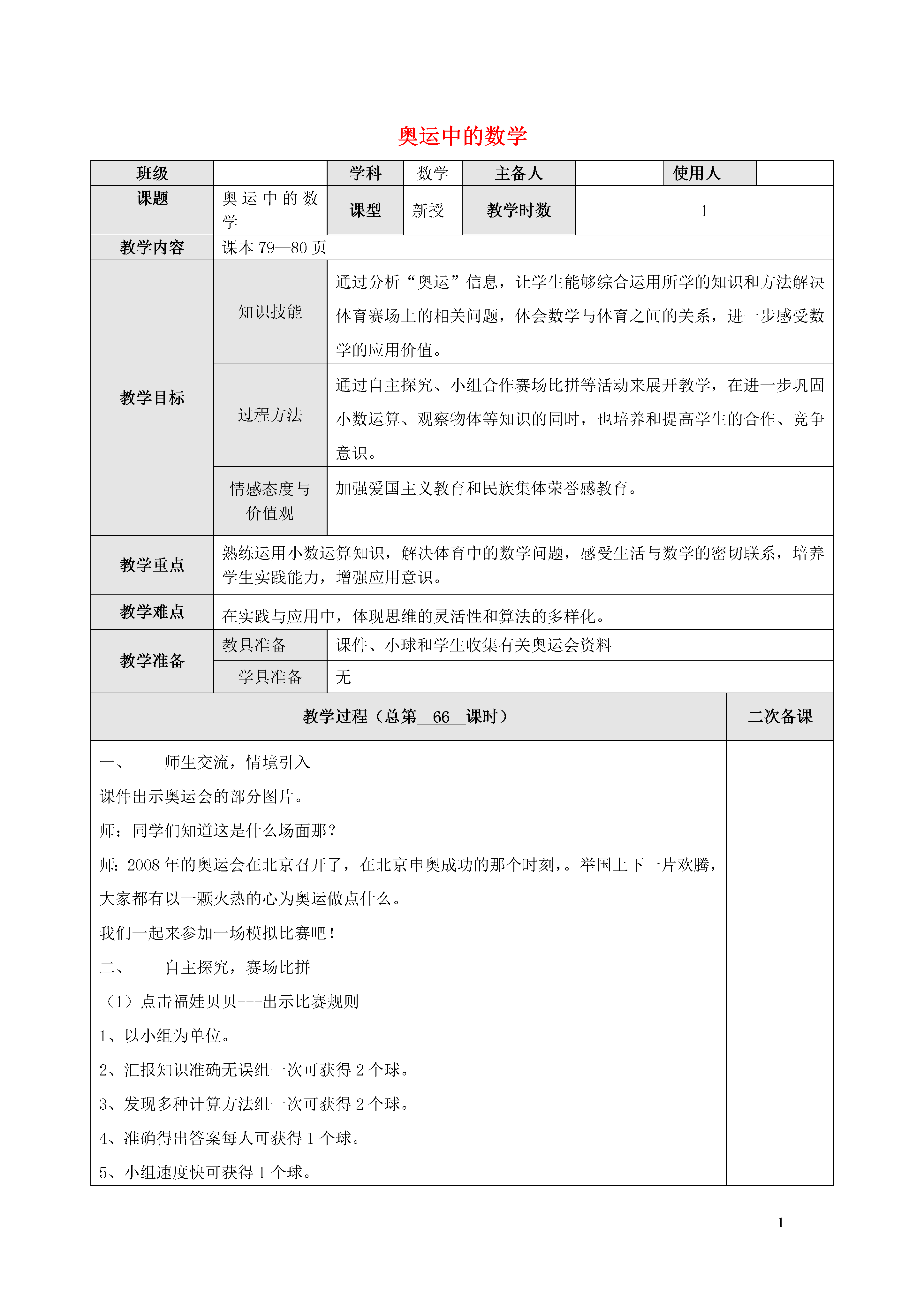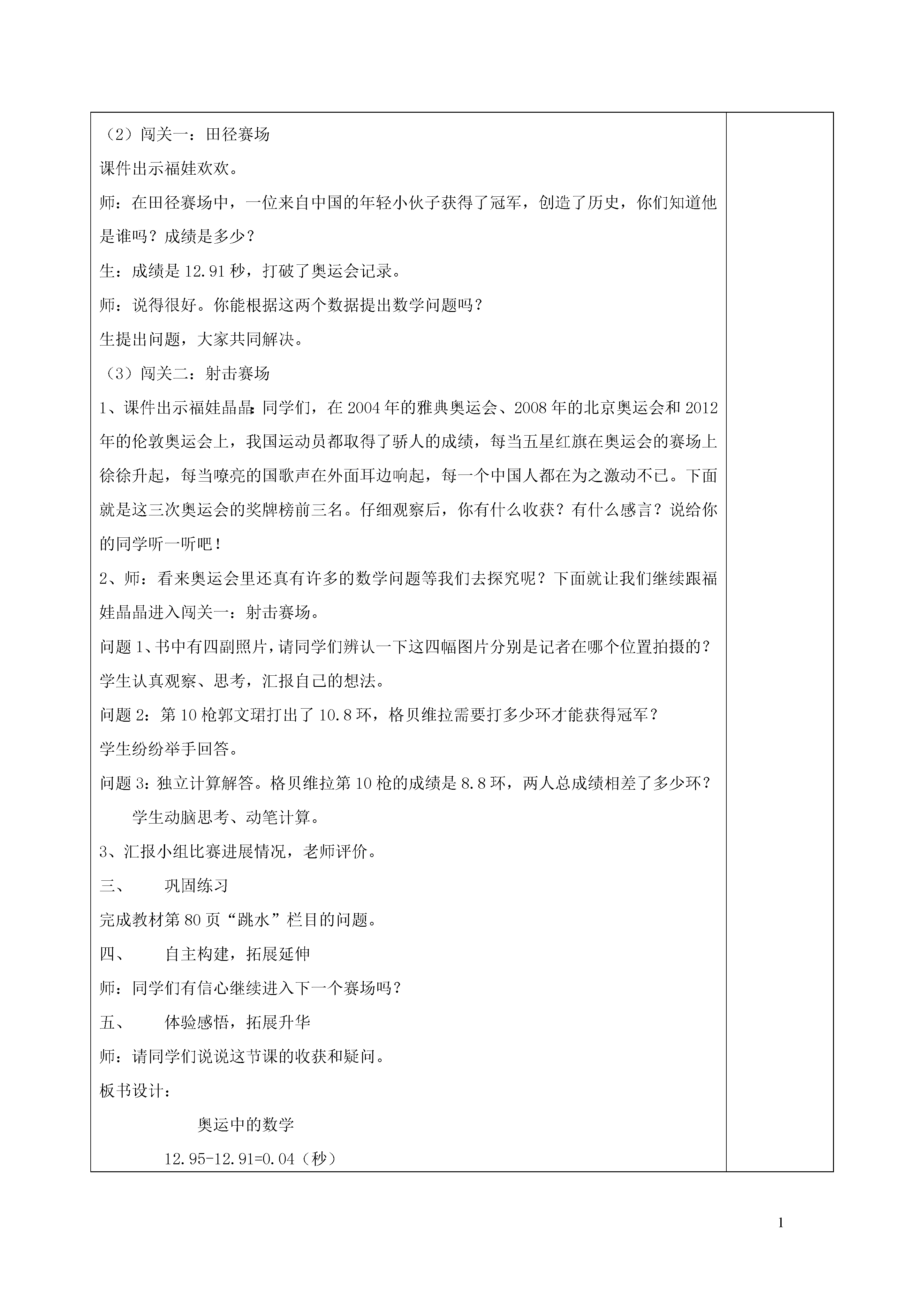 1奥运中的数学班级学科数学主备人使用人课题奥运中的数学课型新授教学时数1教学内容课本79—80页教学目标知识技能通过分析“奥运”信息,让学生能够综合运用所学的知识和方法解决体育赛场上的相关问题,体会数学与体育之间的关系,进一步感受数学的应用价值。过程方法通过自主探究、小组合作赛场比拼等活动来展开教学,在进一步巩固小数运算、观察物体等知识的同时,也培养和提高学生的合作、竞争意识。情感态度与价值观加强爱国主义教育和民族集体荣誉感教育。教学重点熟练运用小数运算知识,解决体育中的数学问题,感受生活与数学的密切联系,培养学生实践能力,增强应用意识。教学难点在实践与应用中,体现思维的灵活性和算法的多样化。教学准备教具准备课件、小球和学生收集有关奥运会资料学具准备无教学过程(总第66课时)二次备课师生交流,情境引入课件出示奥运会的部分图片。师:同学们知道这是什么场面那?师:2008年的奥运会在北京召开了,在北京申奥成功的那个时刻,。举国上下一片欢腾,大家都有以一颗火热的心为奥运做点什么。我们一起来参加一场模拟比赛吧!自主探究,赛场比拼(1)点击福娃贝贝---出示比赛规则1、以小组为单位。2、汇报知识准确无误组一次可获得2个球。3、发现多种计算方法组一次可获得2个球。4、准确得出答案每人可获得1个球。5、小组速度快可获得1个球。(2)闯关一:田径赛场课件出示福娃欢欢。师:在田径赛场中,一位来自中国的年轻小伙子获得了冠军,创造了历史,你们知道他是谁吗?成绩是多少?生:成绩是12.91秒,打破了奥运会记录。师:说得很好。你能根据这两个数据提出数学问题吗?生提出问题,大家共同解决。(3)闯关二:射击赛场1、课件出示福娃晶晶:同学们,在2004年的雅典奥运会、2008年的北京奥运会和2012年的伦敦奥运会上,我国运动员都取得了骄人的成绩,每当五星红旗在奥运会的赛场上徐徐升起,每当嘹亮的国歌声在外面耳边响起,每一个中国人都在为之激动不已。下面就是这三次奥运会的奖牌榜前三名。仔细观察后,你有什么收获?有什么感言?说给你的同学听一听吧!2、师:看来奥运会里还真有许多的数学问题等我们去探究呢?下面就让我们继续跟福娃晶晶进入闯关一:射击赛场。问题1、书中有四副照片,请同学们辨认一下这四幅图片分别是记者在哪个位置拍摄的?学生认真观察、思考,汇报自己的想法。问题2:第10枪郭文珺打出了10.8环,格贝维拉需要打多少环才能获得冠军?学生纷纷举手回答。问题3:独立计算解答。格贝维拉第10枪的成绩是8.8环,两人总成绩相差了多少环?学生动脑思考、动笔计算。3、汇报小组比赛进展情况,老师评价。巩固练习完成教材“跳水”栏目的问题。自主构建,拓展延伸师:同学们有信心继续进入下一个赛场吗?体验感悟,拓展升华师:请同学们说说这节课的收获和疑问。板书设计:奥运中的数学12.95-12.91=0.04(秒)教学反思: