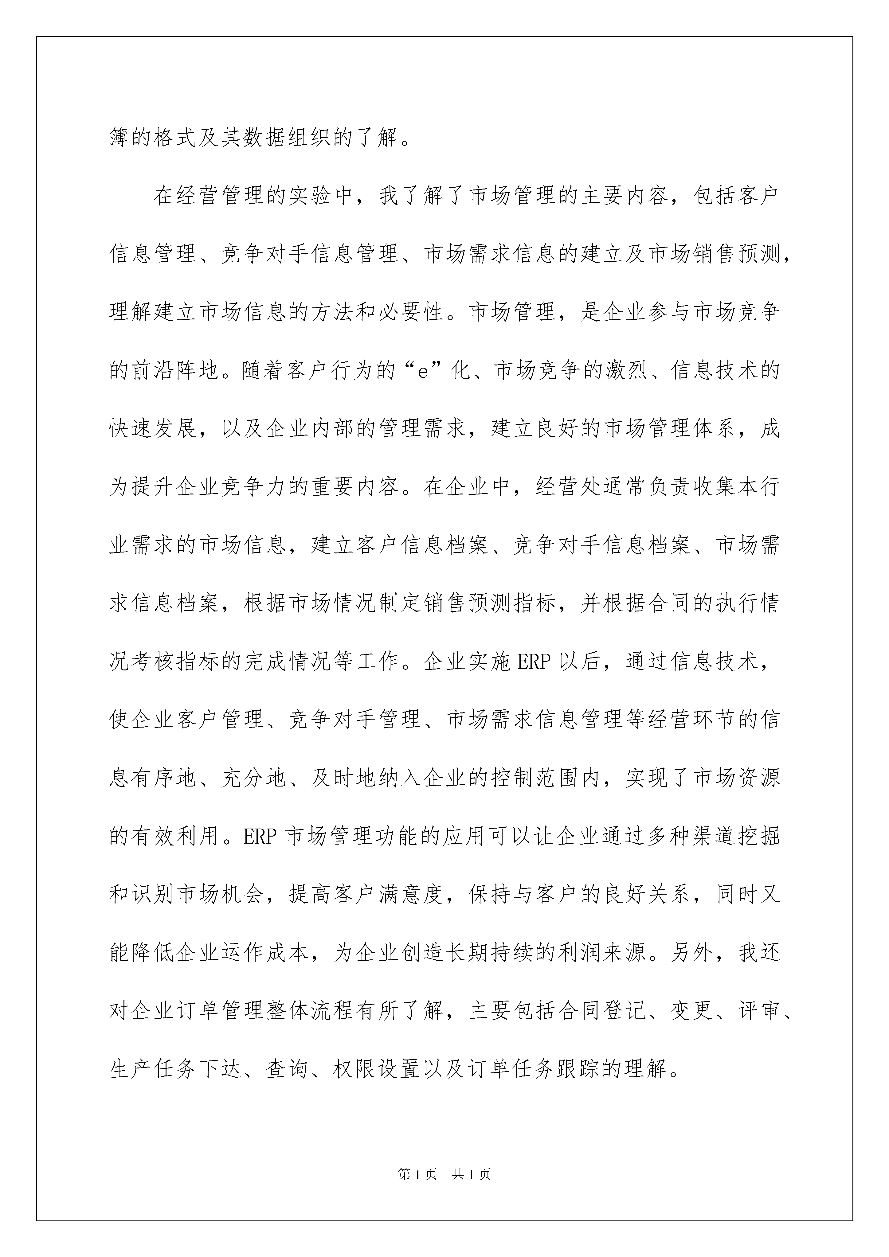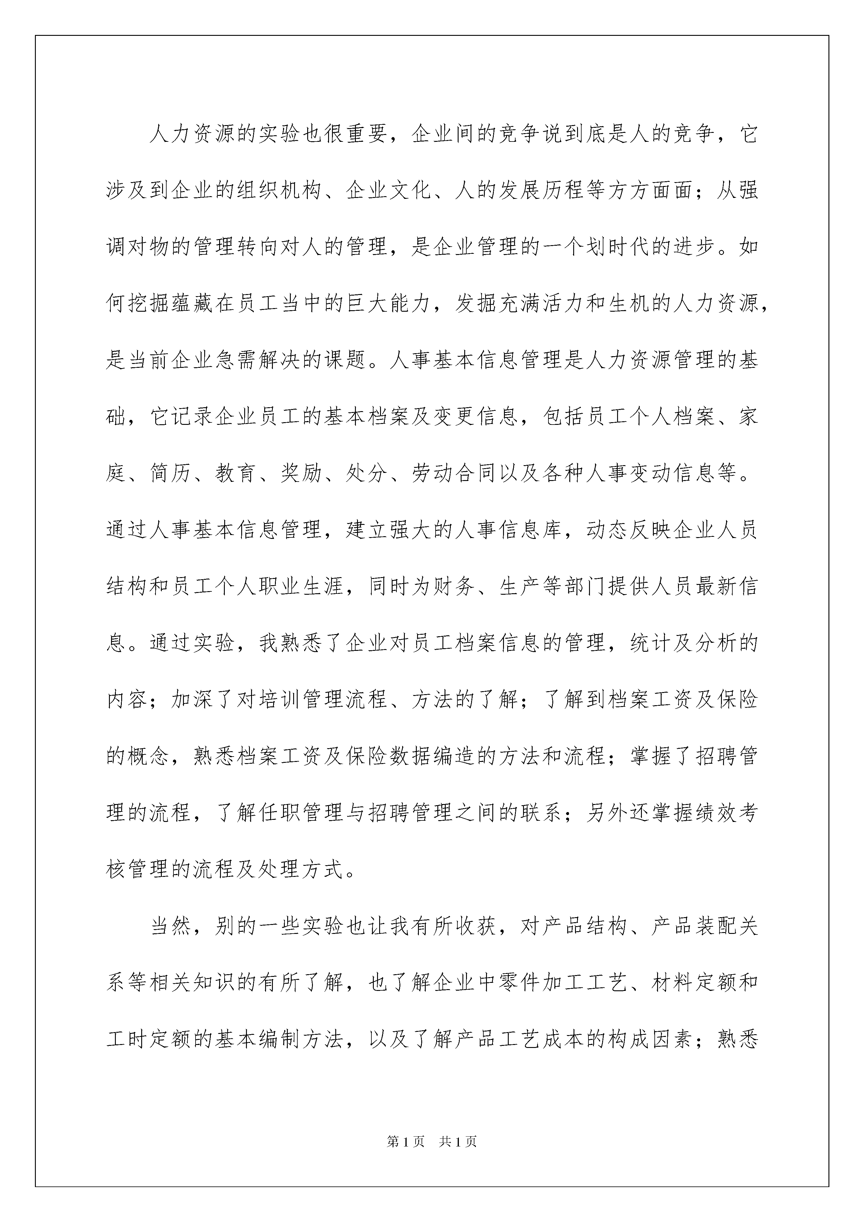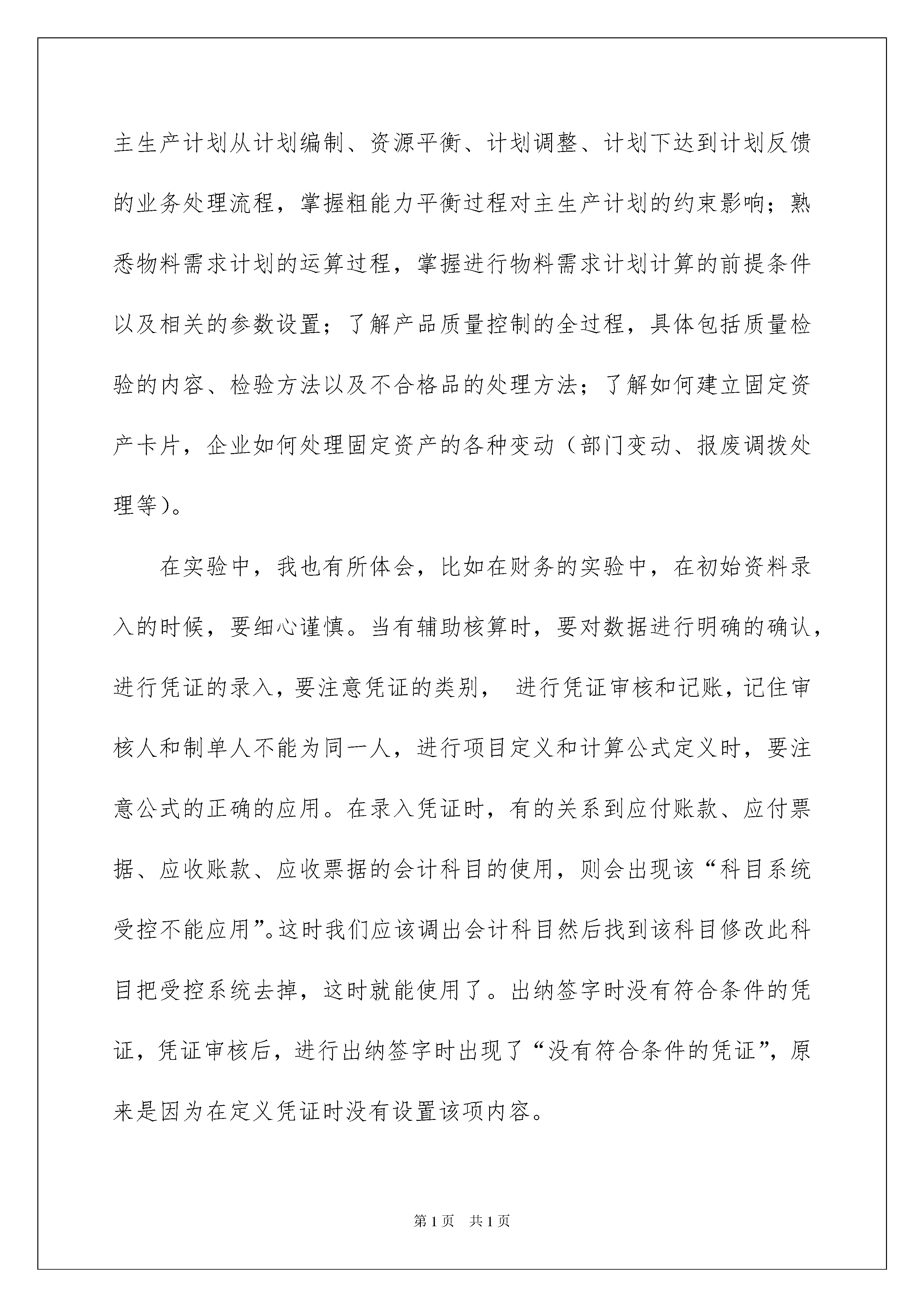 2022去工厂实习报告集锦6篇去工厂实习报告集锦6篇在不断进步的时代,报告十分的重要,我们在写报告的时候要注意逻辑的合理性。相信很多朋友都对写报告感到非常苦恼吧,以下是我为大家收集的去工厂实习报告6篇,仅供参考,大家一起来看看吧。去工厂实习报告篇1本次影子工厂的实习为期一周,我们做的实验包括财务、质量、经营管理、技术、人力资源、资产,其中财务、经营管理和人力资源是重要模块,实验主要着重于这三个模块,其他的模块大概做1、2个实验。经过本次影子工厂的实习,我对财务、经营管理、人力资源等学科有了进一步的认识。在会计电算化中,我们通常把设置账户、复式记账、编制和审核凭证、账簿登记等统称为总账管理。总账管理系统在完成日常账务初始化工作后,进行记账凭证录入,凭证经审核后自动生成总分类账、各类明细账、余额表、资产负债表等各类账表。通过本次实验加深我对记账凭证及记账相关知识、账簿查询的方法,账簿的格式及其数据组织的了解。在经营管理的实验中,我了解了市场管理的主要内容,包括客户信息管理、竞争对手信息管理、市场需求信息的建立及市场销售预测,理解建立市场信息的方法和必要性。市场管理,是企业参与市场竞争的前沿阵地。随着客户行为的“e”化、市场竞争的激烈、信息技术的快速发展,以及企业内部的管理需求,建立良好的市场管理体系,成为提升企业竞争力的重要内容。在企业中,经营处通常负责收集本行业需求的市场信息,建立客户信息档案、竞争对手信息档案、市场需求信息档案,根据市场情况制定销售预测指标,并根据合同的执行情况考核指标的完成情况等工作。企业实施ERP以后,通过信息技术,使企业客户管理、竞争对手管理、市场需求信息管理等经营环节的信息有序地、充分地、及时地纳入企业的控制范围内,实现了市场资源的有效利用。ERP市场管理功能的应用可以让企业通过多种渠道挖掘和识别市场机会,提高客户满意度,保持与客户的良好关系,同时又能降低企业运作成本,为企业创造长期持续的利润来源。另外,我还对企业订单管理整体流程有所了解,主要包括合同登记、变更、评审、生产任务下达、查询、权限设置以及订单任务跟踪的理解。人力资源的实验也很重要,企业间的竞争说到底是人的竞争,它涉及到企业的组织机构、企业文化、人的发展历程等方方面面;从强调对物的管理转向对人的管理,是企业管理的一个划时代的进步。如何挖掘蕴藏在员工当中的巨大能力,发掘充满活力和生机的人力资源,是当前企业急需解决的课题。人事基本信息管理是人力资源管理的基础,它记录企业员工的基本档案及变更信息,包括员工个人档案、家庭、简历、教育、奖励、处分、劳动合同以及各种人事变动信息等。通过人事基本信息管理,建立强大的人事信息库,动态反映企业人员结构和员工个人职业生涯,同时为财务、生产等部门提供人员最新信息。通过实验,我熟悉了企业对员工档案信息的管理,统计及分析的内容;加深了对培训管理流程、方法的了解;了解到档案工资及保险的概念,熟悉档案工资及保险数据编造的方法和流程;掌握了招聘管理的流程,了解任职管理与招聘管理之间的联系;另外还掌握绩效考核管理的流程及处理方式。当然,别的一些实验也让我有所收获,对产品结构、产品装配关系等相关知识的有所了解,也了解企业中零件加工工艺、材料定额和工时定额的基本编制方法,以及了解产品工艺成本的构成因素;熟悉主生产计划从计划编制、资源平衡、计划调整、计划下达到计划反馈的业务处理流程,掌握粗能力平衡过程对主生产计划的约束影响;熟悉物料需求计划的运算过程,掌握进行物料需求计划计算的前提条件以及相关的参数设置;了解产品质量控制的全过程,具体包括质量检验的内容、检验方法以及不合格品的处理方法;了解如何建立固定资产卡片,企业如何处理固定资产的各种变动(部门变动、报废调拨处理等)。在实验中,我也有所体会,比如在财务的实验中,在初始资料录入的时候,要细心谨慎。当有辅助核算时,要对数据进行明确的确认,进行凭证的录入,要注意凭证的类别,进行凭证审核和记账,记住审核人和制单人不能为同一人,进行项目定义和计算公式定义时,要注意公式的正确的应用。在录入凭证时,有的关系到应付账款、应付票据、应收账款、应收票据的会计科目的使用,则会出现该“科目系统受控不能应用”。这时我们应该调出会计科目然后找到该科目修改此科目把受控系统去掉,这时就能使用了。出纳签字时没有符合条件的凭证,凭证审核后,进行出纳签字时出现了“没有符合条件的凭证”,原来是因为在定义凭证时没有设置该项内容。即将毕业的我们,再经历这次实习后,对以后实际工作又有了新的认识。实习主要通过计算机录入来进行处理,提高学生的动手能力,把软件的理论知识和实际操
