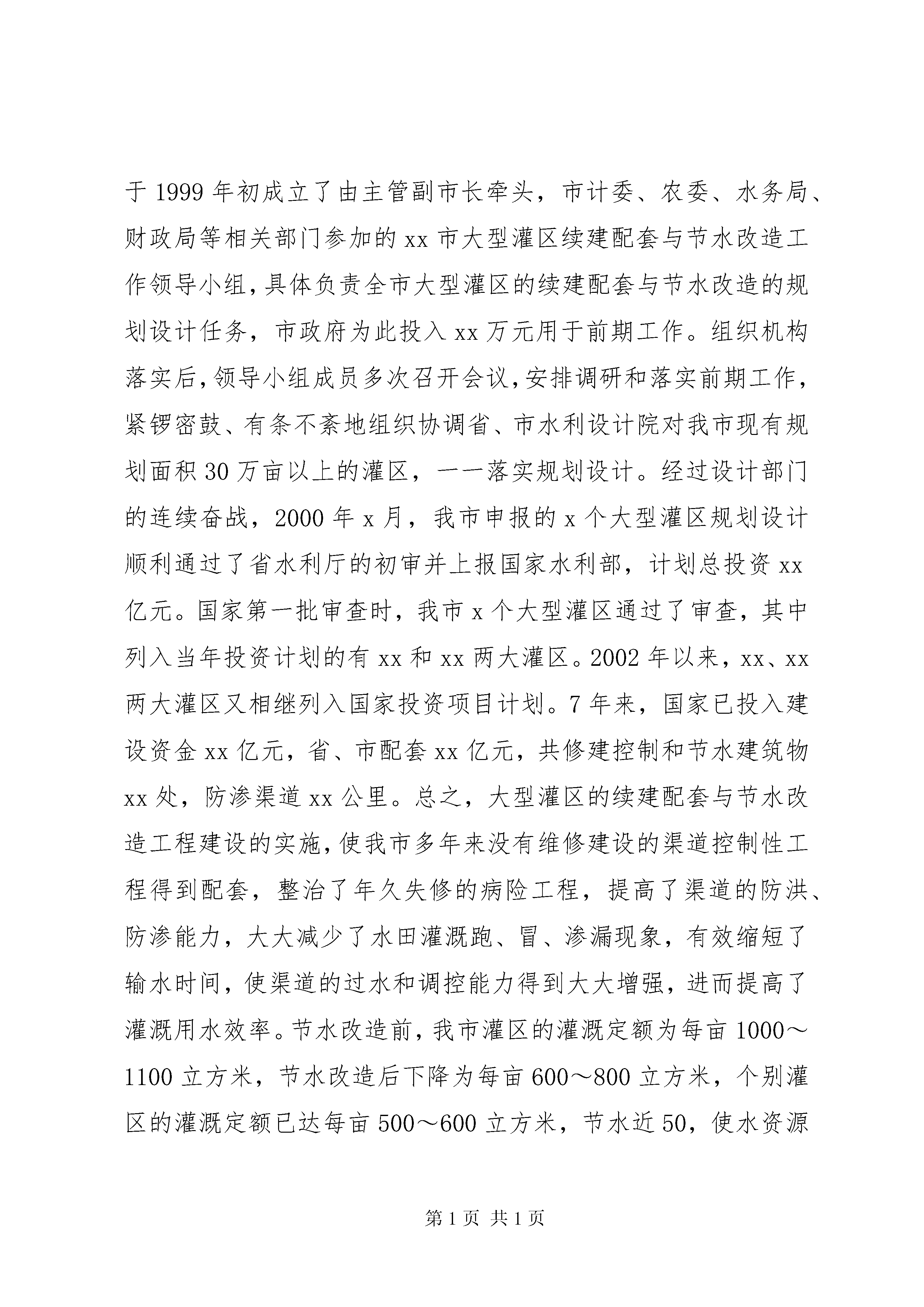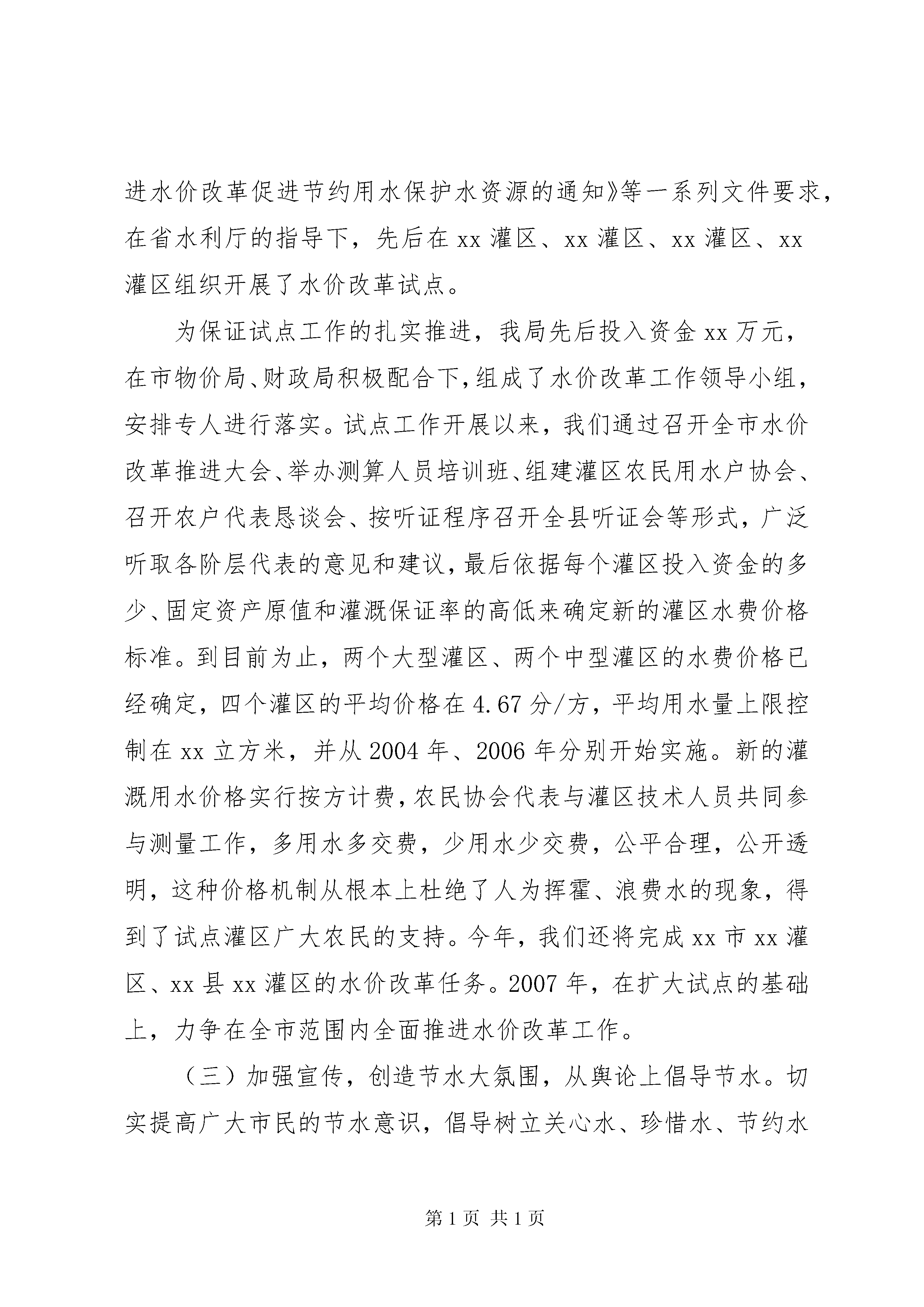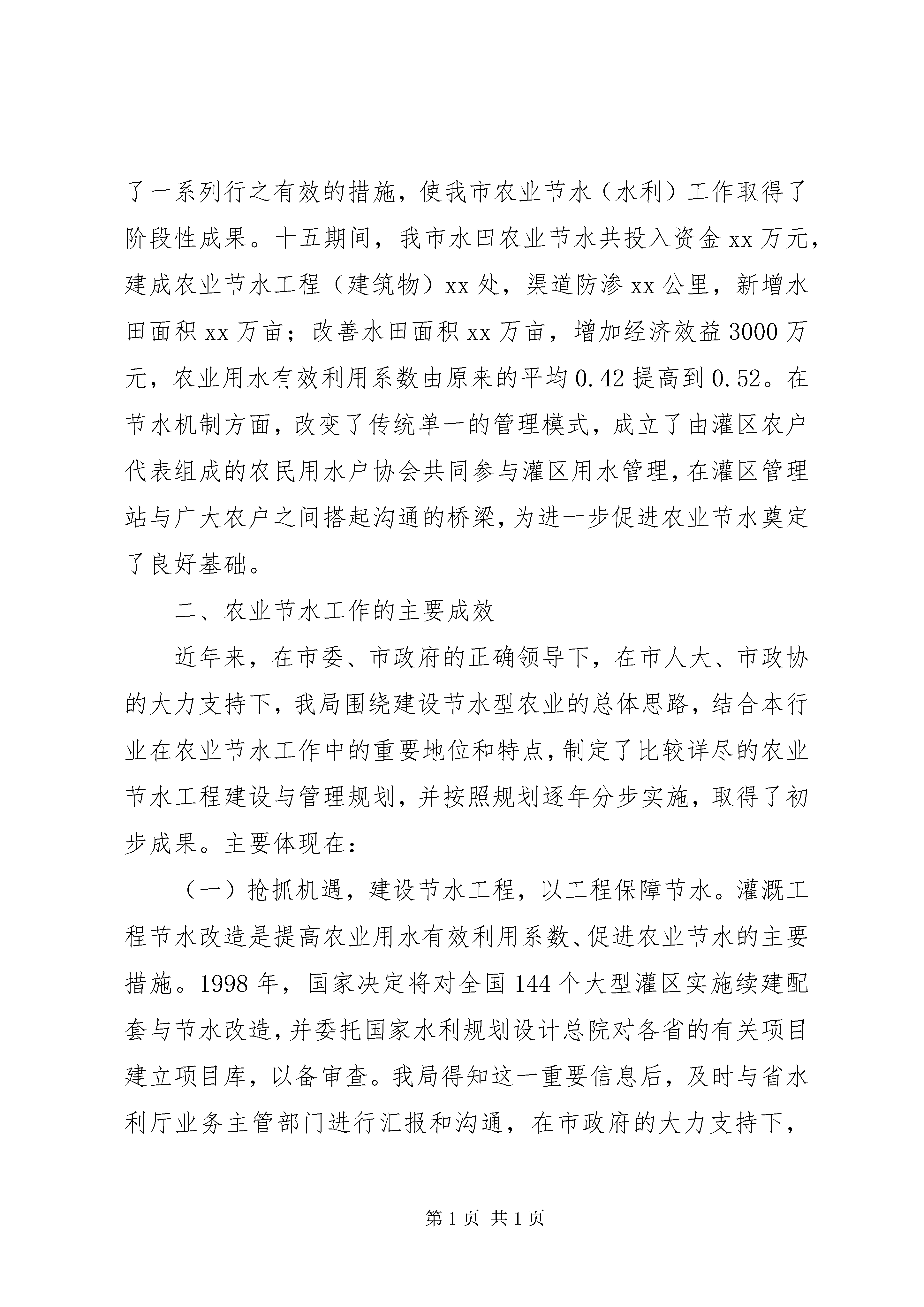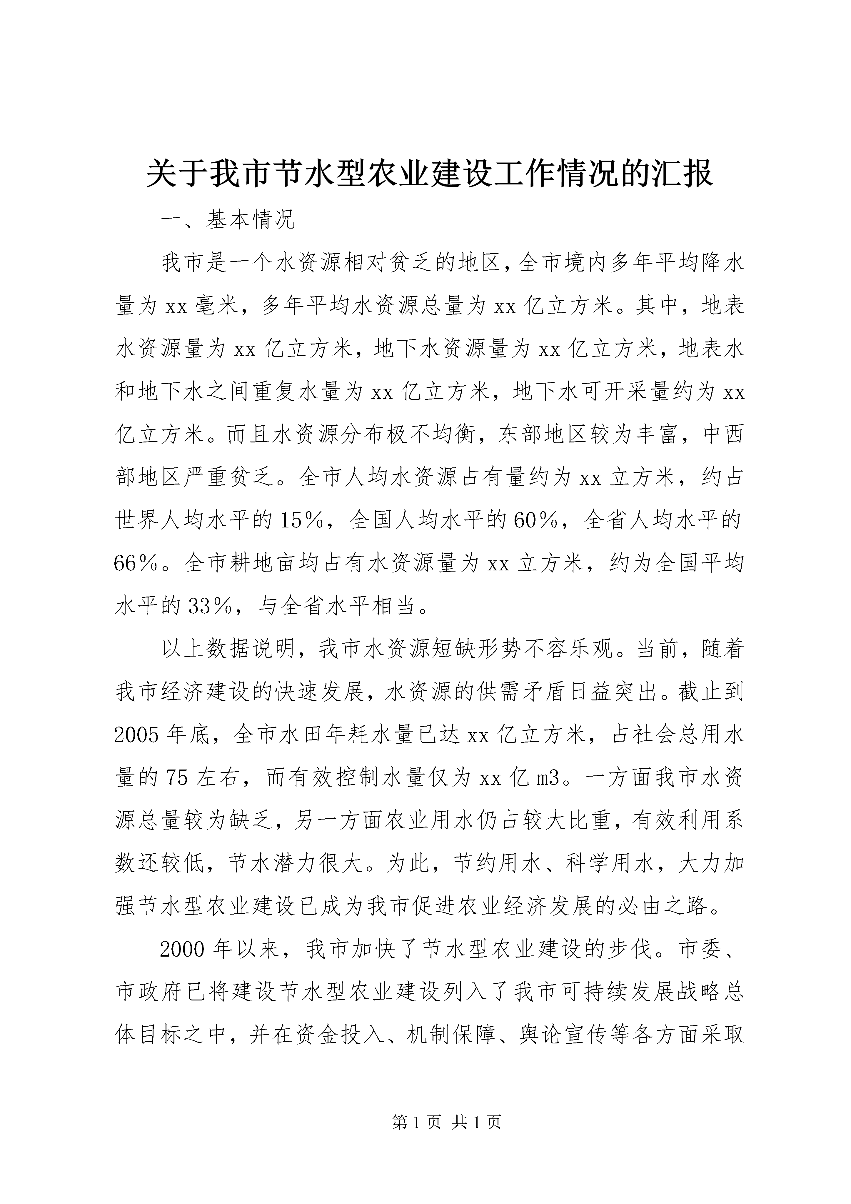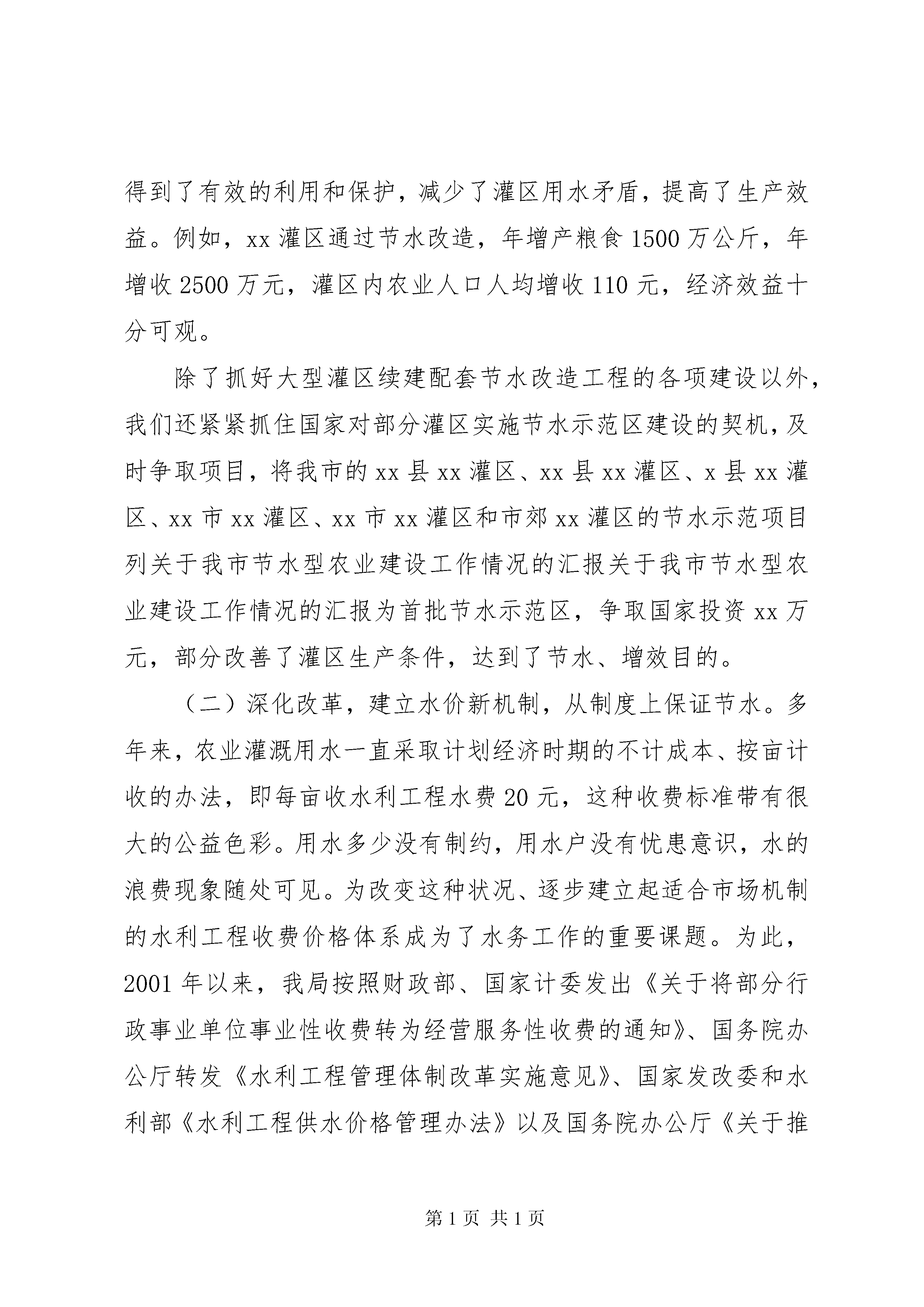 关于我市节水型农业建设工作情况的汇报一、基本情况我市是一个水资源相对贫乏的地区,全市境内多年平均降水量为xx毫米,多年平均水资源总量为xx亿立方米。其中,地表水资源量为xx亿立方米,地下水资源量为xx亿立方米,地表水和地下水之间重复水量为xx亿立方米,地下水可开采量约为xx亿立方米。而且水资源分布极不均衡,东部地区较为丰富,中西部地区严重贫乏。全市人均水资源占有量约为xx立方米,约占世界人均水平的15%,全国人均水平的60%,全省人均水平的66%。全市耕地亩均占有水资源量为xx立方米,约为全国平均水平的33%,与全省水平相当。以上数据说明,我市水资源短缺形势不容乐观。当前,随着我市经济建设的快速发展,水资源的供需矛盾日益突出。截止到2005年底,全市水田年耗水量已达xx亿立方米,占社会总用水量的75左右,而有效控制水量仅为xx亿m3。一方面我市水资源总量较为缺乏,另一方面农业用水仍占较大比重,有效利用系数还较低,节水潜力很大。为此,节约用水、科学用水,大力加强节水型农业建设已成为我市促进农业经济发展的必由之路。2000年以来,我市加快了节水型农业建设的步伐。市委、市政府已将建设节水型农业建设列入了我市可持续发展战略总体目标之中,并在资金投入、机制保障、舆论宣传等各方面采取了一系列行之有效的措施,使我市农业节水(水利)工作取得了阶段性成果。十五期间,我市水田农业节水共投入资金xx万元,建成农业节水工程(建筑物)xx处,渠道防渗xx公里,新增水田面积xx万亩;改善水田面积xx万亩,增加经济效益3000万元,农业用水有效利用系数由原来的平均0.42提高到0.52。在节水机制方面,改变了传统单一的管理模式,成立了由灌区农户代表组成的农民用水户协会共同参与灌区用水管理,在灌区管理站与广大农户之间搭起沟通的桥梁,为进一步促进农业节水奠定了良好基础。二、农业节水工作的主要成效近年来,在市委、市政府的正确领导下,在市人大、市政协的大力支持下,我局围绕建设节水型农业的总体思路,结合本行业在农业节水工作中的重要地位和特点,制定了比较详尽的农业节水工程建设与管理规划,并按照规划逐年分步实施,取得了初步成果。主要体现在:(一)抢抓机遇,建设节水工程,以工程保障节水。灌溉工程节水改造是提高农业用水有效利用系数、促进农业节水的主要措施。1998年,国家决定将对全国144个大型灌区实施续建配套与节水改造,并委托国家水利规划设计总院对各省的有关项目建立项目库,以备审查。我局得知这一重要信息后,及时与省水利厅业务主管部门进行汇报和沟通,在市政府的大力支持下,于1999年初成立了由主管副市长牵头,市计委、农委、水务局、财政局等相关部门参加的xx市大型灌区续建配套与节水改造工作领导小组,具体负责全市大型灌区的续建配套与节水改造的规划设计任务,市政府为此投入xx万元用于前期工作。组织机构落实后,领导小组成员多次召开会议,安排调研和落实前期工作,紧锣密鼓、有条不紊地组织协调省、市水利设计院对我市现有规划面积30万亩以上的灌区,一一落实规划设计。经过设计部门的连续奋战,2000年x月,我市申报的x个大型灌区规划设计顺利通过了省水利厅的初审并上报国家水利部,计划总投资xx亿元。国家第一批审查时,我市x个大型灌区通过了审查,其中列入当年投资计划的有xx和xx两大灌区。2002年以来,xx、xx两大灌区又相继列入国家投资项目计划。7年来,国家已投入建设资金xx亿元,省、市配套xx亿元,共修建控制和节水建筑物xx处,防渗渠道xx公里。总之,大型灌区的续建配套与节水改造工程建设的实施,使我市多年来没有维修建设的渠道控制性工程得到配套,整治了年久失修的病险工程,提高了渠道的防洪、防渗能力,大大减少了水田灌溉跑、冒、渗漏现象,有效缩短了输水时间,使渠道的过水和调控能力得到大大增强,进而提高了灌溉用水效率。节水改造前,我市灌区的灌溉定额为每亩1000~1100立方米,节水改造后下降为每亩600~800立方米,个别灌区的灌溉定额已达每亩500~600立方米,节水近50,使水资源得到了有效的利用和保护,减少了灌区用水矛盾,提高了生产效益。例如,xx灌区通过节水改造,年增产粮食1500万公斤,年增收2500万元,灌区内农业人口人均增收110元,经济效益十分可观。除了抓好大型灌区续建配套节水改造工程的各项建设以外,我们还紧紧抓住国家对部分灌区实施节水示范区建设的契机,及时争取项目,将我市的xx县xx灌区、xx县xx灌区、x县xx灌区、xx市xx灌区、xx市xx灌区和市郊xx灌区的节水示范项目列关于我市节水型农业建设工作情况的汇报关于我市节水型农业建设工作情况的汇报为首批节水示范区,争取国家投资xx万元,部分改善了灌区生产条件,达到了节水、增效目的。(二)深化改革,建立