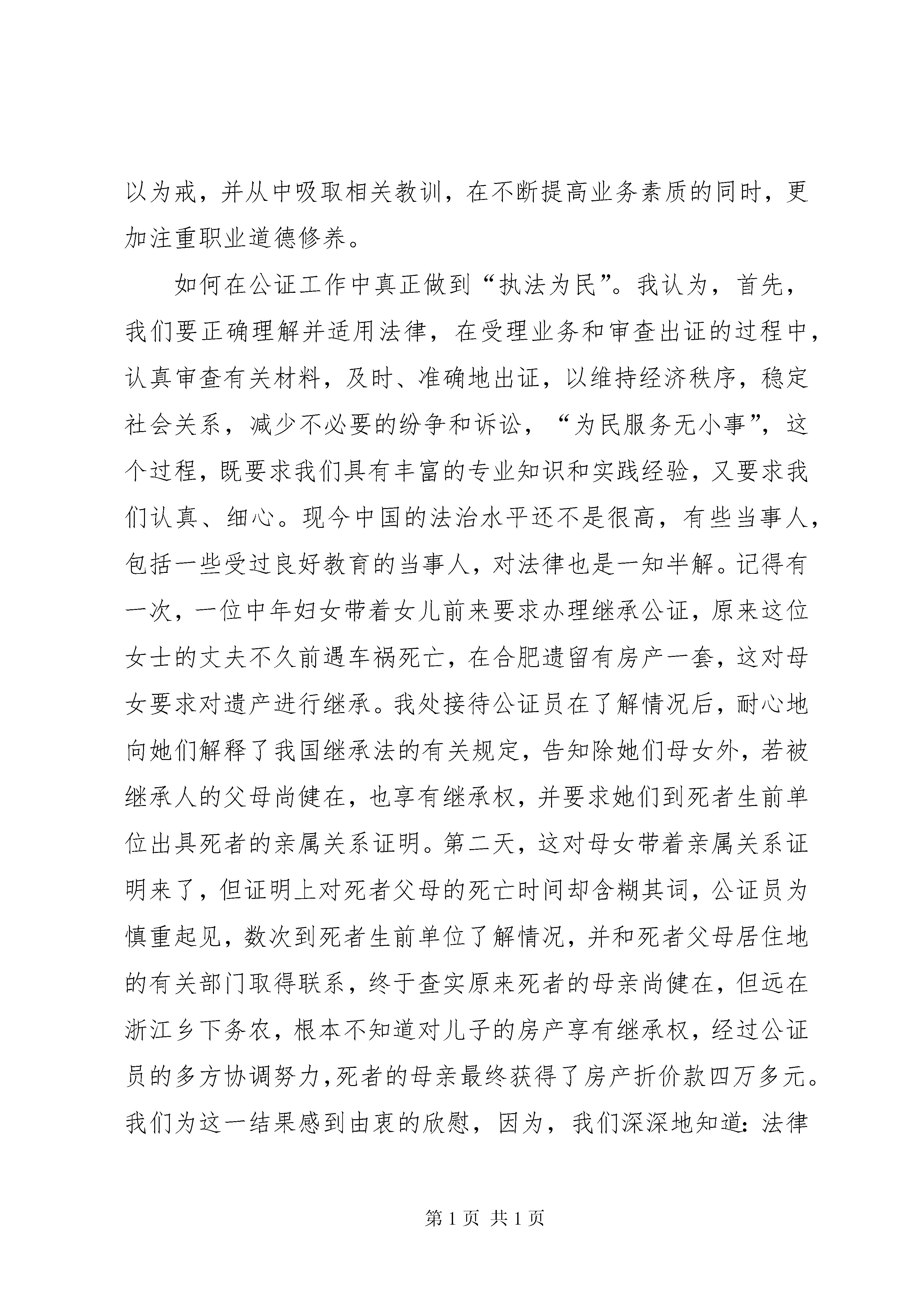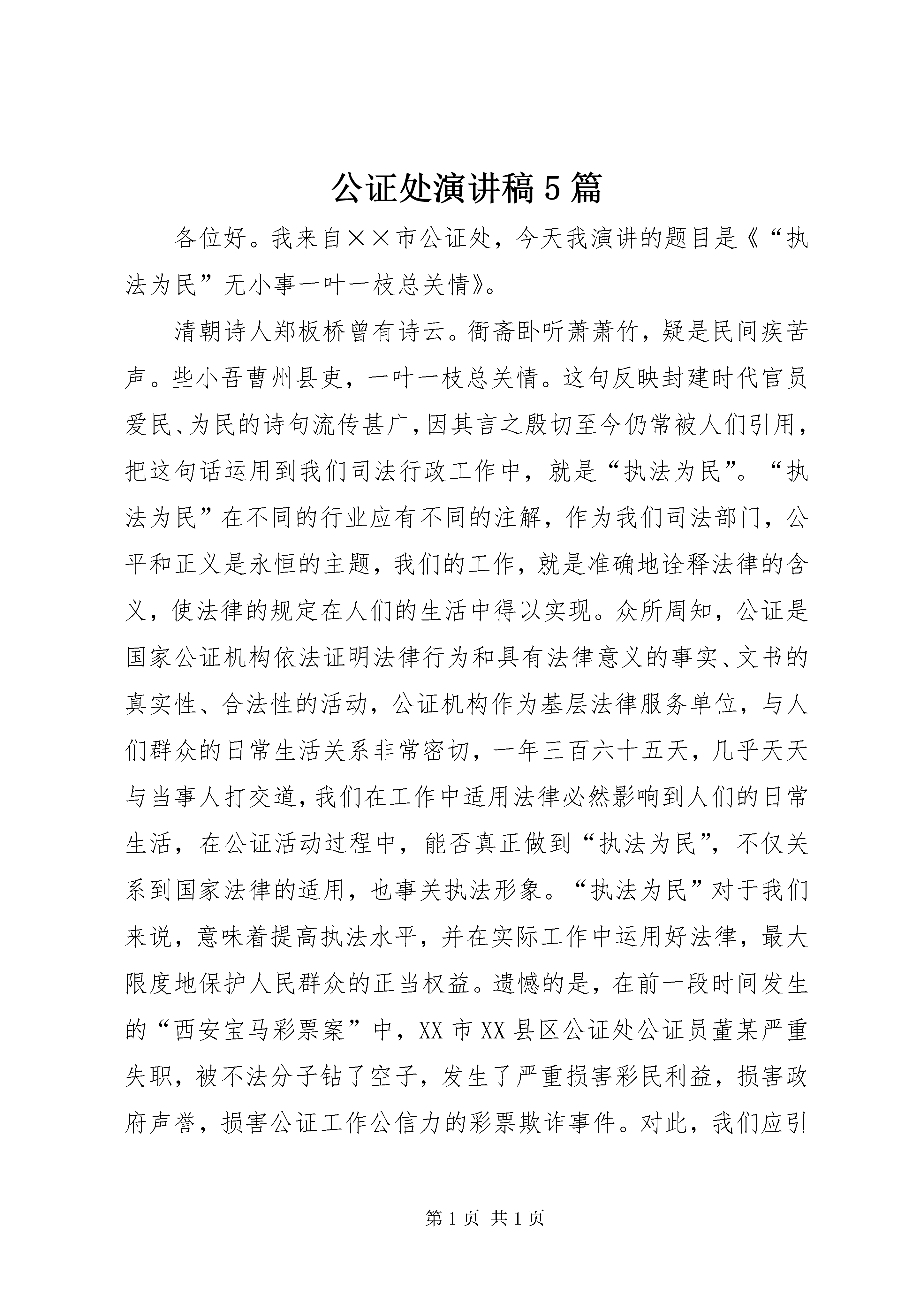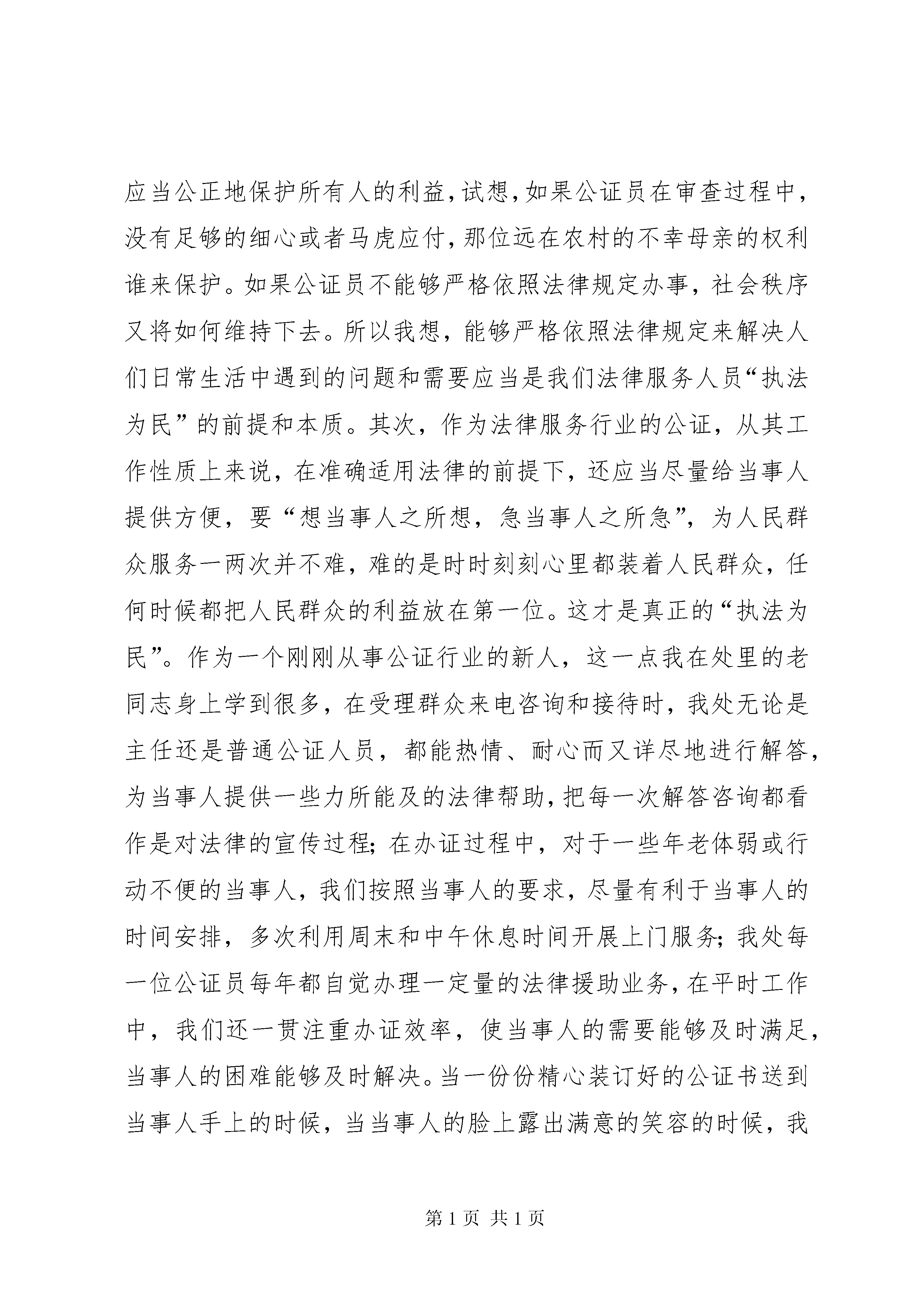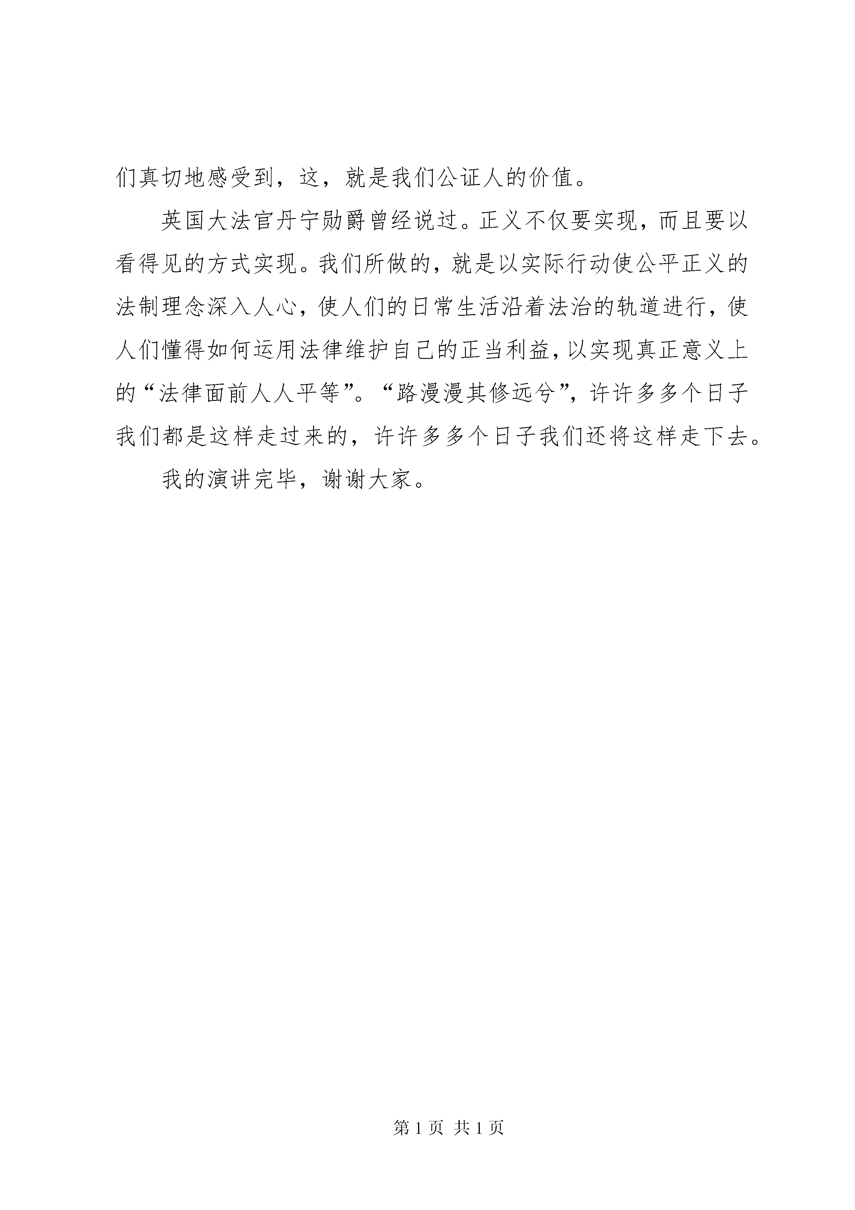 公证处演讲稿5篇各位好。我来自××市公证处,今天我演讲的题目是《“执法为民”无小事一叶一枝总关情》。清朝诗人郑板桥曾有诗云。衙斋卧听萧萧竹,疑是民间疾苦声。些小吾曹州县吏,一叶一枝总关情。这句反映封建时代官员爱民、为民的诗句流传甚广,因其言之殷切至今仍常被人们引用,把这句话运用到我们司法行政工作中,就是“执法为民”。“执法为民”在不同的行业应有不同的注解,作为我们司法部门,公平和正义是永恒的主题,我们的工作,就是准确地诠释法律的含义,使法律的规定在人们的生活中得以实现。众所周知,公证是国家公证机构依法证明法律行为和具有法律意义的事实、文书的真实性、合法性的活动,公证机构作为基层法律服务单位,与人们群众的日常生活关系非常密切,一年三百六十五天,几乎天天与当事人打交道,我们在工作中适用法律必然影响到人们的日常生活,在公证活动过程中,能否真正做到“执法为民”,不仅关系到国家法律的适用,也事关执法形象。“执法为民”对于我们来说,意味着提高执法水平,并在实际工作中运用好法律,最大限度地保护人民群众的正当权益。遗憾的是,在前一段时间发生的“西安宝马彩票案”中,XX市XX县区公证处公证员董某严重失职,被不法分子钻了空子,发生了严重损害彩民利益,损害政府声誉,损害公证工作公信力的彩票欺诈事件。对此,我们应引以为戒,并从中吸取相关教训,在不断提高业务素质的同时,更加注重职业道德修养。如何在公证工作中真正做到“执法为民”。我认为,首先,我们要正确理解并适用法律,在受理业务和审查出证的过程中,认真审查有关材料,及时、准确地出证,以维持经济秩序,稳定社会关系,减少不必要的纷争和诉讼,“为民服务无小事”,这个过程,既要求我们具有丰富的专业知识和实践经验,又要求我们认真、细心。现今中国的法治水平还不是很高,有些当事人,包括一些受过良好教育的当事人,对法律也是一知半解。记得有一次,一位中年妇女带着女儿前来要求办理继承公证,原来这位女士的丈夫不久前遇车祸死亡,在合肥遗留有房产一套,这对母女要求对遗产进行继承。我处接待公证员在了解情况后,耐心地向她们解释了我国继承法的有关规定,告知除她们母女外,若被继承人的父母尚健在,也享有继承权,并要求她们到死者生前单位出具死者的亲属关系证明。第二天,这对母女带着亲属关系证明来了,但证明上对死者父母的死亡时间却含糊其词,公证员为慎重起见,数次到死者生前单位了解情况,并和死者父母居住地的有关部门取得联系,终于查实原来死者的母亲尚健在,但远在浙江乡下务农,根本不知道对儿子的房产享有继承权,经过公证员的多方协调努力,死者的母亲最终获得了房产折价款四万多元。我们为这一结果感到由衷的欣慰,因为,我们深深地知道:法律应当公正地保护所有人的利益,试想,如果公证员在审查过程中,没有足够的细心或者马虎应付,那位远在农村的不幸母亲的权利谁来保护。如果公证员不能够严格依照法律规定办事,社会秩序又将如何维持下去。所以我想,能够严格依照法律规定来解决人们日常生活中遇到的问题和需要应当是我们法律服务人员“执法为民”的前提和本质。其次,作为法律服务行业的公证,从其工作性质上来说,在准确适用法律的前提下,还应当尽量给当事人提供方便,要“想当事人之所想,急当事人之所急”,为人民群众服务一两次并不难,难的是时时刻刻心里都装着人民群众,任何时候都把人民群众的利益放在第一位。这才是真正的“执法为民”。作为一个刚刚从事公证行业的新人,这一点我在处里的老同志身上学到很多,在受理群众来电咨询和接待时,我处无论是主任还是普通公证人员,都能热情、耐心而又详尽地进行解答,为当事人提供一些力所能及的法律帮助,把每一次解答咨询都看作是对法律的宣传过程;在办证过程中,对于一些年老体弱或行动不便的当事人,我们按照当事人的要求,尽量有利于当事人的时间安排,多次利用周末和中午休息时间开展上门服务;我处每一位公证员每年都自觉办理一定量的法律援助业务,在平时工作中,我们还一贯注重办证效率,使当事人的需要能够及时满足,当事人的困难能够及时解决。当一份份精心装订好的公证书送到当事人手上的时候,当当事人的脸上露出满意的笑容的时候,我们真切地感受到,这,就是我们公证人的价值。英国大法官丹宁勋爵曾经说过。正义不仅要实现,而且要以看得见的方式实现。我们所做的,就是以实际行动使公平正义的法制理念深入人心,使人们的日常生活沿着法治的轨道进行,使人们懂得如何运用法律维护自己的正当利益,以实现真正意义上的“法律面前人人平等”。“路漫漫其修远兮”,许许多多个日子我们都是这样走过来的,许许多多个日子我们还将这样走下去。我的演讲完毕,谢谢大家。