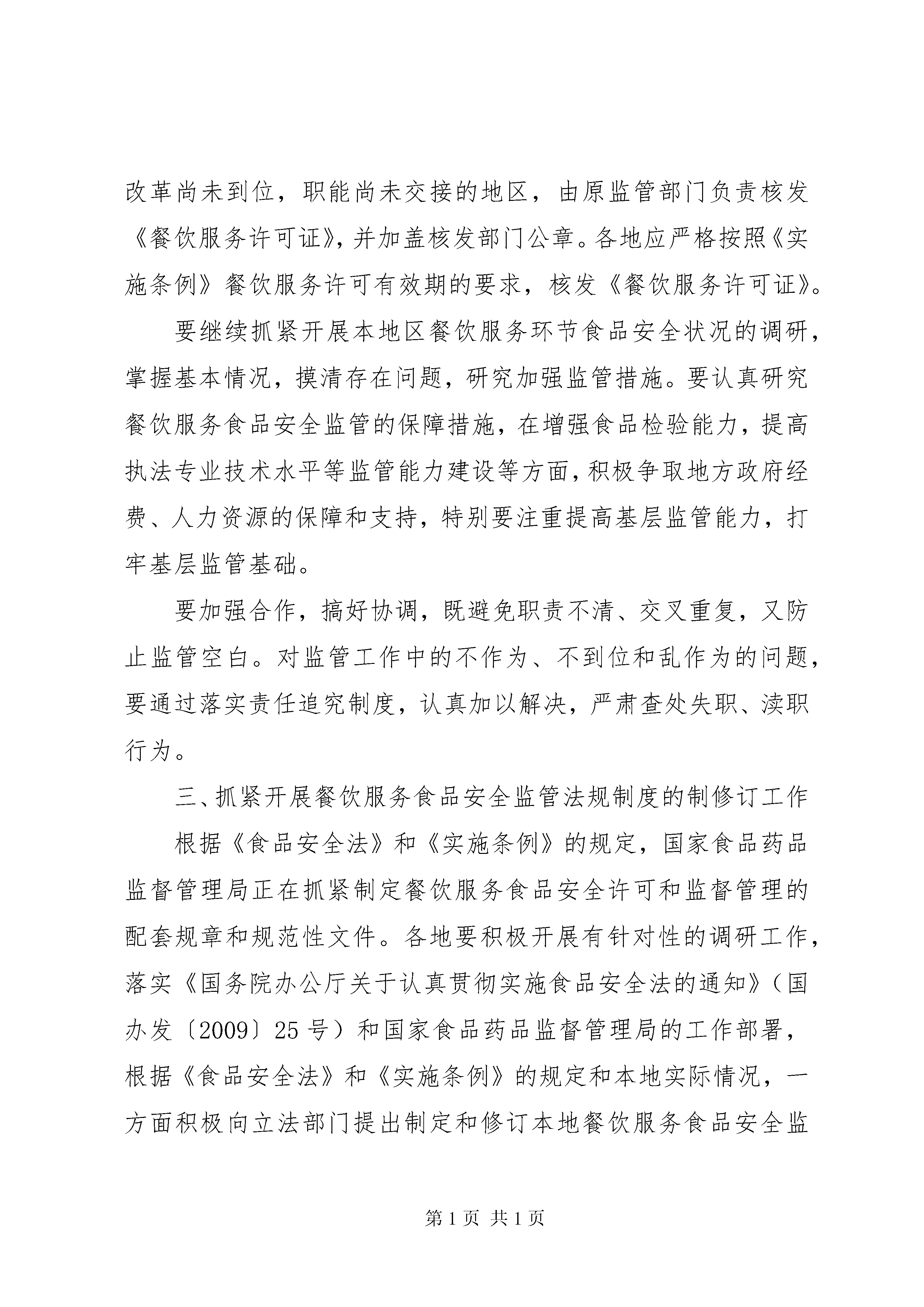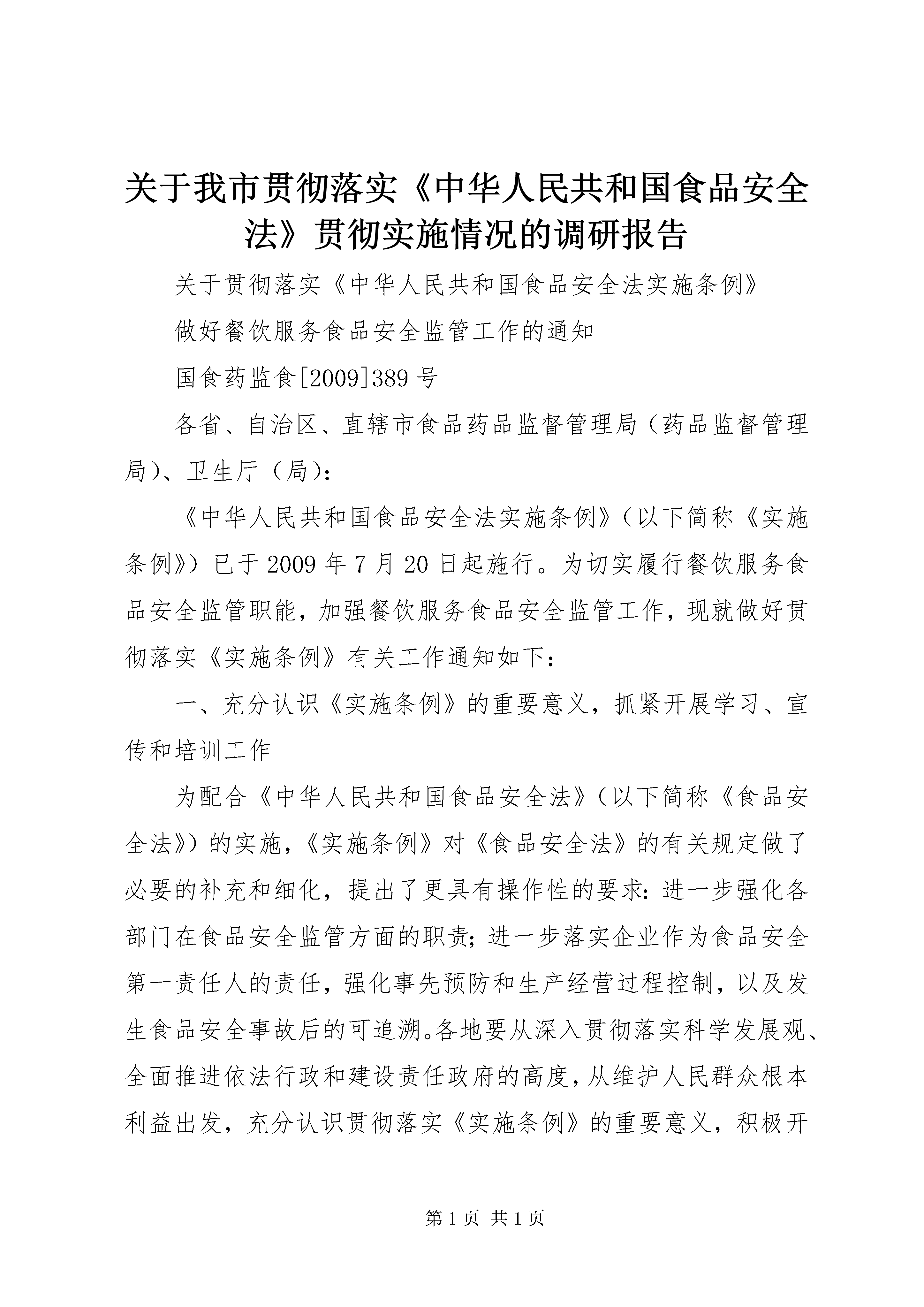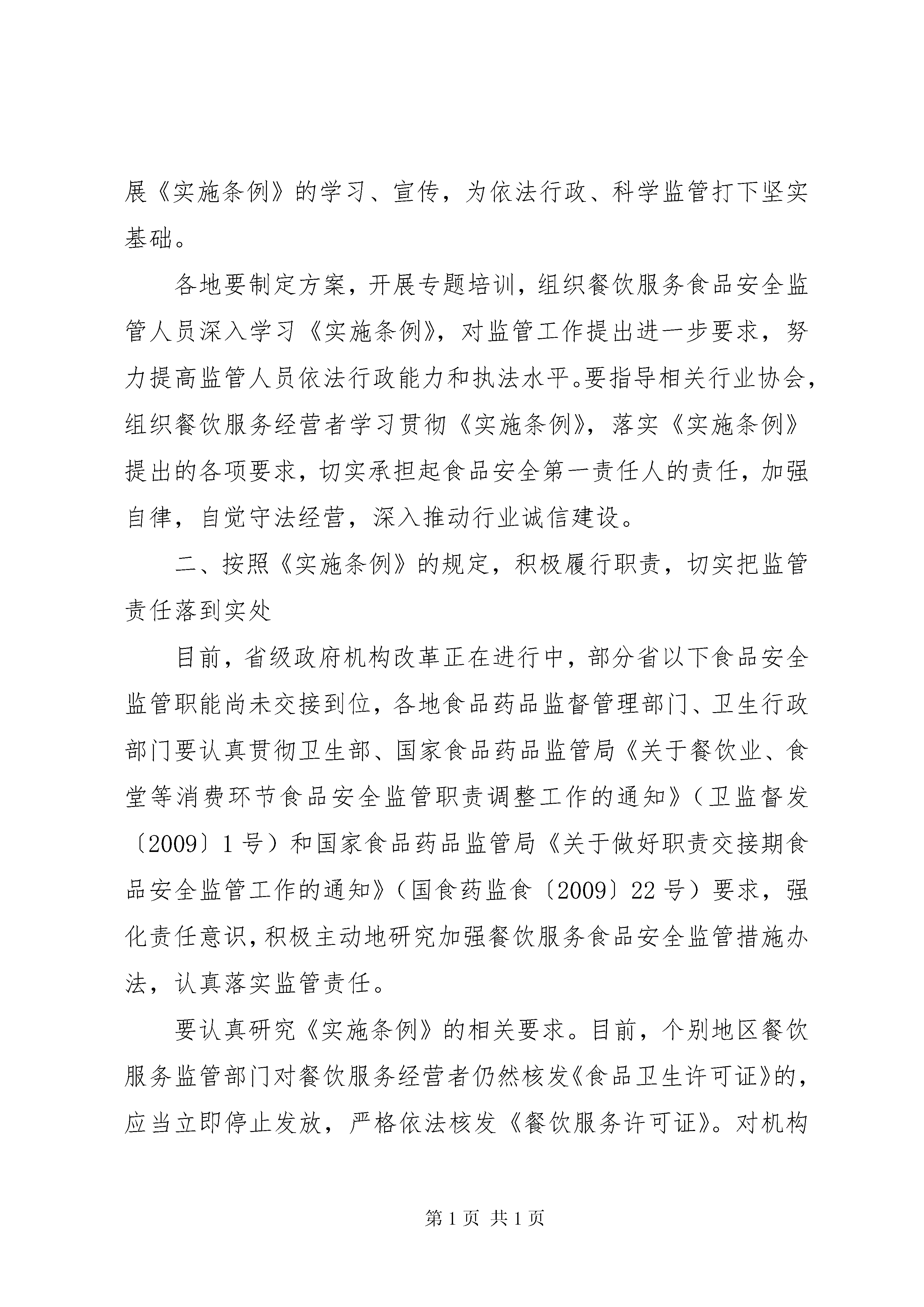 关于我市贯彻落实《中华人民共和国食品安全法》贯彻实施情况的调研报告关于贯彻落实《中华人民共和国食品安全法实施条例》做好餐饮服务食品安全监管工作的通知国食药监食[2009]389号各省、自治区、直辖市食品药品监督管理局(药品监督管理局)、卫生厅(局):《中华人民共和国食品安全法实施条例》(以下简称《实施条例》)已于2009年7月20日起施行。为切实履行餐饮服务食品安全监管职能,加强餐饮服务食品安全监管工作,现就做好贯彻落实《实施条例》有关工作通知如下:一、充分认识《实施条例》的重要意义,抓紧开展学习、宣传和培训工作为配合《中华人民共和国食品安全法》(以下简称《食品安全法》)的实施,《实施条例》对《食品安全法》的有关规定做了必要的补充和细化,提出了更具有操作性的要求:进一步强化各部门在食品安全监管方面的职责;进一步落实企业作为食品安全第一责任人的责任,强化事先预防和生产经营过程控制,以及发生食品安全事故后的可追溯。各地要从深入贯彻落实科学发展观、全面推进依法行政和建设责任政府的高度,从维护人民群众根本利益出发,充分认识贯彻落实《实施条例》的重要意义,积极开展《实施条例》的学习、宣传,为依法行政、科学监管打下坚实基础。各地要制定方案,开展专题培训,组织餐饮服务食品安全监管人员深入学习《实施条例》,对监管工作提出进一步要求,努力提高监管人员依法行政能力和执法水平。要指导相关行业协会,组织餐饮服务经营者学习贯彻《实施条例》,落实《实施条例》提出的各项要求,切实承担起食品安全第一责任人的责任,加强自律,自觉守法经营,深入推动行业诚信建设。二、按照《实施条例》的规定,积极履行职责,切实把监管责任落到实处目前,省级政府机构改革正在进行中,部分省以下食品安全监管职能尚未交接到位,各地食品药品监督管理部门、卫生行政部门要认真贯彻卫生部、国家食品药品监管局《关于餐饮业、食堂等消费环节食品安全监管职责调整工作的通知》(卫监督发〔2009〕1号)和国家食品药品监管局《关于做好职责交接期食品安全监管工作的通知》(国食药监食〔2009〕22号)要求,强化责任意识,积极主动地研究加强餐饮服务食品安全监管措施办法,认真落实监管责任。要认真研究《实施条例》的相关要求。目前,个别地区餐饮服务监管部门对餐饮服务经营者仍然核发《食品卫生许可证》的,应当立即停止发放,严格依法核发《餐饮服务许可证》。对机构改革尚未到位,职能尚未交接的地区,由原监管部门负责核发《餐饮服务许可证》,并加盖核发部门公章。各地应严格按照《实施条例》餐饮服务许可有效期的要求,核发《餐饮服务许可证》。要继续抓紧开展本地区餐饮服务环节食品安全状况的调研,掌握基本情况,摸清存在问题,研究加强监管措施。要认真研究餐饮服务食品安全监管的保障措施,在增强食品检验能力,提高执法专业技术水平等监管能力建设等方面,积极争取地方政府经费、人力资源的保障和支持,特别要注重提高基层监管能力,打牢基层监管基础。要加强合作,搞好协调,既避免职责不清、交叉重复,又防止监管空白。对监管工作中的不作为、不到位和乱作为的问题,要通过落实责任追究制度,认真加以解决,严肃查处失职、渎职行为。三、抓紧开展餐饮服务食品安全监管法规制度的制修订工作根据《食品安全法》和《实施条例》的规定,国家食品药品监督管理局正在抓紧制定餐饮服务食品安全许可和监督管理的配套规章和规范性文件。各地要积极开展有针对性的调研工作,落实《国务院办公厅关于认真贯彻实施食品安全法的通知》(国办发〔2009〕25号)和国家食品药品监督管理局的工作部署,根据《食品安全法》和《实施条例》的规定和本地实际情况,一方面积极向立法部门提出制定和修订本地餐饮服务食品安全监管法规制度的意见和建议,另一方面认真研究餐饮服务食品安全监管的各项具体要求,明确开展制定、完善餐饮服务食品安全监管法规制度的工作原则和工作步骤。四、以学习贯彻《实施条例》为契机,扎实做好餐饮服务食品安全整顿工作国务院办公厅印发食品安全整顿工作方案,至今已有近半年时间。各地要认真对照国家食品药品监督管理局印发《餐饮服务和保健食品安全整顿工作实施意见》要求,加强对餐饮服务经营者的监督检查,严肃查处餐饮服务经营中的违法违规行为,认真总结开展食品安全整顿工作以来的好做法,认真检查工作落实情况和存在的问题,及时按要求报告开展餐饮服务食品安全整顿的工作信息。国家食品药品监管局将在下半年开展督查工作。餐饮服务环节打击违法添加非食用物质和滥用食品添加剂工作已纳入为期2年的餐饮服务食品安全整顿工作计划中,各地要通过有效的监督检查,确保违法添加非食用物质的行为得到及时惩处,食品添加剂的采购、使用、保管更加规范。各地要结合《食品安全法》和《实施条例》的颁布实施,切实加强监管队伍建设,建立健全监管工作制度,突出重点区