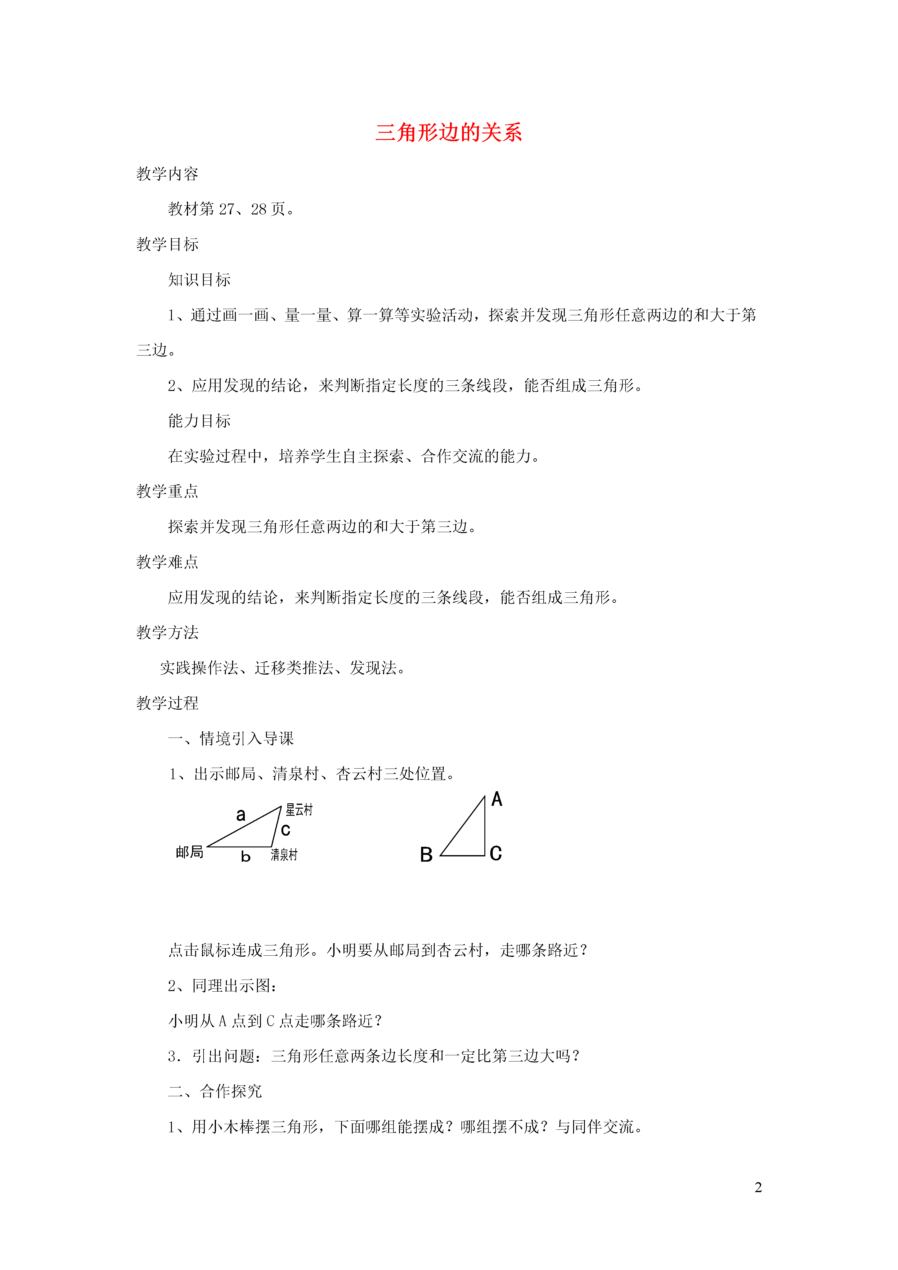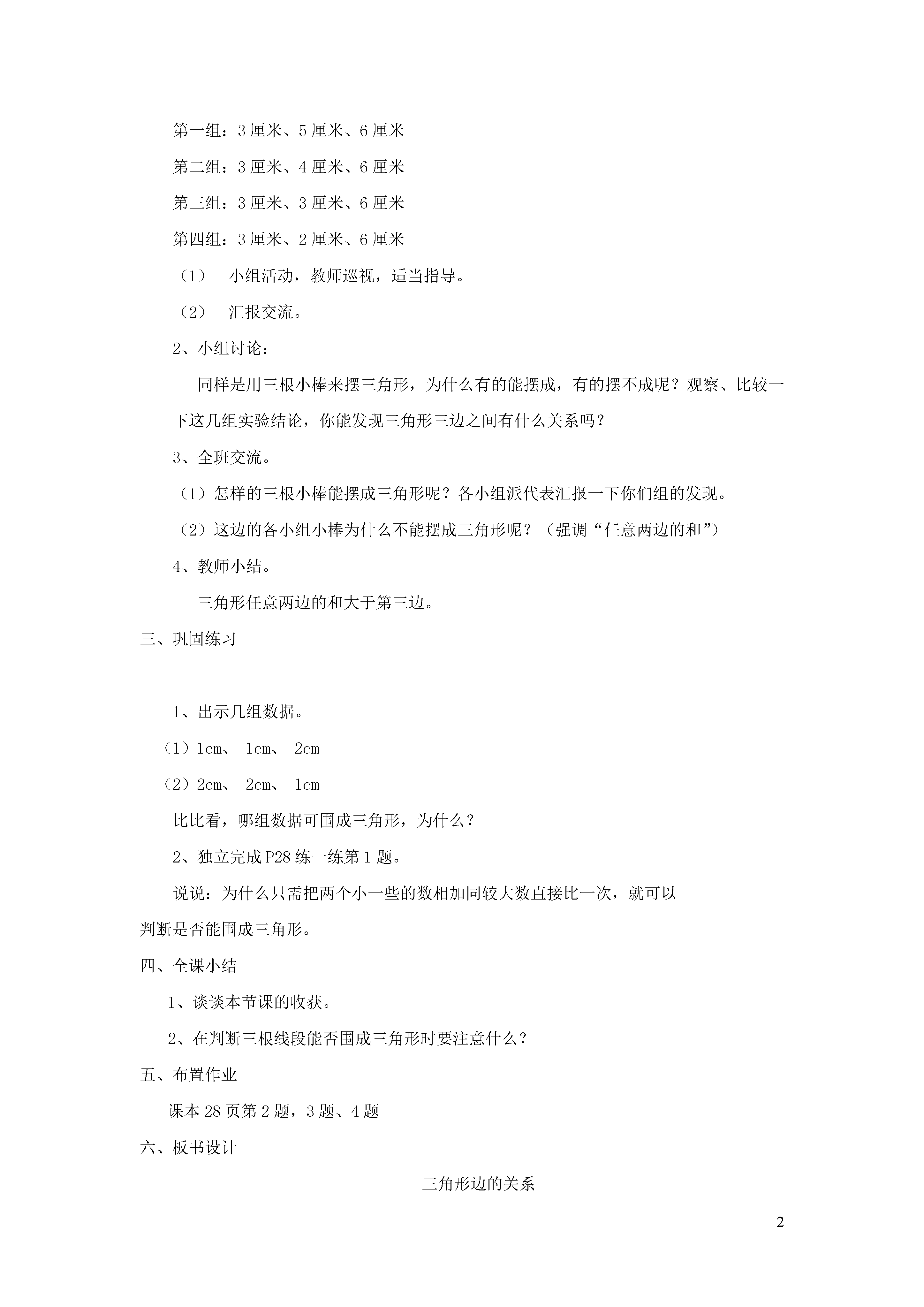 2三角形边的关系教学内容教材第27、28页。教学目标知识目标1、通过画一画、量一量、算一算等实验活动,探索并发现三角形任意两边的和大于第三边。2、应用发现的结论,来判断指定长度的三条线段,能否组成三角形。能力目标在实验过程中,培养学生自主探索、合作交流的能力。教学重点探索并发现三角形任意两边的和大于第三边。教学难点应用发现的结论,来判断指定长度的三条线段,能否组成三角形。教学方法实践操作法、迁移类推法、发现法。教学过程一、情境引入导课1、出示邮局、清泉村、杏云村三处位置。点击鼠标连成三角形。小明要从邮局到杏云村,走哪条路近?2、同理出示图:小明从A点到C点走哪条路近?3.引出问题:三角形任意两条边长度和一定比第三边大吗?二、合作探究1、用小木棒摆三角形,下面哪组能摆成?哪组摆不成?与同伴交流。第一组:3厘米、5厘米、6厘米第二组:3厘米、4厘米、6厘米第三组:3厘米、3厘米、6厘米第四组:3厘米、2厘米、6厘米小组活动,教师巡视,适当指导。汇报交流。2、小组讨论:同样是用三根小棒来摆三角形,为什么有的能摆成,有的摆不成呢?观察、比较一下这几组实验结论,你能发现三角形三边之间有什么关系吗?3、全班交流。(1)怎样的三根小棒能摆成三角形呢?各小组派代表汇报一下你们组的发现。(2)这边的各小组小棒为什么不能摆成三角形呢?(强调“任意两边的和”)4、教师小结。三角形任意两边的和大于第三边。三、巩固练习1、出示几组数据。(1)1cm、1cm、2cm(2)2cm、2cm、1cm比比看,哪组数据可围成三角形,为什么?2、独立完成P28练一练第1题。说说:为什么只需把两个小一些的数相加同较大数直接比一次,就可以判断是否能围成三角形。四、全课小结1、谈谈本节课的收获。2、在判断三根线段能否围成三角形时要注意什么?五、布置作业课本28页第2题,3题、4题六、板书设计三角形边的关系三角形中任意两边之和大于第三边教后感