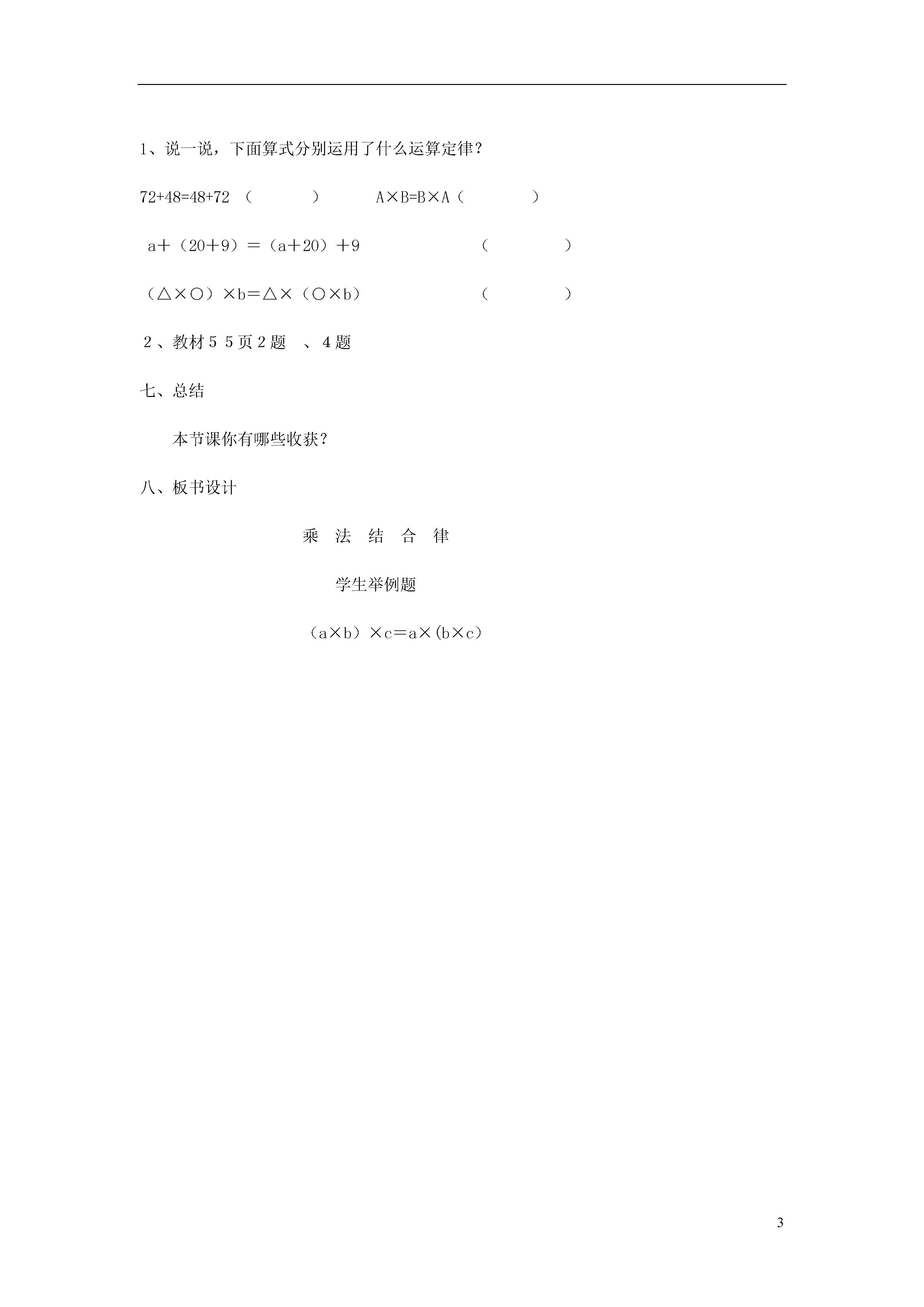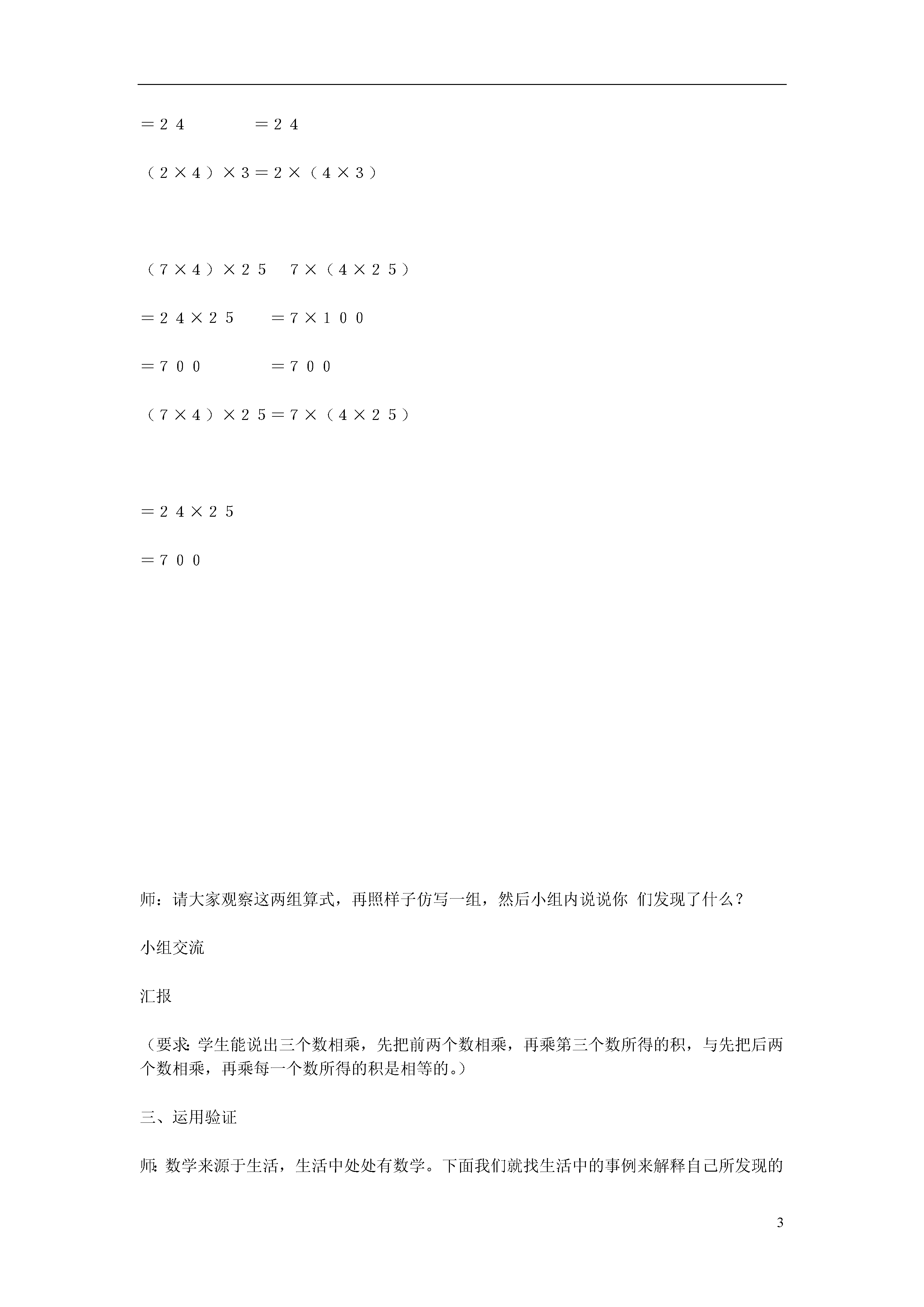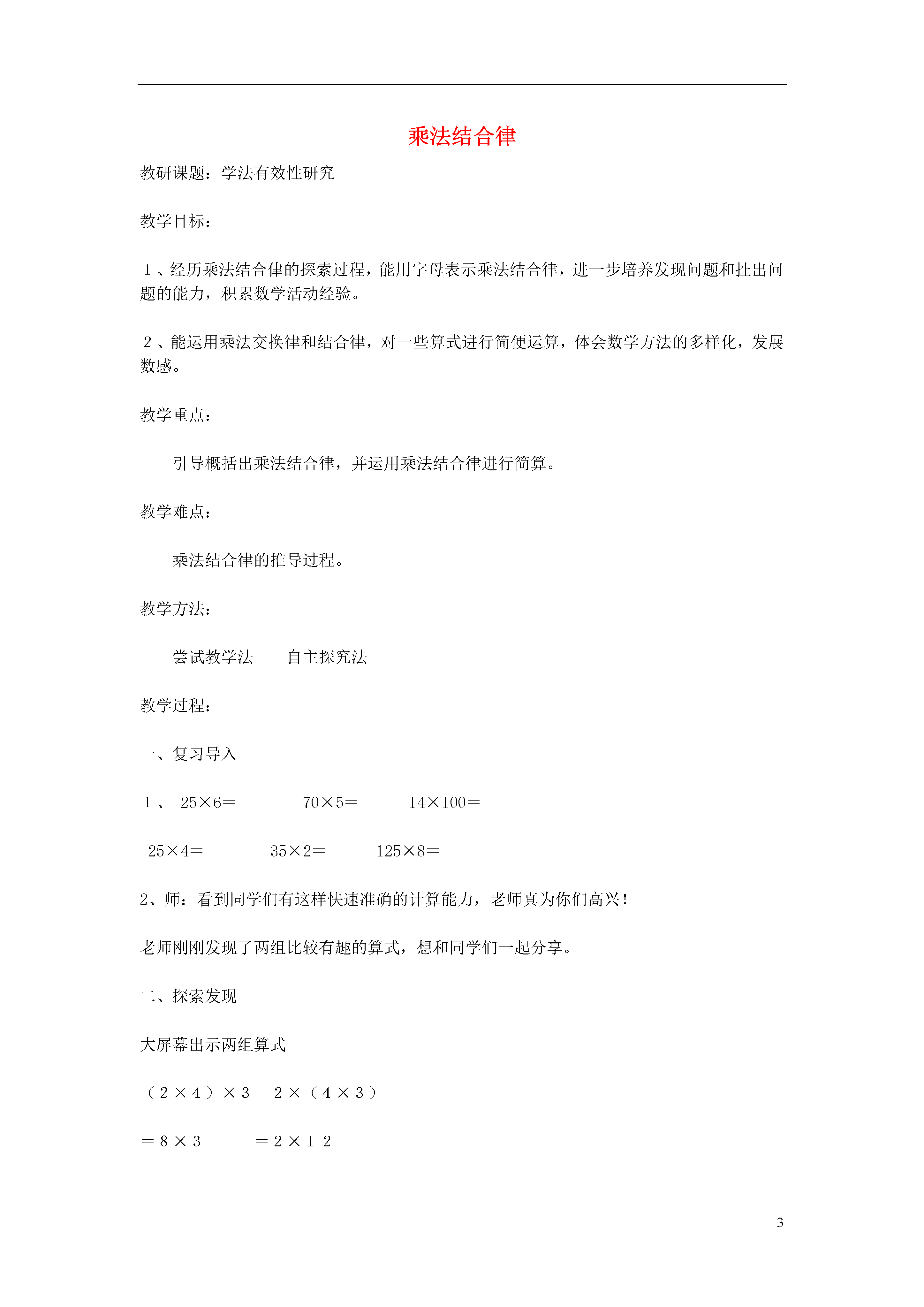 3乘法结合律教研课题:学法有效性研究教学目标:1、经历乘法结合侓的探索过程,能用字母表示乘法结合律,进一步培养发现问题和扯出问题的能力,积累数学活动经验。2、能运用乘法交换律和结合律,对一些算式进行简便运算,体会数学方法的多样化,发展数感。教学重点:引导概括出乘法结合律,并运用乘法结合律进行简算。教学难点:乘法结合律的推导过程。教学方法:尝试教学法自主探究法教学过程:一、复习导入1、25×6=70×5=14×100=25×4=35×2=125×8=2、师:看到同学们有这样快速准确的计算能力,老师真为你们高兴!老师刚刚发现了两组比较有趣的算式,想和同学们一起分享。二、探索发现大屏幕出示两组算式(2×4)×32×(4×3)=8×3=2×12=24=24(2×4)×3=2×(4×3)(7×4)×257×(4×25)=24×25=7×100=700=700(7×4)×25=7×(4×25)=24×25=700师:请大家观察这两组算式,再照样子仿写一组,然后小组内说说你们发现了什么?小组交流汇报(要求:学生能说出三个数相乘,先把前两个数相乘,再乘第三个数所得的积,与先把后两个数相乘,再乘每一个数所得的积是相等的。)三、运用验证师:数学来源于生活,生活中处处有数学。下面我们就找生活中的事例来解释自己所发现的这个事例。出示书中的两个例子要求:(1)先说清楚两个算式中每一步表示什么?(2)再说两个算式特点是否符合我们发现的规律。小组交流、汇报师:任意三个数相乘,改变了运算顺序,积都不变吗?先独立举例子,写练习本上。(大数用计算器)再小组交流,板书展示一组。四、表示对比师:用语言文字来描述这个规律语句比较冗长、复杂,如果用字母表示就比较简洁了。用a、b、c三个字母表示这三个数,你能写出这个规律吗?汇报学生口述,板书(a×b)×c=a×(b×c)看着字母表示的形式,完整地述说乘法结合律的意义。板书课题乘法结合律加法结合律和乘法结合律对比五、简捷计算直接出示125×9×8生观察算示的特点,思考怎样算简便?运用了哪个运算律?展示简便运算过程。总结简便运算的步骤。六、应用提升1、说一说,下面算式分别运用了什么运算定律?72+48=48+72()A×B=B×A()a+(20+9)=(a+20)+9()(△×○)×b=△×(○×b)()2、教材55页2题、4题七、总结本节课你有哪些收获?八、板书设计乘法结合律学生举例题(a×b)×c=a×(b×c)