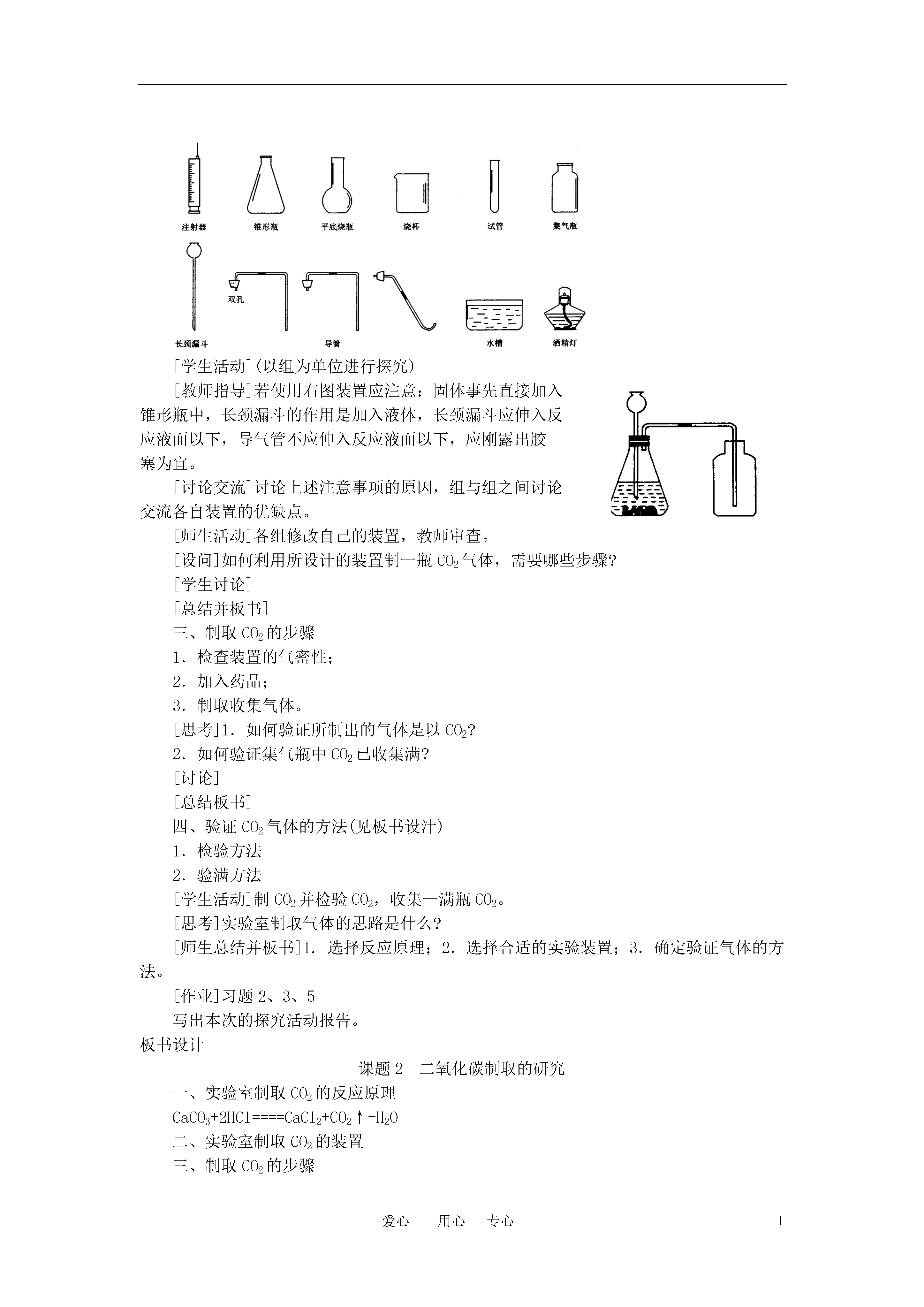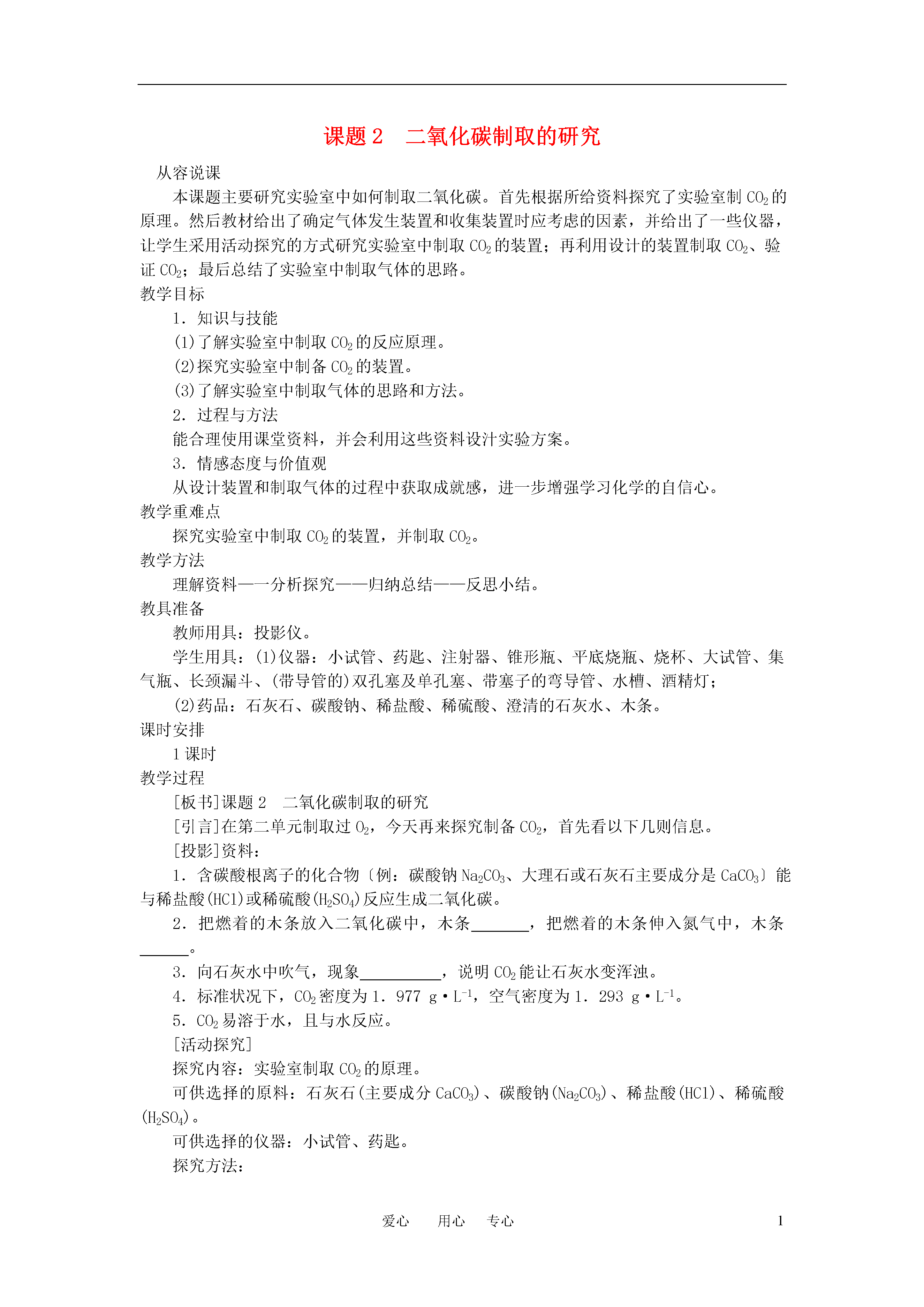 1爱心用心专心课题2二氧化碳制取的研究从容说课本课题主要研究实验室中如何制取二氧化碳。首先根据所给资料探究了实验室制CO2的原理。然后教材给出了确定气体发生装置和收集装置时应考虑的因素,并给出了一些仪器,让学生采用活动探究的方式研究实验室中制取CO2的装置;再利用设计的装置制取CO2、验证CO2;最后总结了实验室中制取气体的思路。教学目标1.知识与技能(1)了解实验室中制取CO2的反应原理。(2)探究实验室中制备CO2的装置。(3)了解实验室中制取气体的思路和方法。2.过程与方法能合理使用课堂资料,并会利用这些资料设汁实验方案。3.情感态度与价值观从设计装置和制取气体的过程中获取成就感,进一步增强学习化学的自信心。教学重难点探究实验室中制取CO2的装置,并制取CO2。教学方法理解资料—一分析探究——归纳总结——反思小结。教具准备教师用具:投影仪。学生用具:(1)仪器:小试管、药匙、注射器、锥形瓶、平底烧瓶、烧杯、大试管、集气瓶、长颈漏斗、(带导管的)双孔塞及单孔塞、带塞子的弯导管、水槽、酒精灯;(2)药品:石灰石、碳酸钠、稀盐酸、稀硫酸、澄清的石灰水、木条。课时安排1课时教学过程[板书]课题2二氧化碳制取的研究[引言]在第二单元制取过O2,今天再来探究制备CO2,首先看以下几则信息。[投影]资料:1.含碳酸根离子的化合物〔例:碳酸钠Na2CO3、大理石或石灰石主要成分是CaCO3〕能与稀盐酸(HCl)或稀硫酸(H2SO4)反应生成二氧化碳。2.把燃着的木条放入二氧化碳中,木条_______,把燃着的木条伸入氮气中,木条______。3.向石灰水中吹气,现象__________,说明CO2能让石灰水变浑浊。4.标准状况下,CO2密度为1.977g·L-1,空气密度为1.293g·L-1。5.CO2易溶于水,且与水反应。[活动探究]探究内容:实验室制取CO2的原理。可供选择的原料:石灰石(主要成分CaCO3)、碳酸钠(Na2CO3)、稀盐酸(HCl)、稀硫酸(H2SO4)。可供选择的仪器:小试管、药匙。探究方法:步骤现象1.2.3.4.结论:______________。[学生活动][交流](教师适当指导)石灰石与HCl反应速度适中;CaCO3与H2SO4反应难于进行;Na2CO3与酸反应瞬间结束,不便收集。所以实验室制取CO2选择石灰石与稀盐酸反应。[讲解]碳酸钙与盐酸反应:CaCO3+2HCl====CaCl2+H2CO3。碳酸不稳定易分解生成CO2和H2O,所以总反应为:CaCO3+2HCl====CaCl2+CO2↑+H2O。[板书]一、实验室制取CO2的反应原理CaCO3+2HCl====CaCl2+CO2↑+H2O[设问]我们如何设计一套完整的装置制取CO2?[板书]二、实验室制取CO2的装置[投影]资料:实验室里制取气体装置的确定实验室里制取气体的装置包括发生装置和收集装置两部分。下面列出了确定气体发生装置和收集装置时应考虑的因素。固体和固体反应反应物的状态固体和液体反应气体发生装置液体和液体反应……反应条件(是否需要加热、加催化剂等)密度比空气大的——向上排气法排空气法气体收集装置密度比空气小的——向上排气法排水法(不易溶于水、不与水发生反应)[活动与探究]二氧化碳和氧气制取实验及相关性质比较二氧化碳和氧气制取实验及相关性质比较反应物的状态反应条件气体密度比空气的大或小是否溶于水是否与水反应二氧化碳氧气根据上述比较,分析制取二氧化碳和氧气的发生装置和收集装置各有什么不同。试设计制取二氧化碳的装置,并与同学讨论、交流,分析各自设计的装置的优缺点。以下仪器可供设计制取二氧化碳的装置时选择,你也可以另选或自制仪器,还可以利用代用品。[学生活动](以组为单位进行探究)[教师指导]若使用右图装置应注意:固体事先直接加入锥形瓶中,长颈漏斗的作用是加入液体,长颈漏斗应伸入反应液面以下,导气管不应伸入反应液面以下,应刚露出胶塞为宜。[讨论交流]讨论上述注意事项的原因,组与组之间讨论交流各自装置的优缺点。[师生活动]各组修改自己的装置,教师审查。[设问]如何利用所设计的装置制一瓶CO2气体,需要哪些步骤?[学生讨论][总结并板书]三、制取CO2的步骤1.检查装置的气密性;2.加入药品;3.制取收集气体。[思考]1.如何验证所制出的气体是以CO2?2.如何验证集气瓶中CO2已收集满?[讨论][总结板书]四、验证CO2气体的方法(见板书设汁)1.检验方法2.验满方法[学生活动]制CO2并检验CO2,收集一满瓶CO2。[思考]实验室制取气体的