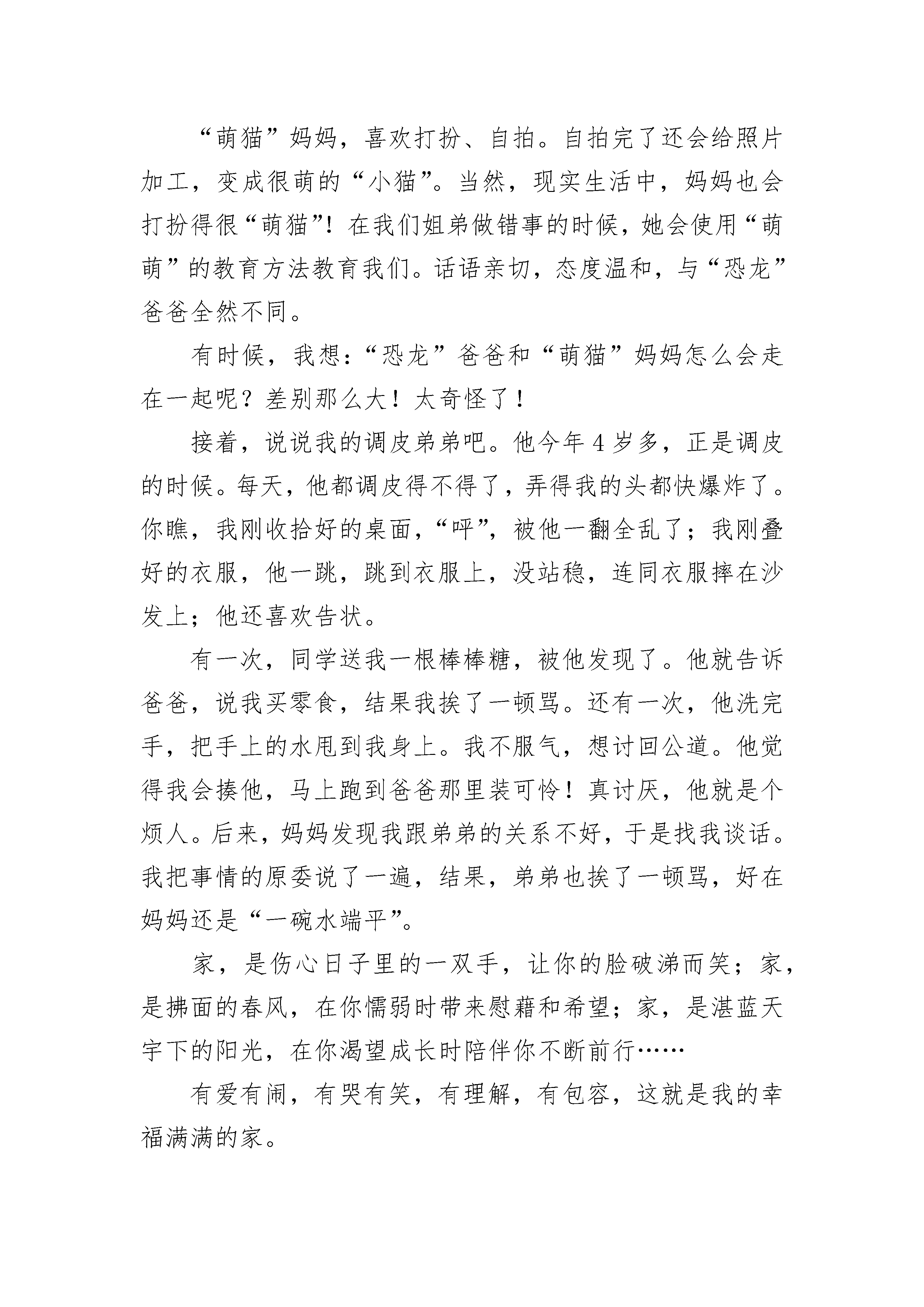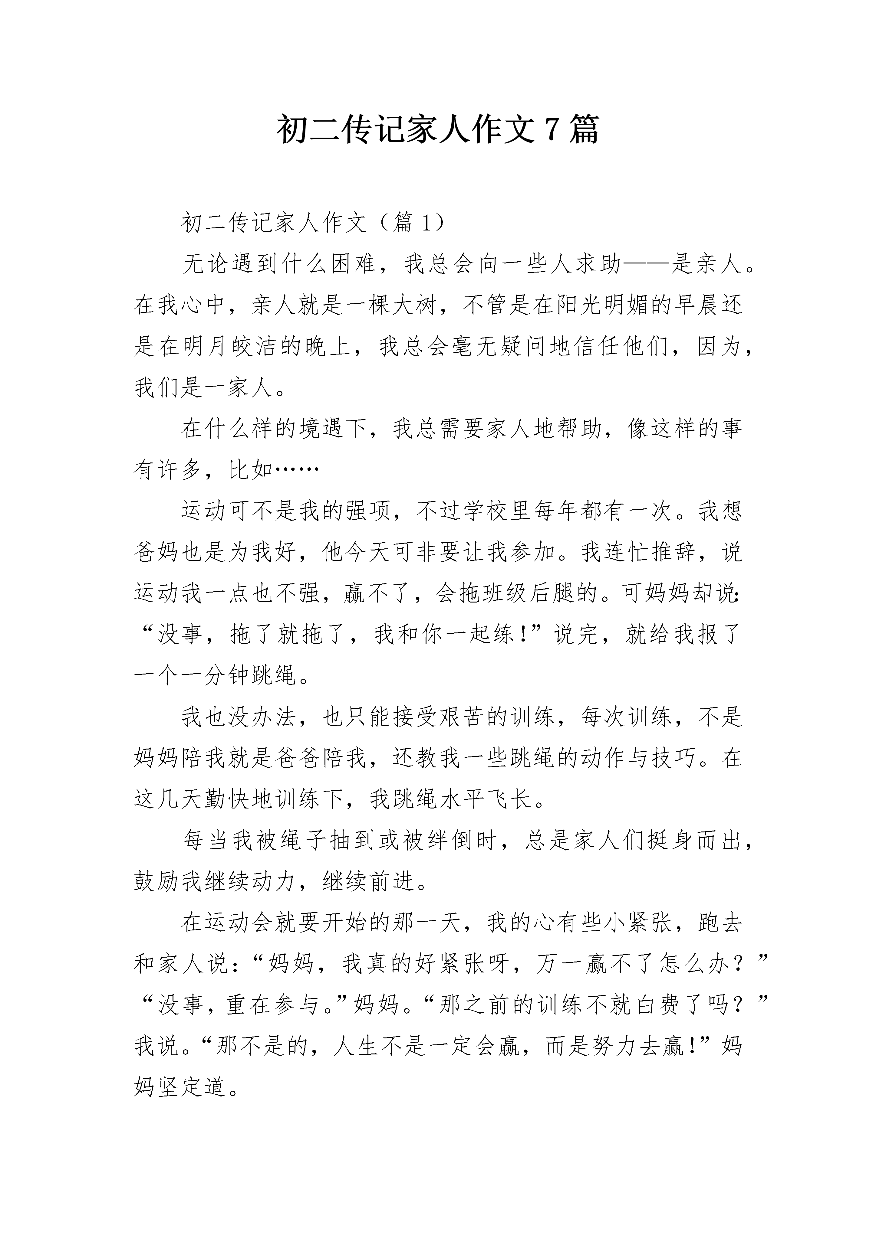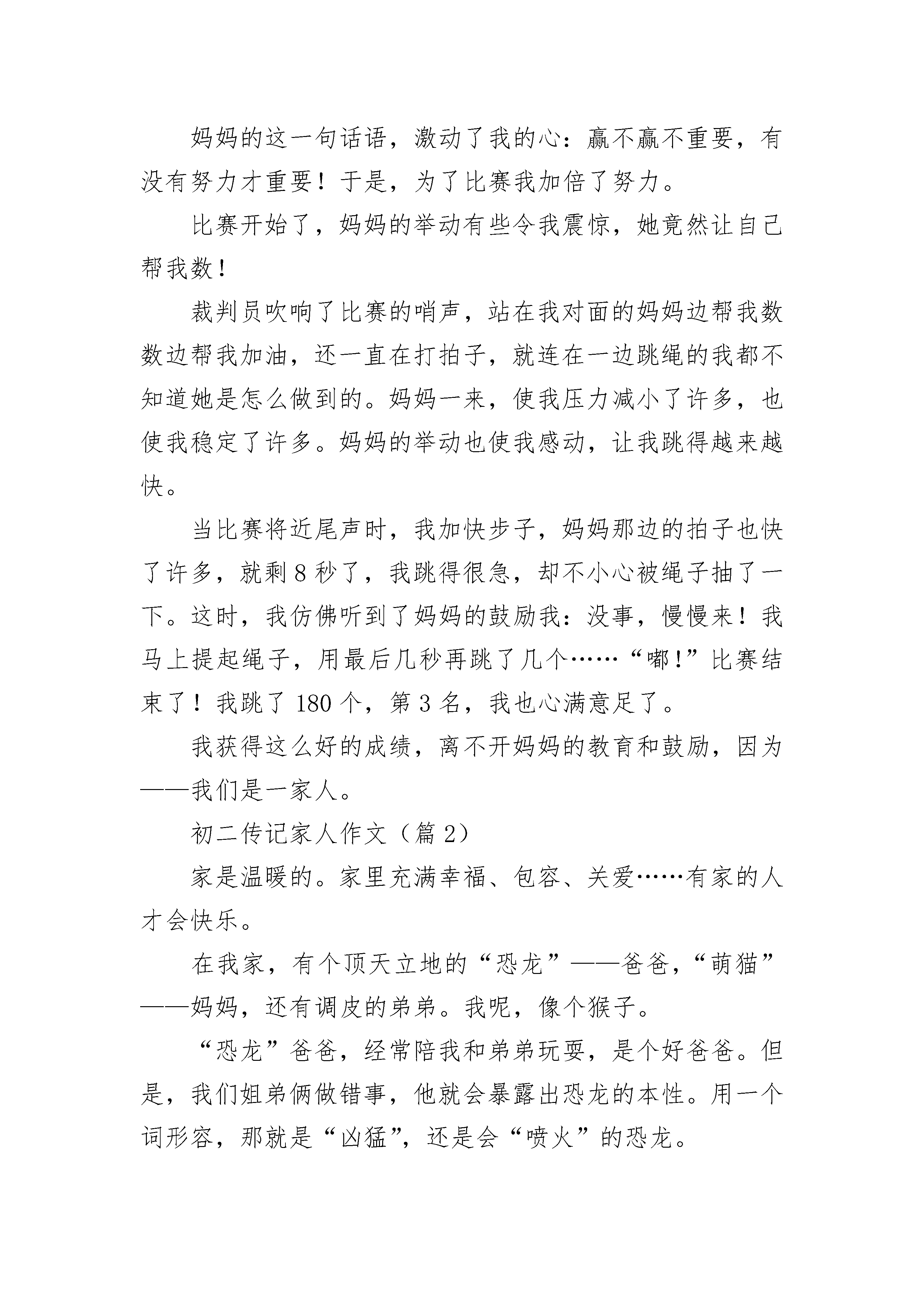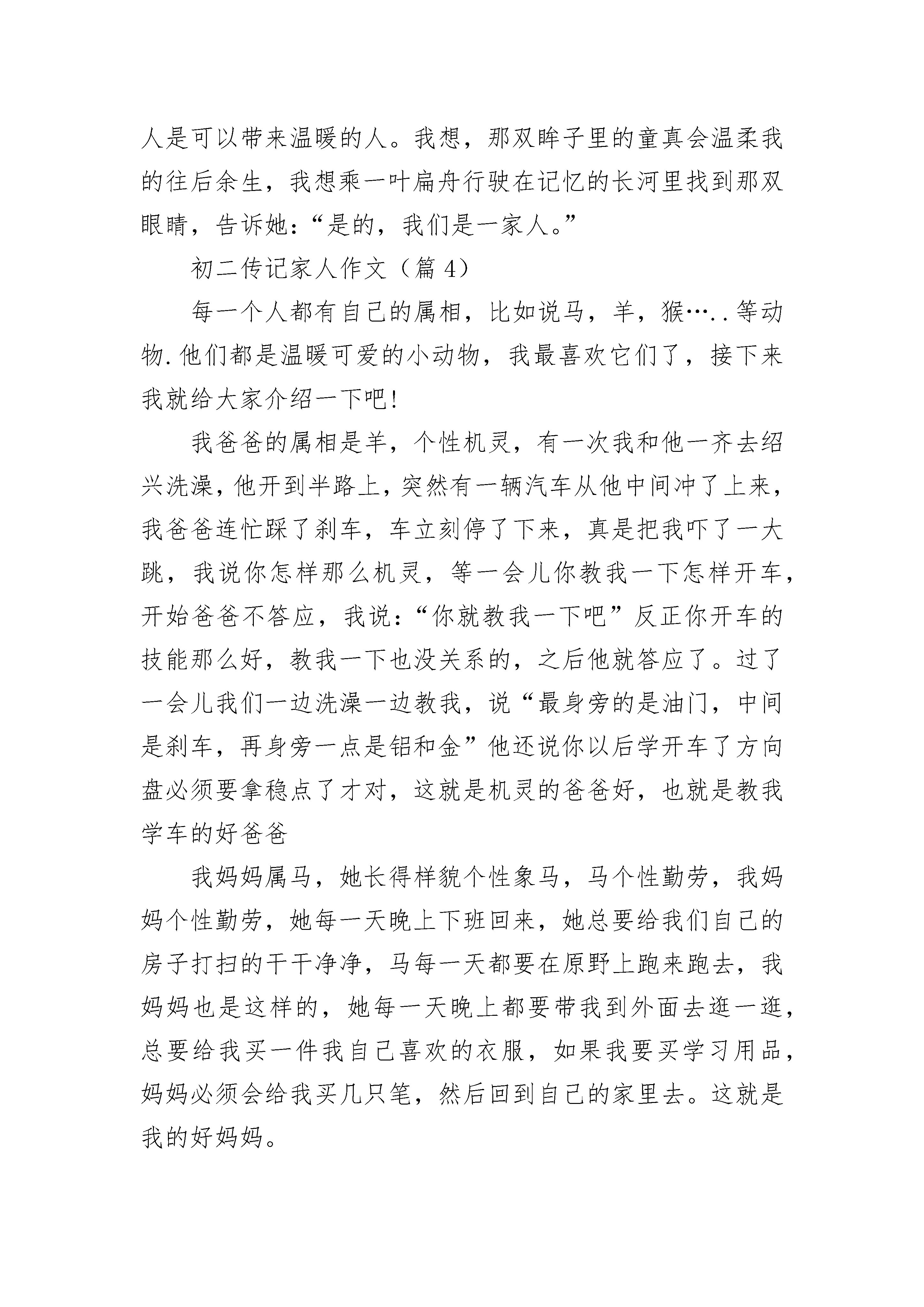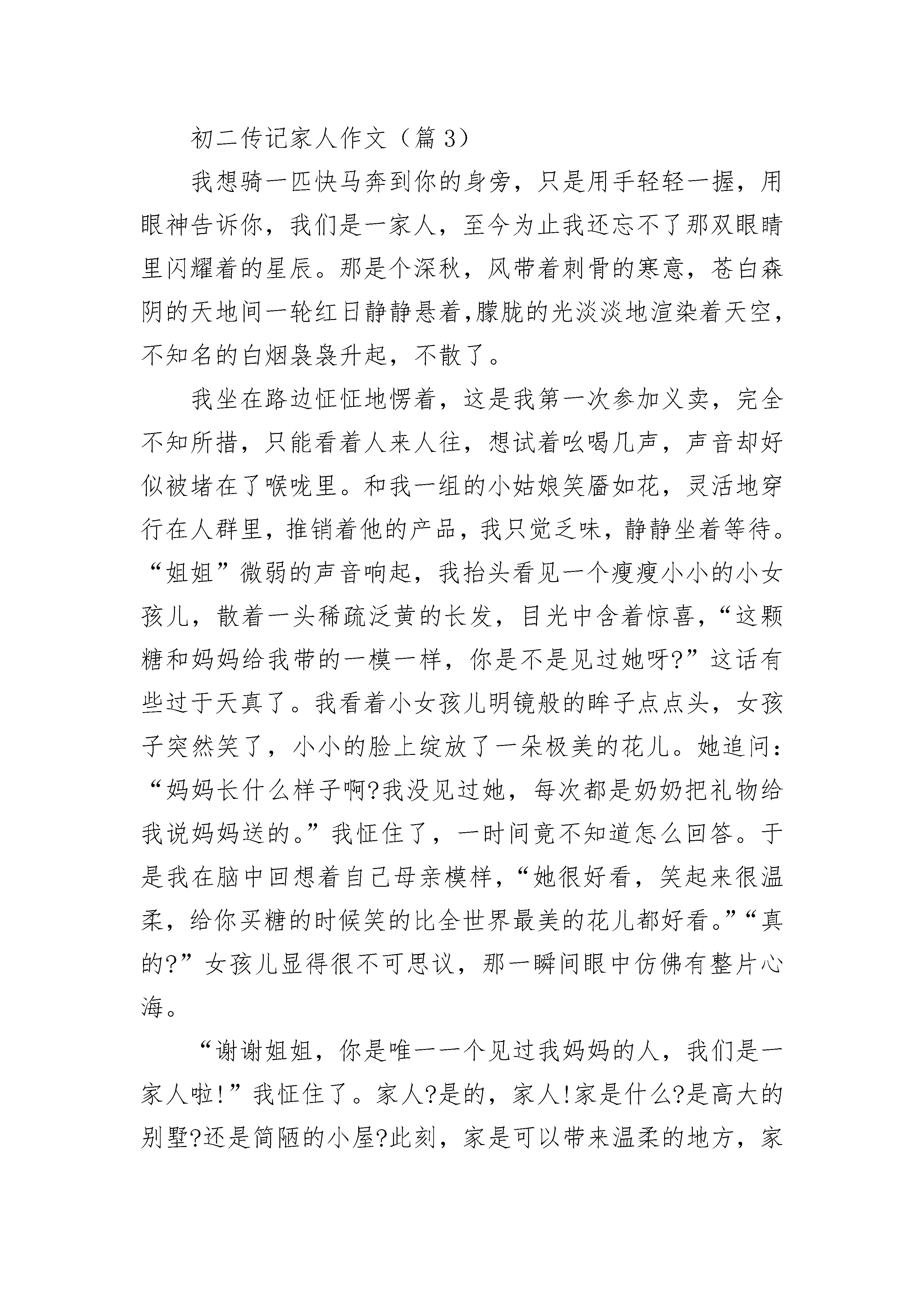 初二传记家人作文7篇初二传记家人作文(篇1)无论遇到什么困难,我总会向一些人求助——是亲人。在我心中,亲人就是一棵大树,不管是在阳光明媚的早晨还是在明月皎洁的晚上,我总会毫无疑问地信任他们,因为,我们是一家人。在什么样的境遇下,我总需要家人地帮助,像这样的事有许多,比如……运动可不是我的强项,不过学校里每年都有一次。我想爸妈也是为我好,他今天可非要让我参加。我连忙推辞,说运动我一点也不强,赢不了,会拖班级后腿的。可妈妈却说:“没事,拖了就拖了,我和你一起练!”说完,就给我报了一个一分钟跳绳。我也没办法,也只能接受艰苦的训练,每次训练,不是妈妈陪我就是爸爸陪我,还教我一些跳绳的动作与技巧。在这几天勤快地训练下,我跳绳水平飞长。每当我被绳子抽到或被绊倒时,总是家人们挺身而出,鼓励我继续动力,继续前进。在运动会就要开始的那一天,我的心有些小紧张,跑去和家人说:“妈妈,我真的好紧张呀,万一赢不了怎么办?”“没事,重在参与。”妈妈。“那之前的训练不就白费了吗?”我说。“那不是的,人生不是一定会赢,而是努力去赢!”妈妈坚定道。妈妈的这一句话语,激动了我的心:赢不赢不重要,有没有努力才重要!于是,为了比赛我加倍了努力。比赛开始了,妈妈的举动有些令我震惊,她竟然让自己帮我数!裁判员吹响了比赛的哨声,站在我对面的妈妈边帮我数数边帮我加油,还一直在打拍子,就连在一边跳绳的我都不知道她是怎么做到的。妈妈一来,使我压力减小了许多,也使我稳定了许多。妈妈的举动也使我感动,让我跳得越来越快。当比赛将近尾声时,我加快步子,妈妈那边的拍子也快了许多,就剩8秒了,我跳得很急,却不小心被绳子抽了一下。这时,我仿佛听到了妈妈的鼓励我:没事,慢慢来!我马上提起绳子,用最后几秒再跳了几个……“嘟!”比赛结束了!我跳了180个,第3名,我也心满意足了。我获得这么好的成绩,离不开妈妈的教育和鼓励,因为——我们是一家人。初二传记家人作文(篇2)家是温暖的。家里充满幸福、包容、关爱……有家的人才会快乐。在我家,有个顶天立地的“恐龙”——爸爸,“萌猫”——妈妈,还有调皮的弟弟。我呢,像个猴子。“恐龙”爸爸,经常陪我和弟弟玩耍,是个好爸爸。但是,我们姐弟俩做错事,他就会暴露出恐龙的本性。用一个词形容,那就是“凶猛”,还是会“喷火”的恐龙。“萌猫”妈妈,喜欢打扮、自拍。自拍完了还会给照片加工,变成很萌的“小猫”。当然,现实生活中,妈妈也会打扮得很“萌猫”!在我们姐弟做错事的时候,她会使用“萌萌”的教育方法教育我们。话语亲切,态度温和,与“恐龙”爸爸全然不同。有时候,我想:“恐龙”爸爸和“萌猫”妈妈怎么会走在一起呢?差别那么大!太奇怪了!接着,说说我的调皮弟弟吧。他今年4岁多,正是调皮的时候。每天,他都调皮得不得了,弄得我的头都快爆炸了。你瞧,我刚收拾好的桌面,“呯”,被他一翻全乱了;我刚叠好的衣服,他一跳,跳到衣服上,没站稳,连同衣服摔在沙发上;他还喜欢告状。有一次,同学送我一根棒棒糖,被他发现了。他就告诉爸爸,说我买零食,结果我挨了一顿骂。还有一次,他洗完手,把手上的水甩到我身上。我不服气,想讨回公道。他觉得我会揍他,马上跑到爸爸那里装可怜!真讨厌,他就是个烦人。后来,妈妈发现我跟弟弟的关系不好,于是找我谈话。我把事情的原委说了一遍,结果,弟弟也挨了一顿骂,好在妈妈还是“一碗水端平”。家,是伤心日子里的一双手,让你的脸破涕而笑;家,是拂面的春风,在你懦弱时带来慰藉和希望;家,是湛蓝天宇下的阳光,在你渴望成长时陪伴你不断前行……有爱有闹,有哭有笑,有理解,有包容,这就是我的幸福满满的家。初二传记家人作文(篇3)我想骑一匹快马奔到你的身旁,只是用手轻轻一握,用眼神告诉你,我们是一家人,至今为止我还忘不了那双眼睛里闪耀着的星辰。那是个深秋,风带着刺骨的寒意,苍白森阴的天地间一轮红日静静悬着,朦胧的光淡淡地渲染着天空,不知名的白烟袅袅升起,不散了。我坐在路边怔怔地愣着,这是我第一次参加义卖,完全不知所措,只能看着人来人往,想试着吆喝几声,声音却好似被堵在了喉咙里。和我一组的小姑娘笑靥如花,灵活地穿行在人群里,推销着他的产品,我只觉乏味,静静坐着等待。“姐姐”微弱的声音响起,我抬头看见一个瘦瘦小小的小女孩儿,散着一头稀疏泛黄的长发,目光中含着惊喜,“这颗糖和妈妈给我带的一模一样,你是不是见过她呀?”这话有些过于天真了。我看着小女孩儿明镜般的眸子点点头,女孩子突然笑了,小小的脸上绽放了一朵极美的花儿。她追问:“妈妈长什么样子啊?我没见过她,每次都是奶奶把礼物给我说妈妈送的。”我怔住了,一时间竟不知道怎么回答。于是我在脑中回想着自己母亲模样,“她很好看,笑起来很温柔,给你买糖的时候笑的比全世界最美的花儿都好看。”“真的?”女孩儿显得很不可思议,那一瞬间眼中仿佛有整片心海。“谢谢姐姐,你是唯