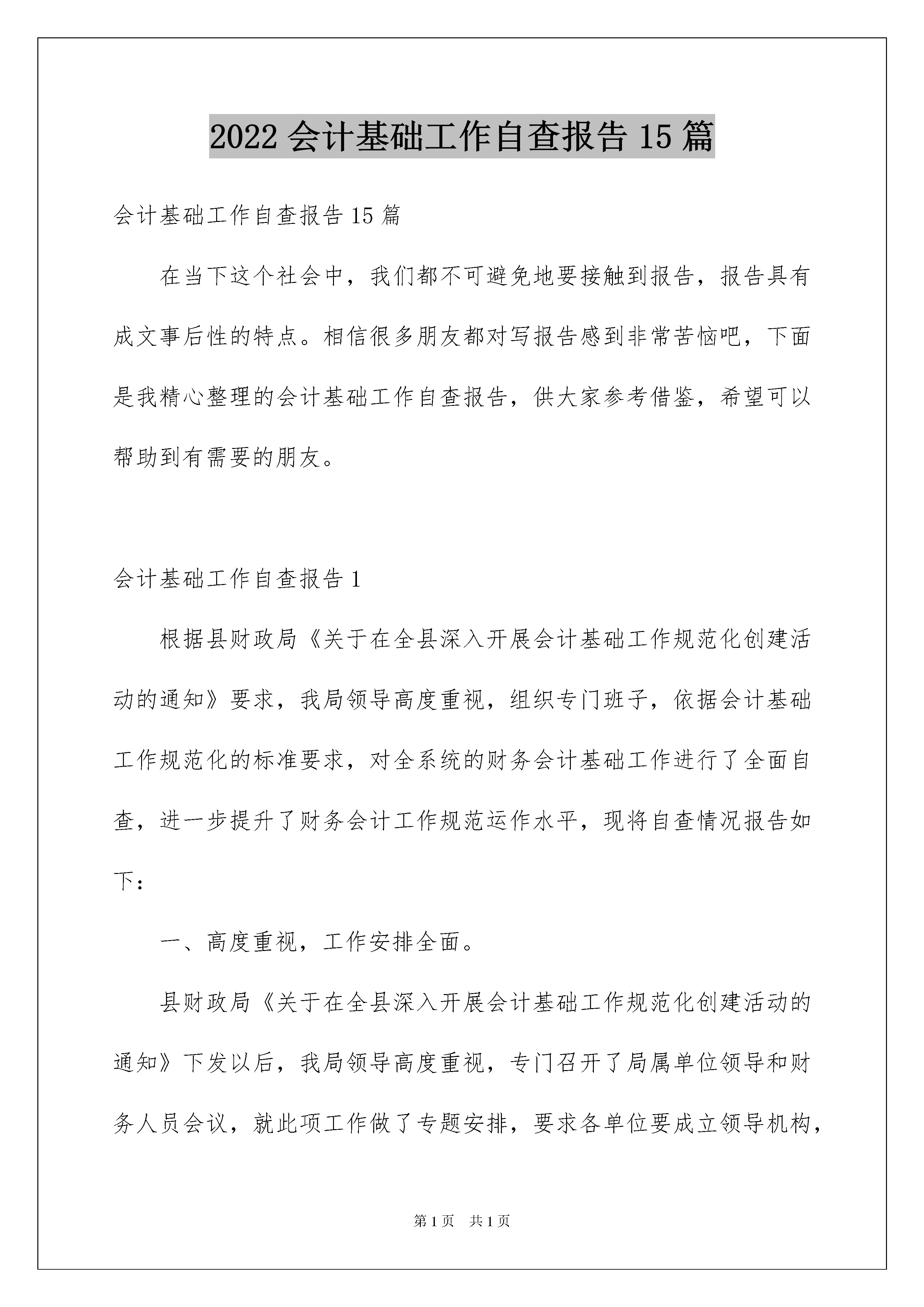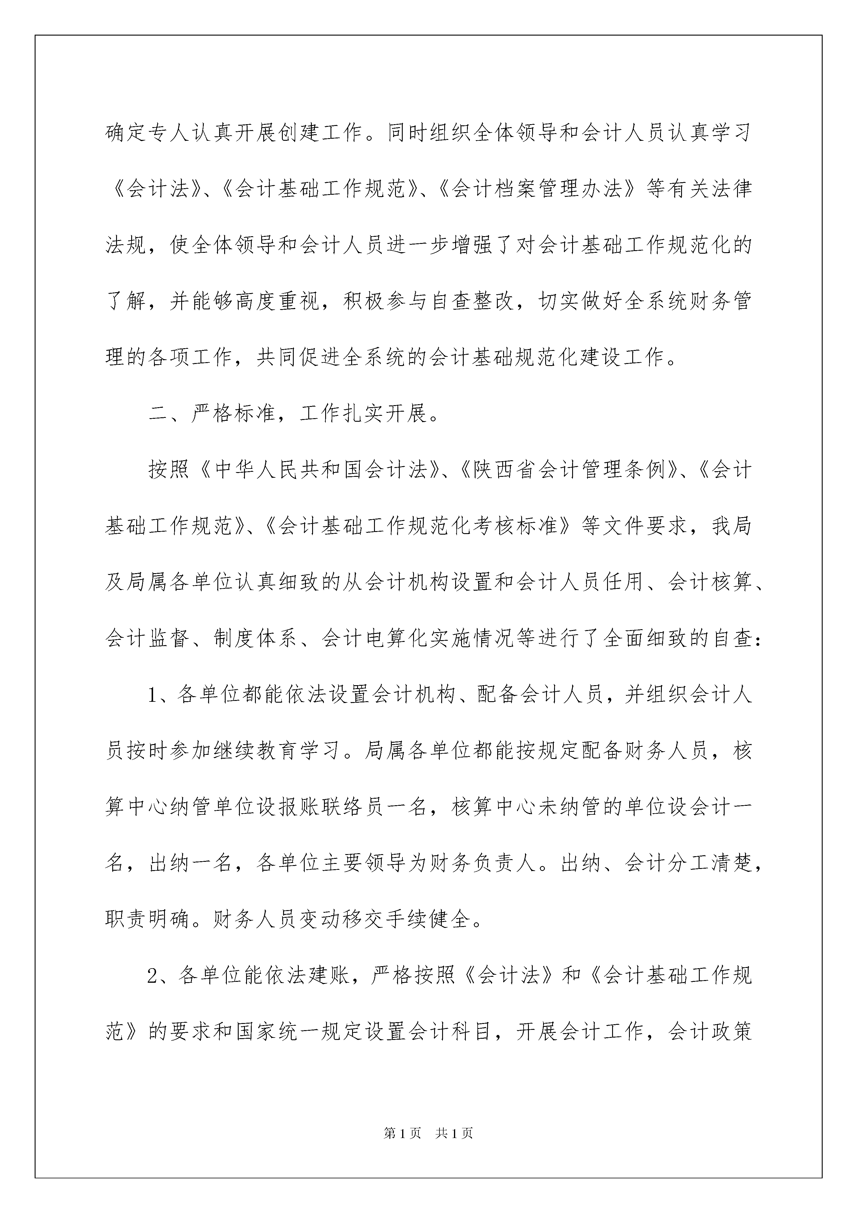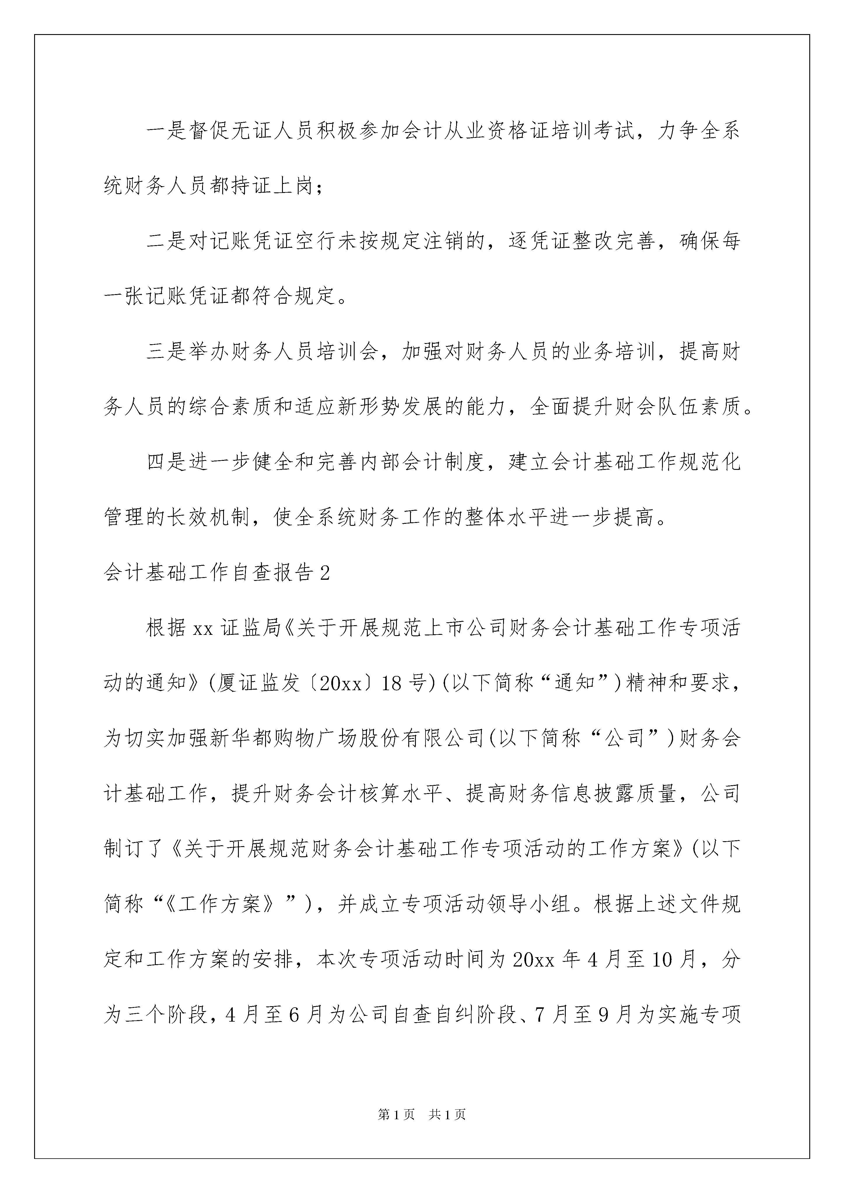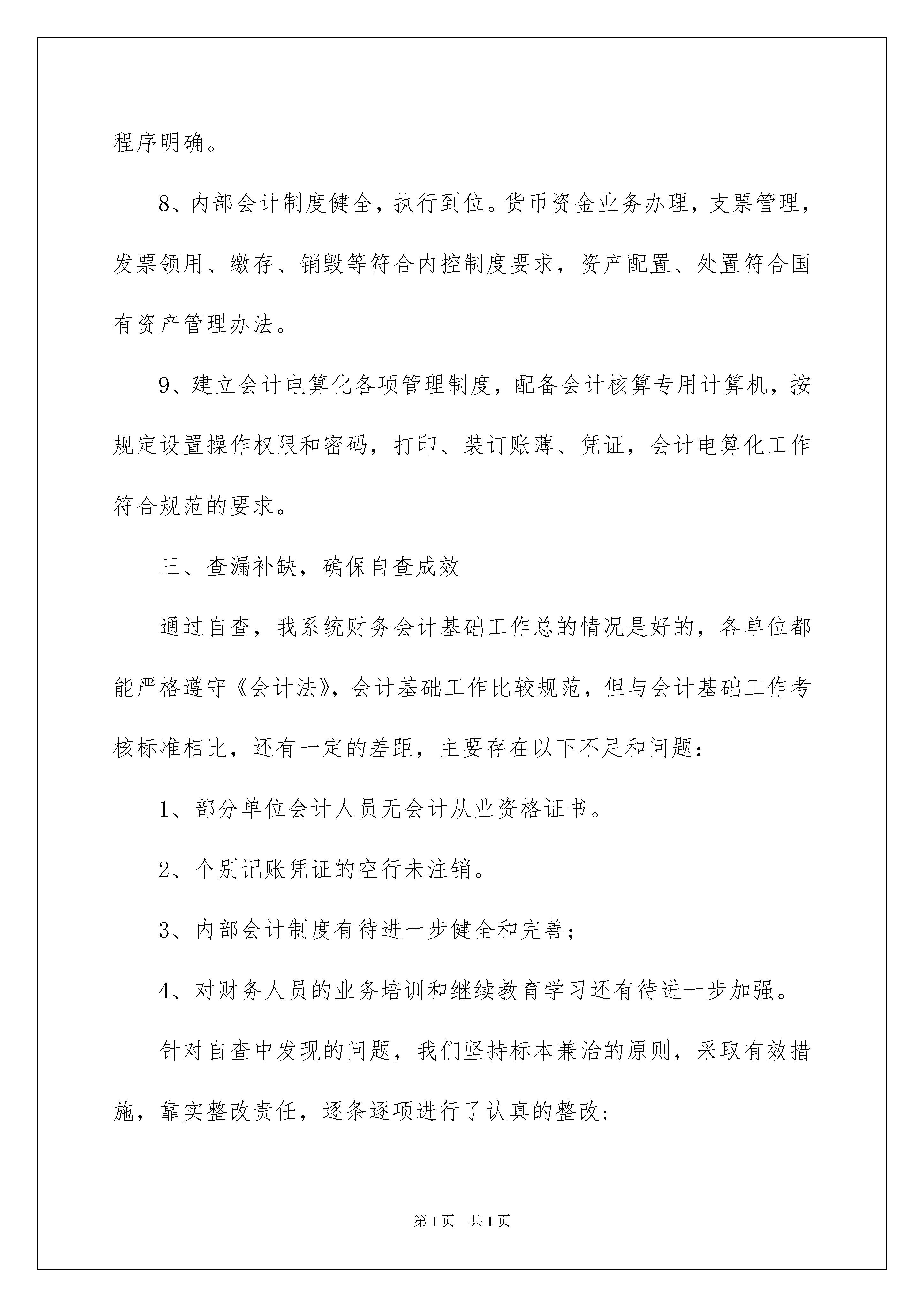 2022会计基础工作自查报告15篇会计基础工作自查报告15篇在当下这个社会中,我们都不可避免地要接触到报告,报告具有成文事后性的特点。相信很多朋友都对写报告感到非常苦恼吧,下面是我精心整理的会计基础工作自查报告,供大家参考借鉴,希望可以帮助到有需要的朋友。会计基础工作自查报告1根据县财政局《关于在全县深入开展会计基础工作规范化创建活动的通知》要求,我局领导高度重视,组织专门班子,依据会计基础工作规范化的标准要求,对全系统的财务会计基础工作进行了全面自查,进一步提升了财务会计工作规范运作水平,现将自查情况报告如下:一、高度重视,工作安排全面。县财政局《关于在全县深入开展会计基础工作规范化创建活动的通知》下发以后,我局领导高度重视,专门召开了局属单位领导和财务人员会议,就此项工作做了专题安排,要求各单位要成立领导机构,确定专人认真开展创建工作。同时组织全体领导和会计人员认真学习《会计法》、《会计基础工作规范》、《会计档案管理办法》等有关法律法规,使全体领导和会计人员进一步增强了对会计基础工作规范化的了解,并能够高度重视,积极参与自查整改,切实做好全系统财务管理的各项工作,共同促进全系统的会计基础规范化建设工作。二、严格标准,工作扎实开展。按照《中华人民共和国会计法》、《陕西省会计管理条例》、《会计基础工作规范》、《会计基础工作规范化考核标准》等文件要求,我局及局属各单位认真细致的从会计机构设置和会计人员任用、会计核算、会计监督、制度体系、会计电算化实施情况等进行了全面细致的自查:1、各单位都能依法设置会计机构、配备会计人员,并组织会计人员按时参加继续教育学习。局属各单位都能按规定配备财务人员,核算中心纳管单位设报账联络员一名,核算中心未纳管的单位设会计一名,出纳一名,各单位主要领导为财务负责人。出纳、会计分工清楚,职责明确。财务人员变动移交手续健全。2、各单位能依法建账,严格按照《会计法》和《会计基础工作规范》的要求和国家统一规定设置会计科目,开展会计工作,会计政策运用准确。3、原始凭证的格式正确、内容完整、要素齐全,填制方法、审核程序等符合会计制度要求;记账凭证内容、填制方法、所附原始凭证、更正错误方法等符合会计制度要求,是经有关责任人签章,字迹清楚,装订整齐。4、各单位都能按规定设置总账、明细账、日记账和备查账,账薄启用规范,账薄登记字迹清楚、要素齐全、摘要明确,结账、错误更正方法都符合会计制度的规定。能做到账证、账账、账实相符,现金和银行日记账按日逐笔顺序登记,结出余额,银行存款与银行对账单及时核对。5、财务人员能按时、按照规定编制财务报表,财务报表数字真实、计算准确、内容完整、说明清楚、报送及时。6、会计档案管理人员对会计凭证、会计账簿、会计报表和其他会计资料都能按照国家规定定期整理归档,妥善保管,会计档案的调阅、复制及时登记,会计档案的销毁符合规定手续。7、各单位内部控制机制已经建立,内部审计制度健全,会计出纳分设,印鉴分管,按时按要求进行财产清查,财产清查的范围、组织程序明确。8、内部会计制度健全,执行到位。货币资金业务办理,支票管理,发票领用、缴存、销毁等符合内控制度要求,资产配置、处置符合国有资产管理办法。9、建立会计电算化各项管理制度,配备会计核算专用计算机,按规定设置操作权限和密码,打印、装订账薄、凭证,会计电算化工作符合规范的要求。三、查漏补缺,确保自查成效通过自查,我系统财务会计基础工作总的情况是好的,各单位都能严格遵守《会计法》,会计基础工作比较规范,但与会计基础工作考核标准相比,还有一定的差距,主要存在以下不足和问题:1、部分单位会计人员无会计从业资格证书。2、个别记账凭证的空行未注销。3、内部会计制度有待进一步健全和完善;4、对财务人员的业务培训和继续教育学习还有待进一步加强。针对自查中发现的问题,我们坚持标本兼治的原则,采取有效措施,靠实整改责任,逐条逐项进行了认真的整改:一是督促无证人员积极参加会计从业资格证培训考试,力争全系统财务人员都持证上岗;二是对记账凭证空行未按规定注销的,逐凭证整改完善,确保每一张记账凭证都符合规定。三是举办财务人员培训会,加强对财务人员的业务培训,提高财务人员的综合素质和适应新形势发展的能力,全面提升财会队伍素质。四是进一步健全和完善内部会计制度,建立会计基础工作规范化管理的长效机制,使全系统财务工作的整体水平进一步提高。会计基础工作自查报告2根据xx证监局《关于开展规范上市公司财务会计基础工作专项活动的通知》(厦证监发〔20xx〕18号)(以下简称“通知”)精神和要求,为切实加强新华都购物广场股份有限公司(以下简