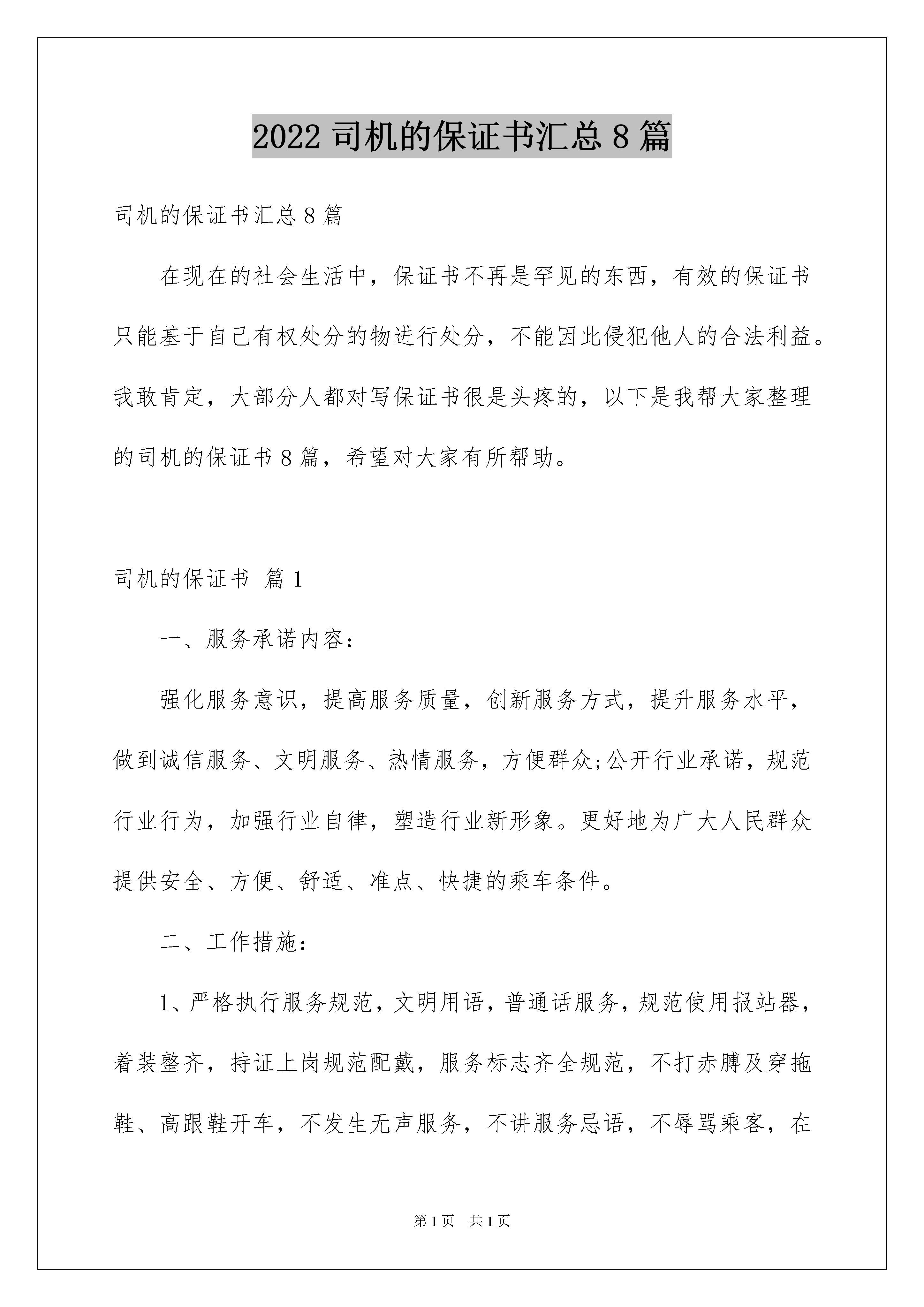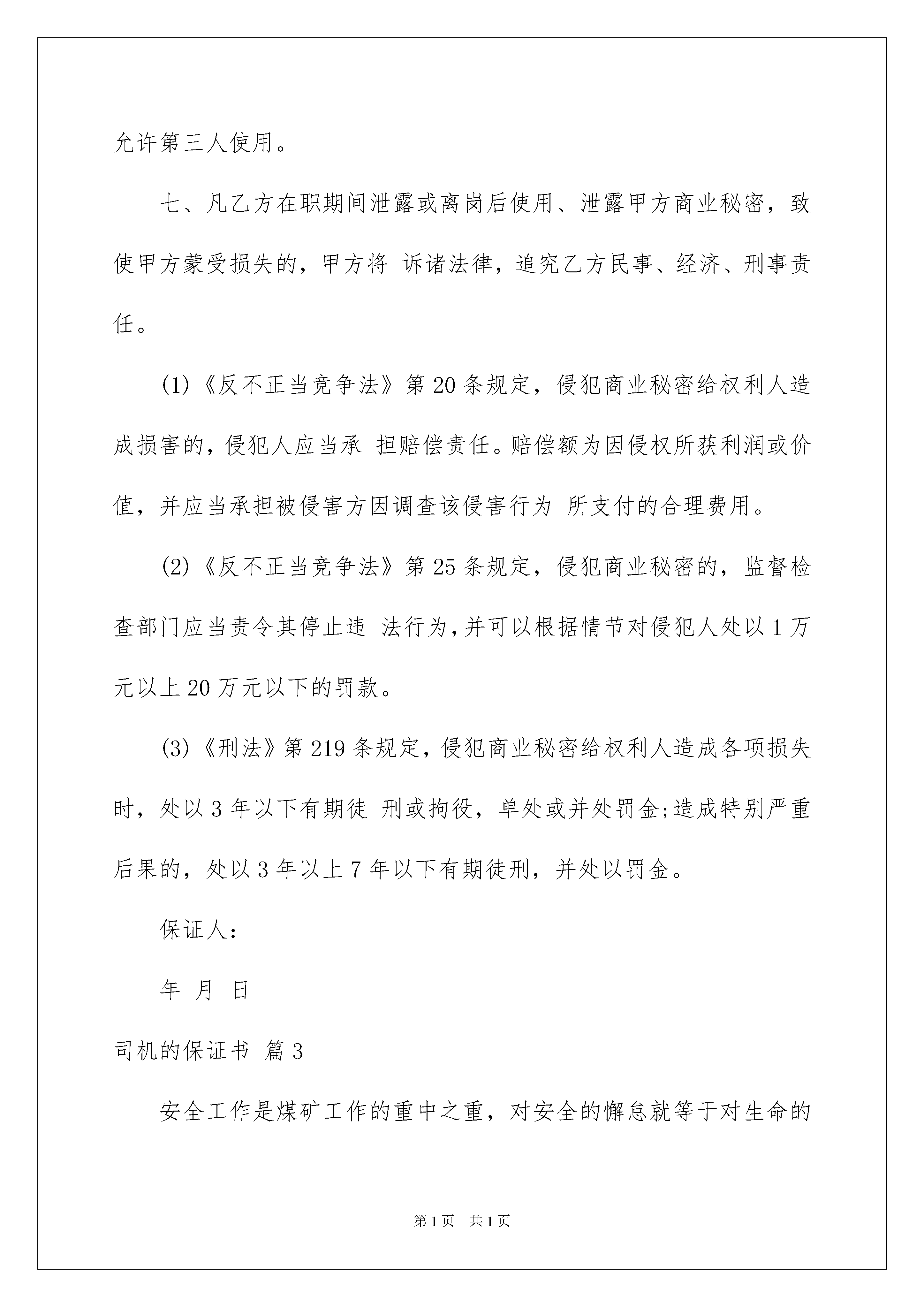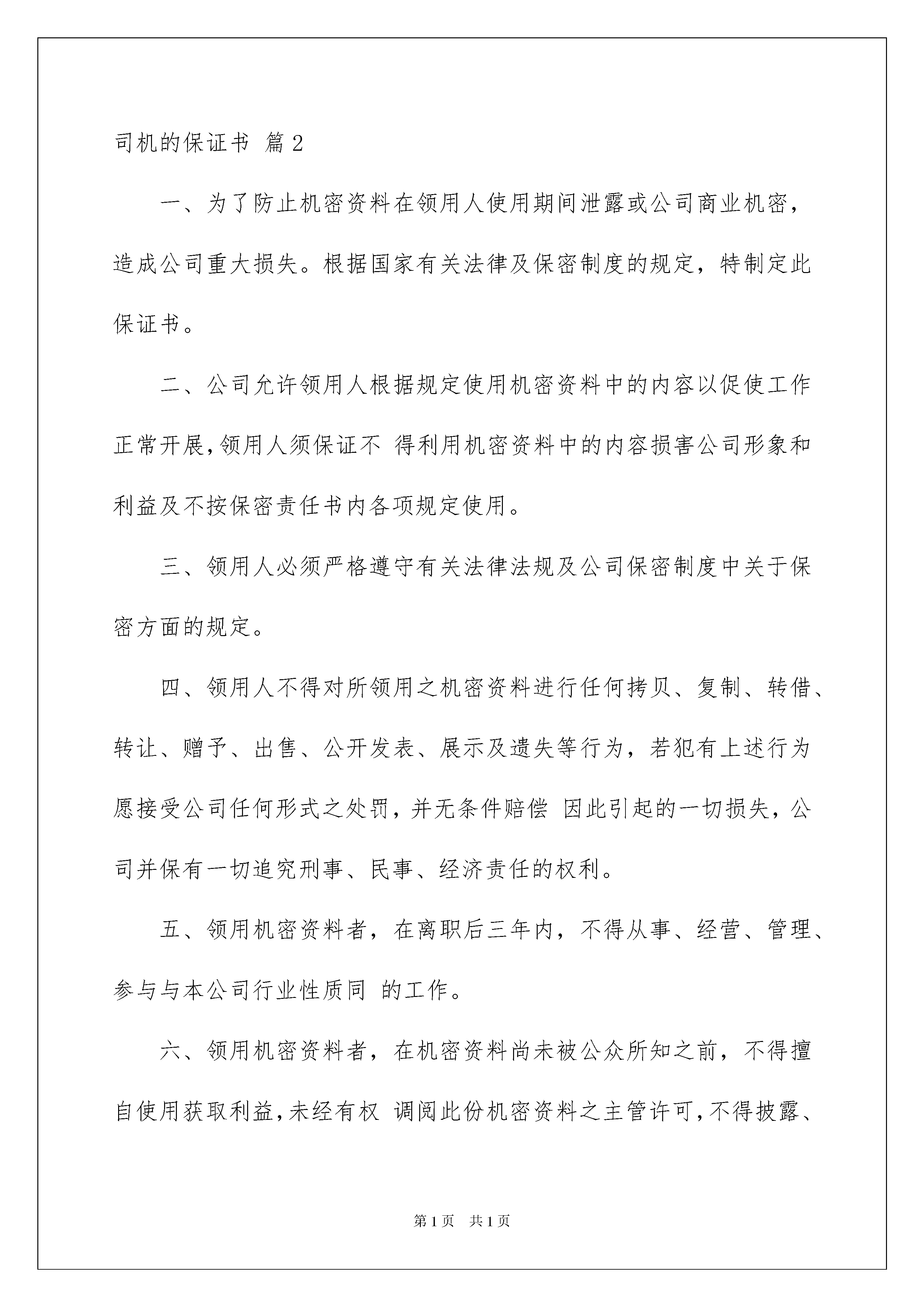 2022司机的保证书汇总8篇司机的保证书汇总8篇在现在的社会生活中,保证书不再是罕见的东西,有效的保证书只能基于自己有权处分的物进行处分,不能因此侵犯他人的合法利益。我敢肯定,大部分人都对写保证书很是头疼的,以下是我帮大家整理的司机的保证书8篇,希望对大家有所帮助。司机的保证书篇1一、服务承诺内容:强化服务意识,提高服务质量,创新服务方式,提升服务水平,做到诚信服务、文明服务、热情服务,方便群众;公开行业承诺,规范行业行为,加强行业自律,塑造行业新形象。更好地为广大人民群众提供安全、方便、舒适、准点、快捷的乘车条件。二、工作措施:1、严格执行服务规范,文明用语,普通话服务,规范使用报站器,着装整齐,持证上岗规范配戴,服务标志齐全规范,不打赤膊及穿拖鞋、高跟鞋开车,不发生无声服务,不讲服务忌语,不辱骂乘客,在营运时不打手机,不在车厢内吸烟。2、严格营运纪律,有站必停,不越线营运,不擅自改线或缩短线营运,市区内按站点停放,不开门游客、不滞站等客,进站停车安全开、关车门,确保乘客上下车安全。3、车况完好,车辆设施齐全,不带病行驶。4、在运行条件正常的情况下,正点发车,保证计划车次完成,首末班车正点率达到98%,车次正点率达到95%,正点时差每次不超过正负2分钟,遇有客运高峰,合理调度车辆,及时疏散乘客。5、车容整洁,卫生设施齐全。6、加强司乘人员的安全教育,为乘客提供一个安全的乘车环境,如发生意外,做到以人为本,积极救助,并服从有关方面的责任处理与赔偿。7、为中心城区范围符合有关文件规定的离休干部、现役、伤残、离退休军人、伤残人民警察、70岁以上老年人办理公交ic卡,持卡(证)提供免费乘车服务。8、在公交线网改造、站点设置、运营班次安排上广泛征求广大群众的意见、建议,切实做到乘客至上。三、做好监督检查工作:一是设立承诺服务热线,方便乘客和群众咨询、投诉和预约服务。热线电话为:(ic卡),对受理的诚信承诺投诉及时查实,并于3日内给予答复,10日内处理完毕。二是实行首问责任制。初次接到乘客、群众来信、来电、来访的人或部门为首问责任人。首问责任人应当热情接待,不得推诿。对不属于首问责任人本职范围内的事项,要主动与本单位有关部门联系,介绍或者引导来访者前去咨询或者投诉。对不属于本单位职责范围内的电话咨询或者投诉,一时无法解决或者解答的,应主动留下通讯办法,并立即与有关部门衔接,有关部门受理后,应立即以回电或其他形式予以答复。三是按照服务承诺内容及工作要求,公司将对各部门、各车队、各线路车辆等进行定期与不定期督促检查,坚持每月30日召开工作例会、总结和评审活动开展情况,对工作中发现的问题及时研究解决,对违诺失信和违反上级规定、并造成严重后果的视情依纪或依法处理。保证人:日期:20xx年XX月XX日司机的保证书篇2一、为了防止机密资料在领用人使用期间泄露或公司商业机密,造成公司重大损失。根据国家有关法律及保密制度的规定,特制定此保证书。二、公司允许领用人根据规定使用机密资料中的内容以促使工作正常开展,领用人须保证不得利用机密资料中的内容损害公司形象和利益及不按保密责任书内各项规定使用。三、领用人必须严格遵守有关法律法规及公司保密制度中关于保密方面的规定。四、领用人不得对所领用之机密资料进行任何拷贝、复制、转借、转让、赠予、出售、公开发表、展示及遗失等行为,若犯有上述行为愿接受公司任何形式之处罚,并无条件赔偿因此引起的一切损失,公司并保有一切追究刑事、民事、经济责任的权利。五、领用机密资料者,在离职后三年内,不得从事、经营、管理、参与与本公司行业性质同的工作。六、领用机密资料者,在机密资料尚未被公众所知之前,不得擅自使用获取利益,未经有权调阅此份机密资料之主管许可,不得披露、允许第三人使用。七、凡乙方在职期间泄露或离岗后使用、泄露甲方商业秘密,致使甲方蒙受损失的,甲方将诉诸法律,追究乙方民事、经济、刑事责任。(1)《反不正当竞争法》第20条规定,侵犯商业秘密给权利人造成损害的,侵犯人应当承担赔偿责任。赔偿额为因侵权所获利润或价值,并应当承担被侵害方因调查该侵害行为所支付的合理费用。(2)《反不正当竞争法》第25条规定,侵犯商业秘密的,监督检查部门应当责令其停止违法行为,并可以根据情节对侵犯人处以1万元以上20万元以下的罚款。(3)《刑法》第219条规定,侵犯商业秘密给权利人造成各项损失时,处以3年以下有期徒刑或拘役,单处或并处罚金;造成特别严重后果的,处以3年以上7年以下有期徒刑,并处以罚金。保证人:年月日司机的保证书篇3安全工作是煤矿工作的重中之重,对安全的懈怠就等于对生命的轻视,安全工作