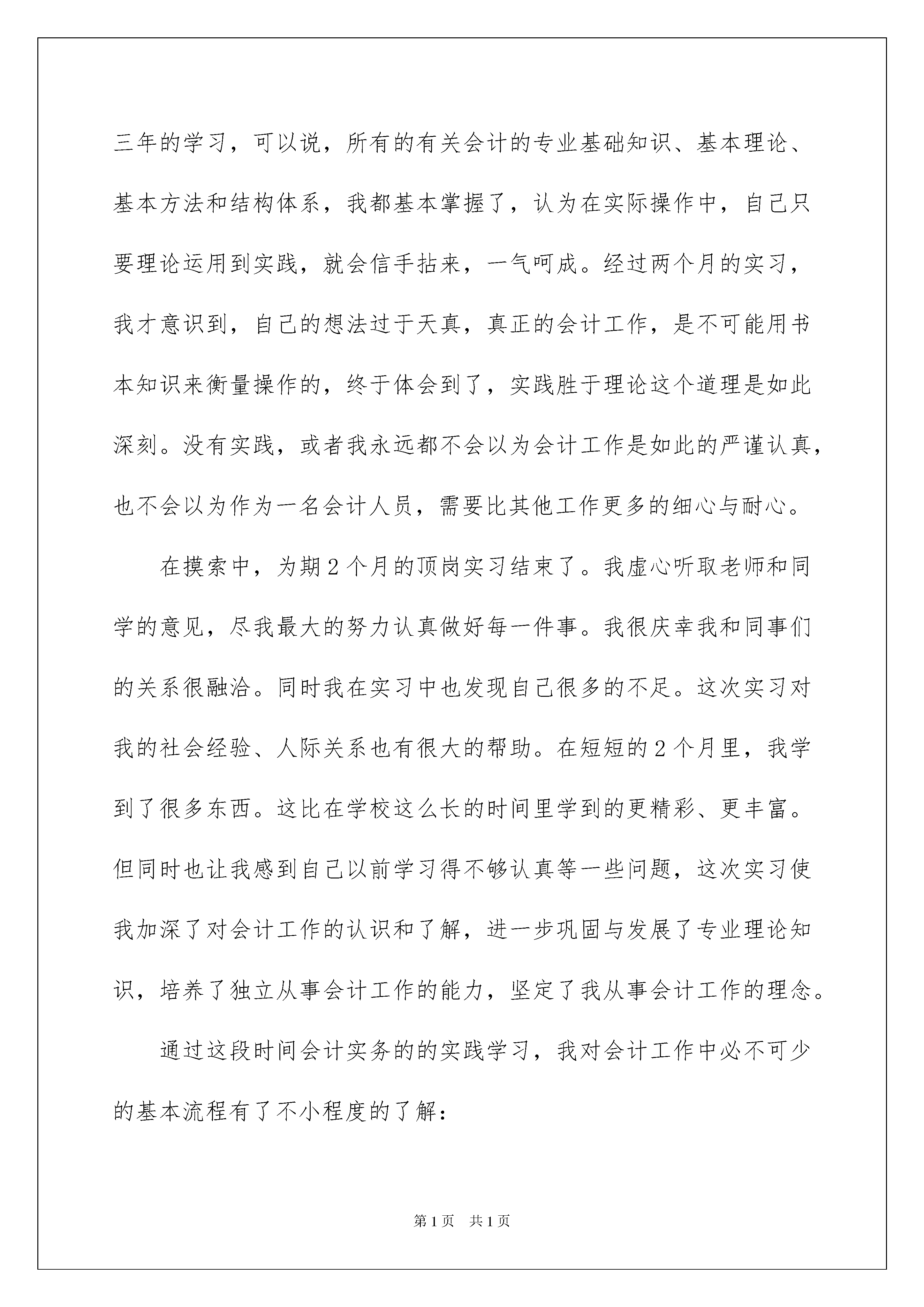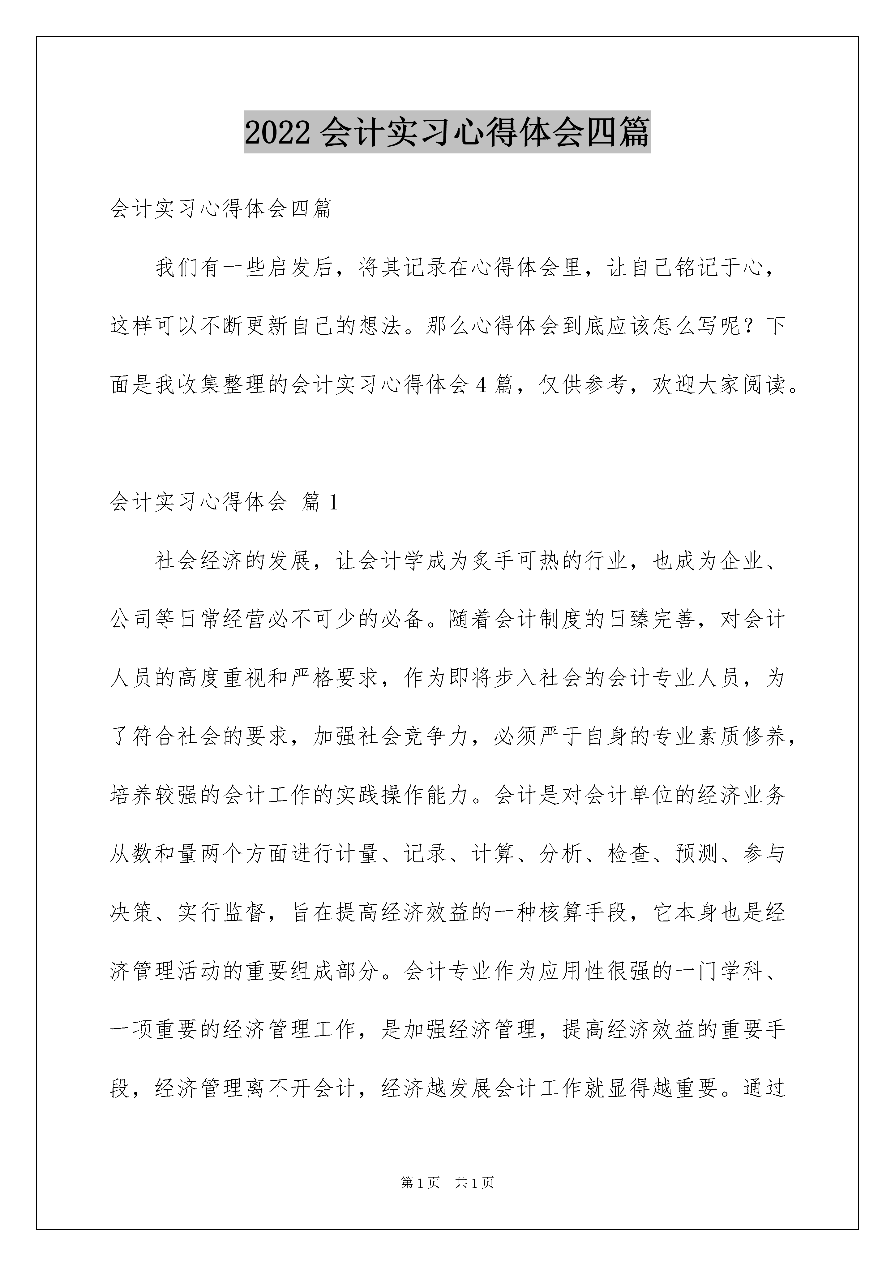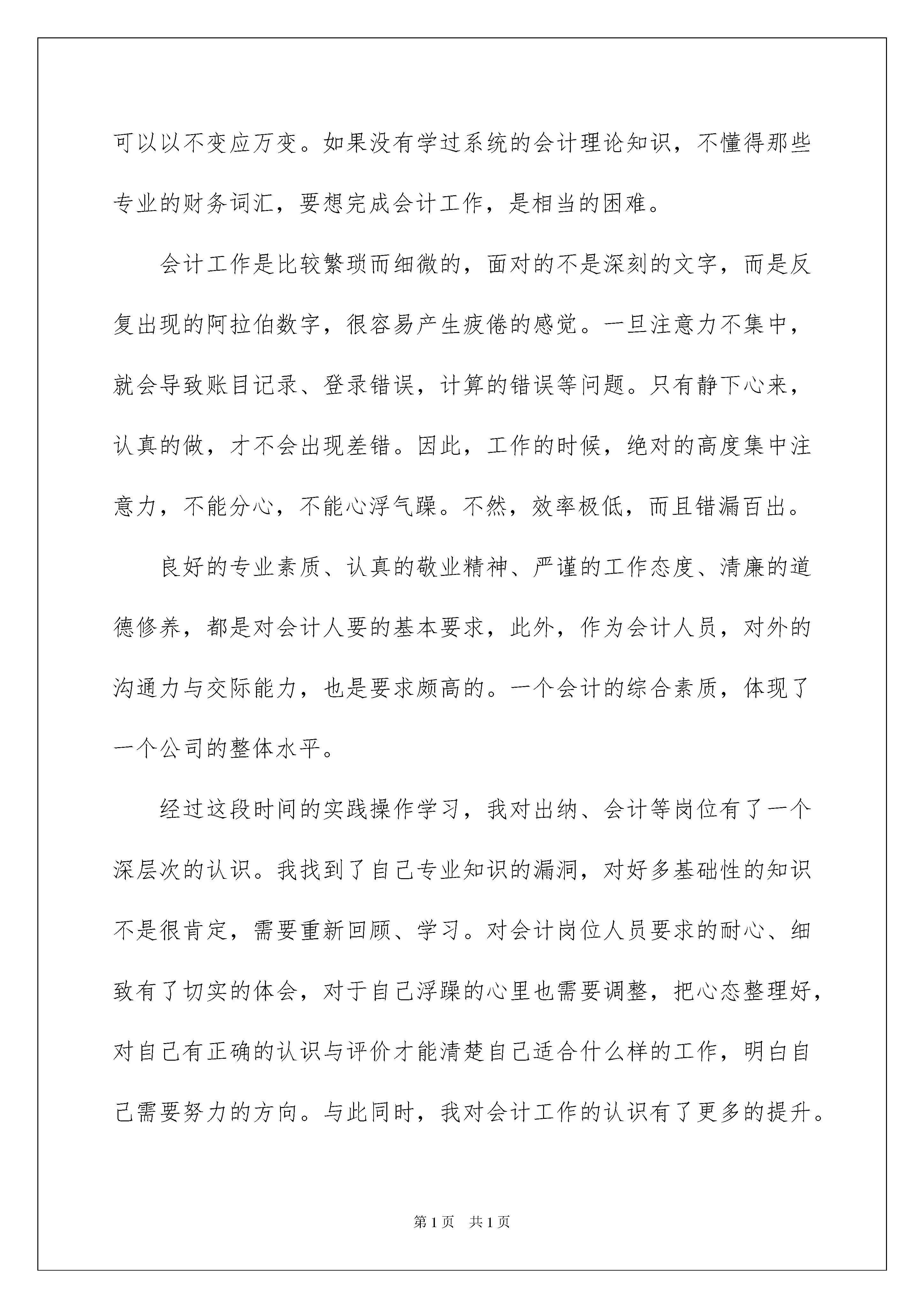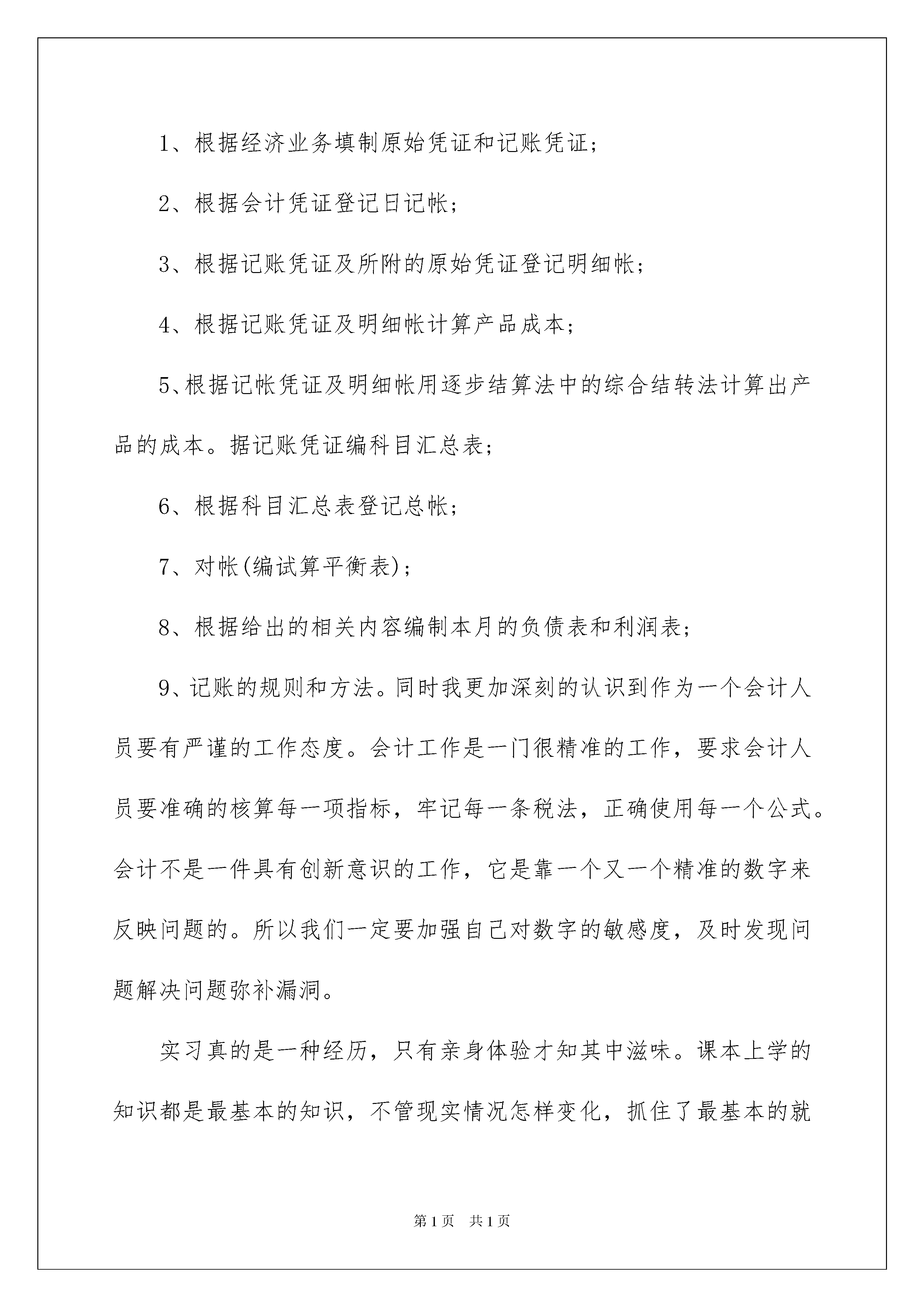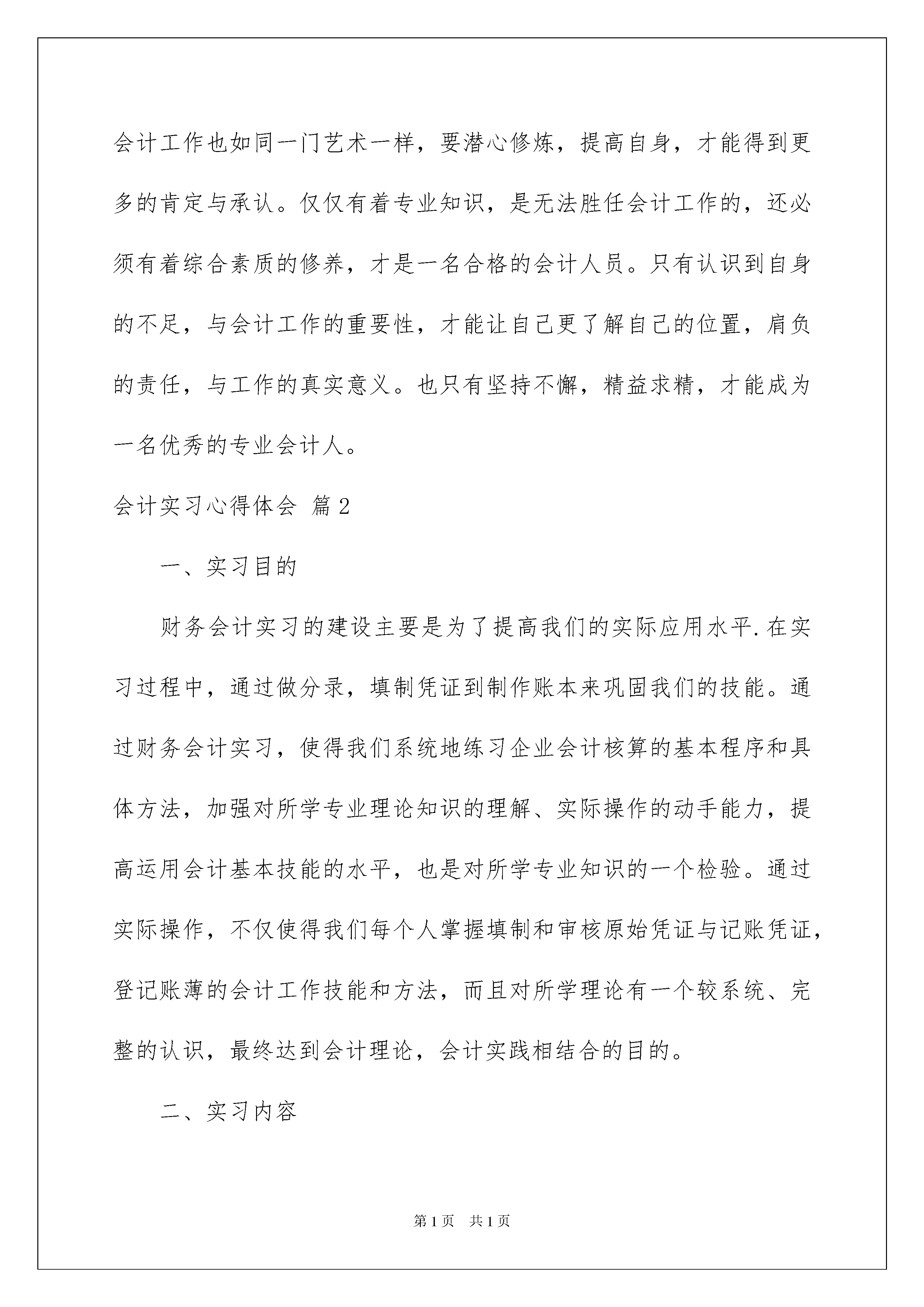 2022会计实习心得体会四篇会计实习心得体会四篇我们有一些启发后,将其记录在心得体会里,让自己铭记于心,这样可以不断更新自己的想法。那么心得体会到底应该怎么写呢?下面是我收集整理的会计实习心得体会4篇,仅供参考,欢迎大家阅读。会计实习心得体会篇1社会经济的发展,让会计学成为炙手可热的行业,也成为企业、公司等日常经营必不可少的必备。随着会计制度的日臻完善,对会计人员的高度重视和严格要求,作为即将步入社会的会计专业人员,为了符合社会的要求,加强社会竞争力,必须严于自身的专业素质修养,培养较强的会计工作的实践操作能力。会计是对会计单位的经济业务从数和量两个方面进行计量、记录、计算、分析、检查、预测、参与决策、实行监督,旨在提高经济效益的一种核算手段,它本身也是经济管理活动的重要组成部分。会计专业作为应用性很强的一门学科、一项重要的经济管理工作,是加强经济管理,提高经济效益的重要手段,经济管理离不开会计,经济越发展会计工作就显得越重要。通过三年的学习,可以说,所有的有关会计的专业基础知识、基本理论、基本方法和结构体系,我都基本掌握了,认为在实际操作中,自己只要理论运用到实践,就会信手拈来,一气呵成。经过两个月的实习,我才意识到,自己的想法过于天真,真正的会计工作,是不可能用书本知识来衡量操作的,终于体会到了,实践胜于理论这个道理是如此深刻。没有实践,或者我永远都不会以为会计工作是如此的严谨认真,也不会以为作为一名会计人员,需要比其他工作更多的细心与耐心。在摸索中,为期2个月的顶岗实习结束了。我虚心听取老师和同学的意见,尽我最大的努力认真做好每一件事。我很庆幸我和同事们的关系很融洽。同时我在实习中也发现自己很多的不足。这次实习对我的社会经验、人际关系也有很大的帮助。在短短的2个月里,我学到了很多东西。这比在学校这么长的时间里学到的更精彩、更丰富。但同时也让我感到自己以前学习得不够认真等一些问题,这次实习使我加深了对会计工作的认识和了解,进一步巩固与发展了专业理论知识,培养了独立从事会计工作的能力,坚定了我从事会计工作的理念。通过这段时间会计实务的的实践学习,我对会计工作中必不可少的基本流程有了不小程度的了解:1、根据经济业务填制原始凭证和记账凭证;2、根据会计凭证登记日记帐;3、根据记账凭证及所附的原始凭证登记明细帐;4、根据记账凭证及明细帐计算产品成本;5、根据记帐凭证及明细帐用逐步结算法中的综合结转法计算出产品的成本。据记账凭证编科目汇总表;6、根据科目汇总表登记总帐;7、对帐(编试算平衡表);8、根据给出的相关内容编制本月的负债表和利润表;9、记账的规则和方法。同时我更加深刻的认识到作为一个会计人员要有严谨的工作态度。会计工作是一门很精准的工作,要求会计人员要准确的核算每一项指标,牢记每一条税法,正确使用每一个公式。会计不是一件具有创新意识的工作,它是靠一个又一个精准的数字来反映问题的。所以我们一定要加强自己对数字的敏感度,及时发现问题解决问题弥补漏洞。实习真的是一种经历,只有亲身体验才知其中滋味。课本上学的知识都是最基本的知识,不管现实情况怎样变化,抓住了最基本的就可以以不变应万变。如果没有学过系统的会计理论知识,不懂得那些专业的财务词汇,要想完成会计工作,是相当的困难。会计工作是比较繁琐而细微的,面对的不是深刻的文字,而是反复出现的阿拉伯数字,很容易产生疲倦的感觉。一旦注意力不集中,就会导致账目记录、登录错误,计算的错误等问题。只有静下心来,认真的做,才不会出现差错。因此,工作的时候,绝对的高度集中注意力,不能分心,不能心浮气躁。不然,效率极低,而且错漏百出。良好的专业素质、认真的敬业精神、严谨的工作态度、清廉的道德修养,都是对会计人要的基本要求,此外,作为会计人员,对外的沟通力与交际能力,也是要求颇高的。一个会计的综合素质,体现了一个公司的整体水平。经过这段时间的实践操作学习,我对出纳、会计等岗位有了一个深层次的认识。我找到了自己专业知识的漏洞,对好多基础性的知识不是很肯定,需要重新回顾、学习。对会计岗位人员要求的耐心、细致有了切实的体会,对于自己浮躁的心里也需要调整,把心态整理好,对自己有正确的认识与评价才能清楚自己适合什么样的工作,明白自己需要努力的方向。与此同时,我对会计工作的认识有了更多的提升。会计工作也如同一门艺术一样,要潜心修炼,提高自身,才能得到更多的肯定与承认。仅仅有着专业知识,是无法胜任会计工作的,还必须有着综合素质的修养,才是一名合格的会计人员。只有认识到自身的不足,与会计工作的重要性,才能让自己更了解自己的位置,肩负的责任,与工作的真实意义。也只有