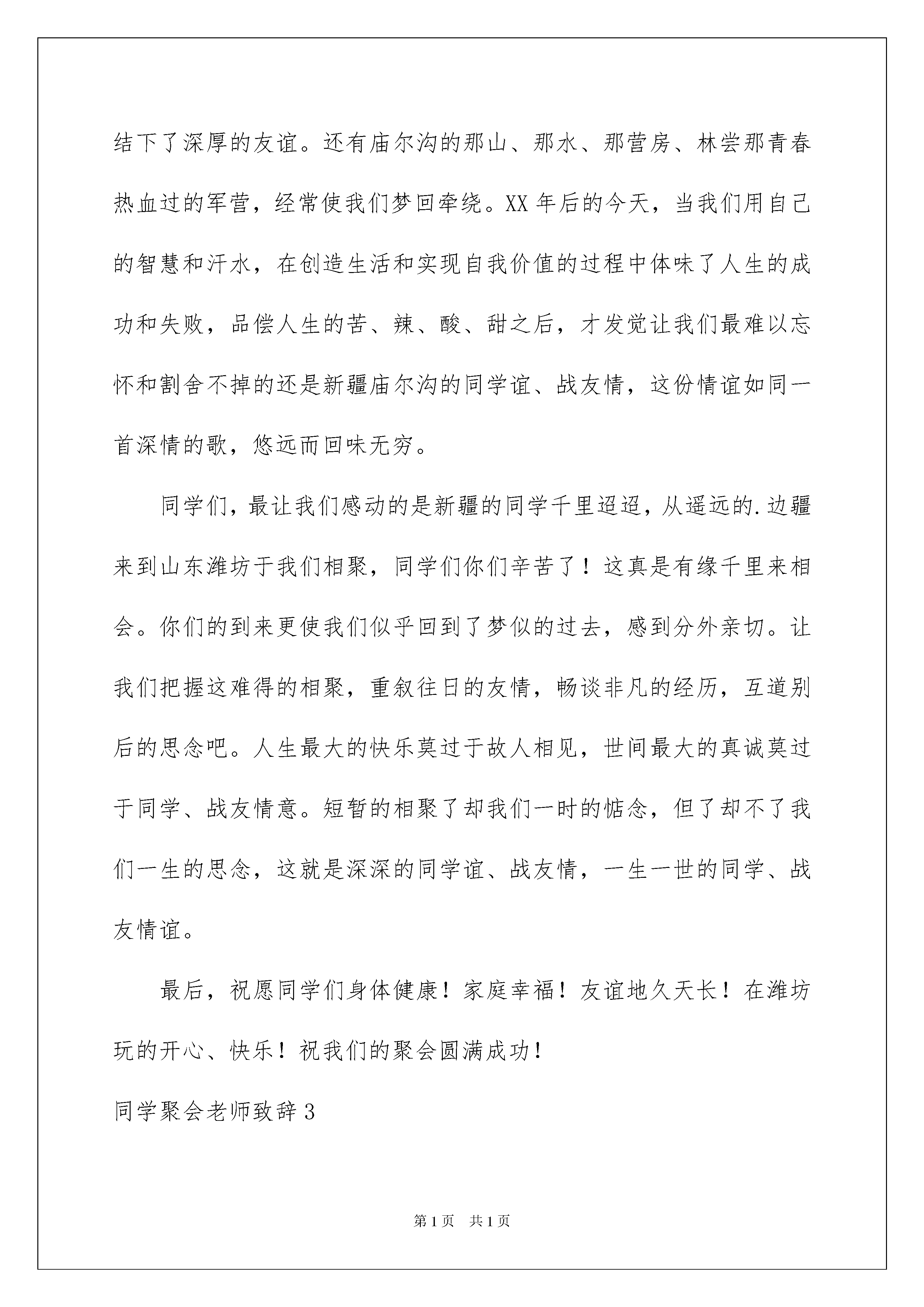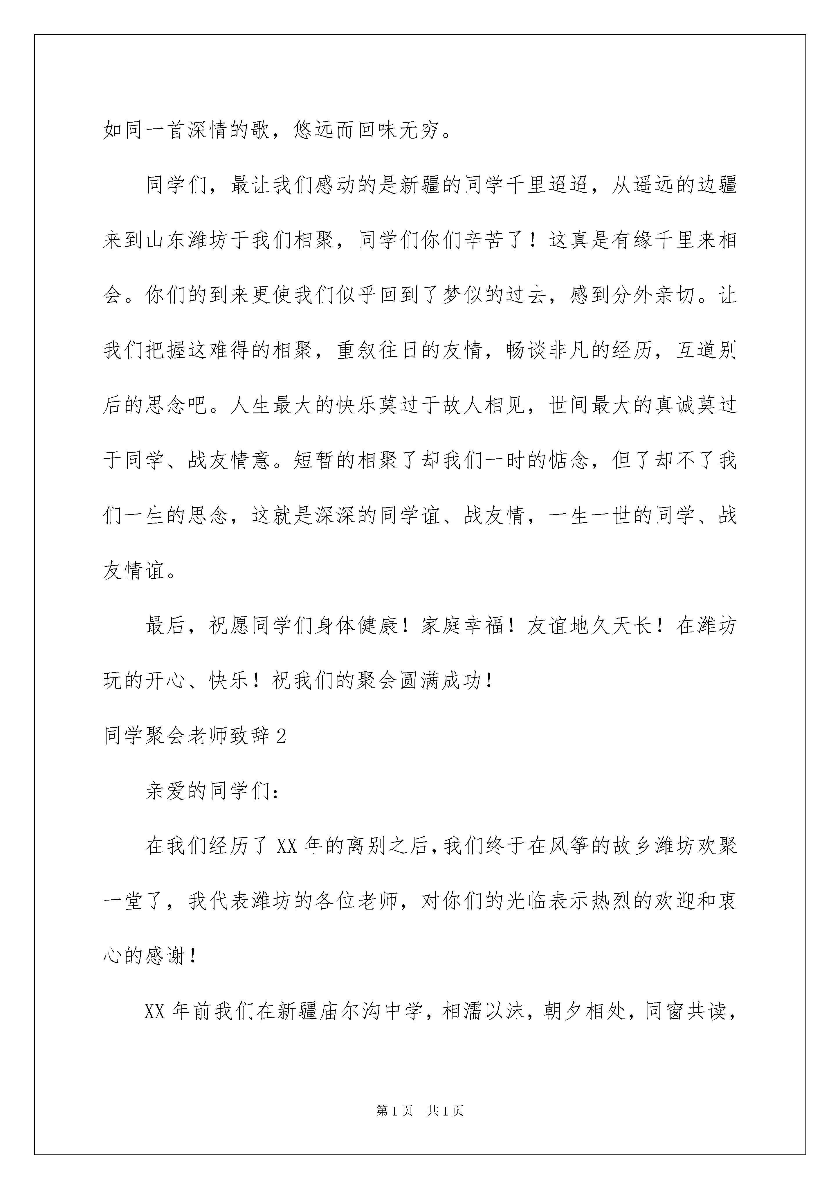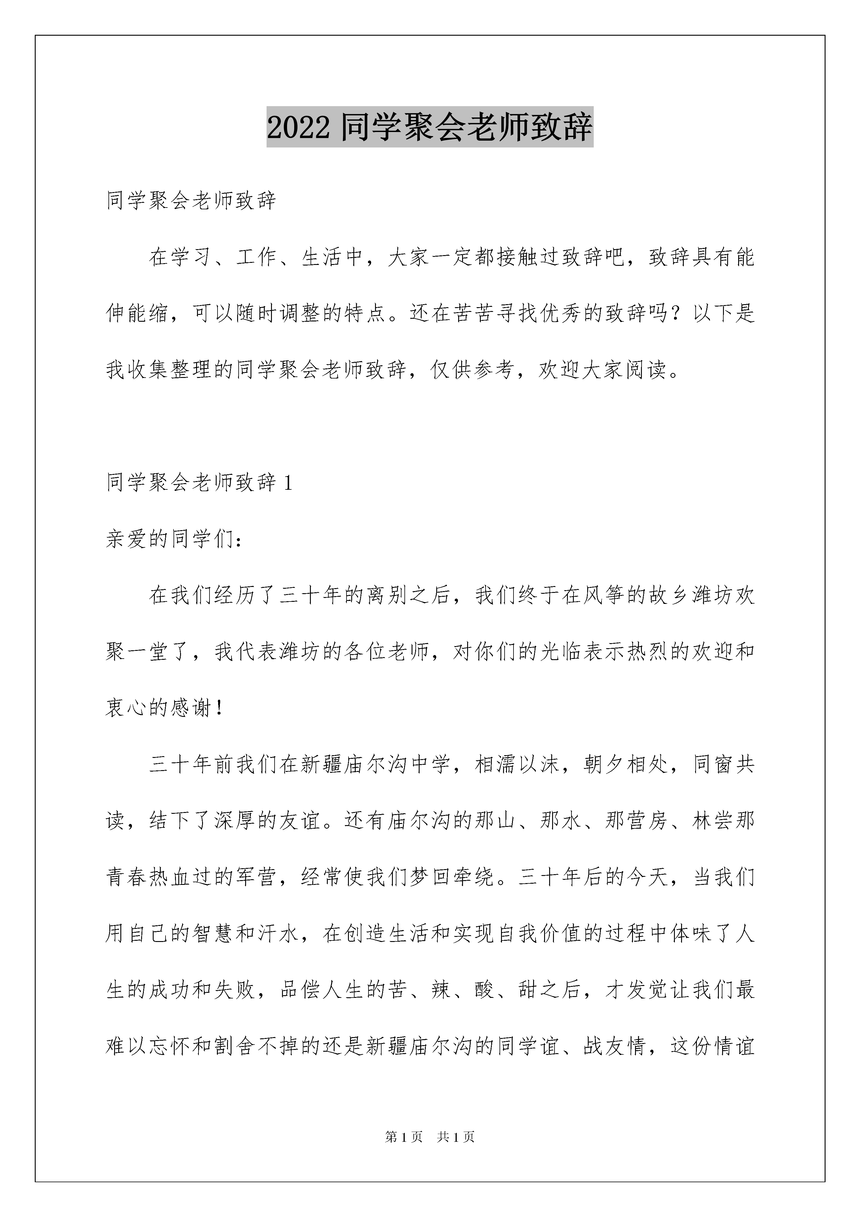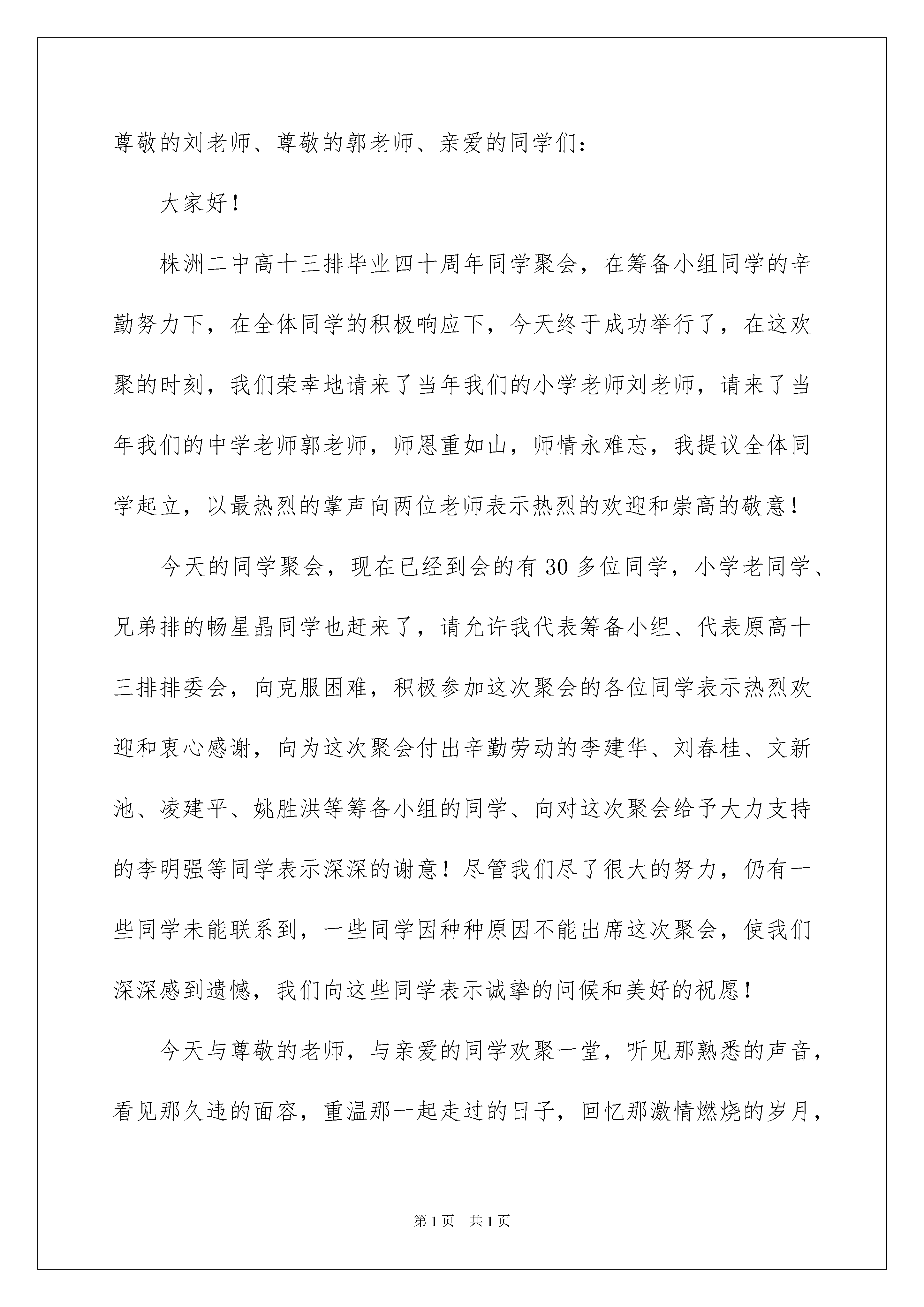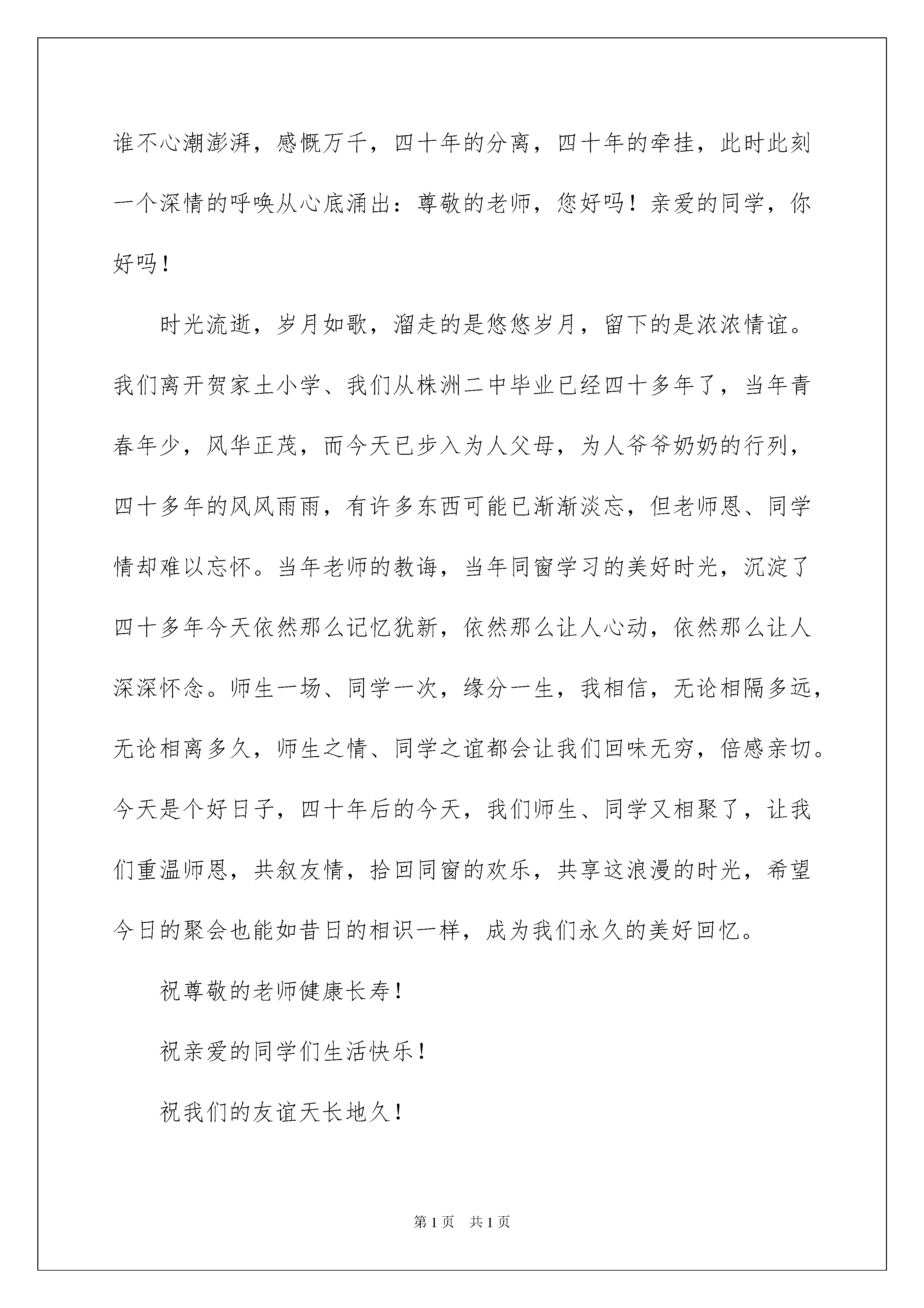 2022同学聚会老师致辞同学聚会老师致辞在学习、工作、生活中,大家一定都接触过致辞吧,致辞具有能伸能缩,可以随时调整的特点。还在苦苦寻找优秀的致辞吗?以下是我收集整理的同学聚会老师致辞,仅供参考,欢迎大家阅读。同学聚会老师致辞1亲爱的同学们:在我们经历了三十年的离别之后,我们终于在风筝的故乡潍坊欢聚一堂了,我代表潍坊的各位老师,对你们的光临表示热烈的欢迎和衷心的感谢!三十年前我们在新疆庙尔沟中学,相濡以沫,朝夕相处,同窗共读,结下了深厚的友谊。还有庙尔沟的那山、那水、那营房、林尝那青春热血过的军营,经常使我们梦回牵绕。三十年后的今天,当我们用自己的智慧和汗水,在创造生活和实现自我价值的过程中体味了人生的成功和失败,品偿人生的苦、辣、酸、甜之后,才发觉让我们最难以忘怀和割舍不掉的还是新疆庙尔沟的同学谊、战友情,这份情谊如同一首深情的歌,悠远而回味无穷。同学们,最让我们感动的是新疆的同学千里迢迢,从遥远的边疆来到山东潍坊于我们相聚,同学们你们辛苦了!这真是有缘千里来相会。你们的到来更使我们似乎回到了梦似的过去,感到分外亲切。让我们把握这难得的相聚,重叙往日的友情,畅谈非凡的经历,互道别后的思念吧。人生最大的快乐莫过于故人相见,世间最大的真诚莫过于同学、战友情意。短暂的相聚了却我们一时的惦念,但了却不了我们一生的思念,这就是深深的同学谊、战友情,一生一世的同学、战友情谊。最后,祝愿同学们身体健康!家庭幸福!友谊地久天长!在潍坊玩的开心、快乐!祝我们的聚会圆满成功!同学聚会老师致辞2亲爱的同学们:在我们经历了XX年的离别之后,我们终于在风筝的故乡潍坊欢聚一堂了,我代表潍坊的各位老师,对你们的光临表示热烈的欢迎和衷心的感谢!XX年前我们在新疆庙尔沟中学,相濡以沫,朝夕相处,同窗共读,结下了深厚的友谊。还有庙尔沟的那山、那水、那营房、林尝那青春热血过的军营,经常使我们梦回牵绕。XX年后的今天,当我们用自己的智慧和汗水,在创造生活和实现自我价值的过程中体味了人生的成功和失败,品偿人生的苦、辣、酸、甜之后,才发觉让我们最难以忘怀和割舍不掉的还是新疆庙尔沟的同学谊、战友情,这份情谊如同一首深情的歌,悠远而回味无穷。同学们,最让我们感动的是新疆的同学千里迢迢,从遥远的.边疆来到山东潍坊于我们相聚,同学们你们辛苦了!这真是有缘千里来相会。你们的到来更使我们似乎回到了梦似的过去,感到分外亲切。让我们把握这难得的相聚,重叙往日的友情,畅谈非凡的经历,互道别后的思念吧。人生最大的快乐莫过于故人相见,世间最大的真诚莫过于同学、战友情意。短暂的相聚了却我们一时的惦念,但了却不了我们一生的思念,这就是深深的同学谊、战友情,一生一世的同学、战友情谊。最后,祝愿同学们身体健康!家庭幸福!友谊地久天长!在潍坊玩的开心、快乐!祝我们的聚会圆满成功!同学聚会老师致辞3尊敬的刘老师、尊敬的郭老师、亲爱的同学们:大家好!株洲二中高十三排毕业四十周年同学聚会,在筹备小组同学的辛勤努力下,在全体同学的积极响应下,今天终于成功举行了,在这欢聚的时刻,我们荣幸地请来了当年我们的小学老师刘老师,请来了当年我们的中学老师郭老师,师恩重如山,师情永难忘,我提议全体同学起立,以最热烈的掌声向两位老师表示热烈的欢迎和崇高的敬意!今天的同学聚会,现在已经到会的有30多位同学,小学老同学、兄弟排的畅星晶同学也赶来了,请允许我代表筹备小组、代表原高十三排排委会,向克服困难,积极参加这次聚会的各位同学表示热烈欢迎和衷心感谢,向为这次聚会付出辛勤劳动的李建华、刘春桂、文新池、凌建平、姚胜洪等筹备小组的同学、向对这次聚会给予大力支持的李明强等同学表示深深的谢意!尽管我们尽了很大的努力,仍有一些同学未能联系到,一些同学因种种原因不能出席这次聚会,使我们深深感到遗憾,我们向这些同学表示诚挚的问候和美好的祝愿!今天与尊敬的老师,与亲爱的同学欢聚一堂,听见那熟悉的声音,看见那久违的面容,重温那一起走过的日子,回忆那激情燃烧的岁月,谁不心潮澎湃,感慨万千,四十年的分离,四十年的牵挂,此时此刻一个深情的呼唤从心底涌出:尊敬的老师,您好吗!亲爱的同学,你好吗!时光流逝,岁月如歌,溜走的是悠悠岁月,留下的是浓浓情谊。我们离开贺家土小学、我们从株洲二中毕业已经四十多年了,当年青春年少,风华正茂,而今天已步入为人父母,为人爷爷奶奶的行列,四十多年的风风雨雨,有许多东西可能已渐渐淡忘,但老师恩、同学情却难以忘怀。当年老师的教诲,当年同窗学习的美好时光,沉淀了四十多年今天依然那么记忆犹新,依然那么让人心动,依然那么让人深深怀念。师生一场、同学一次,缘分一生,我相信,无论相