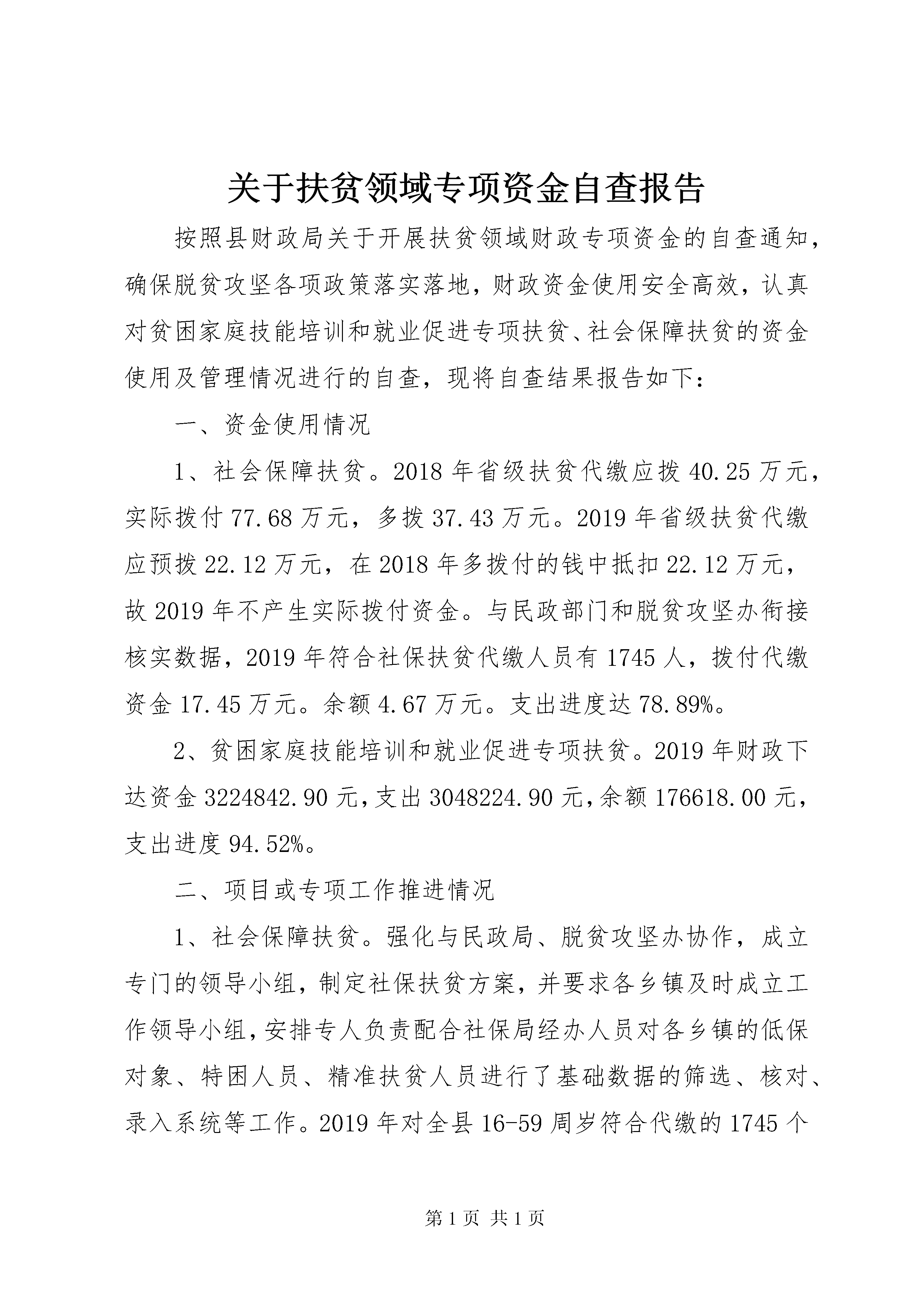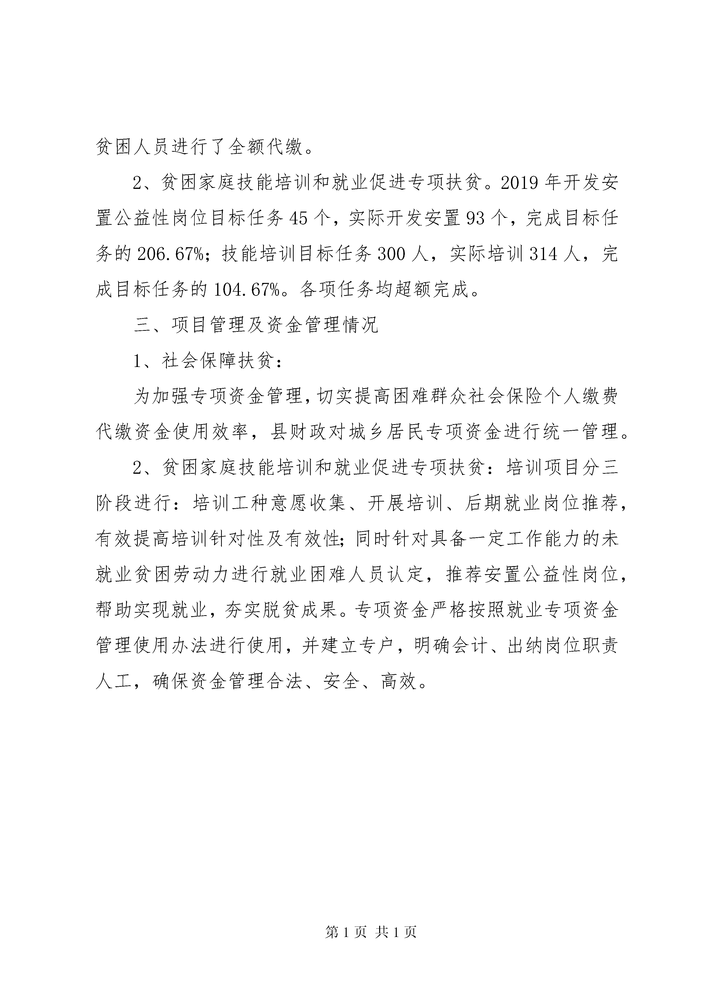 关于扶贫领域专项资金自查报告按照县财政局关于开展扶贫领域财政专项资金的自查通知,确保脱贫攻坚各项政策落实落地,财政资金使用安全高效,认真对贫困家庭技能培训和就业促进专项扶贫、社会保障扶贫的资金使用及管理情况进行的自查,现将自查结果报告如下:一、资金使用情况1、社会保障扶贫。2018年省级扶贫代缴应拨40.25万元,实际拨付77.68万元,多拨37.43万元。2019年省级扶贫代缴应预拨22.12万元,在2018年多拨付的钱中抵扣22.12万元,故2019年不产生实际拨付资金。与民政部门和脱贫攻坚办衔接核实数据,2019年符合社保扶贫代缴人员有1745人,拨付代缴资金17.45万元。余额4.67万元。支出进度达78.89%。2、贫困家庭技能培训和就业促进专项扶贫。2019年财政下达资金3224842.90元,支出3048224.90元,余额176618.00元,支出进度94.52%。二、项目或专项工作推进情况1、社会保障扶贫。强化与民政局、脱贫攻坚办协作,成立专门的领导小组,制定社保扶贫方案,并要求各乡镇及时成立工作领导小组,安排专人负责配合社保局经办人员对各乡镇的低保对象、特困人员、精准扶贫人员进行了基础数据的筛选、核对、录入系统等工作。2019年对全县16-59周岁符合代缴的1745个贫困人员进行了全额代缴。2、贫困家庭技能培训和就业促进专项扶贫。2019年开发安置公益性岗位目标任务45个,实际开发安置93个,完成目标任务的206.67%;技能培训目标任务300人,实际培训314人,完成目标任务的104.67%。各项任务均超额完成。三、项目管理及资金管理情况1、社会保障扶贫:为加强专项资金管理,切实提高困难群众社会保险个人缴费代缴资金使用效率,县财政对城乡居民专项资金进行统一管理。2、贫困家庭技能培训和就业促进专项扶贫:培训项目分三阶段进行:培训工种意愿收集、开展培训、后期就业岗位推荐,有效提高培训针对性及有效性;同时针对具备一定工作能力的未就业贫困劳动力进行就业困难人员认定,推荐安置公益性岗位,帮助实现就业,夯实脱贫成果。专项资金严格按照就业专项资金管理使用办法进行使用,并建立专户,明确会计、出纳岗位职责人工,确保资金管理合法、安全、高效。