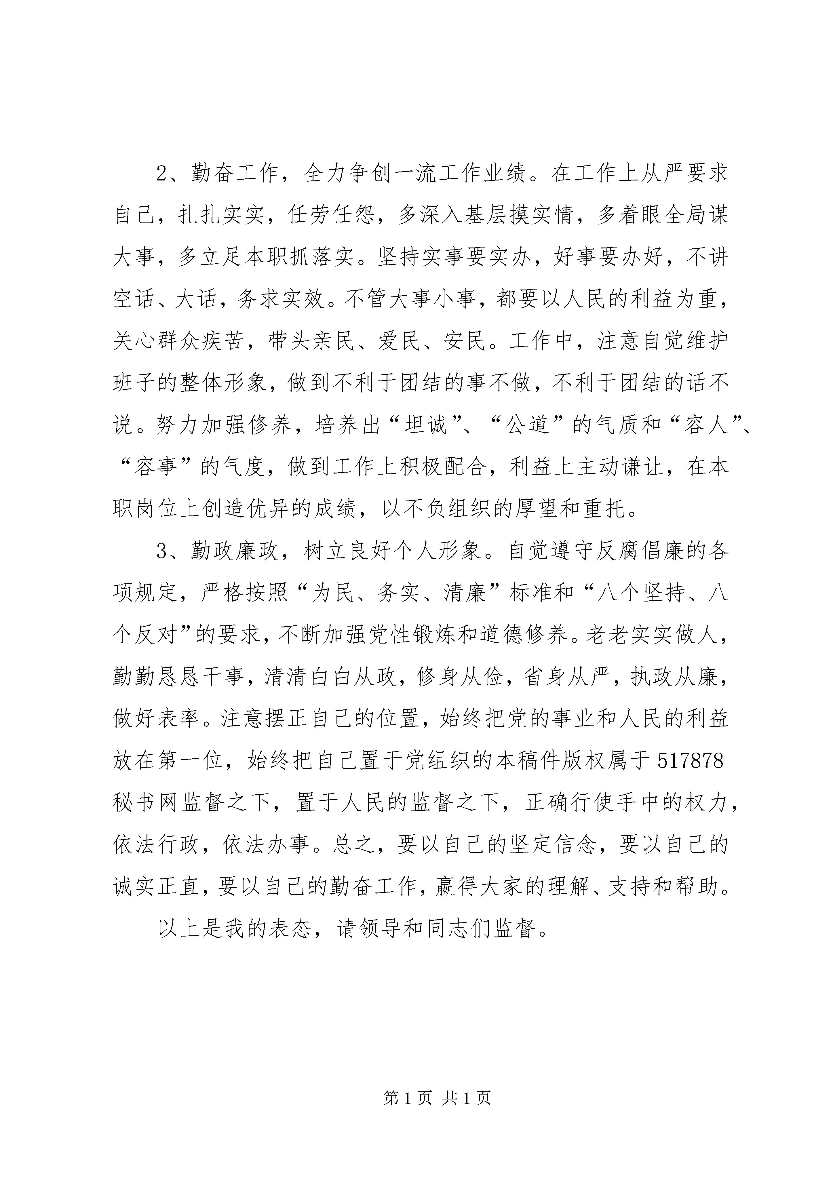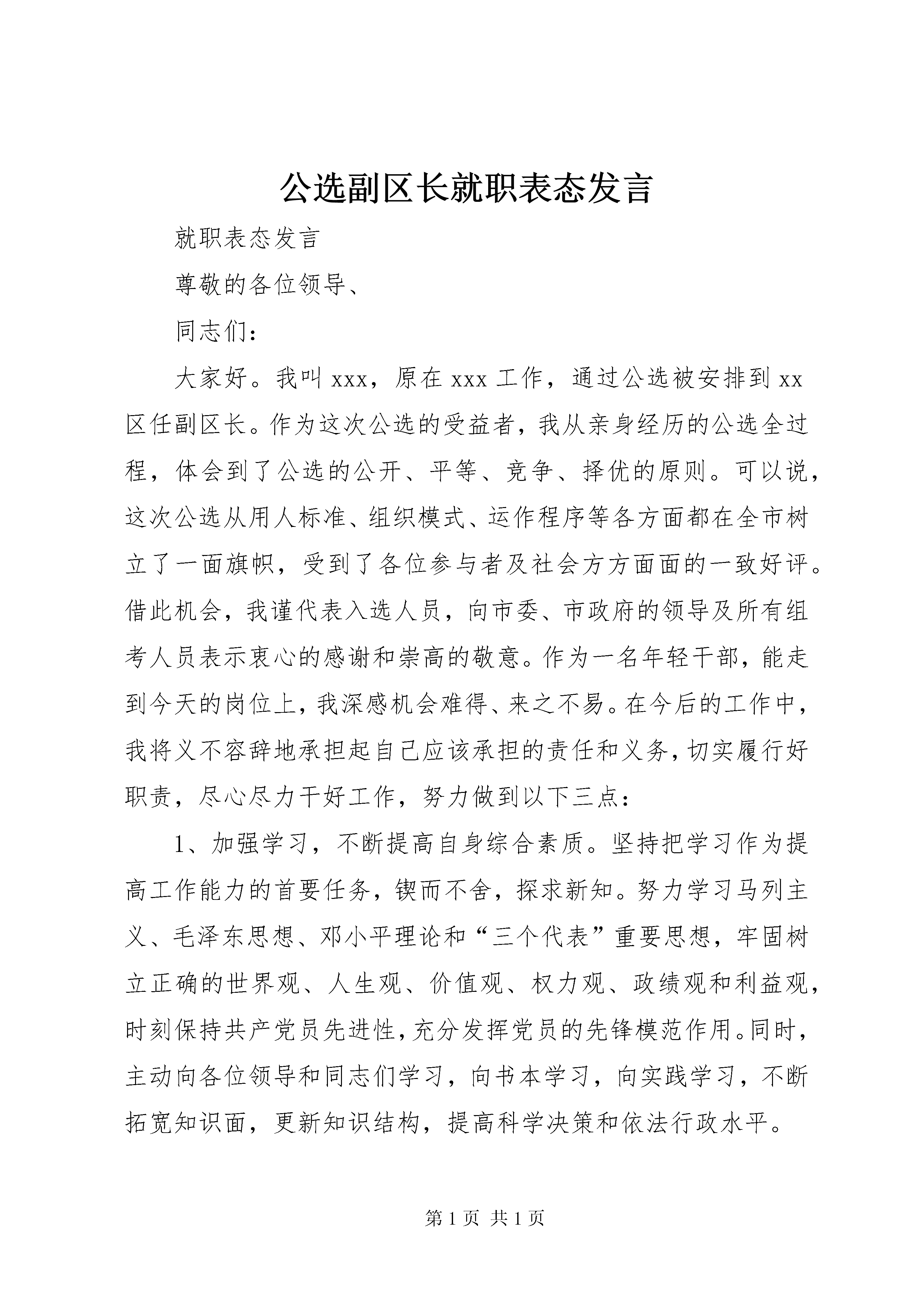 公选副区长就职表态发言就职表态发言尊敬的各位领导、同志们:大家好。我叫xxx,原在xxx工作,通过公选被安排到xx区任副区长。作为这次公选的受益者,我从亲身经历的公选全过程,体会到了公选的公开、平等、竞争、择优的原则。可以说,这次公选从用人标准、组织模式、运作程序等各方面都在全市树立了一面旗帜,受到了各位参与者及社会方方面面的一致好评。借此机会,我谨代表入选人员,向市委、市政府的领导及所有组考人员表示衷心的感谢和崇高的敬意。作为一名年轻干部,能走到今天的岗位上,我深感机会难得、来之不易。在今后的工作中,我将义不容辞地承担起自己应该承担的责任和义务,切实履行好职责,尽心尽力干好工作,努力做到以下三点:1、加强学习,不断提高自身综合素质。坚持把学习作为提高工作能力的首要任务,锲而不舍,探求新知。努力学习马列主义、毛泽东思想、邓小平理论和“三个代表”重要思想,牢固树立正确的世界观、人生观、价值观、权力观、政绩观和利益观,时刻保持共产党员先进性,充分发挥党员的先锋模范作用。同时,主动向各位领导和同志们学习,向书本学习,向实践学习,不断拓宽知识面,更新知识结构,提高科学决策和依法行政水平。2、勤奋工作,全力争创一流工作业绩。在工作上从严要求自己,扎扎实实,任劳任怨,多深入基层摸实情,多着眼全局谋大事,多立足本职抓落实。坚持实事要实办,好事要办好,不讲空话、大话,务求实效。不管大事小事,都要以人民的利益为重,关心群众疾苦,带头亲民、爱民、安民。工作中,注意自觉维护班子的整体形象,做到不利于团结的事不做,不利于团结的话不说。努力加强修养,培养出“坦诚”、“公道”的气质和“容人”、“容事”的气度,做到工作上积极配合,利益上主动谦让,在本职岗位上创造优异的成绩,以不负组织的厚望和重托。3、勤政廉政,树立良好个人形象。自觉遵守反腐倡廉的各项规定,严格按照“为民、务实、清廉”标准和“八个坚持、八个反对”的要求,不断加强党性锻炼和道德修养。老老实实做人,勤勤恳恳干事,清清白白从政,修身从俭,省身从严,执政从廉,做好表率。注意摆正自己的位置,始终把党的事业和人民的利益放在第一位,始终把自己置于党组织的本稿件版权属于517878秘书网监督之下,置于人民的监督之下,正确行使手中的权力,依法行政,依法办事。总之,要以自己的坚定信念,要以自己的诚实正直,要以自己的勤奋工作,嬴得大家的理解、支持和帮助。以上是我的表态,请领导和同志们监督。