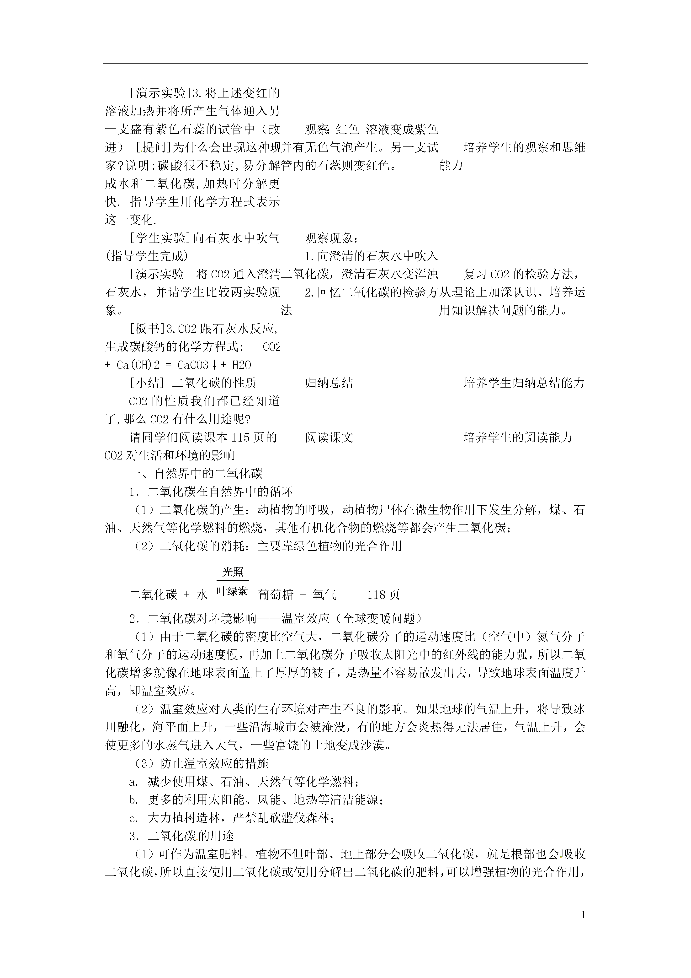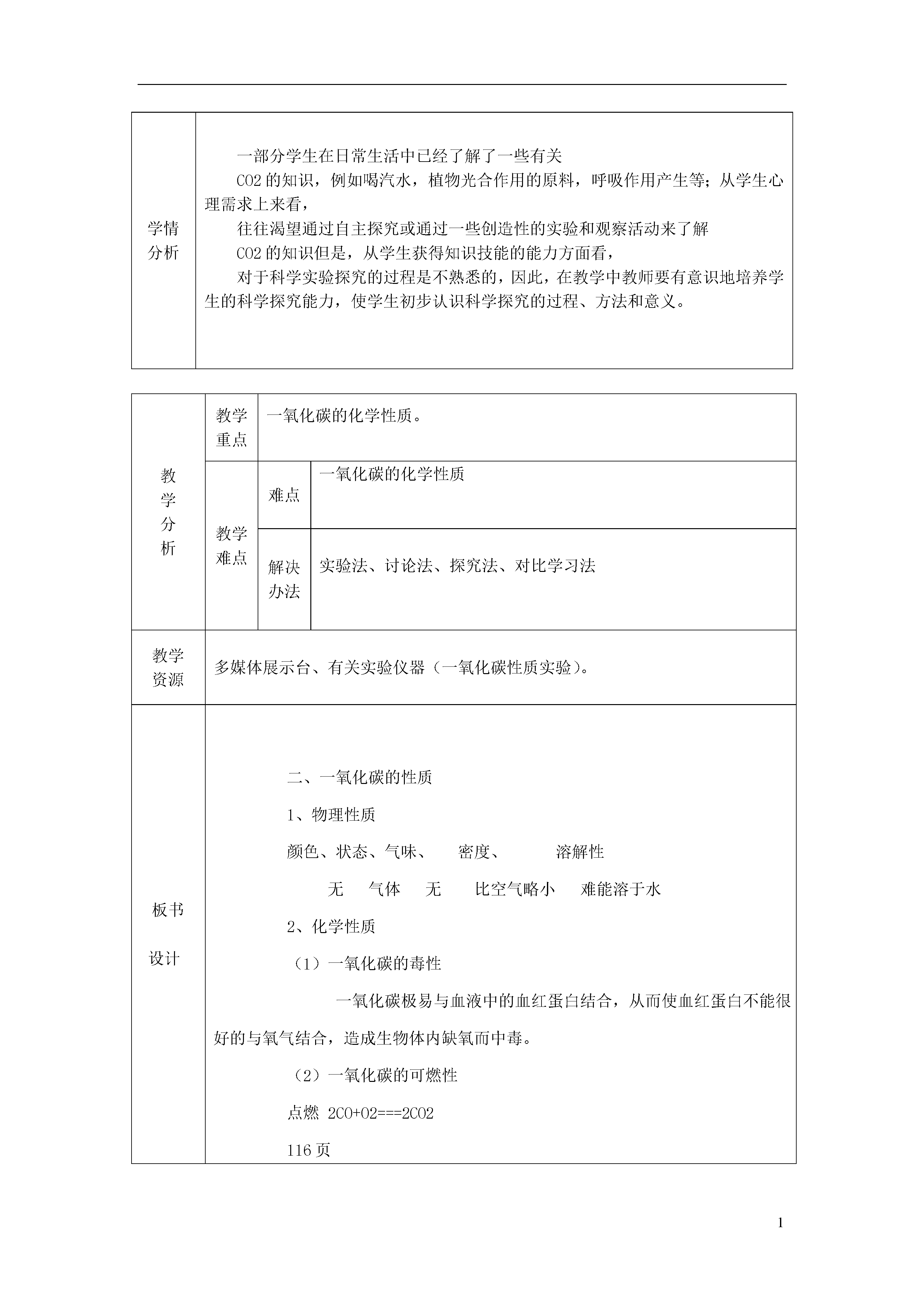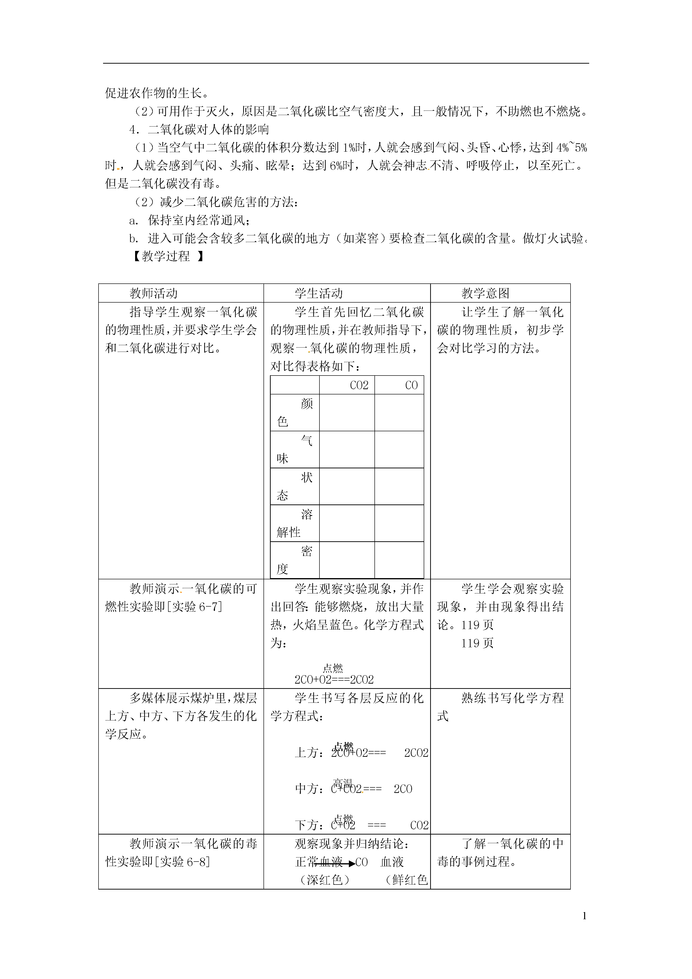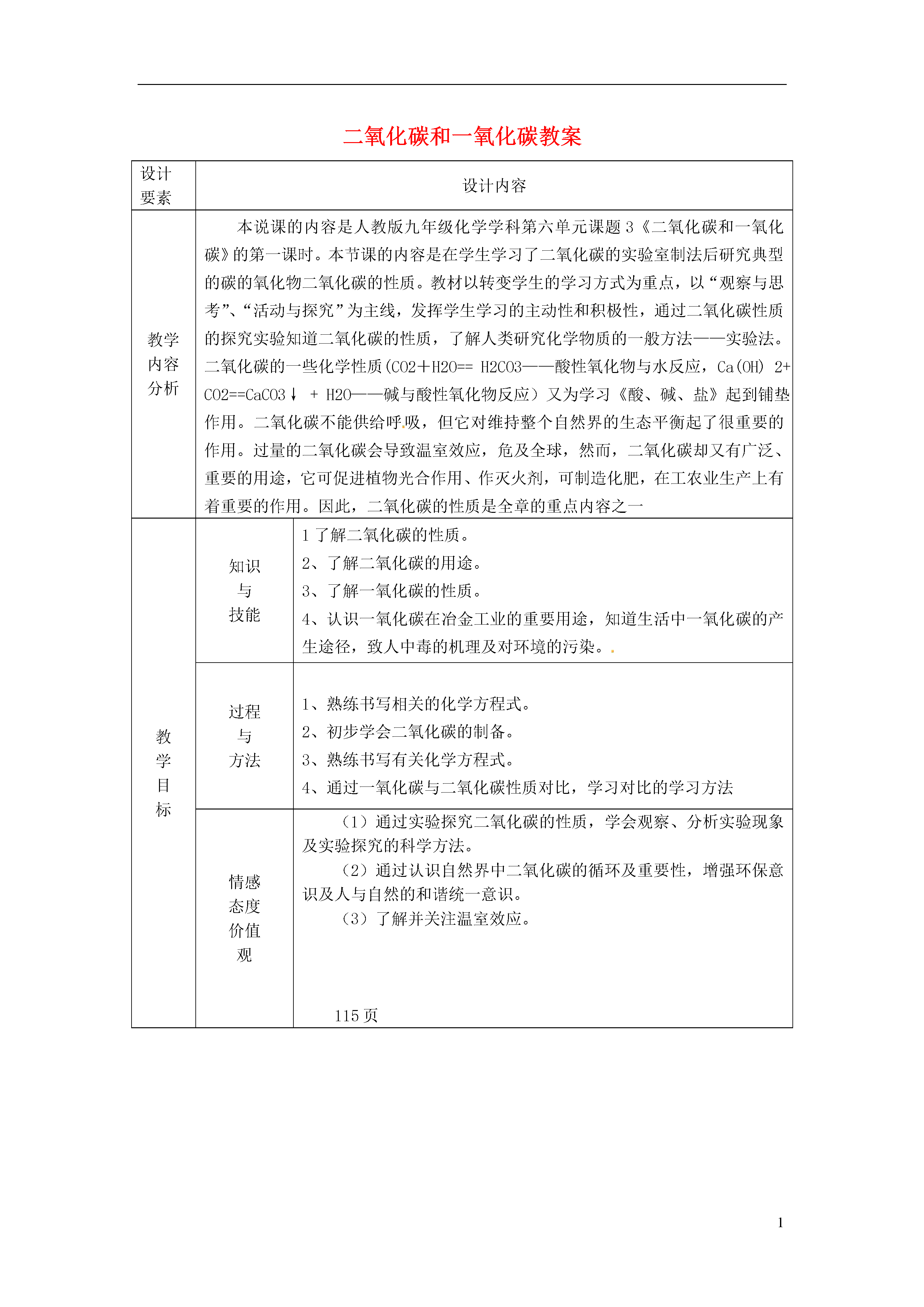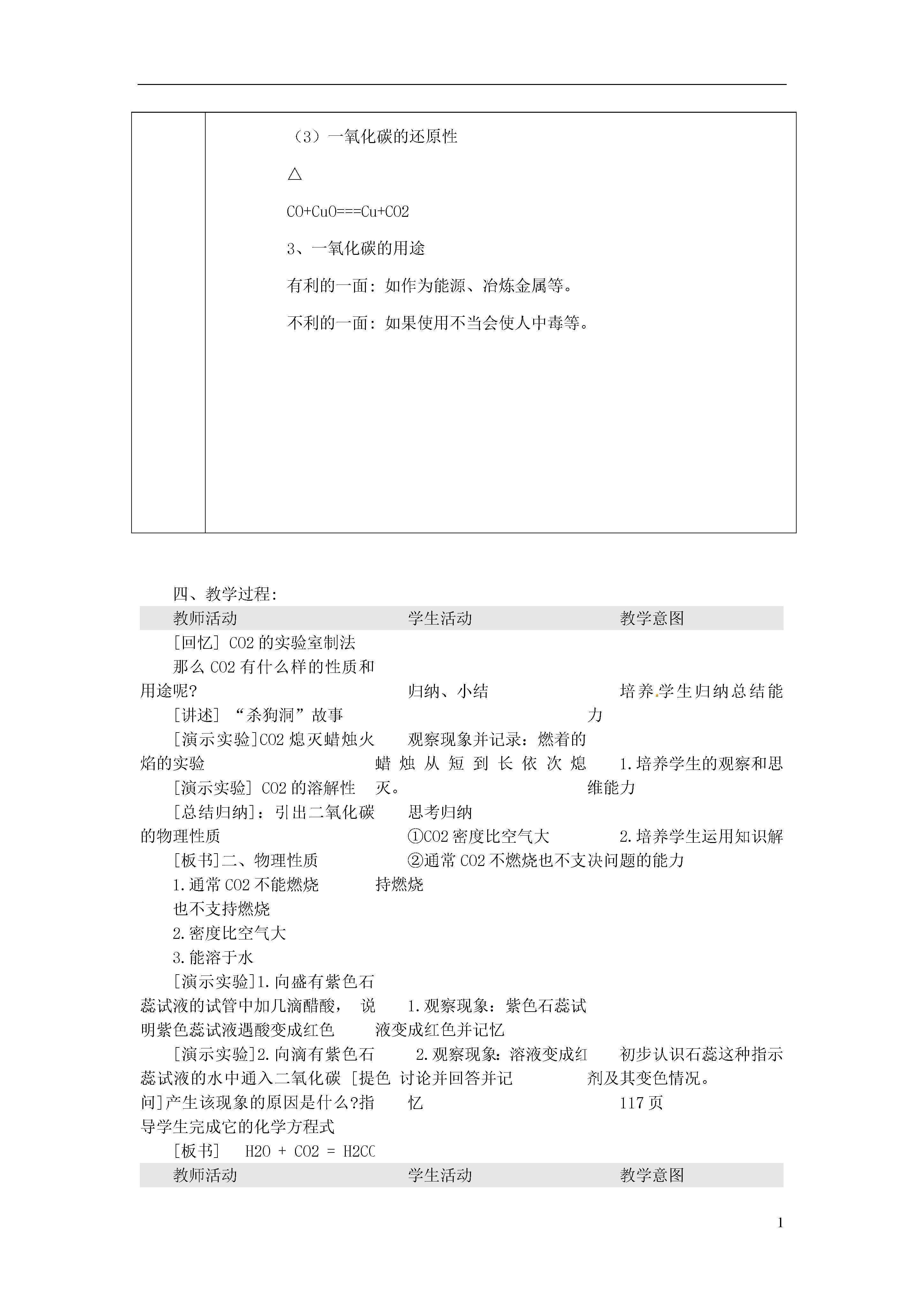 1二氧化碳和一氧化碳教案设计要素设计内容教学内容分析本说课的内容是人教版九年级化学学科第六单元课题3《二氧化碳和一氧化碳》的第一课时。本节课的内容是在学生学习了二氧化碳的实验室制法后研究典型的碳的氧化物二氧化碳的性质。教材以转变学生的学习方式为重点,以“观察与思考”、“活动与探究”为主线,发挥学生学习的主动性和积极性,通过二氧化碳性质的探究实验知道二氧化碳的性质,了解人类研究化学物质的一般方法——实验法。二氧化碳的一些化学性质(CO2+H2O==H2CO3——酸性氧化物与水反应,Ca(OH)2+CO2==CaCO3↓+H2O——碱与酸性氧化物反应)又为学习《酸、碱、盐》起到铺垫作用。二氧化碳不能供给呼吸,但它对维持整个自然界的生态平衡起了很重要的作用。过量的二氧化碳会导致温室效应,危及全球,然而,二氧化碳却又有广泛、重要的用途,它可促进植物光合作用、作灭火剂,可制造化肥,在工农业生产上有着重要的作用。因此,二氧化碳的性质是全章的重点内容之一教学目标知识与技能1了解二氧化碳的性质。2、了解二氧化碳的用途。3、了解一氧化碳的性质。4、认识一氧化碳在冶金工业的重要用途,知道生活中一氧化碳的产生途径,致人中毒的机理及对环境的污染。过程与方法1、熟练书写相关的化学方程式。2、初步学会二氧化碳的制备。3、熟练书写有关化学方程式。4、通过一氧化碳与二氧化碳性质对比,学习对比的学习方法情感态度价值观(1)通过实验探究二氧化碳的性质,学会观察、分析实验现象及实验探究的科学方法。(2)通过认识自然界中二氧化碳的循环及重要性,增强环保意识及人与自然的和谐统一意识。(3)了解并关注温室效应。115页学情分析一部分学生在日常生活中已经了解了一些有关CO2的知识,例如喝汽水,植物光合作用的原料,呼吸作用产生等;从学生心理需求上来看,往往渴望通过自主探究或通过一些创造性的实验和观察活动来了解CO2的知识但是,从学生获得知识技能的能力方面看,对于科学实验探究的过程是不熟悉的,因此,在教学中教师要有意识地培养学生的科学探究能力,使学生初步认识科学探究的过程、方法和意义。教学分析教学重点一氧化碳的化学性质。教学难点难点一氧化碳的化学性质解决办法实验法、讨论法、探究法、对比学习法教学资源多媒体展示台、有关实验仪器(一氧化碳性质实验)。板书设计二、一氧化碳的性质1、物理性质颜色、状态、气味、密度、溶解性无气体无比空气略小难能溶于水2、化学性质(1)一氧化碳的毒性一氧化碳极易与血液中的血红蛋白结合,从而使血红蛋白不能很好的与氧气结合,造成生物体内缺氧而中毒。(2)一氧化碳的可燃性点燃2CO+O2===2CO2116页(3)一氧化碳的还原性△CO+CuO===Cu+CO23、一氧化碳的用途有利的一面:如作为能源、冶炼金属等。不利的一面:如果使用不当会使人中毒等。四、教学过程:教师活动学生活动教学意图[回忆]CO2的实验室制法那么CO2有什么样的性质和用途呢?[讲述]“杀狗洞”故事[演示实验]CO2熄灭蜡烛火焰的实验[演示实验]CO2的溶解性[总结归纳]:引出二氧化碳的物理性质[板书]二、物理性质1.通常CO2不能燃烧也不支持燃烧2.密度比空气大3.能溶于水归纳、小结观察现象并记录:燃着的蜡烛从短到长依次熄灭。思考归纳①CO2密度比空气大②通常CO2不燃烧也不支持燃烧培养学生归纳总结能力1.培养学生的观察和思维能力2.培养学生运用知识解决问题的能力[演示实验]1.向盛有紫色石蕊试液的试管中加几滴醋酸,说明紫色蕊试液遇酸变成红色[演示实验]2.向滴有紫色石蕊试液的水中通入二氧化碳[提问]产生该现象的原因是什么?指导学生完成它的化学方程式[板书]H2O+CO2=H2CO31.观察现象:紫色石蕊试液变成红色并记忆2.观察现象:溶液变成红色讨论并回答并记忆初步认识石蕊这种指示剂及其变色情况。117页教师活动学生活动教学意图[演示实验]3.将上述变红的溶液加热并将所产生气体通入另一支盛有紫色石蕊的试管中(改进)[提问]为什么会出现这种现家?说明:碳酸很不稳定,易分解成水和二氧化碳,加热时分解更快.指导学生用化学方程式表示这一变化.观察:红色溶液变成紫色,并有无色气泡产生。另一支试管内的石蕊则变红色。培养学生的观察和思维能力[学生实验]向石灰水中吹气(指导学生完成)[演示实验]将CO2通入澄清石灰水,并请学生比较两实验现象。[板书]3.CO2跟石灰水反应,生成碳酸钙的化学方程式:CO2+Ca(OH)2=Ca