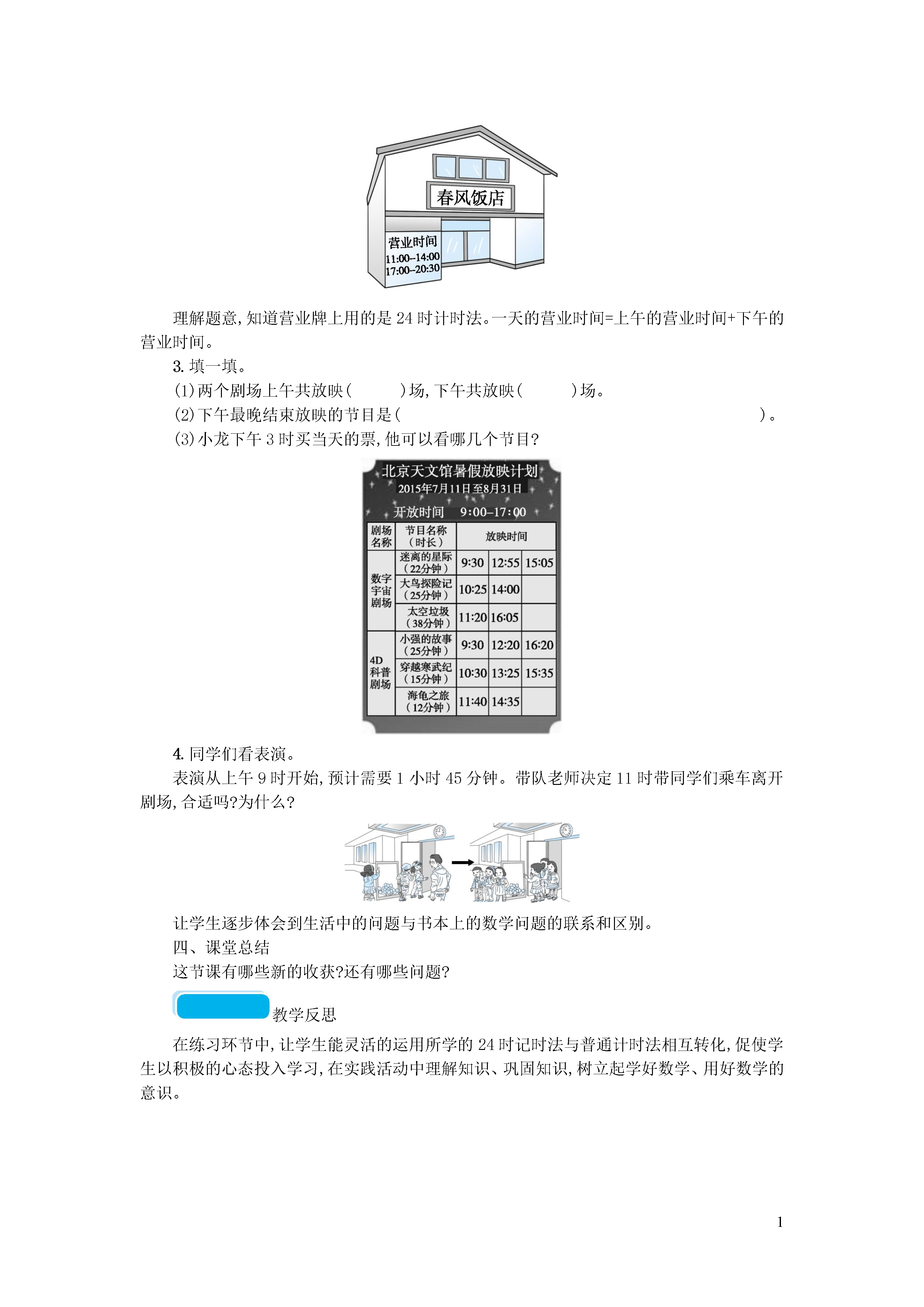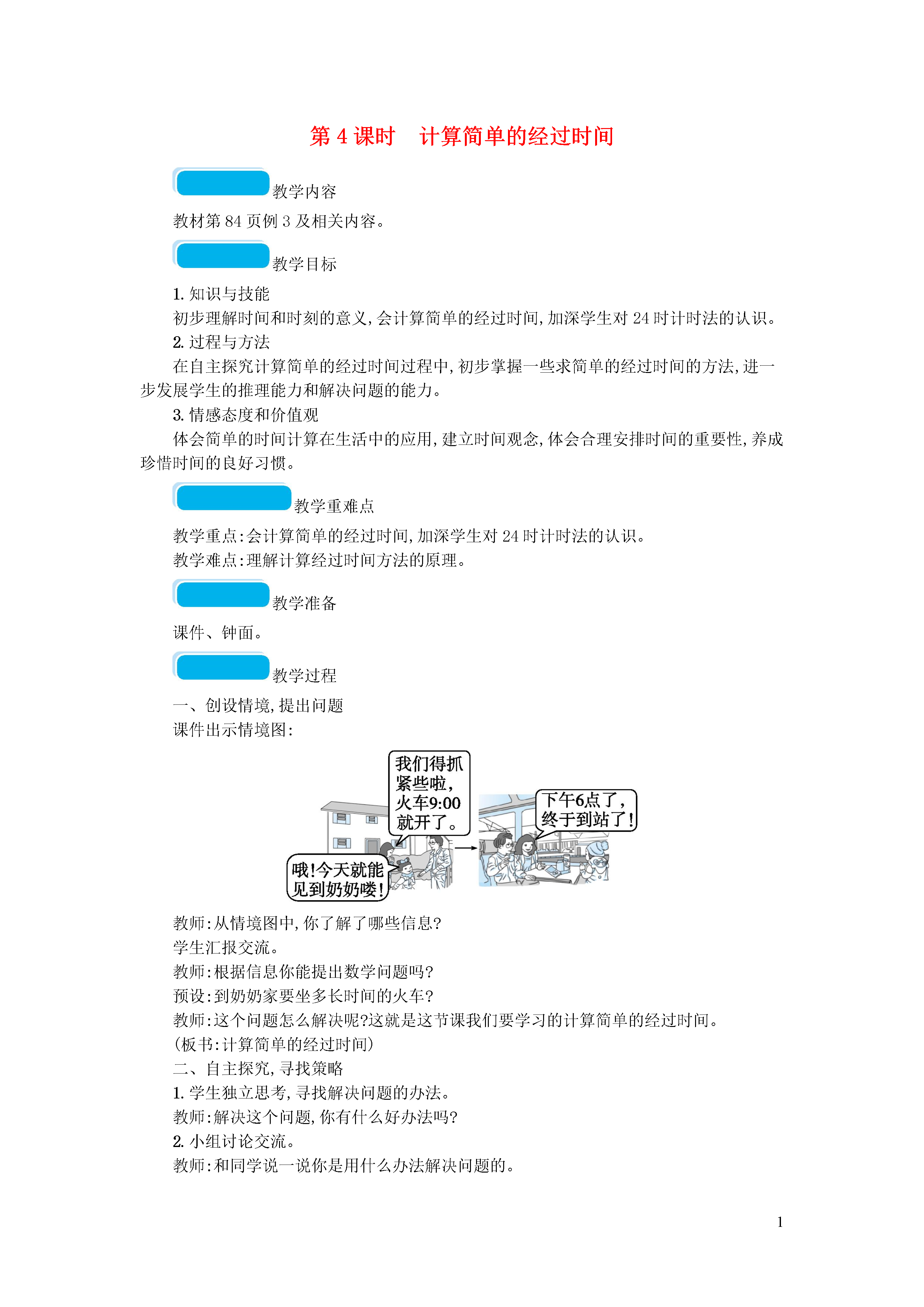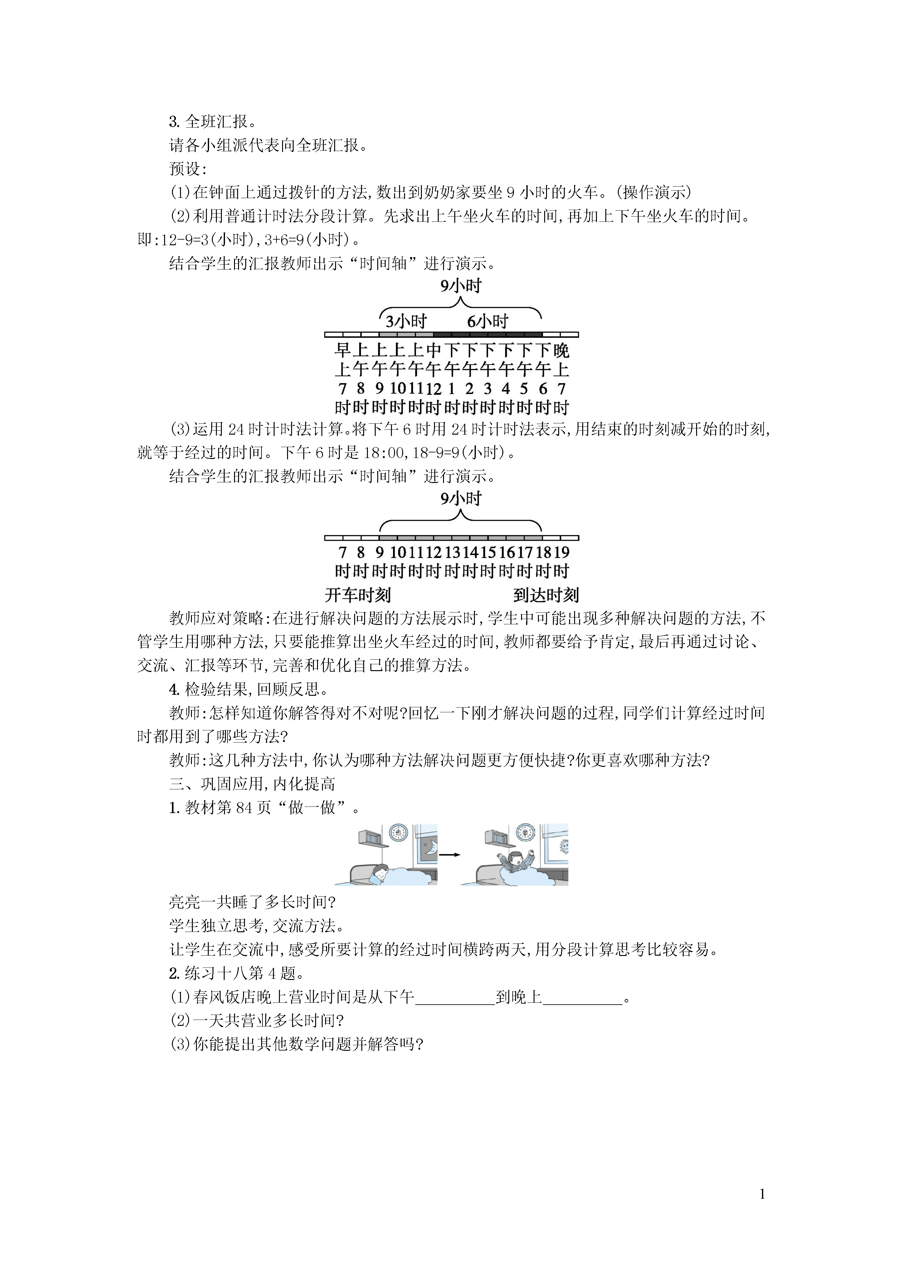 1第4课时计算简单的经过时间教学内容教材例3及相关内容。教学目标1.知识与技能初步理解时间和时刻的意义,会计算简单的经过时间,加深学生对24时计时法的认识。2.过程与方法在自主探究计算简单的经过时间过程中,初步掌握一些求简单的经过时间的方法,进一步发展学生的推理能力和解决问题的能力。3.情感态度和价值观体会简单的时间计算在生活中的应用,建立时间观念,体会合理安排时间的重要性,养成珍惜时间的良好习惯。教学重难点教学重点:会计算简单的经过时间,加深学生对24时计时法的认识。教学难点:理解计算经过时间方法的原理。教学准备课件、钟面。教学过程一、创设情境,提出问题课件出示情境图:教师:从情境图中,你了解了哪些信息?学生汇报交流。教师:根据信息你能提出数学问题吗?预设:到奶奶家要坐多长时间的火车?教师:这个问题怎么解决呢?这就是这节课我们要学习的计算简单的经过时间。(板书:计算简单的经过时间)二、自主探究,寻找策略1.学生独立思考,寻找解决问题的办法。教师:解决这个问题,你有什么好办法吗?2.小组讨论交流。教师:和同学说一说你是用什么办法解决问题的。3.全班汇报。请各小组派代表向全班汇报。预设:(1)在钟面上通过拨针的方法,数出到奶奶家要坐9小时的火车。(操作演示)(2)利用普通计时法分段计算。先求出上午坐火车的时间,再加上下午坐火车的时间。即:12-9=3(小时),3+6=9(小时)。结合学生的汇报教师出示“时间轴”进行演示。(3)运用24时计时法计算。将下午6时用24时计时法表示,用结束的时刻减开始的时刻,就等于经过的时间。下午6时是18:00,18-9=9(小时)。结合学生的汇报教师出示“时间轴”进行演示。教师应对策略:在进行解决问题的方法展示时,学生中可能出现多种解决问题的方法,不管学生用哪种方法,只要能推算出坐火车经过的时间,教师都要给予肯定,最后再通过讨论、交流、汇报等环节,完善和优化自己的推算方法。4.检验结果,回顾反思。教师:怎样知道你解答得对不对呢?回忆一下刚才解决问题的过程,同学们计算经过时间时都用到了哪些方法?教师:这几种方法中,你认为哪种方法解决问题更方便快捷?你更喜欢哪种方法?三、巩固应用,内化提高1.教材“做一做”。亮亮一共睡了多长时间?学生独立思考,交流方法。让学生在交流中,感受所要计算的经过时间横跨两天,用分段计算思考比较容易。2.练习十八第4题。(1)春风饭店晚上营业时间是从下午到晚上。(2)一天共营业多长时间?(3)你能提出其他数学问题并解答吗?理解题意,知道营业牌上用的是24时计时法。一天的营业时间=上午的营业时间+下午的营业时间。3.填一填。(1)两个剧场上午共放映()场,下午共放映()场。(2)下午最晚结束放映的节目是()。(3)小龙下午3时买当天的票,他可以看哪几个节目?4.同学们看表演。表演从上午9时开始,预计需要1小时45分钟。带队老师决定11时带同学们乘车离开剧场,合适吗?为什么?让学生逐步体会到生活中的问题与书本上的数学问题的联系和区别。四、课堂总结这节课有哪些新的收获?还有哪些问题?教学反思在练习环节中,让学生能灵活的运用所学的24时记时法与普通计时法相互转化,促使学生以积极的心态投入学习,在实践活动中理解知识、巩固知识,树立起学好数学、用好数学的意识。