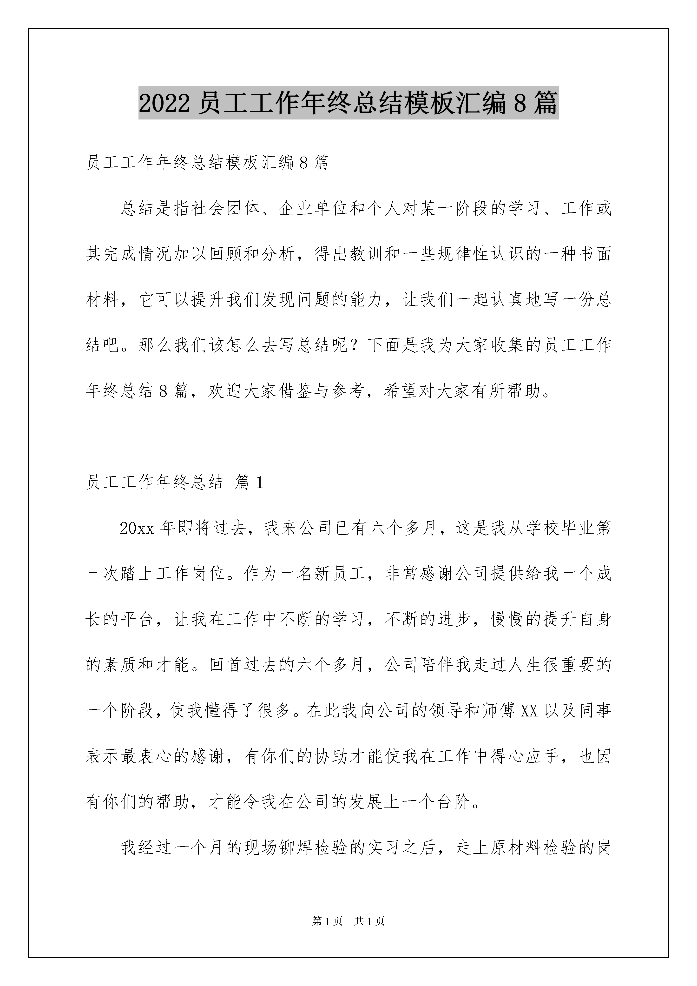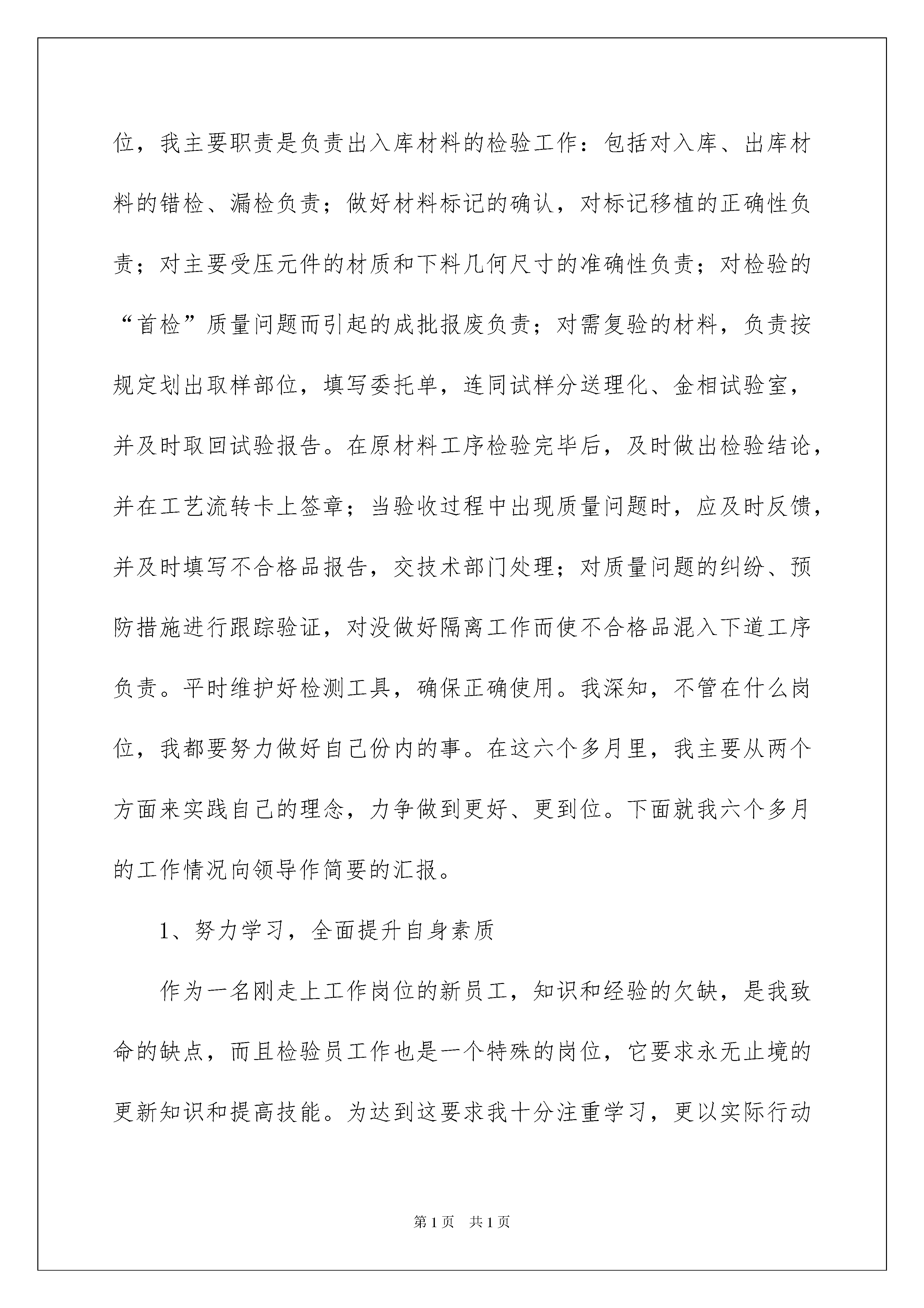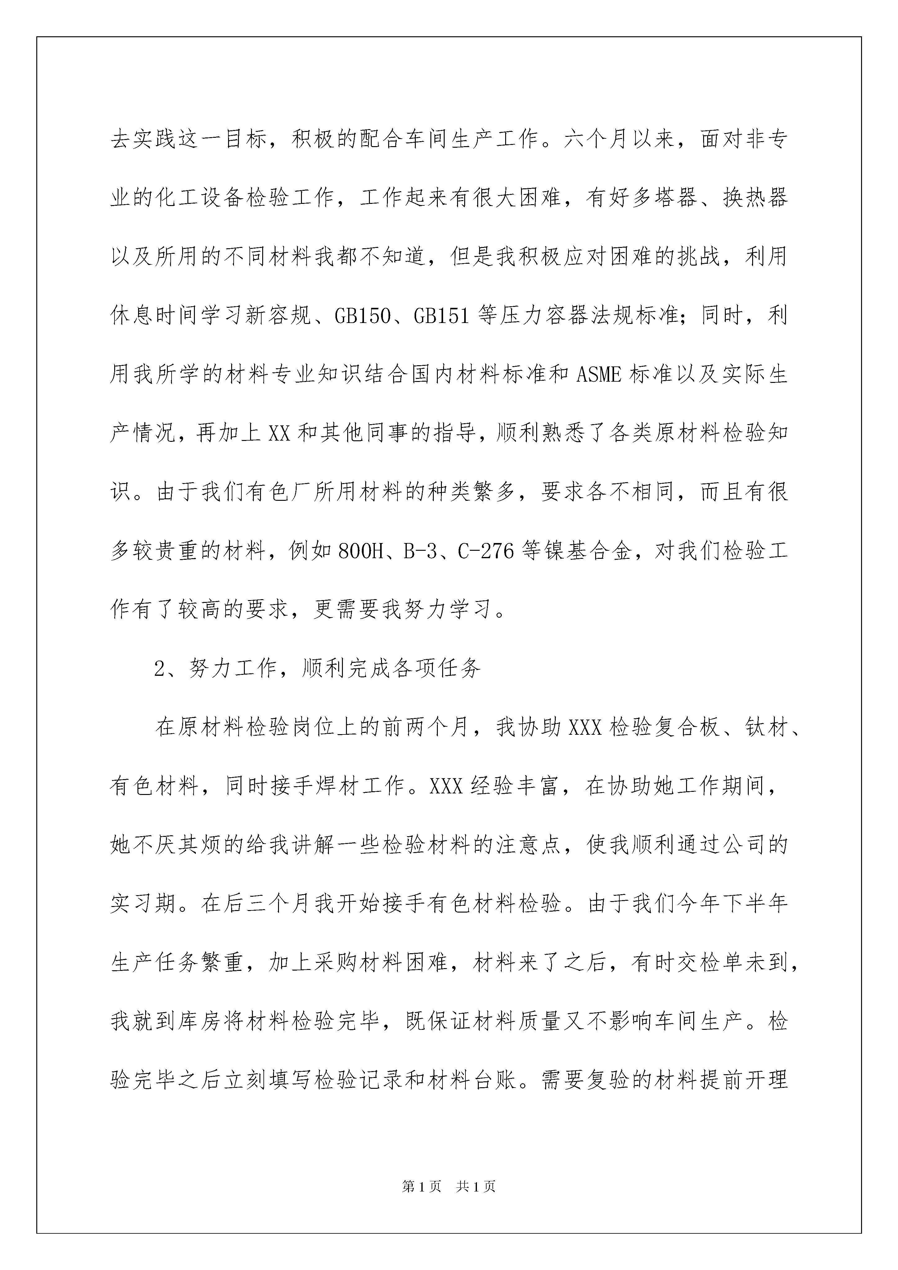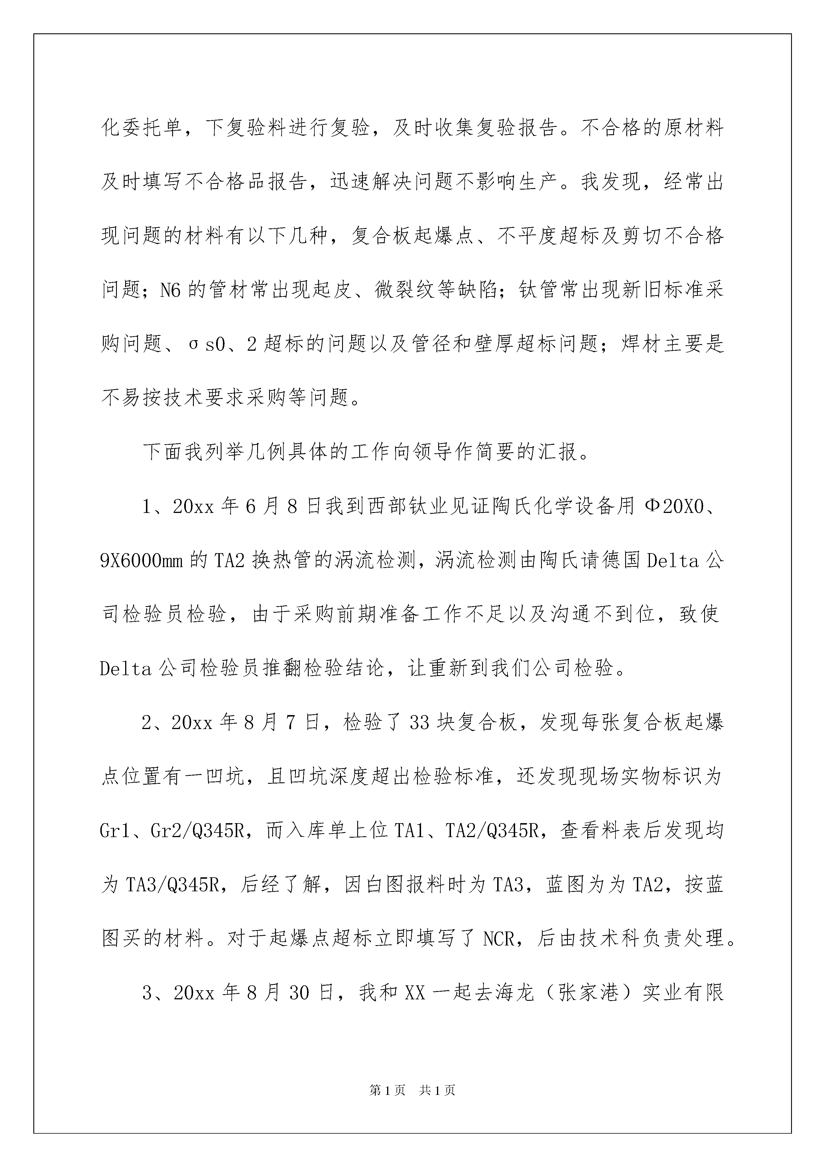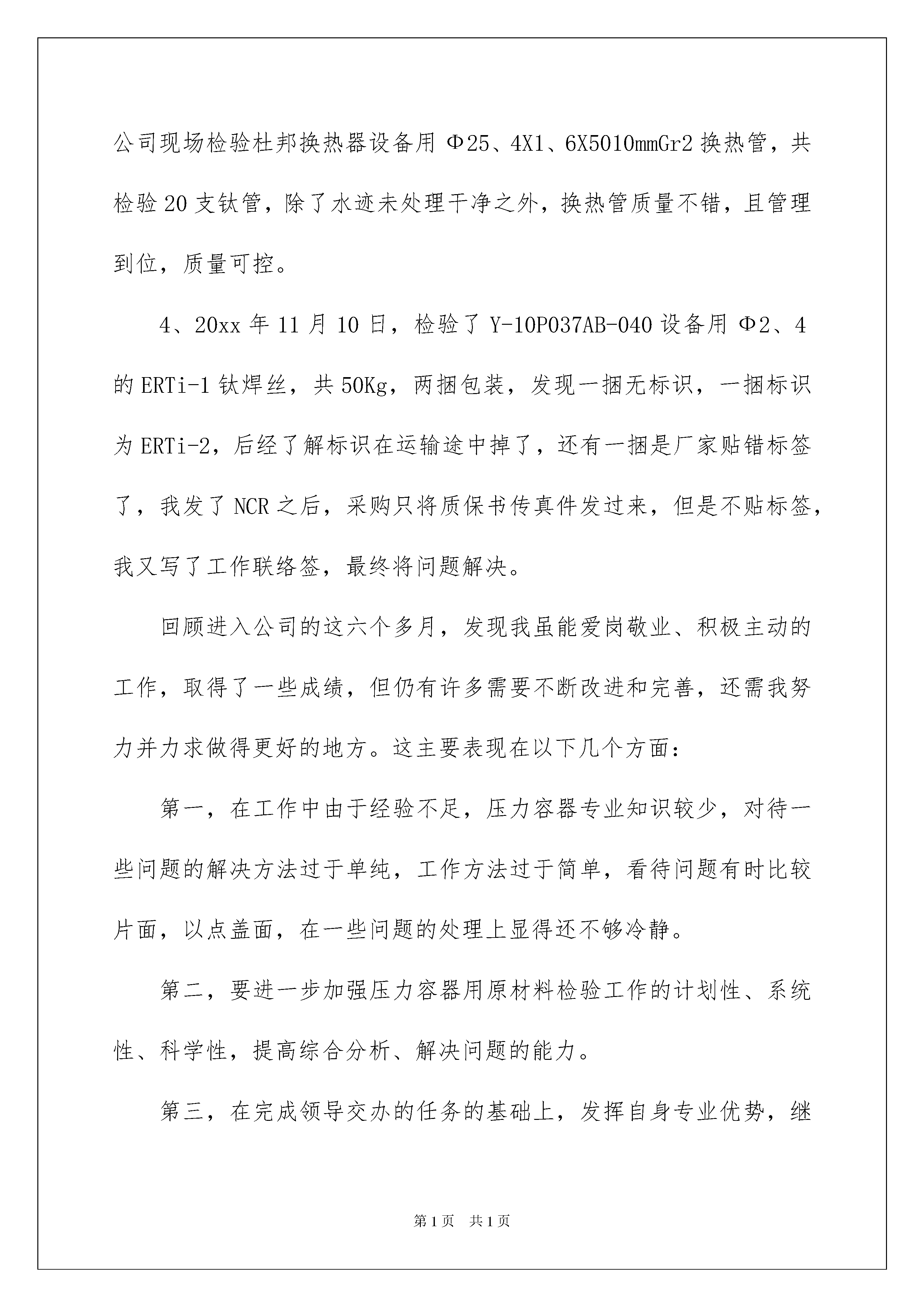 2022员工工作年终总结模板汇编8篇员工工作年终总结模板汇编8篇总结是指社会团体、企业单位和个人对某一阶段的学习、工作或其完成情况加以回顾和分析,得出教训和一些规律性认识的一种书面材料,它可以提升我们发现问题的能力,让我们一起认真地写一份总结吧。那么我们该怎么去写总结呢?下面是我为大家收集的员工工作年终总结8篇,欢迎大家借鉴与参考,希望对大家有所帮助。员工工作年终总结篇120xx年即将过去,我来公司已有六个多月,这是我从学校毕业第一次踏上工作岗位。作为一名新员工,非常感谢公司提供给我一个成长的平台,让我在工作中不断的学习,不断的进步,慢慢的提升自身的素质和才能。回首过去的六个多月,公司陪伴我走过人生很重要的一个阶段,使我懂得了很多。在此我向公司的领导和师傅XX以及同事表示最衷心的感谢,有你们的协助才能使我在工作中得心应手,也因有你们的帮助,才能令我在公司的发展上一个台阶。我经过一个月的现场铆焊检验的实习之后,走上原材料检验的岗位,我主要职责是负责出入库材料的检验工作:包括对入库、出库材料的错检、漏检负责;做好材料标记的确认,对标记移植的正确性负责;对主要受压元件的材质和下料几何尺寸的准确性负责;对检验的“首检”质量问题而引起的成批报废负责;对需复验的材料,负责按规定划出取样部位,填写委托单,连同试样分送理化、金相试验室,并及时取回试验报告。在原材料工序检验完毕后,及时做出检验结论,并在工艺流转卡上签章;当验收过程中出现质量问题时,应及时反馈,并及时填写不合格品报告,交技术部门处理;对质量问题的纠纷、预防措施进行跟踪验证,对没做好隔离工作而使不合格品混入下道工序负责。平时维护好检测工具,确保正确使用。我深知,不管在什么岗位,我都要努力做好自己份内的事。在这六个多月里,我主要从两个方面来实践自己的理念,力争做到更好、更到位。下面就我六个多月的工作情况向领导作简要的汇报。1、努力学习,全面提升自身素质作为一名刚走上工作岗位的新员工,知识和经验的欠缺,是我致命的缺点,而且检验员工作也是一个特殊的岗位,它要求永无止境的更新知识和提高技能。为达到这要求我十分注重学习,更以实际行动去实践这一目标,积极的配合车间生产工作。六个月以来,面对非专业的化工设备检验工作,工作起来有很大困难,有好多塔器、换热器以及所用的不同材料我都不知道,但是我积极应对困难的挑战,利用休息时间学习新容规、GB150、GB151等压力容器法规标准;同时,利用我所学的材料专业知识结合国内材料标准和ASME标准以及实际生产情况,再加上XX和其他同事的指导,顺利熟悉了各类原材料检验知识。由于我们有色厂所用材料的种类繁多,要求各不相同,而且有很多较贵重的材料,例如800H、B-3、C-276等镍基合金,对我们检验工作有了较高的要求,更需要我努力学习。2、努力工作,顺利完成各项任务在原材料检验岗位上的前两个月,我协助XXX检验复合板、钛材、有色材料,同时接手焊材工作。XXX经验丰富,在协助她工作期间,她不厌其烦的给我讲解一些检验材料的注意点,使我顺利通过公司的实习期。在后三个月我开始接手有色材料检验。由于我们今年下半年生产任务繁重,加上采购材料困难,材料来了之后,有时交检单未到,我就到库房将材料检验完毕,既保证材料质量又不影响车间生产。检验完毕之后立刻填写检验记录和材料台账。需要复验的材料提前开理化委托单,下复验料进行复验,及时收集复验报告。不合格的原材料及时填写不合格品报告,迅速解决问题不影响生产。我发现,经常出现问题的材料有以下几种,复合板起爆点、不平度超标及剪切不合格问题;N6的管材常出现起皮、微裂纹等缺陷;钛管常出现新旧标准采购问题、σs0、2超标的问题以及管径和壁厚超标问题;焊材主要是不易按技术要求采购等问题。下面我列举几例具体的工作向领导作简要的汇报。1、20xx年6月8日我到西部钛业见证陶氏化学设备用Ф20X0、9X6000mm的TA2换热管的涡流检测,涡流检测由陶氏请德国Delta公司检验员检验,由于采购前期准备工作不足以及沟通不到位,致使Delta公司检验员推翻检验结论,让重新到我们公司检验。2、20xx年8月7日,检验了33块复合板,发现每张复合板起爆点位置有一凹坑,且凹坑深度超出检验标准,还发现现场实物标识为Gr1、Gr2/Q345R,而入库单上位TA1、TA2/Q345R,查看料表后发现均为TA3/Q345R,后经了解,因白图报料时为TA3,蓝图为为TA2,按蓝图买的材料。对于起爆点超标立即填写了NCR,后由技术科负责处理。3、20xx年8月30日,我和XX一起去海龙(张家港)实业有限公司现场检验杜邦