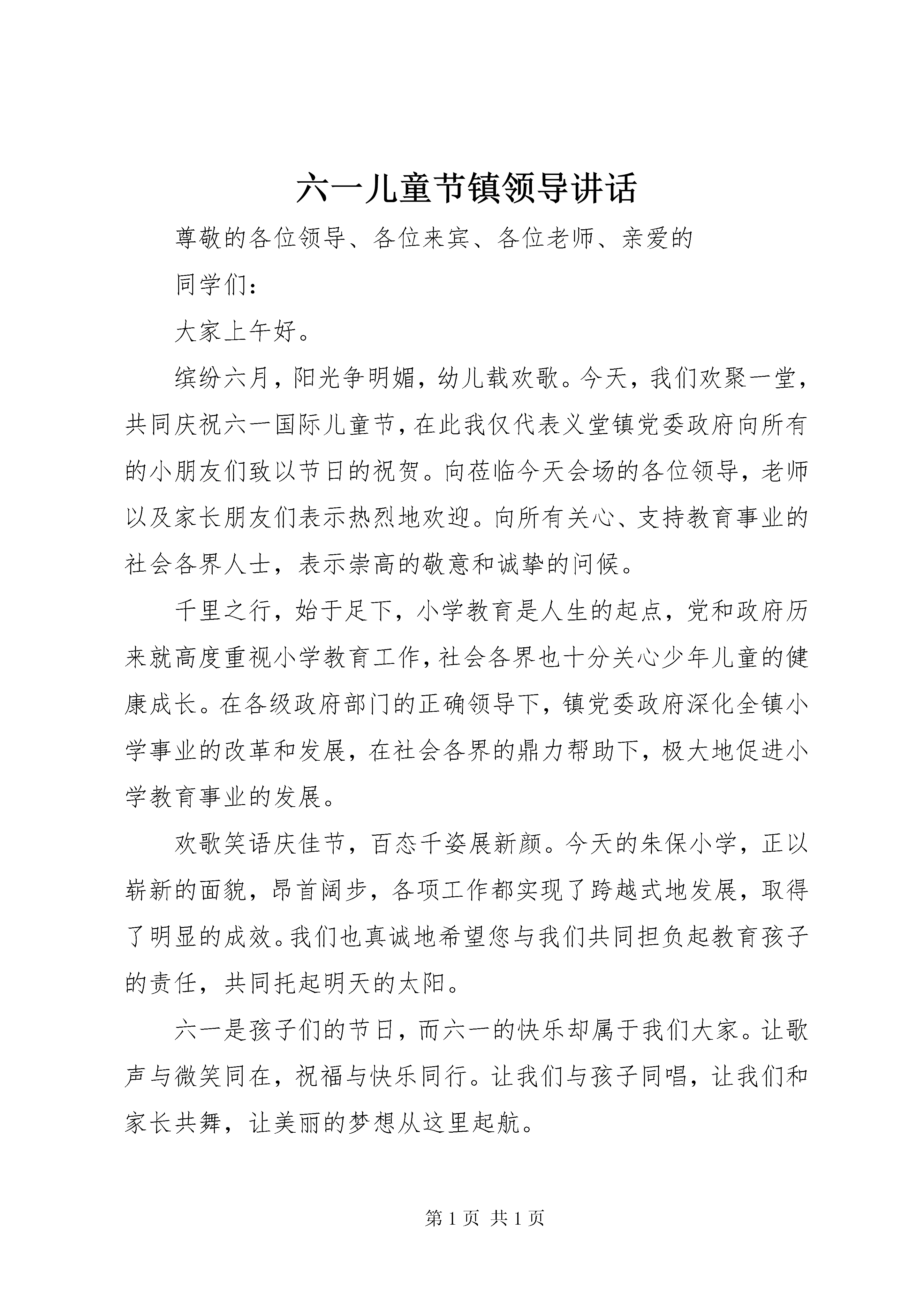 六一儿童节镇领导讲话尊敬的各位领导、各位来宾、各位老师、亲爱的同学们:大家上午好。缤纷六月,阳光争明媚,幼儿载欢歌。今天,我们欢聚一堂,共同庆祝六一国际儿童节,在此我仅代表义堂镇党委政府向所有的小朋友们致以节日的祝贺。向莅临今天会场的各位领导,老师以及家长朋友们表示热烈地欢迎。向所有关心、支持教育事业的社会各界人士,表示崇高的敬意和诚挚的问候。千里之行,始于足下,小学教育是人生的起点,党和政府历来就高度重视小学教育工作,社会各界也十分关心少年儿童的健康成长。在各级政府部门的正确领导下,镇党委政府深化全镇小学事业的改革和发展,在社会各界的鼎力帮助下,极大地促进小学教育事业的发展。欢歌笑语庆佳节,百态千姿展新颜。今天的朱保小学,正以崭新的面貌,昂首阔步,各项工作都实现了跨越式地发展,取得了明显的成效。我们也真诚地希望您与我们共同担负起教育孩子的责任,共同托起明天的太阳。六一是孩子们的节日,而六一的快乐却属于我们大家。让歌声与微笑同在,祝福与快乐同行。让我们与孩子同唱,让我们和家长共舞,让美丽的梦想从这里起航。最后预祝大会圆满成功。祝大家身体健康、合家幸福。祝孩子们永远健康、快乐。