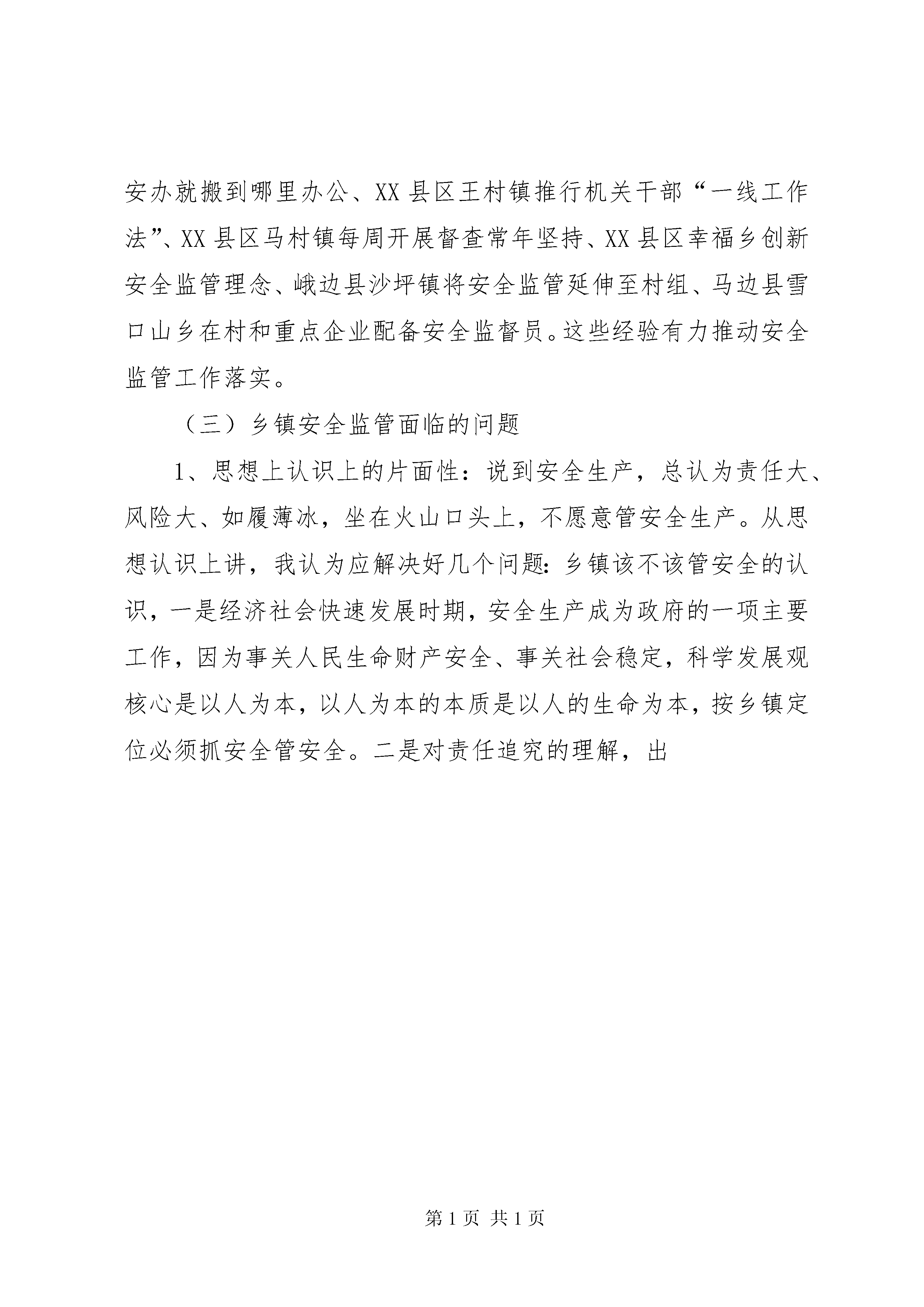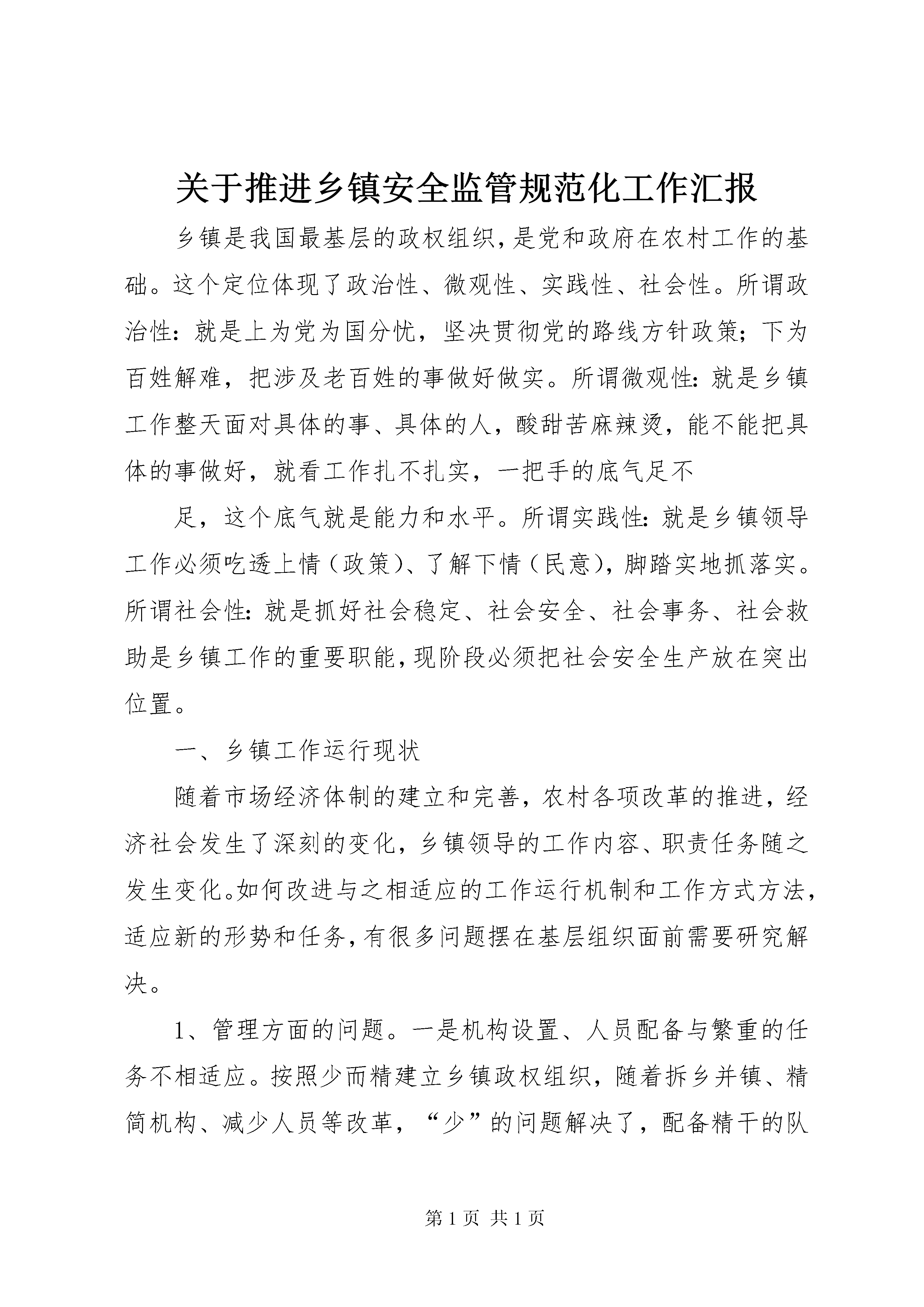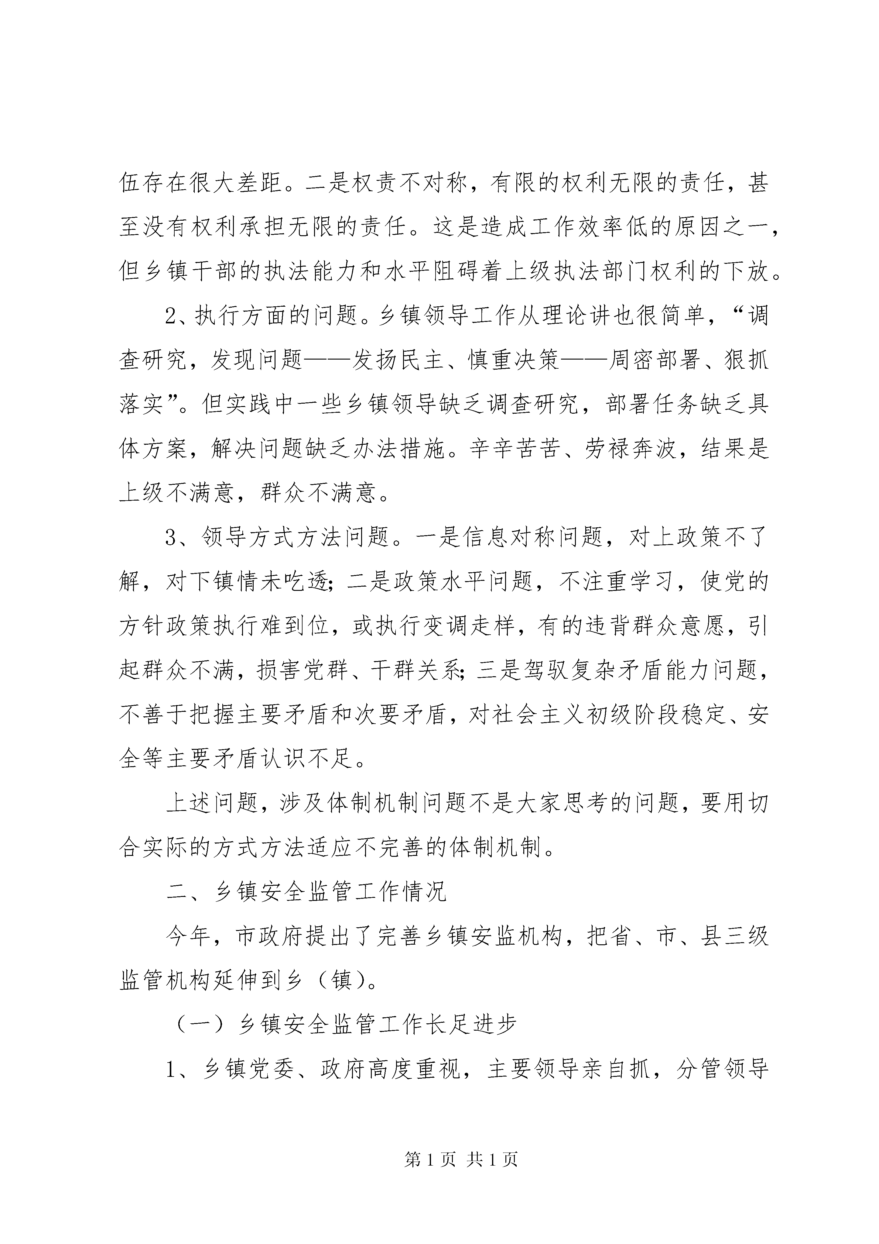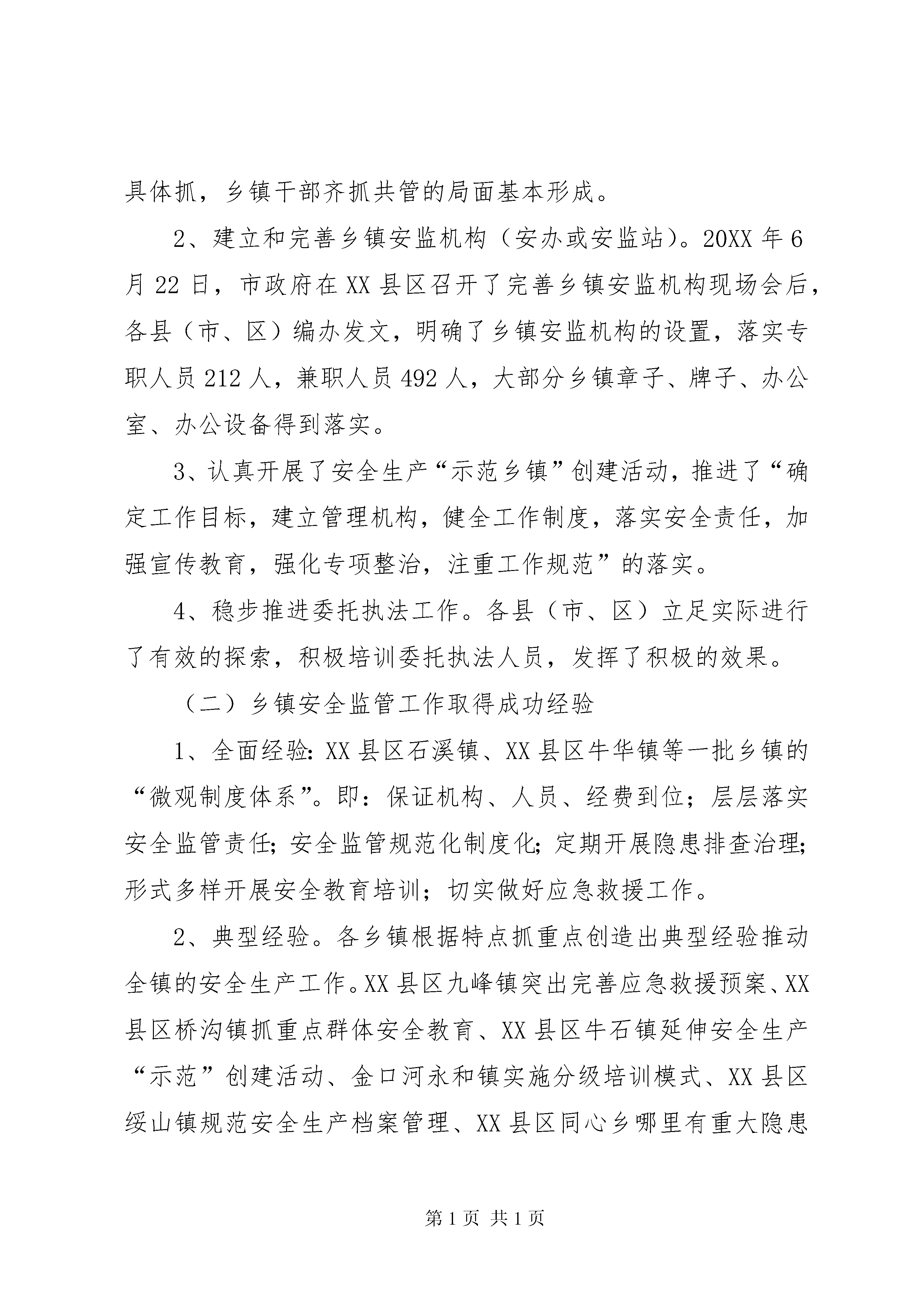 关于推进乡镇安全监管规范化工作汇报乡镇是我国最基层的政权组织,是党和政府在农村工作的基础。这个定位体现了政治性、微观性、实践性、社会性。所谓政治性:就是上为党为国分忧,坚决贯彻党的路线方针政策;下为百姓解难,把涉及老百姓的事做好做实。所谓微观性:就是乡镇工作整天面对具体的事、具体的人,酸甜苦麻辣烫,能不能把具体的事做好,就看工作扎不扎实,一把手的底气足不足,这个底气就是能力和水平。所谓实践性:就是乡镇领导工作必须吃透上情(政策)、了解下情(民意),脚踏实地抓落实。所谓社会性:就是抓好社会稳定、社会安全、社会事务、社会救助是乡镇工作的重要职能,现阶段必须把社会安全生产放在突出位置。一、乡镇工作运行现状随着市场经济体制的建立和完善,农村各项改革的推进,经济社会发生了深刻的变化,乡镇领导的工作内容、职责任务随之发生变化。如何改进与之相适应的工作运行机制和工作方式方法,适应新的形势和任务,有很多问题摆在基层组织面前需要研究解决。1、管理方面的问题。一是机构设置、人员配备与繁重的任务不相适应。按照少而精建立乡镇政权组织,随着拆乡并镇、精简机构、减少人员等改革,“少”的问题解决了,配备精干的队伍存在很大差距。二是权责不对称,有限的权利无限的责任,甚至没有权利承担无限的责任。这是造成工作效率低的原因之一,但乡镇干部的执法能力和水平阻碍着上级执法部门权利的下放。2、执行方面的问题。乡镇领导工作从理论讲也很简单,“调查研究,发现问题——发扬民主、慎重决策——周密部署、狠抓落实”。但实践中一些乡镇领导缺乏调查研究,部署任务缺乏具体方案,解决问题缺乏办法措施。辛辛苦苦、劳禄奔波,结果是上级不满意,群众不满意。3、领导方式方法问题。一是信息对称问题,对上政策不了解,对下镇情未吃透;二是政策水平问题,不注重学习,使党的方针政策执行难到位,或执行变调走样,有的违背群众意愿,引起群众不满,损害党群、干群关系;三是驾驭复杂矛盾能力问题,不善于把握主要矛盾和次要矛盾,对社会主义初级阶段稳定、安全等主要矛盾认识不足。上述问题,涉及体制机制问题不是大家思考的问题,要用切合实际的方式方法适应不完善的体制机制。二、乡镇安全监管工作情况今年,市政府提出了完善乡镇安监机构,把省、市、县三级监管机构延伸到乡(镇)。(一)乡镇安全监管工作长足进步1、乡镇党委、政府高度重视,主要领导亲自抓,分管领导具体抓,乡镇干部齐抓共管的局面基本形成。2、建立和完善乡镇安监机构(安办或安监站)。20XX年6月22日,市政府在XX县区召开了完善乡镇安监机构现场会后,各县(市、区)编办发文,明确了乡镇安监机构的设置,落实专职人员212人,兼职人员492人,大部分乡镇章子、牌子、办公室、办公设备得到落实。3、认真开展了安全生产“示范乡镇”创建活动,推进了“确定工作目标,建立管理机构,健全工作制度,落实安全责任,加强宣传教育,强化专项整治,注重工作规范”的落实。4、稳步推进委托执法工作。各县(市、区)立足实际进行了有效的探索,积极培训委托执法人员,发挥了积极的效果。(二)乡镇安全监管工作取得成功经验1、全面经验:XX县区石溪镇、XX县区牛华镇等一批乡镇的“微观制度体系”。即:保证机构、人员、经费到位;层层落实安全监管责任;安全监管规范化制度化;定期开展隐患排查治理;形式多样开展安全教育培训;切实做好应急救援工作。2、典型经验。各乡镇根据特点抓重点创造出典型经验推动全镇的安全生产工作。XX县区九峰镇突出完善应急救援预案、XX县区桥沟镇抓重点群体安全教育、XX县区牛石镇延伸安全生产“示范”创建活动、金口河永和镇实施分级培训模式、XX县区绥山镇规范安全生产档案管理、XX县区同心乡哪里有重大隐患安办就搬到哪里办公、XX县区王村镇推行机关干部“一线工作法”、XX县区马村镇每周开展督查常年坚持、XX县区幸福乡创新安全监管理念、峨边县沙坪镇将安全监管延伸至村组、马边县雪口山乡在村和重点企业配备安全监督员。这些经验有力推动安全监管工作落实。(三)乡镇安全监管面临的问题1、思想上认识上的片面性:说到安全生产,总认为责任大、风险大、如履薄冰,坐在火山口头上,不愿意管安全生产。从思想认识上讲,我认为应解决好几个问题:乡镇该不该管安全的认识,一是经济社会快速发展时期,安全生产成为政府的一项主要工作,因为事关人民生命财产安全、事关社会稳定,科学发展观核心是以人为本,以人为本的本质是以人的生命为本,按乡镇定位必须抓安全管安全。二是对责任追究的理解,出